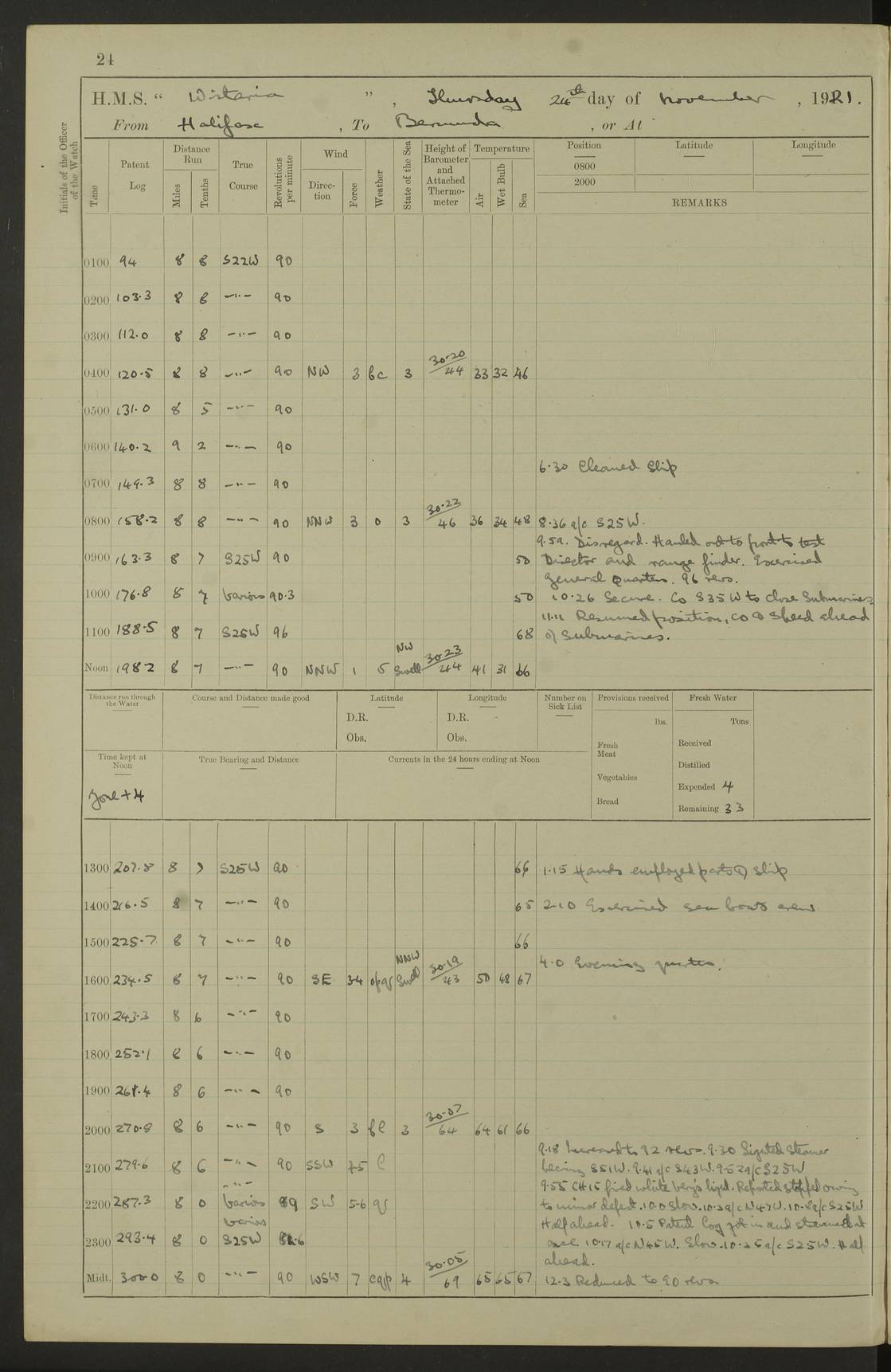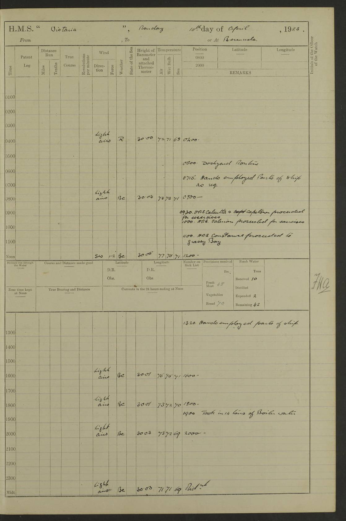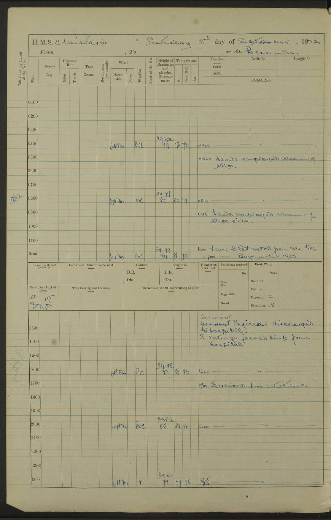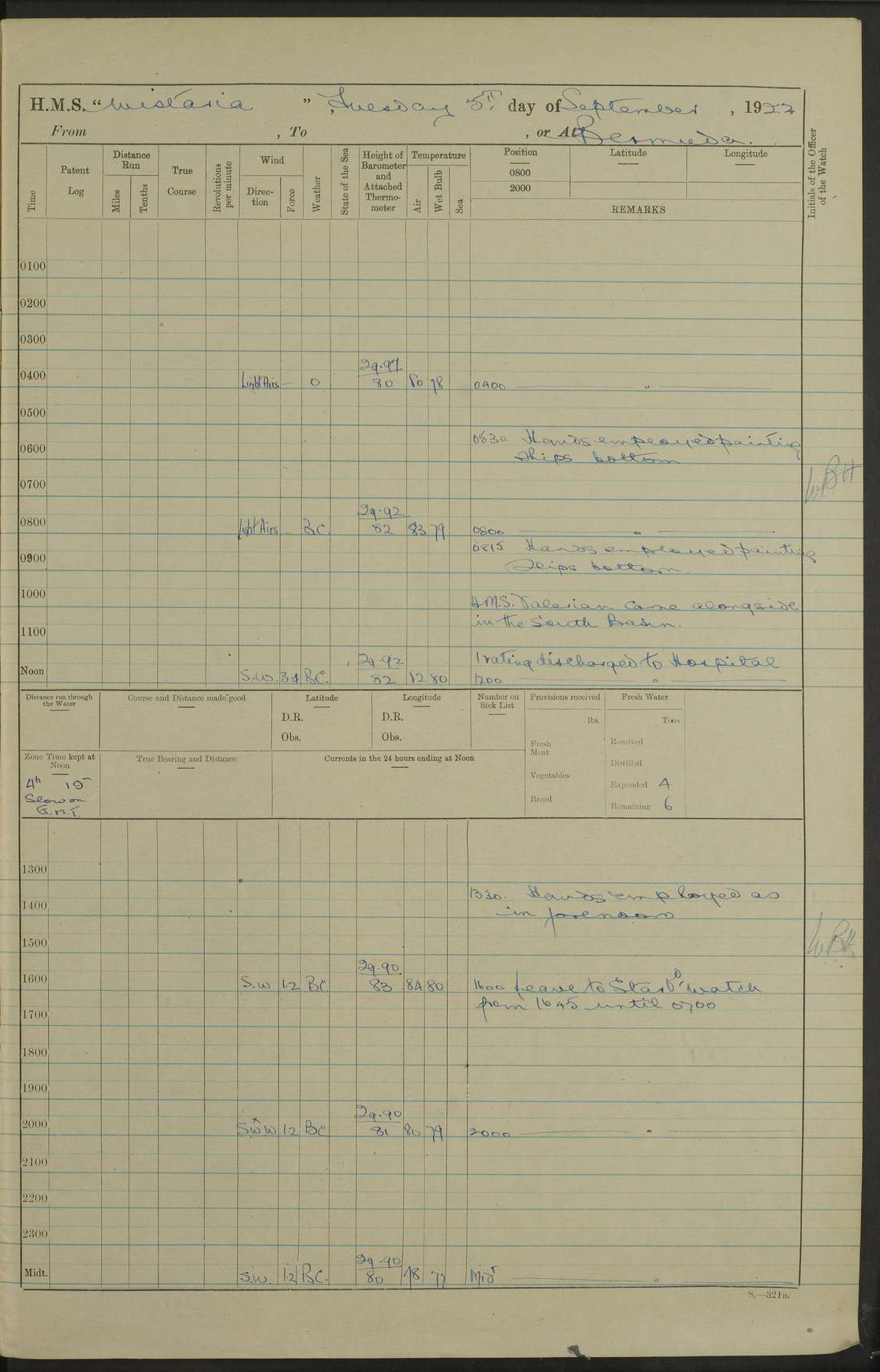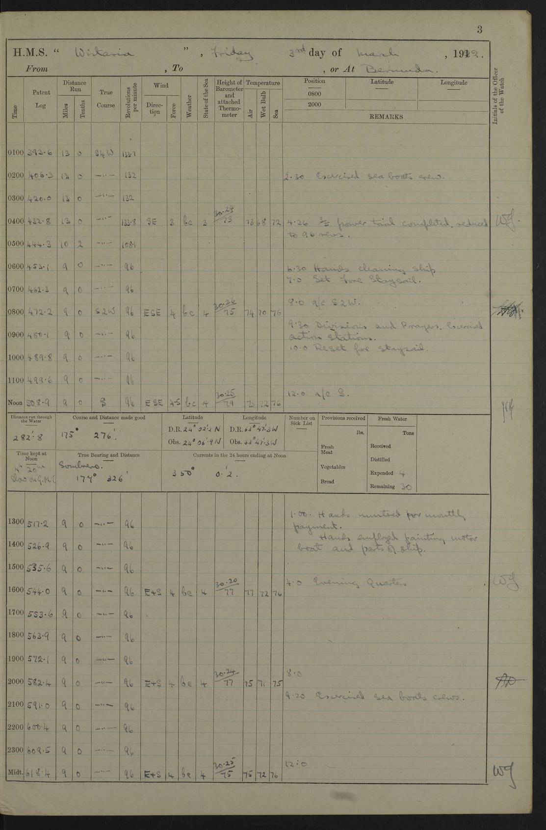4f73caf5a2fc8ea903000c3b: (https://s3.amazonaws.com:443/oldweather/ADM53-93269/0003_1.jpg) 1 September 1922 At Bermuda Lat 32.32, Long -64.8 5.30am: Hands employed cleaning ship 8.15am: Hands employed ranging cable for survey Sunset 6.30 2.0pm: Hands employed scraping ship's bottom, and cleaning out cable lockers 4f73caf5a2fc8ea903000c3c: (https://s3.amazonaws.com:443/oldweather/ADM53-93269/0004_0.jpg) 2 September 1922 At Bermuda Lat 32.32, Long -64.8 5.30am: Hands employed cleaning ship 8.15am: Hands employed cleaning ship’s side pm: Commissioned Engineer discharged to hospital pm: 2 ratings joined ship from hospital 5.0pm: Exercised fires stations 4f73caf6a2fc8ea903000c3d: (https://s3.amazonaws.com:443/oldweather/ADM53-93269/0004_1.jpg) 3 September 1922 At Bermuda Lat 32.32, Long -64.8 6.0am: Hands employed cleaning ship (usual Sunday Routine) 8.0-8.45am: Hands clean up decks for Divisions 10.15am: Church of England Church party landed 6.0pm: Tested fire arrangements 4f73caf6a2fc8ea903000c3e: (https://s3.amazonaws.com:443/oldweather/ADM53-93269/0005_0.jpg) 4 September 1922 At Bermuda Lat 32.32, Long -64.8 5.30am: Hands employed scraping ship's bottom 8.15am: Hands employed painting ship's bottom 2.0pm: Hands employed as in the forenoon 4f73caf7a2fc8ea903000c3f: (https://s3.amazonaws.com:443/oldweather/ADM53-93269/0005_1.jpg) 5 September 1922 At Bermuda Lat 32.32, Long -64.8 5.30am: Hands employed painting ship's bottom 8.15am: Hands employed painting ship's bottom am: HMS “Valerian” came alongside in the South Basin am: 1 rating discharged to hospital 1.30pm: Hands employed as in forenoon 4f73caf7a2fc8ea903000c40: (https://s3.amazonaws.com:443/oldweather/ADM53-93269/0006_0.jpg) 6 September 1922 At Bermuda Lat 32.32, Long -64.8 5.40am: Hands employed painting ship's bottom am: 1 PO & 6 Hands employed stowing cable after survey 8.15am: Hands employed restowing cable and painting ship's bottom am: Leave to Engine room branch from 13.30-07.00 Port Watch 1 boatswains pipe lost by accident pm: Received 20 tons of boiled water 2.0pm: Hands employed restowing cable and painting ship's bottom 4f73caf7a2fc8ea903000c41: (https://s3.amazonaws.com:443/oldweather/ADM53-93269/0006_1.jpg) 7 September 1922 At Bermuda Lat 32.32, Long -64.8 6.30am: Hands employed cleaning ship 8.15am: Hands preparing for undocking ship 9.30am: Secured alongside by the sheerlegs am: Hands restowed ammunition 3.45pm: Exercised collision stations 4f73caf8a2fc8ea903000c42: (https://s3.amazonaws.com:443/oldweather/ADM53-93269/0007_0.jpg) 8 September 1922 At Bermuda Lat 32.32, Long -64.8 8.15am: Hands employed cleaning ship 9.30am: Divisions. Inspection of the ship by Captain the Hon. A. E. Strutt 10.10am: Hands muster by the ledger 11.0am: Cleared ship for action pm: 6 ratings joined ship from Hospital 1.30pm: Resumed inspection of the ship by Captain the Hon A. E. Strutt 2.45pm: Secured, replace gear [Captain the Honourable Arthur Charles Strutt] 4f73caf8a2fc8ea903000c43: (https://s3.amazonaws.com:443/oldweather/ADM53-93269/0007_1.jpg) 9 September 1922 From Bermuda to Halifax N.S., and at Bermuda Lat 32.32, Long -64.8 8.15am: Hands employed provisioning ship pm: 12 ratings discharged to HMS “Dartmouth” pm: 18 ratings joined ship pm: Received 7 tons of boiler water 2.0pm: Hands employed securing ship for sea 4.0pm: Slipped from Jetty & proceeded out 4.15pm: Stopped in Grassy Bay, and hoisted motor boat 4.30pm: Proceeded at 96 revs. Co as requisite for Ship Channel and Narrows 5.49pm: Fairway buoy abeam. Course East 6.04pm: Mills Breaker buoy abeam, 8 cables 6.19pm: Kitchen Shoals buoy abeam, 1 mile 6.35pm: Streamed log [Mills Breaker buoy coordinates: Lat 32 23.9N, Long 64 36.9W] [Kitchen Shoal beacon coordinates: Lat 32 26.1N, Long 64 37.6W] 4f73caf8a2fc8ea903000c44: (https://s3.amazonaws.com:443/oldweather/ADM53-93269/0008_0.jpg) 10 September 1922 From Bermuda to Halifax Lat 35.06, Long -64.5 9.45am: Divisions & Prayers pm: Usual Sunday Routine 4.05pm: Hauled in, cleaned & streamed patent log 5.0pm: Put clocks on 20 minutes 5.30pm: Exercised sounding party True Bearing and Distance: Chebucto Head 004°½, 566 miles 4f73caf9a2fc8ea903000c45: (https://s3.amazonaws.com:443/oldweather/ADM53-93269/0008_1.jpg) 11 September 1922 From Bermuda to Halifax Lat 38.88, Long -64.3 3.0am: Within strong W/T touch with “Cape Town” 5.25am: Spoke “Cape Town” am: Divisions & Prayers, Exercised action am: Exchanged names with British Steamer “San Valerio”, Eagle Oil Co. Lat 38 35N, Long 63 55W 10.10am: Secure pm: Hands employed painting lower boom gear & waterways & cleaning out 2nd whaler 4.50pm: Exercised sounding party 5.0pm: Put clocks on ½ hour 10.10pm: Stopped engines, helm jammed 10.12pm: Hauled in patent log 10.35pm: Resumed Co & speed; hand wheel connected up. Course below NNE 10.45pm: Streamed patent log True Bearing and Distance: Chebucto Head 005°, 332 miles 4f73caf9a2fc8ea903000c46: (https://s3.amazonaws.com:443/oldweather/ADM53-93269/0009_0.jpg) 12 September 1922 From Bermuda to Halifax Lat 42.85, Long -63.81 am: Steering by hand 9.45am: Ord Seamen & Boys to 4” instruction pm: 1 hand scrubber lost by accident pm: 1 whalers oar lost by accident 5.0pm: Altered course N36E (steering NNE½E). Put clocks on 1/2 hour 8.15pm: Sighted Sambro Lt bearing N20E 8.40pm: Sighted Chebucto Head Lt bearing N18E 9.27pm: Sambro Lt buoy abeam, 2 miles 10.07pm: Sambro Lt abeam 10.10pm: Chebucto Lt abeam 10.20pm: Hauled in Patent log 11.20pm: Mauger Beach Lt abeam 11.52pm: Let go off No 4 wharf with 2½ shackles True Bearing and Distance: Chebucto Head 007, 100 miles 4f73cafaa2fc8ea903000c47: (https://s3.amazonaws.com:443/oldweather/ADM53-93269/0009_1.jpg) 13 September 1922 At Halifax Lat 44.69, Long -63.64 7.0am: Ship wharped alongside No 4 pier 8.0am: Hands prepare for coaling 8.45am: Hands coal ship 9.0am: Clocks put back 1 hour 12.30pm: Hands coal ship pm: 26 tons boiler water received 2.25pm: Finished coaling 4f73cafaa2fc