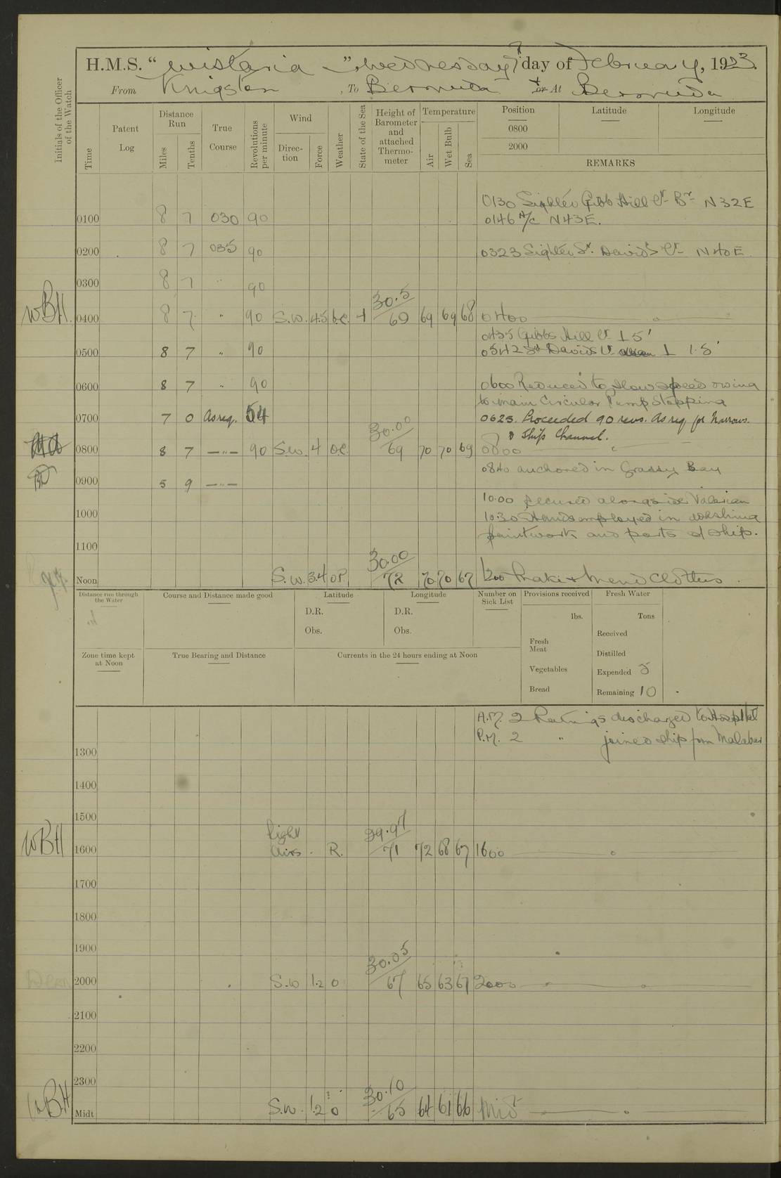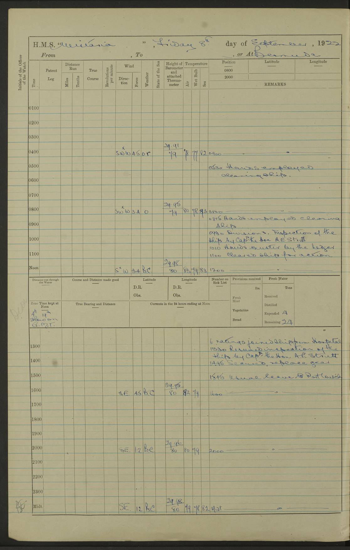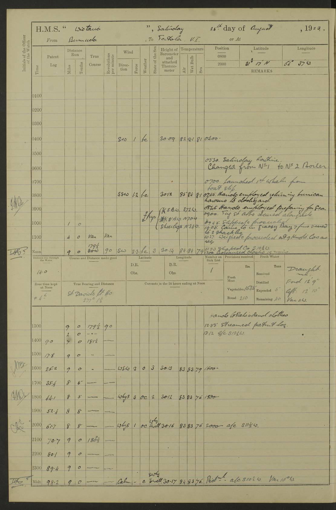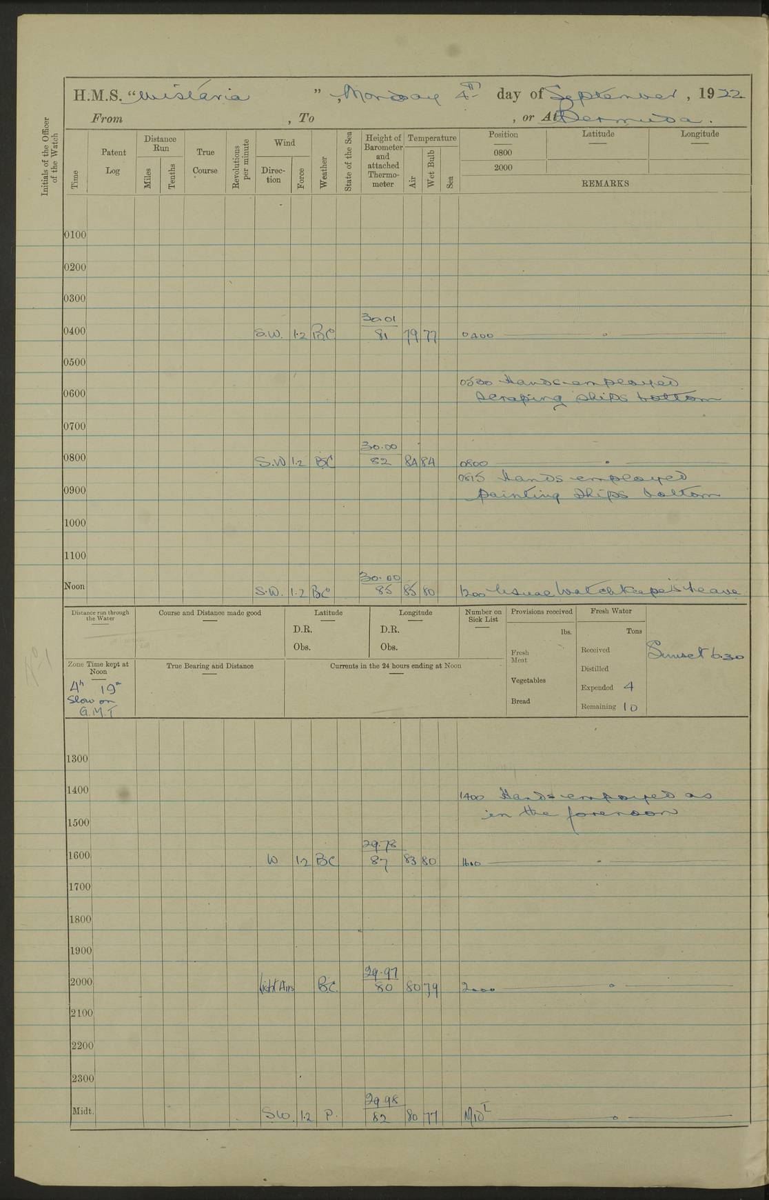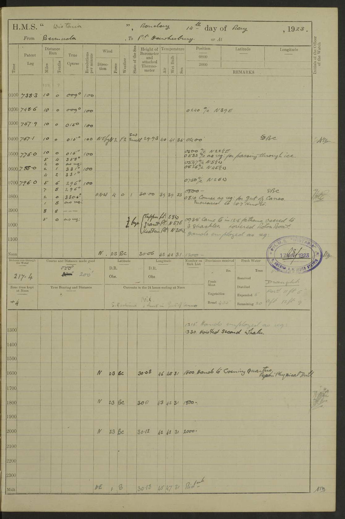 4f73caf5a2fc8ea903000c3b: (https://s3.amazonaws.com:443/oldweather/ADM53-93269/0003_1.jpg) 1 September 1922 At Bermuda Lat 32.32, Long -64.8 5.30am: Hands employed cleaning ship 8.15am: Hands employed ranging cable for survey Sunset 6.30 2.0pm: Hands employed scraping ship's bottom, and cleaning out cable lockers 4f73caf5a2fc8ea903000c3c: (https://s3.amazonaws.com:443/oldweather/ADM53-93269/0004_0.jpg) 2 September 1922 At Bermuda Lat 32.32, Long -64.8 5.30am: Hands employed cleaning ship 8.15am: Hands employed cleaning ship’s side pm: Commissioned Engineer discharged to hospital pm: 2 ratings joined ship from hospital 5.0pm: Exercised fires stations 4f73caf6a2fc8ea903000c3d: (https://s3.amazonaws.com:443/oldweather/ADM53-93269/0004_1.jpg) 3 September 1922 At Bermuda Lat 32.32, Long -64.8 6.0am: Hands employed cleaning ship (usual Sunday Routine) 8.0-8.45am: Hands clean up decks for Divisions 10.15am: Church of England Church party landed 6.0pm: Tested fire arrangements 4f73caf6a2fc8ea903000c3e: (https://s3.amazonaws.com:443/oldweather/ADM53-93269/0005_0.jpg) 4 September 1922 At Bermuda Lat 32.32, Long -64.8 5.30am: Hands employed scraping ship's bottom 8.15am: Hands employed painting ship's bottom 2.0pm: Hands employed as in the forenoon 4f73caf7a2fc8ea903000c3f: (https://s3.amazonaws.com:443/oldweather/ADM53-93269/0005_1.jpg) 5 September 1922 At Bermuda Lat 32.32, Long -64.8 5.30am: Hands employed painting ship's bottom 8.15am: Hands employed painting ship's bottom am: HMS “Valerian” came alongside in the South Basin am: 1 rating discharged to hospital 1.30pm: Hands employed as in forenoon 4f73caf7a2fc8ea903000c40: (https://s3.amazonaws.com:443/oldweather/ADM53-93269/0006_0.jpg) 6 September 1922 At Bermuda Lat 32.32, Long -64.8 5.40am: Hands employed painting ship's bottom am: 1 PO & 6 Hands employed stowing cable after survey 8.15am: Hands employed restowing cable and painting ship's bottom am: Leave to Engine room branch from 13.30-07.00 Port Watch 1 boatswains pipe lost by accident pm: Received 20 tons of boiled water 2.0pm: Hands employed restowing cable and painting ship's bottom 4f73caf7a2fc8ea903000c41: (https://s3.amazonaws.com:443/oldweather/ADM53-93269/0006_1.jpg) 7 September 1922 At Bermuda Lat 32.32, Long -64.8 6.30am: Hands employed cleaning ship 8.15am: Hands preparing for undocking ship 9.30am: Secured alongside by the sheerlegs am: Hands restowed ammunition 3.45pm: Exercised collision stations 4f73caf8a2fc8ea903000c42: (https://s3.amazonaws.com:443/oldweather/ADM53-93269/0007_0.jpg) 8 September 1922 At Bermuda Lat 32.32, Long -64.8 8.15am: Hands employed cleaning ship 9.30am: Divisions. Inspection of the ship by Captain the Hon. A. E. Strutt 10.10am: Hands muster by the ledger 11.0am: Cleared ship for action pm: 6 ratings joined ship from Hospital 1.30pm: Resumed inspection of the ship by Captain the Hon A. E. Strutt 2.45pm: Secured, replace gear [Captain the Honourable Arthur Charles Strutt] 4f73caf8a2fc8ea903000c43: (https://s3.amazonaws.com:443/oldweather/ADM53-93269/0007_1.jpg) 9 September 1922 From Bermuda to Halifax N.S., and at Bermuda Lat 32.32, Long -64.8 8.15am: Hands employed provisioning ship pm: 12 ratings discharged to HMS “Dartmouth” pm: 18 ratings joined ship pm: Received 7 tons of boiler water 2.0pm: Hands employed securing ship for sea 4.0pm: Slipped from Jetty & proceeded out 4.15pm: Stopped in Grassy Bay, and hoisted motor boat 4.30pm: Proceeded at 96 revs. Co as requisite for Ship Channel and Narrows 5.49pm: Fairway buoy abeam. Course East 6.04pm: Mills Breaker buoy abeam, 8 cables 6.19pm: Kitchen Shoals buoy abeam, 1 mile 6.35pm: Streamed log [Mills Breaker buoy coordinates: Lat 32 23.9N, Long 64 36.9W] [Kitchen Shoal beacon coordinates: Lat 32 26.1N, Long 64 37.6W] 4f73caf8a2fc8ea903000c44: (https://s3.amazonaws.com:443/oldweather/ADM53-93269/0008_0.jpg) 10 September 1922 From Bermuda to Halifax Lat 35.06, Long -64.5 9.45am: Divisions & Prayers pm: Usual Sunday Routine 4.05pm: Hauled in, cleaned & streamed patent log 5.0pm: Put clocks on 20 minutes 5.30pm: Exercised sounding party True Bearing and Distance: Chebucto Head 004°½, 566 miles 4f73caf9a2fc8ea903000c45: (https://s3.amazonaws.com:443/oldweather/ADM53-93269/0008_1.jpg) 11 September 1922 From Bermuda to Halifax Lat 38.88, Long -64.3 3.0am: Within strong W/T touch with “Cape Town” 5.25am: Spoke “Cape Town” am: Divisions & Prayers, Exercised action am: Exchanged names with British Steamer “San Valerio”, Eagle Oil Co. Lat 38 35N, Long 63 55W 10.10am: Secure pm: Hands employed painting lower boom gear & waterways & cleaning out 2nd whaler 4.50pm: Exercised sounding party 5.0pm: Put clocks on ½ hour 10.10pm: Stopped engines, helm jammed 10.12pm: Hauled in patent log 10.35pm: Resumed Co & speed; hand wheel connected up. Course below NNE 10.45pm: Streamed patent log True Bearing and Distance: Chebucto Head 005°, 332 miles 4f73caf9a2fc8ea903000c46: (https://s3.amazonaws.com:443/oldweather/ADM53-93269/0009_0.jpg) 12 September 1922 From Bermuda to Halifax Lat 42.85, Long -63.81 am: Steering by hand 9.45am: Ord Seamen & Boys to 4” instruction pm: 1 hand scrubber lost by accident pm: 1 whalers oar lost by accident 5.0pm: Altered course N36E (steering NNE½E). Put clocks on 1/2 hour 8.15pm: Sighted Sambro Lt bearing N20E 8.40pm: Sighted Chebucto Head Lt bearing N18E 9.27pm: Sambro Lt buoy abeam, 2 miles 10.07pm: Sambro Lt abeam 10.10pm: Chebucto Lt abeam 10.20pm: Hauled in Patent log 11.20pm: Mauger Beach Lt abeam 11.52pm: Let go off No 4 wharf with 2½ shackles True Bearing and Distance: Chebucto Head 007, 100 miles 4f73cafaa2fc8ea903000c47: (https://s3.amazonaws.com:443/oldweather/ADM53-93269/0009_1.jpg) 13 September 1922 At Halifax Lat 44.69, Long -63.64 7.0am: Ship wharped alongside No 4 pier 8.0am: Hands prepare for coaling 8.45am: Hands coal ship 9.0am: Clocks put back 1 hour 12.30pm: Hands coal ship pm: 26 tons boiler water received 2.25pm: Finished coaling 4f73cafaa2fc