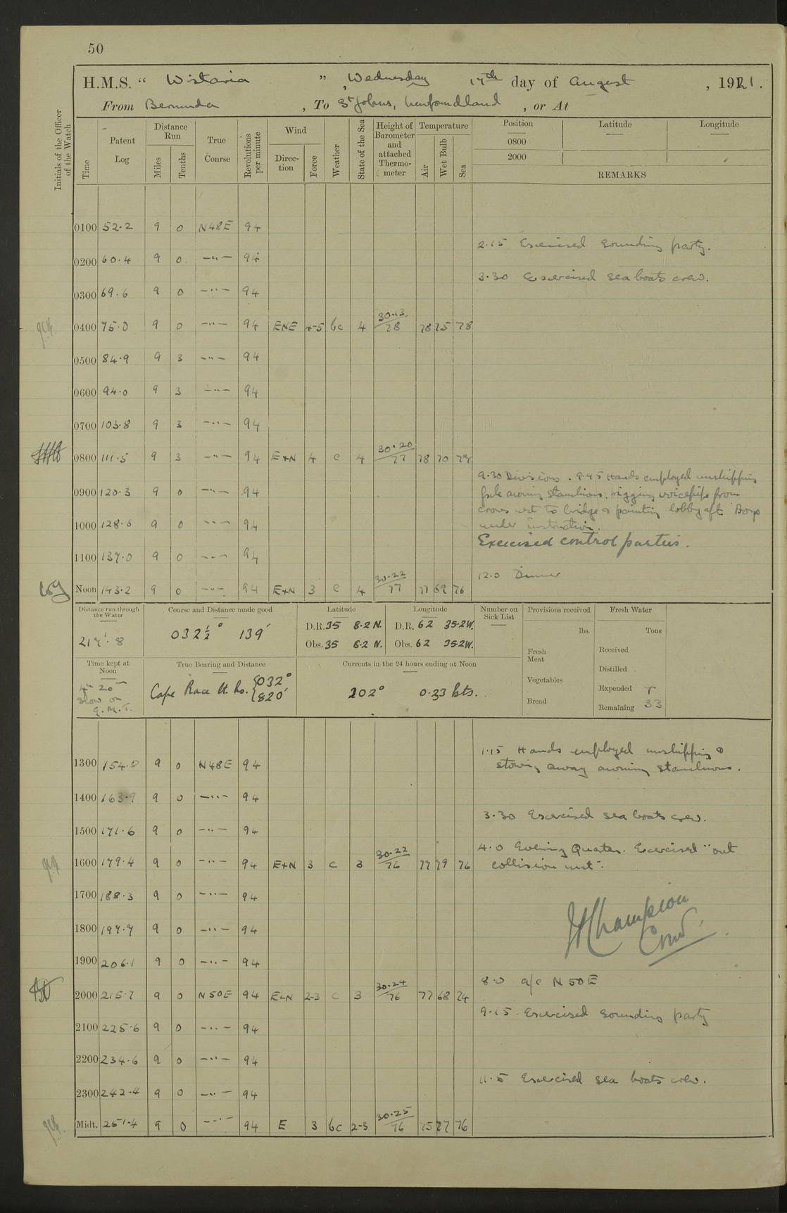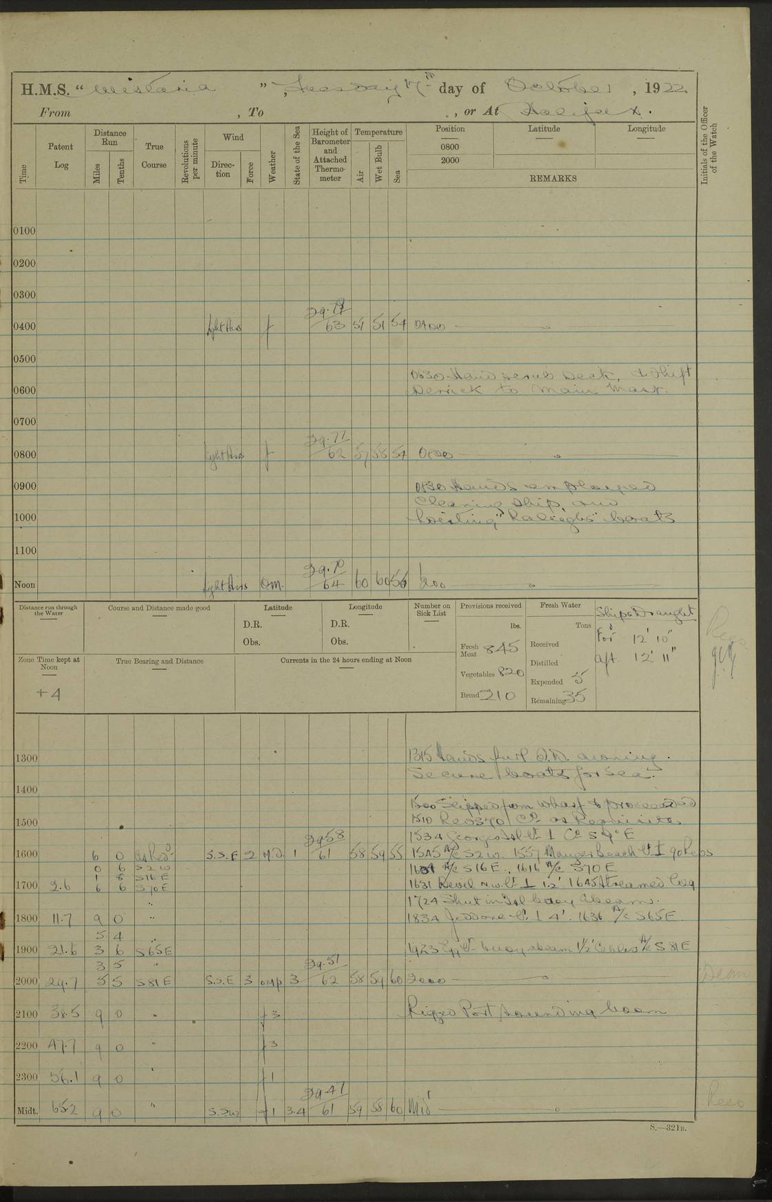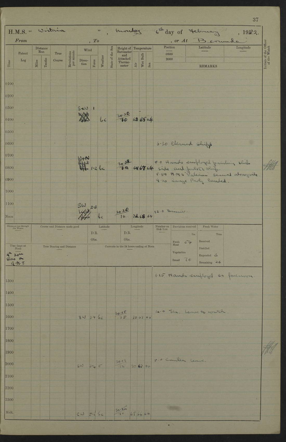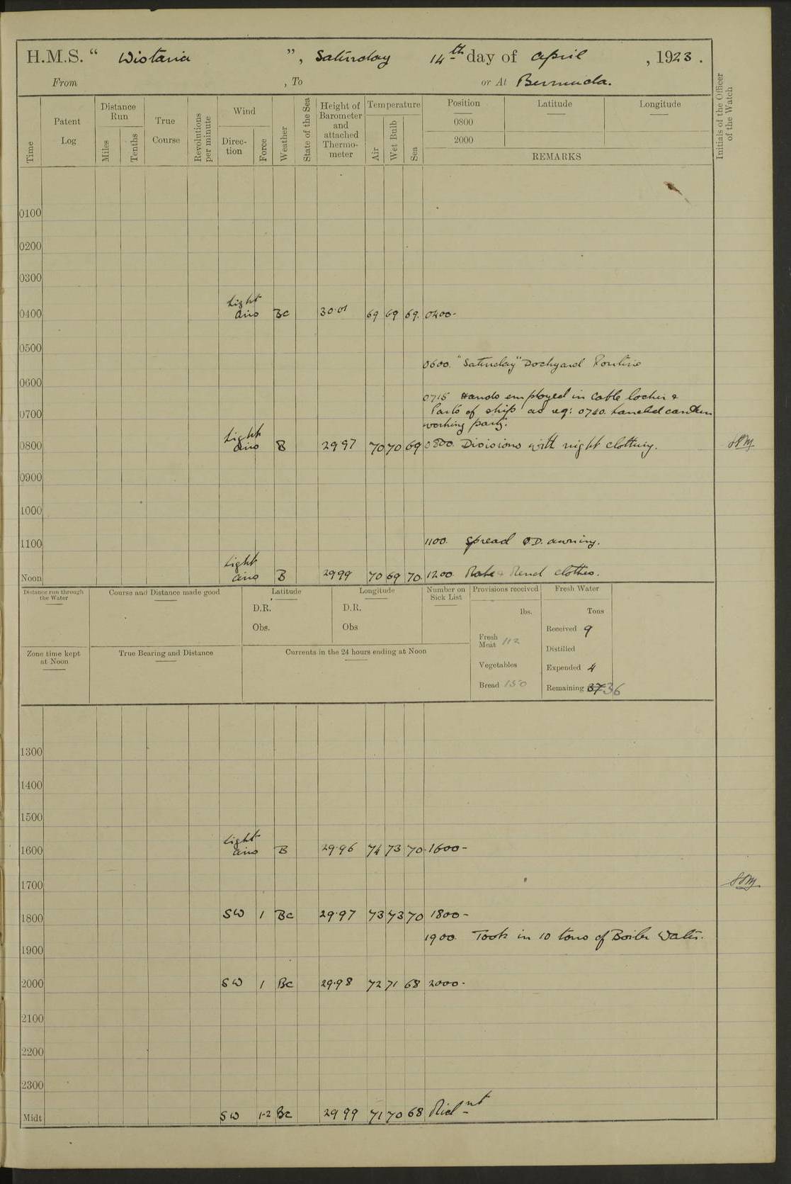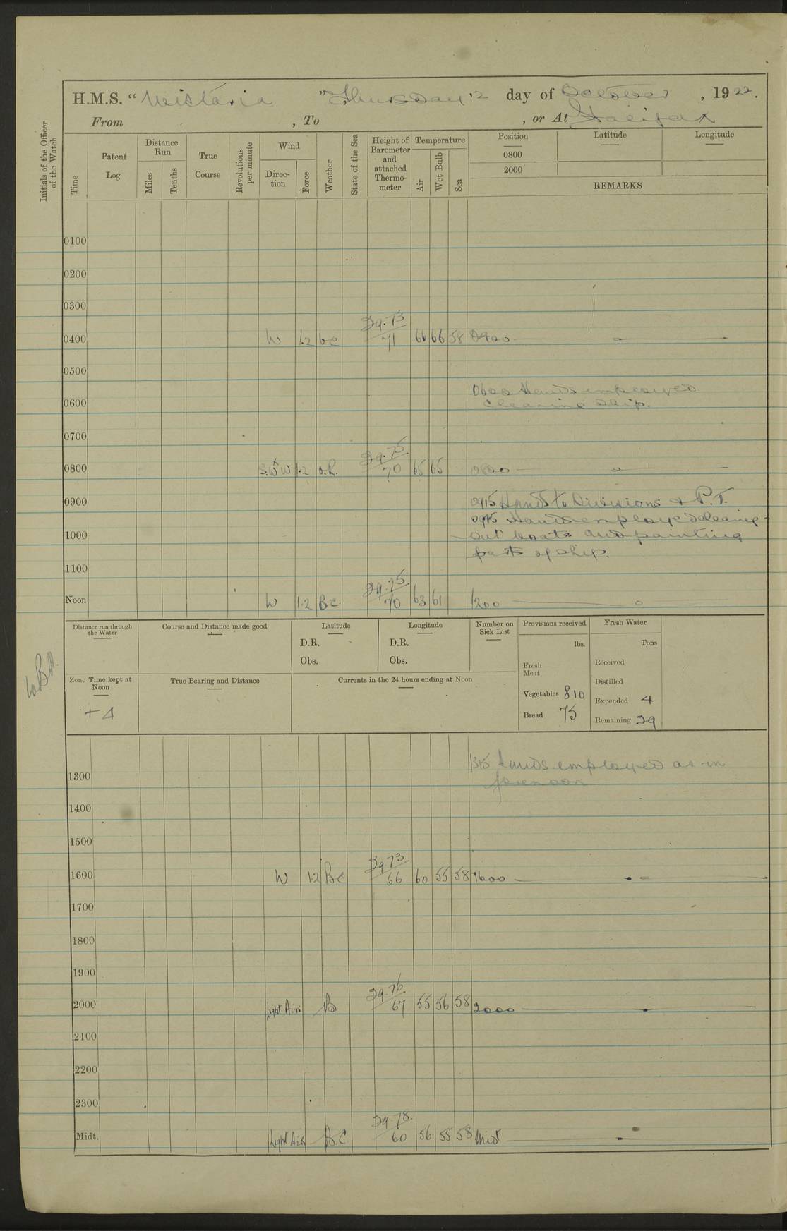 4f73caf5a2fc8ea903000c3b: (https://s3.amazonaws.com:443/oldweather/ADM53-93269/0003_1.jpg) 1 September 1922 At Bermuda Lat 32.32, Long -64.8 5.30am: Hands employed cleaning ship 8.15am: Hands employed ranging cable for survey Sunset 6.30 2.0pm: Hands employed scraping ship's bottom, and cleaning out cable lockers 4f73caf5a2fc8ea903000c3c: (https://s3.amazonaws.com:443/oldweather/ADM53-93269/0004_0.jpg) 2 September 1922 At Bermuda Lat 32.32, Long -64.8 5.30am: Hands employed cleaning ship 8.15am: Hands employed cleaning ship’s side pm: Commissioned Engineer discharged to hospital pm: 2 ratings joined ship from hospital 5.0pm: Exercised fires stations 4f73caf6a2fc8ea903000c3d: (https://s3.amazonaws.com:443/oldweather/ADM53-93269/0004_1.jpg) 3 September 1922 At Bermuda Lat 32.32, Long -64.8 6.0am: Hands employed cleaning ship (usual Sunday Routine) 8.0-8.45am: Hands clean up decks for Divisions 10.15am: Church of England Church party landed 6.0pm: Tested fire arrangements 4f73caf6a2fc8ea903000c3e: (https://s3.amazonaws.com:443/oldweather/ADM53-93269/0005_0.jpg) 4 September 1922 At Bermuda Lat 32.32, Long -64.8 5.30am: Hands employed scraping ship's bottom 8.15am: Hands employed painting ship's bottom 2.0pm: Hands employed as in the forenoon 4f73caf7a2fc8ea903000c3f: (https://s3.amazonaws.com:443/oldweather/ADM53-93269/0005_1.jpg) 5 September 1922 At Bermuda Lat 32.32, Long -64.8 5.30am: Hands employed painting ship's bottom 8.15am: Hands employed painting ship's bottom am: HMS “Valerian” came alongside in the South Basin am: 1 rating discharged to hospital 1.30pm: Hands employed as in forenoon 4f73caf7a2fc8ea903000c40: (https://s3.amazonaws.com:443/oldweather/ADM53-93269/0006_0.jpg) 6 September 1922 At Bermuda Lat 32.32, Long -64.8 5.40am: Hands employed painting ship's bottom am: 1 PO & 6 Hands employed stowing cable after survey 8.15am: Hands employed restowing cable and painting ship's bottom am: Leave to Engine room branch from 13.30-07.00 Port Watch 1 boatswains pipe lost by accident pm: Received 20 tons of boiled water 2.0pm: Hands employed restowing cable and painting ship's bottom 4f73caf7a2fc8ea903000c41: (https://s3.amazonaws.com:443/oldweather/ADM53-93269/0006_1.jpg) 7 September 1922 At Bermuda Lat 32.32, Long -64.8 6.30am: Hands employed cleaning ship 8.15am: Hands preparing for undocking ship 9.30am: Secured alongside by the sheerlegs am: Hands restowed ammunition 3.45pm: Exercised collision stations 4f73caf8a2fc8ea903000c42: (https://s3.amazonaws.com:443/oldweather/ADM53-93269/0007_0.jpg) 8 September 1922 At Bermuda Lat 32.32, Long -64.8 8.15am: Hands employed cleaning ship 9.30am: Divisions. Inspection of the ship by Captain the Hon. A. E. Strutt 10.10am: Hands muster by the ledger 11.0am: Cleared ship for action pm: 6 ratings joined ship from Hospital 1.30pm: Resumed inspection of the ship by Captain the Hon A. E. Strutt 2.45pm: Secured, replace gear [Captain the Honourable Arthur Charles Strutt] 4f73caf8a2fc8ea903000c43: (https://s3.amazonaws.com:443/oldweather/ADM53-93269/0007_1.jpg) 9 September 1922 From Bermuda to Halifax N.S., and at Bermuda Lat 32.32, Long -64.8 8.15am: Hands employed provisioning ship pm: 12 ratings discharged to HMS “Dartmouth” pm: 18 ratings joined ship pm: Received 7 tons of boiler water 2.0pm: Hands employed securing ship for sea 4.0pm: Slipped from Jetty & proceeded out 4.15pm: Stopped in Grassy Bay, and hoisted motor boat 4.30pm: Proceeded at 96 revs. Co as requisite for Ship Channel and Narrows 5.49pm: Fairway buoy abeam. Course East 6.04pm: Mills Breaker buoy abeam, 8 cables 6.19pm: Kitchen Shoals buoy abeam, 1 mile 6.35pm: Streamed log [Mills Breaker buoy coordinates: Lat 32 23.9N, Long 64 36.9W] [Kitchen Shoal beacon coordinates: Lat 32 26.1N, Long 64 37.6W] 4f73caf8a2fc8ea903000c44: (https://s3.amazonaws.com:443/oldweather/ADM53-93269/0008_0.jpg) 10 September 1922 From Bermuda to Halifax Lat 35.06, Long -64.5 9.45am: Divisions & Prayers pm: Usual Sunday Routine 4.05pm: Hauled in, cleaned & streamed patent log 5.0pm: Put clocks on 20 minutes 5.30pm: Exercised sounding party True Bearing and Distance: Chebucto Head 004°½, 566 miles 4f73caf9a2fc8ea903000c45: (https://s3.amazonaws.com:443/oldweather/ADM53-93269/0008_1.jpg) 11 September 1922 From Bermuda to Halifax Lat 38.88, Long -64.3 3.0am: Within strong W/T touch with “Cape Town” 5.25am: Spoke “Cape Town” am: Divisions & Prayers, Exercised action am: Exchanged names with British Steamer “San Valerio”, Eagle Oil Co. Lat 38 35N, Long 63 55W 10.10am: Secure pm: Hands employed painting lower boom gear & waterways & cleaning out 2nd whaler 4.50pm: Exercised sounding party 5.0pm: Put clocks on ½ hour 10.10pm: Stopped engines, helm jammed 10.12pm: Hauled in patent log 10.35pm: Resumed Co & speed; hand wheel connected up. Course below NNE 10.45pm: Streamed patent log True Bearing and Distance: Chebucto Head 005°, 332 miles 4f73caf9a2fc8ea903000c46: (https://s3.amazonaws.com:443/oldweather/ADM53-93269/0009_0.jpg) 12 September 1922 From Bermuda to Halifax Lat 42.85, Long -63.81 am: Steering by hand 9.45am: Ord Seamen & Boys to 4” instruction pm: 1 hand scrubber lost by accident pm: 1 whalers oar lost by accident 5.0pm: Altered course N36E (steering NNE½E). Put clocks on 1/2 hour 8.15pm: Sighted Sambro Lt bearing N20E 8.40pm: Sighted Chebucto Head Lt bearing N18E 9.27pm: Sambro Lt buoy abeam, 2 miles 10.07pm: Sambro Lt abeam 10.10pm: Chebucto Lt abeam 10.20pm: Hauled in Patent log 11.20pm: Mauger Beach Lt abeam 11.52pm: Let go off No 4 wharf with 2½ shackles True Bearing and Distance: Chebucto Head 007, 100 miles 4f73cafaa2fc8ea903000c47: (https://s3.amazonaws.com:443/oldweather/ADM53-93269/0009_1.jpg) 13 September 1922 At Halifax Lat 44.69, Long -63.64 7.0am: Ship wharped alongside No 4 pier 8.0am: Hands prepare for coaling 8.45am: Hands coal ship 9.0am: Clocks put back 1 hour 12.30pm: Hands coal ship pm: 26 tons boiler water received 2.25pm: Finished coaling 4f73cafaa2fc