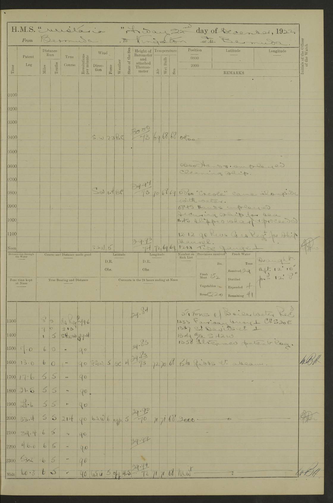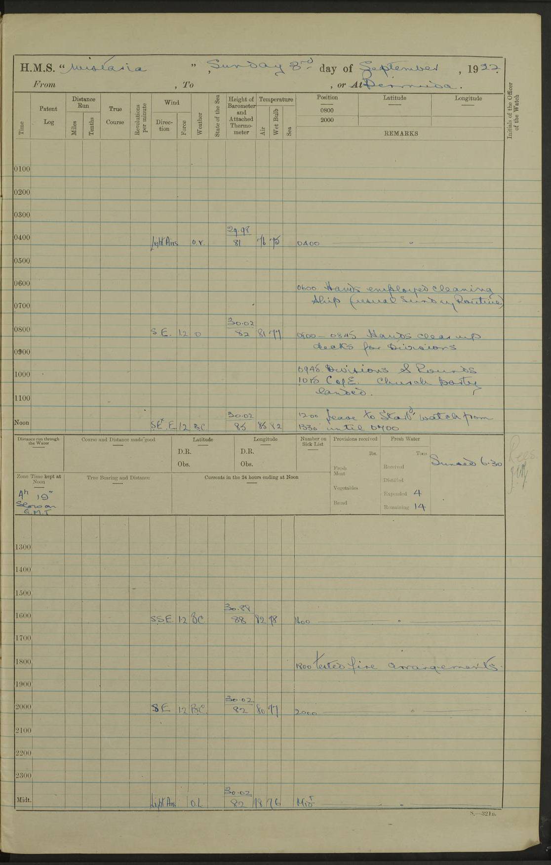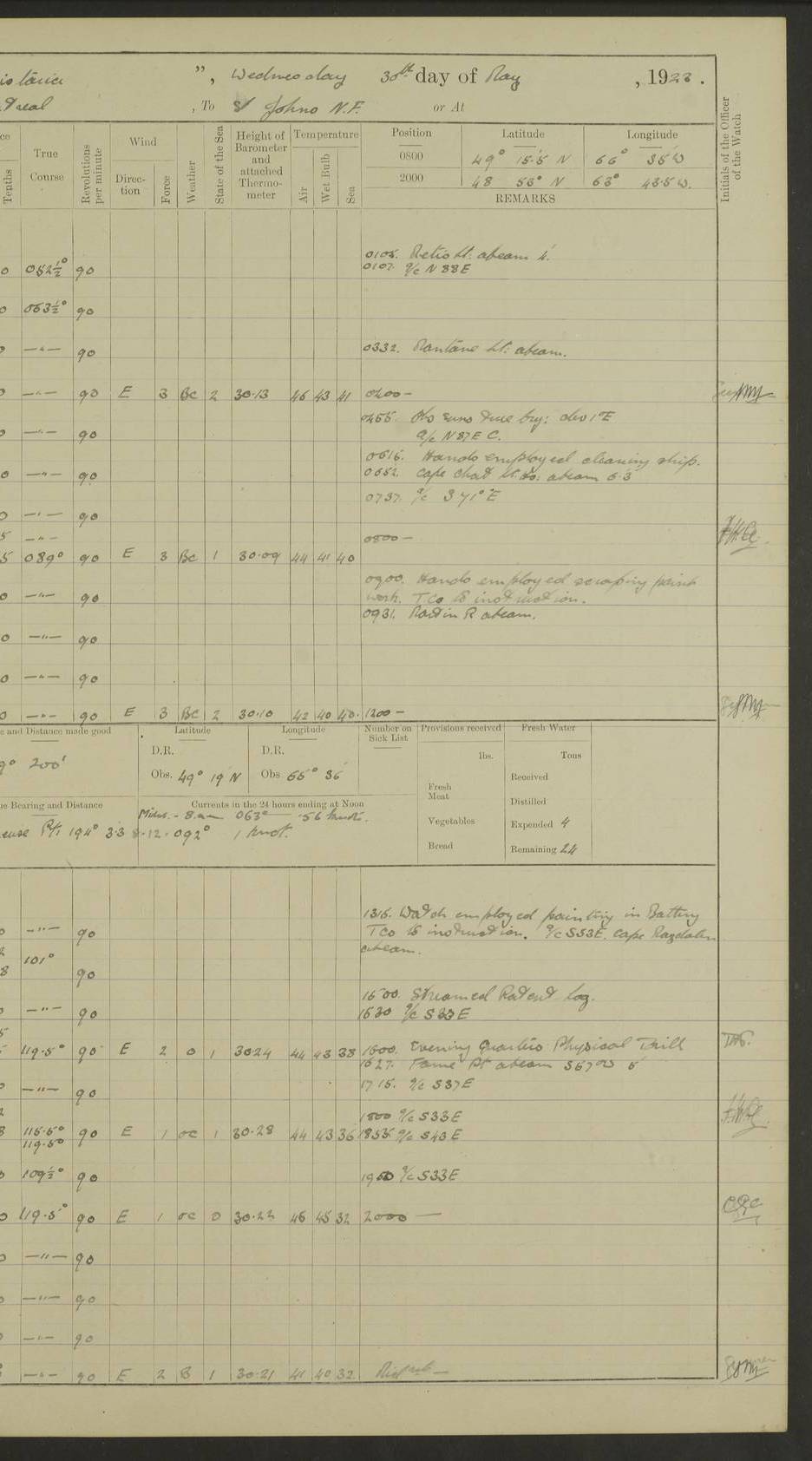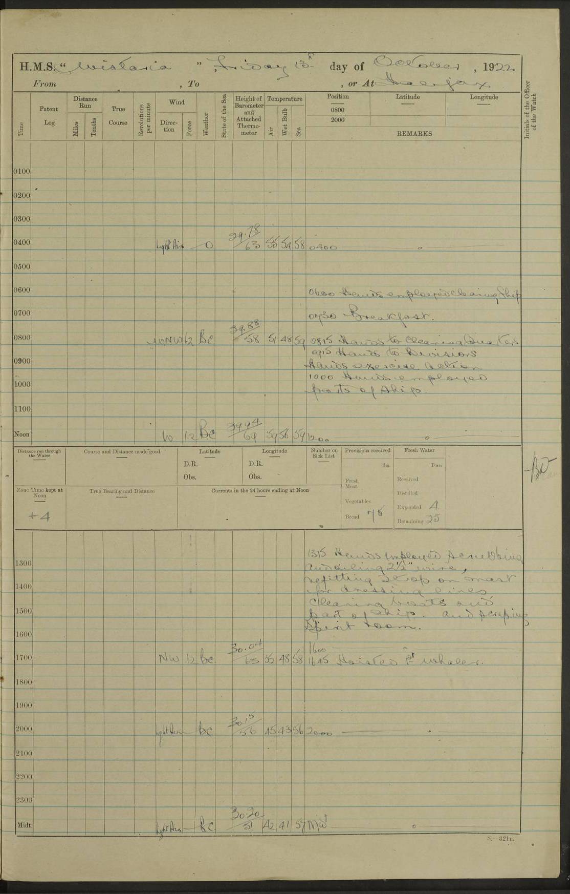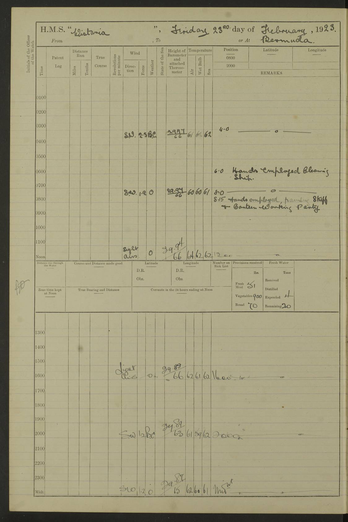 4f73caf5a2fc8ea903000c3b: (https://s3.amazonaws.com:443/oldweather/ADM53-93269/0003_1.jpg) 1 September 1922 At Bermuda Lat 32.32, Long -64.8 5.30am: Hands employed cleaning ship 8.15am: Hands employed ranging cable for survey Sunset 6.30 2.0pm: Hands employed scraping ship's bottom, and cleaning out cable lockers 4f73caf5a2fc8ea903000c3c: (https://s3.amazonaws.com:443/oldweather/ADM53-93269/0004_0.jpg) 2 September 1922 At Bermuda Lat 32.32, Long -64.8 5.30am: Hands employed cleaning ship 8.15am: Hands employed cleaning ship’s side pm: Commissioned Engineer discharged to hospital pm: 2 ratings joined ship from hospital 5.0pm: Exercised fires stations 4f73caf6a2fc8ea903000c3d: (https://s3.amazonaws.com:443/oldweather/ADM53-93269/0004_1.jpg) 3 September 1922 At Bermuda Lat 32.32, Long -64.8 6.0am: Hands employed cleaning ship (usual Sunday Routine) 8.0-8.45am: Hands clean up decks for Divisions 10.15am: Church of England Church party landed 6.0pm: Tested fire arrangements 4f73caf6a2fc8ea903000c3e: (https://s3.amazonaws.com:443/oldweather/ADM53-93269/0005_0.jpg) 4 September 1922 At Bermuda Lat 32.32, Long -64.8 5.30am: Hands employed scraping ship's bottom 8.15am: Hands employed painting ship's bottom 2.0pm: Hands employed as in the forenoon 4f73caf7a2fc8ea903000c3f: (https://s3.amazonaws.com:443/oldweather/ADM53-93269/0005_1.jpg) 5 September 1922 At Bermuda Lat 32.32, Long -64.8 5.30am: Hands employed painting ship's bottom 8.15am: Hands employed painting ship's bottom am: HMS “Valerian” came alongside in the South Basin am: 1 rating discharged to hospital 1.30pm: Hands employed as in forenoon 4f73caf7a2fc8ea903000c40: (https://s3.amazonaws.com:443/oldweather/ADM53-93269/0006_0.jpg) 6 September 1922 At Bermuda Lat 32.32, Long -64.8 5.40am: Hands employed painting ship's bottom am: 1 PO & 6 Hands employed stowing cable after survey 8.15am: Hands employed restowing cable and painting ship's bottom am: Leave to Engine room branch from 13.30-07.00 Port Watch 1 boatswains pipe lost by accident pm: Received 20 tons of boiled water 2.0pm: Hands employed restowing cable and painting ship's bottom 4f73caf7a2fc8ea903000c41: (https://s3.amazonaws.com:443/oldweather/ADM53-93269/0006_1.jpg) 7 September 1922 At Bermuda Lat 32.32, Long -64.8 6.30am: Hands employed cleaning ship 8.15am: Hands preparing for undocking ship 9.30am: Secured alongside by the sheerlegs am: Hands restowed ammunition 3.45pm: Exercised collision stations 4f73caf8a2fc8ea903000c42: (https://s3.amazonaws.com:443/oldweather/ADM53-93269/0007_0.jpg) 8 September 1922 At Bermuda Lat 32.32, Long -64.8 8.15am: Hands employed cleaning ship 9.30am: Divisions. Inspection of the ship by Captain the Hon. A. E. Strutt 10.10am: Hands muster by the ledger 11.0am: Cleared ship for action pm: 6 ratings joined ship from Hospital 1.30pm: Resumed inspection of the ship by Captain the Hon A. E. Strutt 2.45pm: Secured, replace gear [Captain the Honourable Arthur Charles Strutt] 4f73caf8a2fc8ea903000c43: (https://s3.amazonaws.com:443/oldweather/ADM53-93269/0007_1.jpg) 9 September 1922 From Bermuda to Halifax N.S., and at Bermuda Lat 32.32, Long -64.8 8.15am: Hands employed provisioning ship pm: 12 ratings discharged to HMS “Dartmouth” pm: 18 ratings joined ship pm: Received 7 tons of boiler water 2.0pm: Hands employed securing ship for sea 4.0pm: Slipped from Jetty & proceeded out 4.15pm: Stopped in Grassy Bay, and hoisted motor boat 4.30pm: Proceeded at 96 revs. Co as requisite for Ship Channel and Narrows 5.49pm: Fairway buoy abeam. Course East 6.04pm: Mills Breaker buoy abeam, 8 cables 6.19pm: Kitchen Shoals buoy abeam, 1 mile 6.35pm: Streamed log [Mills Breaker buoy coordinates: Lat 32 23.9N, Long 64 36.9W] [Kitchen Shoal beacon coordinates: Lat 32 26.1N, Long 64 37.6W] 4f73caf8a2fc8ea903000c44: (https://s3.amazonaws.com:443/oldweather/ADM53-93269/0008_0.jpg) 10 September 1922 From Bermuda to Halifax Lat 35.06, Long -64.5 9.45am: Divisions & Prayers pm: Usual Sunday Routine 4.05pm: Hauled in, cleaned & streamed patent log 5.0pm: Put clocks on 20 minutes 5.30pm: Exercised sounding party True Bearing and Distance: Chebucto Head 004°½, 566 miles 4f73caf9a2fc8ea903000c45: (https://s3.amazonaws.com:443/oldweather/ADM53-93269/0008_1.jpg) 11 September 1922 From Bermuda to Halifax Lat 38.88, Long -64.3 3.0am: Within strong W/T touch with “Cape Town” 5.25am: Spoke “Cape Town” am: Divisions & Prayers, Exercised action am: Exchanged names with British Steamer “San Valerio”, Eagle Oil Co. Lat 38 35N, Long 63 55W 10.10am: Secure pm: Hands employed painting lower boom gear & waterways & cleaning out 2nd whaler 4.50pm: Exercised sounding party 5.0pm: Put clocks on ½ hour 10.10pm: Stopped engines, helm jammed 10.12pm: Hauled in patent log 10.35pm: Resumed Co & speed; hand wheel connected up. Course below NNE 10.45pm: Streamed patent log True Bearing and Distance: Chebucto Head 005°, 332 miles 4f73caf9a2fc8ea903000c46: (https://s3.amazonaws.com:443/oldweather/ADM53-93269/0009_0.jpg) 12 September 1922 From Bermuda to Halifax Lat 42.85, Long -63.81 am: Steering by hand 9.45am: Ord Seamen & Boys to 4” instruction pm: 1 hand scrubber lost by accident pm: 1 whalers oar lost by accident 5.0pm: Altered course N36E (steering NNE½E). Put clocks on 1/2 hour 8.15pm: Sighted Sambro Lt bearing N20E 8.40pm: Sighted Chebucto Head Lt bearing N18E 9.27pm: Sambro Lt buoy abeam, 2 miles 10.07pm: Sambro Lt abeam 10.10pm: Chebucto Lt abeam 10.20pm: Hauled in Patent log 11.20pm: Mauger Beach Lt abeam 11.52pm: Let go off No 4 wharf with 2½ shackles True Bearing and Distance: Chebucto Head 007, 100 miles 4f73cafaa2fc8ea903000c47: (https://s3.amazonaws.com:443/oldweather/ADM53-93269/0009_1.jpg) 13 September 1922 At Halifax Lat 44.69, Long -63.64 7.0am: Ship wharped alongside No 4 pier 8.0am: Hands prepare for coaling 8.45am: Hands coal ship 9.0am: Clocks put back 1 hour 12.30pm: Hands coal ship pm: 26 tons boiler water received 2.25pm: Finished coaling 4f73cafaa2fc