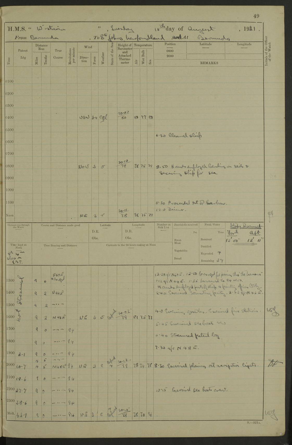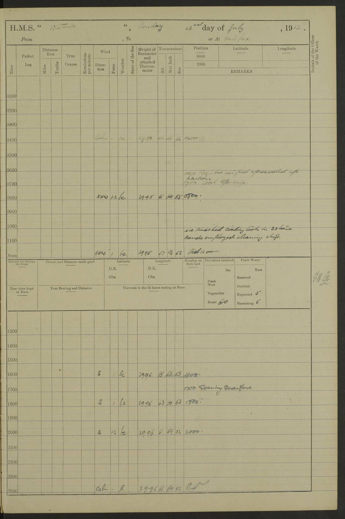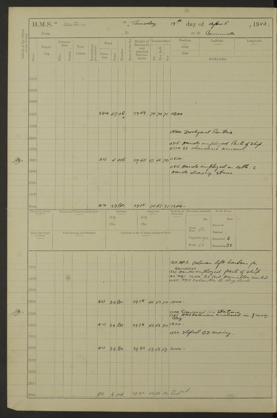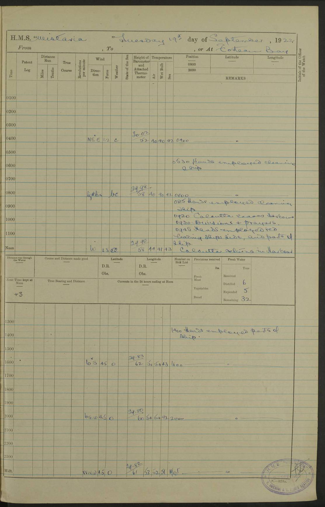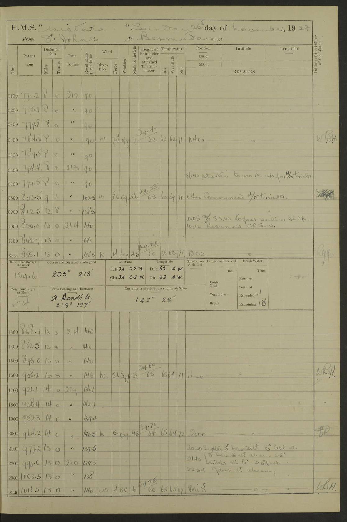 4f73caf5a2fc8ea903000c3b: (https://s3.amazonaws.com:443/oldweather/ADM53-93269/0003_1.jpg) 1 September 1922 At Bermuda Lat 32.32, Long -64.8 5.30am: Hands employed cleaning ship 8.15am: Hands employed ranging cable for survey Sunset 6.30 2.0pm: Hands employed scraping ship's bottom, and cleaning out cable lockers 4f73caf5a2fc8ea903000c3c: (https://s3.amazonaws.com:443/oldweather/ADM53-93269/0004_0.jpg) 2 September 1922 At Bermuda Lat 32.32, Long -64.8 5.30am: Hands employed cleaning ship 8.15am: Hands employed cleaning ship’s side pm: Commissioned Engineer discharged to hospital pm: 2 ratings joined ship from hospital 5.0pm: Exercised fires stations 4f73caf6a2fc8ea903000c3d: (https://s3.amazonaws.com:443/oldweather/ADM53-93269/0004_1.jpg) 3 September 1922 At Bermuda Lat 32.32, Long -64.8 6.0am: Hands employed cleaning ship (usual Sunday Routine) 8.0-8.45am: Hands clean up decks for Divisions 10.15am: Church of England Church party landed 6.0pm: Tested fire arrangements 4f73caf6a2fc8ea903000c3e: (https://s3.amazonaws.com:443/oldweather/ADM53-93269/0005_0.jpg) 4 September 1922 At Bermuda Lat 32.32, Long -64.8 5.30am: Hands employed scraping ship's bottom 8.15am: Hands employed painting ship's bottom 2.0pm: Hands employed as in the forenoon 4f73caf7a2fc8ea903000c3f: (https://s3.amazonaws.com:443/oldweather/ADM53-93269/0005_1.jpg) 5 September 1922 At Bermuda Lat 32.32, Long -64.8 5.30am: Hands employed painting ship's bottom 8.15am: Hands employed painting ship's bottom am: HMS “Valerian” came alongside in the South Basin am: 1 rating discharged to hospital 1.30pm: Hands employed as in forenoon 4f73caf7a2fc8ea903000c40: (https://s3.amazonaws.com:443/oldweather/ADM53-93269/0006_0.jpg) 6 September 1922 At Bermuda Lat 32.32, Long -64.8 5.40am: Hands employed painting ship's bottom am: 1 PO & 6 Hands employed stowing cable after survey 8.15am: Hands employed restowing cable and painting ship's bottom am: Leave to Engine room branch from 13.30-07.00 Port Watch 1 boatswains pipe lost by accident pm: Received 20 tons of boiled water 2.0pm: Hands employed restowing cable and painting ship's bottom 4f73caf7a2fc8ea903000c41: (https://s3.amazonaws.com:443/oldweather/ADM53-93269/0006_1.jpg) 7 September 1922 At Bermuda Lat 32.32, Long -64.8 6.30am: Hands employed cleaning ship 8.15am: Hands preparing for undocking ship 9.30am: Secured alongside by the sheerlegs am: Hands restowed ammunition 3.45pm: Exercised collision stations 4f73caf8a2fc8ea903000c42: (https://s3.amazonaws.com:443/oldweather/ADM53-93269/0007_0.jpg) 8 September 1922 At Bermuda Lat 32.32, Long -64.8 8.15am: Hands employed cleaning ship 9.30am: Divisions. Inspection of the ship by Captain the Hon. A. E. Strutt 10.10am: Hands muster by the ledger 11.0am: Cleared ship for action pm: 6 ratings joined ship from Hospital 1.30pm: Resumed inspection of the ship by Captain the Hon A. E. Strutt 2.45pm: Secured, replace gear [Captain the Honourable Arthur Charles Strutt] 4f73caf8a2fc8ea903000c43: (https://s3.amazonaws.com:443/oldweather/ADM53-93269/0007_1.jpg) 9 September 1922 From Bermuda to Halifax N.S., and at Bermuda Lat 32.32, Long -64.8 8.15am: Hands employed provisioning ship pm: 12 ratings discharged to HMS “Dartmouth” pm: 18 ratings joined ship pm: Received 7 tons of boiler water 2.0pm: Hands employed securing ship for sea 4.0pm: Slipped from Jetty & proceeded out 4.15pm: Stopped in Grassy Bay, and hoisted motor boat 4.30pm: Proceeded at 96 revs. Co as requisite for Ship Channel and Narrows 5.49pm: Fairway buoy abeam. Course East 6.04pm: Mills Breaker buoy abeam, 8 cables 6.19pm: Kitchen Shoals buoy abeam, 1 mile 6.35pm: Streamed log [Mills Breaker buoy coordinates: Lat 32 23.9N, Long 64 36.9W] [Kitchen Shoal beacon coordinates: Lat 32 26.1N, Long 64 37.6W] 4f73caf8a2fc8ea903000c44: (https://s3.amazonaws.com:443/oldweather/ADM53-93269/0008_0.jpg) 10 September 1922 From Bermuda to Halifax Lat 35.06, Long -64.5 9.45am: Divisions & Prayers pm: Usual Sunday Routine 4.05pm: Hauled in, cleaned & streamed patent log 5.0pm: Put clocks on 20 minutes 5.30pm: Exercised sounding party True Bearing and Distance: Chebucto Head 004°½, 566 miles 4f73caf9a2fc8ea903000c45: (https://s3.amazonaws.com:443/oldweather/ADM53-93269/0008_1.jpg) 11 September 1922 From Bermuda to Halifax Lat 38.88, Long -64.3 3.0am: Within strong W/T touch with “Cape Town” 5.25am: Spoke “Cape Town” am: Divisions & Prayers, Exercised action am: Exchanged names with British Steamer “San Valerio”, Eagle Oil Co. Lat 38 35N, Long 63 55W 10.10am: Secure pm: Hands employed painting lower boom gear & waterways & cleaning out 2nd whaler 4.50pm: Exercised sounding party 5.0pm: Put clocks on ½ hour 10.10pm: Stopped engines, helm jammed 10.12pm: Hauled in patent log 10.35pm: Resumed Co & speed; hand wheel connected up. Course below NNE 10.45pm: Streamed patent log True Bearing and Distance: Chebucto Head 005°, 332 miles 4f73caf9a2fc8ea903000c46: (https://s3.amazonaws.com:443/oldweather/ADM53-93269/0009_0.jpg) 12 September 1922 From Bermuda to Halifax Lat 42.85, Long -63.81 am: Steering by hand 9.45am: Ord Seamen & Boys to 4” instruction pm: 1 hand scrubber lost by accident pm: 1 whalers oar lost by accident 5.0pm: Altered course N36E (steering NNE½E). Put clocks on 1/2 hour 8.15pm: Sighted Sambro Lt bearing N20E 8.40pm: Sighted Chebucto Head Lt bearing N18E 9.27pm: Sambro Lt buoy abeam, 2 miles 10.07pm: Sambro Lt abeam 10.10pm: Chebucto Lt abeam 10.20pm: Hauled in Patent log 11.20pm: Mauger Beach Lt abeam 11.52pm: Let go off No 4 wharf with 2½ shackles True Bearing and Distance: Chebucto Head 007, 100 miles 4f73cafaa2fc8ea903000c47: (https://s3.amazonaws.com:443/oldweather/ADM53-93269/0009_1.jpg) 13 September 1922 At Halifax Lat 44.69, Long -63.64 7.0am: Ship wharped alongside No 4 pier 8.0am: Hands prepare for coaling 8.45am: Hands coal ship 9.0am: Clocks put back 1 hour 12.30pm: Hands coal ship pm: 26 tons boiler water received 2.25pm: Finished coaling 4f73cafaa2fc