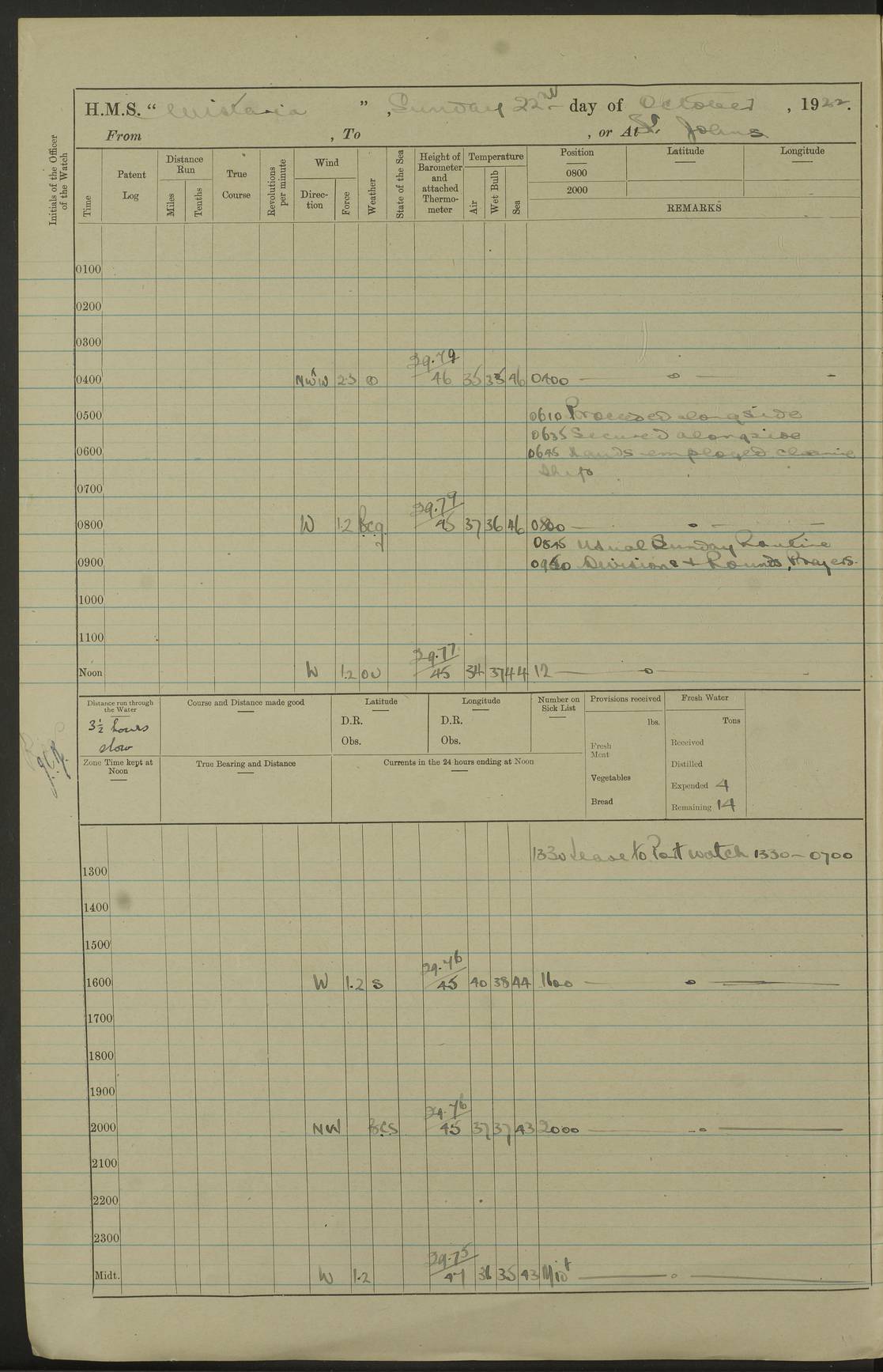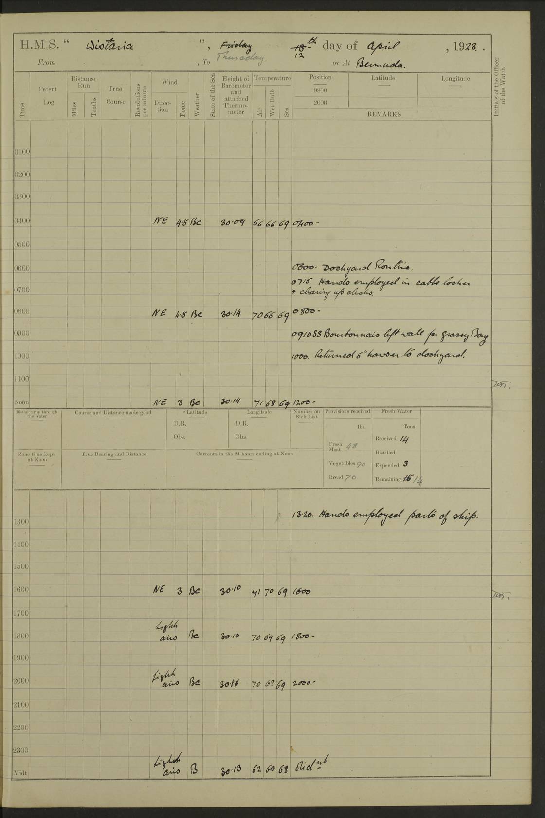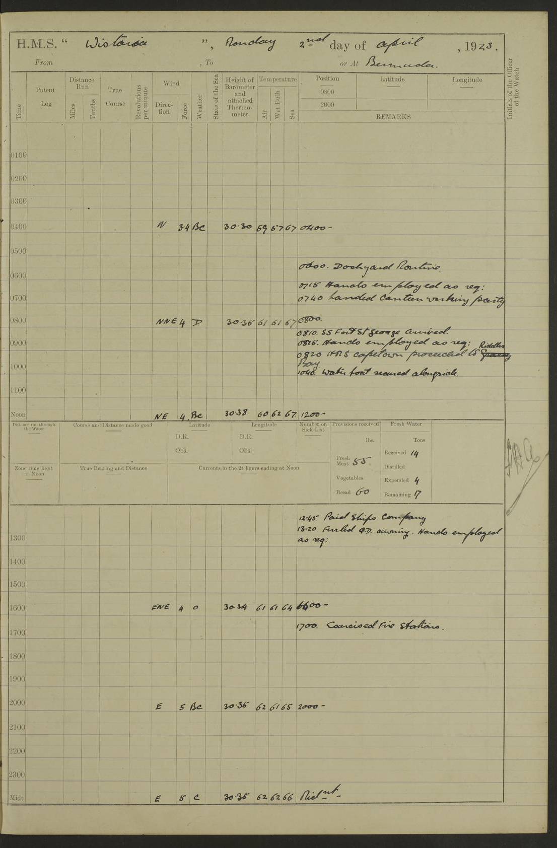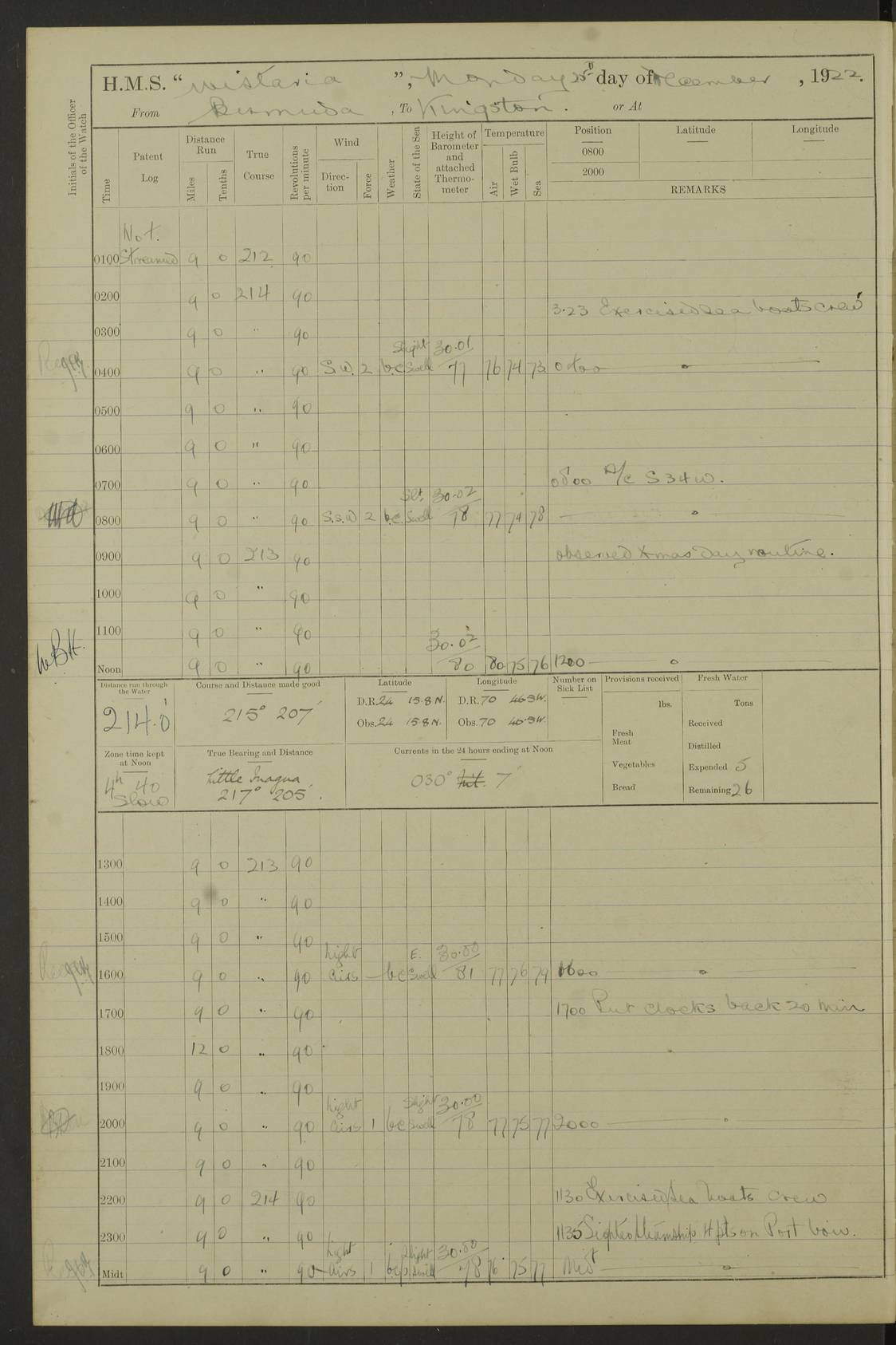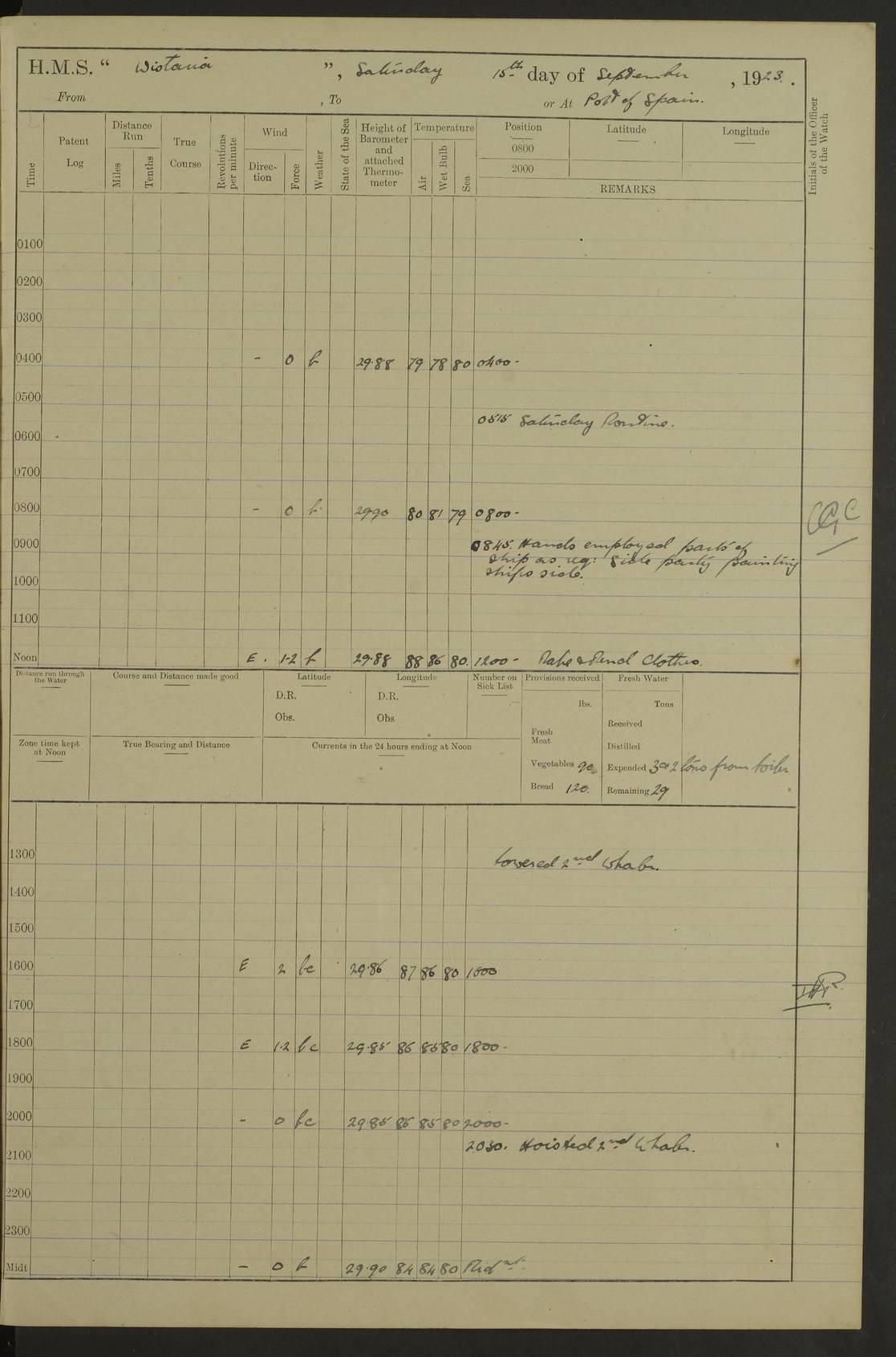 4f73caf5a2fc8ea903000c3b: (https://s3.amazonaws.com:443/oldweather/ADM53-93269/0003_1.jpg) 1 September 1922 At Bermuda Lat 32.32, Long -64.8 5.30am: Hands employed cleaning ship 8.15am: Hands employed ranging cable for survey Sunset 6.30 2.0pm: Hands employed scraping ship's bottom, and cleaning out cable lockers 4f73caf5a2fc8ea903000c3c: (https://s3.amazonaws.com:443/oldweather/ADM53-93269/0004_0.jpg) 2 September 1922 At Bermuda Lat 32.32, Long -64.8 5.30am: Hands employed cleaning ship 8.15am: Hands employed cleaning ship’s side pm: Commissioned Engineer discharged to hospital pm: 2 ratings joined ship from hospital 5.0pm: Exercised fires stations 4f73caf6a2fc8ea903000c3d: (https://s3.amazonaws.com:443/oldweather/ADM53-93269/0004_1.jpg) 3 September 1922 At Bermuda Lat 32.32, Long -64.8 6.0am: Hands employed cleaning ship (usual Sunday Routine) 8.0-8.45am: Hands clean up decks for Divisions 10.15am: Church of England Church party landed 6.0pm: Tested fire arrangements 4f73caf6a2fc8ea903000c3e: (https://s3.amazonaws.com:443/oldweather/ADM53-93269/0005_0.jpg) 4 September 1922 At Bermuda Lat 32.32, Long -64.8 5.30am: Hands employed scraping ship's bottom 8.15am: Hands employed painting ship's bottom 2.0pm: Hands employed as in the forenoon 4f73caf7a2fc8ea903000c3f: (https://s3.amazonaws.com:443/oldweather/ADM53-93269/0005_1.jpg) 5 September 1922 At Bermuda Lat 32.32, Long -64.8 5.30am: Hands employed painting ship's bottom 8.15am: Hands employed painting ship's bottom am: HMS “Valerian” came alongside in the South Basin am: 1 rating discharged to hospital 1.30pm: Hands employed as in forenoon 4f73caf7a2fc8ea903000c40: (https://s3.amazonaws.com:443/oldweather/ADM53-93269/0006_0.jpg) 6 September 1922 At Bermuda Lat 32.32, Long -64.8 5.40am: Hands employed painting ship's bottom am: 1 PO & 6 Hands employed stowing cable after survey 8.15am: Hands employed restowing cable and painting ship's bottom am: Leave to Engine room branch from 13.30-07.00 Port Watch 1 boatswains pipe lost by accident pm: Received 20 tons of boiled water 2.0pm: Hands employed restowing cable and painting ship's bottom 4f73caf7a2fc8ea903000c41: (https://s3.amazonaws.com:443/oldweather/ADM53-93269/0006_1.jpg) 7 September 1922 At Bermuda Lat 32.32, Long -64.8 6.30am: Hands employed cleaning ship 8.15am: Hands preparing for undocking ship 9.30am: Secured alongside by the sheerlegs am: Hands restowed ammunition 3.45pm: Exercised collision stations 4f73caf8a2fc8ea903000c42: (https://s3.amazonaws.com:443/oldweather/ADM53-93269/0007_0.jpg) 8 September 1922 At Bermuda Lat 32.32, Long -64.8 8.15am: Hands employed cleaning ship 9.30am: Divisions. Inspection of the ship by Captain the Hon. A. E. Strutt 10.10am: Hands muster by the ledger 11.0am: Cleared ship for action pm: 6 ratings joined ship from Hospital 1.30pm: Resumed inspection of the ship by Captain the Hon A. E. Strutt 2.45pm: Secured, replace gear [Captain the Honourable Arthur Charles Strutt] 4f73caf8a2fc8ea903000c43: (https://s3.amazonaws.com:443/oldweather/ADM53-93269/0007_1.jpg) 9 September 1922 From Bermuda to Halifax N.S., and at Bermuda Lat 32.32, Long -64.8 8.15am: Hands employed provisioning ship pm: 12 ratings discharged to HMS “Dartmouth” pm: 18 ratings joined ship pm: Received 7 tons of boiler water 2.0pm: Hands employed securing ship for sea 4.0pm: Slipped from Jetty & proceeded out 4.15pm: Stopped in Grassy Bay, and hoisted motor boat 4.30pm: Proceeded at 96 revs. Co as requisite for Ship Channel and Narrows 5.49pm: Fairway buoy abeam. Course East 6.04pm: Mills Breaker buoy abeam, 8 cables 6.19pm: Kitchen Shoals buoy abeam, 1 mile 6.35pm: Streamed log [Mills Breaker buoy coordinates: Lat 32 23.9N, Long 64 36.9W] [Kitchen Shoal beacon coordinates: Lat 32 26.1N, Long 64 37.6W] 4f73caf8a2fc8ea903000c44: (https://s3.amazonaws.com:443/oldweather/ADM53-93269/0008_0.jpg) 10 September 1922 From Bermuda to Halifax Lat 35.06, Long -64.5 9.45am: Divisions & Prayers pm: Usual Sunday Routine 4.05pm: Hauled in, cleaned & streamed patent log 5.0pm: Put clocks on 20 minutes 5.30pm: Exercised sounding party True Bearing and Distance: Chebucto Head 004°½, 566 miles 4f73caf9a2fc8ea903000c45: (https://s3.amazonaws.com:443/oldweather/ADM53-93269/0008_1.jpg) 11 September 1922 From Bermuda to Halifax Lat 38.88, Long -64.3 3.0am: Within strong W/T touch with “Cape Town” 5.25am: Spoke “Cape Town” am: Divisions & Prayers, Exercised action am: Exchanged names with British Steamer “San Valerio”, Eagle Oil Co. Lat 38 35N, Long 63 55W 10.10am: Secure pm: Hands employed painting lower boom gear & waterways & cleaning out 2nd whaler 4.50pm: Exercised sounding party 5.0pm: Put clocks on ½ hour 10.10pm: Stopped engines, helm jammed 10.12pm: Hauled in patent log 10.35pm: Resumed Co & speed; hand wheel connected up. Course below NNE 10.45pm: Streamed patent log True Bearing and Distance: Chebucto Head 005°, 332 miles 4f73caf9a2fc8ea903000c46: (https://s3.amazonaws.com:443/oldweather/ADM53-93269/0009_0.jpg) 12 September 1922 From Bermuda to Halifax Lat 42.85, Long -63.81 am: Steering by hand 9.45am: Ord Seamen & Boys to 4” instruction pm: 1 hand scrubber lost by accident pm: 1 whalers oar lost by accident 5.0pm: Altered course N36E (steering NNE½E). Put clocks on 1/2 hour 8.15pm: Sighted Sambro Lt bearing N20E 8.40pm: Sighted Chebucto Head Lt bearing N18E 9.27pm: Sambro Lt buoy abeam, 2 miles 10.07pm: Sambro Lt abeam 10.10pm: Chebucto Lt abeam 10.20pm: Hauled in Patent log 11.20pm: Mauger Beach Lt abeam 11.52pm: Let go off No 4 wharf with 2½ shackles True Bearing and Distance: Chebucto Head 007, 100 miles 4f73cafaa2fc8ea903000c47: (https://s3.amazonaws.com:443/oldweather/ADM53-93269/0009_1.jpg) 13 September 1922 At Halifax Lat 44.69, Long -63.64 7.0am: Ship wharped alongside No 4 pier 8.0am: Hands prepare for coaling 8.45am: Hands coal ship 9.0am: Clocks put back 1 hour 12.30pm: Hands coal ship pm: 26 tons boiler water received 2.25pm: Finished coaling 4f73cafaa2fc