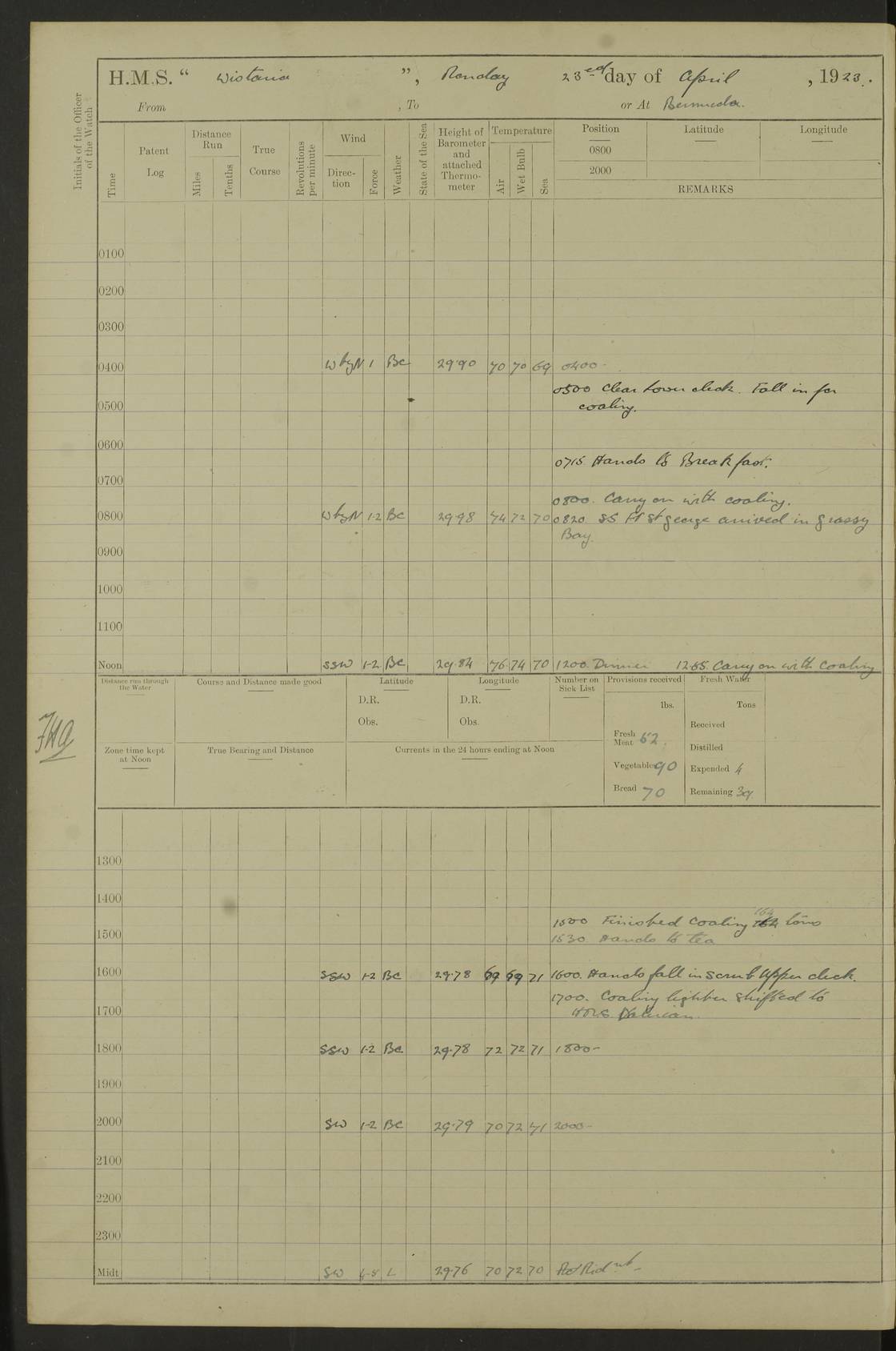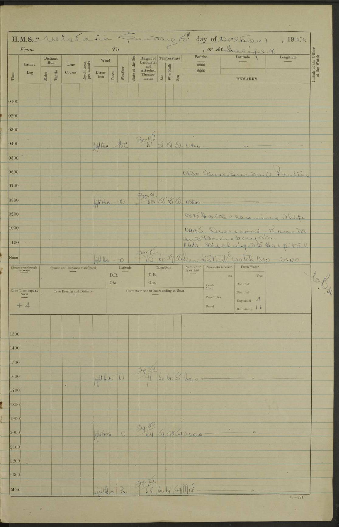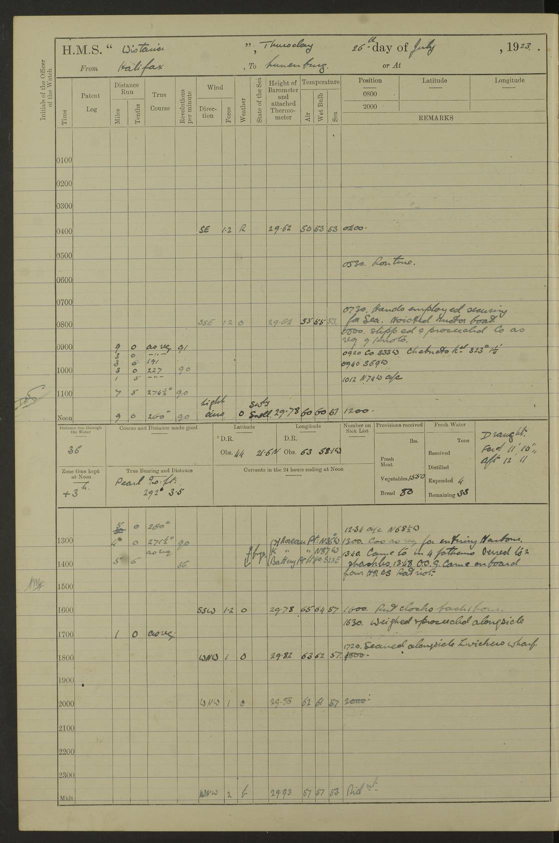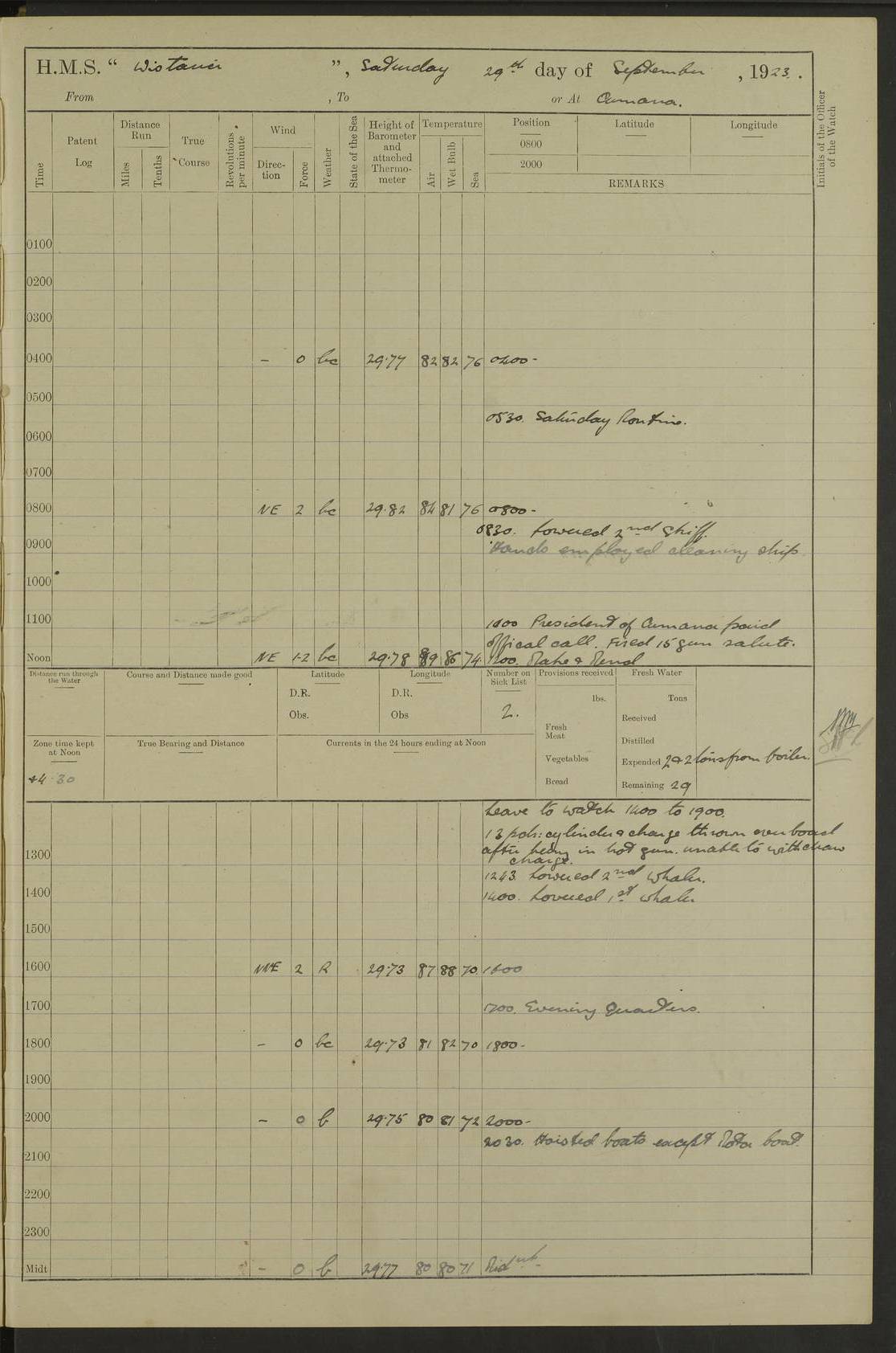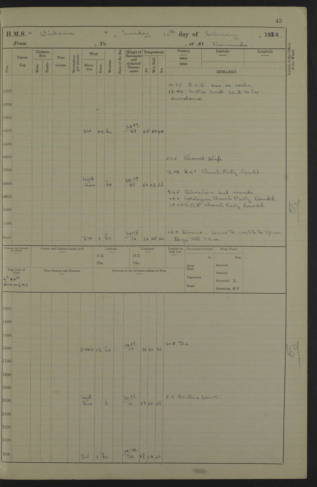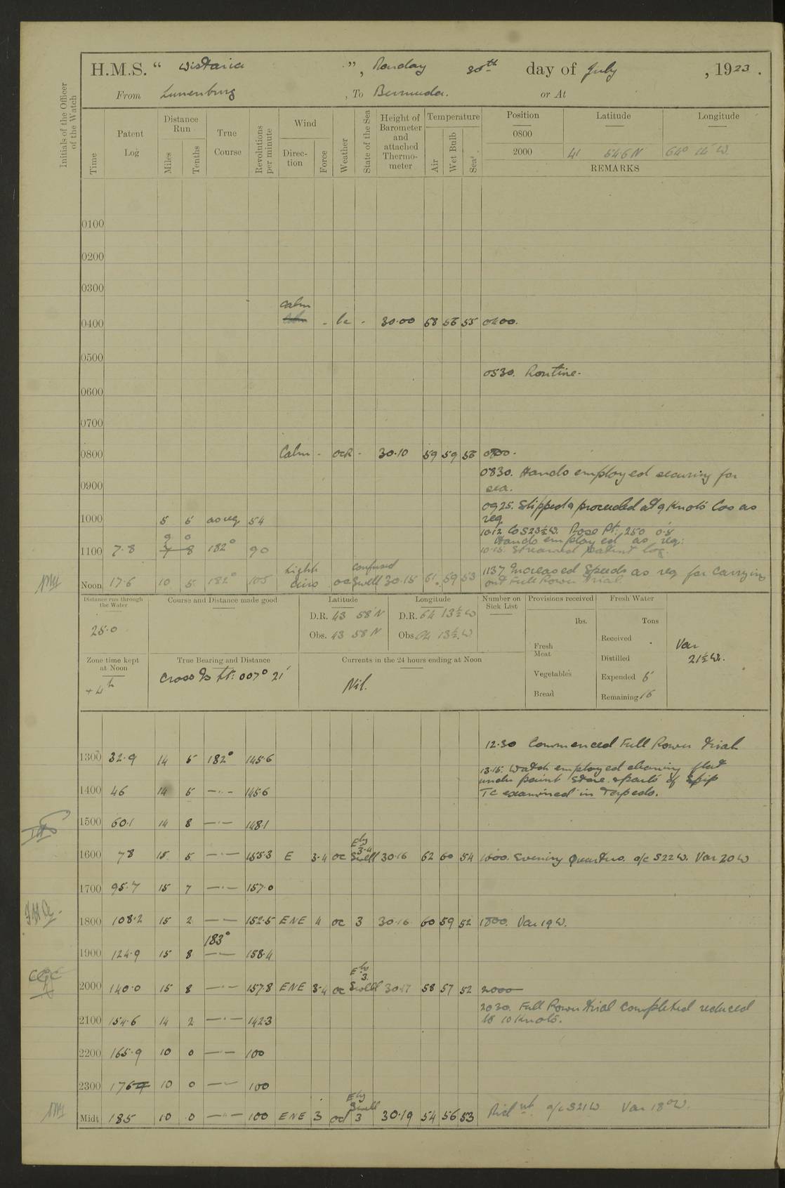 4f73caf5a2fc8ea903000c3b: (https://s3.amazonaws.com:443/oldweather/ADM53-93269/0003_1.jpg) 1 September 1922 At Bermuda Lat 32.32, Long -64.8 5.30am: Hands employed cleaning ship 8.15am: Hands employed ranging cable for survey Sunset 6.30 2.0pm: Hands employed scraping ship's bottom, and cleaning out cable lockers 4f73caf5a2fc8ea903000c3c: (https://s3.amazonaws.com:443/oldweather/ADM53-93269/0004_0.jpg) 2 September 1922 At Bermuda Lat 32.32, Long -64.8 5.30am: Hands employed cleaning ship 8.15am: Hands employed cleaning ship’s side pm: Commissioned Engineer discharged to hospital pm: 2 ratings joined ship from hospital 5.0pm: Exercised fires stations 4f73caf6a2fc8ea903000c3d: (https://s3.amazonaws.com:443/oldweather/ADM53-93269/0004_1.jpg) 3 September 1922 At Bermuda Lat 32.32, Long -64.8 6.0am: Hands employed cleaning ship (usual Sunday Routine) 8.0-8.45am: Hands clean up decks for Divisions 10.15am: Church of England Church party landed 6.0pm: Tested fire arrangements 4f73caf6a2fc8ea903000c3e: (https://s3.amazonaws.com:443/oldweather/ADM53-93269/0005_0.jpg) 4 September 1922 At Bermuda Lat 32.32, Long -64.8 5.30am: Hands employed scraping ship's bottom 8.15am: Hands employed painting ship's bottom 2.0pm: Hands employed as in the forenoon 4f73caf7a2fc8ea903000c3f: (https://s3.amazonaws.com:443/oldweather/ADM53-93269/0005_1.jpg) 5 September 1922 At Bermuda Lat 32.32, Long -64.8 5.30am: Hands employed painting ship's bottom 8.15am: Hands employed painting ship's bottom am: HMS “Valerian” came alongside in the South Basin am: 1 rating discharged to hospital 1.30pm: Hands employed as in forenoon 4f73caf7a2fc8ea903000c40: (https://s3.amazonaws.com:443/oldweather/ADM53-93269/0006_0.jpg) 6 September 1922 At Bermuda Lat 32.32, Long -64.8 5.40am: Hands employed painting ship's bottom am: 1 PO & 6 Hands employed stowing cable after survey 8.15am: Hands employed restowing cable and painting ship's bottom am: Leave to Engine room branch from 13.30-07.00 Port Watch 1 boatswains pipe lost by accident pm: Received 20 tons of boiled water 2.0pm: Hands employed restowing cable and painting ship's bottom 4f73caf7a2fc8ea903000c41: (https://s3.amazonaws.com:443/oldweather/ADM53-93269/0006_1.jpg) 7 September 1922 At Bermuda Lat 32.32, Long -64.8 6.30am: Hands employed cleaning ship 8.15am: Hands preparing for undocking ship 9.30am: Secured alongside by the sheerlegs am: Hands restowed ammunition 3.45pm: Exercised collision stations 4f73caf8a2fc8ea903000c42: (https://s3.amazonaws.com:443/oldweather/ADM53-93269/0007_0.jpg) 8 September 1922 At Bermuda Lat 32.32, Long -64.8 8.15am: Hands employed cleaning ship 9.30am: Divisions. Inspection of the ship by Captain the Hon. A. E. Strutt 10.10am: Hands muster by the ledger 11.0am: Cleared ship for action pm: 6 ratings joined ship from Hospital 1.30pm: Resumed inspection of the ship by Captain the Hon A. E. Strutt 2.45pm: Secured, replace gear [Captain the Honourable Arthur Charles Strutt] 4f73caf8a2fc8ea903000c43: (https://s3.amazonaws.com:443/oldweather/ADM53-93269/0007_1.jpg) 9 September 1922 From Bermuda to Halifax N.S., and at Bermuda Lat 32.32, Long -64.8 8.15am: Hands employed provisioning ship pm: 12 ratings discharged to HMS “Dartmouth” pm: 18 ratings joined ship pm: Received 7 tons of boiler water 2.0pm: Hands employed securing ship for sea 4.0pm: Slipped from Jetty & proceeded out 4.15pm: Stopped in Grassy Bay, and hoisted motor boat 4.30pm: Proceeded at 96 revs. Co as requisite for Ship Channel and Narrows 5.49pm: Fairway buoy abeam. Course East 6.04pm: Mills Breaker buoy abeam, 8 cables 6.19pm: Kitchen Shoals buoy abeam, 1 mile 6.35pm: Streamed log [Mills Breaker buoy coordinates: Lat 32 23.9N, Long 64 36.9W] [Kitchen Shoal beacon coordinates: Lat 32 26.1N, Long 64 37.6W] 4f73caf8a2fc8ea903000c44: (https://s3.amazonaws.com:443/oldweather/ADM53-93269/0008_0.jpg) 10 September 1922 From Bermuda to Halifax Lat 35.06, Long -64.5 9.45am: Divisions & Prayers pm: Usual Sunday Routine 4.05pm: Hauled in, cleaned & streamed patent log 5.0pm: Put clocks on 20 minutes 5.30pm: Exercised sounding party True Bearing and Distance: Chebucto Head 004°½, 566 miles 4f73caf9a2fc8ea903000c45: (https://s3.amazonaws.com:443/oldweather/ADM53-93269/0008_1.jpg) 11 September 1922 From Bermuda to Halifax Lat 38.88, Long -64.3 3.0am: Within strong W/T touch with “Cape Town” 5.25am: Spoke “Cape Town” am: Divisions & Prayers, Exercised action am: Exchanged names with British Steamer “San Valerio”, Eagle Oil Co. Lat 38 35N, Long 63 55W 10.10am: Secure pm: Hands employed painting lower boom gear & waterways & cleaning out 2nd whaler 4.50pm: Exercised sounding party 5.0pm: Put clocks on ½ hour 10.10pm: Stopped engines, helm jammed 10.12pm: Hauled in patent log 10.35pm: Resumed Co & speed; hand wheel connected up. Course below NNE 10.45pm: Streamed patent log True Bearing and Distance: Chebucto Head 005°, 332 miles 4f73caf9a2fc8ea903000c46: (https://s3.amazonaws.com:443/oldweather/ADM53-93269/0009_0.jpg) 12 September 1922 From Bermuda to Halifax Lat 42.85, Long -63.81 am: Steering by hand 9.45am: Ord Seamen & Boys to 4” instruction pm: 1 hand scrubber lost by accident pm: 1 whalers oar lost by accident 5.0pm: Altered course N36E (steering NNE½E). Put clocks on 1/2 hour 8.15pm: Sighted Sambro Lt bearing N20E 8.40pm: Sighted Chebucto Head Lt bearing N18E 9.27pm: Sambro Lt buoy abeam, 2 miles 10.07pm: Sambro Lt abeam 10.10pm: Chebucto Lt abeam 10.20pm: Hauled in Patent log 11.20pm: Mauger Beach Lt abeam 11.52pm: Let go off No 4 wharf with 2½ shackles True Bearing and Distance: Chebucto Head 007, 100 miles 4f73cafaa2fc8ea903000c47: (https://s3.amazonaws.com:443/oldweather/ADM53-93269/0009_1.jpg) 13 September 1922 At Halifax Lat 44.69, Long -63.64 7.0am: Ship wharped alongside No 4 pier 8.0am: Hands prepare for coaling 8.45am: Hands coal ship 9.0am: Clocks put back 1 hour 12.30pm: Hands coal ship pm: 26 tons boiler water received 2.25pm: Finished coaling 4f73cafaa2fc