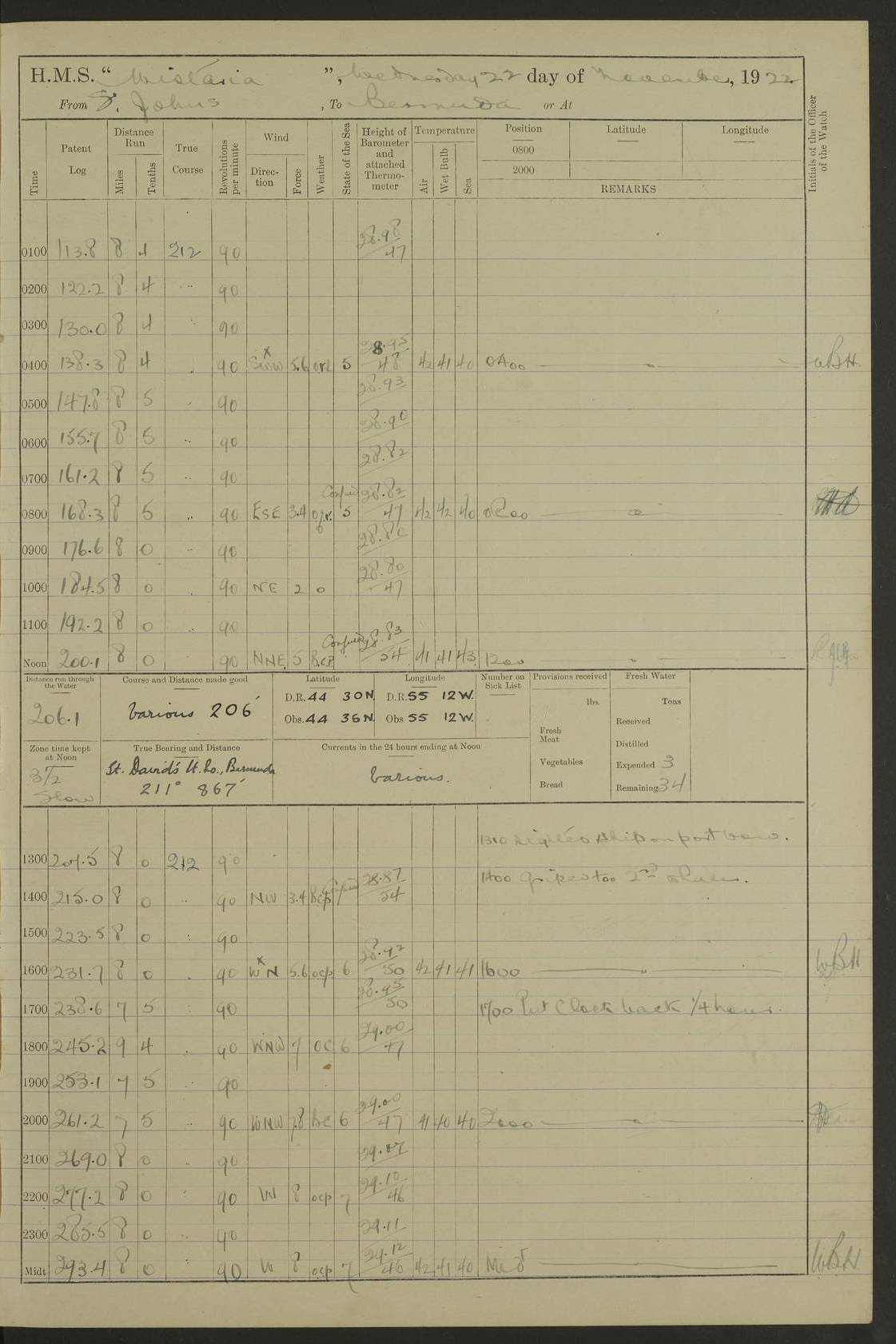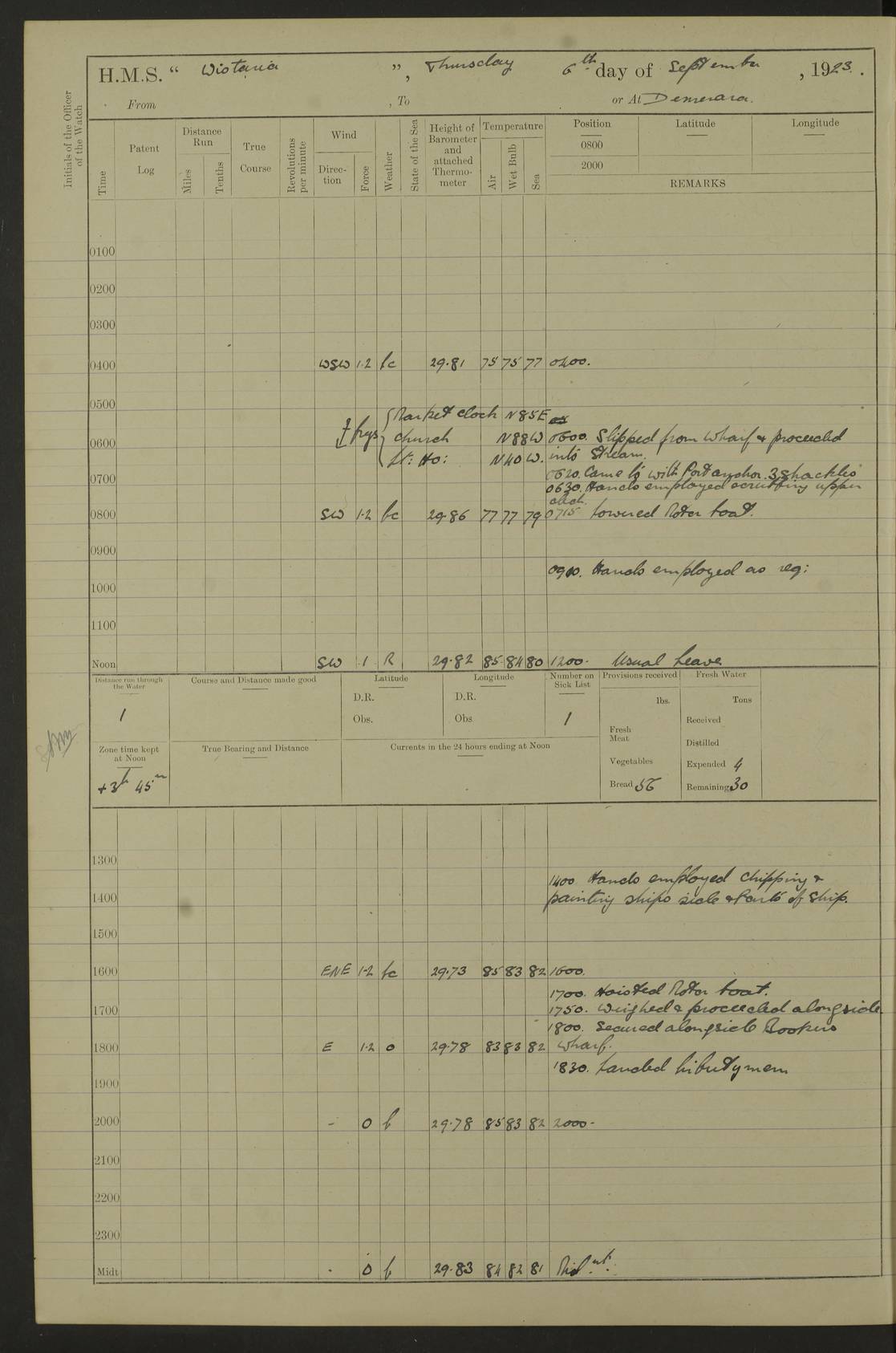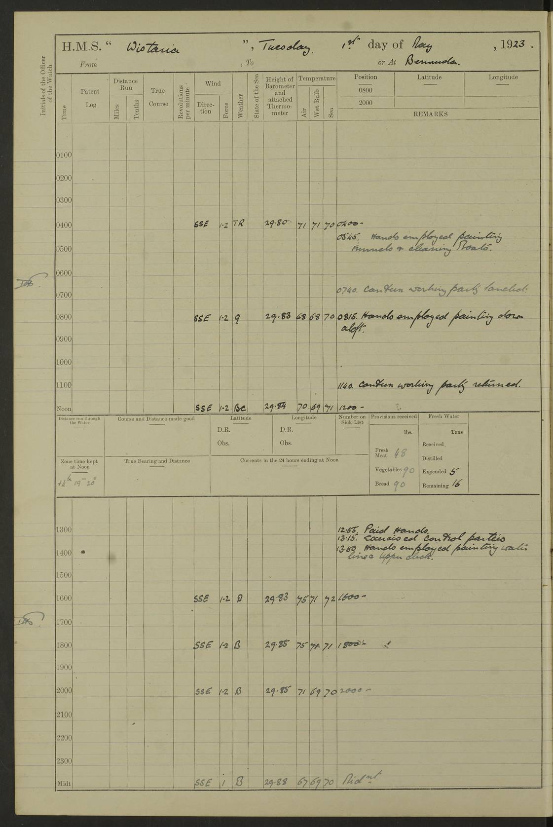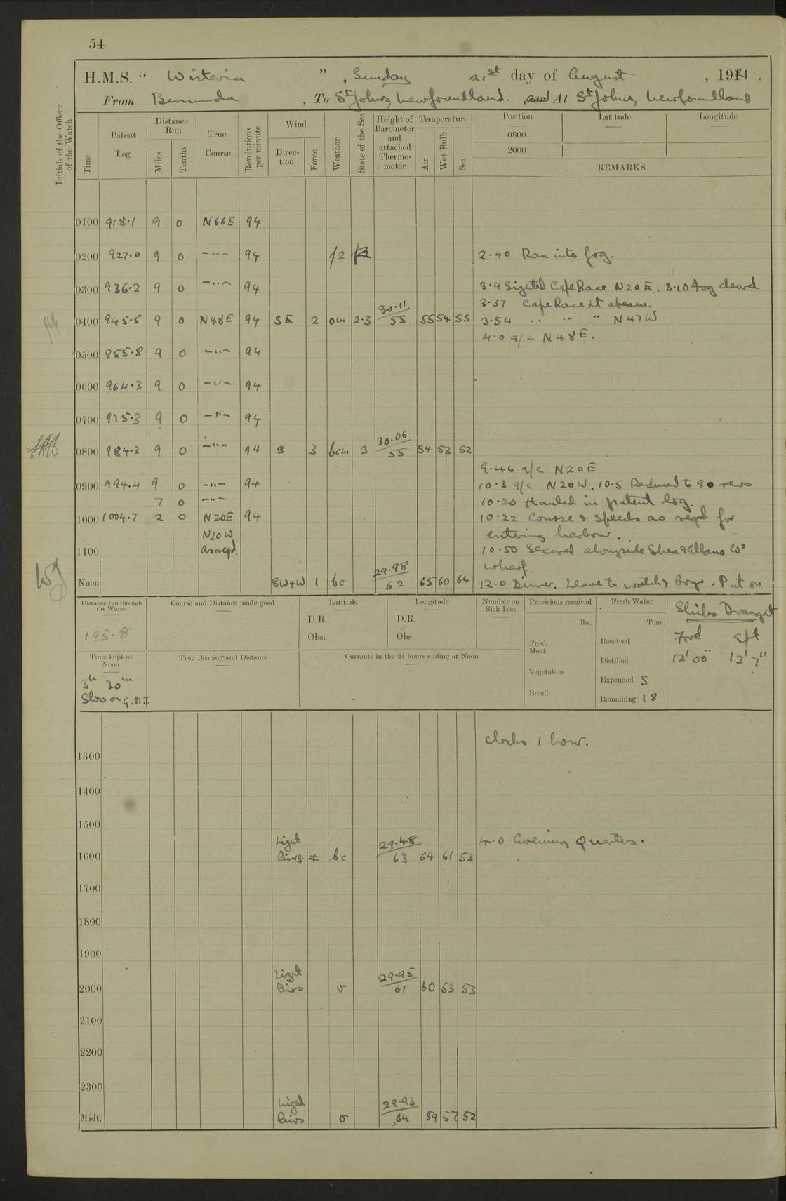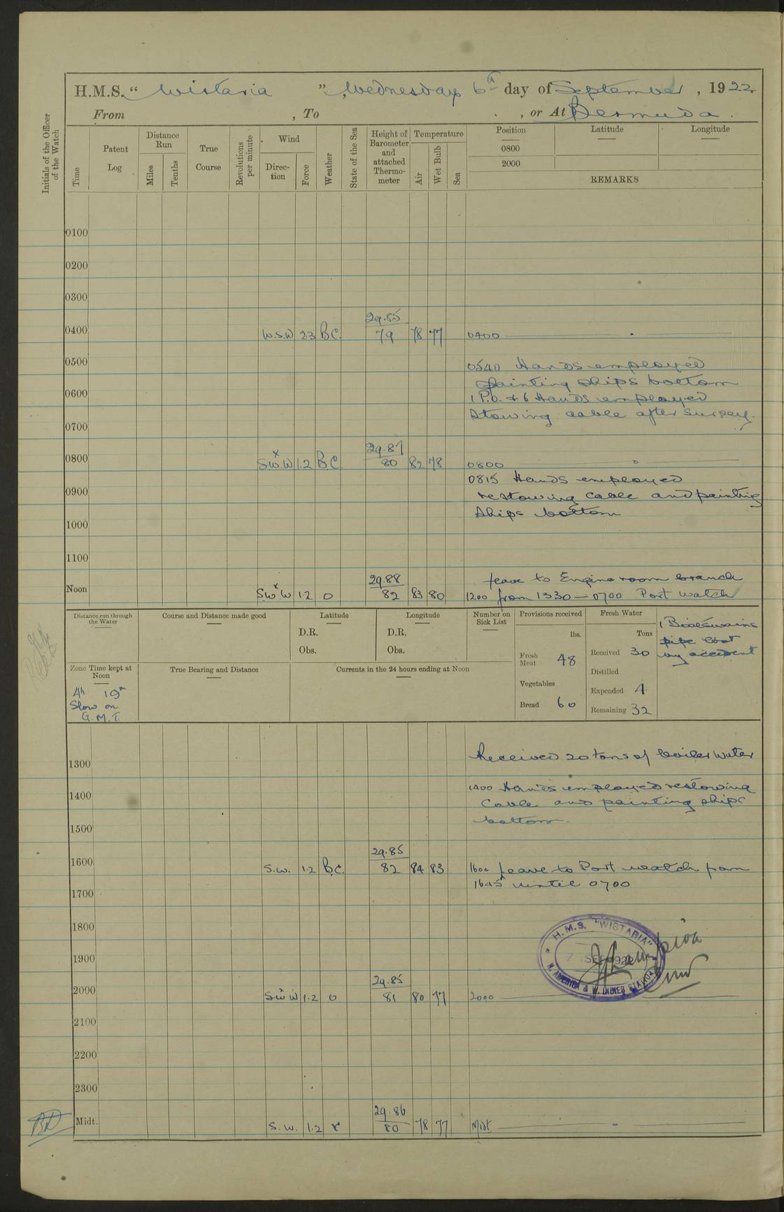 4f73caf5a2fc8ea903000c3b: (https://s3.amazonaws.com:443/oldweather/ADM53-93269/0003_1.jpg) 1 September 1922 At Bermuda Lat 32.32, Long -64.8 5.30am: Hands employed cleaning ship 8.15am: Hands employed ranging cable for survey Sunset 6.30 2.0pm: Hands employed scraping ship's bottom, and cleaning out cable lockers 4f73caf5a2fc8ea903000c3c: (https://s3.amazonaws.com:443/oldweather/ADM53-93269/0004_0.jpg) 2 September 1922 At Bermuda Lat 32.32, Long -64.8 5.30am: Hands employed cleaning ship 8.15am: Hands employed cleaning ship’s side pm: Commissioned Engineer discharged to hospital pm: 2 ratings joined ship from hospital 5.0pm: Exercised fires stations 4f73caf6a2fc8ea903000c3d: (https://s3.amazonaws.com:443/oldweather/ADM53-93269/0004_1.jpg) 3 September 1922 At Bermuda Lat 32.32, Long -64.8 6.0am: Hands employed cleaning ship (usual Sunday Routine) 8.0-8.45am: Hands clean up decks for Divisions 10.15am: Church of England Church party landed 6.0pm: Tested fire arrangements 4f73caf6a2fc8ea903000c3e: (https://s3.amazonaws.com:443/oldweather/ADM53-93269/0005_0.jpg) 4 September 1922 At Bermuda Lat 32.32, Long -64.8 5.30am: Hands employed scraping ship's bottom 8.15am: Hands employed painting ship's bottom 2.0pm: Hands employed as in the forenoon 4f73caf7a2fc8ea903000c3f: (https://s3.amazonaws.com:443/oldweather/ADM53-93269/0005_1.jpg) 5 September 1922 At Bermuda Lat 32.32, Long -64.8 5.30am: Hands employed painting ship's bottom 8.15am: Hands employed painting ship's bottom am: HMS “Valerian” came alongside in the South Basin am: 1 rating discharged to hospital 1.30pm: Hands employed as in forenoon 4f73caf7a2fc8ea903000c40: (https://s3.amazonaws.com:443/oldweather/ADM53-93269/0006_0.jpg) 6 September 1922 At Bermuda Lat 32.32, Long -64.8 5.40am: Hands employed painting ship's bottom am: 1 PO & 6 Hands employed stowing cable after survey 8.15am: Hands employed restowing cable and painting ship's bottom am: Leave to Engine room branch from 13.30-07.00 Port Watch 1 boatswains pipe lost by accident pm: Received 20 tons of boiled water 2.0pm: Hands employed restowing cable and painting ship's bottom 4f73caf7a2fc8ea903000c41: (https://s3.amazonaws.com:443/oldweather/ADM53-93269/0006_1.jpg) 7 September 1922 At Bermuda Lat 32.32, Long -64.8 6.30am: Hands employed cleaning ship 8.15am: Hands preparing for undocking ship 9.30am: Secured alongside by the sheerlegs am: Hands restowed ammunition 3.45pm: Exercised collision stations 4f73caf8a2fc8ea903000c42: (https://s3.amazonaws.com:443/oldweather/ADM53-93269/0007_0.jpg) 8 September 1922 At Bermuda Lat 32.32, Long -64.8 8.15am: Hands employed cleaning ship 9.30am: Divisions. Inspection of the ship by Captain the Hon. A. E. Strutt 10.10am: Hands muster by the ledger 11.0am: Cleared ship for action pm: 6 ratings joined ship from Hospital 1.30pm: Resumed inspection of the ship by Captain the Hon A. E. Strutt 2.45pm: Secured, replace gear [Captain the Honourable Arthur Charles Strutt] 4f73caf8a2fc8ea903000c43: (https://s3.amazonaws.com:443/oldweather/ADM53-93269/0007_1.jpg) 9 September 1922 From Bermuda to Halifax N.S., and at Bermuda Lat 32.32, Long -64.8 8.15am: Hands employed provisioning ship pm: 12 ratings discharged to HMS “Dartmouth” pm: 18 ratings joined ship pm: Received 7 tons of boiler water 2.0pm: Hands employed securing ship for sea 4.0pm: Slipped from Jetty & proceeded out 4.15pm: Stopped in Grassy Bay, and hoisted motor boat 4.30pm: Proceeded at 96 revs. Co as requisite for Ship Channel and Narrows 5.49pm: Fairway buoy abeam. Course East 6.04pm: Mills Breaker buoy abeam, 8 cables 6.19pm: Kitchen Shoals buoy abeam, 1 mile 6.35pm: Streamed log [Mills Breaker buoy coordinates: Lat 32 23.9N, Long 64 36.9W] [Kitchen Shoal beacon coordinates: Lat 32 26.1N, Long 64 37.6W] 4f73caf8a2fc8ea903000c44: (https://s3.amazonaws.com:443/oldweather/ADM53-93269/0008_0.jpg) 10 September 1922 From Bermuda to Halifax Lat 35.06, Long -64.5 9.45am: Divisions & Prayers pm: Usual Sunday Routine 4.05pm: Hauled in, cleaned & streamed patent log 5.0pm: Put clocks on 20 minutes 5.30pm: Exercised sounding party True Bearing and Distance: Chebucto Head 004°½, 566 miles 4f73caf9a2fc8ea903000c45: (https://s3.amazonaws.com:443/oldweather/ADM53-93269/0008_1.jpg) 11 September 1922 From Bermuda to Halifax Lat 38.88, Long -64.3 3.0am: Within strong W/T touch with “Cape Town” 5.25am: Spoke “Cape Town” am: Divisions & Prayers, Exercised action am: Exchanged names with British Steamer “San Valerio”, Eagle Oil Co. Lat 38 35N, Long 63 55W 10.10am: Secure pm: Hands employed painting lower boom gear & waterways & cleaning out 2nd whaler 4.50pm: Exercised sounding party 5.0pm: Put clocks on ½ hour 10.10pm: Stopped engines, helm jammed 10.12pm: Hauled in patent log 10.35pm: Resumed Co & speed; hand wheel connected up. Course below NNE 10.45pm: Streamed patent log True Bearing and Distance: Chebucto Head 005°, 332 miles 4f73caf9a2fc8ea903000c46: (https://s3.amazonaws.com:443/oldweather/ADM53-93269/0009_0.jpg) 12 September 1922 From Bermuda to Halifax Lat 42.85, Long -63.81 am: Steering by hand 9.45am: Ord Seamen & Boys to 4” instruction pm: 1 hand scrubber lost by accident pm: 1 whalers oar lost by accident 5.0pm: Altered course N36E (steering NNE½E). Put clocks on 1/2 hour 8.15pm: Sighted Sambro Lt bearing N20E 8.40pm: Sighted Chebucto Head Lt bearing N18E 9.27pm: Sambro Lt buoy abeam, 2 miles 10.07pm: Sambro Lt abeam 10.10pm: Chebucto Lt abeam 10.20pm: Hauled in Patent log 11.20pm: Mauger Beach Lt abeam 11.52pm: Let go off No 4 wharf with 2½ shackles True Bearing and Distance: Chebucto Head 007, 100 miles 4f73cafaa2fc8ea903000c47: (https://s3.amazonaws.com:443/oldweather/ADM53-93269/0009_1.jpg) 13 September 1922 At Halifax Lat 44.69, Long -63.64 7.0am: Ship wharped alongside No 4 pier 8.0am: Hands prepare for coaling 8.45am: Hands coal ship 9.0am: Clocks put back 1 hour 12.30pm: Hands coal ship pm: 26 tons boiler water received 2.25pm: Finished coaling 4f73cafaa2fc