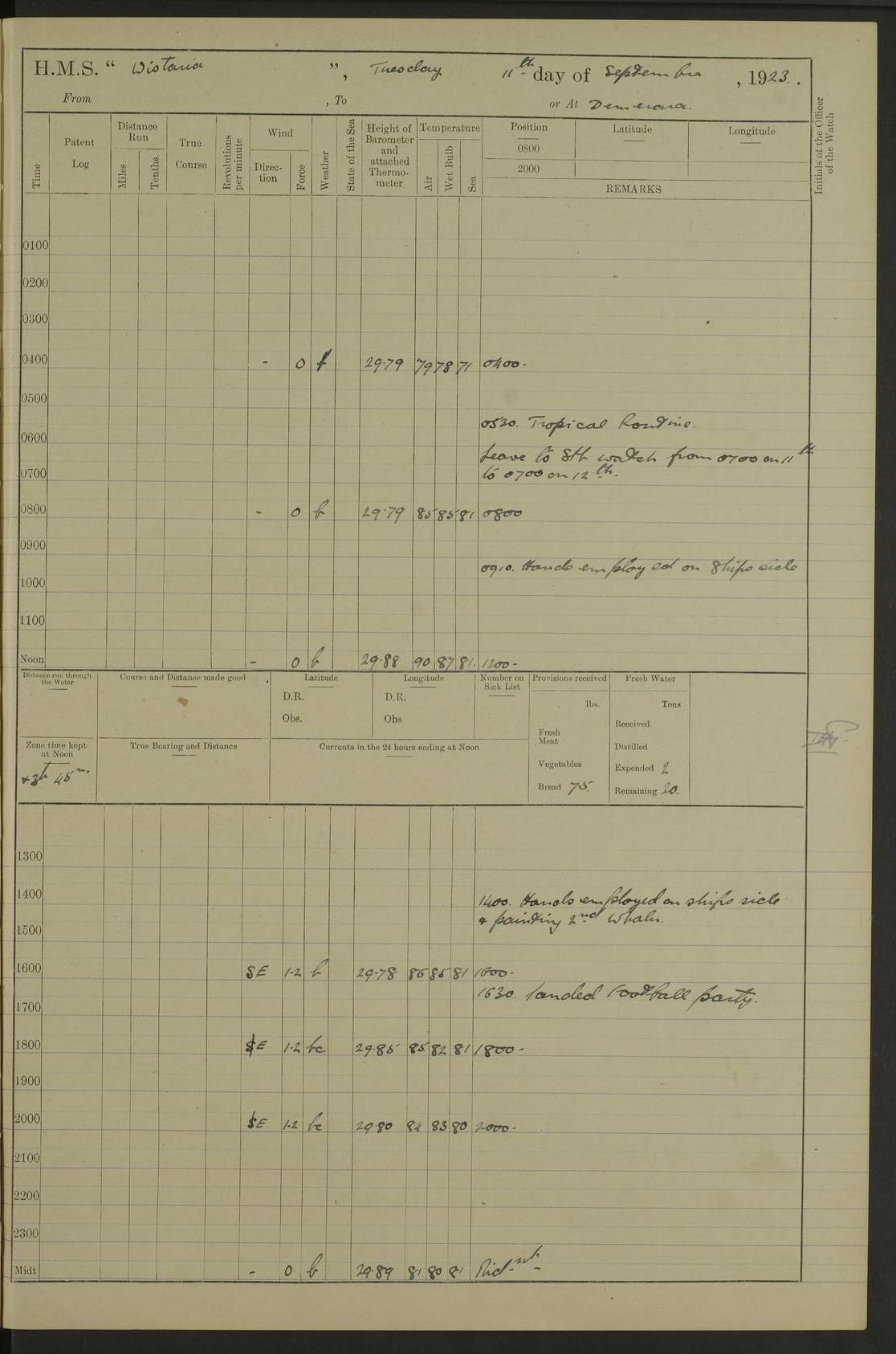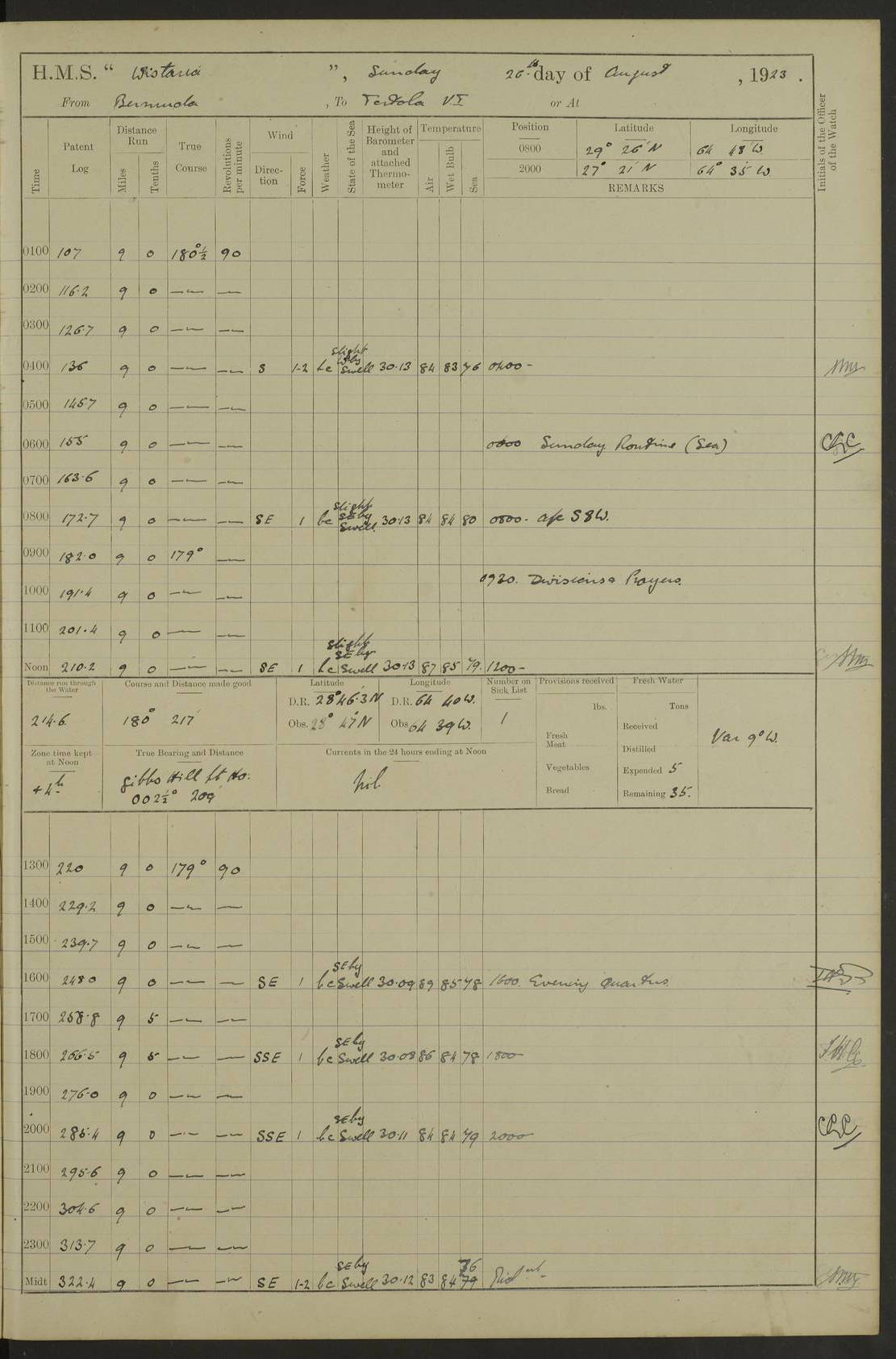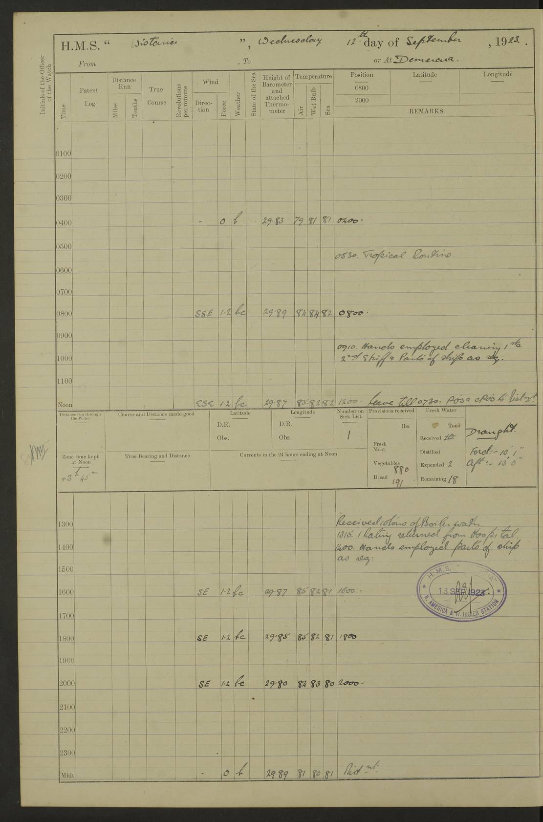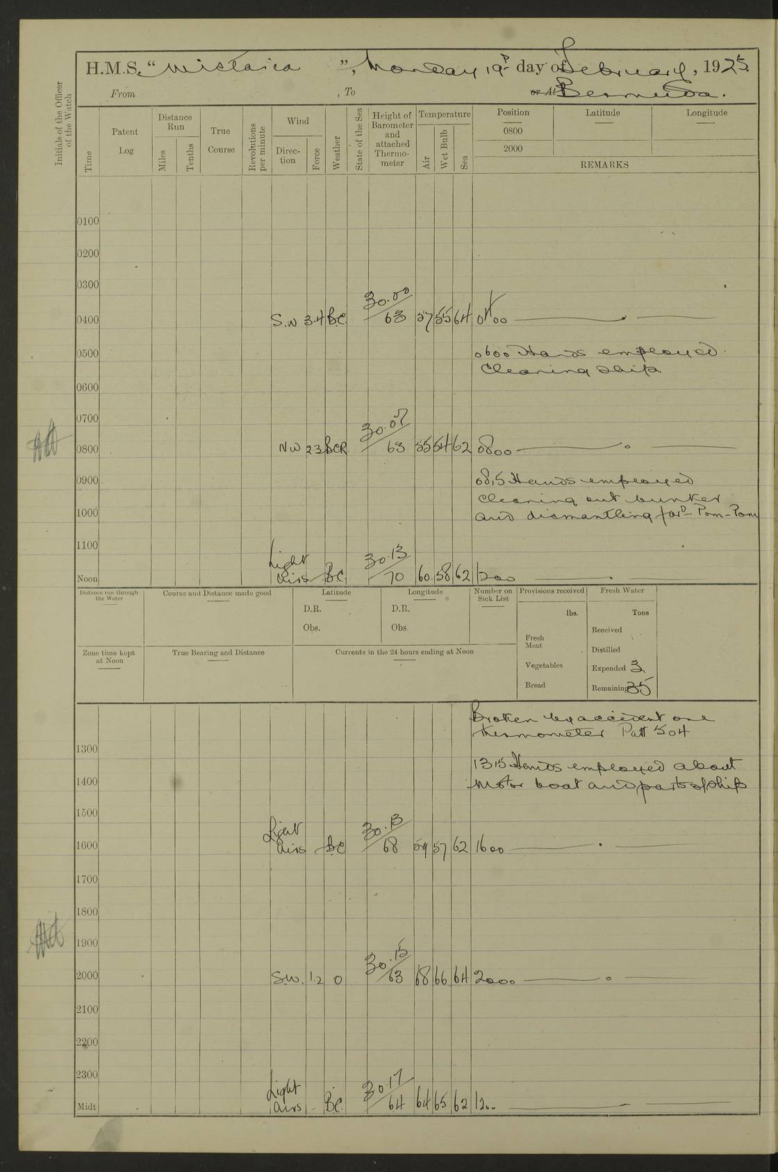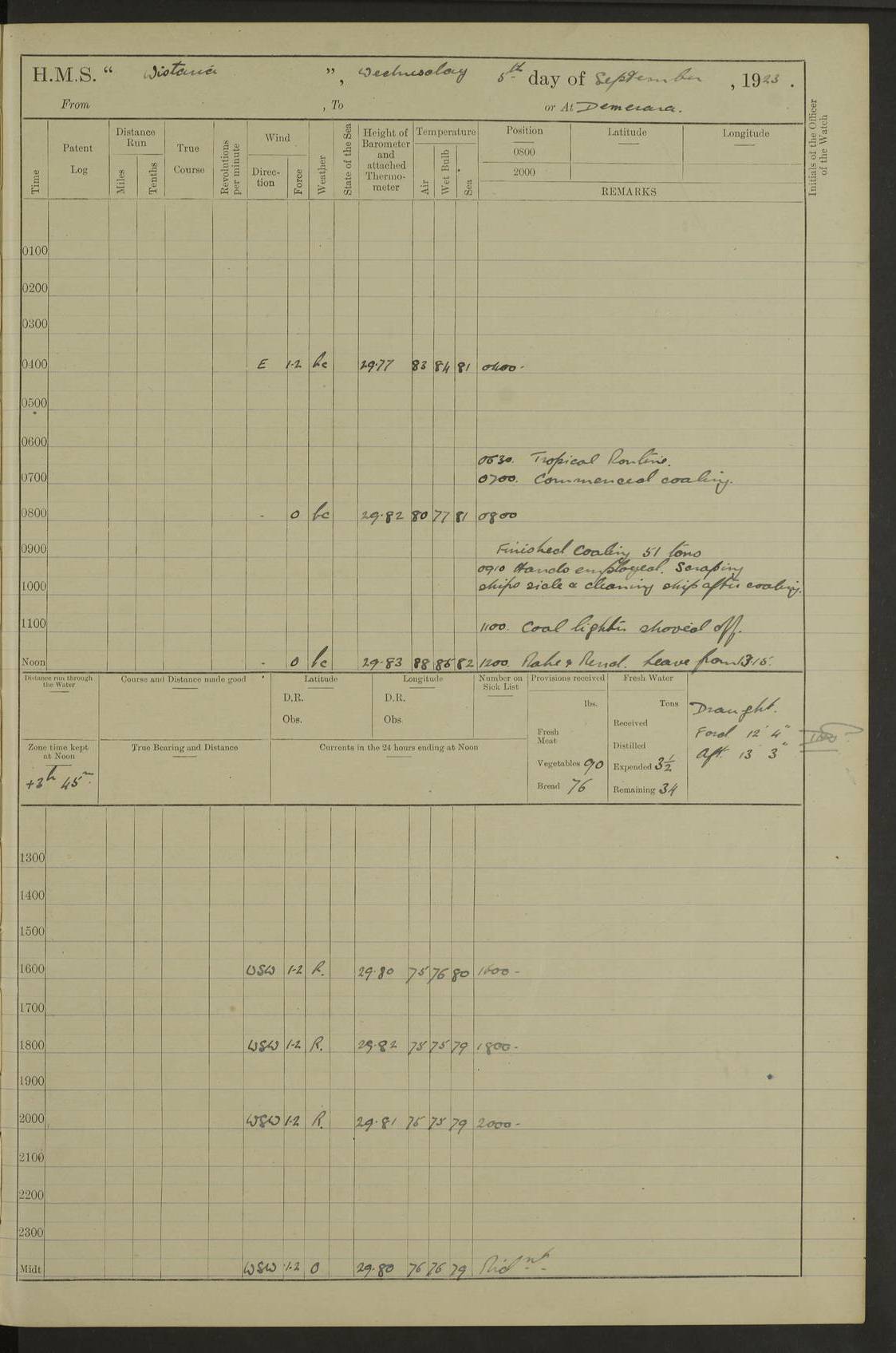 4f73caf5a2fc8ea903000c3b: (https://s3.amazonaws.com:443/oldweather/ADM53-93269/0003_1.jpg) 1 September 1922 At Bermuda Lat 32.32, Long -64.8 5.30am: Hands employed cleaning ship 8.15am: Hands employed ranging cable for survey Sunset 6.30 2.0pm: Hands employed scraping ship's bottom, and cleaning out cable lockers 4f73caf5a2fc8ea903000c3c: (https://s3.amazonaws.com:443/oldweather/ADM53-93269/0004_0.jpg) 2 September 1922 At Bermuda Lat 32.32, Long -64.8 5.30am: Hands employed cleaning ship 8.15am: Hands employed cleaning ship’s side pm: Commissioned Engineer discharged to hospital pm: 2 ratings joined ship from hospital 5.0pm: Exercised fires stations 4f73caf6a2fc8ea903000c3d: (https://s3.amazonaws.com:443/oldweather/ADM53-93269/0004_1.jpg) 3 September 1922 At Bermuda Lat 32.32, Long -64.8 6.0am: Hands employed cleaning ship (usual Sunday Routine) 8.0-8.45am: Hands clean up decks for Divisions 10.15am: Church of England Church party landed 6.0pm: Tested fire arrangements 4f73caf6a2fc8ea903000c3e: (https://s3.amazonaws.com:443/oldweather/ADM53-93269/0005_0.jpg) 4 September 1922 At Bermuda Lat 32.32, Long -64.8 5.30am: Hands employed scraping ship's bottom 8.15am: Hands employed painting ship's bottom 2.0pm: Hands employed as in the forenoon 4f73caf7a2fc8ea903000c3f: (https://s3.amazonaws.com:443/oldweather/ADM53-93269/0005_1.jpg) 5 September 1922 At Bermuda Lat 32.32, Long -64.8 5.30am: Hands employed painting ship's bottom 8.15am: Hands employed painting ship's bottom am: HMS “Valerian” came alongside in the South Basin am: 1 rating discharged to hospital 1.30pm: Hands employed as in forenoon 4f73caf7a2fc8ea903000c40: (https://s3.amazonaws.com:443/oldweather/ADM53-93269/0006_0.jpg) 6 September 1922 At Bermuda Lat 32.32, Long -64.8 5.40am: Hands employed painting ship's bottom am: 1 PO & 6 Hands employed stowing cable after survey 8.15am: Hands employed restowing cable and painting ship's bottom am: Leave to Engine room branch from 13.30-07.00 Port Watch 1 boatswains pipe lost by accident pm: Received 20 tons of boiled water 2.0pm: Hands employed restowing cable and painting ship's bottom 4f73caf7a2fc8ea903000c41: (https://s3.amazonaws.com:443/oldweather/ADM53-93269/0006_1.jpg) 7 September 1922 At Bermuda Lat 32.32, Long -64.8 6.30am: Hands employed cleaning ship 8.15am: Hands preparing for undocking ship 9.30am: Secured alongside by the sheerlegs am: Hands restowed ammunition 3.45pm: Exercised collision stations 4f73caf8a2fc8ea903000c42: (https://s3.amazonaws.com:443/oldweather/ADM53-93269/0007_0.jpg) 8 September 1922 At Bermuda Lat 32.32, Long -64.8 8.15am: Hands employed cleaning ship 9.30am: Divisions. Inspection of the ship by Captain the Hon. A. E. Strutt 10.10am: Hands muster by the ledger 11.0am: Cleared ship for action pm: 6 ratings joined ship from Hospital 1.30pm: Resumed inspection of the ship by Captain the Hon A. E. Strutt 2.45pm: Secured, replace gear [Captain the Honourable Arthur Charles Strutt] 4f73caf8a2fc8ea903000c43: (https://s3.amazonaws.com:443/oldweather/ADM53-93269/0007_1.jpg) 9 September 1922 From Bermuda to Halifax N.S., and at Bermuda Lat 32.32, Long -64.8 8.15am: Hands employed provisioning ship pm: 12 ratings discharged to HMS “Dartmouth” pm: 18 ratings joined ship pm: Received 7 tons of boiler water 2.0pm: Hands employed securing ship for sea 4.0pm: Slipped from Jetty & proceeded out 4.15pm: Stopped in Grassy Bay, and hoisted motor boat 4.30pm: Proceeded at 96 revs. Co as requisite for Ship Channel and Narrows 5.49pm: Fairway buoy abeam. Course East 6.04pm: Mills Breaker buoy abeam, 8 cables 6.19pm: Kitchen Shoals buoy abeam, 1 mile 6.35pm: Streamed log [Mills Breaker buoy coordinates: Lat 32 23.9N, Long 64 36.9W] [Kitchen Shoal beacon coordinates: Lat 32 26.1N, Long 64 37.6W] 4f73caf8a2fc8ea903000c44: (https://s3.amazonaws.com:443/oldweather/ADM53-93269/0008_0.jpg) 10 September 1922 From Bermuda to Halifax Lat 35.06, Long -64.5 9.45am: Divisions & Prayers pm: Usual Sunday Routine 4.05pm: Hauled in, cleaned & streamed patent log 5.0pm: Put clocks on 20 minutes 5.30pm: Exercised sounding party True Bearing and Distance: Chebucto Head 004°½, 566 miles 4f73caf9a2fc8ea903000c45: (https://s3.amazonaws.com:443/oldweather/ADM53-93269/0008_1.jpg) 11 September 1922 From Bermuda to Halifax Lat 38.88, Long -64.3 3.0am: Within strong W/T touch with “Cape Town” 5.25am: Spoke “Cape Town” am: Divisions & Prayers, Exercised action am: Exchanged names with British Steamer “San Valerio”, Eagle Oil Co. Lat 38 35N, Long 63 55W 10.10am: Secure pm: Hands employed painting lower boom gear & waterways & cleaning out 2nd whaler 4.50pm: Exercised sounding party 5.0pm: Put clocks on ½ hour 10.10pm: Stopped engines, helm jammed 10.12pm: Hauled in patent log 10.35pm: Resumed Co & speed; hand wheel connected up. Course below NNE 10.45pm: Streamed patent log True Bearing and Distance: Chebucto Head 005°, 332 miles 4f73caf9a2fc8ea903000c46: (https://s3.amazonaws.com:443/oldweather/ADM53-93269/0009_0.jpg) 12 September 1922 From Bermuda to Halifax Lat 42.85, Long -63.81 am: Steering by hand 9.45am: Ord Seamen & Boys to 4” instruction pm: 1 hand scrubber lost by accident pm: 1 whalers oar lost by accident 5.0pm: Altered course N36E (steering NNE½E). Put clocks on 1/2 hour 8.15pm: Sighted Sambro Lt bearing N20E 8.40pm: Sighted Chebucto Head Lt bearing N18E 9.27pm: Sambro Lt buoy abeam, 2 miles 10.07pm: Sambro Lt abeam 10.10pm: Chebucto Lt abeam 10.20pm: Hauled in Patent log 11.20pm: Mauger Beach Lt abeam 11.52pm: Let go off No 4 wharf with 2½ shackles True Bearing and Distance: Chebucto Head 007, 100 miles 4f73cafaa2fc8ea903000c47: (https://s3.amazonaws.com:443/oldweather/ADM53-93269/0009_1.jpg) 13 September 1922 At Halifax Lat 44.69, Long -63.64 7.0am: Ship wharped alongside No 4 pier 8.0am: Hands prepare for coaling 8.45am: Hands coal ship 9.0am: Clocks put back 1 hour 12.30pm: Hands coal ship pm: 26 tons boiler water received 2.25pm: Finished coaling 4f73cafaa2fc
