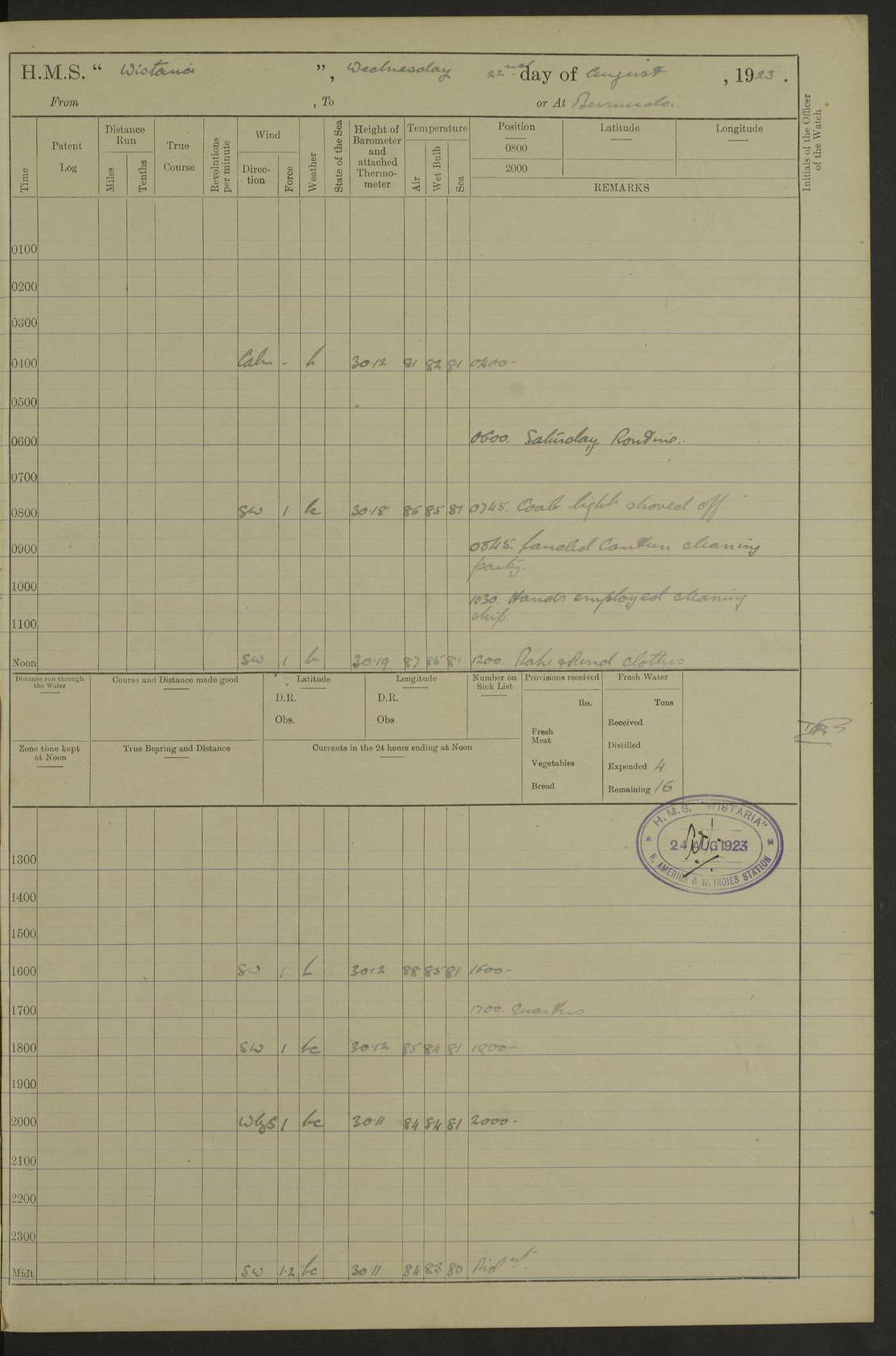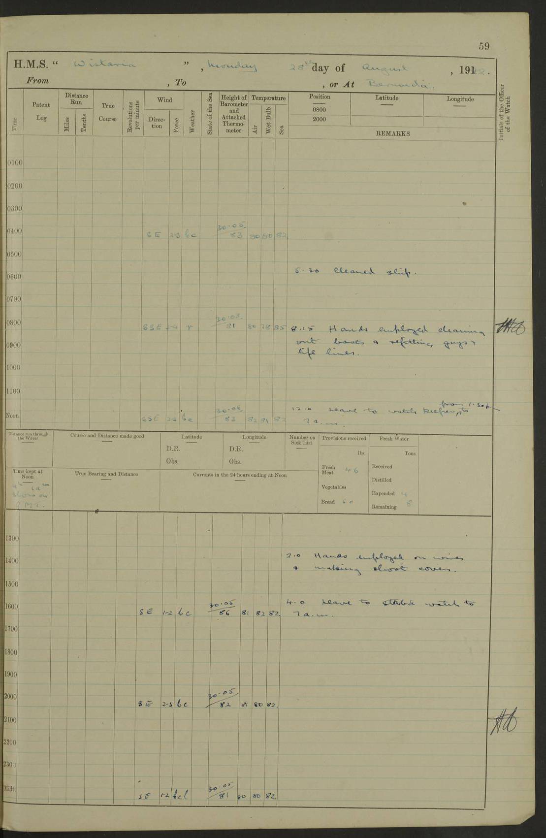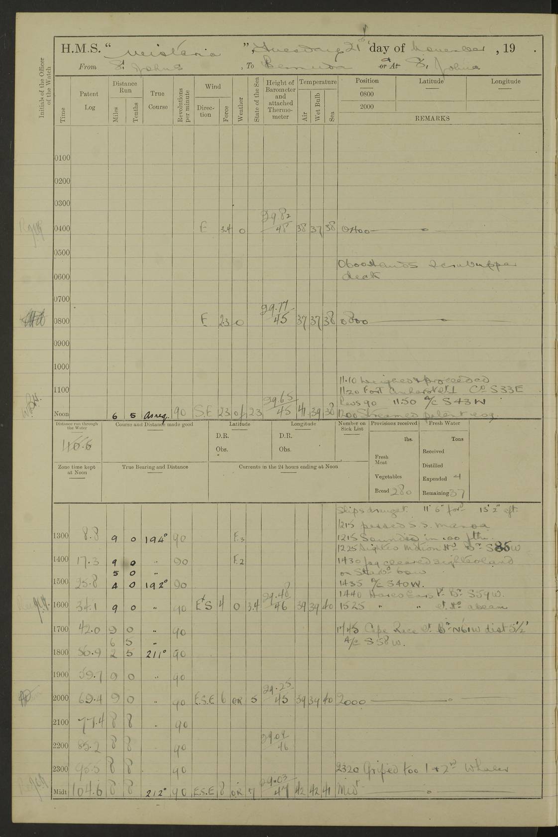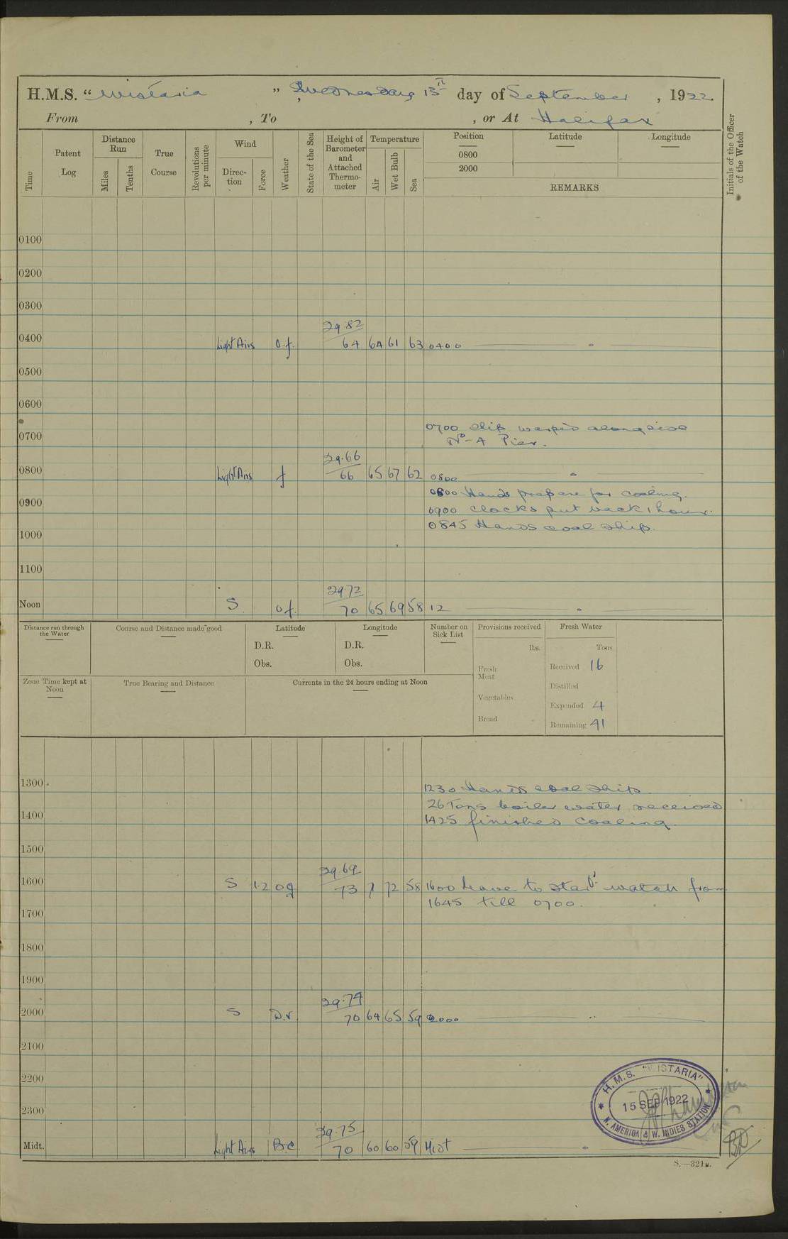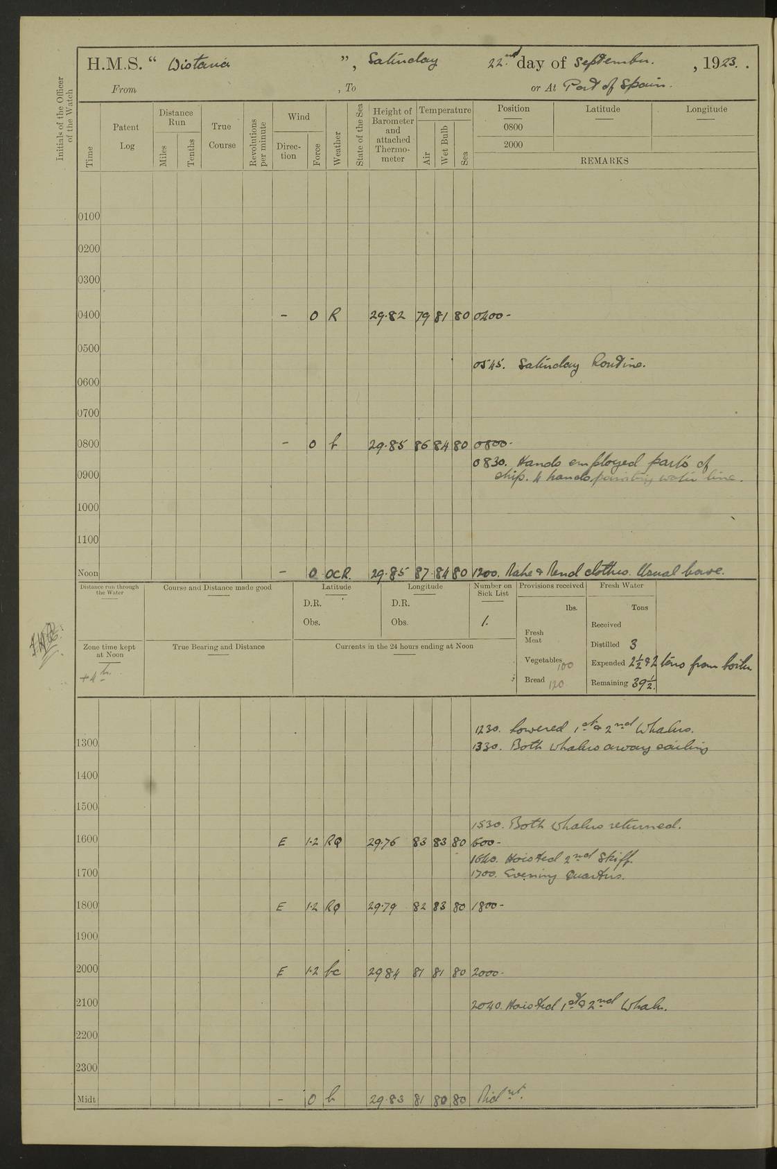 4f73caf5a2fc8ea903000c3b: (https://s3.amazonaws.com:443/oldweather/ADM53-93269/0003_1.jpg) 1 September 1922 At Bermuda Lat 32.32, Long -64.8 5.30am: Hands employed cleaning ship 8.15am: Hands employed ranging cable for survey Sunset 6.30 2.0pm: Hands employed scraping ship's bottom, and cleaning out cable lockers 4f73caf5a2fc8ea903000c3c: (https://s3.amazonaws.com:443/oldweather/ADM53-93269/0004_0.jpg) 2 September 1922 At Bermuda Lat 32.32, Long -64.8 5.30am: Hands employed cleaning ship 8.15am: Hands employed cleaning ship’s side pm: Commissioned Engineer discharged to hospital pm: 2 ratings joined ship from hospital 5.0pm: Exercised fires stations 4f73caf6a2fc8ea903000c3d: (https://s3.amazonaws.com:443/oldweather/ADM53-93269/0004_1.jpg) 3 September 1922 At Bermuda Lat 32.32, Long -64.8 6.0am: Hands employed cleaning ship (usual Sunday Routine) 8.0-8.45am: Hands clean up decks for Divisions 10.15am: Church of England Church party landed 6.0pm: Tested fire arrangements 4f73caf6a2fc8ea903000c3e: (https://s3.amazonaws.com:443/oldweather/ADM53-93269/0005_0.jpg) 4 September 1922 At Bermuda Lat 32.32, Long -64.8 5.30am: Hands employed scraping ship's bottom 8.15am: Hands employed painting ship's bottom 2.0pm: Hands employed as in the forenoon 4f73caf7a2fc8ea903000c3f: (https://s3.amazonaws.com:443/oldweather/ADM53-93269/0005_1.jpg) 5 September 1922 At Bermuda Lat 32.32, Long -64.8 5.30am: Hands employed painting ship's bottom 8.15am: Hands employed painting ship's bottom am: HMS “Valerian” came alongside in the South Basin am: 1 rating discharged to hospital 1.30pm: Hands employed as in forenoon 4f73caf7a2fc8ea903000c40: (https://s3.amazonaws.com:443/oldweather/ADM53-93269/0006_0.jpg) 6 September 1922 At Bermuda Lat 32.32, Long -64.8 5.40am: Hands employed painting ship's bottom am: 1 PO & 6 Hands employed stowing cable after survey 8.15am: Hands employed restowing cable and painting ship's bottom am: Leave to Engine room branch from 13.30-07.00 Port Watch 1 boatswains pipe lost by accident pm: Received 20 tons of boiled water 2.0pm: Hands employed restowing cable and painting ship's bottom 4f73caf7a2fc8ea903000c41: (https://s3.amazonaws.com:443/oldweather/ADM53-93269/0006_1.jpg) 7 September 1922 At Bermuda Lat 32.32, Long -64.8 6.30am: Hands employed cleaning ship 8.15am: Hands preparing for undocking ship 9.30am: Secured alongside by the sheerlegs am: Hands restowed ammunition 3.45pm: Exercised collision stations 4f73caf8a2fc8ea903000c42: (https://s3.amazonaws.com:443/oldweather/ADM53-93269/0007_0.jpg) 8 September 1922 At Bermuda Lat 32.32, Long -64.8 8.15am: Hands employed cleaning ship 9.30am: Divisions. Inspection of the ship by Captain the Hon. A. E. Strutt 10.10am: Hands muster by the ledger 11.0am: Cleared ship for action pm: 6 ratings joined ship from Hospital 1.30pm: Resumed inspection of the ship by Captain the Hon A. E. Strutt 2.45pm: Secured, replace gear [Captain the Honourable Arthur Charles Strutt] 4f73caf8a2fc8ea903000c43: (https://s3.amazonaws.com:443/oldweather/ADM53-93269/0007_1.jpg) 9 September 1922 From Bermuda to Halifax N.S., and at Bermuda Lat 32.32, Long -64.8 8.15am: Hands employed provisioning ship pm: 12 ratings discharged to HMS “Dartmouth” pm: 18 ratings joined ship pm: Received 7 tons of boiler water 2.0pm: Hands employed securing ship for sea 4.0pm: Slipped from Jetty & proceeded out 4.15pm: Stopped in Grassy Bay, and hoisted motor boat 4.30pm: Proceeded at 96 revs. Co as requisite for Ship Channel and Narrows 5.49pm: Fairway buoy abeam. Course East 6.04pm: Mills Breaker buoy abeam, 8 cables 6.19pm: Kitchen Shoals buoy abeam, 1 mile 6.35pm: Streamed log [Mills Breaker buoy coordinates: Lat 32 23.9N, Long 64 36.9W] [Kitchen Shoal beacon coordinates: Lat 32 26.1N, Long 64 37.6W] 4f73caf8a2fc8ea903000c44: (https://s3.amazonaws.com:443/oldweather/ADM53-93269/0008_0.jpg) 10 September 1922 From Bermuda to Halifax Lat 35.06, Long -64.5 9.45am: Divisions & Prayers pm: Usual Sunday Routine 4.05pm: Hauled in, cleaned & streamed patent log 5.0pm: Put clocks on 20 minutes 5.30pm: Exercised sounding party True Bearing and Distance: Chebucto Head 004°½, 566 miles 4f73caf9a2fc8ea903000c45: (https://s3.amazonaws.com:443/oldweather/ADM53-93269/0008_1.jpg) 11 September 1922 From Bermuda to Halifax Lat 38.88, Long -64.3 3.0am: Within strong W/T touch with “Cape Town” 5.25am: Spoke “Cape Town” am: Divisions & Prayers, Exercised action am: Exchanged names with British Steamer “San Valerio”, Eagle Oil Co. Lat 38 35N, Long 63 55W 10.10am: Secure pm: Hands employed painting lower boom gear & waterways & cleaning out 2nd whaler 4.50pm: Exercised sounding party 5.0pm: Put clocks on ½ hour 10.10pm: Stopped engines, helm jammed 10.12pm: Hauled in patent log 10.35pm: Resumed Co & speed; hand wheel connected up. Course below NNE 10.45pm: Streamed patent log True Bearing and Distance: Chebucto Head 005°, 332 miles 4f73caf9a2fc8ea903000c46: (https://s3.amazonaws.com:443/oldweather/ADM53-93269/0009_0.jpg) 12 September 1922 From Bermuda to Halifax Lat 42.85, Long -63.81 am: Steering by hand 9.45am: Ord Seamen & Boys to 4” instruction pm: 1 hand scrubber lost by accident pm: 1 whalers oar lost by accident 5.0pm: Altered course N36E (steering NNE½E). Put clocks on 1/2 hour 8.15pm: Sighted Sambro Lt bearing N20E 8.40pm: Sighted Chebucto Head Lt bearing N18E 9.27pm: Sambro Lt buoy abeam, 2 miles 10.07pm: Sambro Lt abeam 10.10pm: Chebucto Lt abeam 10.20pm: Hauled in Patent log 11.20pm: Mauger Beach Lt abeam 11.52pm: Let go off No 4 wharf with 2½ shackles True Bearing and Distance: Chebucto Head 007, 100 miles 4f73cafaa2fc8ea903000c47: (https://s3.amazonaws.com:443/oldweather/ADM53-93269/0009_1.jpg) 13 September 1922 At Halifax Lat 44.69, Long -63.64 7.0am: Ship wharped alongside No 4 pier 8.0am: Hands prepare for coaling 8.45am: Hands coal ship 9.0am: Clocks put back 1 hour 12.30pm: Hands coal ship pm: 26 tons boiler water received 2.25pm: Finished coaling 4f73cafaa2fc