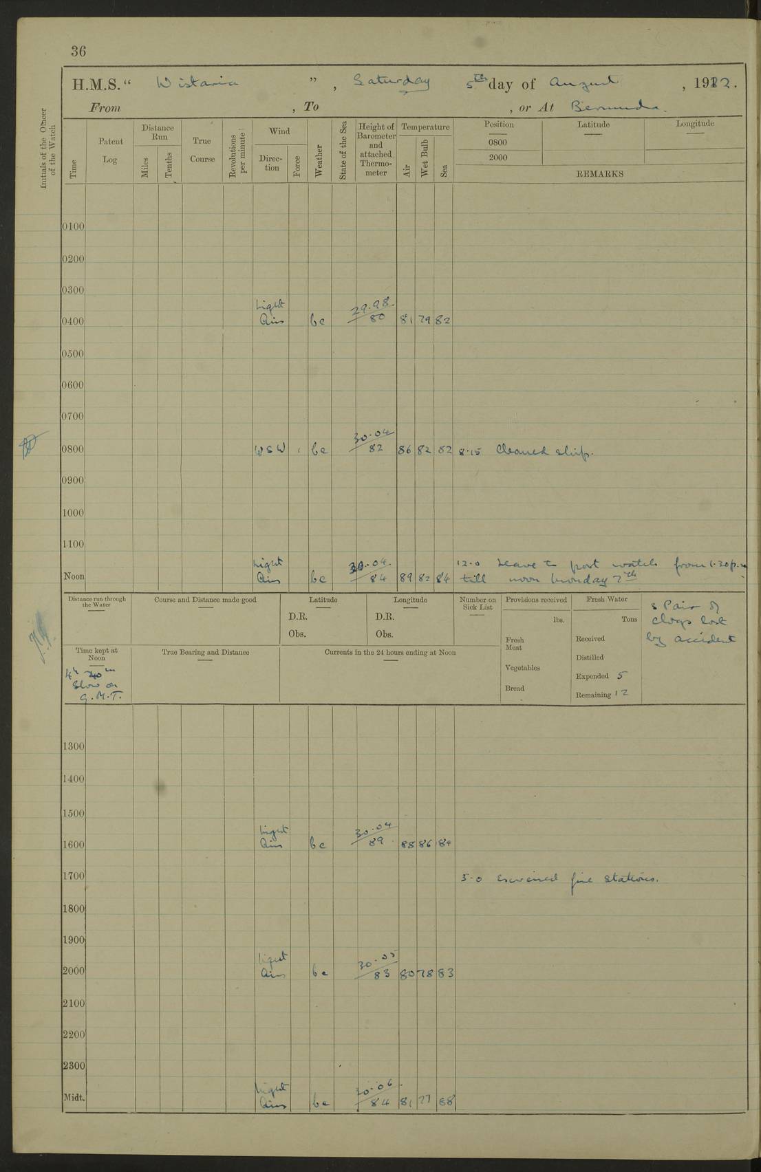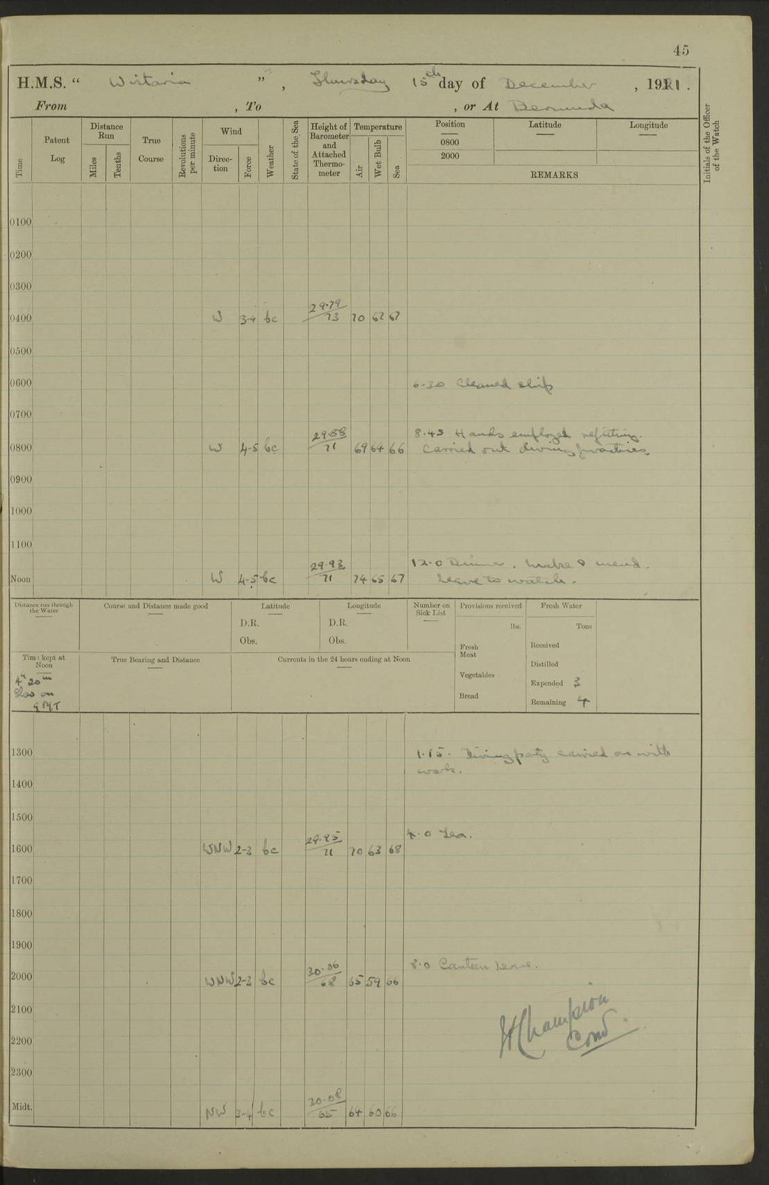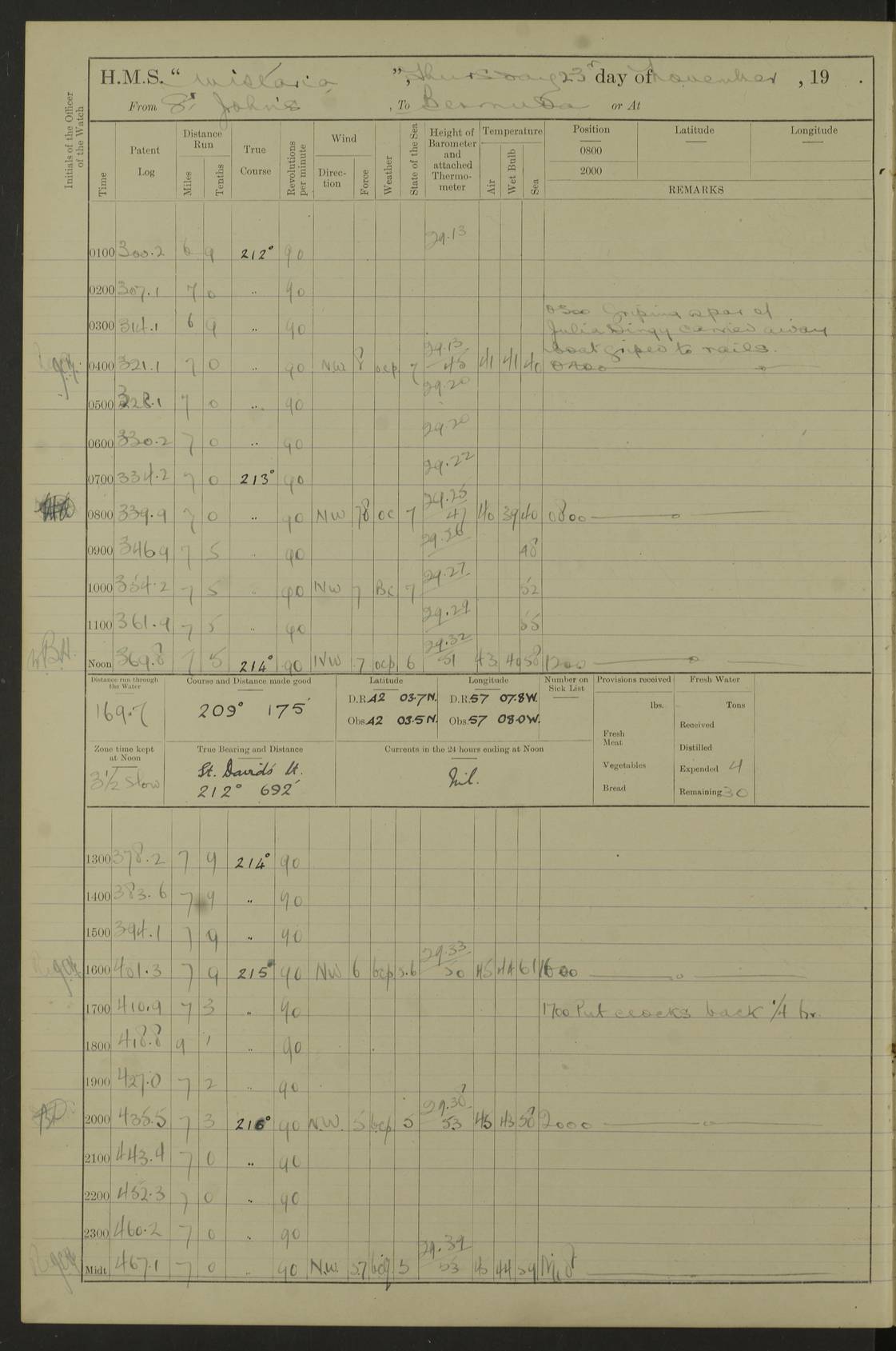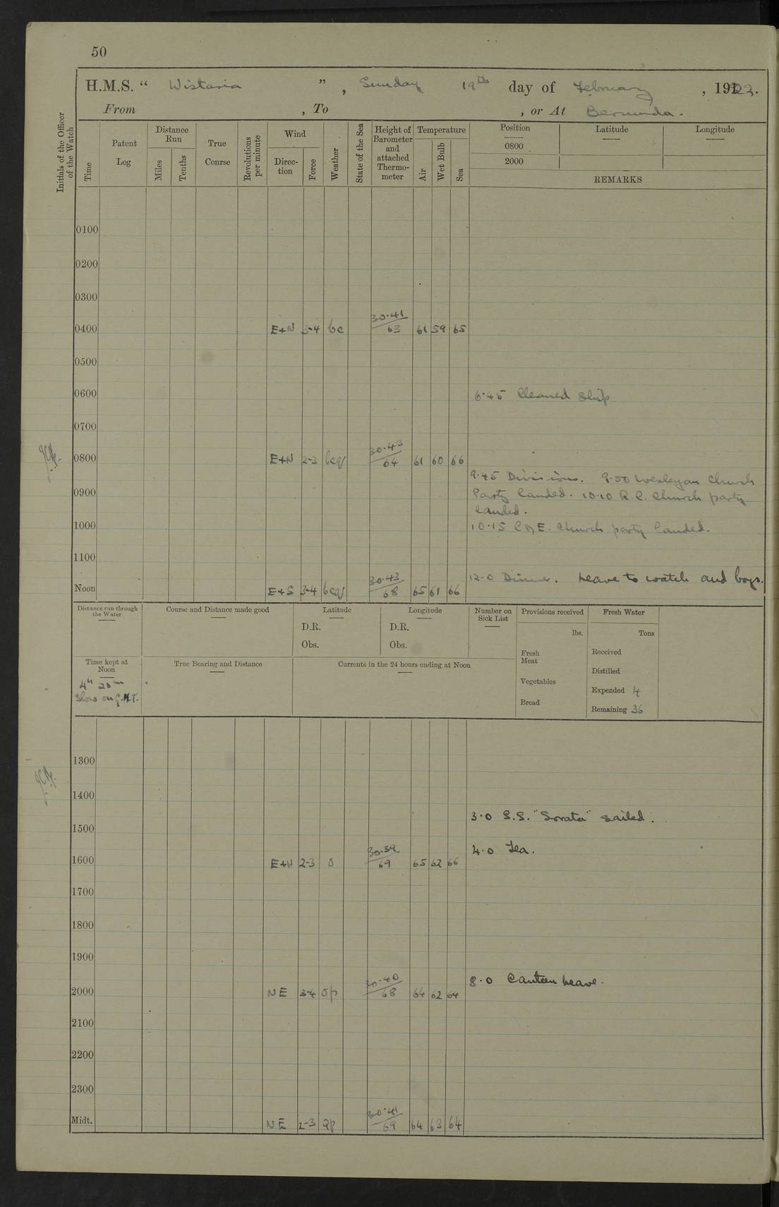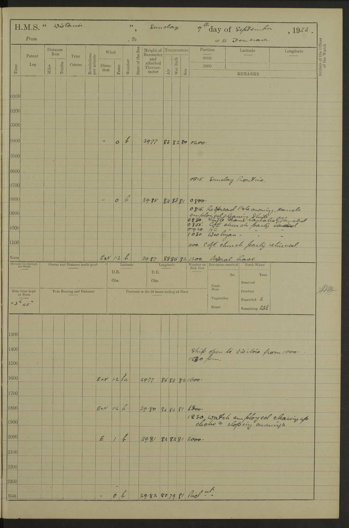 4f73caf5a2fc8ea903000c3b: (https://s3.amazonaws.com:443/oldweather/ADM53-93269/0003_1.jpg) 1 September 1922 At Bermuda Lat 32.32, Long -64.8 5.30am: Hands employed cleaning ship 8.15am: Hands employed ranging cable for survey Sunset 6.30 2.0pm: Hands employed scraping ship's bottom, and cleaning out cable lockers 4f73caf5a2fc8ea903000c3c: (https://s3.amazonaws.com:443/oldweather/ADM53-93269/0004_0.jpg) 2 September 1922 At Bermuda Lat 32.32, Long -64.8 5.30am: Hands employed cleaning ship 8.15am: Hands employed cleaning ship’s side pm: Commissioned Engineer discharged to hospital pm: 2 ratings joined ship from hospital 5.0pm: Exercised fires stations 4f73caf6a2fc8ea903000c3d: (https://s3.amazonaws.com:443/oldweather/ADM53-93269/0004_1.jpg) 3 September 1922 At Bermuda Lat 32.32, Long -64.8 6.0am: Hands employed cleaning ship (usual Sunday Routine) 8.0-8.45am: Hands clean up decks for Divisions 10.15am: Church of England Church party landed 6.0pm: Tested fire arrangements 4f73caf6a2fc8ea903000c3e: (https://s3.amazonaws.com:443/oldweather/ADM53-93269/0005_0.jpg) 4 September 1922 At Bermuda Lat 32.32, Long -64.8 5.30am: Hands employed scraping ship's bottom 8.15am: Hands employed painting ship's bottom 2.0pm: Hands employed as in the forenoon 4f73caf7a2fc8ea903000c3f: (https://s3.amazonaws.com:443/oldweather/ADM53-93269/0005_1.jpg) 5 September 1922 At Bermuda Lat 32.32, Long -64.8 5.30am: Hands employed painting ship's bottom 8.15am: Hands employed painting ship's bottom am: HMS “Valerian” came alongside in the South Basin am: 1 rating discharged to hospital 1.30pm: Hands employed as in forenoon 4f73caf7a2fc8ea903000c40: (https://s3.amazonaws.com:443/oldweather/ADM53-93269/0006_0.jpg) 6 September 1922 At Bermuda Lat 32.32, Long -64.8 5.40am: Hands employed painting ship's bottom am: 1 PO & 6 Hands employed stowing cable after survey 8.15am: Hands employed restowing cable and painting ship's bottom am: Leave to Engine room branch from 13.30-07.00 Port Watch 1 boatswains pipe lost by accident pm: Received 20 tons of boiled water 2.0pm: Hands employed restowing cable and painting ship's bottom 4f73caf7a2fc8ea903000c41: (https://s3.amazonaws.com:443/oldweather/ADM53-93269/0006_1.jpg) 7 September 1922 At Bermuda Lat 32.32, Long -64.8 6.30am: Hands employed cleaning ship 8.15am: Hands preparing for undocking ship 9.30am: Secured alongside by the sheerlegs am: Hands restowed ammunition 3.45pm: Exercised collision stations 4f73caf8a2fc8ea903000c42: (https://s3.amazonaws.com:443/oldweather/ADM53-93269/0007_0.jpg) 8 September 1922 At Bermuda Lat 32.32, Long -64.8 8.15am: Hands employed cleaning ship 9.30am: Divisions. Inspection of the ship by Captain the Hon. A. E. Strutt 10.10am: Hands muster by the ledger 11.0am: Cleared ship for action pm: 6 ratings joined ship from Hospital 1.30pm: Resumed inspection of the ship by Captain the Hon A. E. Strutt 2.45pm: Secured, replace gear [Captain the Honourable Arthur Charles Strutt] 4f73caf8a2fc8ea903000c43: (https://s3.amazonaws.com:443/oldweather/ADM53-93269/0007_1.jpg) 9 September 1922 From Bermuda to Halifax N.S., and at Bermuda Lat 32.32, Long -64.8 8.15am: Hands employed provisioning ship pm: 12 ratings discharged to HMS “Dartmouth” pm: 18 ratings joined ship pm: Received 7 tons of boiler water 2.0pm: Hands employed securing ship for sea 4.0pm: Slipped from Jetty & proceeded out 4.15pm: Stopped in Grassy Bay, and hoisted motor boat 4.30pm: Proceeded at 96 revs. Co as requisite for Ship Channel and Narrows 5.49pm: Fairway buoy abeam. Course East 6.04pm: Mills Breaker buoy abeam, 8 cables 6.19pm: Kitchen Shoals buoy abeam, 1 mile 6.35pm: Streamed log [Mills Breaker buoy coordinates: Lat 32 23.9N, Long 64 36.9W] [Kitchen Shoal beacon coordinates: Lat 32 26.1N, Long 64 37.6W] 4f73caf8a2fc8ea903000c44: (https://s3.amazonaws.com:443/oldweather/ADM53-93269/0008_0.jpg) 10 September 1922 From Bermuda to Halifax Lat 35.06, Long -64.5 9.45am: Divisions & Prayers pm: Usual Sunday Routine 4.05pm: Hauled in, cleaned & streamed patent log 5.0pm: Put clocks on 20 minutes 5.30pm: Exercised sounding party True Bearing and Distance: Chebucto Head 004°½, 566 miles 4f73caf9a2fc8ea903000c45: (https://s3.amazonaws.com:443/oldweather/ADM53-93269/0008_1.jpg) 11 September 1922 From Bermuda to Halifax Lat 38.88, Long -64.3 3.0am: Within strong W/T touch with “Cape Town” 5.25am: Spoke “Cape Town” am: Divisions & Prayers, Exercised action am: Exchanged names with British Steamer “San Valerio”, Eagle Oil Co. Lat 38 35N, Long 63 55W 10.10am: Secure pm: Hands employed painting lower boom gear & waterways & cleaning out 2nd whaler 4.50pm: Exercised sounding party 5.0pm: Put clocks on ½ hour 10.10pm: Stopped engines, helm jammed 10.12pm: Hauled in patent log 10.35pm: Resumed Co & speed; hand wheel connected up. Course below NNE 10.45pm: Streamed patent log True Bearing and Distance: Chebucto Head 005°, 332 miles 4f73caf9a2fc8ea903000c46: (https://s3.amazonaws.com:443/oldweather/ADM53-93269/0009_0.jpg) 12 September 1922 From Bermuda to Halifax Lat 42.85, Long -63.81 am: Steering by hand 9.45am: Ord Seamen & Boys to 4” instruction pm: 1 hand scrubber lost by accident pm: 1 whalers oar lost by accident 5.0pm: Altered course N36E (steering NNE½E). Put clocks on 1/2 hour 8.15pm: Sighted Sambro Lt bearing N20E 8.40pm: Sighted Chebucto Head Lt bearing N18E 9.27pm: Sambro Lt buoy abeam, 2 miles 10.07pm: Sambro Lt abeam 10.10pm: Chebucto Lt abeam 10.20pm: Hauled in Patent log 11.20pm: Mauger Beach Lt abeam 11.52pm: Let go off No 4 wharf with 2½ shackles True Bearing and Distance: Chebucto Head 007, 100 miles 4f73cafaa2fc8ea903000c47: (https://s3.amazonaws.com:443/oldweather/ADM53-93269/0009_1.jpg) 13 September 1922 At Halifax Lat 44.69, Long -63.64 7.0am: Ship wharped alongside No 4 pier 8.0am: Hands prepare for coaling 8.45am: Hands coal ship 9.0am: Clocks put back 1 hour 12.30pm: Hands coal ship pm: 26 tons boiler water received 2.25pm: Finished coaling 4f73cafaa2fc