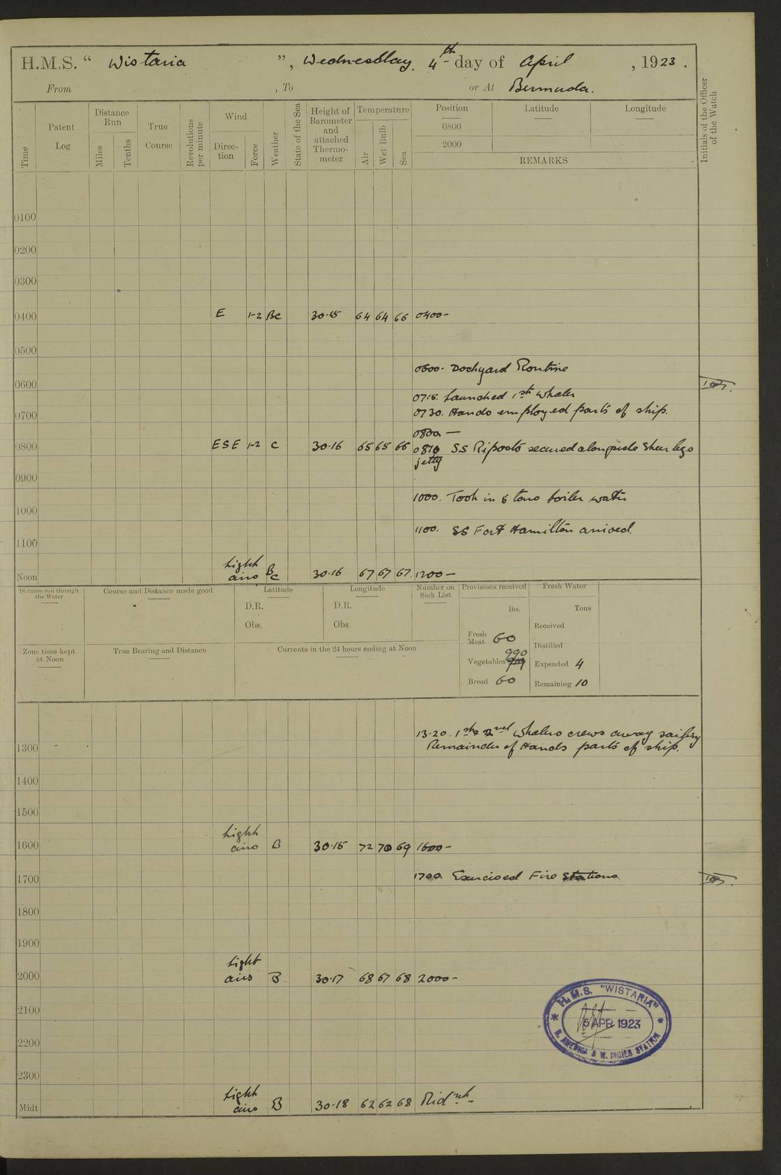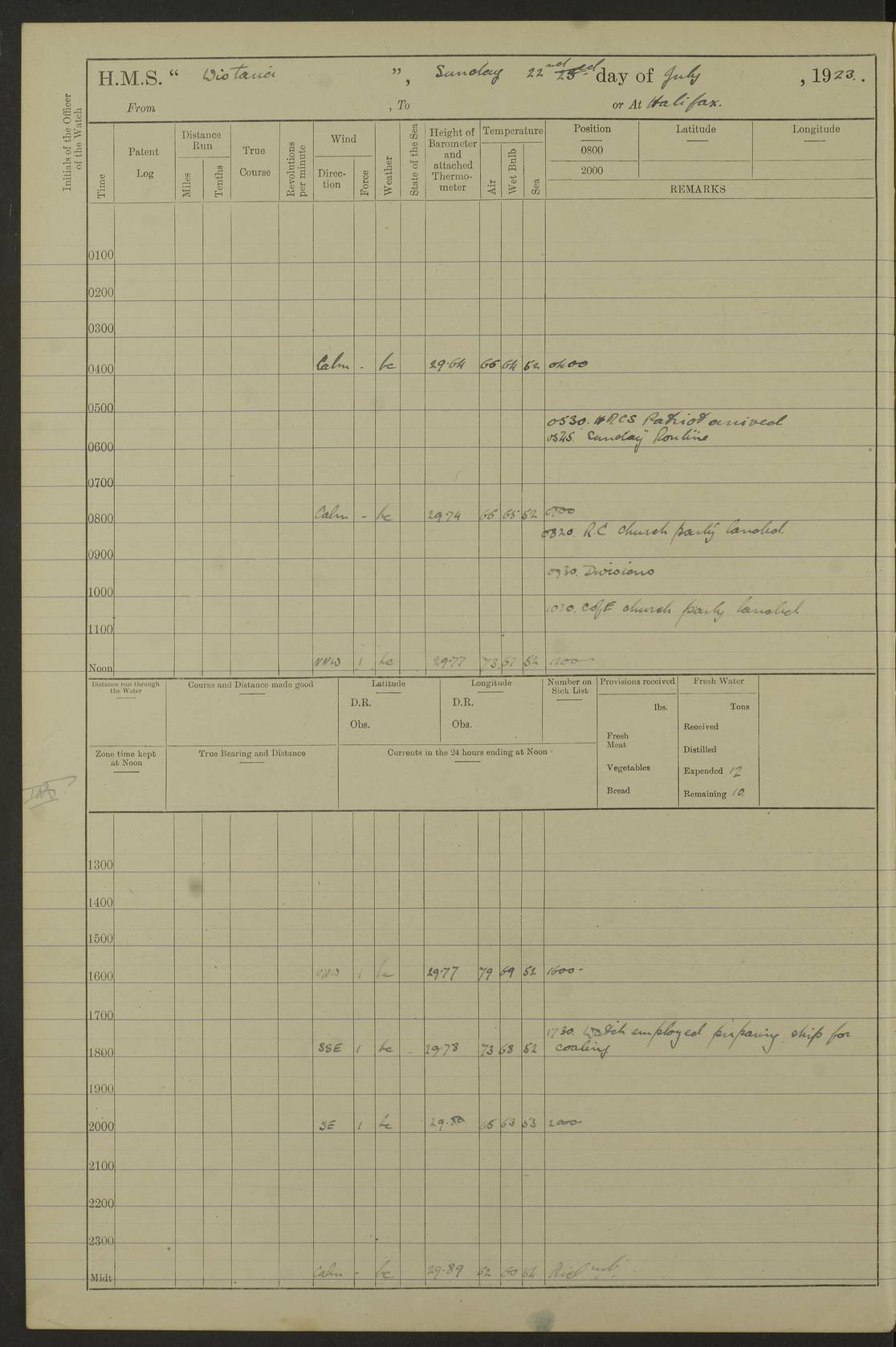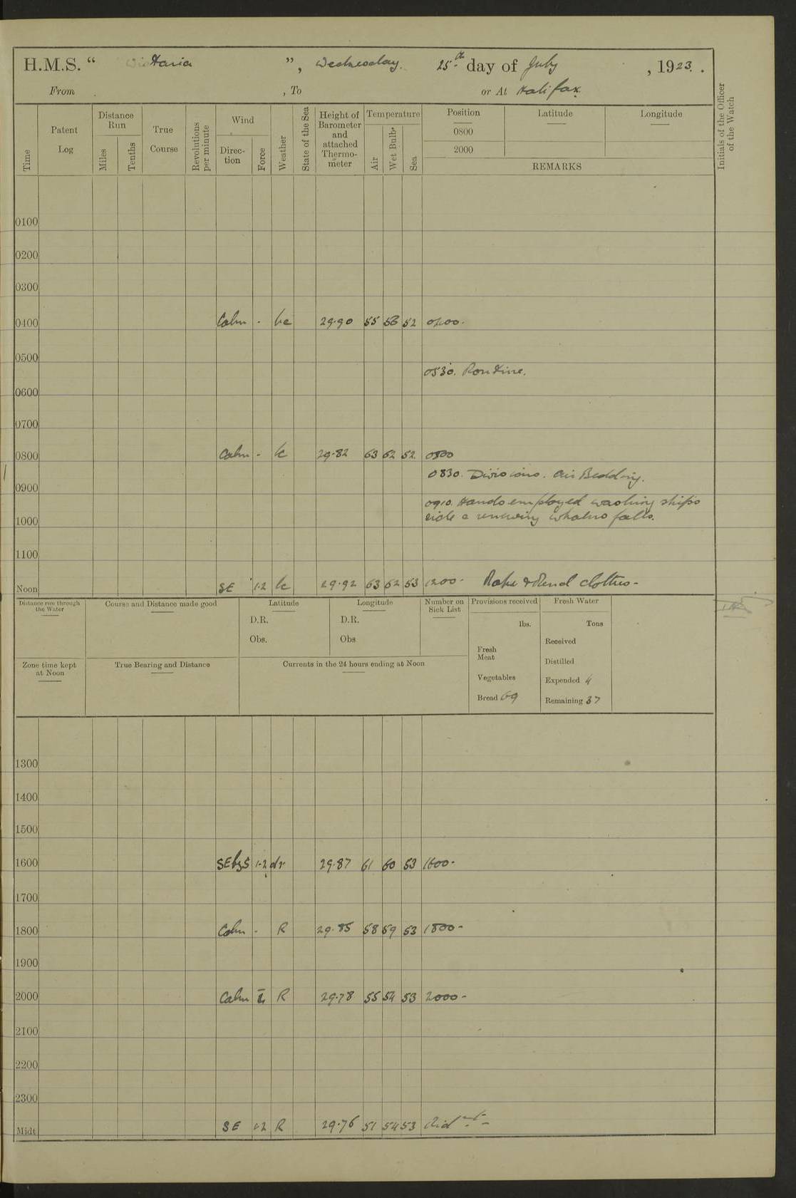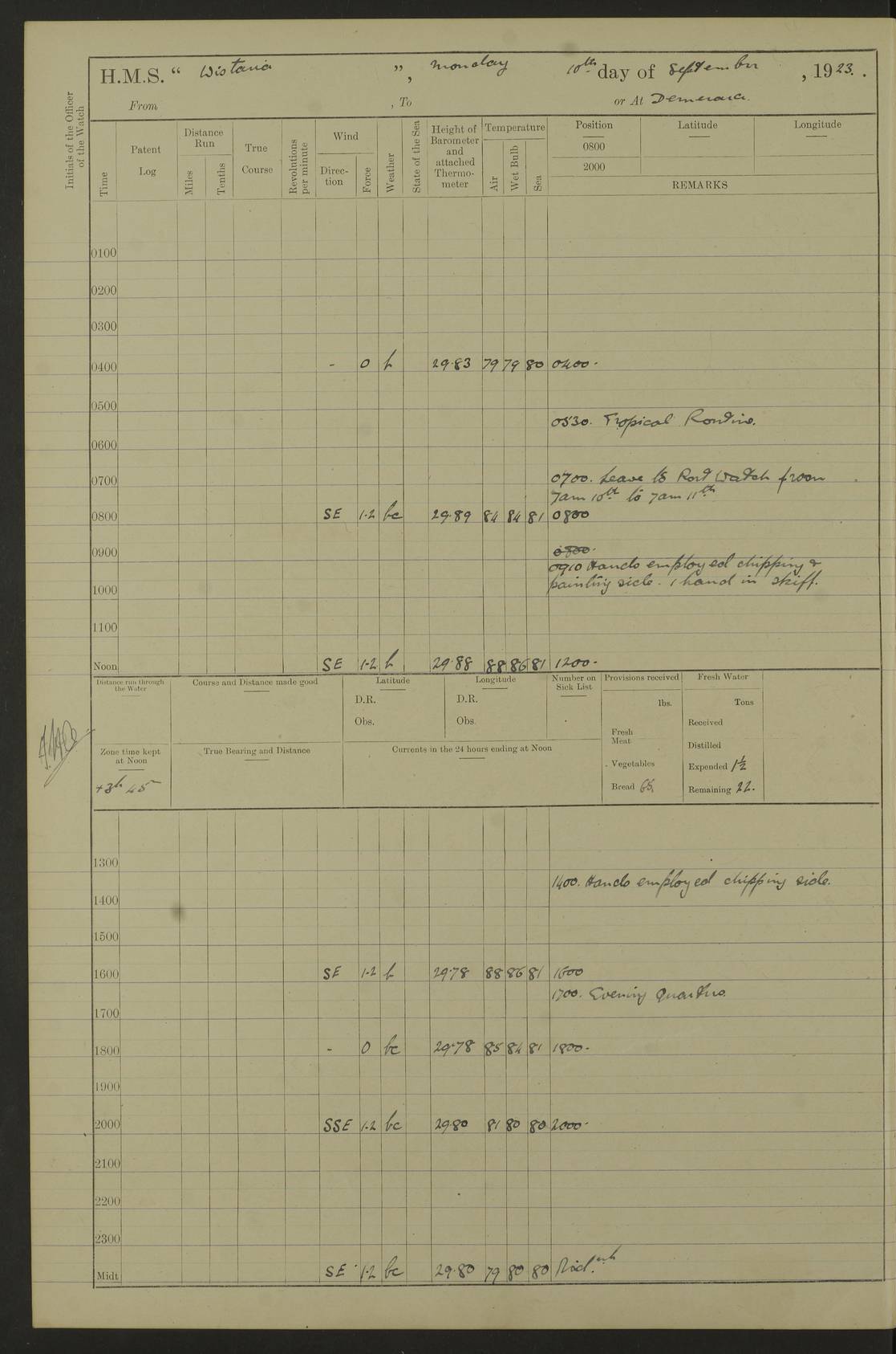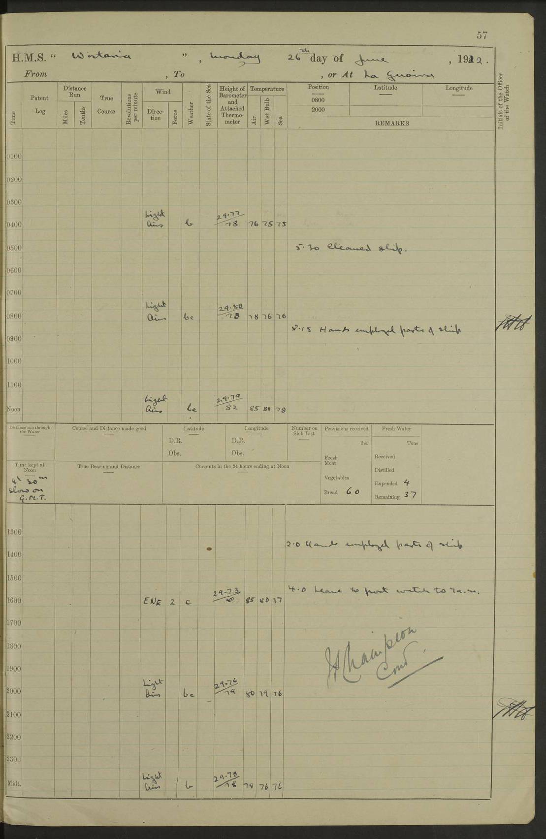 4f73caf5a2fc8ea903000c3b: (https://s3.amazonaws.com:443/oldweather/ADM53-93269/0003_1.jpg) 1 September 1922 At Bermuda Lat 32.32, Long -64.8 5.30am: Hands employed cleaning ship 8.15am: Hands employed ranging cable for survey Sunset 6.30 2.0pm: Hands employed scraping ship's bottom, and cleaning out cable lockers 4f73caf5a2fc8ea903000c3c: (https://s3.amazonaws.com:443/oldweather/ADM53-93269/0004_0.jpg) 2 September 1922 At Bermuda Lat 32.32, Long -64.8 5.30am: Hands employed cleaning ship 8.15am: Hands employed cleaning ship’s side pm: Commissioned Engineer discharged to hospital pm: 2 ratings joined ship from hospital 5.0pm: Exercised fires stations 4f73caf6a2fc8ea903000c3d: (https://s3.amazonaws.com:443/oldweather/ADM53-93269/0004_1.jpg) 3 September 1922 At Bermuda Lat 32.32, Long -64.8 6.0am: Hands employed cleaning ship (usual Sunday Routine) 8.0-8.45am: Hands clean up decks for Divisions 10.15am: Church of England Church party landed 6.0pm: Tested fire arrangements 4f73caf6a2fc8ea903000c3e: (https://s3.amazonaws.com:443/oldweather/ADM53-93269/0005_0.jpg) 4 September 1922 At Bermuda Lat 32.32, Long -64.8 5.30am: Hands employed scraping ship's bottom 8.15am: Hands employed painting ship's bottom 2.0pm: Hands employed as in the forenoon 4f73caf7a2fc8ea903000c3f: (https://s3.amazonaws.com:443/oldweather/ADM53-93269/0005_1.jpg) 5 September 1922 At Bermuda Lat 32.32, Long -64.8 5.30am: Hands employed painting ship's bottom 8.15am: Hands employed painting ship's bottom am: HMS “Valerian” came alongside in the South Basin am: 1 rating discharged to hospital 1.30pm: Hands employed as in forenoon 4f73caf7a2fc8ea903000c40: (https://s3.amazonaws.com:443/oldweather/ADM53-93269/0006_0.jpg) 6 September 1922 At Bermuda Lat 32.32, Long -64.8 5.40am: Hands employed painting ship's bottom am: 1 PO & 6 Hands employed stowing cable after survey 8.15am: Hands employed restowing cable and painting ship's bottom am: Leave to Engine room branch from 13.30-07.00 Port Watch 1 boatswains pipe lost by accident pm: Received 20 tons of boiled water 2.0pm: Hands employed restowing cable and painting ship's bottom 4f73caf7a2fc8ea903000c41: (https://s3.amazonaws.com:443/oldweather/ADM53-93269/0006_1.jpg) 7 September 1922 At Bermuda Lat 32.32, Long -64.8 6.30am: Hands employed cleaning ship 8.15am: Hands preparing for undocking ship 9.30am: Secured alongside by the sheerlegs am: Hands restowed ammunition 3.45pm: Exercised collision stations 4f73caf8a2fc8ea903000c42: (https://s3.amazonaws.com:443/oldweather/ADM53-93269/0007_0.jpg) 8 September 1922 At Bermuda Lat 32.32, Long -64.8 8.15am: Hands employed cleaning ship 9.30am: Divisions. Inspection of the ship by Captain the Hon. A. E. Strutt 10.10am: Hands muster by the ledger 11.0am: Cleared ship for action pm: 6 ratings joined ship from Hospital 1.30pm: Resumed inspection of the ship by Captain the Hon A. E. Strutt 2.45pm: Secured, replace gear [Captain the Honourable Arthur Charles Strutt] 4f73caf8a2fc8ea903000c43: (https://s3.amazonaws.com:443/oldweather/ADM53-93269/0007_1.jpg) 9 September 1922 From Bermuda to Halifax N.S., and at Bermuda Lat 32.32, Long -64.8 8.15am: Hands employed provisioning ship pm: 12 ratings discharged to HMS “Dartmouth” pm: 18 ratings joined ship pm: Received 7 tons of boiler water 2.0pm: Hands employed securing ship for sea 4.0pm: Slipped from Jetty & proceeded out 4.15pm: Stopped in Grassy Bay, and hoisted motor boat 4.30pm: Proceeded at 96 revs. Co as requisite for Ship Channel and Narrows 5.49pm: Fairway buoy abeam. Course East 6.04pm: Mills Breaker buoy abeam, 8 cables 6.19pm: Kitchen Shoals buoy abeam, 1 mile 6.35pm: Streamed log [Mills Breaker buoy coordinates: Lat 32 23.9N, Long 64 36.9W] [Kitchen Shoal beacon coordinates: Lat 32 26.1N, Long 64 37.6W] 4f73caf8a2fc8ea903000c44: (https://s3.amazonaws.com:443/oldweather/ADM53-93269/0008_0.jpg) 10 September 1922 From Bermuda to Halifax Lat 35.06, Long -64.5 9.45am: Divisions & Prayers pm: Usual Sunday Routine 4.05pm: Hauled in, cleaned & streamed patent log 5.0pm: Put clocks on 20 minutes 5.30pm: Exercised sounding party True Bearing and Distance: Chebucto Head 004°½, 566 miles 4f73caf9a2fc8ea903000c45: (https://s3.amazonaws.com:443/oldweather/ADM53-93269/0008_1.jpg) 11 September 1922 From Bermuda to Halifax Lat 38.88, Long -64.3 3.0am: Within strong W/T touch with “Cape Town” 5.25am: Spoke “Cape Town” am: Divisions & Prayers, Exercised action am: Exchanged names with British Steamer “San Valerio”, Eagle Oil Co. Lat 38 35N, Long 63 55W 10.10am: Secure pm: Hands employed painting lower boom gear & waterways & cleaning out 2nd whaler 4.50pm: Exercised sounding party 5.0pm: Put clocks on ½ hour 10.10pm: Stopped engines, helm jammed 10.12pm: Hauled in patent log 10.35pm: Resumed Co & speed; hand wheel connected up. Course below NNE 10.45pm: Streamed patent log True Bearing and Distance: Chebucto Head 005°, 332 miles 4f73caf9a2fc8ea903000c46: (https://s3.amazonaws.com:443/oldweather/ADM53-93269/0009_0.jpg) 12 September 1922 From Bermuda to Halifax Lat 42.85, Long -63.81 am: Steering by hand 9.45am: Ord Seamen & Boys to 4” instruction pm: 1 hand scrubber lost by accident pm: 1 whalers oar lost by accident 5.0pm: Altered course N36E (steering NNE½E). Put clocks on 1/2 hour 8.15pm: Sighted Sambro Lt bearing N20E 8.40pm: Sighted Chebucto Head Lt bearing N18E 9.27pm: Sambro Lt buoy abeam, 2 miles 10.07pm: Sambro Lt abeam 10.10pm: Chebucto Lt abeam 10.20pm: Hauled in Patent log 11.20pm: Mauger Beach Lt abeam 11.52pm: Let go off No 4 wharf with 2½ shackles True Bearing and Distance: Chebucto Head 007, 100 miles 4f73cafaa2fc8ea903000c47: (https://s3.amazonaws.com:443/oldweather/ADM53-93269/0009_1.jpg) 13 September 1922 At Halifax Lat 44.69, Long -63.64 7.0am: Ship wharped alongside No 4 pier 8.0am: Hands prepare for coaling 8.45am: Hands coal ship 9.0am: Clocks put back 1 hour 12.30pm: Hands coal ship pm: 26 tons boiler water received 2.25pm: Finished coaling 4f73cafaa2fc