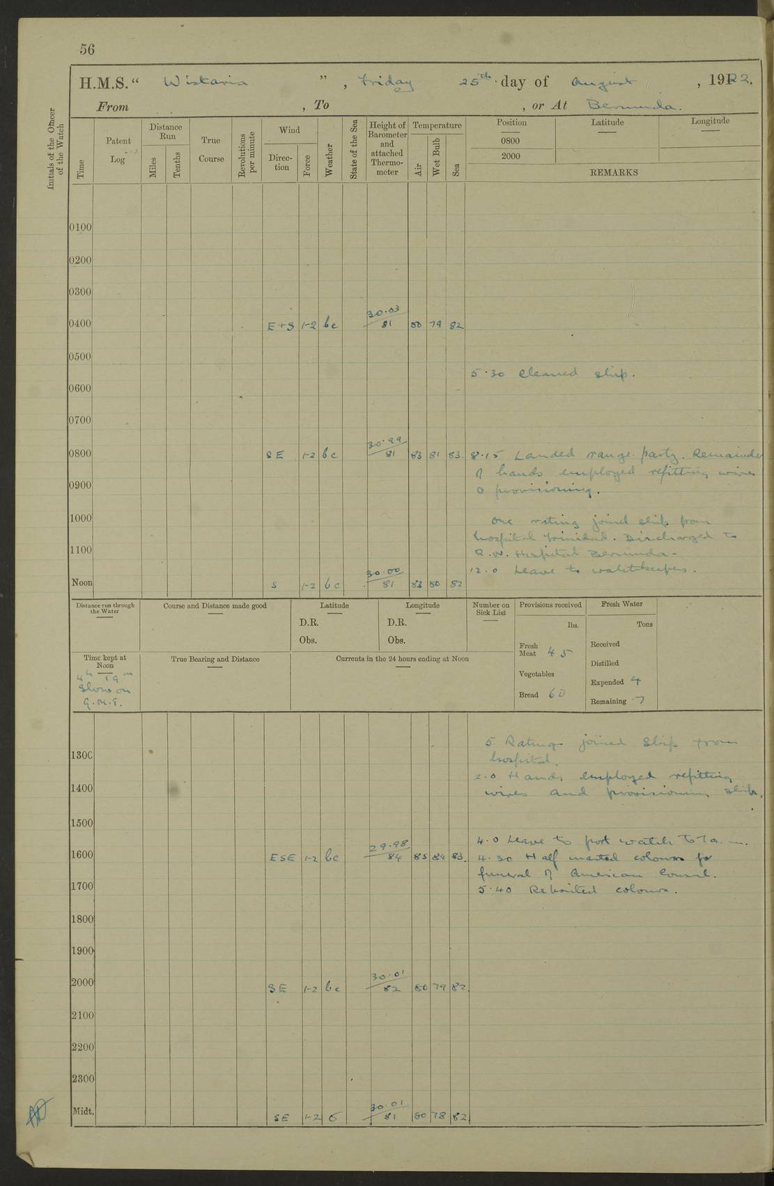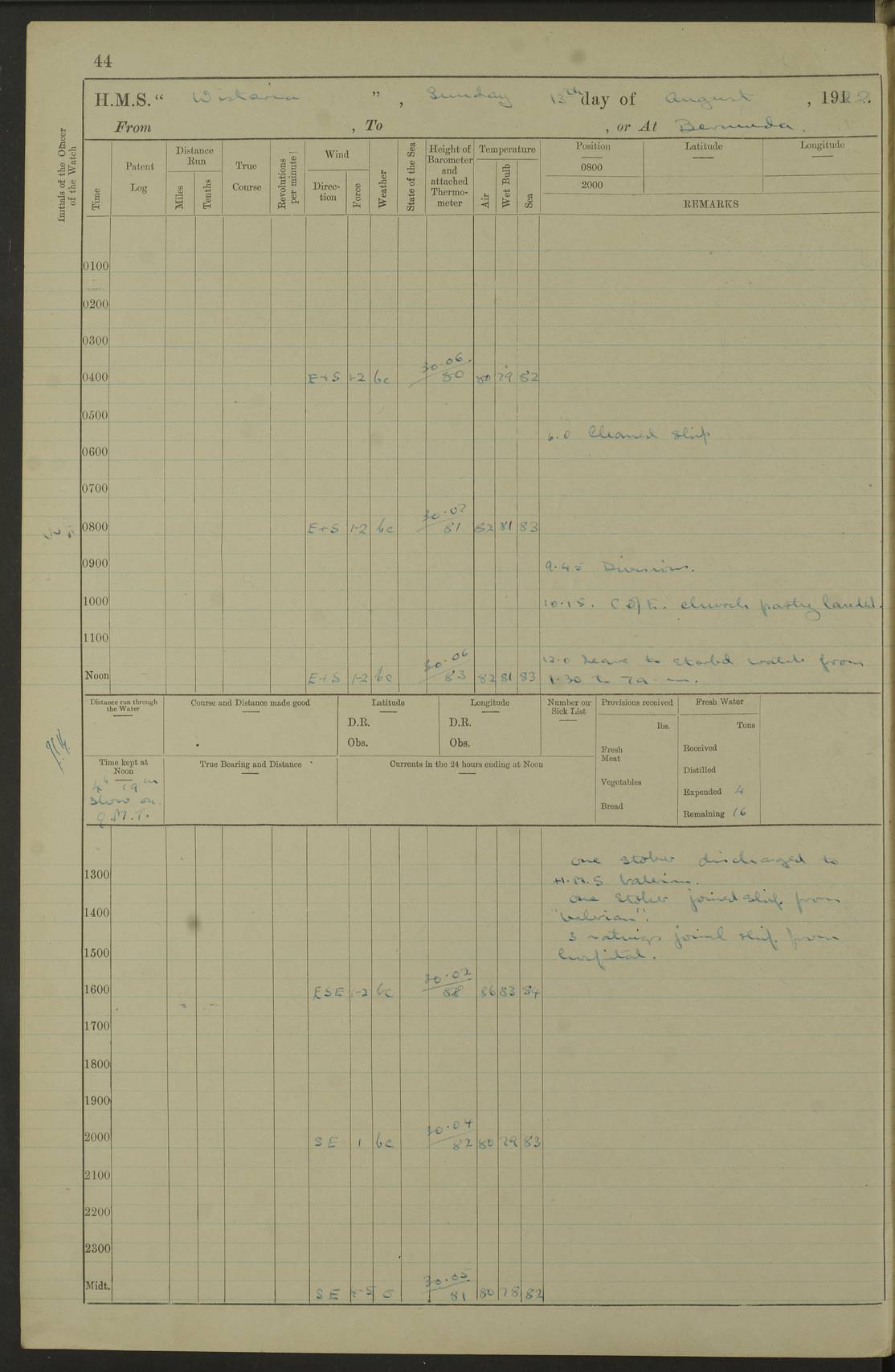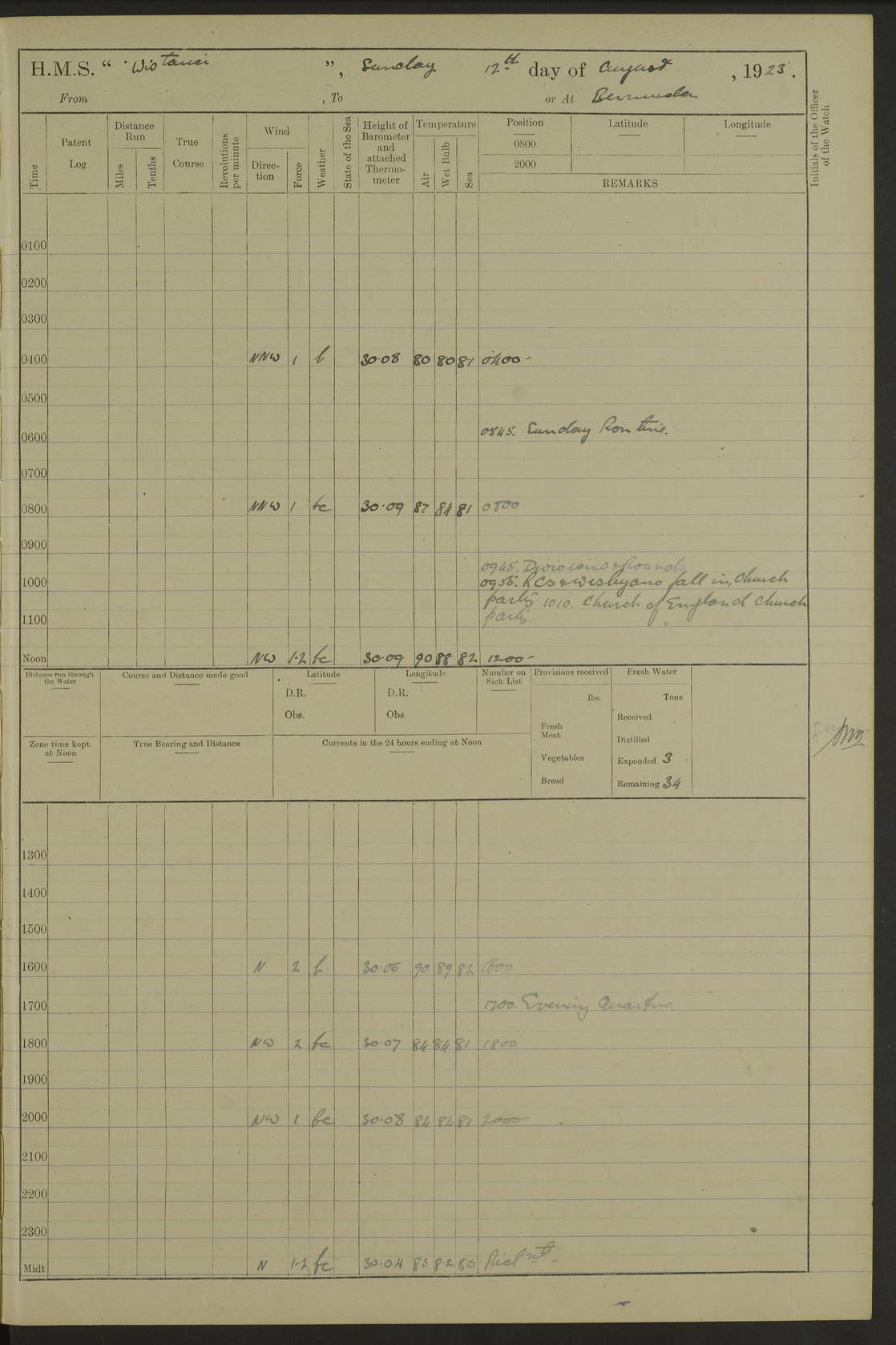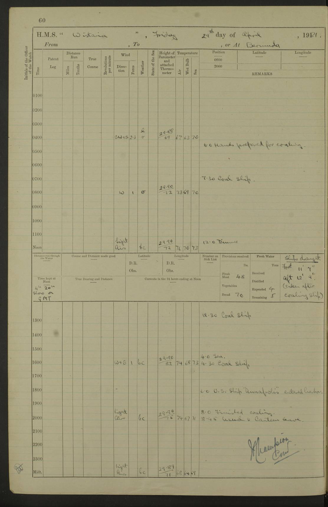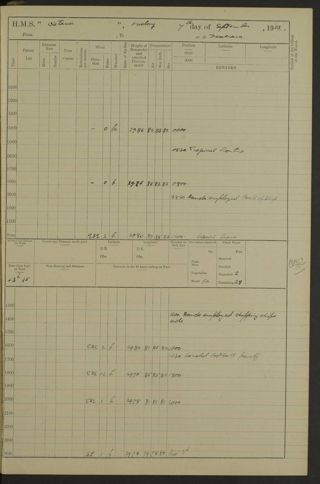 4f73caf5a2fc8ea903000c3b: (https://s3.amazonaws.com:443/oldweather/ADM53-93269/0003_1.jpg) 1 September 1922 At Bermuda Lat 32.32, Long -64.8 5.30am: Hands employed cleaning ship 8.15am: Hands employed ranging cable for survey Sunset 6.30 2.0pm: Hands employed scraping ship's bottom, and cleaning out cable lockers 4f73caf5a2fc8ea903000c3c: (https://s3.amazonaws.com:443/oldweather/ADM53-93269/0004_0.jpg) 2 September 1922 At Bermuda Lat 32.32, Long -64.8 5.30am: Hands employed cleaning ship 8.15am: Hands employed cleaning ship’s side pm: Commissioned Engineer discharged to hospital pm: 2 ratings joined ship from hospital 5.0pm: Exercised fires stations 4f73caf6a2fc8ea903000c3d: (https://s3.amazonaws.com:443/oldweather/ADM53-93269/0004_1.jpg) 3 September 1922 At Bermuda Lat 32.32, Long -64.8 6.0am: Hands employed cleaning ship (usual Sunday Routine) 8.0-8.45am: Hands clean up decks for Divisions 10.15am: Church of England Church party landed 6.0pm: Tested fire arrangements 4f73caf6a2fc8ea903000c3e: (https://s3.amazonaws.com:443/oldweather/ADM53-93269/0005_0.jpg) 4 September 1922 At Bermuda Lat 32.32, Long -64.8 5.30am: Hands employed scraping ship's bottom 8.15am: Hands employed painting ship's bottom 2.0pm: Hands employed as in the forenoon 4f73caf7a2fc8ea903000c3f: (https://s3.amazonaws.com:443/oldweather/ADM53-93269/0005_1.jpg) 5 September 1922 At Bermuda Lat 32.32, Long -64.8 5.30am: Hands employed painting ship's bottom 8.15am: Hands employed painting ship's bottom am: HMS “Valerian” came alongside in the South Basin am: 1 rating discharged to hospital 1.30pm: Hands employed as in forenoon 4f73caf7a2fc8ea903000c40: (https://s3.amazonaws.com:443/oldweather/ADM53-93269/0006_0.jpg) 6 September 1922 At Bermuda Lat 32.32, Long -64.8 5.40am: Hands employed painting ship's bottom am: 1 PO & 6 Hands employed stowing cable after survey 8.15am: Hands employed restowing cable and painting ship's bottom am: Leave to Engine room branch from 13.30-07.00 Port Watch 1 boatswains pipe lost by accident pm: Received 20 tons of boiled water 2.0pm: Hands employed restowing cable and painting ship's bottom 4f73caf7a2fc8ea903000c41: (https://s3.amazonaws.com:443/oldweather/ADM53-93269/0006_1.jpg) 7 September 1922 At Bermuda Lat 32.32, Long -64.8 6.30am: Hands employed cleaning ship 8.15am: Hands preparing for undocking ship 9.30am: Secured alongside by the sheerlegs am: Hands restowed ammunition 3.45pm: Exercised collision stations 4f73caf8a2fc8ea903000c42: (https://s3.amazonaws.com:443/oldweather/ADM53-93269/0007_0.jpg) 8 September 1922 At Bermuda Lat 32.32, Long -64.8 8.15am: Hands employed cleaning ship 9.30am: Divisions. Inspection of the ship by Captain the Hon. A. E. Strutt 10.10am: Hands muster by the ledger 11.0am: Cleared ship for action pm: 6 ratings joined ship from Hospital 1.30pm: Resumed inspection of the ship by Captain the Hon A. E. Strutt 2.45pm: Secured, replace gear [Captain the Honourable Arthur Charles Strutt] 4f73caf8a2fc8ea903000c43: (https://s3.amazonaws.com:443/oldweather/ADM53-93269/0007_1.jpg) 9 September 1922 From Bermuda to Halifax N.S., and at Bermuda Lat 32.32, Long -64.8 8.15am: Hands employed provisioning ship pm: 12 ratings discharged to HMS “Dartmouth” pm: 18 ratings joined ship pm: Received 7 tons of boiler water 2.0pm: Hands employed securing ship for sea 4.0pm: Slipped from Jetty & proceeded out 4.15pm: Stopped in Grassy Bay, and hoisted motor boat 4.30pm: Proceeded at 96 revs. Co as requisite for Ship Channel and Narrows 5.49pm: Fairway buoy abeam. Course East 6.04pm: Mills Breaker buoy abeam, 8 cables 6.19pm: Kitchen Shoals buoy abeam, 1 mile 6.35pm: Streamed log [Mills Breaker buoy coordinates: Lat 32 23.9N, Long 64 36.9W] [Kitchen Shoal beacon coordinates: Lat 32 26.1N, Long 64 37.6W] 4f73caf8a2fc8ea903000c44: (https://s3.amazonaws.com:443/oldweather/ADM53-93269/0008_0.jpg) 10 September 1922 From Bermuda to Halifax Lat 35.06, Long -64.5 9.45am: Divisions & Prayers pm: Usual Sunday Routine 4.05pm: Hauled in, cleaned & streamed patent log 5.0pm: Put clocks on 20 minutes 5.30pm: Exercised sounding party True Bearing and Distance: Chebucto Head 004°½, 566 miles 4f73caf9a2fc8ea903000c45: (https://s3.amazonaws.com:443/oldweather/ADM53-93269/0008_1.jpg) 11 September 1922 From Bermuda to Halifax Lat 38.88, Long -64.3 3.0am: Within strong W/T touch with “Cape Town” 5.25am: Spoke “Cape Town” am: Divisions & Prayers, Exercised action am: Exchanged names with British Steamer “San Valerio”, Eagle Oil Co. Lat 38 35N, Long 63 55W 10.10am: Secure pm: Hands employed painting lower boom gear & waterways & cleaning out 2nd whaler 4.50pm: Exercised sounding party 5.0pm: Put clocks on ½ hour 10.10pm: Stopped engines, helm jammed 10.12pm: Hauled in patent log 10.35pm: Resumed Co & speed; hand wheel connected up. Course below NNE 10.45pm: Streamed patent log True Bearing and Distance: Chebucto Head 005°, 332 miles 4f73caf9a2fc8ea903000c46: (https://s3.amazonaws.com:443/oldweather/ADM53-93269/0009_0.jpg) 12 September 1922 From Bermuda to Halifax Lat 42.85, Long -63.81 am: Steering by hand 9.45am: Ord Seamen & Boys to 4” instruction pm: 1 hand scrubber lost by accident pm: 1 whalers oar lost by accident 5.0pm: Altered course N36E (steering NNE½E). Put clocks on 1/2 hour 8.15pm: Sighted Sambro Lt bearing N20E 8.40pm: Sighted Chebucto Head Lt bearing N18E 9.27pm: Sambro Lt buoy abeam, 2 miles 10.07pm: Sambro Lt abeam 10.10pm: Chebucto Lt abeam 10.20pm: Hauled in Patent log 11.20pm: Mauger Beach Lt abeam 11.52pm: Let go off No 4 wharf with 2½ shackles True Bearing and Distance: Chebucto Head 007, 100 miles 4f73cafaa2fc8ea903000c47: (https://s3.amazonaws.com:443/oldweather/ADM53-93269/0009_1.jpg) 13 September 1922 At Halifax Lat 44.69, Long -63.64 7.0am: Ship wharped alongside No 4 pier 8.0am: Hands prepare for coaling 8.45am: Hands coal ship 9.0am: Clocks put back 1 hour 12.30pm: Hands coal ship pm: 26 tons boiler water received 2.25pm: Finished coaling 4f73cafaa2fc