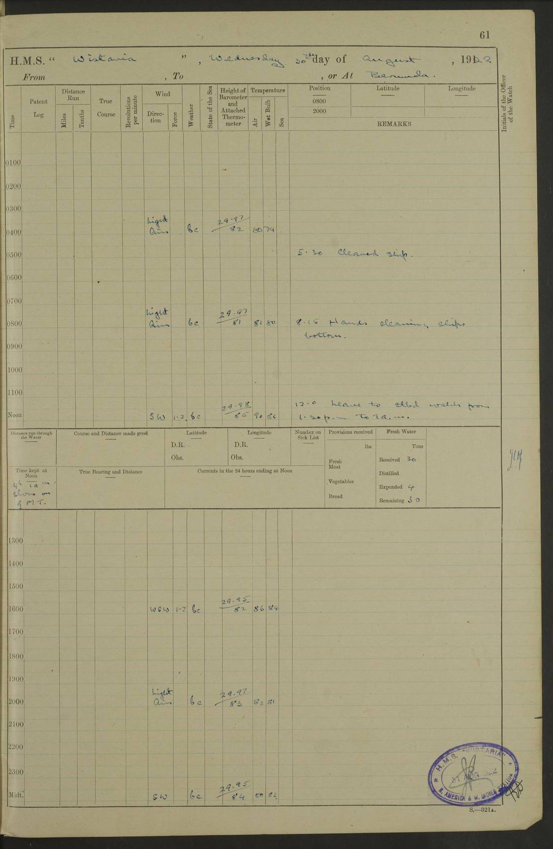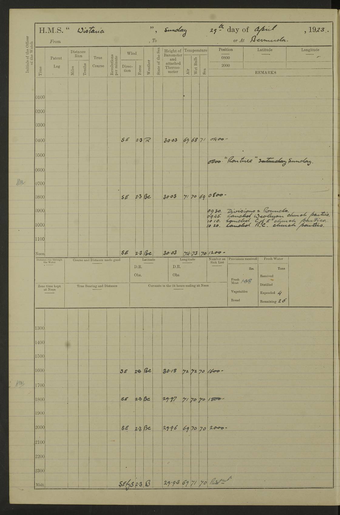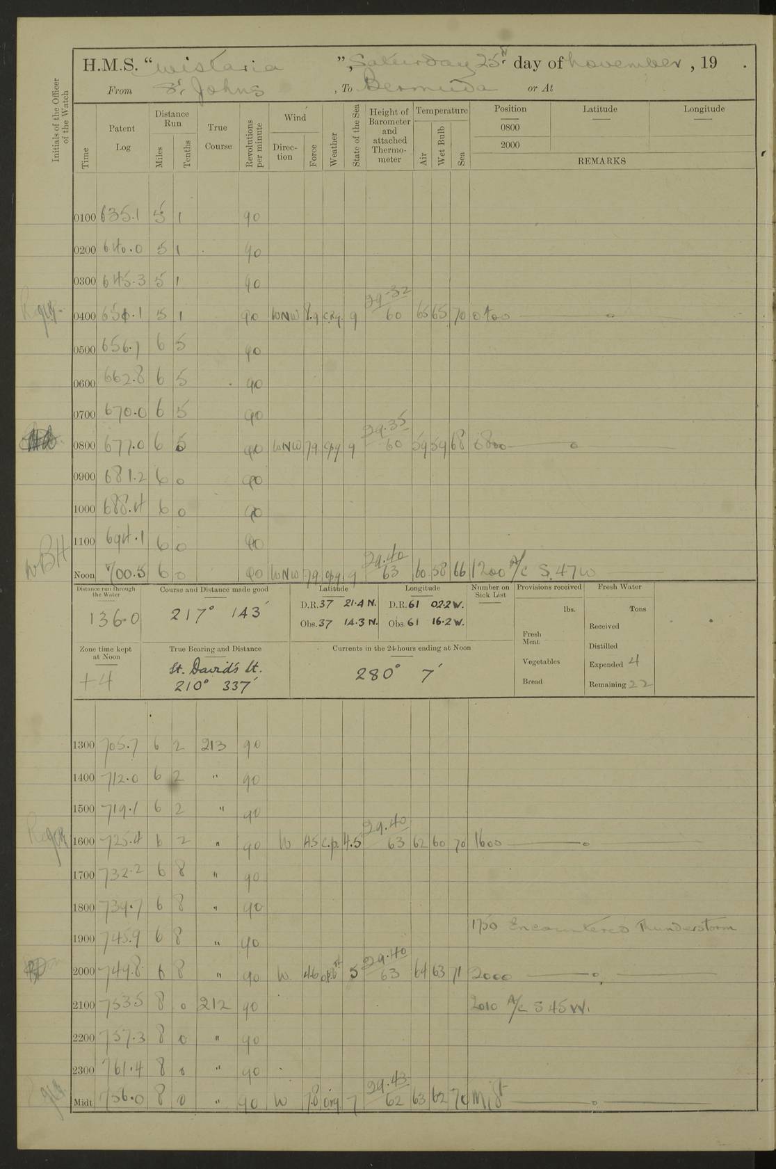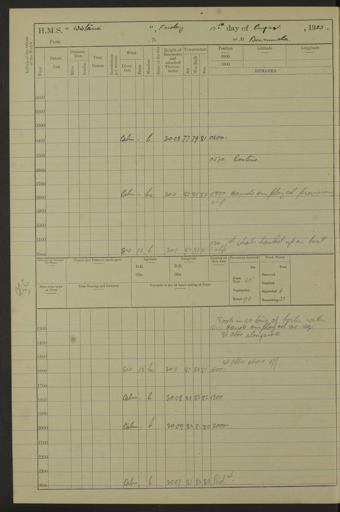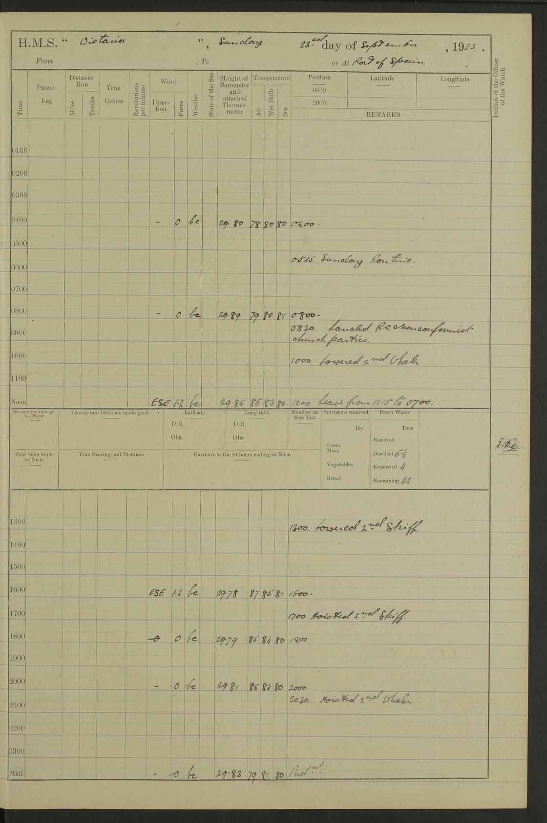 4f73caf5a2fc8ea903000c3b: (https://s3.amazonaws.com:443/oldweather/ADM53-93269/0003_1.jpg) 1 September 1922 At Bermuda Lat 32.32, Long -64.8 5.30am: Hands employed cleaning ship 8.15am: Hands employed ranging cable for survey Sunset 6.30 2.0pm: Hands employed scraping ship's bottom, and cleaning out cable lockers 4f73caf5a2fc8ea903000c3c: (https://s3.amazonaws.com:443/oldweather/ADM53-93269/0004_0.jpg) 2 September 1922 At Bermuda Lat 32.32, Long -64.8 5.30am: Hands employed cleaning ship 8.15am: Hands employed cleaning ship’s side pm: Commissioned Engineer discharged to hospital pm: 2 ratings joined ship from hospital 5.0pm: Exercised fires stations 4f73caf6a2fc8ea903000c3d: (https://s3.amazonaws.com:443/oldweather/ADM53-93269/0004_1.jpg) 3 September 1922 At Bermuda Lat 32.32, Long -64.8 6.0am: Hands employed cleaning ship (usual Sunday Routine) 8.0-8.45am: Hands clean up decks for Divisions 10.15am: Church of England Church party landed 6.0pm: Tested fire arrangements 4f73caf6a2fc8ea903000c3e: (https://s3.amazonaws.com:443/oldweather/ADM53-93269/0005_0.jpg) 4 September 1922 At Bermuda Lat 32.32, Long -64.8 5.30am: Hands employed scraping ship's bottom 8.15am: Hands employed painting ship's bottom 2.0pm: Hands employed as in the forenoon 4f73caf7a2fc8ea903000c3f: (https://s3.amazonaws.com:443/oldweather/ADM53-93269/0005_1.jpg) 5 September 1922 At Bermuda Lat 32.32, Long -64.8 5.30am: Hands employed painting ship's bottom 8.15am: Hands employed painting ship's bottom am: HMS “Valerian” came alongside in the South Basin am: 1 rating discharged to hospital 1.30pm: Hands employed as in forenoon 4f73caf7a2fc8ea903000c40: (https://s3.amazonaws.com:443/oldweather/ADM53-93269/0006_0.jpg) 6 September 1922 At Bermuda Lat 32.32, Long -64.8 5.40am: Hands employed painting ship's bottom am: 1 PO & 6 Hands employed stowing cable after survey 8.15am: Hands employed restowing cable and painting ship's bottom am: Leave to Engine room branch from 13.30-07.00 Port Watch 1 boatswains pipe lost by accident pm: Received 20 tons of boiled water 2.0pm: Hands employed restowing cable and painting ship's bottom 4f73caf7a2fc8ea903000c41: (https://s3.amazonaws.com:443/oldweather/ADM53-93269/0006_1.jpg) 7 September 1922 At Bermuda Lat 32.32, Long -64.8 6.30am: Hands employed cleaning ship 8.15am: Hands preparing for undocking ship 9.30am: Secured alongside by the sheerlegs am: Hands restowed ammunition 3.45pm: Exercised collision stations 4f73caf8a2fc8ea903000c42: (https://s3.amazonaws.com:443/oldweather/ADM53-93269/0007_0.jpg) 8 September 1922 At Bermuda Lat 32.32, Long -64.8 8.15am: Hands employed cleaning ship 9.30am: Divisions. Inspection of the ship by Captain the Hon. A. E. Strutt 10.10am: Hands muster by the ledger 11.0am: Cleared ship for action pm: 6 ratings joined ship from Hospital 1.30pm: Resumed inspection of the ship by Captain the Hon A. E. Strutt 2.45pm: Secured, replace gear [Captain the Honourable Arthur Charles Strutt] 4f73caf8a2fc8ea903000c43: (https://s3.amazonaws.com:443/oldweather/ADM53-93269/0007_1.jpg) 9 September 1922 From Bermuda to Halifax N.S., and at Bermuda Lat 32.32, Long -64.8 8.15am: Hands employed provisioning ship pm: 12 ratings discharged to HMS “Dartmouth” pm: 18 ratings joined ship pm: Received 7 tons of boiler water 2.0pm: Hands employed securing ship for sea 4.0pm: Slipped from Jetty & proceeded out 4.15pm: Stopped in Grassy Bay, and hoisted motor boat 4.30pm: Proceeded at 96 revs. Co as requisite for Ship Channel and Narrows 5.49pm: Fairway buoy abeam. Course East 6.04pm: Mills Breaker buoy abeam, 8 cables 6.19pm: Kitchen Shoals buoy abeam, 1 mile 6.35pm: Streamed log [Mills Breaker buoy coordinates: Lat 32 23.9N, Long 64 36.9W] [Kitchen Shoal beacon coordinates: Lat 32 26.1N, Long 64 37.6W] 4f73caf8a2fc8ea903000c44: (https://s3.amazonaws.com:443/oldweather/ADM53-93269/0008_0.jpg) 10 September 1922 From Bermuda to Halifax Lat 35.06, Long -64.5 9.45am: Divisions & Prayers pm: Usual Sunday Routine 4.05pm: Hauled in, cleaned & streamed patent log 5.0pm: Put clocks on 20 minutes 5.30pm: Exercised sounding party True Bearing and Distance: Chebucto Head 004°½, 566 miles 4f73caf9a2fc8ea903000c45: (https://s3.amazonaws.com:443/oldweather/ADM53-93269/0008_1.jpg) 11 September 1922 From Bermuda to Halifax Lat 38.88, Long -64.3 3.0am: Within strong W/T touch with “Cape Town” 5.25am: Spoke “Cape Town” am: Divisions & Prayers, Exercised action am: Exchanged names with British Steamer “San Valerio”, Eagle Oil Co. Lat 38 35N, Long 63 55W 10.10am: Secure pm: Hands employed painting lower boom gear & waterways & cleaning out 2nd whaler 4.50pm: Exercised sounding party 5.0pm: Put clocks on ½ hour 10.10pm: Stopped engines, helm jammed 10.12pm: Hauled in patent log 10.35pm: Resumed Co & speed; hand wheel connected up. Course below NNE 10.45pm: Streamed patent log True Bearing and Distance: Chebucto Head 005°, 332 miles 4f73caf9a2fc8ea903000c46: (https://s3.amazonaws.com:443/oldweather/ADM53-93269/0009_0.jpg) 12 September 1922 From Bermuda to Halifax Lat 42.85, Long -63.81 am: Steering by hand 9.45am: Ord Seamen & Boys to 4” instruction pm: 1 hand scrubber lost by accident pm: 1 whalers oar lost by accident 5.0pm: Altered course N36E (steering NNE½E). Put clocks on 1/2 hour 8.15pm: Sighted Sambro Lt bearing N20E 8.40pm: Sighted Chebucto Head Lt bearing N18E 9.27pm: Sambro Lt buoy abeam, 2 miles 10.07pm: Sambro Lt abeam 10.10pm: Chebucto Lt abeam 10.20pm: Hauled in Patent log 11.20pm: Mauger Beach Lt abeam 11.52pm: Let go off No 4 wharf with 2½ shackles True Bearing and Distance: Chebucto Head 007, 100 miles 4f73cafaa2fc8ea903000c47: (https://s3.amazonaws.com:443/oldweather/ADM53-93269/0009_1.jpg) 13 September 1922 At Halifax Lat 44.69, Long -63.64 7.0am: Ship wharped alongside No 4 pier 8.0am: Hands prepare for coaling 8.45am: Hands coal ship 9.0am: Clocks put back 1 hour 12.30pm: Hands coal ship pm: 26 tons boiler water received 2.25pm: Finished coaling 4f73cafaa2fc