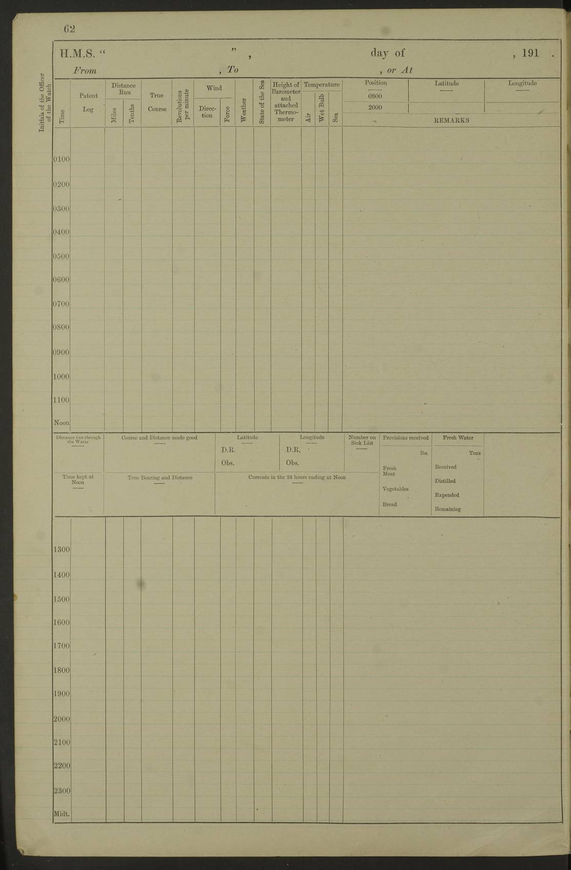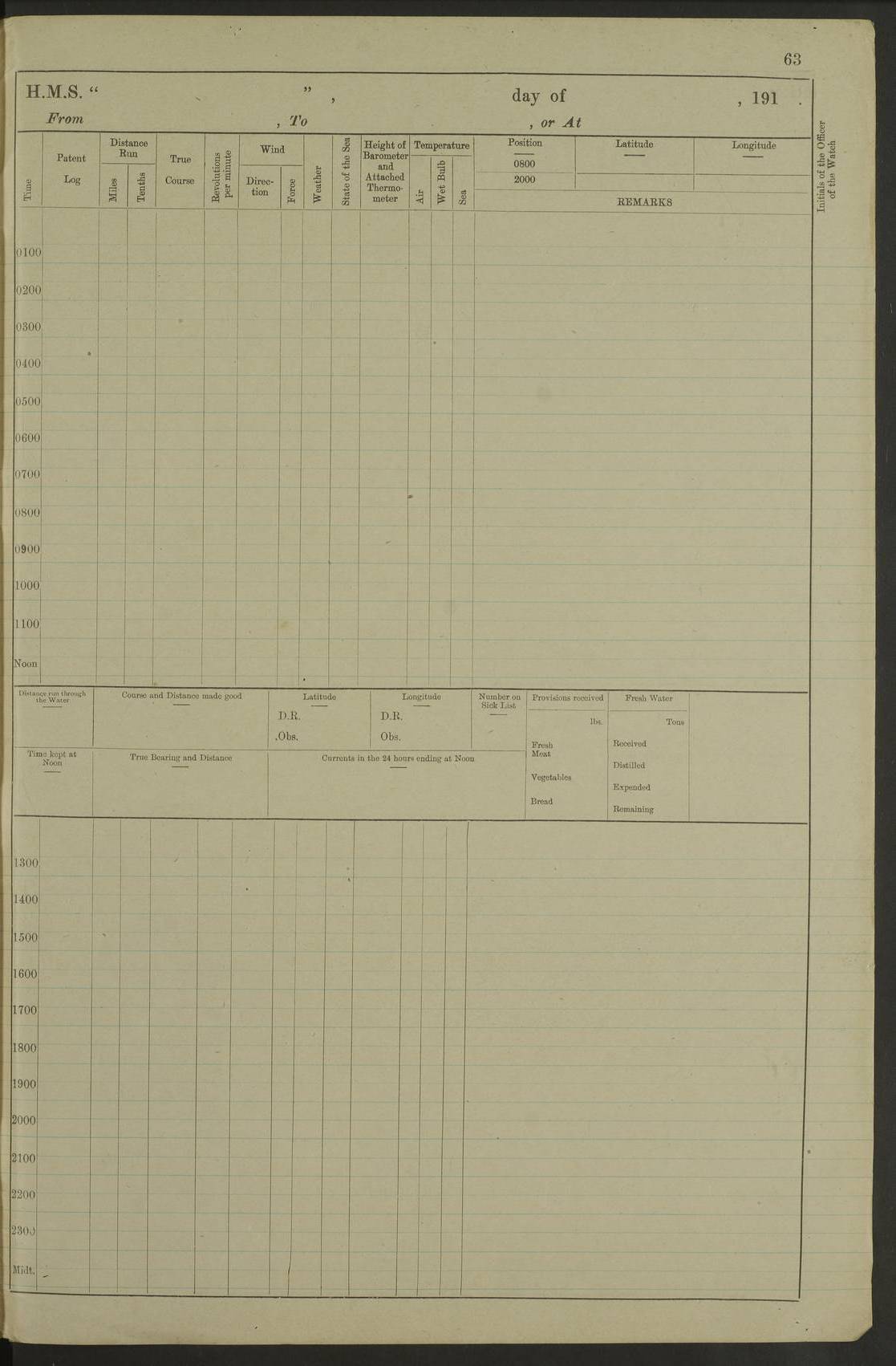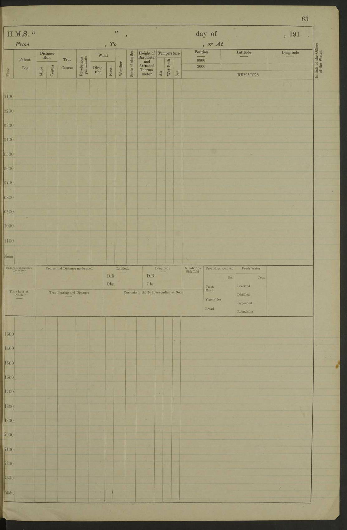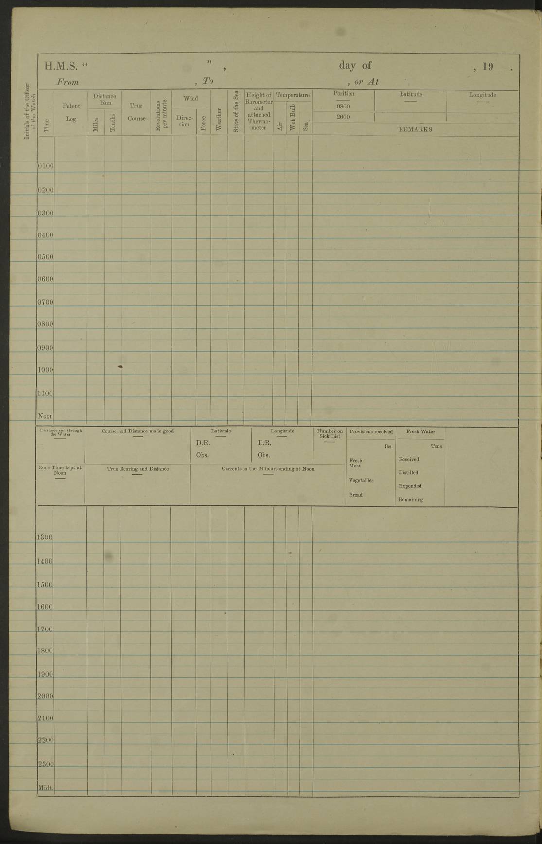 Notes: 1. Latitude/longitude, including for days in port, show representative decimal positions for each day, as calculated by the Old Weather project's analysis program. As such, they differ by varying amounts from the positions recorded, usually at noon, in the log pages. In addition, some latitudes/longitudes have been amended in edited logs for errors in the logs, for errors in identifying locations by the analysis program, or simply for greater accuracy. In all cases, refer to the log-page scans for the positions as originally recorded. Not all log pages contain this information and the ships' positions have therefore often been estimated. 2. Full account of any day is available by clicking on the link above that day. Groups of links refer to log book covers and introductory information; some may be blank. |