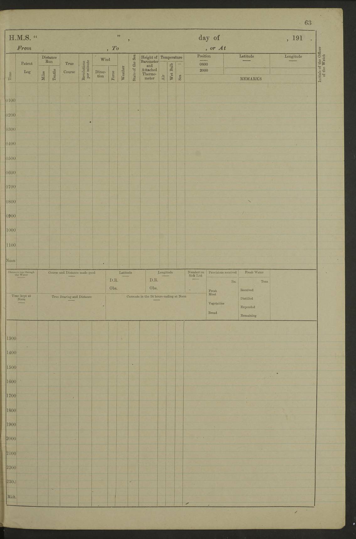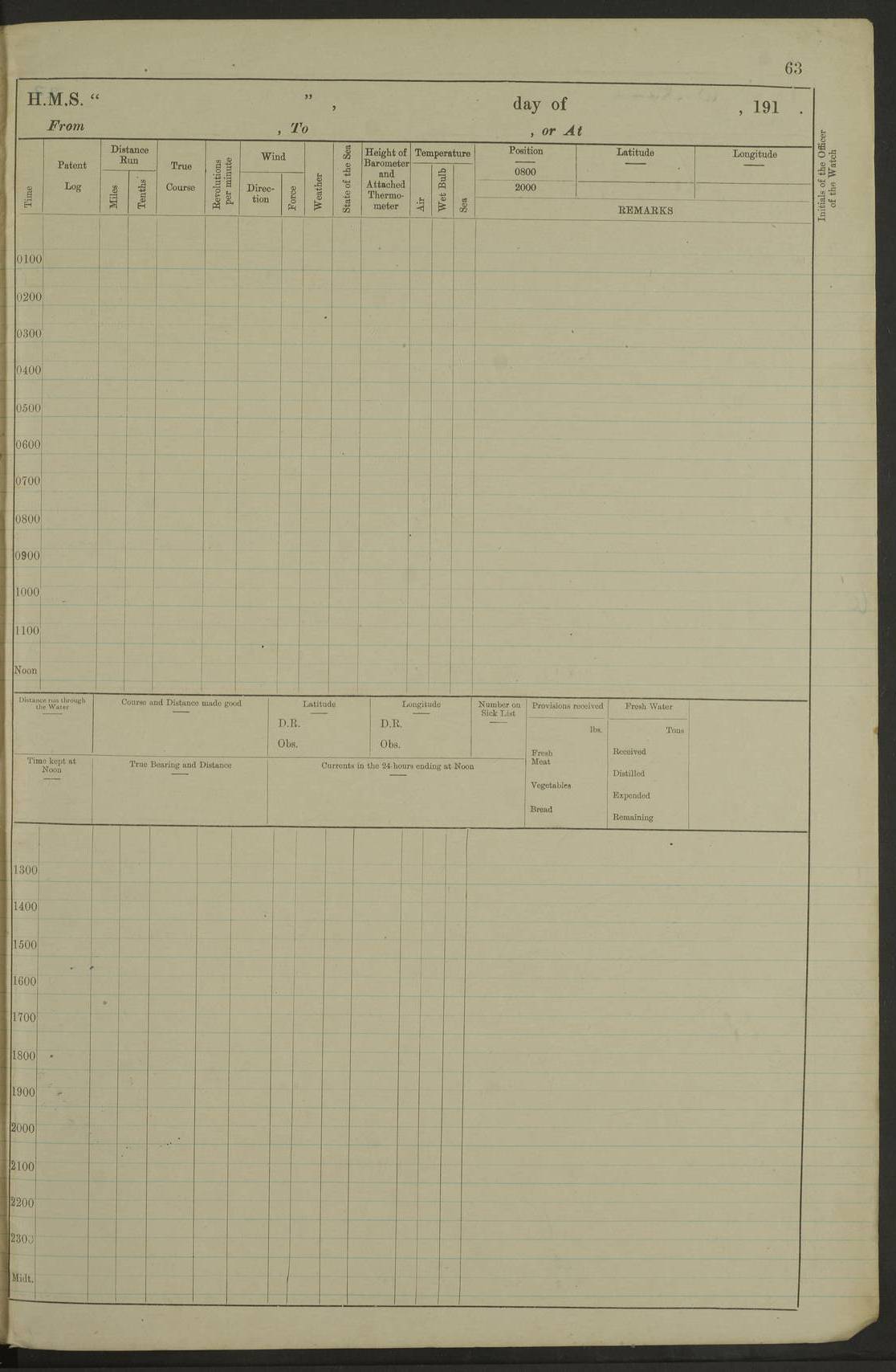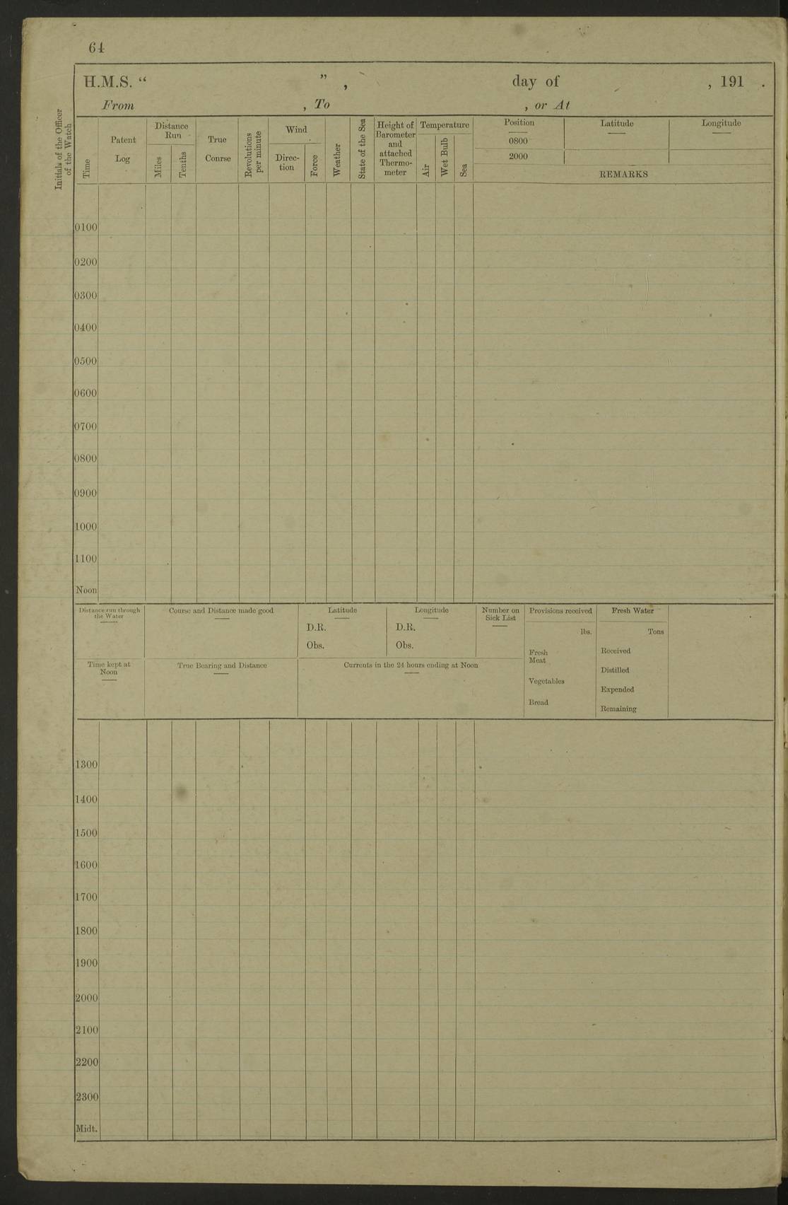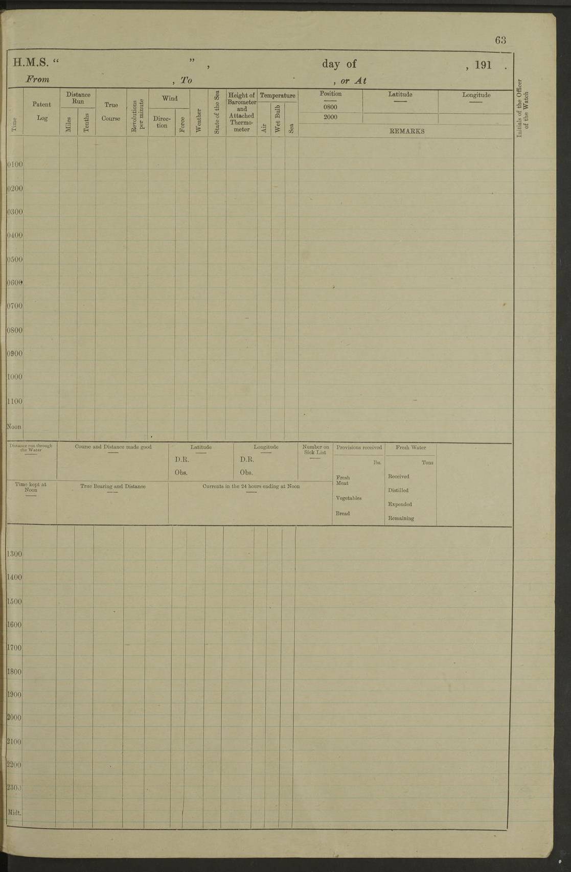 Notes: 1. Latitude/longitude, including for days in port, show representative decimal positions for each day, as calculated by the Old Weather project's analysis program. As such, they differ by varying amounts from the positions recorded, usually at noon, in the log pages. In addition, some latitudes/longitudes have been amended in edited logs for errors in the logs, for errors in identifying locations by the analysis program, or simply for greater accuracy. In all cases, refer to the log-page scans for the positions as originally recorded. Not all log pages contain this information and the ships' positions have therefore often been estimated. 2. Full account of any day is available by clicking on the link above that day. Groups of links refer to log book covers and introductory information; some may be blank. |