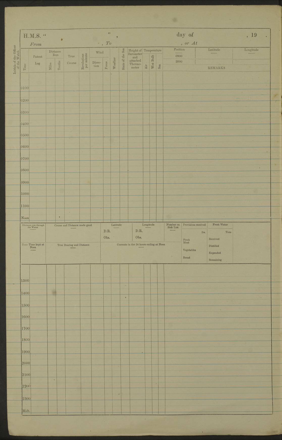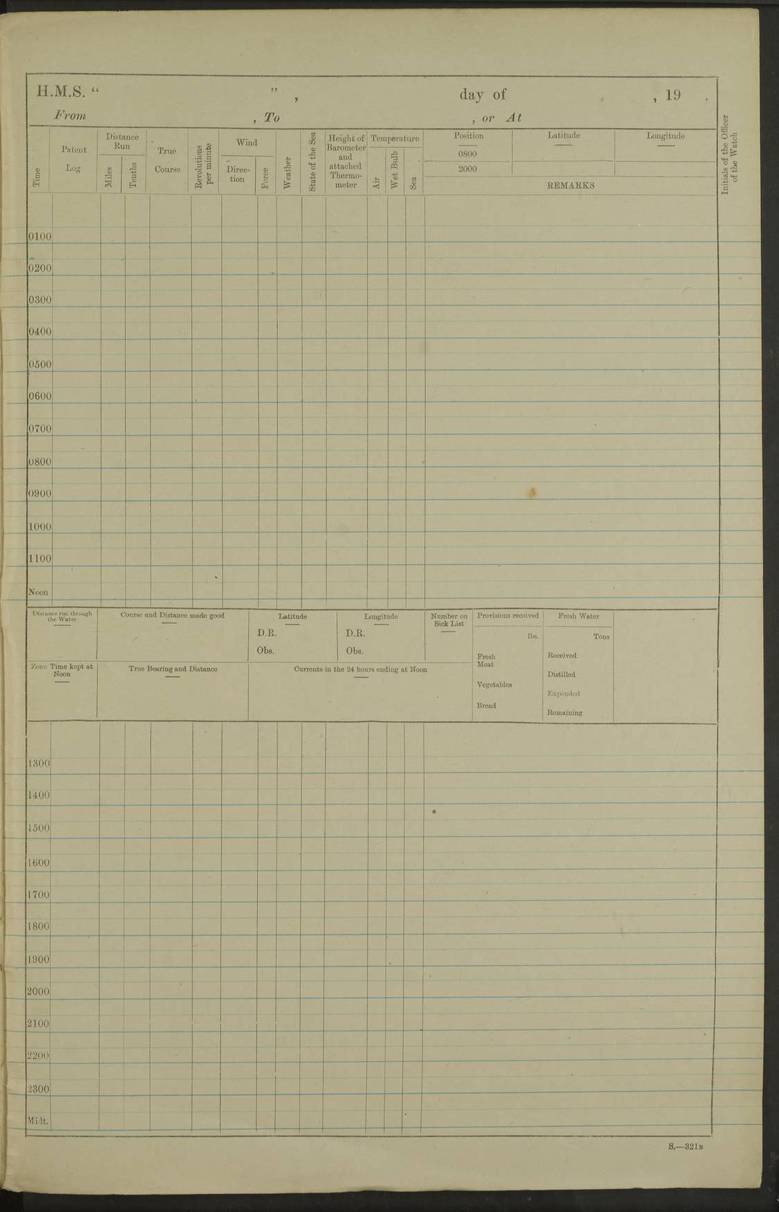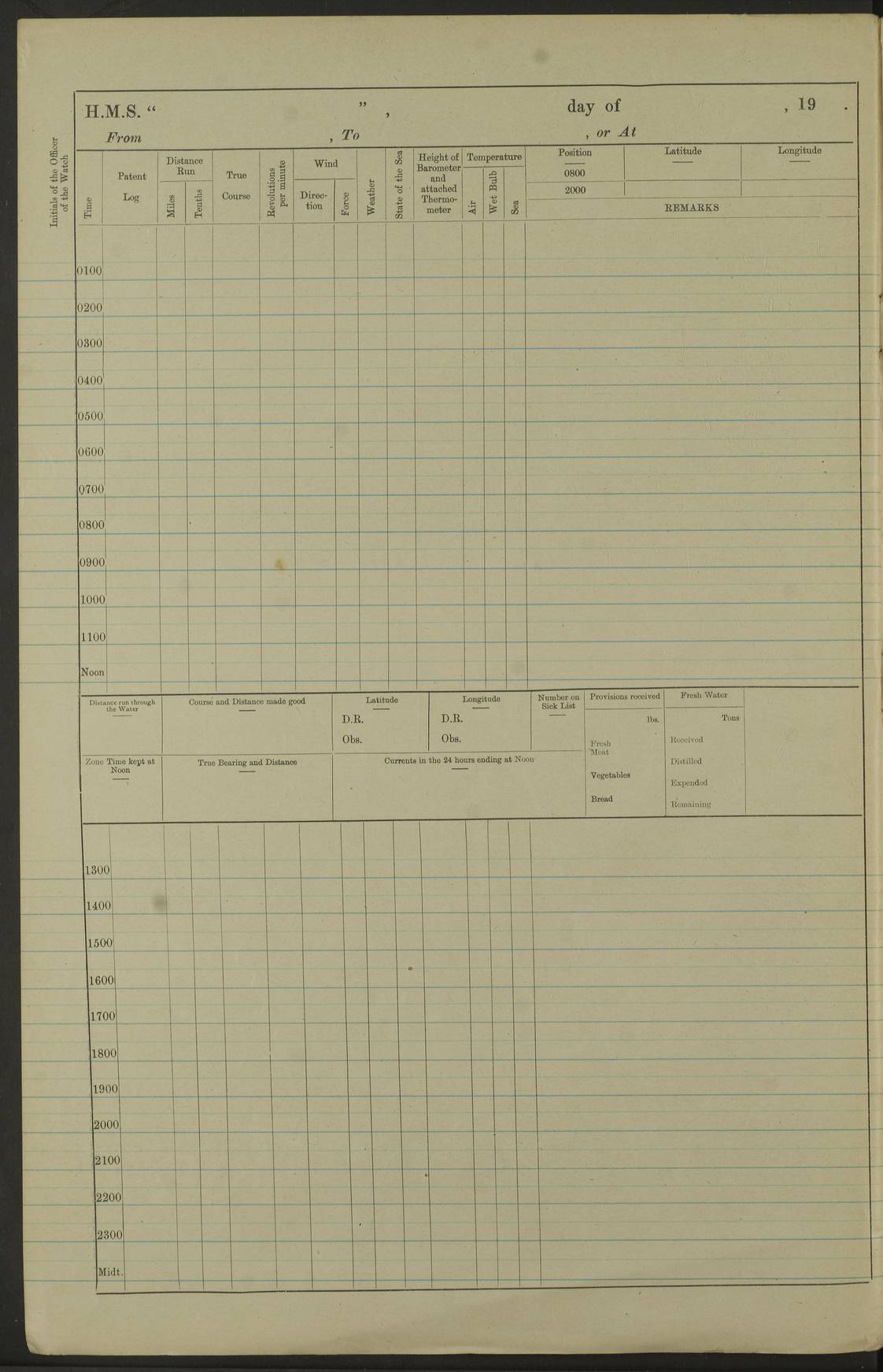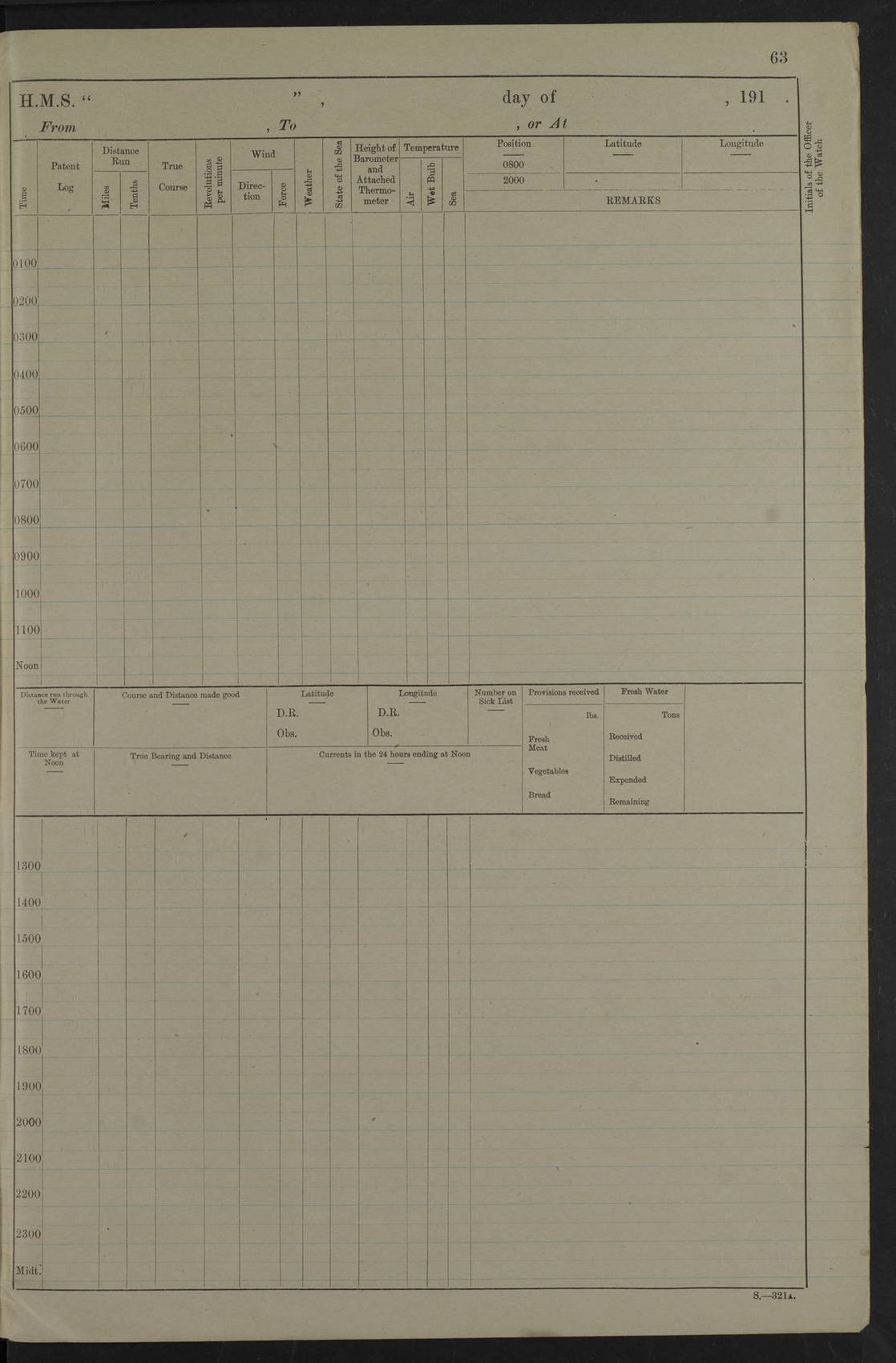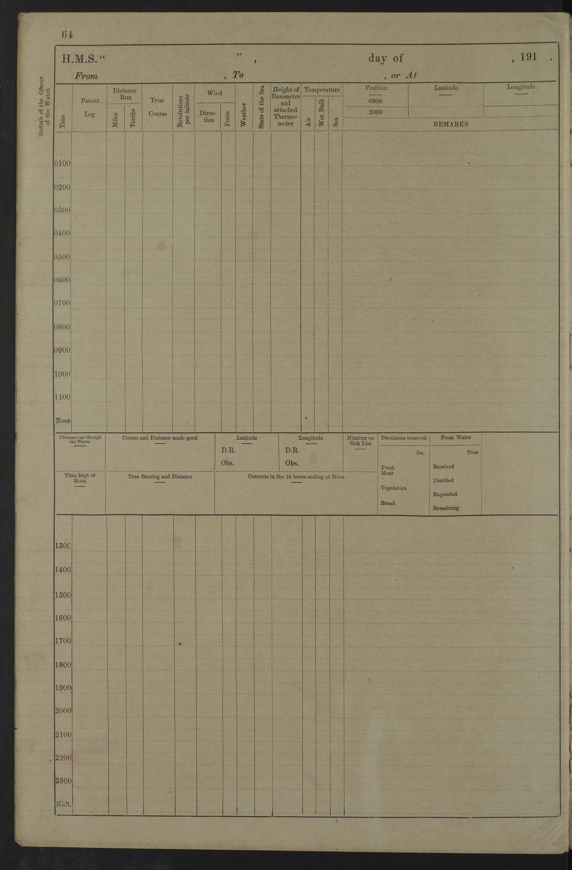 Notes: 1. Latitude/longitude, including for days in port, show representative decimal positions for each day, as calculated by the Old Weather project's analysis program. As such, they differ by varying amounts from the positions recorded, usually at noon, in the log pages. In addition, some latitudes/longitudes have been amended in edited logs for errors in the logs, for errors in identifying locations by the analysis program, or simply for greater accuracy. In all cases, refer to the log-page scans for the positions as originally recorded. Not all log pages contain this information and the ships' positions have therefore often been estimated. 2. Full account of any day is available by clicking on the link above that day. Groups of links refer to log book covers and introductory information; some may be blank. |