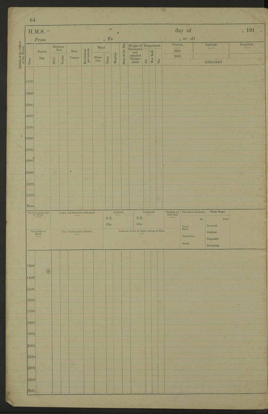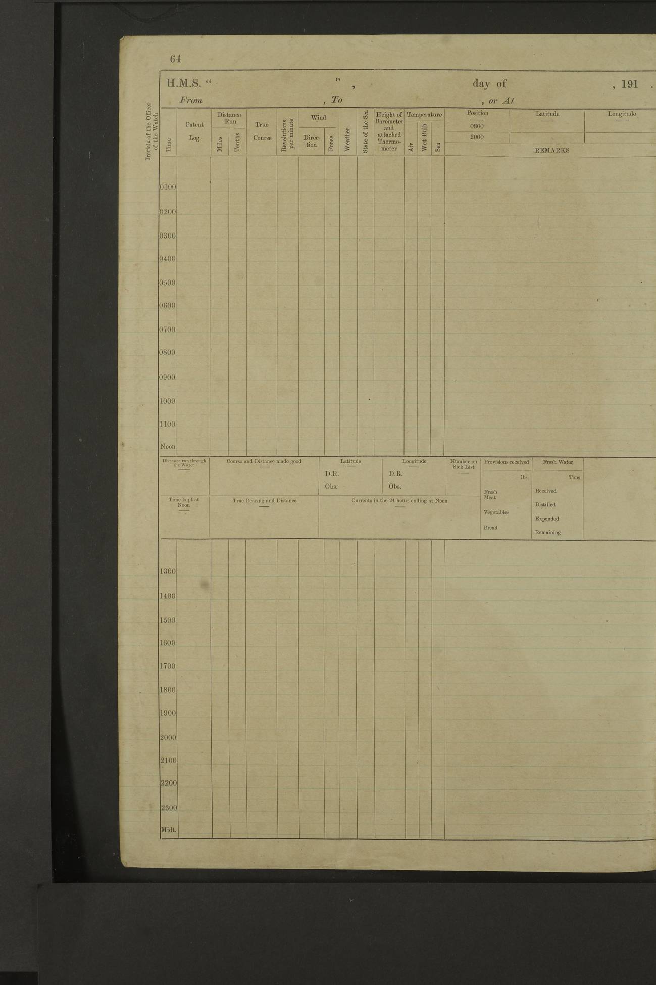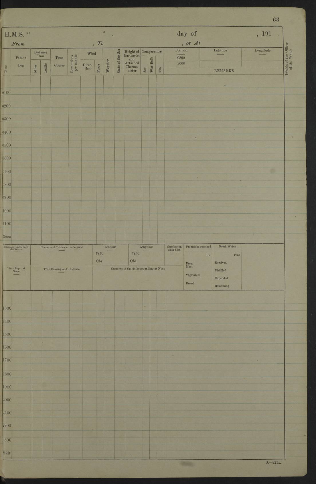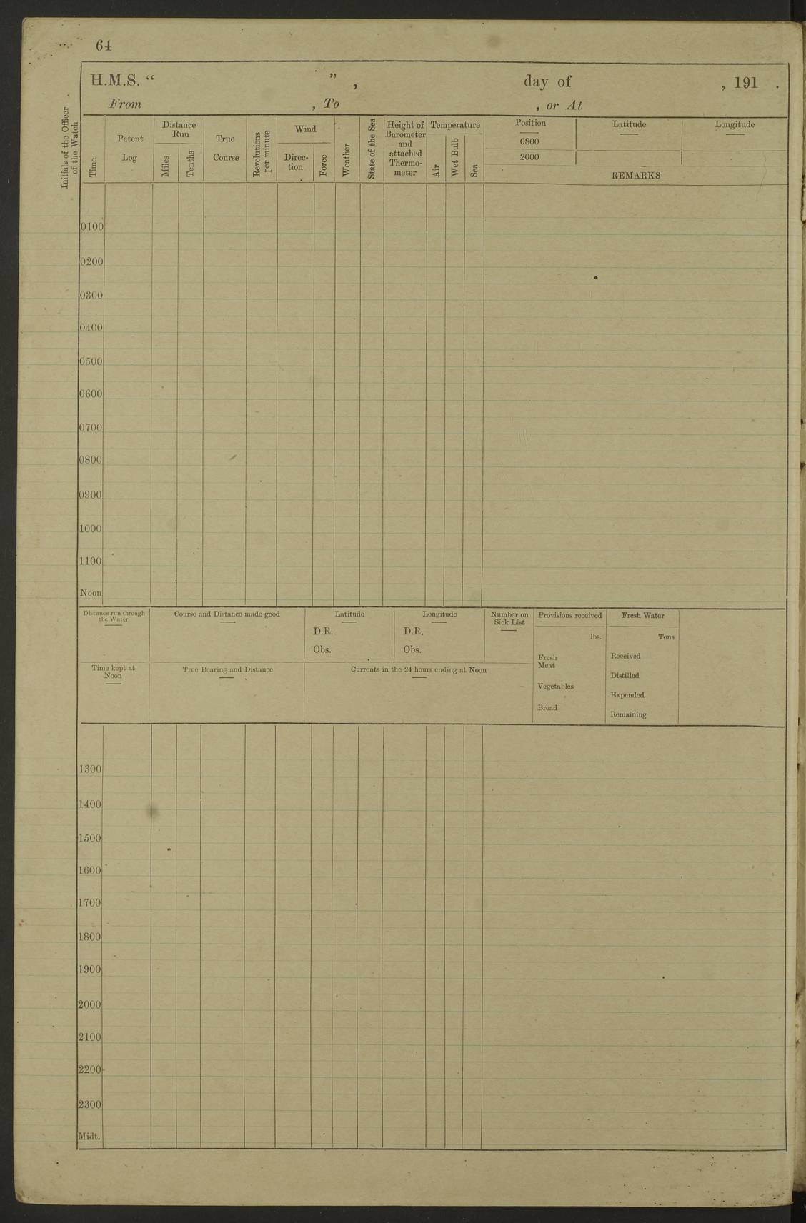 Notes: 1. Latitude/longitude, including for days in port, show representative decimal positions for each day, as calculated by the Old Weather project's analysis program. As such, they differ by varying amounts from the positions recorded, usually at noon, in the log pages. In addition, some latitudes/longitudes have been amended in edited logs for errors in the logs, for errors in identifying locations by the analysis program, or simply for greater accuracy. In all cases, refer to the log-page scans for the positions as originally recorded. Not all log pages contain this information and the ships' positions have therefore often been estimated. 2. Full account of any day is available by clicking on the link above that day. Groups of links refer to log book covers and introductory information; some may be blank. |