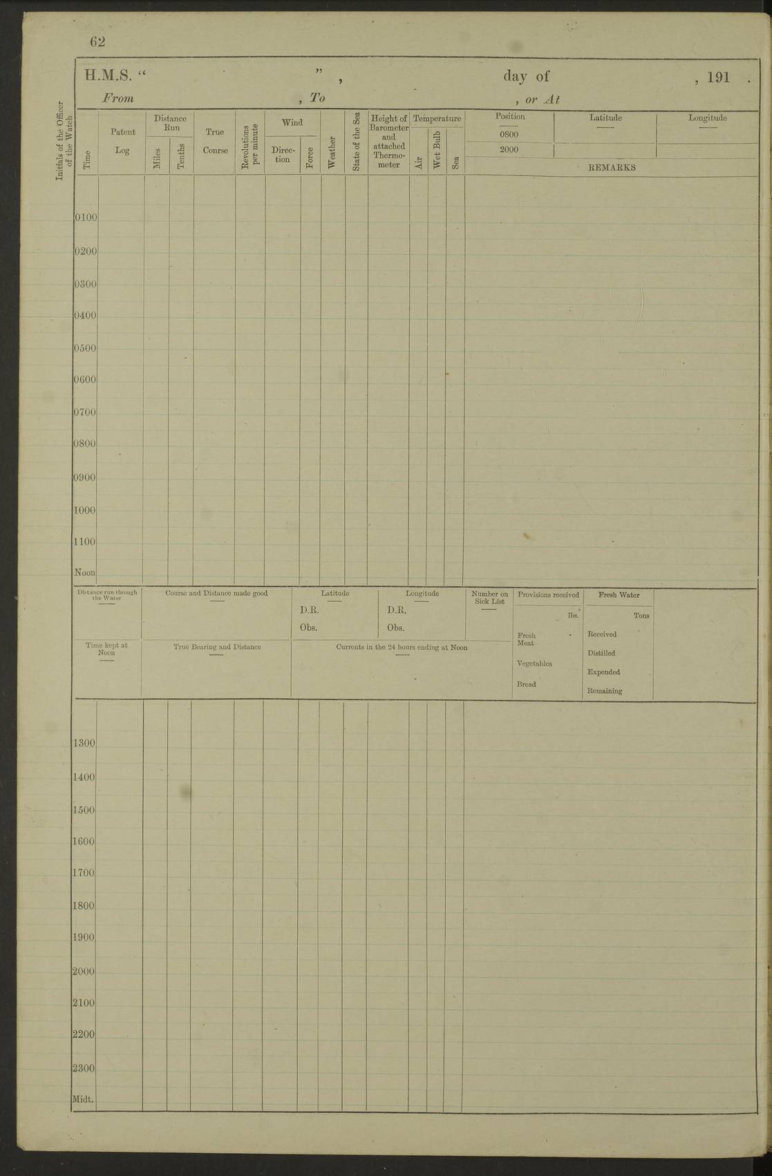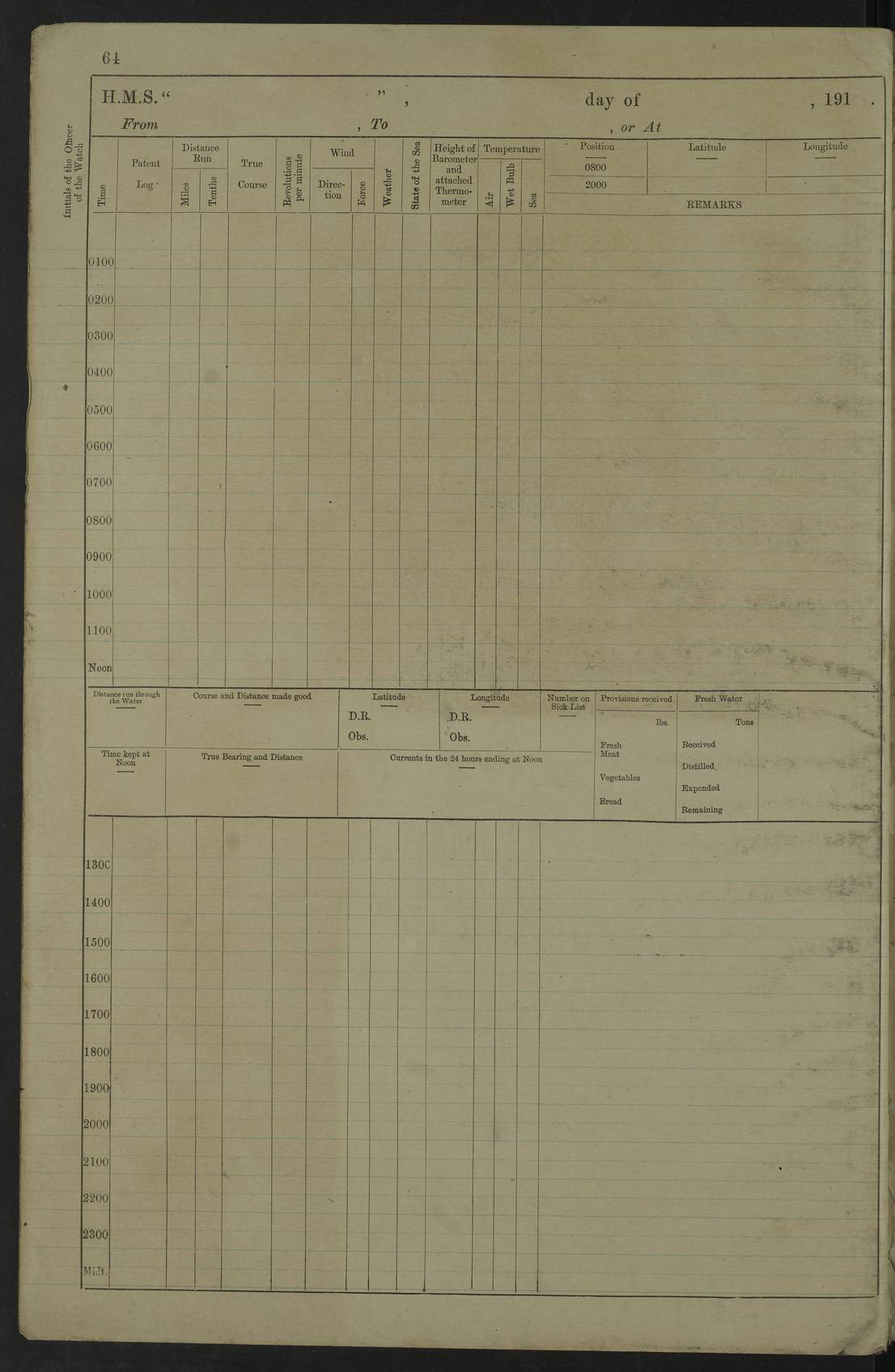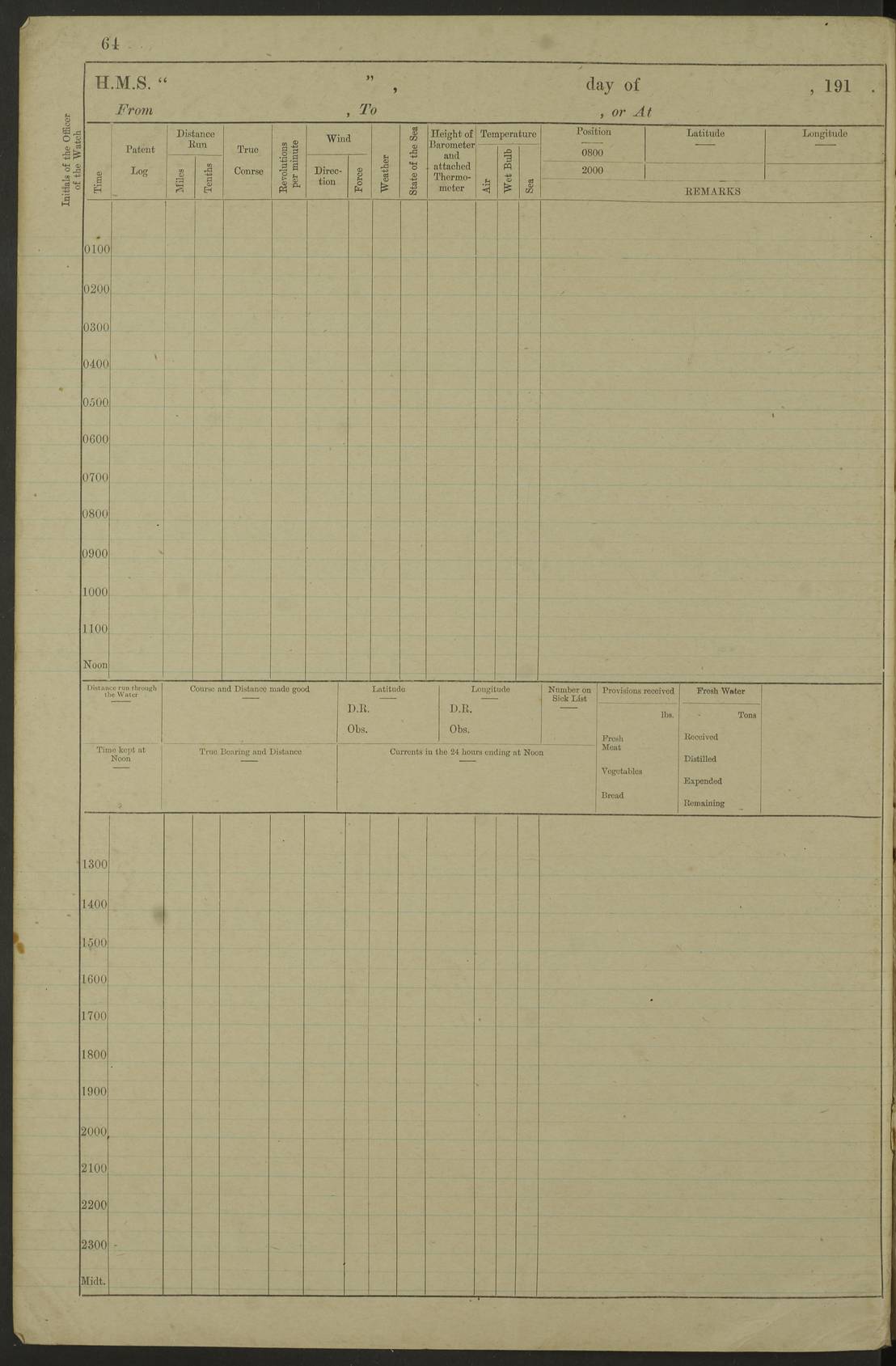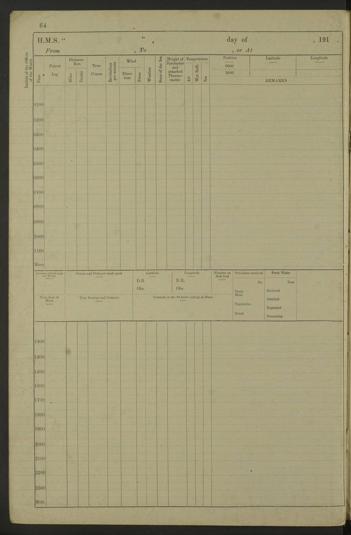 Notes: 1. Latitude/longitude, including for days in port, show representative decimal positions for each day, as calculated by the Old Weather project's analysis program. As such, they differ by varying amounts from the positions recorded, usually at noon, in the log pages. In addition, some latitudes/longitudes have been amended in edited logs for errors in the logs, for errors in identifying locations by the analysis program, or simply for greater accuracy. In all cases, refer to the log-page scans for the positions as originally recorded. Not all log pages contain this information and the ships' positions have therefore often been estimated. 2. Full account of any day is available by clicking on the link above that day. Groups of links refer to log book covers and introductory information; some may be blank. |