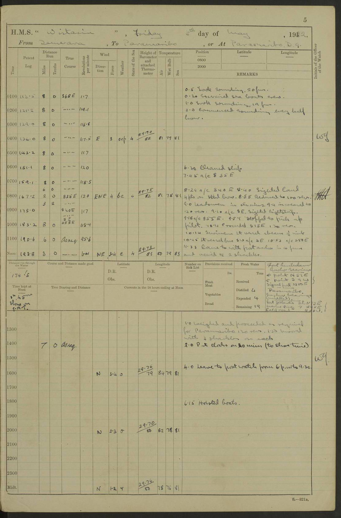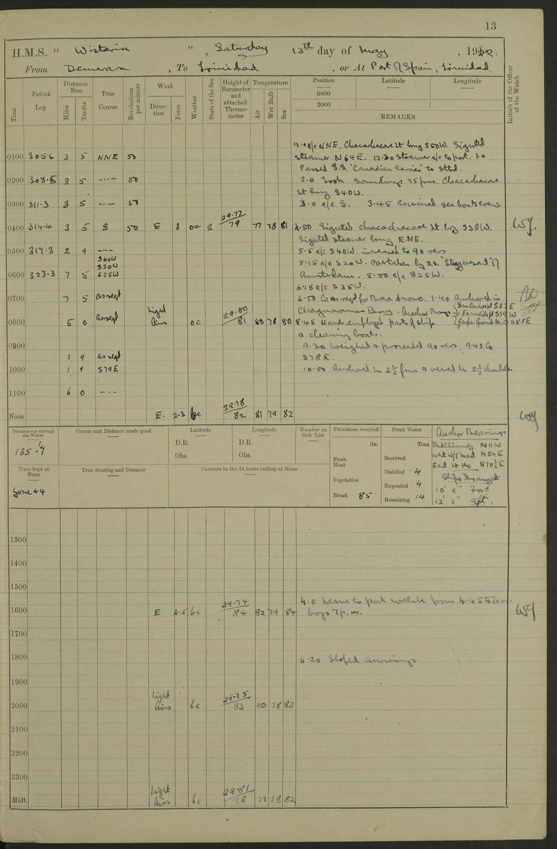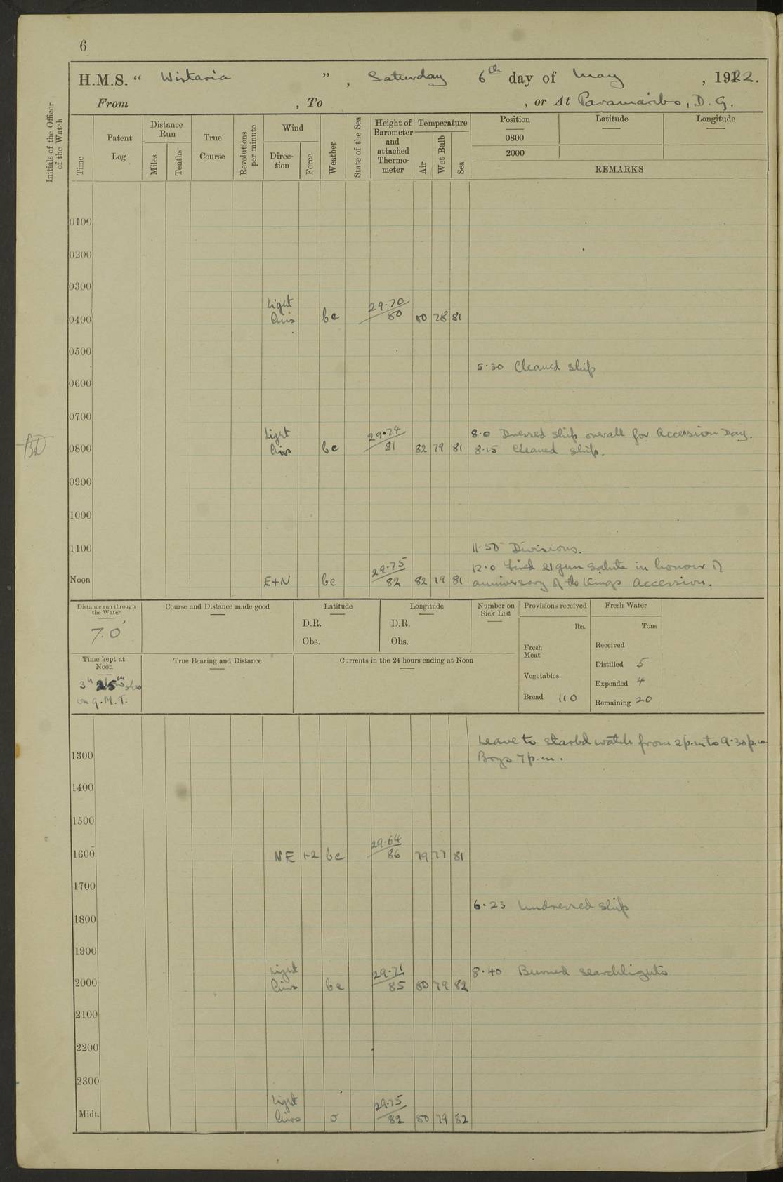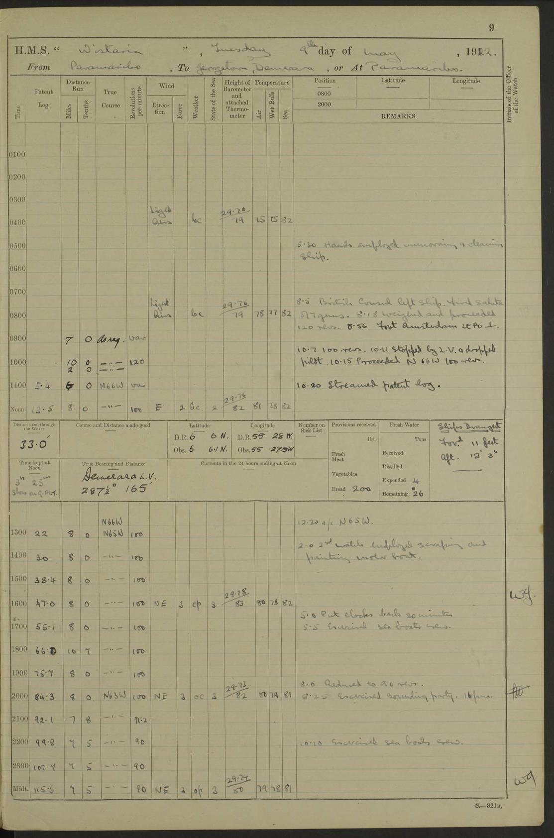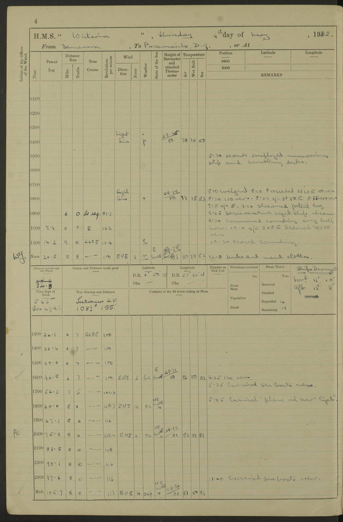 LOGS FOR MAY 1922 4f73cabfa2fc8ea903000bab: (https://s3.amazonaws.com:443/oldweather/ADM53-93267/0003_1.jpg) 1 May 1922 At Georgetown, Demerara Lat 6.83, Long -58.16 8.15am: Hands employed about boats, falls and parts of ship 2.0pm: Hands employed parts of ship 6.0pm: Hoisted boats 4f73cac0a2fc8ea903000bac: (https://s3.amazonaws.com:443/oldweather/ADM53-93267/0004_0.jpg) 2 May 1922 At Georgetown, Demerara Lat 6.83, Long -58.16 8.0am: Hands employed about boats and falls, and parts of ship 4f73cac0a2fc8ea903000bad: (https://s3.amazonaws.com:443/oldweather/ADM53-93267/0004_1.jpg) 3 May 1922 At Demerara Lat 6.83, Long -58.16 9.15am: Divisions & Prayers. Hands employed cleaning out boats, turning skiff falls end for end and parts of ship 11.30am: One rating rejoined ship from hospital 4f73cac1a2fc8ea903000bae: (https://s3.amazonaws.com:443/oldweather/ADM53-93267/0005_0.jpg) 4 May 1922 From Demerara to Paramaribo, D.G. Lat 6.83, Long -57.7 5.30am: Hands employed unmooring ship and scrubbing decks 8.0am: Weighed 8.10am: Proceeded N10E, 80 revs 9.10am: Streamed patent log 9.25am: Demerara River Light Ship abeam 9.30am: Commenced sounding every half hour 10.30am: Ceased sounding 5.45pm: Exercised “flare oil navigation lights” True Bearing and Distance: Suriname L.V. 108°½, 155 miles 4f73cac1a2fc8ea903000baf: (https://s3.amazonaws.com:443/oldweather/ADM53-93267/0005_1.jpg) 5 May 1922 From Demerara to Paramaribo and at Paramaribo D.G. Lat 5.88, Long -55.09 0.05am: Took sounding, 20 fms 1.0am: Took sounding, 19 fms 2.0am: Commenced sounding every half hour 8.40am: Sighted land 4 points on Starboard bow 9.0am: Leadsmen in cleaning 9.10am: Altered course SE. Sighted lightship 9.57am: Stopped to pick up pilot 10.12am: Proceeded S15E, 30 revs 10.14am: Suriname Lt Vessel abeam ½ mile 11.33am: Came to with port anchor in 4 fms and veered to 2 shackles Fort Amsterdam Anchor Bearings: left tangent, Point N57E; left tangent, Point S9W; Signal Post N80E 1.0pm: Weighed and proceeded as required for Paramaribo, 130 revs 1.50am: Moored with 3 shackles on each Paramaribo Anchor Bearings (middled): Fort Zeelandia Pt N83E; Marien Quay, right tangent, N45E; End of road N53W 2.0pm: Put clocks on 20 minutes (to shore time) 6.15pm: Hoisted boats 4f73cac1a2fc8ea903000bb0: (https://s3.amazonaws.com:443/oldweather/ADM53-93267/0006_0.jpg) 6 May 1922 At Paramaribo D.G. Lat 5.84, Long -55.11 8.0am: Dressed ship overall for Accession Day noon: Fired 21 gun salute in honour of anniversary of the Kings Accession 6.23pm: Undressed ship 8.40pm: Burned searchlights 4f73cac2a2fc8ea903000bb1: (https://s3.amazonaws.com:443/oldweather/ADM53-93267/0006_1.jpg) 7 May 1922 At Paramaribo D.G. Lat 5.84, Long -55.11 6.0am: Cleaned ship 10.15am: Divisions 4f73cac2a2fc8ea903000bb2: (https://s3.amazonaws.com:443/oldweather/ADM53-93267/0007_0.jpg) 8 May 1922 At Paramaribo D.G. Lat 5.84, Long -55.11 8.15am: Hands employed cleaning ship and about boats & falls 6 tons of rain water caught for drinking purposes 2.0pm: Hands employed working parts of ship 5.50pm: One rating rejoined ship from hospital 4f73cac2a2fc8ea903000bb3: (https://s3.amazonaws.com:443/oldweather/ADM53-93267/0007_1.jpg) 9 May 1922 From Paramaribo to Georgetown, Demerara Lat 6.1, Long -55.46 5.30am: Hands employed unmooring & cleaning ship 8.05am: British Consul left ship. Fired salute of 7 guns 8.18am: Weighed and proceeded 120 revs 8.56am: Fort Amsterdam Lt Ho abeam 10.11am: Stopped by L.V. & dropped pilot 10.15am: Proceeded N66W, 100 revs 10.20am: Streamed patent log 2.0pm: 3rd watch employed scraping and painting motor boat 5.0pm: Put clocks back 20 minutes 8.25pm: Exercised sounding party, 16 fms True Bearing and Distance: Demerara L.V. 287°½, 165 miles 4f73cac3a2fc8ea903000bb4: (https://s3.amazonaws.com:443/oldweather/ADM53-93267/0008_0.jpg) 10 May 1922 From Paramaribo to Georgetown, Demerara and at Georgetown Lat 6.83, Long -58.16 2.05am: Took soundings, 11½ fms 5.0am: Took sounding 4 fms 5.31am: Sighted Demerara Lt V N46W, Georgetown Lt Ho S85W 7.05am: Sighted Georgetown Pier Hd. Course as requisite for entering harbour 7.43am: Came to with Port anchor 4 shackles in 5 faths Anchor Bearings: Best Lt Ho N80W, Best Church S68W, Georgetown Lt Ho N33E 8.45am: Hands employed cleaning out boats & store rooms 10.25am: Weighed and proceeded alongside La Providence coaling jetty 10.48am: Secured alongside One whaler oar lost by accident [Best Light House: perhaps this light: “A fixed green light with red sector is shown from the end of the jetty called East Best Groin, on the west side of the river”. A map of Georgetown and Mouths of Demerara and Essequibo Rivers here] 4f73cac3a2fc8ea903000bb5: (https://s3.amazonaws.com:443/oldweather/ADM53-93267/0008_1.jpg) 11 May 1922 From Demerara to Trinidad and at Georgetown, Demerara Lat 7.61, Long -58.18 5.35am: Weighed and proceeded 96 revs 5.46am: Best Lt Ho abeam. Course N20E 6.38am: Streamed patent log 6.58am: Demerara L.V. bore S, ¼ mile 10.42am: Took soundings 16 fms 3.10am: Took soundings 15 fathoms 5.0pm: Put clocks back ¼ hour True Bearing and Distance: Galera Point Lt Ho 320°, 250 miles 4f73cac4a2fc8ea903000bb6: (https://s3.amazonaws.com:443/oldweather/ADM53-93267/0009_0.jpg) 12 May 1922 From Demerara to Trinidad Lat 10.55, Long -60.16 am: Hands employed parts of ship and seamen under instruction 12.40pm: Took soundings. No bottom at 200 fms of wire 1.30pm: Took soundings. No bottom at 200 fms of wire 2.0pm: Took sounding. No bottom at 175 fms of wire 2.30pm: Sounding 36 fms 3.0pm: 42 fms 5.25pm: Sighted Galera Pt S40W 7.02pm: Galera Pt abeam 11.0pm: Sighted Chacachacare Lt bearing S57W 11.06pm: Took soundings 60 fms True Bearing and Distance: Galera Point Lt Ho 292°, 47 miles 4f73cac4a2fc8ea903000bb7: (https://s3.amazonaws.com:443/oldweather/ADM53-93267/0009_1.jpg) 13 May 1922 From Demerara to Trinidad and at Port of Spain, Trinidad Lat 6.81, Long -58.17 noon: Altered course NNE. Chacachacare Lt bearing S50W. Sig