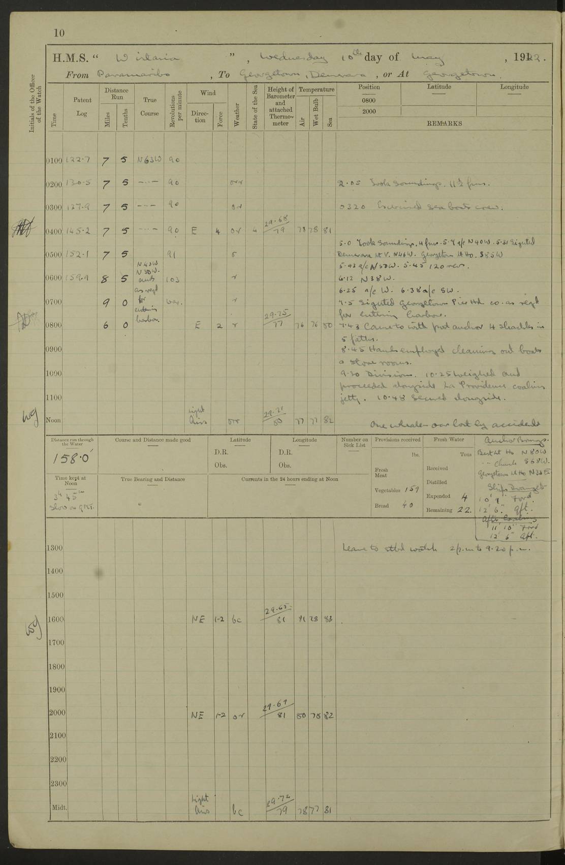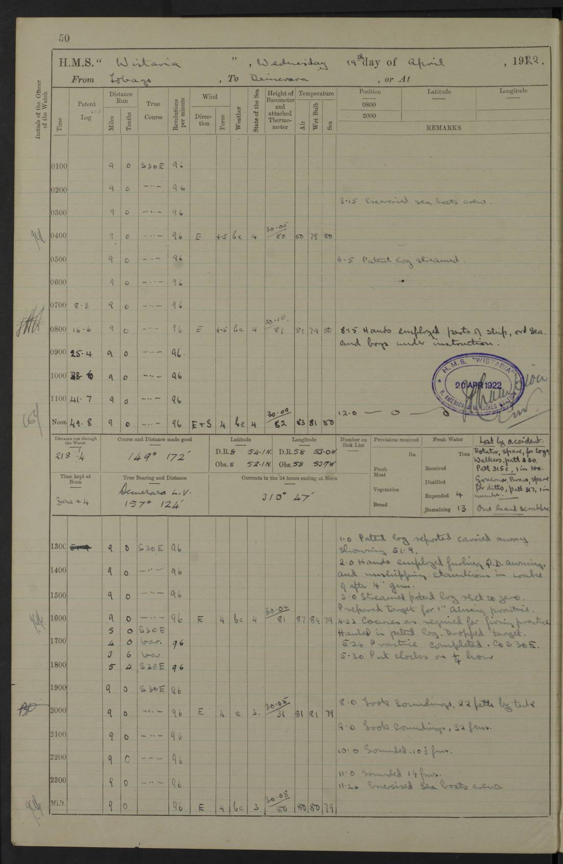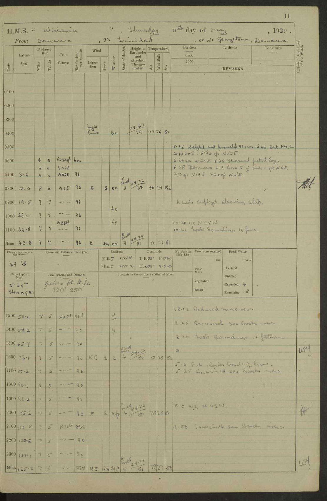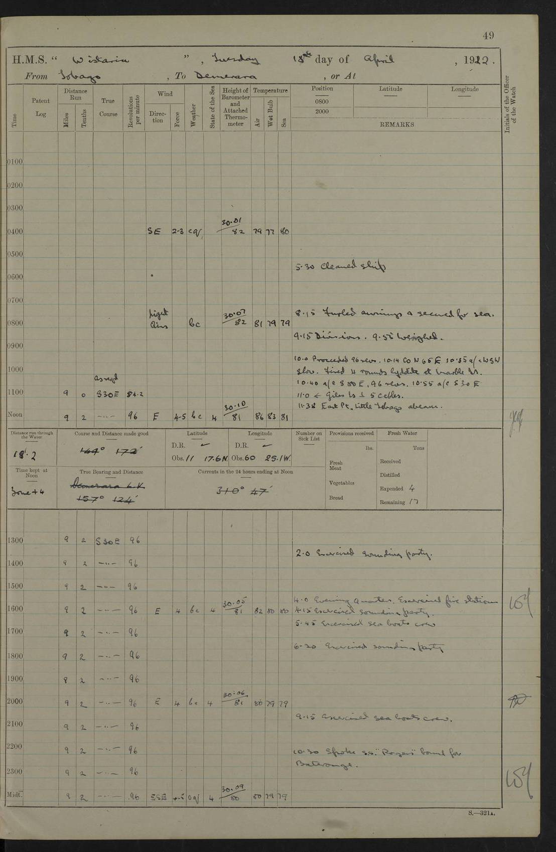 LOGS FOR MAY 1922 4f73cabfa2fc8ea903000bab: (https://s3.amazonaws.com:443/oldweather/ADM53-93267/0003_1.jpg) 1 May 1922 At Georgetown, Demerara Lat 6.83, Long -58.16 8.15am: Hands employed about boats, falls and parts of ship 2.0pm: Hands employed parts of ship 6.0pm: Hoisted boats 4f73cac0a2fc8ea903000bac: (https://s3.amazonaws.com:443/oldweather/ADM53-93267/0004_0.jpg) 2 May 1922 At Georgetown, Demerara Lat 6.83, Long -58.16 8.0am: Hands employed about boats and falls, and parts of ship 4f73cac0a2fc8ea903000bad: (https://s3.amazonaws.com:443/oldweather/ADM53-93267/0004_1.jpg) 3 May 1922 At Demerara Lat 6.83, Long -58.16 9.15am: Divisions & Prayers. Hands employed cleaning out boats, turning skiff falls end for end and parts of ship 11.30am: One rating rejoined ship from hospital 4f73cac1a2fc8ea903000bae: (https://s3.amazonaws.com:443/oldweather/ADM53-93267/0005_0.jpg) 4 May 1922 From Demerara to Paramaribo, D.G. Lat 6.83, Long -57.7 5.30am: Hands employed unmooring ship and scrubbing decks 8.0am: Weighed 8.10am: Proceeded N10E, 80 revs 9.10am: Streamed patent log 9.25am: Demerara River Light Ship abeam 9.30am: Commenced sounding every half hour 10.30am: Ceased sounding 5.45pm: Exercised “flare oil navigation lights” True Bearing and Distance: Suriname L.V. 108°½, 155 miles 4f73cac1a2fc8ea903000baf: (https://s3.amazonaws.com:443/oldweather/ADM53-93267/0005_1.jpg) 5 May 1922 From Demerara to Paramaribo and at Paramaribo D.G. Lat 5.88, Long -55.09 0.05am: Took sounding, 20 fms 1.0am: Took sounding, 19 fms 2.0am: Commenced sounding every half hour 8.40am: Sighted land 4 points on Starboard bow 9.0am: Leadsmen in cleaning 9.10am: Altered course SE. Sighted lightship 9.57am: Stopped to pick up pilot 10.12am: Proceeded S15E, 30 revs 10.14am: Suriname Lt Vessel abeam ½ mile 11.33am: Came to with port anchor in 4 fms and veered to 2 shackles Fort Amsterdam Anchor Bearings: left tangent, Point N57E; left tangent, Point S9W; Signal Post N80E 1.0pm: Weighed and proceeded as required for Paramaribo, 130 revs 1.50am: Moored with 3 shackles on each Paramaribo Anchor Bearings (middled): Fort Zeelandia Pt N83E; Marien Quay, right tangent, N45E; End of road N53W 2.0pm: Put clocks on 20 minutes (to shore time) 6.15pm: Hoisted boats 4f73cac1a2fc8ea903000bb0: (https://s3.amazonaws.com:443/oldweather/ADM53-93267/0006_0.jpg) 6 May 1922 At Paramaribo D.G. Lat 5.84, Long -55.11 8.0am: Dressed ship overall for Accession Day noon: Fired 21 gun salute in honour of anniversary of the Kings Accession 6.23pm: Undressed ship 8.40pm: Burned searchlights 4f73cac2a2fc8ea903000bb1: (https://s3.amazonaws.com:443/oldweather/ADM53-93267/0006_1.jpg) 7 May 1922 At Paramaribo D.G. Lat 5.84, Long -55.11 6.0am: Cleaned ship 10.15am: Divisions 4f73cac2a2fc8ea903000bb2: (https://s3.amazonaws.com:443/oldweather/ADM53-93267/0007_0.jpg) 8 May 1922 At Paramaribo D.G. Lat 5.84, Long -55.11 8.15am: Hands employed cleaning ship and about boats & falls 6 tons of rain water caught for drinking purposes 2.0pm: Hands employed working parts of ship 5.50pm: One rating rejoined ship from hospital 4f73cac2a2fc8ea903000bb3: (https://s3.amazonaws.com:443/oldweather/ADM53-93267/0007_1.jpg) 9 May 1922 From Paramaribo to Georgetown, Demerara Lat 6.1, Long -55.46 5.30am: Hands employed unmooring & cleaning ship 8.05am: British Consul left ship. Fired salute of 7 guns 8.18am: Weighed and proceeded 120 revs 8.56am: Fort Amsterdam Lt Ho abeam 10.11am: Stopped by L.V. & dropped pilot 10.15am: Proceeded N66W, 100 revs 10.20am: Streamed patent log 2.0pm: 3rd watch employed scraping and painting motor boat 5.0pm: Put clocks back 20 minutes 8.25pm: Exercised sounding party, 16 fms True Bearing and Distance: Demerara L.V. 287°½, 165 miles 4f73cac3a2fc8ea903000bb4: (https://s3.amazonaws.com:443/oldweather/ADM53-93267/0008_0.jpg) 10 May 1922 From Paramaribo to Georgetown, Demerara and at Georgetown Lat 6.83, Long -58.16 2.05am: Took soundings, 11½ fms 5.0am: Took sounding 4 fms 5.31am: Sighted Demerara Lt V N46W, Georgetown Lt Ho S85W 7.05am: Sighted Georgetown Pier Hd. Course as requisite for entering harbour 7.43am: Came to with Port anchor 4 shackles in 5 faths Anchor Bearings: Best Lt Ho N80W, Best Church S68W, Georgetown Lt Ho N33E 8.45am: Hands employed cleaning out boats & store rooms 10.25am: Weighed and proceeded alongside La Providence coaling jetty 10.48am: Secured alongside One whaler oar lost by accident [Best Light House: perhaps this light: “A fixed green light with red sector is shown from the end of the jetty called East Best Groin, on the west side of the river”. A map of Georgetown and Mouths of Demerara and Essequibo Rivers here] 4f73cac3a2fc8ea903000bb5: (https://s3.amazonaws.com:443/oldweather/ADM53-93267/0008_1.jpg) 11 May 1922 From Demerara to Trinidad and at Georgetown, Demerara Lat 7.61, Long -58.18 5.35am: Weighed and proceeded 96 revs 5.46am: Best Lt Ho abeam. Course N20E 6.38am: Streamed patent log 6.58am: Demerara L.V. bore S, ¼ mile 10.42am: Took soundings 16 fms 3.10am: Took soundings 15 fathoms 5.0pm: Put clocks back ¼ hour True Bearing and Distance: Galera Point Lt Ho 320°, 250 miles 4f73cac4a2fc8ea903000bb6: (https://s3.amazonaws.com:443/oldweather/ADM53-93267/0009_0.jpg) 12 May 1922 From Demerara to Trinidad Lat 10.55, Long -60.16 am: Hands employed parts of ship and seamen under instruction 12.40pm: Took soundings. No bottom at 200 fms of wire 1.30pm: Took soundings. No bottom at 200 fms of wire 2.0pm: Took sounding. No bottom at 175 fms of wire 2.30pm: Sounding 36 fms 3.0pm: 42 fms 5.25pm: Sighted Galera Pt S40W 7.02pm: Galera Pt abeam 11.0pm: Sighted Chacachacare Lt bearing S57W 11.06pm: Took soundings 60 fms True Bearing and Distance: Galera Point Lt Ho 292°, 47 miles 4f73cac4a2fc8ea903000bb7: (https://s3.amazonaws.com:443/oldweather/ADM53-93267/0009_1.jpg) 13 May 1922 From Demerara to Trinidad and at Port of Spain, Trinidad Lat 6.81, Long -58.17 noon: Altered course NNE. Chacachacare Lt bearing S50W. Sig