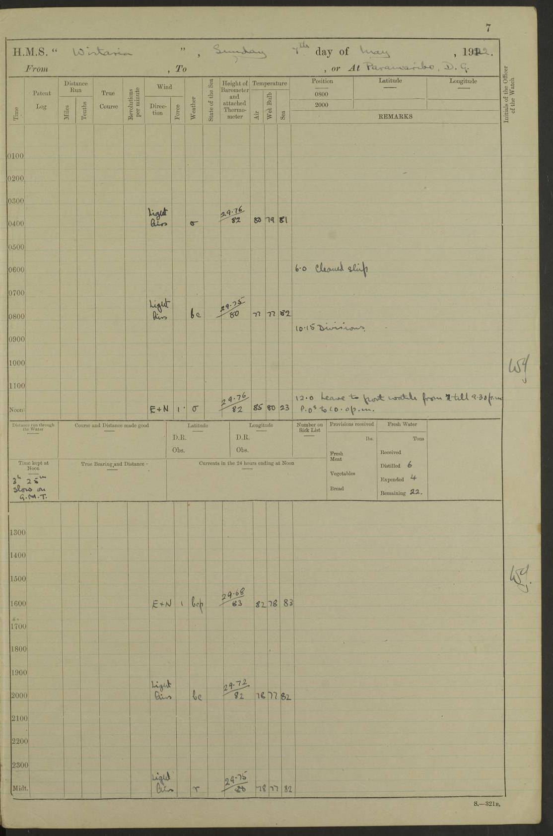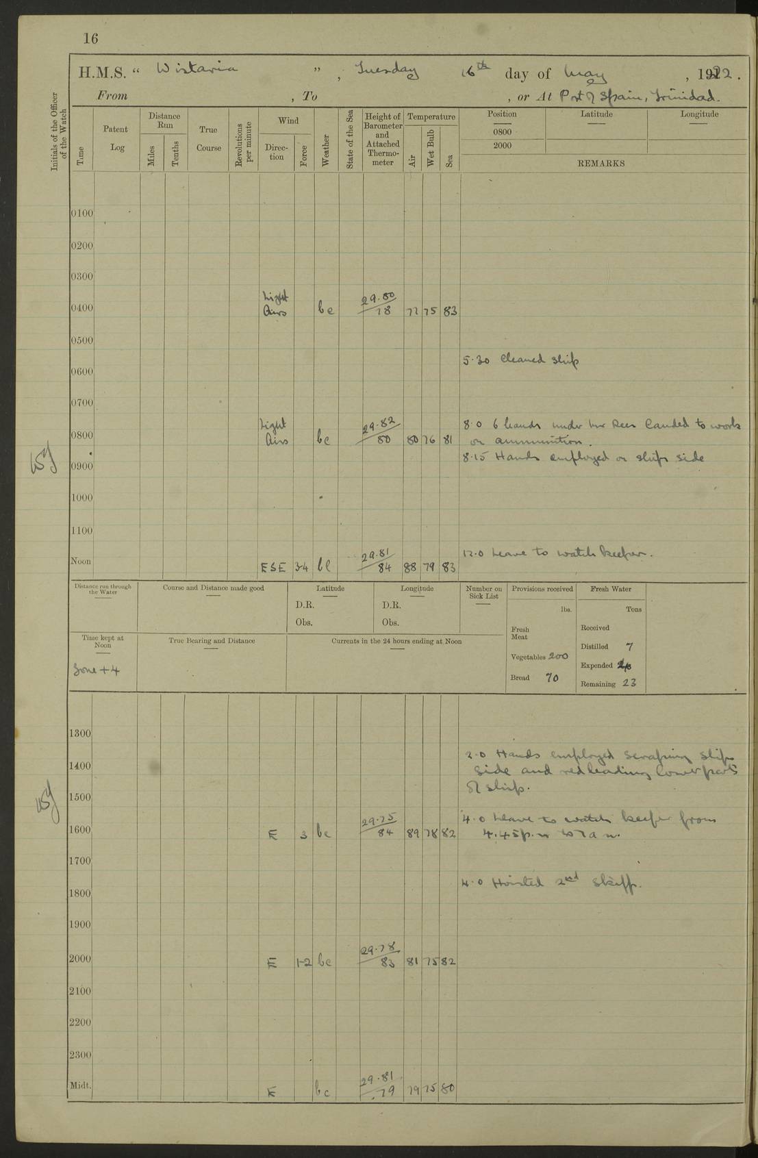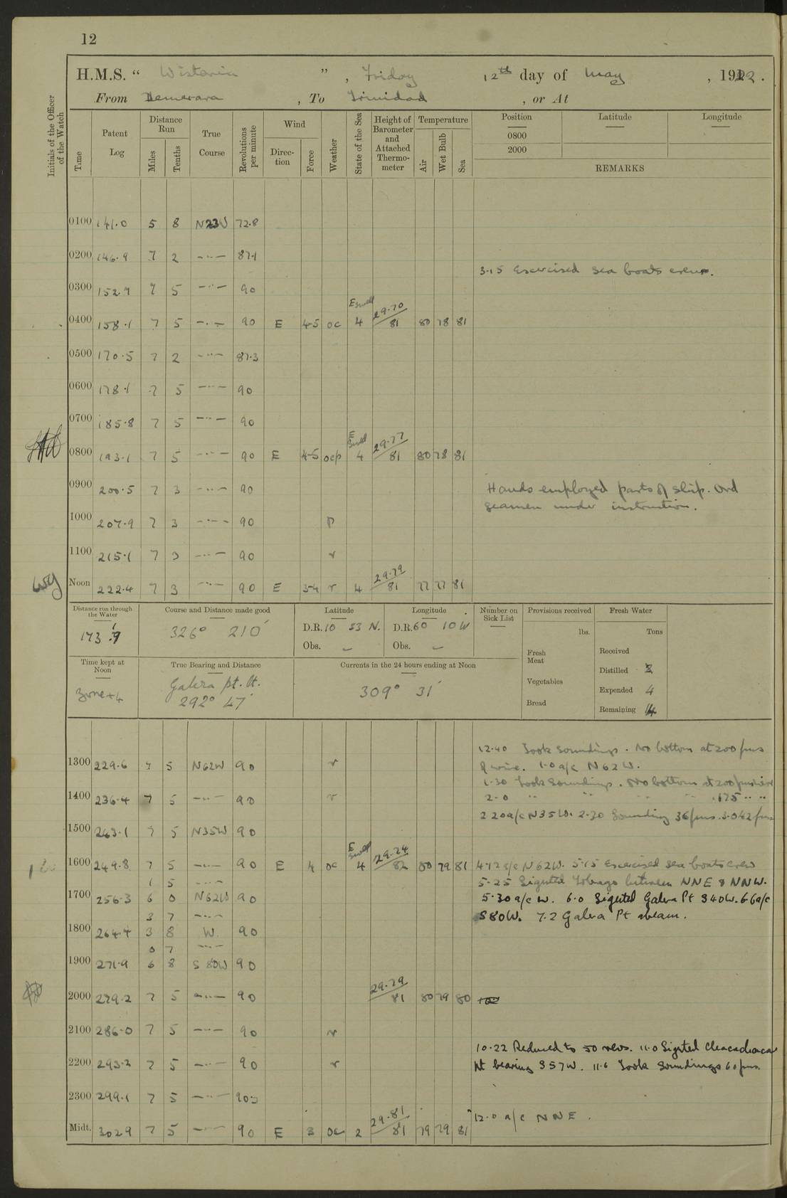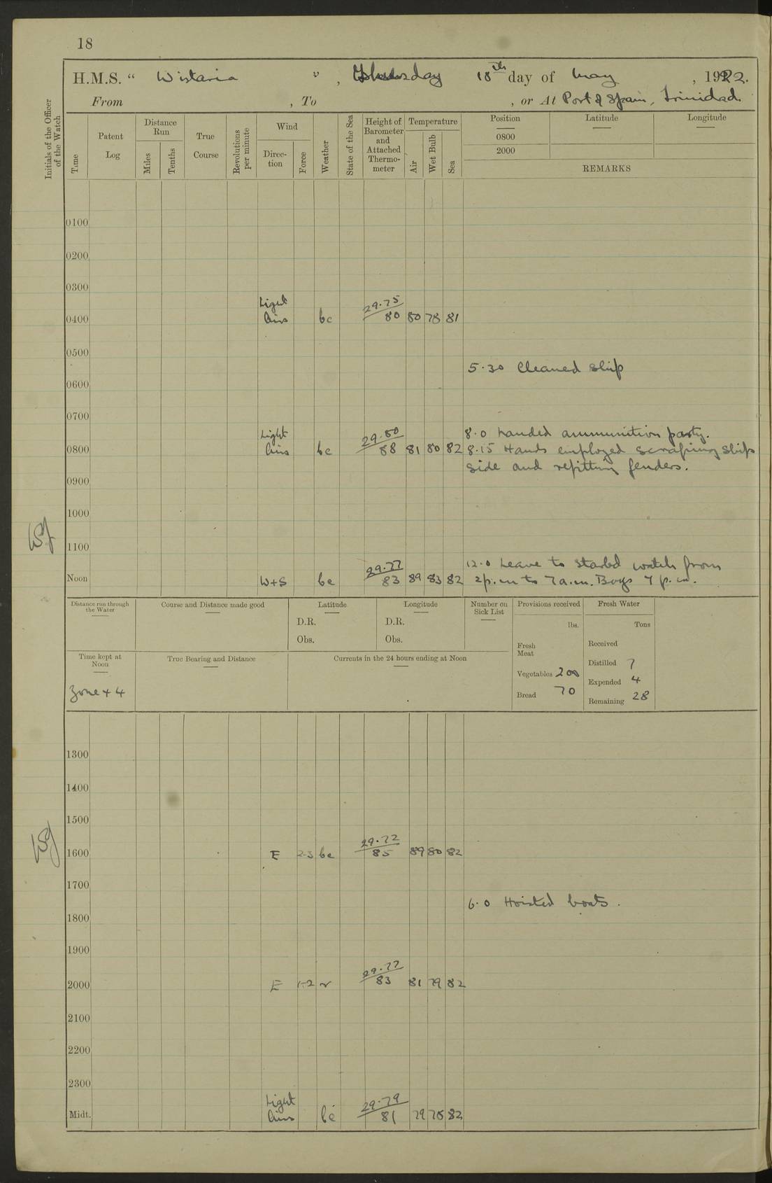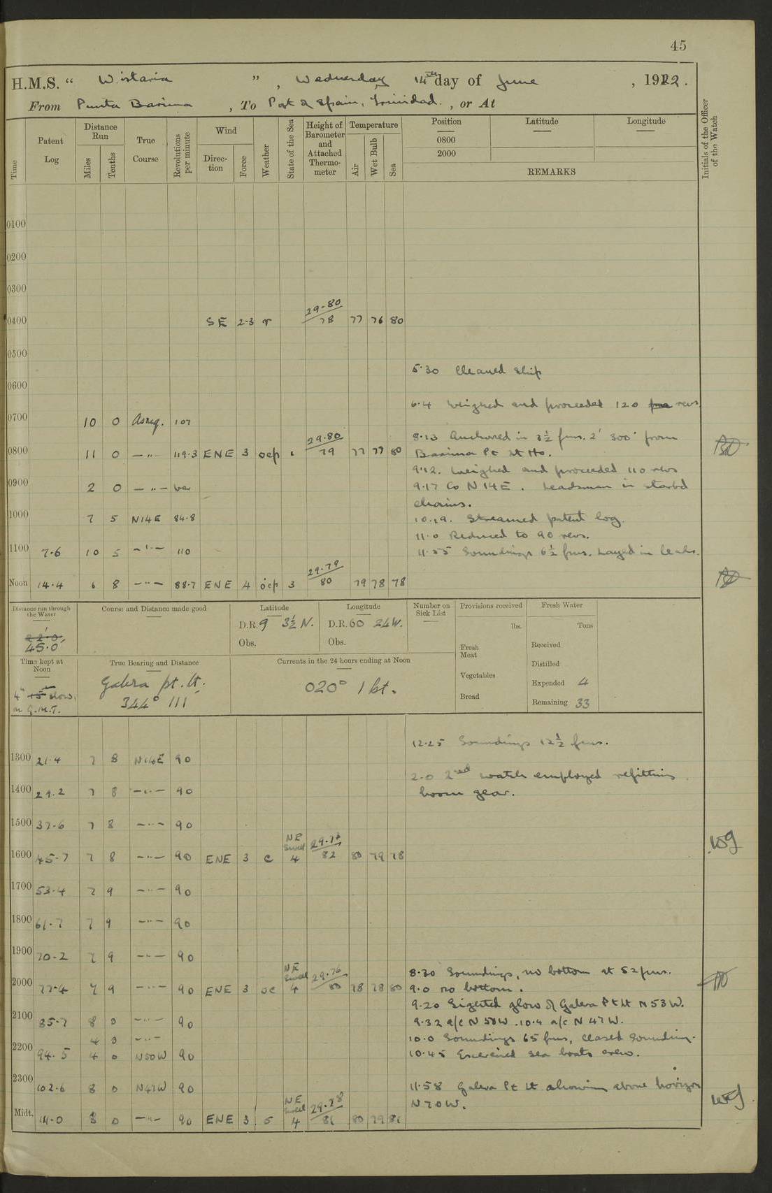 LOGS FOR MAY 1922 4f73cabfa2fc8ea903000bab: (https://s3.amazonaws.com:443/oldweather/ADM53-93267/0003_1.jpg) 1 May 1922 At Georgetown, Demerara Lat 6.83, Long -58.16 8.15am: Hands employed about boats, falls and parts of ship 2.0pm: Hands employed parts of ship 6.0pm: Hoisted boats 4f73cac0a2fc8ea903000bac: (https://s3.amazonaws.com:443/oldweather/ADM53-93267/0004_0.jpg) 2 May 1922 At Georgetown, Demerara Lat 6.83, Long -58.16 8.0am: Hands employed about boats and falls, and parts of ship 4f73cac0a2fc8ea903000bad: (https://s3.amazonaws.com:443/oldweather/ADM53-93267/0004_1.jpg) 3 May 1922 At Demerara Lat 6.83, Long -58.16 9.15am: Divisions & Prayers. Hands employed cleaning out boats, turning skiff falls end for end and parts of ship 11.30am: One rating rejoined ship from hospital 4f73cac1a2fc8ea903000bae: (https://s3.amazonaws.com:443/oldweather/ADM53-93267/0005_0.jpg) 4 May 1922 From Demerara to Paramaribo, D.G. Lat 6.83, Long -57.7 5.30am: Hands employed unmooring ship and scrubbing decks 8.0am: Weighed 8.10am: Proceeded N10E, 80 revs 9.10am: Streamed patent log 9.25am: Demerara River Light Ship abeam 9.30am: Commenced sounding every half hour 10.30am: Ceased sounding 5.45pm: Exercised “flare oil navigation lights” True Bearing and Distance: Suriname L.V. 108°½, 155 miles 4f73cac1a2fc8ea903000baf: (https://s3.amazonaws.com:443/oldweather/ADM53-93267/0005_1.jpg) 5 May 1922 From Demerara to Paramaribo and at Paramaribo D.G. Lat 5.88, Long -55.09 0.05am: Took sounding, 20 fms 1.0am: Took sounding, 19 fms 2.0am: Commenced sounding every half hour 8.40am: Sighted land 4 points on Starboard bow 9.0am: Leadsmen in cleaning 9.10am: Altered course SE. Sighted lightship 9.57am: Stopped to pick up pilot 10.12am: Proceeded S15E, 30 revs 10.14am: Suriname Lt Vessel abeam ½ mile 11.33am: Came to with port anchor in 4 fms and veered to 2 shackles Fort Amsterdam Anchor Bearings: left tangent, Point N57E; left tangent, Point S9W; Signal Post N80E 1.0pm: Weighed and proceeded as required for Paramaribo, 130 revs 1.50am: Moored with 3 shackles on each Paramaribo Anchor Bearings (middled): Fort Zeelandia Pt N83E; Marien Quay, right tangent, N45E; End of road N53W 2.0pm: Put clocks on 20 minutes (to shore time) 6.15pm: Hoisted boats 4f73cac1a2fc8ea903000bb0: (https://s3.amazonaws.com:443/oldweather/ADM53-93267/0006_0.jpg) 6 May 1922 At Paramaribo D.G. Lat 5.84, Long -55.11 8.0am: Dressed ship overall for Accession Day noon: Fired 21 gun salute in honour of anniversary of the Kings Accession 6.23pm: Undressed ship 8.40pm: Burned searchlights 4f73cac2a2fc8ea903000bb1: (https://s3.amazonaws.com:443/oldweather/ADM53-93267/0006_1.jpg) 7 May 1922 At Paramaribo D.G. Lat 5.84, Long -55.11 6.0am: Cleaned ship 10.15am: Divisions 4f73cac2a2fc8ea903000bb2: (https://s3.amazonaws.com:443/oldweather/ADM53-93267/0007_0.jpg) 8 May 1922 At Paramaribo D.G. Lat 5.84, Long -55.11 8.15am: Hands employed cleaning ship and about boats & falls 6 tons of rain water caught for drinking purposes 2.0pm: Hands employed working parts of ship 5.50pm: One rating rejoined ship from hospital 4f73cac2a2fc8ea903000bb3: (https://s3.amazonaws.com:443/oldweather/ADM53-93267/0007_1.jpg) 9 May 1922 From Paramaribo to Georgetown, Demerara Lat 6.1, Long -55.46 5.30am: Hands employed unmooring & cleaning ship 8.05am: British Consul left ship. Fired salute of 7 guns 8.18am: Weighed and proceeded 120 revs 8.56am: Fort Amsterdam Lt Ho abeam 10.11am: Stopped by L.V. & dropped pilot 10.15am: Proceeded N66W, 100 revs 10.20am: Streamed patent log 2.0pm: 3rd watch employed scraping and painting motor boat 5.0pm: Put clocks back 20 minutes 8.25pm: Exercised sounding party, 16 fms True Bearing and Distance: Demerara L.V. 287°½, 165 miles 4f73cac3a2fc8ea903000bb4: (https://s3.amazonaws.com:443/oldweather/ADM53-93267/0008_0.jpg) 10 May 1922 From Paramaribo to Georgetown, Demerara and at Georgetown Lat 6.83, Long -58.16 2.05am: Took soundings, 11½ fms 5.0am: Took sounding 4 fms 5.31am: Sighted Demerara Lt V N46W, Georgetown Lt Ho S85W 7.05am: Sighted Georgetown Pier Hd. Course as requisite for entering harbour 7.43am: Came to with Port anchor 4 shackles in 5 faths Anchor Bearings: Best Lt Ho N80W, Best Church S68W, Georgetown Lt Ho N33E 8.45am: Hands employed cleaning out boats & store rooms 10.25am: Weighed and proceeded alongside La Providence coaling jetty 10.48am: Secured alongside One whaler oar lost by accident [Best Light House: perhaps this light: “A fixed green light with red sector is shown from the end of the jetty called East Best Groin, on the west side of the river”. A map of Georgetown and Mouths of Demerara and Essequibo Rivers here] 4f73cac3a2fc8ea903000bb5: (https://s3.amazonaws.com:443/oldweather/ADM53-93267/0008_1.jpg) 11 May 1922 From Demerara to Trinidad and at Georgetown, Demerara Lat 7.61, Long -58.18 5.35am: Weighed and proceeded 96 revs 5.46am: Best Lt Ho abeam. Course N20E 6.38am: Streamed patent log 6.58am: Demerara L.V. bore S, ¼ mile 10.42am: Took soundings 16 fms 3.10am: Took soundings 15 fathoms 5.0pm: Put clocks back ¼ hour True Bearing and Distance: Galera Point Lt Ho 320°, 250 miles 4f73cac4a2fc8ea903000bb6: (https://s3.amazonaws.com:443/oldweather/ADM53-93267/0009_0.jpg) 12 May 1922 From Demerara to Trinidad Lat 10.55, Long -60.16 am: Hands employed parts of ship and seamen under instruction 12.40pm: Took soundings. No bottom at 200 fms of wire 1.30pm: Took soundings. No bottom at 200 fms of wire 2.0pm: Took sounding. No bottom at 175 fms of wire 2.30pm: Sounding 36 fms 3.0pm: 42 fms 5.25pm: Sighted Galera Pt S40W 7.02pm: Galera Pt abeam 11.0pm: Sighted Chacachacare Lt bearing S57W 11.06pm: Took soundings 60 fms True Bearing and Distance: Galera Point Lt Ho 292°, 47 miles 4f73cac4a2fc8ea903000bb7: (https://s3.amazonaws.com:443/oldweather/ADM53-93267/0009_1.jpg) 13 May 1922 From Demerara to Trinidad and at Port of Spain, Trinidad Lat 6.81, Long -58.17 noon: Altered course NNE. Chacachacare Lt bearing S50W. Sig