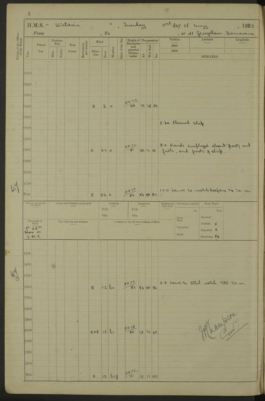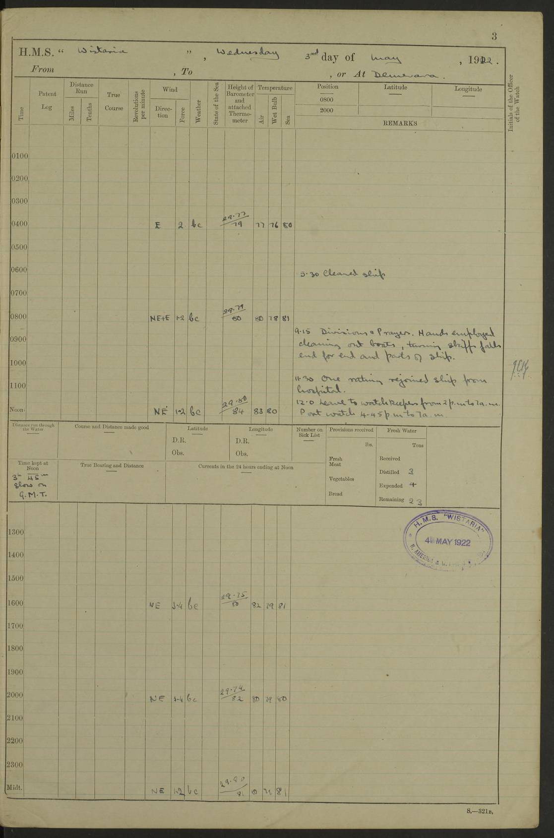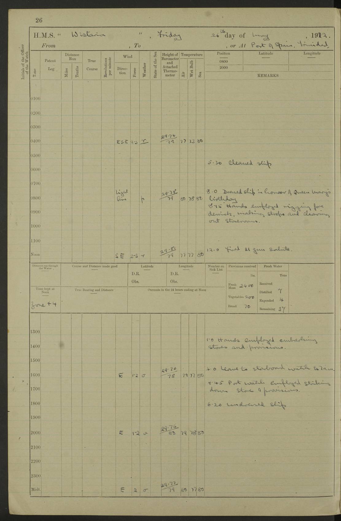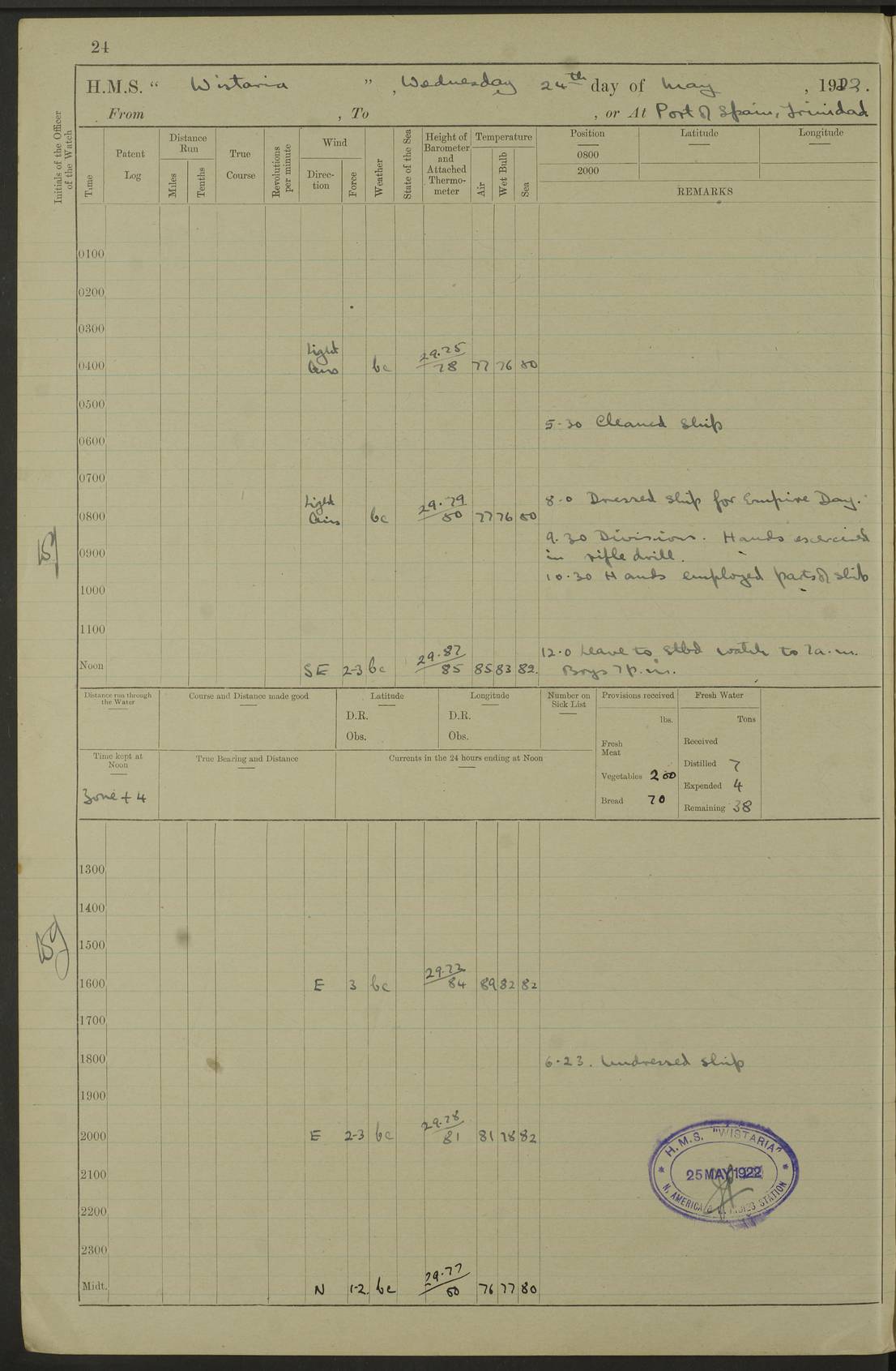 LOGS FOR MAY 1922 4f73cabfa2fc8ea903000bab: (https://s3.amazonaws.com:443/oldweather/ADM53-93267/0003_1.jpg) 1 May 1922 At Georgetown, Demerara Lat 6.83, Long -58.16 8.15am: Hands employed about boats, falls and parts of ship 2.0pm: Hands employed parts of ship 6.0pm: Hoisted boats 4f73cac0a2fc8ea903000bac: (https://s3.amazonaws.com:443/oldweather/ADM53-93267/0004_0.jpg) 2 May 1922 At Georgetown, Demerara Lat 6.83, Long -58.16 8.0am: Hands employed about boats and falls, and parts of ship 4f73cac0a2fc8ea903000bad: (https://s3.amazonaws.com:443/oldweather/ADM53-93267/0004_1.jpg) 3 May 1922 At Demerara Lat 6.83, Long -58.16 9.15am: Divisions & Prayers. Hands employed cleaning out boats, turning skiff falls end for end and parts of ship 11.30am: One rating rejoined ship from hospital 4f73cac1a2fc8ea903000bae: (https://s3.amazonaws.com:443/oldweather/ADM53-93267/0005_0.jpg) 4 May 1922 From Demerara to Paramaribo, D.G. Lat 6.83, Long -57.7 5.30am: Hands employed unmooring ship and scrubbing decks 8.0am: Weighed 8.10am: Proceeded N10E, 80 revs 9.10am: Streamed patent log 9.25am: Demerara River Light Ship abeam 9.30am: Commenced sounding every half hour 10.30am: Ceased sounding 5.45pm: Exercised “flare oil navigation lights” True Bearing and Distance: Suriname L.V. 108°½, 155 miles 4f73cac1a2fc8ea903000baf: (https://s3.amazonaws.com:443/oldweather/ADM53-93267/0005_1.jpg) 5 May 1922 From Demerara to Paramaribo and at Paramaribo D.G. Lat 5.88, Long -55.09 0.05am: Took sounding, 20 fms 1.0am: Took sounding, 19 fms 2.0am: Commenced sounding every half hour 8.40am: Sighted land 4 points on Starboard bow 9.0am: Leadsmen in cleaning 9.10am: Altered course SE. Sighted lightship 9.57am: Stopped to pick up pilot 10.12am: Proceeded S15E, 30 revs 10.14am: Suriname Lt Vessel abeam ½ mile 11.33am: Came to with port anchor in 4 fms and veered to 2 shackles Fort Amsterdam Anchor Bearings: left tangent, Point N57E; left tangent, Point S9W; Signal Post N80E 1.0pm: Weighed and proceeded as required for Paramaribo, 130 revs 1.50am: Moored with 3 shackles on each Paramaribo Anchor Bearings (middled): Fort Zeelandia Pt N83E; Marien Quay, right tangent, N45E; End of road N53W 2.0pm: Put clocks on 20 minutes (to shore time) 6.15pm: Hoisted boats 4f73cac1a2fc8ea903000bb0: (https://s3.amazonaws.com:443/oldweather/ADM53-93267/0006_0.jpg) 6 May 1922 At Paramaribo D.G. Lat 5.84, Long -55.11 8.0am: Dressed ship overall for Accession Day noon: Fired 21 gun salute in honour of anniversary of the Kings Accession 6.23pm: Undressed ship 8.40pm: Burned searchlights 4f73cac2a2fc8ea903000bb1: (https://s3.amazonaws.com:443/oldweather/ADM53-93267/0006_1.jpg) 7 May 1922 At Paramaribo D.G. Lat 5.84, Long -55.11 6.0am: Cleaned ship 10.15am: Divisions 4f73cac2a2fc8ea903000bb2: (https://s3.amazonaws.com:443/oldweather/ADM53-93267/0007_0.jpg) 8 May 1922 At Paramaribo D.G. Lat 5.84, Long -55.11 8.15am: Hands employed cleaning ship and about boats & falls 6 tons of rain water caught for drinking purposes 2.0pm: Hands employed working parts of ship 5.50pm: One rating rejoined ship from hospital 4f73cac2a2fc8ea903000bb3: (https://s3.amazonaws.com:443/oldweather/ADM53-93267/0007_1.jpg) 9 May 1922 From Paramaribo to Georgetown, Demerara Lat 6.1, Long -55.46 5.30am: Hands employed unmooring & cleaning ship 8.05am: British Consul left ship. Fired salute of 7 guns 8.18am: Weighed and proceeded 120 revs 8.56am: Fort Amsterdam Lt Ho abeam 10.11am: Stopped by L.V. & dropped pilot 10.15am: Proceeded N66W, 100 revs 10.20am: Streamed patent log 2.0pm: 3rd watch employed scraping and painting motor boat 5.0pm: Put clocks back 20 minutes 8.25pm: Exercised sounding party, 16 fms True Bearing and Distance: Demerara L.V. 287°½, 165 miles 4f73cac3a2fc8ea903000bb4: (https://s3.amazonaws.com:443/oldweather/ADM53-93267/0008_0.jpg) 10 May 1922 From Paramaribo to Georgetown, Demerara and at Georgetown Lat 6.83, Long -58.16 2.05am: Took soundings, 11½ fms 5.0am: Took sounding 4 fms 5.31am: Sighted Demerara Lt V N46W, Georgetown Lt Ho S85W 7.05am: Sighted Georgetown Pier Hd. Course as requisite for entering harbour 7.43am: Came to with Port anchor 4 shackles in 5 faths Anchor Bearings: Best Lt Ho N80W, Best Church S68W, Georgetown Lt Ho N33E 8.45am: Hands employed cleaning out boats & store rooms 10.25am: Weighed and proceeded alongside La Providence coaling jetty 10.48am: Secured alongside One whaler oar lost by accident [Best Light House: perhaps this light: “A fixed green light with red sector is shown from the end of the jetty called East Best Groin, on the west side of the river”. A map of Georgetown and Mouths of Demerara and Essequibo Rivers here] 4f73cac3a2fc8ea903000bb5: (https://s3.amazonaws.com:443/oldweather/ADM53-93267/0008_1.jpg) 11 May 1922 From Demerara to Trinidad and at Georgetown, Demerara Lat 7.61, Long -58.18 5.35am: Weighed and proceeded 96 revs 5.46am: Best Lt Ho abeam. Course N20E 6.38am: Streamed patent log 6.58am: Demerara L.V. bore S, ¼ mile 10.42am: Took soundings 16 fms 3.10am: Took soundings 15 fathoms 5.0pm: Put clocks back ¼ hour True Bearing and Distance: Galera Point Lt Ho 320°, 250 miles 4f73cac4a2fc8ea903000bb6: (https://s3.amazonaws.com:443/oldweather/ADM53-93267/0009_0.jpg) 12 May 1922 From Demerara to Trinidad Lat 10.55, Long -60.16 am: Hands employed parts of ship and seamen under instruction 12.40pm: Took soundings. No bottom at 200 fms of wire 1.30pm: Took soundings. No bottom at 200 fms of wire 2.0pm: Took sounding. No bottom at 175 fms of wire 2.30pm: Sounding 36 fms 3.0pm: 42 fms 5.25pm: Sighted Galera Pt S40W 7.02pm: Galera Pt abeam 11.0pm: Sighted Chacachacare Lt bearing S57W 11.06pm: Took soundings 60 fms True Bearing and Distance: Galera Point Lt Ho 292°, 47 miles 4f73cac4a2fc8ea903000bb7: (https://s3.amazonaws.com:443/oldweather/ADM53-93267/0009_1.jpg) 13 May 1922 From Demerara to Trinidad and at Port of Spain, Trinidad Lat 6.81, Long -58.17 noon: Altered course NNE. Chacachacare Lt bearing S50W. Sig