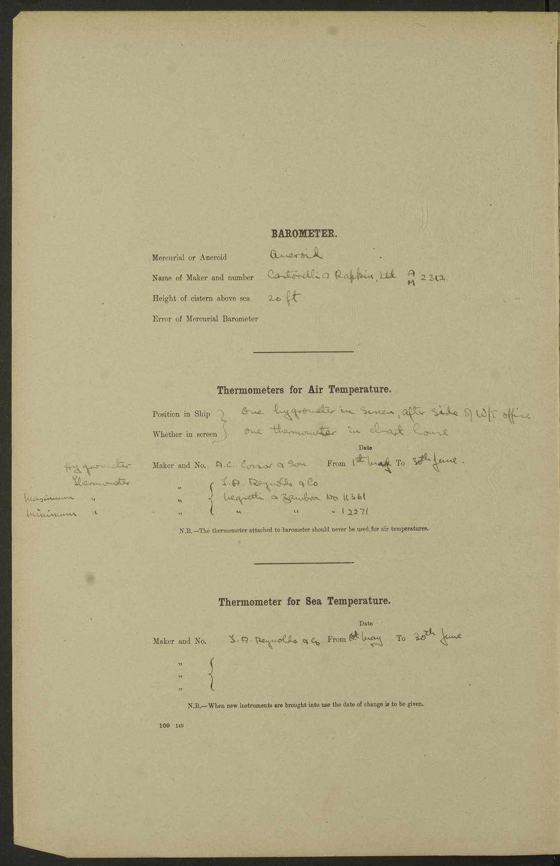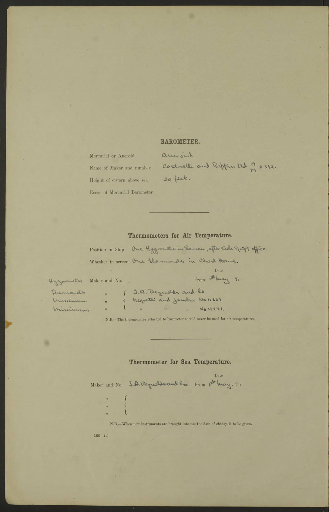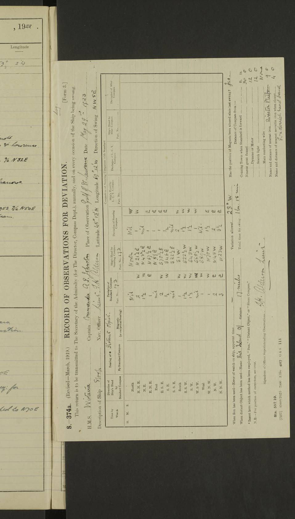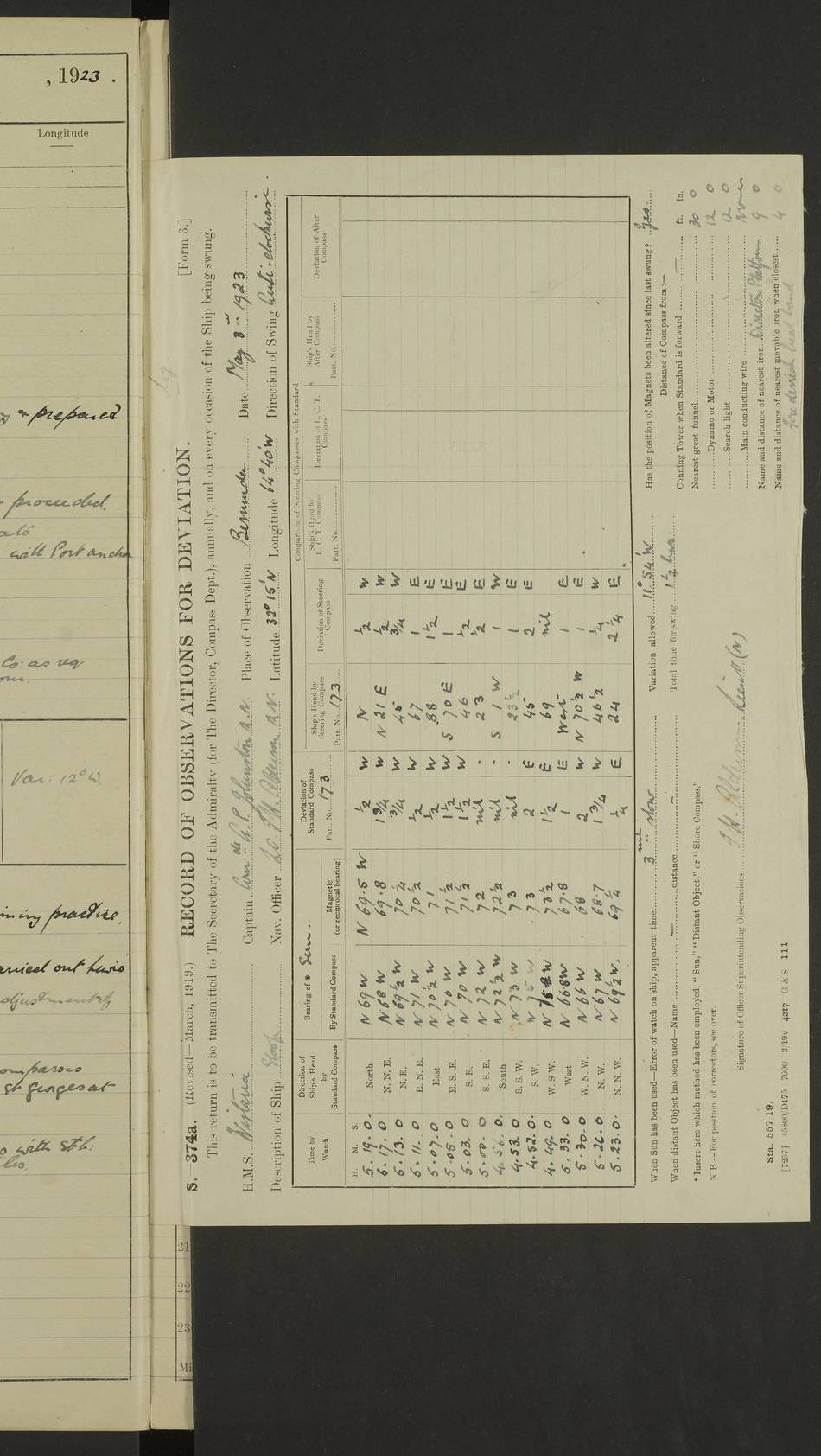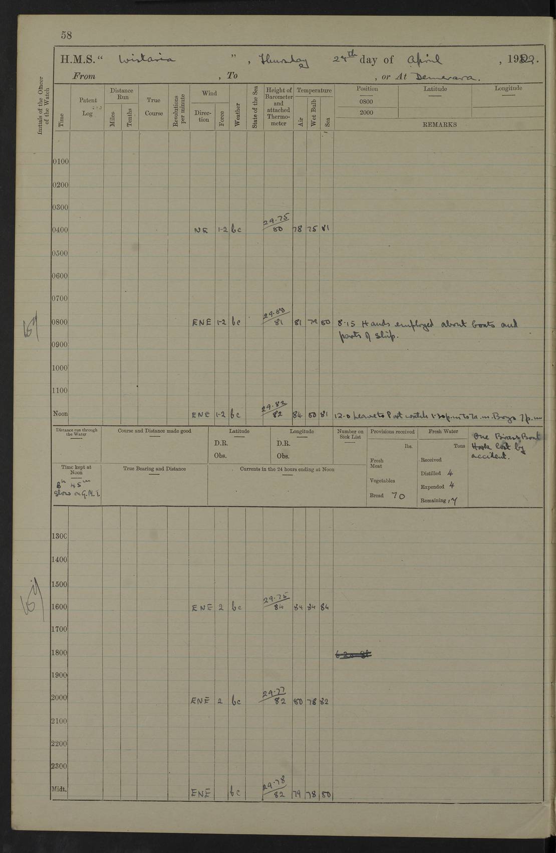 LOGS FOR MAY 1922 4f73cabfa2fc8ea903000bab: (https://s3.amazonaws.com:443/oldweather/ADM53-93267/0003_1.jpg) 1 May 1922 At Georgetown, Demerara Lat 6.83, Long -58.16 8.15am: Hands employed about boats, falls and parts of ship 2.0pm: Hands employed parts of ship 6.0pm: Hoisted boats 4f73cac0a2fc8ea903000bac: (https://s3.amazonaws.com:443/oldweather/ADM53-93267/0004_0.jpg) 2 May 1922 At Georgetown, Demerara Lat 6.83, Long -58.16 8.0am: Hands employed about boats and falls, and parts of ship 4f73cac0a2fc8ea903000bad: (https://s3.amazonaws.com:443/oldweather/ADM53-93267/0004_1.jpg) 3 May 1922 At Demerara Lat 6.83, Long -58.16 9.15am: Divisions & Prayers. Hands employed cleaning out boats, turning skiff falls end for end and parts of ship 11.30am: One rating rejoined ship from hospital 4f73cac1a2fc8ea903000bae: (https://s3.amazonaws.com:443/oldweather/ADM53-93267/0005_0.jpg) 4 May 1922 From Demerara to Paramaribo, D.G. Lat 6.83, Long -57.7 5.30am: Hands employed unmooring ship and scrubbing decks 8.0am: Weighed 8.10am: Proceeded N10E, 80 revs 9.10am: Streamed patent log 9.25am: Demerara River Light Ship abeam 9.30am: Commenced sounding every half hour 10.30am: Ceased sounding 5.45pm: Exercised “flare oil navigation lights” True Bearing and Distance: Suriname L.V. 108°½, 155 miles 4f73cac1a2fc8ea903000baf: (https://s3.amazonaws.com:443/oldweather/ADM53-93267/0005_1.jpg) 5 May 1922 From Demerara to Paramaribo and at Paramaribo D.G. Lat 5.88, Long -55.09 0.05am: Took sounding, 20 fms 1.0am: Took sounding, 19 fms 2.0am: Commenced sounding every half hour 8.40am: Sighted land 4 points on Starboard bow 9.0am: Leadsmen in cleaning 9.10am: Altered course SE. Sighted lightship 9.57am: Stopped to pick up pilot 10.12am: Proceeded S15E, 30 revs 10.14am: Suriname Lt Vessel abeam ½ mile 11.33am: Came to with port anchor in 4 fms and veered to 2 shackles Fort Amsterdam Anchor Bearings: left tangent, Point N57E; left tangent, Point S9W; Signal Post N80E 1.0pm: Weighed and proceeded as required for Paramaribo, 130 revs 1.50am: Moored with 3 shackles on each Paramaribo Anchor Bearings (middled): Fort Zeelandia Pt N83E; Marien Quay, right tangent, N45E; End of road N53W 2.0pm: Put clocks on 20 minutes (to shore time) 6.15pm: Hoisted boats 4f73cac1a2fc8ea903000bb0: (https://s3.amazonaws.com:443/oldweather/ADM53-93267/0006_0.jpg) 6 May 1922 At Paramaribo D.G. Lat 5.84, Long -55.11 8.0am: Dressed ship overall for Accession Day noon: Fired 21 gun salute in honour of anniversary of the Kings Accession 6.23pm: Undressed ship 8.40pm: Burned searchlights 4f73cac2a2fc8ea903000bb1: (https://s3.amazonaws.com:443/oldweather/ADM53-93267/0006_1.jpg) 7 May 1922 At Paramaribo D.G. Lat 5.84, Long -55.11 6.0am: Cleaned ship 10.15am: Divisions 4f73cac2a2fc8ea903000bb2: (https://s3.amazonaws.com:443/oldweather/ADM53-93267/0007_0.jpg) 8 May 1922 At Paramaribo D.G. Lat 5.84, Long -55.11 8.15am: Hands employed cleaning ship and about boats & falls 6 tons of rain water caught for drinking purposes 2.0pm: Hands employed working parts of ship 5.50pm: One rating rejoined ship from hospital 4f73cac2a2fc8ea903000bb3: (https://s3.amazonaws.com:443/oldweather/ADM53-93267/0007_1.jpg) 9 May 1922 From Paramaribo to Georgetown, Demerara Lat 6.1, Long -55.46 5.30am: Hands employed unmooring & cleaning ship 8.05am: British Consul left ship. Fired salute of 7 guns 8.18am: Weighed and proceeded 120 revs 8.56am: Fort Amsterdam Lt Ho abeam 10.11am: Stopped by L.V. & dropped pilot 10.15am: Proceeded N66W, 100 revs 10.20am: Streamed patent log 2.0pm: 3rd watch employed scraping and painting motor boat 5.0pm: Put clocks back 20 minutes 8.25pm: Exercised sounding party, 16 fms True Bearing and Distance: Demerara L.V. 287°½, 165 miles 4f73cac3a2fc8ea903000bb4: (https://s3.amazonaws.com:443/oldweather/ADM53-93267/0008_0.jpg) 10 May 1922 From Paramaribo to Georgetown, Demerara and at Georgetown Lat 6.83, Long -58.16 2.05am: Took soundings, 11½ fms 5.0am: Took sounding 4 fms 5.31am: Sighted Demerara Lt V N46W, Georgetown Lt Ho S85W 7.05am: Sighted Georgetown Pier Hd. Course as requisite for entering harbour 7.43am: Came to with Port anchor 4 shackles in 5 faths Anchor Bearings: Best Lt Ho N80W, Best Church S68W, Georgetown Lt Ho N33E 8.45am: Hands employed cleaning out boats & store rooms 10.25am: Weighed and proceeded alongside La Providence coaling jetty 10.48am: Secured alongside One whaler oar lost by accident [Best Light House: perhaps this light: “A fixed green light with red sector is shown from the end of the jetty called East Best Groin, on the west side of the river”. A map of Georgetown and Mouths of Demerara and Essequibo Rivers here] 4f73cac3a2fc8ea903000bb5: (https://s3.amazonaws.com:443/oldweather/ADM53-93267/0008_1.jpg) 11 May 1922 From Demerara to Trinidad and at Georgetown, Demerara Lat 7.61, Long -58.18 5.35am: Weighed and proceeded 96 revs 5.46am: Best Lt Ho abeam. Course N20E 6.38am: Streamed patent log 6.58am: Demerara L.V. bore S, ¼ mile 10.42am: Took soundings 16 fms 3.10am: Took soundings 15 fathoms 5.0pm: Put clocks back ¼ hour True Bearing and Distance: Galera Point Lt Ho 320°, 250 miles 4f73cac4a2fc8ea903000bb6: (https://s3.amazonaws.com:443/oldweather/ADM53-93267/0009_0.jpg) 12 May 1922 From Demerara to Trinidad Lat 10.55, Long -60.16 am: Hands employed parts of ship and seamen under instruction 12.40pm: Took soundings. No bottom at 200 fms of wire 1.30pm: Took soundings. No bottom at 200 fms of wire 2.0pm: Took sounding. No bottom at 175 fms of wire 2.30pm: Sounding 36 fms 3.0pm: 42 fms 5.25pm: Sighted Galera Pt S40W 7.02pm: Galera Pt abeam 11.0pm: Sighted Chacachacare Lt bearing S57W 11.06pm: Took soundings 60 fms True Bearing and Distance: Galera Point Lt Ho 292°, 47 miles 4f73cac4a2fc8ea903000bb7: (https://s3.amazonaws.com:443/oldweather/ADM53-93267/0009_1.jpg) 13 May 1922 From Demerara to Trinidad and at Port of Spain, Trinidad Lat 6.81, Long -58.17 noon: Altered course NNE. Chacachacare Lt bearing S50W. Sig