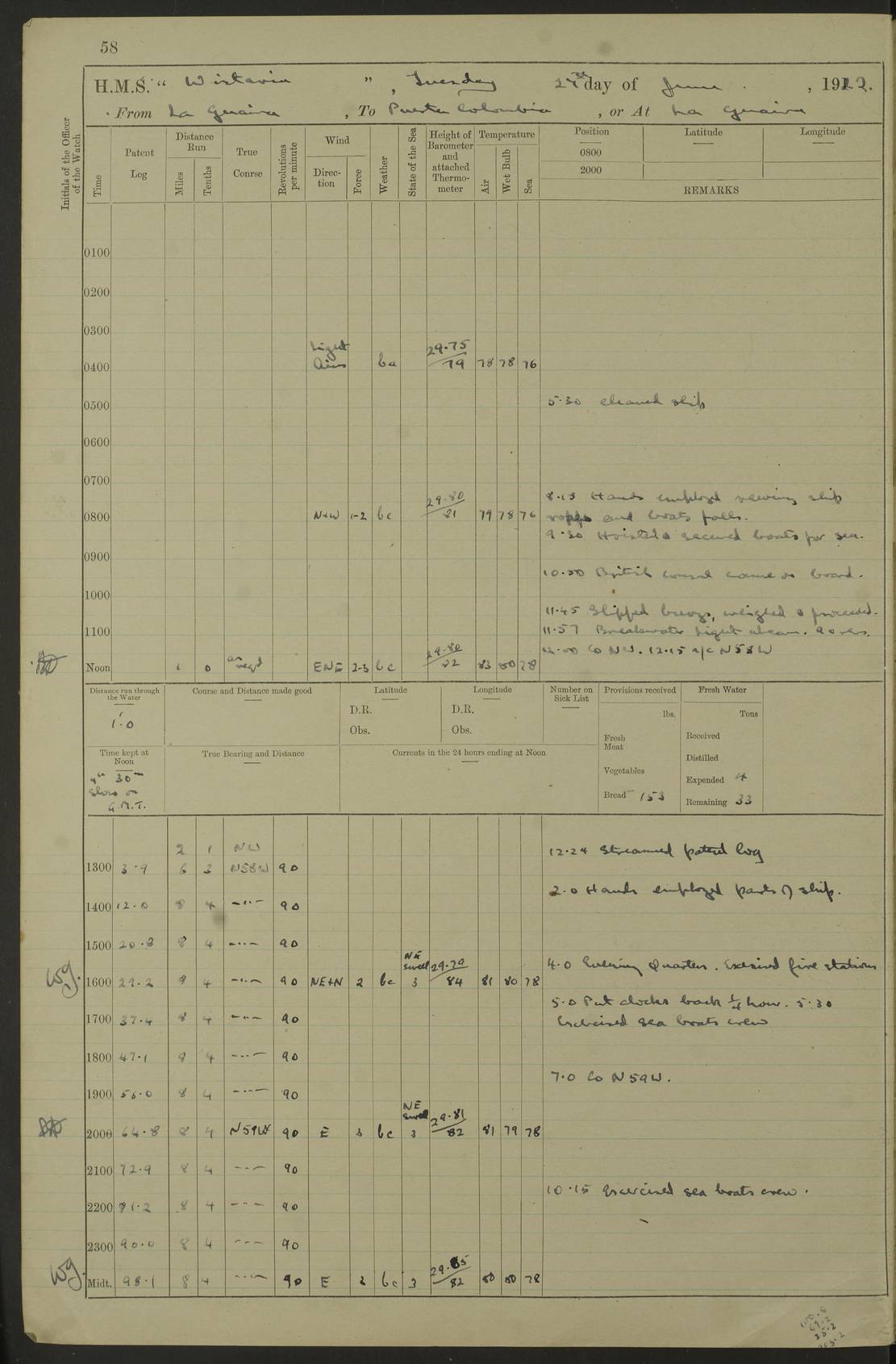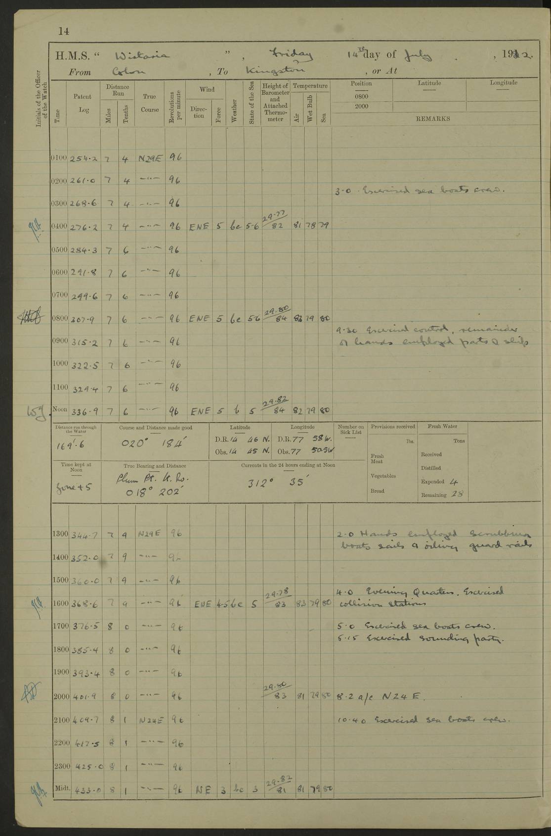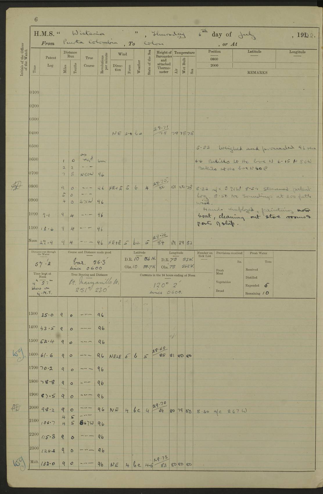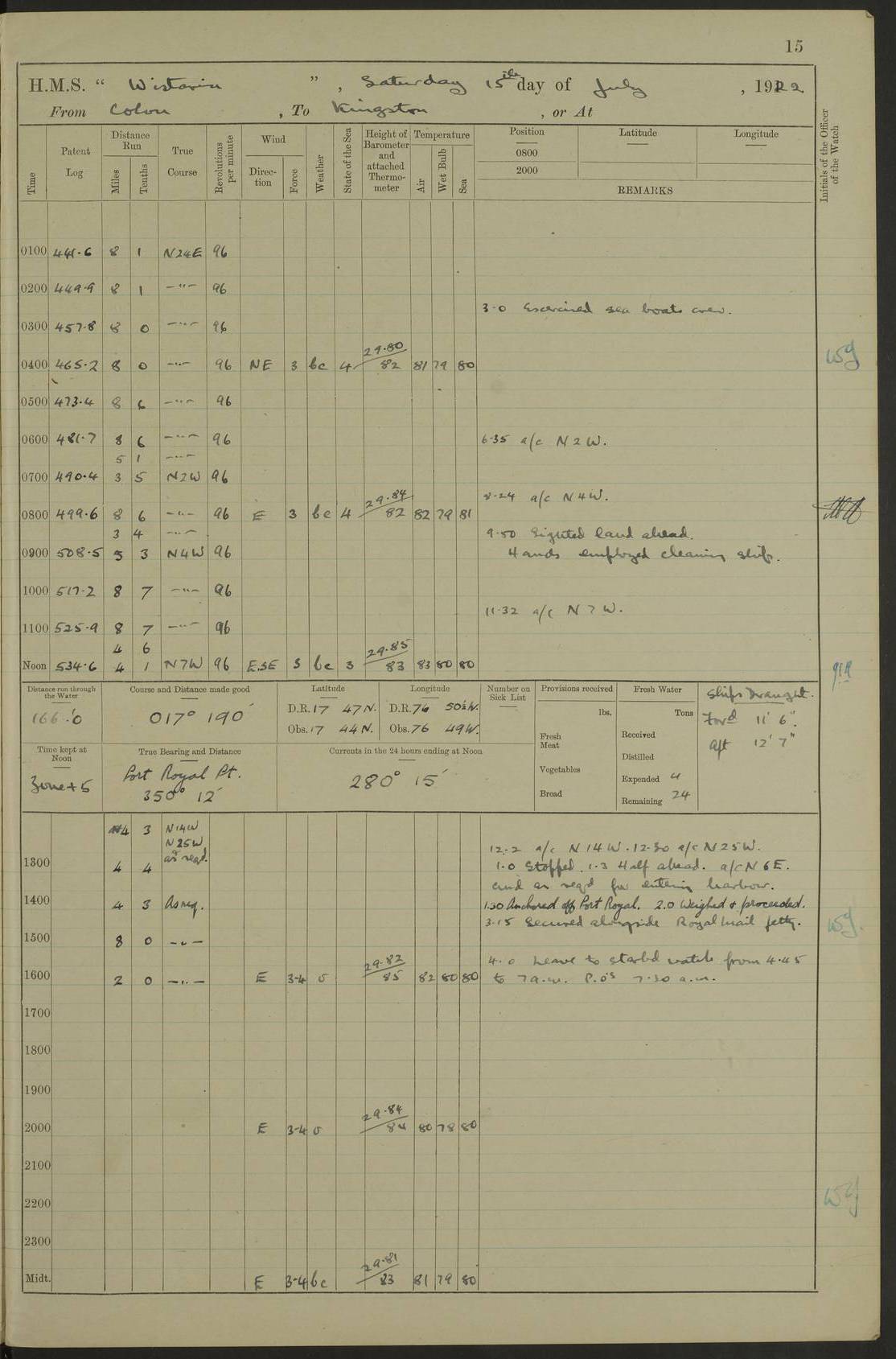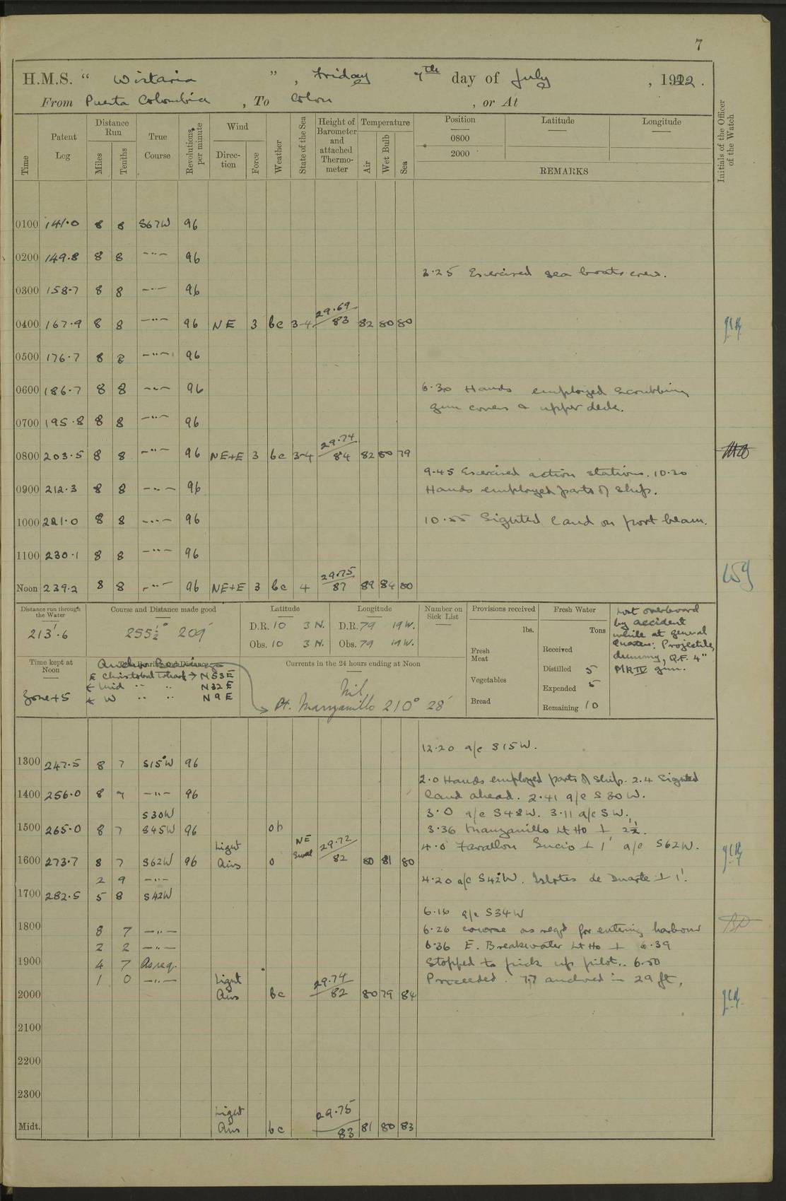 LOGS FOR JULY 1922 4f73cadaa2fc8ea903000bf3: (https://s3.amazonaws.com:443/oldweather/ADM53-93268/0003_1.jpg) 1 July 1922 At Puerto Colombia Lat 10.98, Long -74.95 8.15am: Cleaned ship am: One hand scrubber lost by accident 6.0pm: Hoisted boats 4f73cadba2fc8ea903000bf4: (https://s3.amazonaws.com:443/oldweather/ADM53-93268/0004_0.jpg) 2 July 1922 At Puerto Colombia Lat 10.98, Long -74.95 9.30am: Divisions am: One bucket & scrubber lost by accident 4f73cadba2fc8ea903000bf5: (https://s3.amazonaws.com:443/oldweather/ADM53-93268/0004_1.jpg) 3 July 1922 At Puerto Colombia Lat 10.98, Long -74.95 9.30am: Divisions pm: Hands employed painting ship’s side & parts of ship 6.30pm: Hoisted boats 4f73cadba2fc8ea903000bf6: (https://s3.amazonaws.com:443/oldweather/ADM53-93268/0005_0.jpg) 4 July 1922 At Puerto Colombia Lat 10.98, Long -74.95 8.15am: Hands employed making boats gripes, parts of ship & fumigating PO’s mess deck 2.0pm: Hands employed parts of ship 6.35pm: Hoisted boats 4f73cadca2fc8ea903000bf7: (https://s3.amazonaws.com:443/oldweather/ADM53-93268/0005_1.jpg) 5 July 1922 At Puerto Colombia Lat 10.98, Long -74.95 8.15am: Hands employed refitting motor boat falls and parts on ship 9.0pm: Hoisted boats 4f73cadca2fc8ea903000bf8: (https://s3.amazonaws.com:443/oldweather/ADM53-93268/0006_0.jpg) 6 July 1922 From Puerto Colombia to Colon Lat 10.9, Long -75.86 5.53am: Weighed and proceeded, 96 revs 6.06am: Bellilo Lt Ho bore N 6.15am: N80W, Belillo Lt Ho bore N40E 8.54am: Streamed patent log 8.50am: Sounding at 200 fath wire am: Hands employed painting motor boat, cleaning out store rooms & parts of ship True Bearing and Distance: Pt Manzanillo Lt 251°, 230 miles 4f73cadda2fc8ea903000bf9: (https://s3.amazonaws.com:443/oldweather/ADM53-93268/0006_1.jpg) 7 July 1922 From Puerto Colombia to Colon Lat 10.05, Long -79.31 6.30am: Hands employed scrubbing gun covers & upper deck 9.45am: Exercised action stations 10.55am: Sighted land on Port beam Lost overboard by accident while at general quarters: Projectile, dummy, Q.F. 4” MK IV gun 2.04pm: Sighted land ahead 3.36pm: Manzanillo Lt Ho abeam 2.5 miles 4.05pm: Farallon Sucio abeam, 1 mile. Altered course S62W 4.20pm: Altered course S42W. Islotes de Duarte abeam, 1 mile 6.26pm: Course as required for entering harbour 6.36pm: E Breakwater Lt Ho abeam 6.39pm: Stopped to pick up pilot 6.50pm: Proceeded 7.07pm: Anchored in 29 ft Anchor Bearings: E Christobal Wharf, right tangent, N53E; left tangent, Mid Christobal Wharf N35E; left tangent, W Christobal Wharf N9E True Bearing and Distance: Pt Manzanillo 210°, 28 miles 4f73cadda2fc8ea903000bfa: (https://s3.amazonaws.com:443/oldweather/ADM53-93268/0007_0.jpg) 8 July 1922 At Colon Lat 9.33, Long -79.9 8.0am: Saluted U.S.A. flag with 21 gun salute 8.45am: Secured alongside jetty 1.25pm: Lieut Arliss discharged to hospital 4f73cadda2fc8ea903000bfb: (https://s3.amazonaws.com:443/oldweather/ADM53-93268/0007_1.jpg) 9 July 1922 At Colon Lat 9.33, Long -79.9 6.0am: Cleaned ship. Party of 40 men landed to visit Panama Canal 9.45am: Divisions & Prayers 4f73cadea2fc8ea903000bfc: (https://s3.amazonaws.com:443/oldweather/ADM53-93268/0008_0.jpg) 10 July 1922 At Colon Lat 9.33, Long -79.9 8.15am: Hands employed refitting boats falls & touching up ship’s side One tarpaulin lost by accident (8x8) 4f73cadea2fc8ea903000bfd: (https://s3.amazonaws.com:443/oldweather/ADM53-93268/0008_1.jpg) 11 July 1922 At Colon Lat 9.33, Long -79.9 8.15am: Hands employed refitting boats falls & parts of ship 4f73cadfa2fc8ea903000bfe: (https://s3.amazonaws.com:443/oldweather/ADM53-93268/0009_0.jpg) 12 July 1922 At Colon Lat 9.33, Long -79.9 5.30am: Prepared ship for coaling 6.30am: Left No 6 pier & proceeded alongside coaling wharf 7.10am: Secured alongside coaling wharf 7.30am: Commenced coaling 8.30am: Coal ship 11.15am: Left coaling wharf & proceeded 11.50am: E Breakwater Lt Ho abeam. Course N10E. Streamed patent log 4f73cadfa2fc8ea903000bff: (https://s3.amazonaws.com:443/oldweather/ADM53-93268/0009_1.jpg) 13 July 1922 From Colon to Kingston Lat 11.95, Long -78.88 2.10am: Furled boat deck awning 9.30am: Divisions. Hands employed overhauling boats sailing gear & oiling after 2½” wire hawser 3.47pm: Slow ahead. Unshipped forecastle awning stanchions 3.53pm: Half ahead, 96 revs True Bearing and Distance: Plum Pt Lt Ho 018°½, 384 miles 4f73cadfa2fc8ea903000c00: (https://s3.amazonaws.com:443/oldweather/ADM53-93268/0010_0.jpg) 14 July 1922 From Colon to Kingston Lat 14.76, Long -77.96 9.30am: Exercised control, remainder of hands employed parts of ship 2.0pm: Hands employed scrubbing boats sails & oiling guard rails 4.0pm: Evening Quarters. Exercised collision stations 5.15pm: Exercised sounding party True Bearing and Distance: Plum Pt Lt Ho 018°, 202 miles 4f73cae0a2fc8ea903000c01: (https://s3.amazonaws.com:443/oldweather/ADM53-93268/0010_1.jpg) 15 July 1922 From Colon to Kingston Lat 17.78, Long -76.83 9.50am: Sighted land ahead. Hands employed cleaning ship 1.0pm: Stopped 1.03pm: Half ahead. Altered course N6E and as required for entering harbour 1.30pm: Anchored off Port Royal 2.0pm: Weighed & proceeded 3.15pm: Secured alongside Royal Mail jetty True Bearing and Distance: Port Royal Pt 350°, 12 miles 4f73cae0a2fc8ea903000c02: (https://s3.amazonaws.com:443/oldweather/ADM53-93268/0011_0.jpg) 16 July 1922 At Kingston Lat 17.95, Long -76.76 6.0am: Cleaned ship 9.45am: Divisions 4f73cae0a2fc8ea903000c03: (https://s3.amazonaws.com:443/oldweather/ADM53-93268/0011_1.jpg) 17 July 1922 At Kingston Lat 17.95, Long -76.76 5.30am: Hands employed furling quarter deck awning & rigging sheer legs 9.15am: Hands employed refitting fender & washing ship's side 2.0pm: Hands employed cleaning ship's side 4f73cae1a2fc8ea903000c04: (https://s3.amazonaws.com:443/oldweather/ADM53-93268/0012_0.jpg) 18 July 1922 At Kingston Lat 17.95, Long -76.76 5.30am: Hands employed cleaning ship. Divers at work about rudders 8.15am: Hands employed washing down aloft & replac