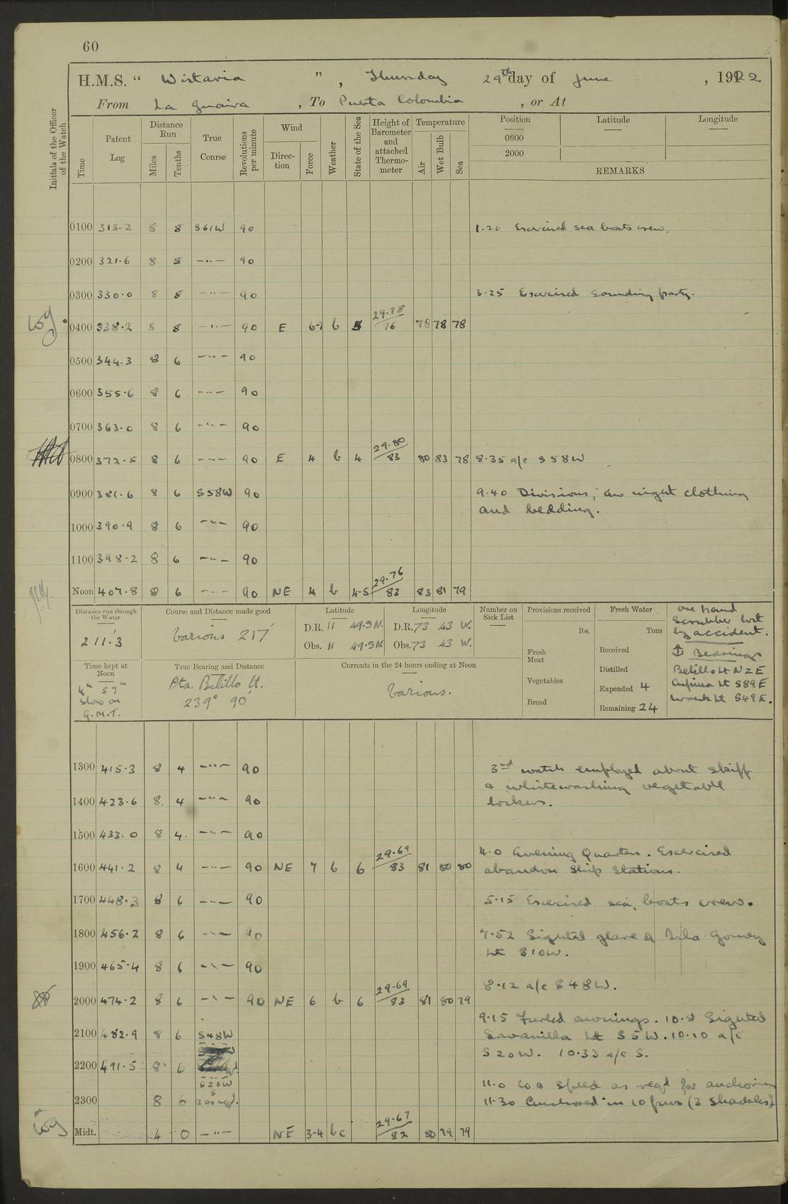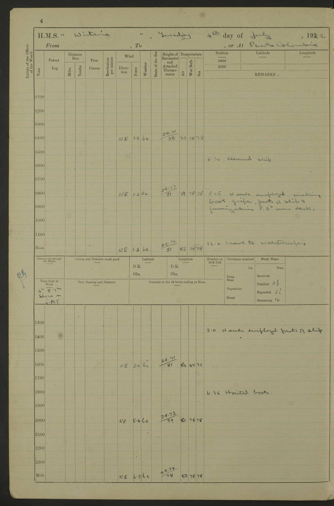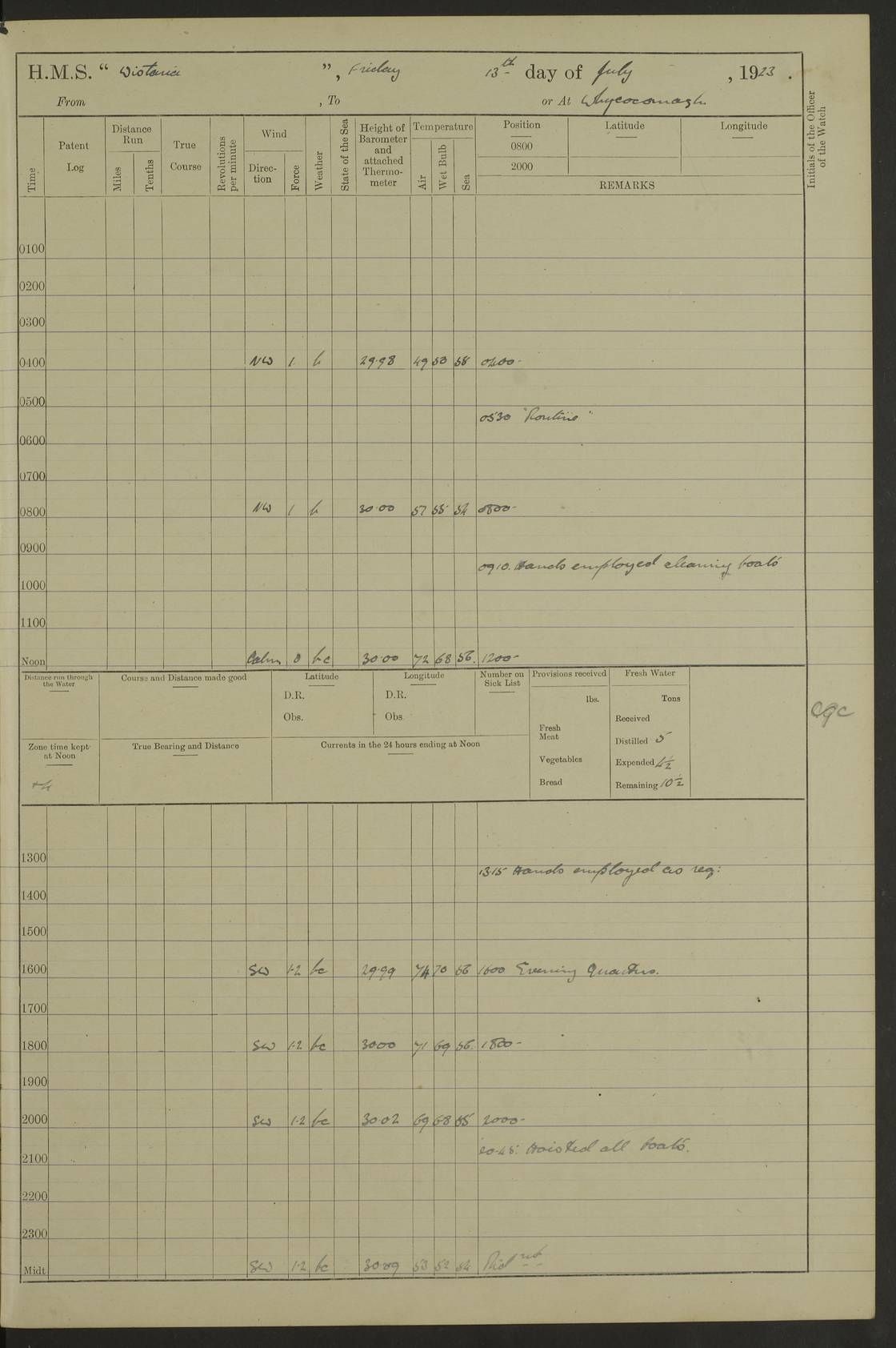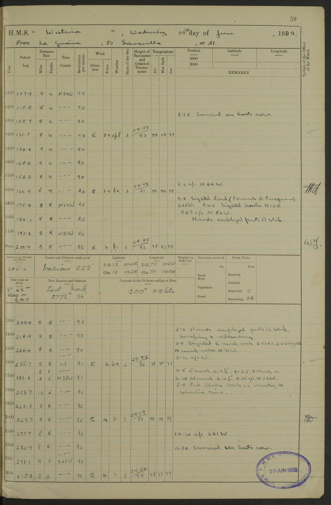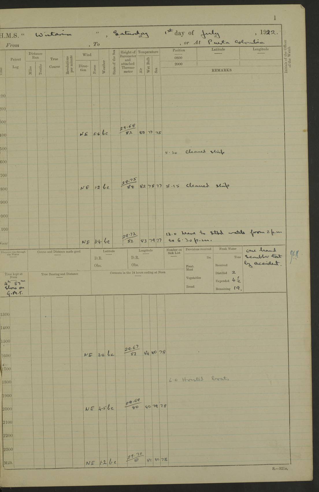 LOGS FOR JULY 1922 4f73cadaa2fc8ea903000bf3: (https://s3.amazonaws.com:443/oldweather/ADM53-93268/0003_1.jpg) 1 July 1922 At Puerto Colombia Lat 10.98, Long -74.95 8.15am: Cleaned ship am: One hand scrubber lost by accident 6.0pm: Hoisted boats 4f73cadba2fc8ea903000bf4: (https://s3.amazonaws.com:443/oldweather/ADM53-93268/0004_0.jpg) 2 July 1922 At Puerto Colombia Lat 10.98, Long -74.95 9.30am: Divisions am: One bucket & scrubber lost by accident 4f73cadba2fc8ea903000bf5: (https://s3.amazonaws.com:443/oldweather/ADM53-93268/0004_1.jpg) 3 July 1922 At Puerto Colombia Lat 10.98, Long -74.95 9.30am: Divisions pm: Hands employed painting ship’s side & parts of ship 6.30pm: Hoisted boats 4f73cadba2fc8ea903000bf6: (https://s3.amazonaws.com:443/oldweather/ADM53-93268/0005_0.jpg) 4 July 1922 At Puerto Colombia Lat 10.98, Long -74.95 8.15am: Hands employed making boats gripes, parts of ship & fumigating PO’s mess deck 2.0pm: Hands employed parts of ship 6.35pm: Hoisted boats 4f73cadca2fc8ea903000bf7: (https://s3.amazonaws.com:443/oldweather/ADM53-93268/0005_1.jpg) 5 July 1922 At Puerto Colombia Lat 10.98, Long -74.95 8.15am: Hands employed refitting motor boat falls and parts on ship 9.0pm: Hoisted boats 4f73cadca2fc8ea903000bf8: (https://s3.amazonaws.com:443/oldweather/ADM53-93268/0006_0.jpg) 6 July 1922 From Puerto Colombia to Colon Lat 10.9, Long -75.86 5.53am: Weighed and proceeded, 96 revs 6.06am: Bellilo Lt Ho bore N 6.15am: N80W, Belillo Lt Ho bore N40E 8.54am: Streamed patent log 8.50am: Sounding at 200 fath wire am: Hands employed painting motor boat, cleaning out store rooms & parts of ship True Bearing and Distance: Pt Manzanillo Lt 251°, 230 miles 4f73cadda2fc8ea903000bf9: (https://s3.amazonaws.com:443/oldweather/ADM53-93268/0006_1.jpg) 7 July 1922 From Puerto Colombia to Colon Lat 10.05, Long -79.31 6.30am: Hands employed scrubbing gun covers & upper deck 9.45am: Exercised action stations 10.55am: Sighted land on Port beam Lost overboard by accident while at general quarters: Projectile, dummy, Q.F. 4” MK IV gun 2.04pm: Sighted land ahead 3.36pm: Manzanillo Lt Ho abeam 2.5 miles 4.05pm: Farallon Sucio abeam, 1 mile. Altered course S62W 4.20pm: Altered course S42W. Islotes de Duarte abeam, 1 mile 6.26pm: Course as required for entering harbour 6.36pm: E Breakwater Lt Ho abeam 6.39pm: Stopped to pick up pilot 6.50pm: Proceeded 7.07pm: Anchored in 29 ft Anchor Bearings: E Christobal Wharf, right tangent, N53E; left tangent, Mid Christobal Wharf N35E; left tangent, W Christobal Wharf N9E True Bearing and Distance: Pt Manzanillo 210°, 28 miles 4f73cadda2fc8ea903000bfa: (https://s3.amazonaws.com:443/oldweather/ADM53-93268/0007_0.jpg) 8 July 1922 At Colon Lat 9.33, Long -79.9 8.0am: Saluted U.S.A. flag with 21 gun salute 8.45am: Secured alongside jetty 1.25pm: Lieut Arliss discharged to hospital 4f73cadda2fc8ea903000bfb: (https://s3.amazonaws.com:443/oldweather/ADM53-93268/0007_1.jpg) 9 July 1922 At Colon Lat 9.33, Long -79.9 6.0am: Cleaned ship. Party of 40 men landed to visit Panama Canal 9.45am: Divisions & Prayers 4f73cadea2fc8ea903000bfc: (https://s3.amazonaws.com:443/oldweather/ADM53-93268/0008_0.jpg) 10 July 1922 At Colon Lat 9.33, Long -79.9 8.15am: Hands employed refitting boats falls & touching up ship’s side One tarpaulin lost by accident (8x8) 4f73cadea2fc8ea903000bfd: (https://s3.amazonaws.com:443/oldweather/ADM53-93268/0008_1.jpg) 11 July 1922 At Colon Lat 9.33, Long -79.9 8.15am: Hands employed refitting boats falls & parts of ship 4f73cadfa2fc8ea903000bfe: (https://s3.amazonaws.com:443/oldweather/ADM53-93268/0009_0.jpg) 12 July 1922 At Colon Lat 9.33, Long -79.9 5.30am: Prepared ship for coaling 6.30am: Left No 6 pier & proceeded alongside coaling wharf 7.10am: Secured alongside coaling wharf 7.30am: Commenced coaling 8.30am: Coal ship 11.15am: Left coaling wharf & proceeded 11.50am: E Breakwater Lt Ho abeam. Course N10E. Streamed patent log 4f73cadfa2fc8ea903000bff: (https://s3.amazonaws.com:443/oldweather/ADM53-93268/0009_1.jpg) 13 July 1922 From Colon to Kingston Lat 11.95, Long -78.88 2.10am: Furled boat deck awning 9.30am: Divisions. Hands employed overhauling boats sailing gear & oiling after 2½” wire hawser 3.47pm: Slow ahead. Unshipped forecastle awning stanchions 3.53pm: Half ahead, 96 revs True Bearing and Distance: Plum Pt Lt Ho 018°½, 384 miles 4f73cadfa2fc8ea903000c00: (https://s3.amazonaws.com:443/oldweather/ADM53-93268/0010_0.jpg) 14 July 1922 From Colon to Kingston Lat 14.76, Long -77.96 9.30am: Exercised control, remainder of hands employed parts of ship 2.0pm: Hands employed scrubbing boats sails & oiling guard rails 4.0pm: Evening Quarters. Exercised collision stations 5.15pm: Exercised sounding party True Bearing and Distance: Plum Pt Lt Ho 018°, 202 miles 4f73cae0a2fc8ea903000c01: (https://s3.amazonaws.com:443/oldweather/ADM53-93268/0010_1.jpg) 15 July 1922 From Colon to Kingston Lat 17.78, Long -76.83 9.50am: Sighted land ahead. Hands employed cleaning ship 1.0pm: Stopped 1.03pm: Half ahead. Altered course N6E and as required for entering harbour 1.30pm: Anchored off Port Royal 2.0pm: Weighed & proceeded 3.15pm: Secured alongside Royal Mail jetty True Bearing and Distance: Port Royal Pt 350°, 12 miles 4f73cae0a2fc8ea903000c02: (https://s3.amazonaws.com:443/oldweather/ADM53-93268/0011_0.jpg) 16 July 1922 At Kingston Lat 17.95, Long -76.76 6.0am: Cleaned ship 9.45am: Divisions 4f73cae0a2fc8ea903000c03: (https://s3.amazonaws.com:443/oldweather/ADM53-93268/0011_1.jpg) 17 July 1922 At Kingston Lat 17.95, Long -76.76 5.30am: Hands employed furling quarter deck awning & rigging sheer legs 9.15am: Hands employed refitting fender & washing ship's side 2.0pm: Hands employed cleaning ship's side 4f73cae1a2fc8ea903000c04: (https://s3.amazonaws.com:443/oldweather/ADM53-93268/0012_0.jpg) 18 July 1922 At Kingston Lat 17.95, Long -76.76 5.30am: Hands employed cleaning ship. Divers at work about rudders 8.15am: Hands employed washing down aloft & replac