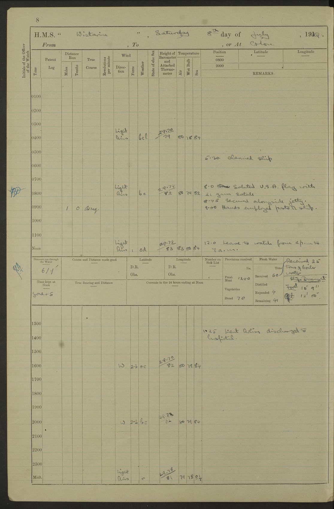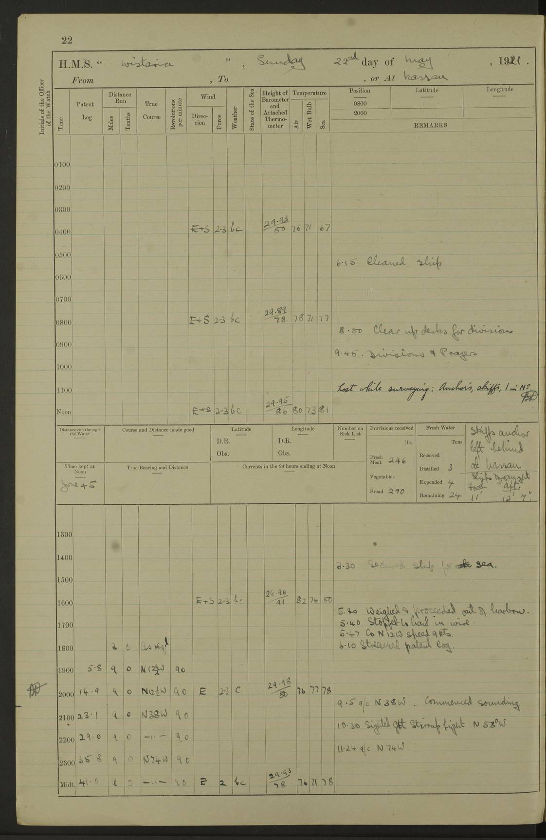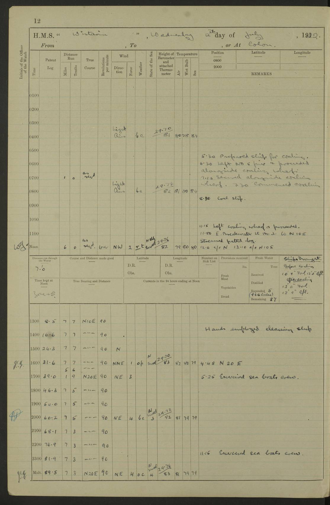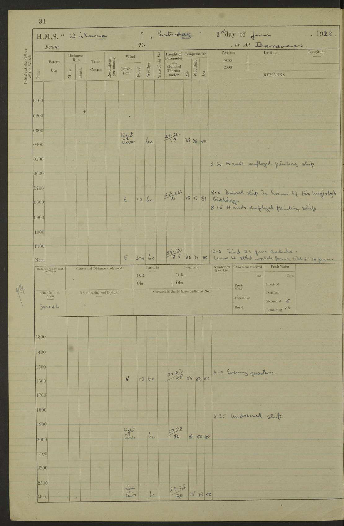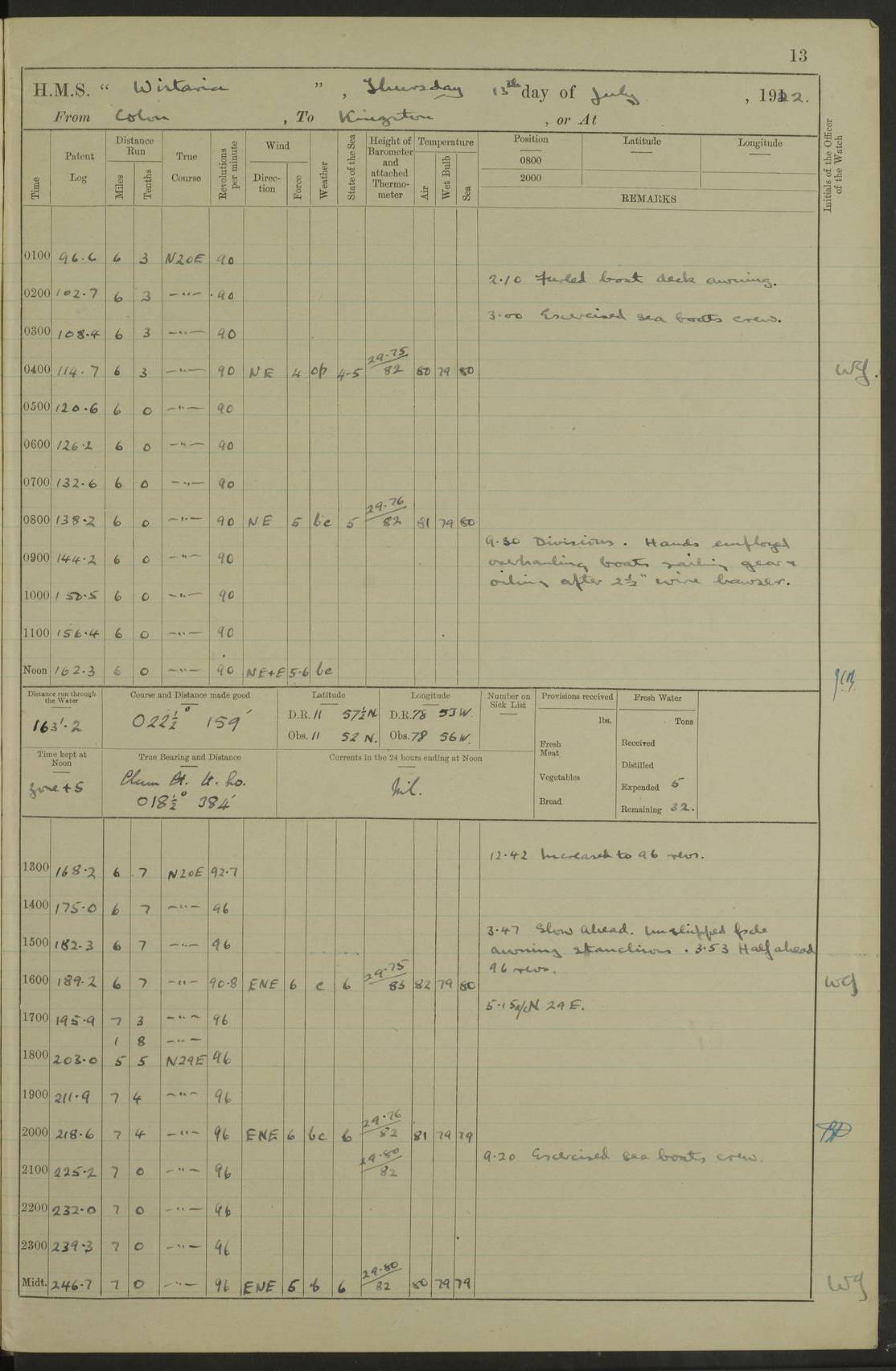 LOGS FOR JULY 1922 4f73cadaa2fc8ea903000bf3: (https://s3.amazonaws.com:443/oldweather/ADM53-93268/0003_1.jpg) 1 July 1922 At Puerto Colombia Lat 10.98, Long -74.95 8.15am: Cleaned ship am: One hand scrubber lost by accident 6.0pm: Hoisted boats 4f73cadba2fc8ea903000bf4: (https://s3.amazonaws.com:443/oldweather/ADM53-93268/0004_0.jpg) 2 July 1922 At Puerto Colombia Lat 10.98, Long -74.95 9.30am: Divisions am: One bucket & scrubber lost by accident 4f73cadba2fc8ea903000bf5: (https://s3.amazonaws.com:443/oldweather/ADM53-93268/0004_1.jpg) 3 July 1922 At Puerto Colombia Lat 10.98, Long -74.95 9.30am: Divisions pm: Hands employed painting ship’s side & parts of ship 6.30pm: Hoisted boats 4f73cadba2fc8ea903000bf6: (https://s3.amazonaws.com:443/oldweather/ADM53-93268/0005_0.jpg) 4 July 1922 At Puerto Colombia Lat 10.98, Long -74.95 8.15am: Hands employed making boats gripes, parts of ship & fumigating PO’s mess deck 2.0pm: Hands employed parts of ship 6.35pm: Hoisted boats 4f73cadca2fc8ea903000bf7: (https://s3.amazonaws.com:443/oldweather/ADM53-93268/0005_1.jpg) 5 July 1922 At Puerto Colombia Lat 10.98, Long -74.95 8.15am: Hands employed refitting motor boat falls and parts on ship 9.0pm: Hoisted boats 4f73cadca2fc8ea903000bf8: (https://s3.amazonaws.com:443/oldweather/ADM53-93268/0006_0.jpg) 6 July 1922 From Puerto Colombia to Colon Lat 10.9, Long -75.86 5.53am: Weighed and proceeded, 96 revs 6.06am: Bellilo Lt Ho bore N 6.15am: N80W, Belillo Lt Ho bore N40E 8.54am: Streamed patent log 8.50am: Sounding at 200 fath wire am: Hands employed painting motor boat, cleaning out store rooms & parts of ship True Bearing and Distance: Pt Manzanillo Lt 251°, 230 miles 4f73cadda2fc8ea903000bf9: (https://s3.amazonaws.com:443/oldweather/ADM53-93268/0006_1.jpg) 7 July 1922 From Puerto Colombia to Colon Lat 10.05, Long -79.31 6.30am: Hands employed scrubbing gun covers & upper deck 9.45am: Exercised action stations 10.55am: Sighted land on Port beam Lost overboard by accident while at general quarters: Projectile, dummy, Q.F. 4” MK IV gun 2.04pm: Sighted land ahead 3.36pm: Manzanillo Lt Ho abeam 2.5 miles 4.05pm: Farallon Sucio abeam, 1 mile. Altered course S62W 4.20pm: Altered course S42W. Islotes de Duarte abeam, 1 mile 6.26pm: Course as required for entering harbour 6.36pm: E Breakwater Lt Ho abeam 6.39pm: Stopped to pick up pilot 6.50pm: Proceeded 7.07pm: Anchored in 29 ft Anchor Bearings: E Christobal Wharf, right tangent, N53E; left tangent, Mid Christobal Wharf N35E; left tangent, W Christobal Wharf N9E True Bearing and Distance: Pt Manzanillo 210°, 28 miles 4f73cadda2fc8ea903000bfa: (https://s3.amazonaws.com:443/oldweather/ADM53-93268/0007_0.jpg) 8 July 1922 At Colon Lat 9.33, Long -79.9 8.0am: Saluted U.S.A. flag with 21 gun salute 8.45am: Secured alongside jetty 1.25pm: Lieut Arliss discharged to hospital 4f73cadda2fc8ea903000bfb: (https://s3.amazonaws.com:443/oldweather/ADM53-93268/0007_1.jpg) 9 July 1922 At Colon Lat 9.33, Long -79.9 6.0am: Cleaned ship. Party of 40 men landed to visit Panama Canal 9.45am: Divisions & Prayers 4f73cadea2fc8ea903000bfc: (https://s3.amazonaws.com:443/oldweather/ADM53-93268/0008_0.jpg) 10 July 1922 At Colon Lat 9.33, Long -79.9 8.15am: Hands employed refitting boats falls & touching up ship’s side One tarpaulin lost by accident (8x8) 4f73cadea2fc8ea903000bfd: (https://s3.amazonaws.com:443/oldweather/ADM53-93268/0008_1.jpg) 11 July 1922 At Colon Lat 9.33, Long -79.9 8.15am: Hands employed refitting boats falls & parts of ship 4f73cadfa2fc8ea903000bfe: (https://s3.amazonaws.com:443/oldweather/ADM53-93268/0009_0.jpg) 12 July 1922 At Colon Lat 9.33, Long -79.9 5.30am: Prepared ship for coaling 6.30am: Left No 6 pier & proceeded alongside coaling wharf 7.10am: Secured alongside coaling wharf 7.30am: Commenced coaling 8.30am: Coal ship 11.15am: Left coaling wharf & proceeded 11.50am: E Breakwater Lt Ho abeam. Course N10E. Streamed patent log 4f73cadfa2fc8ea903000bff: (https://s3.amazonaws.com:443/oldweather/ADM53-93268/0009_1.jpg) 13 July 1922 From Colon to Kingston Lat 11.95, Long -78.88 2.10am: Furled boat deck awning 9.30am: Divisions. Hands employed overhauling boats sailing gear & oiling after 2½” wire hawser 3.47pm: Slow ahead. Unshipped forecastle awning stanchions 3.53pm: Half ahead, 96 revs True Bearing and Distance: Plum Pt Lt Ho 018°½, 384 miles 4f73cadfa2fc8ea903000c00: (https://s3.amazonaws.com:443/oldweather/ADM53-93268/0010_0.jpg) 14 July 1922 From Colon to Kingston Lat 14.76, Long -77.96 9.30am: Exercised control, remainder of hands employed parts of ship 2.0pm: Hands employed scrubbing boats sails & oiling guard rails 4.0pm: Evening Quarters. Exercised collision stations 5.15pm: Exercised sounding party True Bearing and Distance: Plum Pt Lt Ho 018°, 202 miles 4f73cae0a2fc8ea903000c01: (https://s3.amazonaws.com:443/oldweather/ADM53-93268/0010_1.jpg) 15 July 1922 From Colon to Kingston Lat 17.78, Long -76.83 9.50am: Sighted land ahead. Hands employed cleaning ship 1.0pm: Stopped 1.03pm: Half ahead. Altered course N6E and as required for entering harbour 1.30pm: Anchored off Port Royal 2.0pm: Weighed & proceeded 3.15pm: Secured alongside Royal Mail jetty True Bearing and Distance: Port Royal Pt 350°, 12 miles 4f73cae0a2fc8ea903000c02: (https://s3.amazonaws.com:443/oldweather/ADM53-93268/0011_0.jpg) 16 July 1922 At Kingston Lat 17.95, Long -76.76 6.0am: Cleaned ship 9.45am: Divisions 4f73cae0a2fc8ea903000c03: (https://s3.amazonaws.com:443/oldweather/ADM53-93268/0011_1.jpg) 17 July 1922 At Kingston Lat 17.95, Long -76.76 5.30am: Hands employed furling quarter deck awning & rigging sheer legs 9.15am: Hands employed refitting fender & washing ship's side 2.0pm: Hands employed cleaning ship's side 4f73cae1a2fc8ea903000c04: (https://s3.amazonaws.com:443/oldweather/ADM53-93268/0012_0.jpg) 18 July 1922 At Kingston Lat 17.95, Long -76.76 5.30am: Hands employed cleaning ship. Divers at work about rudders 8.15am: Hands employed washing down aloft & replac