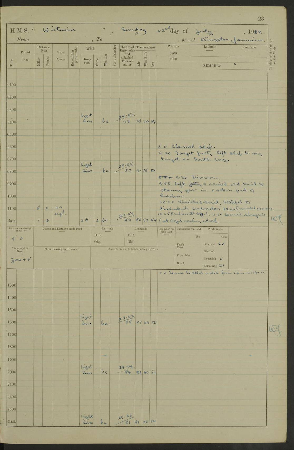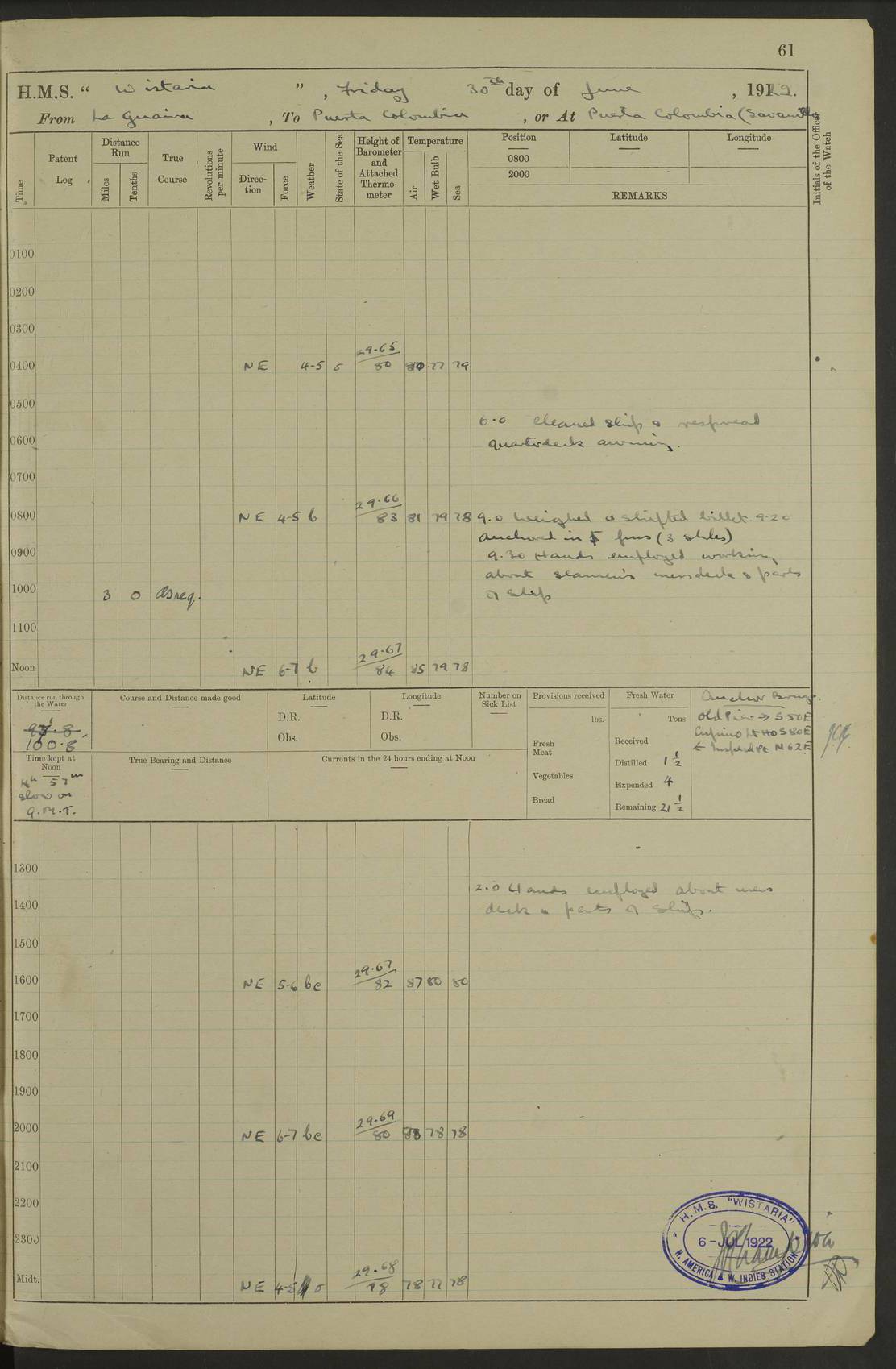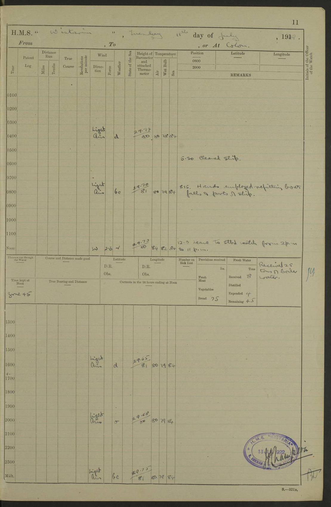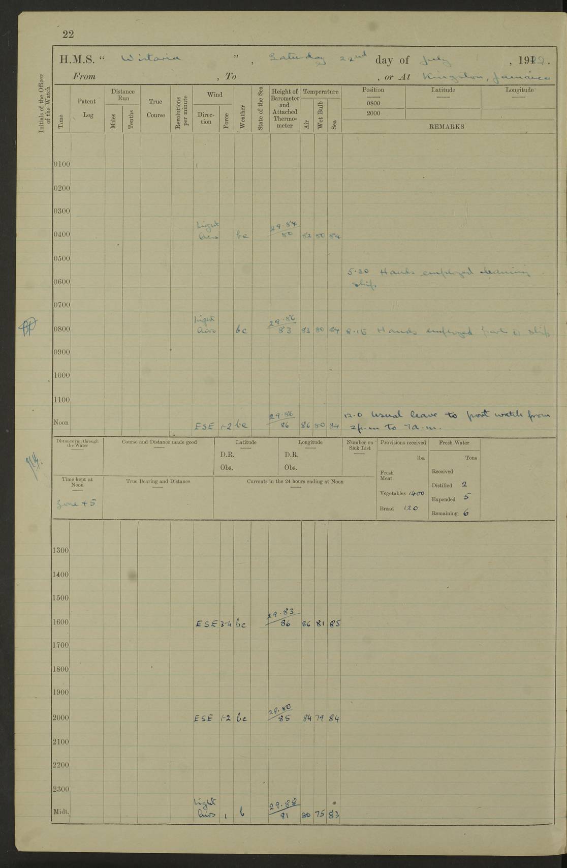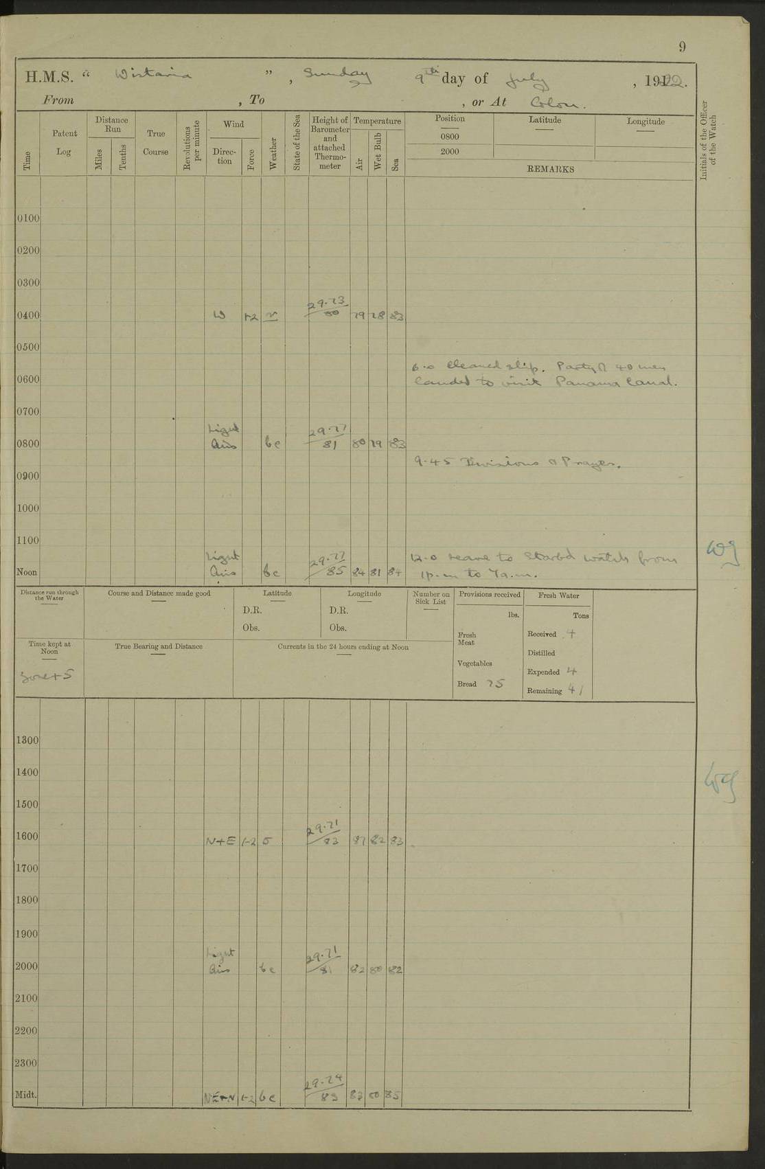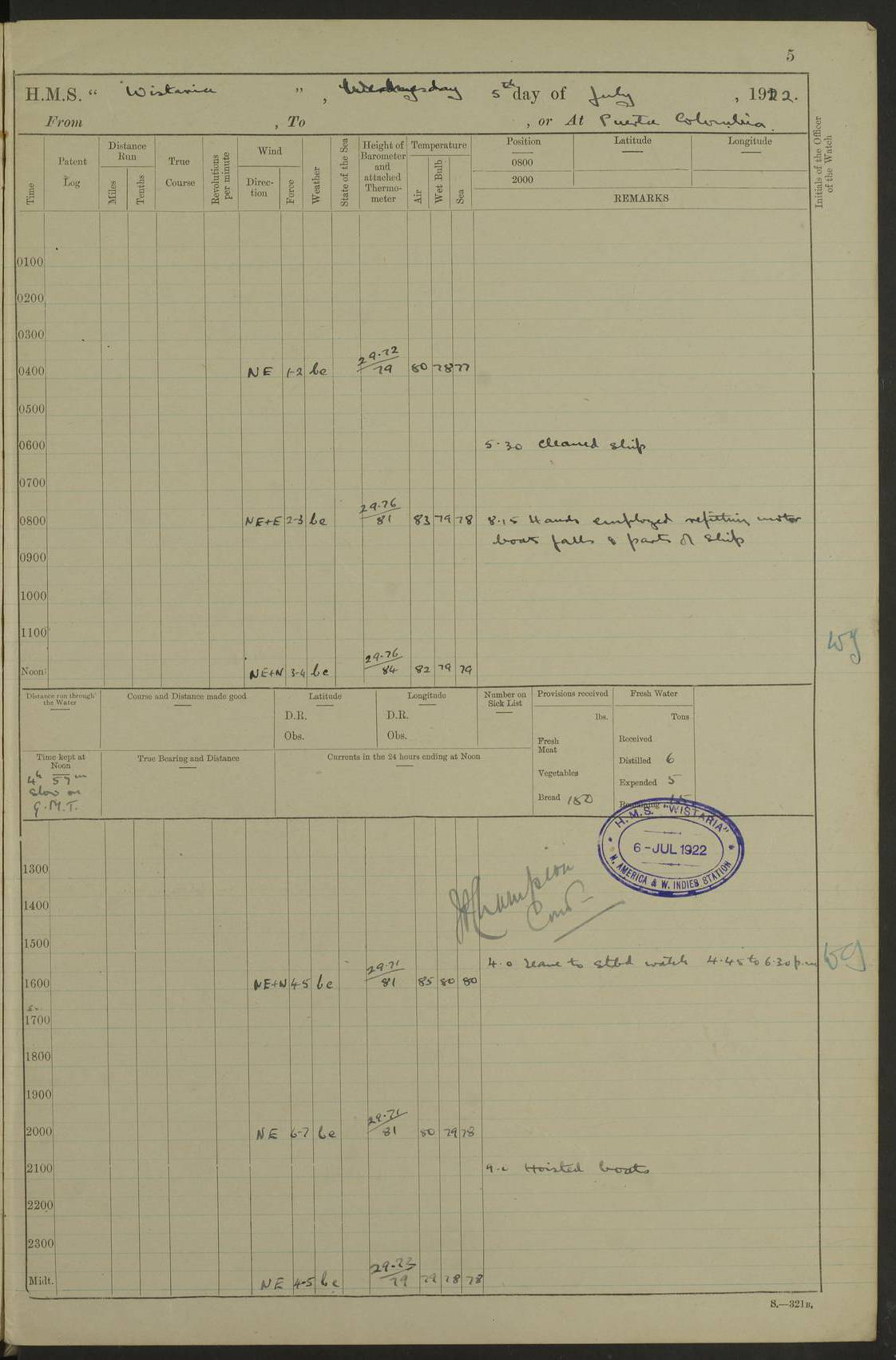 LOGS FOR JULY 1922 4f73cadaa2fc8ea903000bf3: (https://s3.amazonaws.com:443/oldweather/ADM53-93268/0003_1.jpg) 1 July 1922 At Puerto Colombia Lat 10.98, Long -74.95 8.15am: Cleaned ship am: One hand scrubber lost by accident 6.0pm: Hoisted boats 4f73cadba2fc8ea903000bf4: (https://s3.amazonaws.com:443/oldweather/ADM53-93268/0004_0.jpg) 2 July 1922 At Puerto Colombia Lat 10.98, Long -74.95 9.30am: Divisions am: One bucket & scrubber lost by accident 4f73cadba2fc8ea903000bf5: (https://s3.amazonaws.com:443/oldweather/ADM53-93268/0004_1.jpg) 3 July 1922 At Puerto Colombia Lat 10.98, Long -74.95 9.30am: Divisions pm: Hands employed painting ship’s side & parts of ship 6.30pm: Hoisted boats 4f73cadba2fc8ea903000bf6: (https://s3.amazonaws.com:443/oldweather/ADM53-93268/0005_0.jpg) 4 July 1922 At Puerto Colombia Lat 10.98, Long -74.95 8.15am: Hands employed making boats gripes, parts of ship & fumigating PO’s mess deck 2.0pm: Hands employed parts of ship 6.35pm: Hoisted boats 4f73cadca2fc8ea903000bf7: (https://s3.amazonaws.com:443/oldweather/ADM53-93268/0005_1.jpg) 5 July 1922 At Puerto Colombia Lat 10.98, Long -74.95 8.15am: Hands employed refitting motor boat falls and parts on ship 9.0pm: Hoisted boats 4f73cadca2fc8ea903000bf8: (https://s3.amazonaws.com:443/oldweather/ADM53-93268/0006_0.jpg) 6 July 1922 From Puerto Colombia to Colon Lat 10.9, Long -75.86 5.53am: Weighed and proceeded, 96 revs 6.06am: Bellilo Lt Ho bore N 6.15am: N80W, Belillo Lt Ho bore N40E 8.54am: Streamed patent log 8.50am: Sounding at 200 fath wire am: Hands employed painting motor boat, cleaning out store rooms & parts of ship True Bearing and Distance: Pt Manzanillo Lt 251°, 230 miles 4f73cadda2fc8ea903000bf9: (https://s3.amazonaws.com:443/oldweather/ADM53-93268/0006_1.jpg) 7 July 1922 From Puerto Colombia to Colon Lat 10.05, Long -79.31 6.30am: Hands employed scrubbing gun covers & upper deck 9.45am: Exercised action stations 10.55am: Sighted land on Port beam Lost overboard by accident while at general quarters: Projectile, dummy, Q.F. 4” MK IV gun 2.04pm: Sighted land ahead 3.36pm: Manzanillo Lt Ho abeam 2.5 miles 4.05pm: Farallon Sucio abeam, 1 mile. Altered course S62W 4.20pm: Altered course S42W. Islotes de Duarte abeam, 1 mile 6.26pm: Course as required for entering harbour 6.36pm: E Breakwater Lt Ho abeam 6.39pm: Stopped to pick up pilot 6.50pm: Proceeded 7.07pm: Anchored in 29 ft Anchor Bearings: E Christobal Wharf, right tangent, N53E; left tangent, Mid Christobal Wharf N35E; left tangent, W Christobal Wharf N9E True Bearing and Distance: Pt Manzanillo 210°, 28 miles 4f73cadda2fc8ea903000bfa: (https://s3.amazonaws.com:443/oldweather/ADM53-93268/0007_0.jpg) 8 July 1922 At Colon Lat 9.33, Long -79.9 8.0am: Saluted U.S.A. flag with 21 gun salute 8.45am: Secured alongside jetty 1.25pm: Lieut Arliss discharged to hospital 4f73cadda2fc8ea903000bfb: (https://s3.amazonaws.com:443/oldweather/ADM53-93268/0007_1.jpg) 9 July 1922 At Colon Lat 9.33, Long -79.9 6.0am: Cleaned ship. Party of 40 men landed to visit Panama Canal 9.45am: Divisions & Prayers 4f73cadea2fc8ea903000bfc: (https://s3.amazonaws.com:443/oldweather/ADM53-93268/0008_0.jpg) 10 July 1922 At Colon Lat 9.33, Long -79.9 8.15am: Hands employed refitting boats falls & touching up ship’s side One tarpaulin lost by accident (8x8) 4f73cadea2fc8ea903000bfd: (https://s3.amazonaws.com:443/oldweather/ADM53-93268/0008_1.jpg) 11 July 1922 At Colon Lat 9.33, Long -79.9 8.15am: Hands employed refitting boats falls & parts of ship 4f73cadfa2fc8ea903000bfe: (https://s3.amazonaws.com:443/oldweather/ADM53-93268/0009_0.jpg) 12 July 1922 At Colon Lat 9.33, Long -79.9 5.30am: Prepared ship for coaling 6.30am: Left No 6 pier & proceeded alongside coaling wharf 7.10am: Secured alongside coaling wharf 7.30am: Commenced coaling 8.30am: Coal ship 11.15am: Left coaling wharf & proceeded 11.50am: E Breakwater Lt Ho abeam. Course N10E. Streamed patent log 4f73cadfa2fc8ea903000bff: (https://s3.amazonaws.com:443/oldweather/ADM53-93268/0009_1.jpg) 13 July 1922 From Colon to Kingston Lat 11.95, Long -78.88 2.10am: Furled boat deck awning 9.30am: Divisions. Hands employed overhauling boats sailing gear & oiling after 2½” wire hawser 3.47pm: Slow ahead. Unshipped forecastle awning stanchions 3.53pm: Half ahead, 96 revs True Bearing and Distance: Plum Pt Lt Ho 018°½, 384 miles 4f73cadfa2fc8ea903000c00: (https://s3.amazonaws.com:443/oldweather/ADM53-93268/0010_0.jpg) 14 July 1922 From Colon to Kingston Lat 14.76, Long -77.96 9.30am: Exercised control, remainder of hands employed parts of ship 2.0pm: Hands employed scrubbing boats sails & oiling guard rails 4.0pm: Evening Quarters. Exercised collision stations 5.15pm: Exercised sounding party True Bearing and Distance: Plum Pt Lt Ho 018°, 202 miles 4f73cae0a2fc8ea903000c01: (https://s3.amazonaws.com:443/oldweather/ADM53-93268/0010_1.jpg) 15 July 1922 From Colon to Kingston Lat 17.78, Long -76.83 9.50am: Sighted land ahead. Hands employed cleaning ship 1.0pm: Stopped 1.03pm: Half ahead. Altered course N6E and as required for entering harbour 1.30pm: Anchored off Port Royal 2.0pm: Weighed & proceeded 3.15pm: Secured alongside Royal Mail jetty True Bearing and Distance: Port Royal Pt 350°, 12 miles 4f73cae0a2fc8ea903000c02: (https://s3.amazonaws.com:443/oldweather/ADM53-93268/0011_0.jpg) 16 July 1922 At Kingston Lat 17.95, Long -76.76 6.0am: Cleaned ship 9.45am: Divisions 4f73cae0a2fc8ea903000c03: (https://s3.amazonaws.com:443/oldweather/ADM53-93268/0011_1.jpg) 17 July 1922 At Kingston Lat 17.95, Long -76.76 5.30am: Hands employed furling quarter deck awning & rigging sheer legs 9.15am: Hands employed refitting fender & washing ship's side 2.0pm: Hands employed cleaning ship's side 4f73cae1a2fc8ea903000c04: (https://s3.amazonaws.com:443/oldweather/ADM53-93268/0012_0.jpg) 18 July 1922 At Kingston Lat 17.95, Long -76.76 5.30am: Hands employed cleaning ship. Divers at work about rudders 8.15am: Hands employed washing down aloft & replac