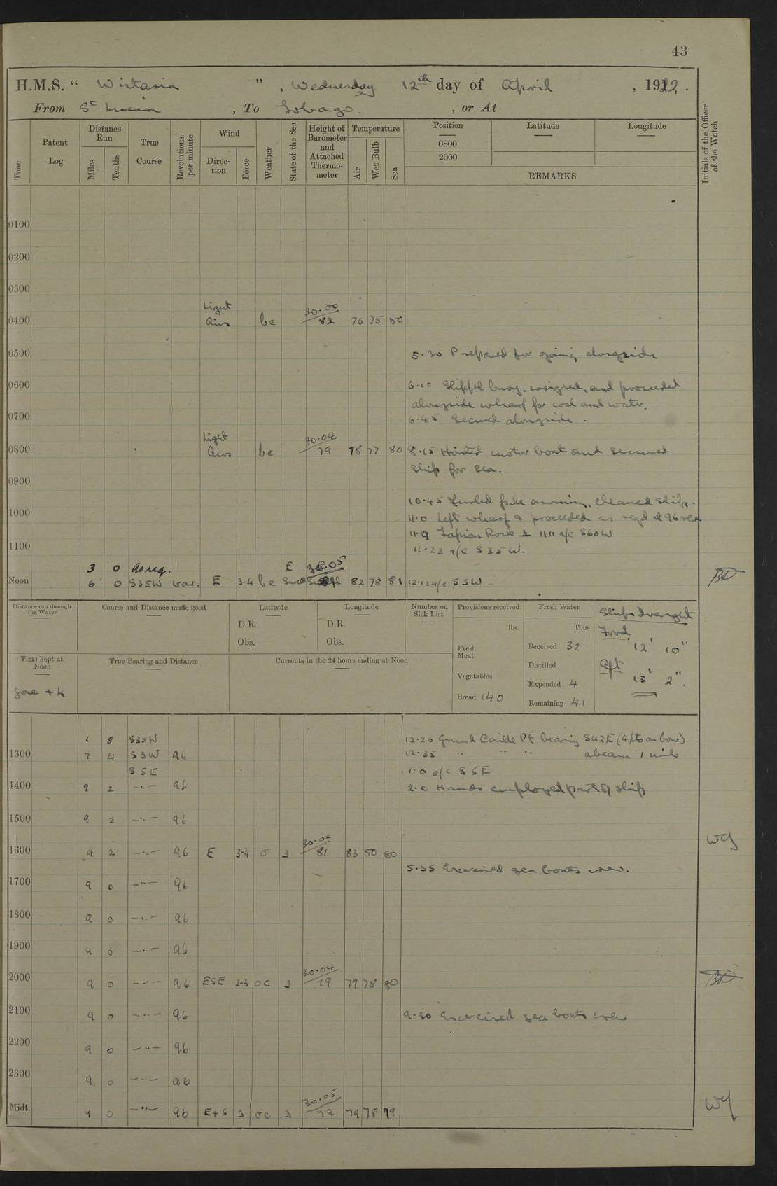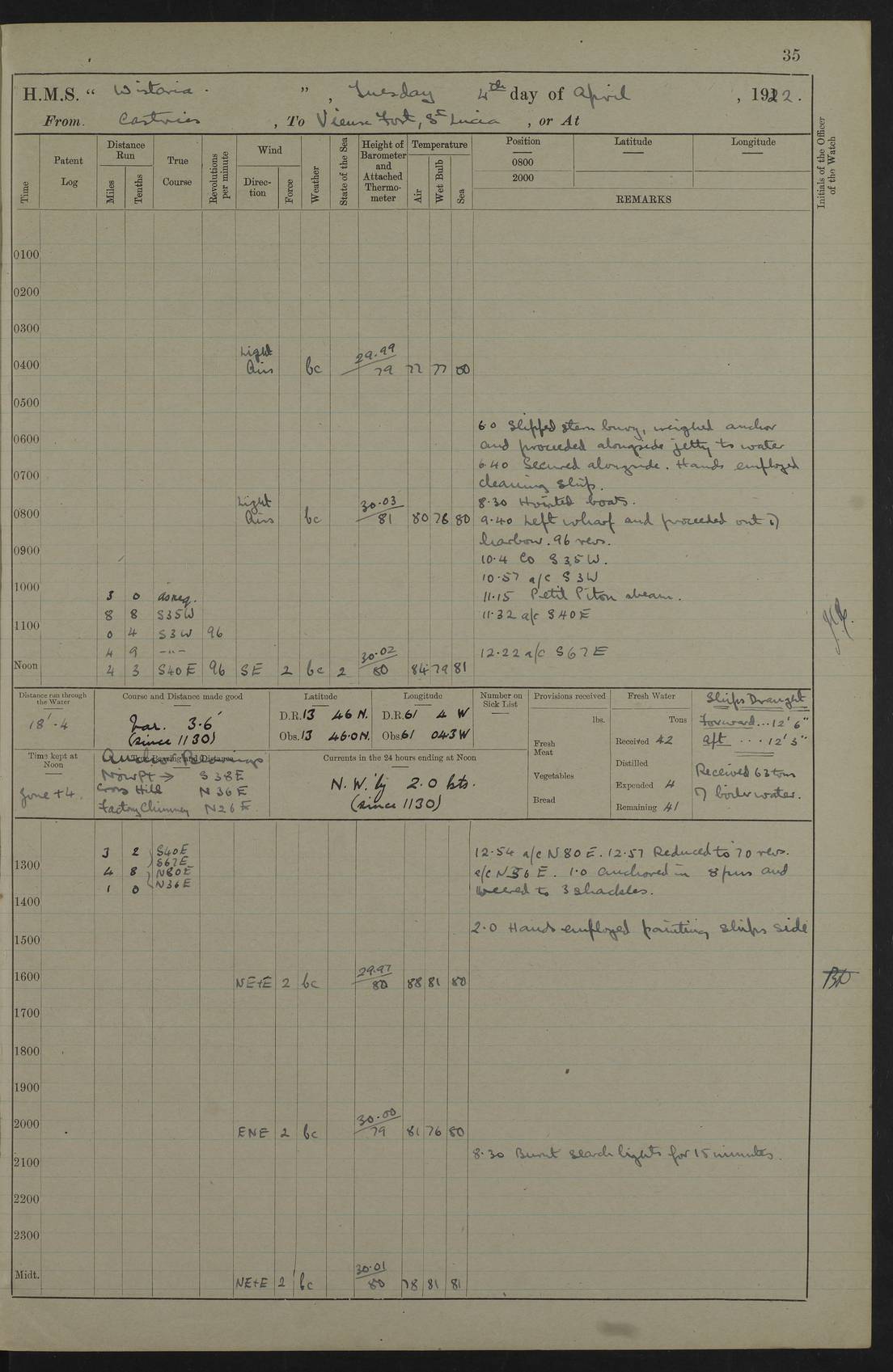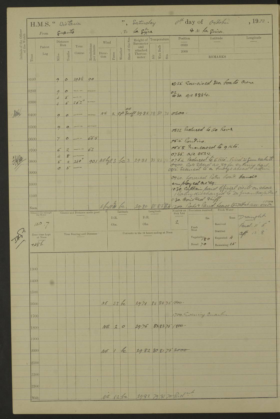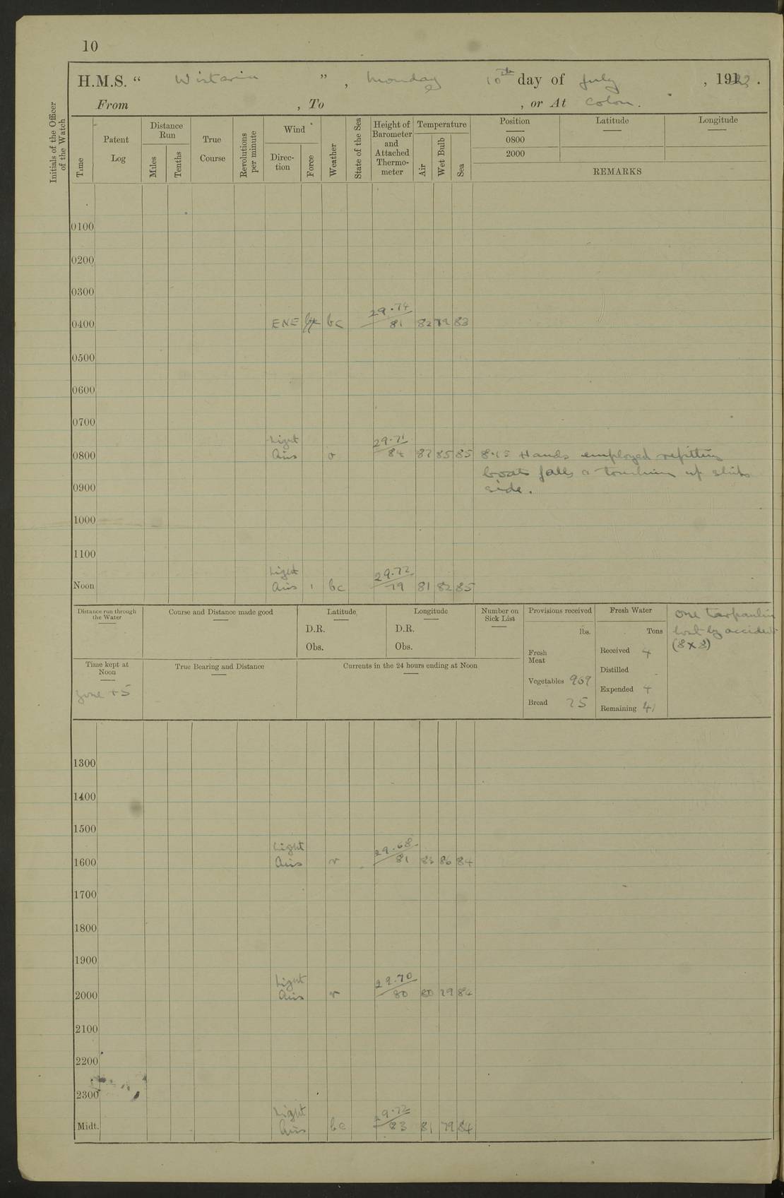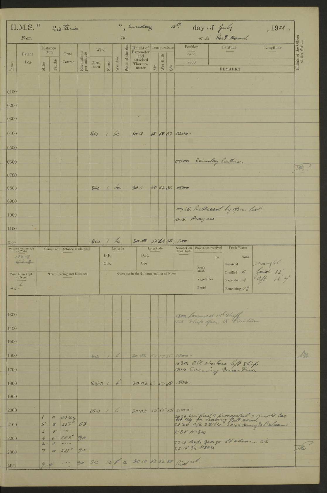 LOGS FOR JULY 1922 4f73cadaa2fc8ea903000bf3: (https://s3.amazonaws.com:443/oldweather/ADM53-93268/0003_1.jpg) 1 July 1922 At Puerto Colombia Lat 10.98, Long -74.95 8.15am: Cleaned ship am: One hand scrubber lost by accident 6.0pm: Hoisted boats 4f73cadba2fc8ea903000bf4: (https://s3.amazonaws.com:443/oldweather/ADM53-93268/0004_0.jpg) 2 July 1922 At Puerto Colombia Lat 10.98, Long -74.95 9.30am: Divisions am: One bucket & scrubber lost by accident 4f73cadba2fc8ea903000bf5: (https://s3.amazonaws.com:443/oldweather/ADM53-93268/0004_1.jpg) 3 July 1922 At Puerto Colombia Lat 10.98, Long -74.95 9.30am: Divisions pm: Hands employed painting ship’s side & parts of ship 6.30pm: Hoisted boats 4f73cadba2fc8ea903000bf6: (https://s3.amazonaws.com:443/oldweather/ADM53-93268/0005_0.jpg) 4 July 1922 At Puerto Colombia Lat 10.98, Long -74.95 8.15am: Hands employed making boats gripes, parts of ship & fumigating PO’s mess deck 2.0pm: Hands employed parts of ship 6.35pm: Hoisted boats 4f73cadca2fc8ea903000bf7: (https://s3.amazonaws.com:443/oldweather/ADM53-93268/0005_1.jpg) 5 July 1922 At Puerto Colombia Lat 10.98, Long -74.95 8.15am: Hands employed refitting motor boat falls and parts on ship 9.0pm: Hoisted boats 4f73cadca2fc8ea903000bf8: (https://s3.amazonaws.com:443/oldweather/ADM53-93268/0006_0.jpg) 6 July 1922 From Puerto Colombia to Colon Lat 10.9, Long -75.86 5.53am: Weighed and proceeded, 96 revs 6.06am: Bellilo Lt Ho bore N 6.15am: N80W, Belillo Lt Ho bore N40E 8.54am: Streamed patent log 8.50am: Sounding at 200 fath wire am: Hands employed painting motor boat, cleaning out store rooms & parts of ship True Bearing and Distance: Pt Manzanillo Lt 251°, 230 miles 4f73cadda2fc8ea903000bf9: (https://s3.amazonaws.com:443/oldweather/ADM53-93268/0006_1.jpg) 7 July 1922 From Puerto Colombia to Colon Lat 10.05, Long -79.31 6.30am: Hands employed scrubbing gun covers & upper deck 9.45am: Exercised action stations 10.55am: Sighted land on Port beam Lost overboard by accident while at general quarters: Projectile, dummy, Q.F. 4” MK IV gun 2.04pm: Sighted land ahead 3.36pm: Manzanillo Lt Ho abeam 2.5 miles 4.05pm: Farallon Sucio abeam, 1 mile. Altered course S62W 4.20pm: Altered course S42W. Islotes de Duarte abeam, 1 mile 6.26pm: Course as required for entering harbour 6.36pm: E Breakwater Lt Ho abeam 6.39pm: Stopped to pick up pilot 6.50pm: Proceeded 7.07pm: Anchored in 29 ft Anchor Bearings: E Christobal Wharf, right tangent, N53E; left tangent, Mid Christobal Wharf N35E; left tangent, W Christobal Wharf N9E True Bearing and Distance: Pt Manzanillo 210°, 28 miles 4f73cadda2fc8ea903000bfa: (https://s3.amazonaws.com:443/oldweather/ADM53-93268/0007_0.jpg) 8 July 1922 At Colon Lat 9.33, Long -79.9 8.0am: Saluted U.S.A. flag with 21 gun salute 8.45am: Secured alongside jetty 1.25pm: Lieut Arliss discharged to hospital 4f73cadda2fc8ea903000bfb: (https://s3.amazonaws.com:443/oldweather/ADM53-93268/0007_1.jpg) 9 July 1922 At Colon Lat 9.33, Long -79.9 6.0am: Cleaned ship. Party of 40 men landed to visit Panama Canal 9.45am: Divisions & Prayers 4f73cadea2fc8ea903000bfc: (https://s3.amazonaws.com:443/oldweather/ADM53-93268/0008_0.jpg) 10 July 1922 At Colon Lat 9.33, Long -79.9 8.15am: Hands employed refitting boats falls & touching up ship’s side One tarpaulin lost by accident (8x8) 4f73cadea2fc8ea903000bfd: (https://s3.amazonaws.com:443/oldweather/ADM53-93268/0008_1.jpg) 11 July 1922 At Colon Lat 9.33, Long -79.9 8.15am: Hands employed refitting boats falls & parts of ship 4f73cadfa2fc8ea903000bfe: (https://s3.amazonaws.com:443/oldweather/ADM53-93268/0009_0.jpg) 12 July 1922 At Colon Lat 9.33, Long -79.9 5.30am: Prepared ship for coaling 6.30am: Left No 6 pier & proceeded alongside coaling wharf 7.10am: Secured alongside coaling wharf 7.30am: Commenced coaling 8.30am: Coal ship 11.15am: Left coaling wharf & proceeded 11.50am: E Breakwater Lt Ho abeam. Course N10E. Streamed patent log 4f73cadfa2fc8ea903000bff: (https://s3.amazonaws.com:443/oldweather/ADM53-93268/0009_1.jpg) 13 July 1922 From Colon to Kingston Lat 11.95, Long -78.88 2.10am: Furled boat deck awning 9.30am: Divisions. Hands employed overhauling boats sailing gear & oiling after 2½” wire hawser 3.47pm: Slow ahead. Unshipped forecastle awning stanchions 3.53pm: Half ahead, 96 revs True Bearing and Distance: Plum Pt Lt Ho 018°½, 384 miles 4f73cadfa2fc8ea903000c00: (https://s3.amazonaws.com:443/oldweather/ADM53-93268/0010_0.jpg) 14 July 1922 From Colon to Kingston Lat 14.76, Long -77.96 9.30am: Exercised control, remainder of hands employed parts of ship 2.0pm: Hands employed scrubbing boats sails & oiling guard rails 4.0pm: Evening Quarters. Exercised collision stations 5.15pm: Exercised sounding party True Bearing and Distance: Plum Pt Lt Ho 018°, 202 miles 4f73cae0a2fc8ea903000c01: (https://s3.amazonaws.com:443/oldweather/ADM53-93268/0010_1.jpg) 15 July 1922 From Colon to Kingston Lat 17.78, Long -76.83 9.50am: Sighted land ahead. Hands employed cleaning ship 1.0pm: Stopped 1.03pm: Half ahead. Altered course N6E and as required for entering harbour 1.30pm: Anchored off Port Royal 2.0pm: Weighed & proceeded 3.15pm: Secured alongside Royal Mail jetty True Bearing and Distance: Port Royal Pt 350°, 12 miles 4f73cae0a2fc8ea903000c02: (https://s3.amazonaws.com:443/oldweather/ADM53-93268/0011_0.jpg) 16 July 1922 At Kingston Lat 17.95, Long -76.76 6.0am: Cleaned ship 9.45am: Divisions 4f73cae0a2fc8ea903000c03: (https://s3.amazonaws.com:443/oldweather/ADM53-93268/0011_1.jpg) 17 July 1922 At Kingston Lat 17.95, Long -76.76 5.30am: Hands employed furling quarter deck awning & rigging sheer legs 9.15am: Hands employed refitting fender & washing ship's side 2.0pm: Hands employed cleaning ship's side 4f73cae1a2fc8ea903000c04: (https://s3.amazonaws.com:443/oldweather/ADM53-93268/0012_0.jpg) 18 July 1922 At Kingston Lat 17.95, Long -76.76 5.30am: Hands employed cleaning ship. Divers at work about rudders 8.15am: Hands employed washing down aloft & replac