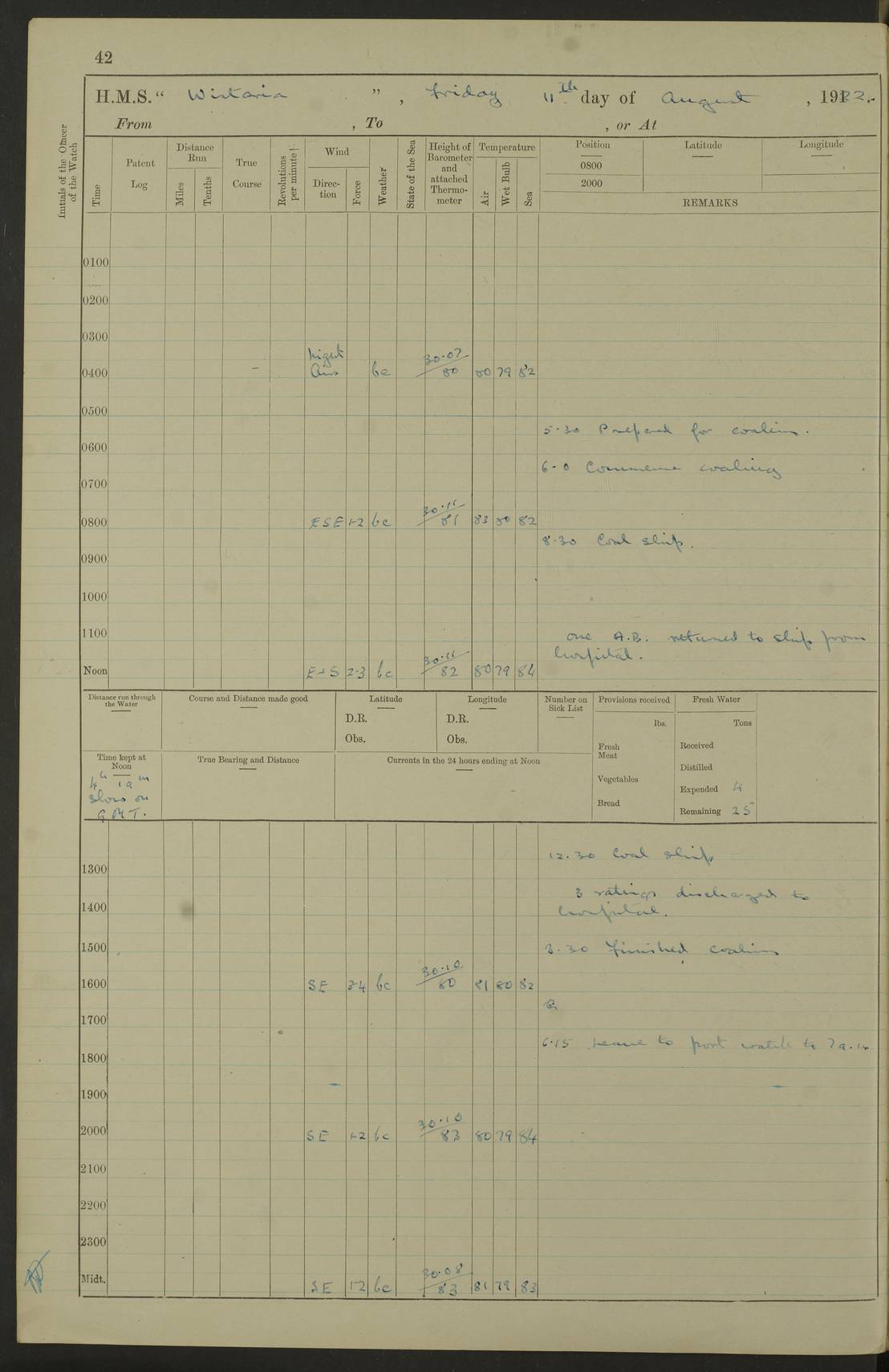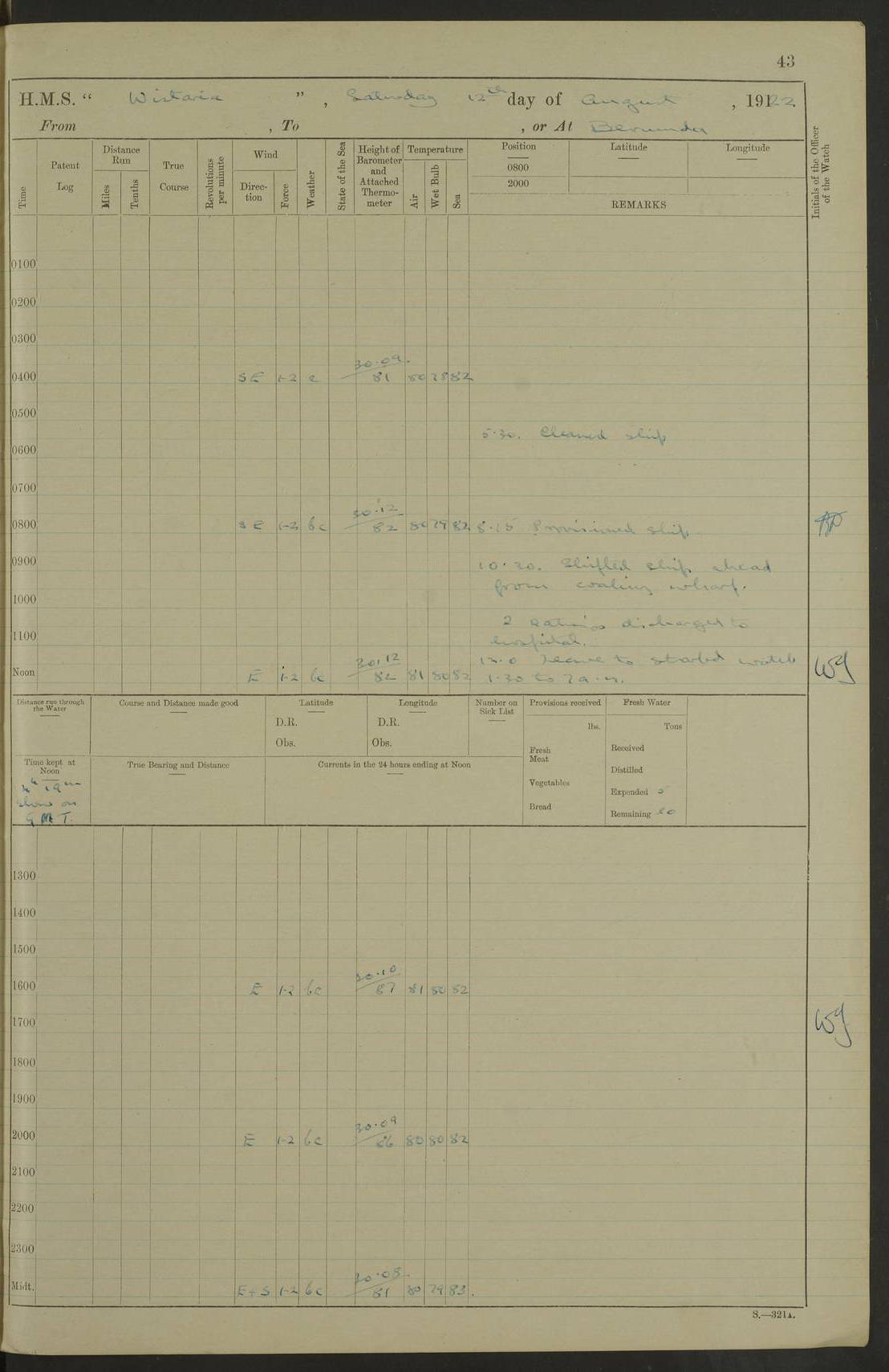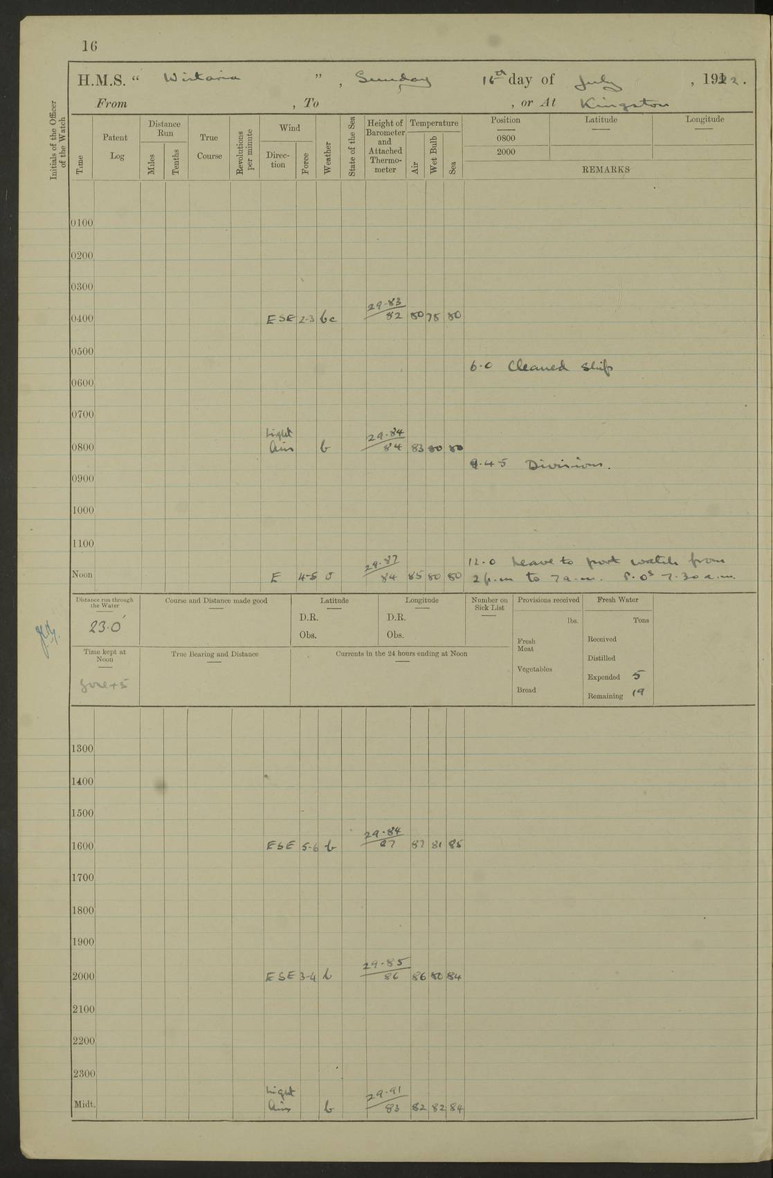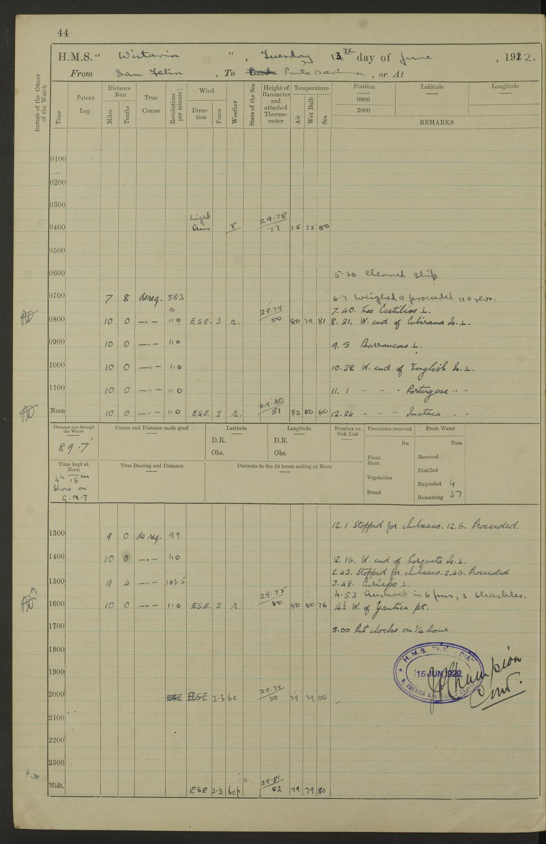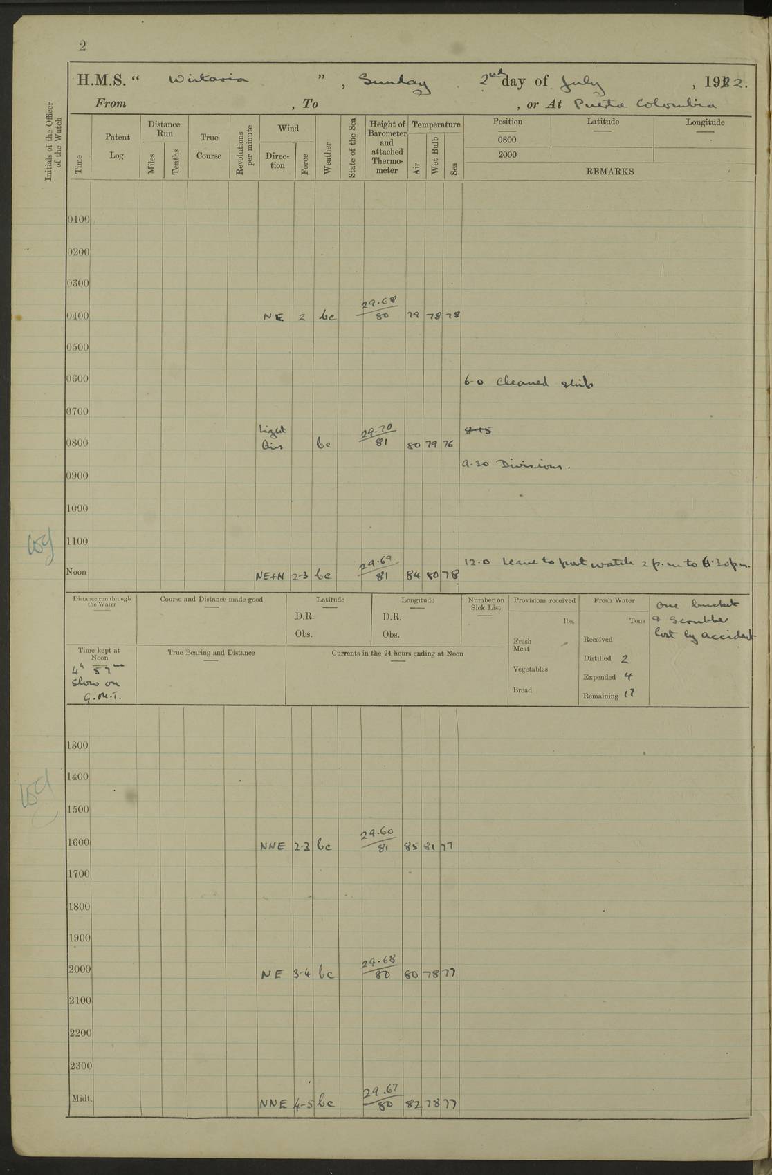 LOGS FOR JULY 1922 4f73cadaa2fc8ea903000bf3: (https://s3.amazonaws.com:443/oldweather/ADM53-93268/0003_1.jpg) 1 July 1922 At Puerto Colombia Lat 10.98, Long -74.95 8.15am: Cleaned ship am: One hand scrubber lost by accident 6.0pm: Hoisted boats 4f73cadba2fc8ea903000bf4: (https://s3.amazonaws.com:443/oldweather/ADM53-93268/0004_0.jpg) 2 July 1922 At Puerto Colombia Lat 10.98, Long -74.95 9.30am: Divisions am: One bucket & scrubber lost by accident 4f73cadba2fc8ea903000bf5: (https://s3.amazonaws.com:443/oldweather/ADM53-93268/0004_1.jpg) 3 July 1922 At Puerto Colombia Lat 10.98, Long -74.95 9.30am: Divisions pm: Hands employed painting ship’s side & parts of ship 6.30pm: Hoisted boats 4f73cadba2fc8ea903000bf6: (https://s3.amazonaws.com:443/oldweather/ADM53-93268/0005_0.jpg) 4 July 1922 At Puerto Colombia Lat 10.98, Long -74.95 8.15am: Hands employed making boats gripes, parts of ship & fumigating PO’s mess deck 2.0pm: Hands employed parts of ship 6.35pm: Hoisted boats 4f73cadca2fc8ea903000bf7: (https://s3.amazonaws.com:443/oldweather/ADM53-93268/0005_1.jpg) 5 July 1922 At Puerto Colombia Lat 10.98, Long -74.95 8.15am: Hands employed refitting motor boat falls and parts on ship 9.0pm: Hoisted boats 4f73cadca2fc8ea903000bf8: (https://s3.amazonaws.com:443/oldweather/ADM53-93268/0006_0.jpg) 6 July 1922 From Puerto Colombia to Colon Lat 10.9, Long -75.86 5.53am: Weighed and proceeded, 96 revs 6.06am: Bellilo Lt Ho bore N 6.15am: N80W, Belillo Lt Ho bore N40E 8.54am: Streamed patent log 8.50am: Sounding at 200 fath wire am: Hands employed painting motor boat, cleaning out store rooms & parts of ship True Bearing and Distance: Pt Manzanillo Lt 251°, 230 miles 4f73cadda2fc8ea903000bf9: (https://s3.amazonaws.com:443/oldweather/ADM53-93268/0006_1.jpg) 7 July 1922 From Puerto Colombia to Colon Lat 10.05, Long -79.31 6.30am: Hands employed scrubbing gun covers & upper deck 9.45am: Exercised action stations 10.55am: Sighted land on Port beam Lost overboard by accident while at general quarters: Projectile, dummy, Q.F. 4” MK IV gun 2.04pm: Sighted land ahead 3.36pm: Manzanillo Lt Ho abeam 2.5 miles 4.05pm: Farallon Sucio abeam, 1 mile. Altered course S62W 4.20pm: Altered course S42W. Islotes de Duarte abeam, 1 mile 6.26pm: Course as required for entering harbour 6.36pm: E Breakwater Lt Ho abeam 6.39pm: Stopped to pick up pilot 6.50pm: Proceeded 7.07pm: Anchored in 29 ft Anchor Bearings: E Christobal Wharf, right tangent, N53E; left tangent, Mid Christobal Wharf N35E; left tangent, W Christobal Wharf N9E True Bearing and Distance: Pt Manzanillo 210°, 28 miles 4f73cadda2fc8ea903000bfa: (https://s3.amazonaws.com:443/oldweather/ADM53-93268/0007_0.jpg) 8 July 1922 At Colon Lat 9.33, Long -79.9 8.0am: Saluted U.S.A. flag with 21 gun salute 8.45am: Secured alongside jetty 1.25pm: Lieut Arliss discharged to hospital 4f73cadda2fc8ea903000bfb: (https://s3.amazonaws.com:443/oldweather/ADM53-93268/0007_1.jpg) 9 July 1922 At Colon Lat 9.33, Long -79.9 6.0am: Cleaned ship. Party of 40 men landed to visit Panama Canal 9.45am: Divisions & Prayers 4f73cadea2fc8ea903000bfc: (https://s3.amazonaws.com:443/oldweather/ADM53-93268/0008_0.jpg) 10 July 1922 At Colon Lat 9.33, Long -79.9 8.15am: Hands employed refitting boats falls & touching up ship’s side One tarpaulin lost by accident (8x8) 4f73cadea2fc8ea903000bfd: (https://s3.amazonaws.com:443/oldweather/ADM53-93268/0008_1.jpg) 11 July 1922 At Colon Lat 9.33, Long -79.9 8.15am: Hands employed refitting boats falls & parts of ship 4f73cadfa2fc8ea903000bfe: (https://s3.amazonaws.com:443/oldweather/ADM53-93268/0009_0.jpg) 12 July 1922 At Colon Lat 9.33, Long -79.9 5.30am: Prepared ship for coaling 6.30am: Left No 6 pier & proceeded alongside coaling wharf 7.10am: Secured alongside coaling wharf 7.30am: Commenced coaling 8.30am: Coal ship 11.15am: Left coaling wharf & proceeded 11.50am: E Breakwater Lt Ho abeam. Course N10E. Streamed patent log 4f73cadfa2fc8ea903000bff: (https://s3.amazonaws.com:443/oldweather/ADM53-93268/0009_1.jpg) 13 July 1922 From Colon to Kingston Lat 11.95, Long -78.88 2.10am: Furled boat deck awning 9.30am: Divisions. Hands employed overhauling boats sailing gear & oiling after 2½” wire hawser 3.47pm: Slow ahead. Unshipped forecastle awning stanchions 3.53pm: Half ahead, 96 revs True Bearing and Distance: Plum Pt Lt Ho 018°½, 384 miles 4f73cadfa2fc8ea903000c00: (https://s3.amazonaws.com:443/oldweather/ADM53-93268/0010_0.jpg) 14 July 1922 From Colon to Kingston Lat 14.76, Long -77.96 9.30am: Exercised control, remainder of hands employed parts of ship 2.0pm: Hands employed scrubbing boats sails & oiling guard rails 4.0pm: Evening Quarters. Exercised collision stations 5.15pm: Exercised sounding party True Bearing and Distance: Plum Pt Lt Ho 018°, 202 miles 4f73cae0a2fc8ea903000c01: (https://s3.amazonaws.com:443/oldweather/ADM53-93268/0010_1.jpg) 15 July 1922 From Colon to Kingston Lat 17.78, Long -76.83 9.50am: Sighted land ahead. Hands employed cleaning ship 1.0pm: Stopped 1.03pm: Half ahead. Altered course N6E and as required for entering harbour 1.30pm: Anchored off Port Royal 2.0pm: Weighed & proceeded 3.15pm: Secured alongside Royal Mail jetty True Bearing and Distance: Port Royal Pt 350°, 12 miles 4f73cae0a2fc8ea903000c02: (https://s3.amazonaws.com:443/oldweather/ADM53-93268/0011_0.jpg) 16 July 1922 At Kingston Lat 17.95, Long -76.76 6.0am: Cleaned ship 9.45am: Divisions 4f73cae0a2fc8ea903000c03: (https://s3.amazonaws.com:443/oldweather/ADM53-93268/0011_1.jpg) 17 July 1922 At Kingston Lat 17.95, Long -76.76 5.30am: Hands employed furling quarter deck awning & rigging sheer legs 9.15am: Hands employed refitting fender & washing ship's side 2.0pm: Hands employed cleaning ship's side 4f73cae1a2fc8ea903000c04: (https://s3.amazonaws.com:443/oldweather/ADM53-93268/0012_0.jpg) 18 July 1922 At Kingston Lat 17.95, Long -76.76 5.30am: Hands employed cleaning ship. Divers at work about rudders 8.15am: Hands employed washing down aloft & replac