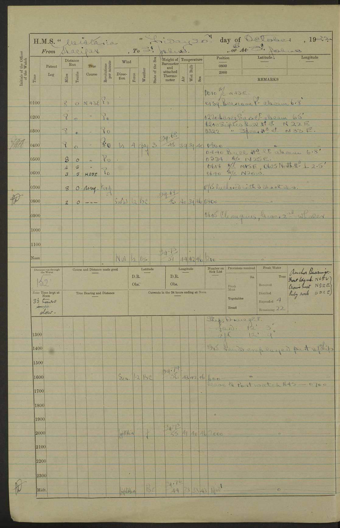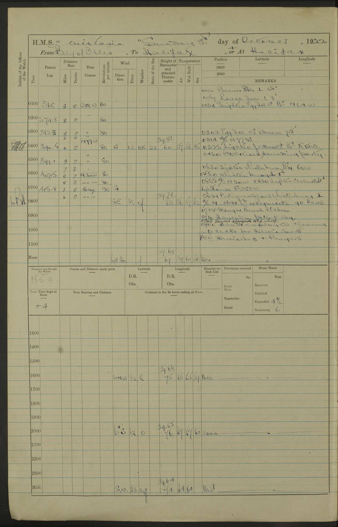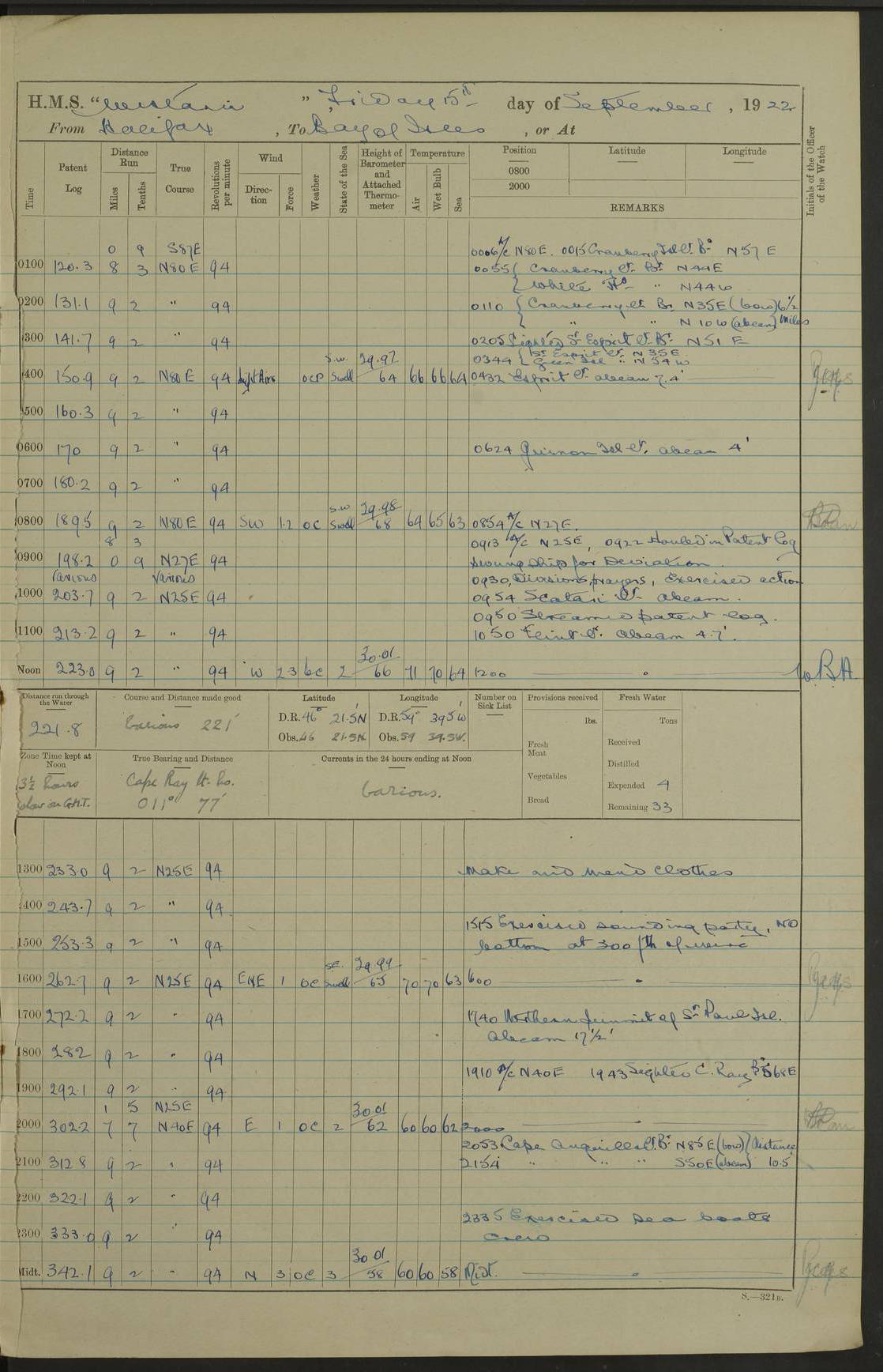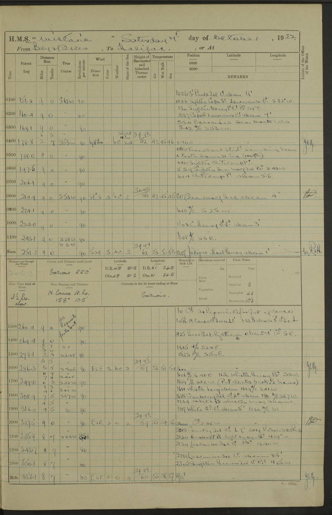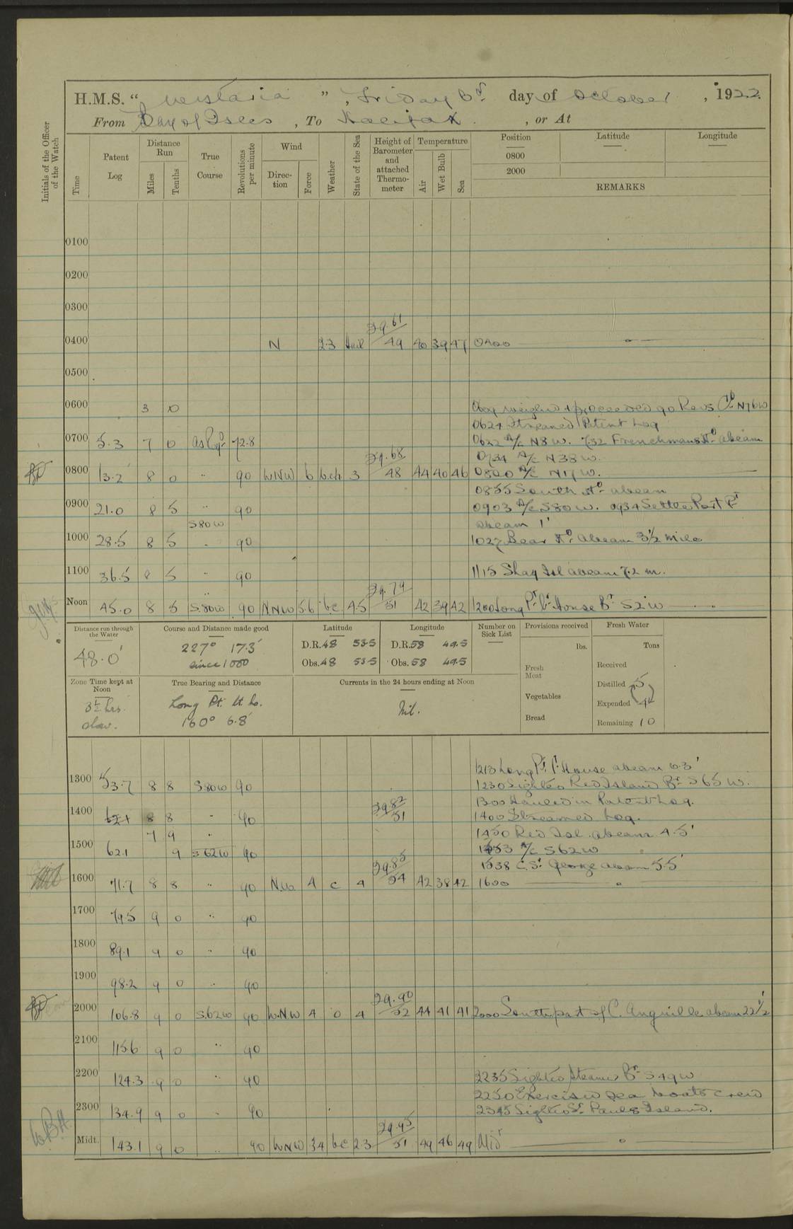 LOGS FOR OCTOBER 1922 4f73cb05a2fc8ea903000c65: (https://s3.amazonaws.com:443/oldweather/ADM53-93270/0003_1.jpg) 1 October 1922 At Forteau Bay Lat 51.46, Long -56.91 6.0am: Hands employed cleaning ship 9.45am: Divisions & Prayers 4f73cb05a2fc8ea903000c66: (https://s3.amazonaws.com:443/oldweather/ADM53-93270/0004_0.jpg) 2 October 1922 At Forteau Bay Lat 51.46, Long -56.91 6.0am: Hands employed cleaning ship 8.30am: Hands employed cleaning out boats and refitting well deck awnings 9.30am: Divisions & P.T. Party of 7 PO and 1 man to “Raleigh” 1.0pm: Hands for monthly payment 1.30pm: Hands employed refitting well deck awning and painting davits, etc 6.45pm: Hoisted Motor Boat 4f73cb05a2fc8ea903000c67: (https://s3.amazonaws.com:443/oldweather/ADM53-93270/0004_1.jpg) 3 October 1922 At Forteau Bay Lat 51.46, Long -56.91 8.30am: Hands employed cleaning out boats and refitting well deck awning am: New ratings to “Lewis gun” instruction pm: 1 hand scrubber lost by accident pm: 3 policemen received from Newfoundland in SS “Portia” 4.20pm: SS “Portia” enters harbour 4.45pm: SS “Portia” leaves 4f73cb06a2fc8ea903000c68: (https://s3.amazonaws.com:443/oldweather/ADM53-93270/0005_0.jpg) 4 October 1922 At Forteau Bay Lat 51.46, Long -56.91 8.30am: Hands employed securing ship for sea 8.45am: Shortened in 9.0am: Weighed and proceeded to Point Amour 9.20am: Anchored in 10 fathoms Anchor Bearings: Anse Amour Pier S65E; Amour Pt, right tangent, S4W; Cliff S11E 10.0am: Hands detailed for “Raleigh” working party 2.0pm: HMS “Raleigh” abandoned 2.15pm: 1 P.O. and 11 hands joined for passage (ex “Raleigh’s”) 3.0pm: Weighed and proceeded 90 revs 4.18pm: Greenly Island Lt Ho abeam, 7.4 miles 4.37pm: Patent log streamed 6.10pm: New Ferolle Pt abeam, 6.5 miles 7.05pm: Sighted Rich Pt bearing S42W 8.11pm: Rich Pt (bow) S15W 8.48pm: Rich Pt (Abeam), dist 5.7 miles. Altered course S52W 4f73cb06a2fc8ea903000c69: (https://s3.amazonaws.com:443/oldweather/ADM53-93270/0005_1.jpg) 5 October 1922 From Forteau Bay to Bonne Bay Lat 49.41, Long -58.25 1.35am: Sighted Cow Head Lt bearing S9W 1.40am: Cow Head Lt bearing S7W (bow), dist 8.3 miles 2.39am: Cow Head Lt bearing S38E (abeam), dist 8.3 miles 3.25am: Sighted Lobster Head Lt bearing S15W 5.20am: Sighted Lobster Point bearing S10E 6.47am: Lobster Cove Head abeam, 1 mile 7.35am: Anchored Bonne Bay 8.45am: Hands employed cleaning after sail room & canteen flat 9.15am: Weighed & proceeded, 90 revs 1.0pm: Altered course South and as requisite for entering Humber Arm, Bay of Isles 3.34pm: Anchored in 10 faths Anchor Bearings: Humber Mouth Pier right tangent S45W; Point, right tangent, S45E; left tangent, Hughes Brook N69E True Bearing and Distance: Gregory Island 192°, 8 miles 4f73cb07a2fc8ea903000c6a: (https://s3.amazonaws.com:443/oldweather/ADM53-93270/0006_0.jpg) 6 October 1922 From Bay of Isles to Halifax Lat 48.88, Long -58.81 6.09am: Weighed & proceeded 90 revs. Course N76W 6.24am: Streamed patent log 7.32am: Frenchman’s Head abeam 8.55am: South Head abeam 9.35am: Little Port Pt abeam, 1 mile 10.27am: Bear Head abeam, 3½ miles 11.15am: Shag Island abeam, 7.2 miles noon: Long Pt Lt Ho bearing S2W 12.10pm: Long Pt Lt House abeam, 6.3 miles 12.30pm: Sighted Red Island bearing S65W 1.0pm: Hauled in patent log 2.0pm: Streamed log 2.50pm: Red Island abeam, 4.5 miles 3.38pm: C. St George abeam, 5.5 miles 8.0pm: South part of C. Anguille abeam, 22½ miles 10.35pm: Sighted steamer bearing S49W 11.45pm: Sighted St Pauls Island True Bearing and Distance: Long Pt Lt Ho 160°, 6.8 miles 4f73cb07a2fc8ea903000c6b: (https://s3.amazonaws.com:443/oldweather/ADM53-93270/0006_1.jpg) 7 October 1922 From Bay of Isles to Halifax Lat 45.85, Long -61.56 12.26am: St Pauls Island Lt abeam, 16 miles 1.06am: Sighted Cape St Lawrence Lt S32W 1.30am: Sighted Money Pt Lt bearing S9E 2.37am: Cape St Lawrence Lt abeam, 7 miles 4.10am: Turned out Starboard sounding boom & took sounding (100 fath) 4.10am: Sighted Chiticamp Pt 5.39am: Sighted Sea Wolf Island bearing S43W 6.14am: Chiticamp Pt abeam, 5.5 miles 8.07am: Sea Wolf Island abeam, 4 miles 11.03am: C Henry Lt Ho abeam, 3 miles 12.07pm: Judique shoal buoy abeam, 1 mile 1.0pm: Course as requisite for Gut of Canso 1.05pm: North Canso Lt House abeam, 1 mile 1.33pm: Balache Pt Lt Ho abeam 2.25pm: Bear Island lighthouse abeam, 0.4 miles. Course SE 4.56pm: Whistle buoy bearing S3W 4.58pm: Altered course S22W. (Put clocks back ½ hour) 4.31pm: Whistle buoy abeam 4.55pm: Cranberry Island Lt Ho abeam 5.39pm: White Rk whistle buoy abeam 6.17pm: White Head Lt abeam, 5 miles 8.18pm: Country Island Lt abeam, 7 miles 9.30pm: Humbolt Rock light buoy bearing N69W 9.39pm: Luscombe Island Lt bearing N40W 10.18pm: Luscombe Island Lt abeam, 8.5 miles 11.05pm: Sighted Beaver Island Lt bearing N65W True Bearing and Distance: North Canso Lt Ho 158°, 10.5 miles [Chiticamp Point: misspelt for Chéticamp Point, the southwestern point of the island] [Luscombe Island: misspelt for Liscomb Island] 4f73cb07a2fc8ea903000c6c: (https://s3.amazonaws.com:443/oldweather/ADM53-93270/0007_0.jpg) 8 October 1922 From Bay of Isles to Halifax and at Halifax Lat 49.41, Long -58.25 0.20am: Beaver Isle abeam, 6 ¼ miles 0.59am: Roach Isle abeam, 9 miles 1.34am: Sighted Egg Island Lt bearing N64W 3.02am: Egg Island Lt abeam, 7.5 miles 3.25am: Sighted Jeddore Lt bearing N15W 5.30am: Sighted Whistle buoy bearing N60W 5.50am: Whistle buoy abeam, 1 mile 6.30am: Sighted Chebucto Head lighthouse bearing S88W 6.38am: Portuguese shoal whistle buoy abeam. Altered course North 7.08am: Manger Beach Lt abeam 7.10am: Hauled in patent log 7.45am: Secured alongside Number 4 wharf 9.0am: Hands employed cleaning up decks for divisions 4f73cb08a2fc8ea903000c6d: (https://s3.amazonaws.com:443/oldweather/ADM53-93270/0007_1.jpg) 9 October 1922 At Halifax Lat 44.69, Long -63.64 8.30am: Hands employed in getting out “Raleigh’s” boats 9.05am: HMCS “Patriot” proceeded to Sea 1.