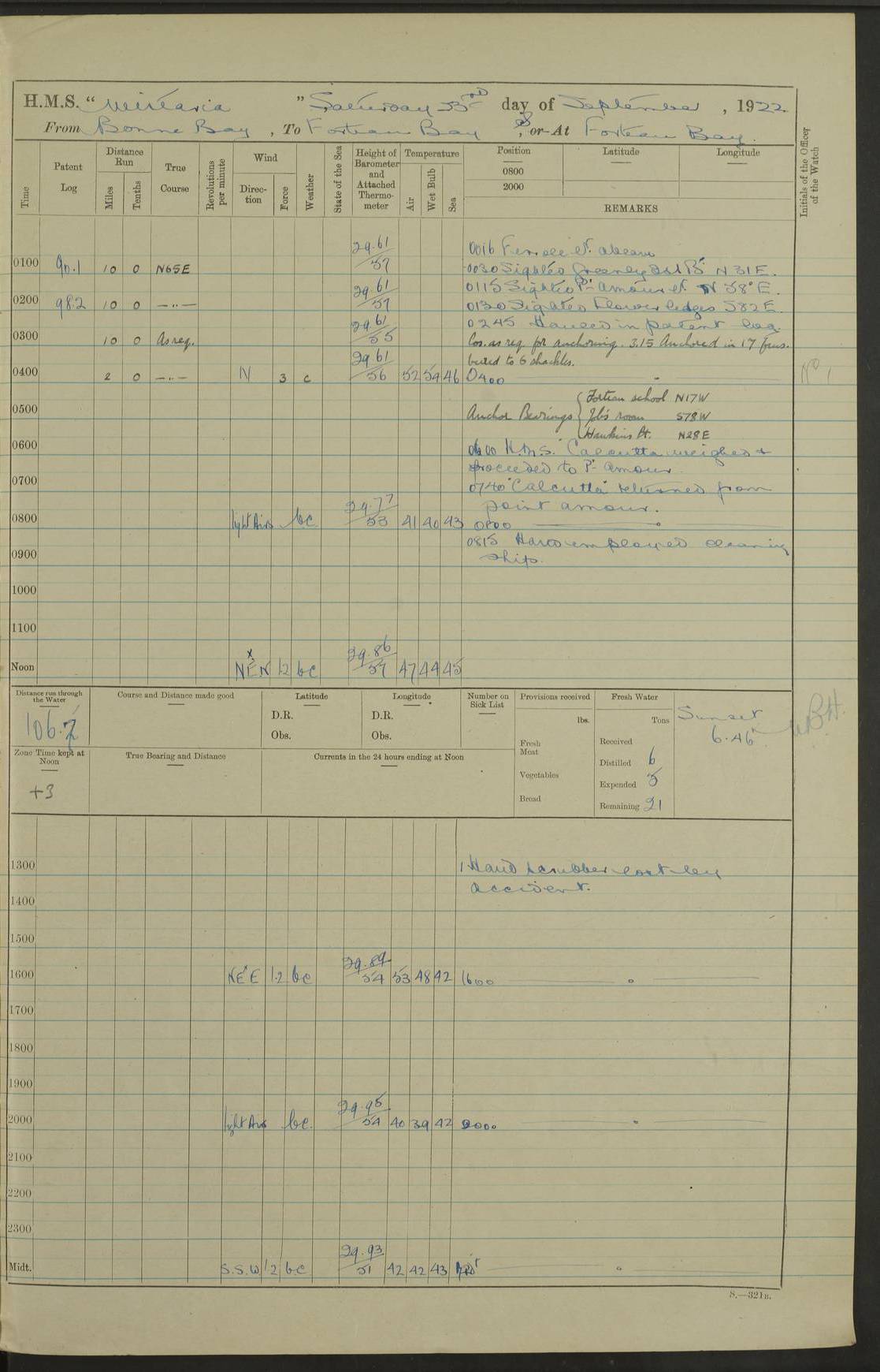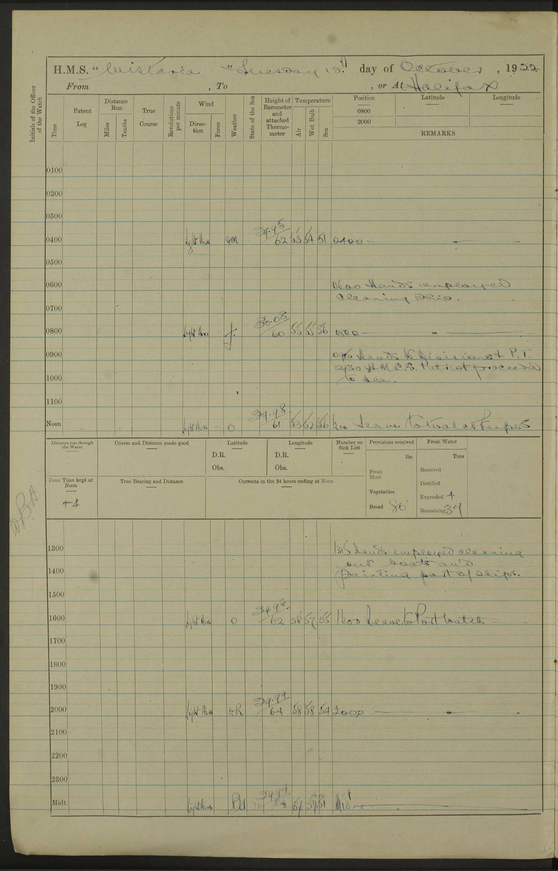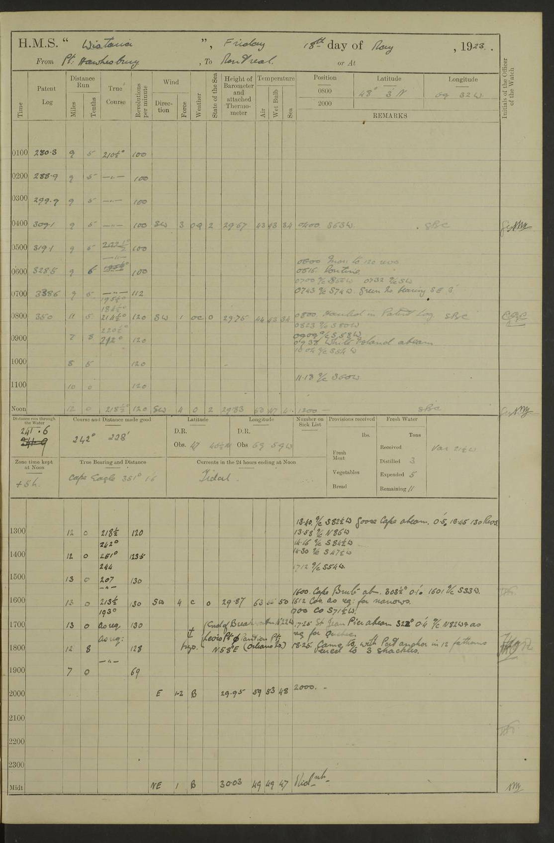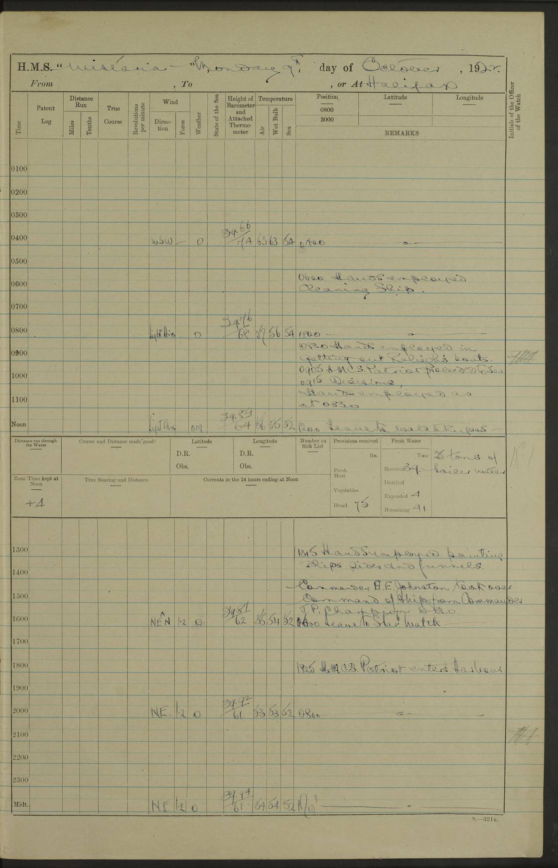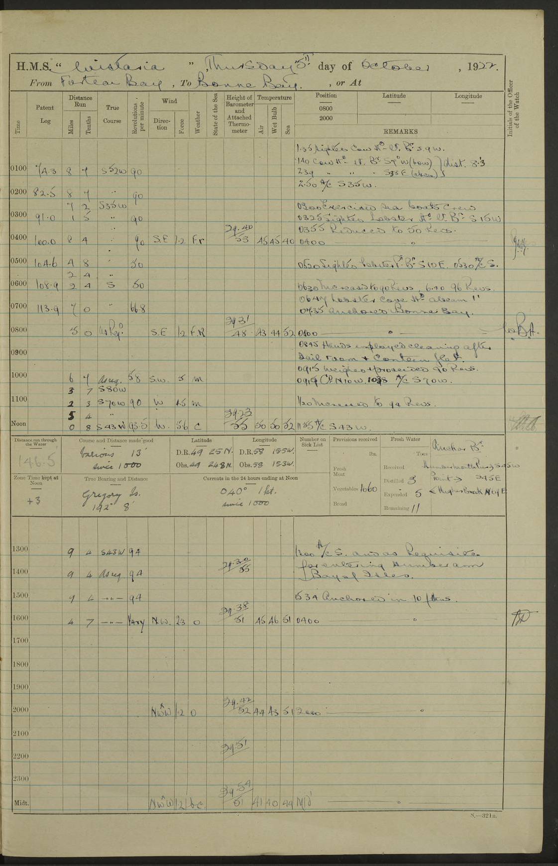 LOGS FOR OCTOBER 1922 4f73cb05a2fc8ea903000c65: (https://s3.amazonaws.com:443/oldweather/ADM53-93270/0003_1.jpg) 1 October 1922 At Forteau Bay Lat 51.46, Long -56.91 6.0am: Hands employed cleaning ship 9.45am: Divisions & Prayers 4f73cb05a2fc8ea903000c66: (https://s3.amazonaws.com:443/oldweather/ADM53-93270/0004_0.jpg) 2 October 1922 At Forteau Bay Lat 51.46, Long -56.91 6.0am: Hands employed cleaning ship 8.30am: Hands employed cleaning out boats and refitting well deck awnings 9.30am: Divisions & P.T. Party of 7 PO and 1 man to “Raleigh” 1.0pm: Hands for monthly payment 1.30pm: Hands employed refitting well deck awning and painting davits, etc 6.45pm: Hoisted Motor Boat 4f73cb05a2fc8ea903000c67: (https://s3.amazonaws.com:443/oldweather/ADM53-93270/0004_1.jpg) 3 October 1922 At Forteau Bay Lat 51.46, Long -56.91 8.30am: Hands employed cleaning out boats and refitting well deck awning am: New ratings to “Lewis gun” instruction pm: 1 hand scrubber lost by accident pm: 3 policemen received from Newfoundland in SS “Portia” 4.20pm: SS “Portia” enters harbour 4.45pm: SS “Portia” leaves 4f73cb06a2fc8ea903000c68: (https://s3.amazonaws.com:443/oldweather/ADM53-93270/0005_0.jpg) 4 October 1922 At Forteau Bay Lat 51.46, Long -56.91 8.30am: Hands employed securing ship for sea 8.45am: Shortened in 9.0am: Weighed and proceeded to Point Amour 9.20am: Anchored in 10 fathoms Anchor Bearings: Anse Amour Pier S65E; Amour Pt, right tangent, S4W; Cliff S11E 10.0am: Hands detailed for “Raleigh” working party 2.0pm: HMS “Raleigh” abandoned 2.15pm: 1 P.O. and 11 hands joined for passage (ex “Raleigh’s”) 3.0pm: Weighed and proceeded 90 revs 4.18pm: Greenly Island Lt Ho abeam, 7.4 miles 4.37pm: Patent log streamed 6.10pm: New Ferolle Pt abeam, 6.5 miles 7.05pm: Sighted Rich Pt bearing S42W 8.11pm: Rich Pt (bow) S15W 8.48pm: Rich Pt (Abeam), dist 5.7 miles. Altered course S52W 4f73cb06a2fc8ea903000c69: (https://s3.amazonaws.com:443/oldweather/ADM53-93270/0005_1.jpg) 5 October 1922 From Forteau Bay to Bonne Bay Lat 49.41, Long -58.25 1.35am: Sighted Cow Head Lt bearing S9W 1.40am: Cow Head Lt bearing S7W (bow), dist 8.3 miles 2.39am: Cow Head Lt bearing S38E (abeam), dist 8.3 miles 3.25am: Sighted Lobster Head Lt bearing S15W 5.20am: Sighted Lobster Point bearing S10E 6.47am: Lobster Cove Head abeam, 1 mile 7.35am: Anchored Bonne Bay 8.45am: Hands employed cleaning after sail room & canteen flat 9.15am: Weighed & proceeded, 90 revs 1.0pm: Altered course South and as requisite for entering Humber Arm, Bay of Isles 3.34pm: Anchored in 10 faths Anchor Bearings: Humber Mouth Pier right tangent S45W; Point, right tangent, S45E; left tangent, Hughes Brook N69E True Bearing and Distance: Gregory Island 192°, 8 miles 4f73cb07a2fc8ea903000c6a: (https://s3.amazonaws.com:443/oldweather/ADM53-93270/0006_0.jpg) 6 October 1922 From Bay of Isles to Halifax Lat 48.88, Long -58.81 6.09am: Weighed & proceeded 90 revs. Course N76W 6.24am: Streamed patent log 7.32am: Frenchman’s Head abeam 8.55am: South Head abeam 9.35am: Little Port Pt abeam, 1 mile 10.27am: Bear Head abeam, 3½ miles 11.15am: Shag Island abeam, 7.2 miles noon: Long Pt Lt Ho bearing S2W 12.10pm: Long Pt Lt House abeam, 6.3 miles 12.30pm: Sighted Red Island bearing S65W 1.0pm: Hauled in patent log 2.0pm: Streamed log 2.50pm: Red Island abeam, 4.5 miles 3.38pm: C. St George abeam, 5.5 miles 8.0pm: South part of C. Anguille abeam, 22½ miles 10.35pm: Sighted steamer bearing S49W 11.45pm: Sighted St Pauls Island True Bearing and Distance: Long Pt Lt Ho 160°, 6.8 miles 4f73cb07a2fc8ea903000c6b: (https://s3.amazonaws.com:443/oldweather/ADM53-93270/0006_1.jpg) 7 October 1922 From Bay of Isles to Halifax Lat 45.85, Long -61.56 12.26am: St Pauls Island Lt abeam, 16 miles 1.06am: Sighted Cape St Lawrence Lt S32W 1.30am: Sighted Money Pt Lt bearing S9E 2.37am: Cape St Lawrence Lt abeam, 7 miles 4.10am: Turned out Starboard sounding boom & took sounding (100 fath) 4.10am: Sighted Chiticamp Pt 5.39am: Sighted Sea Wolf Island bearing S43W 6.14am: Chiticamp Pt abeam, 5.5 miles 8.07am: Sea Wolf Island abeam, 4 miles 11.03am: C Henry Lt Ho abeam, 3 miles 12.07pm: Judique shoal buoy abeam, 1 mile 1.0pm: Course as requisite for Gut of Canso 1.05pm: North Canso Lt House abeam, 1 mile 1.33pm: Balache Pt Lt Ho abeam 2.25pm: Bear Island lighthouse abeam, 0.4 miles. Course SE 4.56pm: Whistle buoy bearing S3W 4.58pm: Altered course S22W. (Put clocks back ½ hour) 4.31pm: Whistle buoy abeam 4.55pm: Cranberry Island Lt Ho abeam 5.39pm: White Rk whistle buoy abeam 6.17pm: White Head Lt abeam, 5 miles 8.18pm: Country Island Lt abeam, 7 miles 9.30pm: Humbolt Rock light buoy bearing N69W 9.39pm: Luscombe Island Lt bearing N40W 10.18pm: Luscombe Island Lt abeam, 8.5 miles 11.05pm: Sighted Beaver Island Lt bearing N65W True Bearing and Distance: North Canso Lt Ho 158°, 10.5 miles [Chiticamp Point: misspelt for Chéticamp Point, the southwestern point of the island] [Luscombe Island: misspelt for Liscomb Island] 4f73cb07a2fc8ea903000c6c: (https://s3.amazonaws.com:443/oldweather/ADM53-93270/0007_0.jpg) 8 October 1922 From Bay of Isles to Halifax and at Halifax Lat 49.41, Long -58.25 0.20am: Beaver Isle abeam, 6 ¼ miles 0.59am: Roach Isle abeam, 9 miles 1.34am: Sighted Egg Island Lt bearing N64W 3.02am: Egg Island Lt abeam, 7.5 miles 3.25am: Sighted Jeddore Lt bearing N15W 5.30am: Sighted Whistle buoy bearing N60W 5.50am: Whistle buoy abeam, 1 mile 6.30am: Sighted Chebucto Head lighthouse bearing S88W 6.38am: Portuguese shoal whistle buoy abeam. Altered course North 7.08am: Manger Beach Lt abeam 7.10am: Hauled in patent log 7.45am: Secured alongside Number 4 wharf 9.0am: Hands employed cleaning up decks for divisions 4f73cb08a2fc8ea903000c6d: (https://s3.amazonaws.com:443/oldweather/ADM53-93270/0007_1.jpg) 9 October 1922 At Halifax Lat 44.69, Long -63.64 8.30am: Hands employed in getting out “Raleigh’s” boats 9.05am: HMCS “Patriot” proceeded to Sea 1.