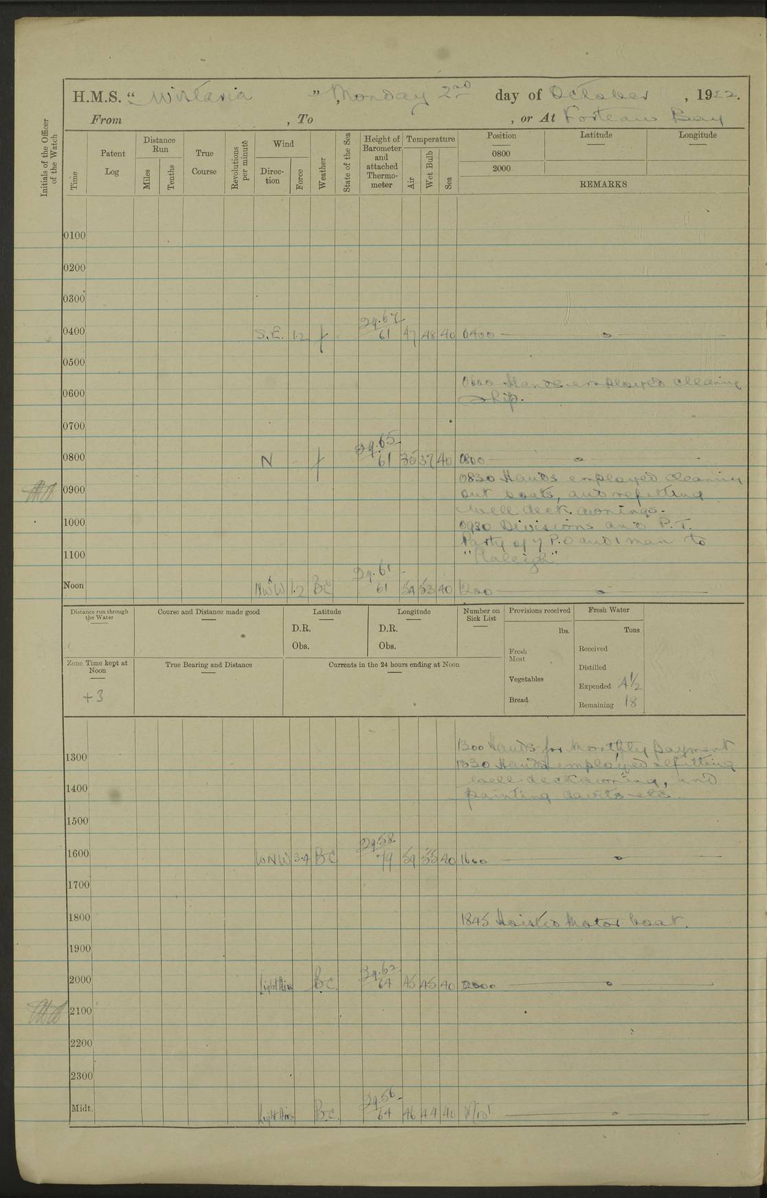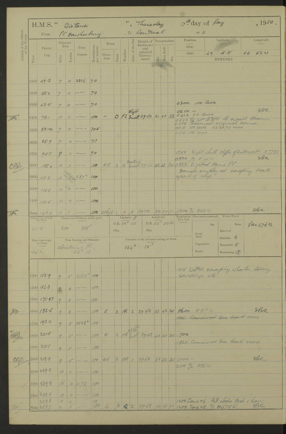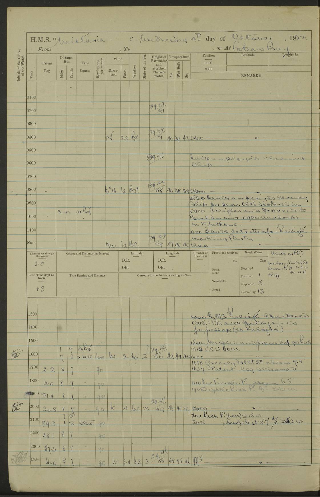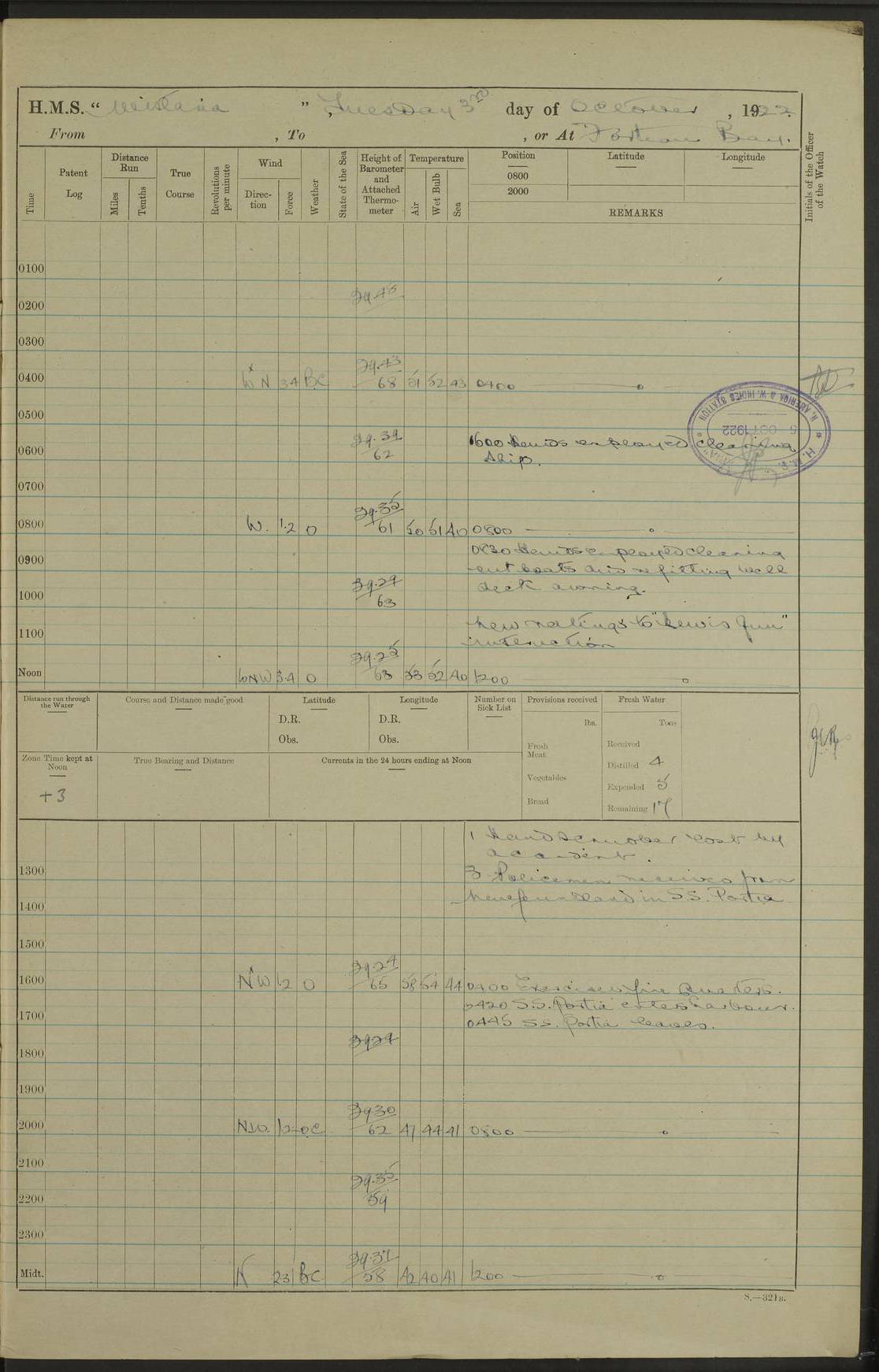 LOGS FOR OCTOBER 1922 4f73cb05a2fc8ea903000c65: (https://s3.amazonaws.com:443/oldweather/ADM53-93270/0003_1.jpg) 1 October 1922 At Forteau Bay Lat 51.46, Long -56.91 6.0am: Hands employed cleaning ship 9.45am: Divisions & Prayers 4f73cb05a2fc8ea903000c66: (https://s3.amazonaws.com:443/oldweather/ADM53-93270/0004_0.jpg) 2 October 1922 At Forteau Bay Lat 51.46, Long -56.91 6.0am: Hands employed cleaning ship 8.30am: Hands employed cleaning out boats and refitting well deck awnings 9.30am: Divisions & P.T. Party of 7 PO and 1 man to “Raleigh” 1.0pm: Hands for monthly payment 1.30pm: Hands employed refitting well deck awning and painting davits, etc 6.45pm: Hoisted Motor Boat 4f73cb05a2fc8ea903000c67: (https://s3.amazonaws.com:443/oldweather/ADM53-93270/0004_1.jpg) 3 October 1922 At Forteau Bay Lat 51.46, Long -56.91 8.30am: Hands employed cleaning out boats and refitting well deck awning am: New ratings to “Lewis gun” instruction pm: 1 hand scrubber lost by accident pm: 3 policemen received from Newfoundland in SS “Portia” 4.20pm: SS “Portia” enters harbour 4.45pm: SS “Portia” leaves 4f73cb06a2fc8ea903000c68: (https://s3.amazonaws.com:443/oldweather/ADM53-93270/0005_0.jpg) 4 October 1922 At Forteau Bay Lat 51.46, Long -56.91 8.30am: Hands employed securing ship for sea 8.45am: Shortened in 9.0am: Weighed and proceeded to Point Amour 9.20am: Anchored in 10 fathoms Anchor Bearings: Anse Amour Pier S65E; Amour Pt, right tangent, S4W; Cliff S11E 10.0am: Hands detailed for “Raleigh” working party 2.0pm: HMS “Raleigh” abandoned 2.15pm: 1 P.O. and 11 hands joined for passage (ex “Raleigh’s”) 3.0pm: Weighed and proceeded 90 revs 4.18pm: Greenly Island Lt Ho abeam, 7.4 miles 4.37pm: Patent log streamed 6.10pm: New Ferolle Pt abeam, 6.5 miles 7.05pm: Sighted Rich Pt bearing S42W 8.11pm: Rich Pt (bow) S15W 8.48pm: Rich Pt (Abeam), dist 5.7 miles. Altered course S52W 4f73cb06a2fc8ea903000c69: (https://s3.amazonaws.com:443/oldweather/ADM53-93270/0005_1.jpg) 5 October 1922 From Forteau Bay to Bonne Bay Lat 49.41, Long -58.25 1.35am: Sighted Cow Head Lt bearing S9W 1.40am: Cow Head Lt bearing S7W (bow), dist 8.3 miles 2.39am: Cow Head Lt bearing S38E (abeam), dist 8.3 miles 3.25am: Sighted Lobster Head Lt bearing S15W 5.20am: Sighted Lobster Point bearing S10E 6.47am: Lobster Cove Head abeam, 1 mile 7.35am: Anchored Bonne Bay 8.45am: Hands employed cleaning after sail room & canteen flat 9.15am: Weighed & proceeded, 90 revs 1.0pm: Altered course South and as requisite for entering Humber Arm, Bay of Isles 3.34pm: Anchored in 10 faths Anchor Bearings: Humber Mouth Pier right tangent S45W; Point, right tangent, S45E; left tangent, Hughes Brook N69E True Bearing and Distance: Gregory Island 192°, 8 miles 4f73cb07a2fc8ea903000c6a: (https://s3.amazonaws.com:443/oldweather/ADM53-93270/0006_0.jpg) 6 October 1922 From Bay of Isles to Halifax Lat 48.88, Long -58.81 6.09am: Weighed & proceeded 90 revs. Course N76W 6.24am: Streamed patent log 7.32am: Frenchman’s Head abeam 8.55am: South Head abeam 9.35am: Little Port Pt abeam, 1 mile 10.27am: Bear Head abeam, 3½ miles 11.15am: Shag Island abeam, 7.2 miles noon: Long Pt Lt Ho bearing S2W 12.10pm: Long Pt Lt House abeam, 6.3 miles 12.30pm: Sighted Red Island bearing S65W 1.0pm: Hauled in patent log 2.0pm: Streamed log 2.50pm: Red Island abeam, 4.5 miles 3.38pm: C. St George abeam, 5.5 miles 8.0pm: South part of C. Anguille abeam, 22½ miles 10.35pm: Sighted steamer bearing S49W 11.45pm: Sighted St Pauls Island True Bearing and Distance: Long Pt Lt Ho 160°, 6.8 miles 4f73cb07a2fc8ea903000c6b: (https://s3.amazonaws.com:443/oldweather/ADM53-93270/0006_1.jpg) 7 October 1922 From Bay of Isles to Halifax Lat 45.85, Long -61.56 12.26am: St Pauls Island Lt abeam, 16 miles 1.06am: Sighted Cape St Lawrence Lt S32W 1.30am: Sighted Money Pt Lt bearing S9E 2.37am: Cape St Lawrence Lt abeam, 7 miles 4.10am: Turned out Starboard sounding boom & took sounding (100 fath) 4.10am: Sighted Chiticamp Pt 5.39am: Sighted Sea Wolf Island bearing S43W 6.14am: Chiticamp Pt abeam, 5.5 miles 8.07am: Sea Wolf Island abeam, 4 miles 11.03am: C Henry Lt Ho abeam, 3 miles 12.07pm: Judique shoal buoy abeam, 1 mile 1.0pm: Course as requisite for Gut of Canso 1.05pm: North Canso Lt House abeam, 1 mile 1.33pm: Balache Pt Lt Ho abeam 2.25pm: Bear Island lighthouse abeam, 0.4 miles. Course SE 4.56pm: Whistle buoy bearing S3W 4.58pm: Altered course S22W. (Put clocks back ½ hour) 4.31pm: Whistle buoy abeam 4.55pm: Cranberry Island Lt Ho abeam 5.39pm: White Rk whistle buoy abeam 6.17pm: White Head Lt abeam, 5 miles 8.18pm: Country Island Lt abeam, 7 miles 9.30pm: Humbolt Rock light buoy bearing N69W 9.39pm: Luscombe Island Lt bearing N40W 10.18pm: Luscombe Island Lt abeam, 8.5 miles 11.05pm: Sighted Beaver Island Lt bearing N65W True Bearing and Distance: North Canso Lt Ho 158°, 10.5 miles [Chiticamp Point: misspelt for Chéticamp Point, the southwestern point of the island] [Luscombe Island: misspelt for Liscomb Island] 4f73cb07a2fc8ea903000c6c: (https://s3.amazonaws.com:443/oldweather/ADM53-93270/0007_0.jpg) 8 October 1922 From Bay of Isles to Halifax and at Halifax Lat 49.41, Long -58.25 0.20am: Beaver Isle abeam, 6 ¼ miles 0.59am: Roach Isle abeam, 9 miles 1.34am: Sighted Egg Island Lt bearing N64W 3.02am: Egg Island Lt abeam, 7.5 miles 3.25am: Sighted Jeddore Lt bearing N15W 5.30am: Sighted Whistle buoy bearing N60W 5.50am: Whistle buoy abeam, 1 mile 6.30am: Sighted Chebucto Head lighthouse bearing S88W 6.38am: Portuguese shoal whistle buoy abeam. Altered course North 7.08am: Manger Beach Lt abeam 7.10am: Hauled in patent log 7.45am: Secured alongside Number 4 wharf 9.0am: Hands employed cleaning up decks for divisions 4f73cb08a2fc8ea903000c6d: (https://s3.amazonaws.com:443/oldweather/ADM53-93270/0007_1.jpg) 9 October 1922 At Halifax Lat 44.69, Long -63.64 8.30am: Hands employed in getting out “Raleigh’s” boats 9.05am: HMCS “Patriot” proceeded to Sea 1.