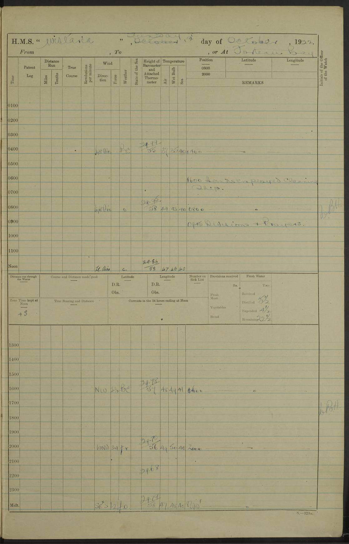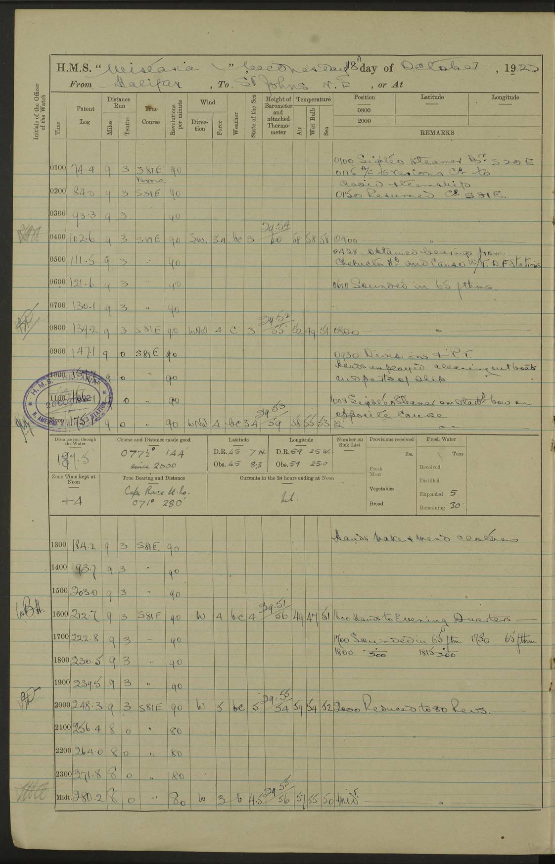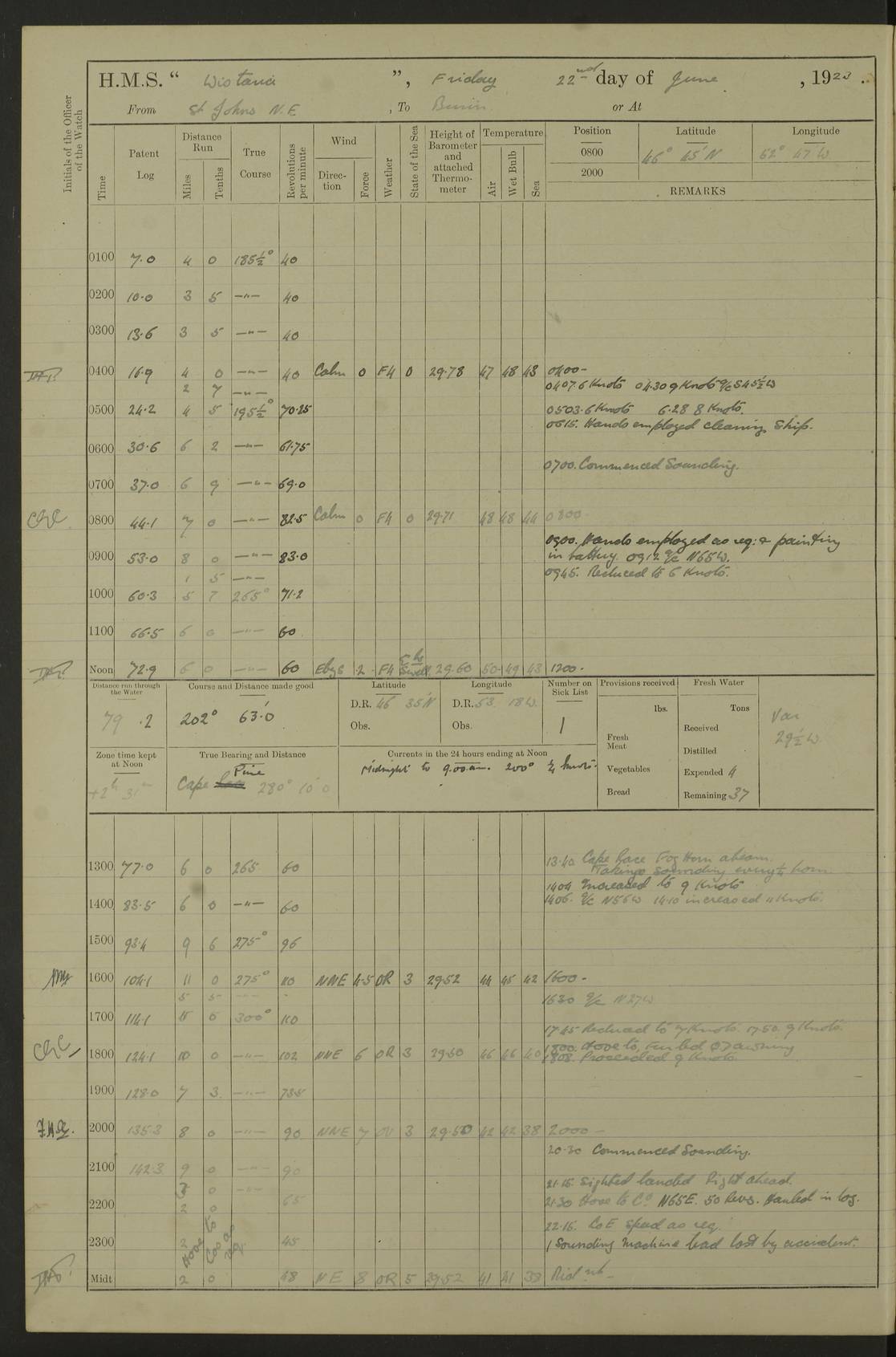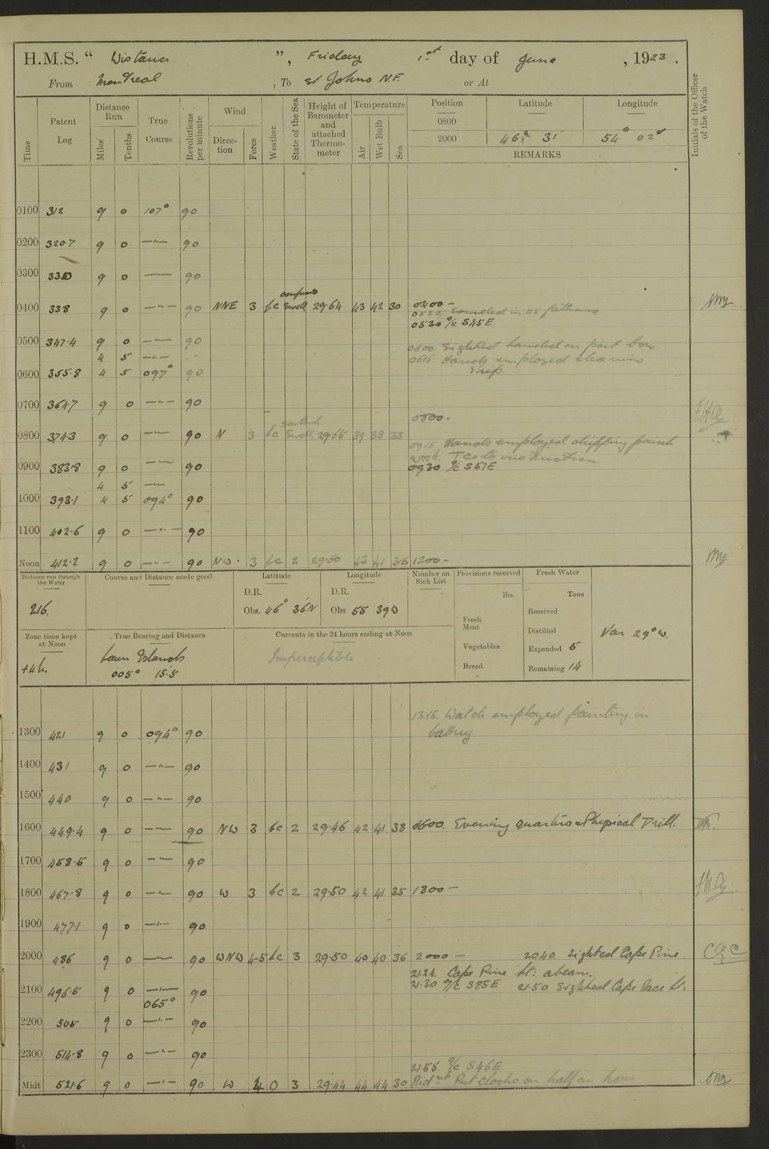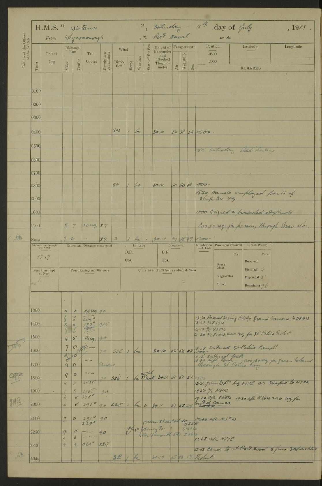 LOGS FOR OCTOBER 1922 4f73cb05a2fc8ea903000c65: (https://s3.amazonaws.com:443/oldweather/ADM53-93270/0003_1.jpg) 1 October 1922 At Forteau Bay Lat 51.46, Long -56.91 6.0am: Hands employed cleaning ship 9.45am: Divisions & Prayers 4f73cb05a2fc8ea903000c66: (https://s3.amazonaws.com:443/oldweather/ADM53-93270/0004_0.jpg) 2 October 1922 At Forteau Bay Lat 51.46, Long -56.91 6.0am: Hands employed cleaning ship 8.30am: Hands employed cleaning out boats and refitting well deck awnings 9.30am: Divisions & P.T. Party of 7 PO and 1 man to “Raleigh” 1.0pm: Hands for monthly payment 1.30pm: Hands employed refitting well deck awning and painting davits, etc 6.45pm: Hoisted Motor Boat 4f73cb05a2fc8ea903000c67: (https://s3.amazonaws.com:443/oldweather/ADM53-93270/0004_1.jpg) 3 October 1922 At Forteau Bay Lat 51.46, Long -56.91 8.30am: Hands employed cleaning out boats and refitting well deck awning am: New ratings to “Lewis gun” instruction pm: 1 hand scrubber lost by accident pm: 3 policemen received from Newfoundland in SS “Portia” 4.20pm: SS “Portia” enters harbour 4.45pm: SS “Portia” leaves 4f73cb06a2fc8ea903000c68: (https://s3.amazonaws.com:443/oldweather/ADM53-93270/0005_0.jpg) 4 October 1922 At Forteau Bay Lat 51.46, Long -56.91 8.30am: Hands employed securing ship for sea 8.45am: Shortened in 9.0am: Weighed and proceeded to Point Amour 9.20am: Anchored in 10 fathoms Anchor Bearings: Anse Amour Pier S65E; Amour Pt, right tangent, S4W; Cliff S11E 10.0am: Hands detailed for “Raleigh” working party 2.0pm: HMS “Raleigh” abandoned 2.15pm: 1 P.O. and 11 hands joined for passage (ex “Raleigh’s”) 3.0pm: Weighed and proceeded 90 revs 4.18pm: Greenly Island Lt Ho abeam, 7.4 miles 4.37pm: Patent log streamed 6.10pm: New Ferolle Pt abeam, 6.5 miles 7.05pm: Sighted Rich Pt bearing S42W 8.11pm: Rich Pt (bow) S15W 8.48pm: Rich Pt (Abeam), dist 5.7 miles. Altered course S52W 4f73cb06a2fc8ea903000c69: (https://s3.amazonaws.com:443/oldweather/ADM53-93270/0005_1.jpg) 5 October 1922 From Forteau Bay to Bonne Bay Lat 49.41, Long -58.25 1.35am: Sighted Cow Head Lt bearing S9W 1.40am: Cow Head Lt bearing S7W (bow), dist 8.3 miles 2.39am: Cow Head Lt bearing S38E (abeam), dist 8.3 miles 3.25am: Sighted Lobster Head Lt bearing S15W 5.20am: Sighted Lobster Point bearing S10E 6.47am: Lobster Cove Head abeam, 1 mile 7.35am: Anchored Bonne Bay 8.45am: Hands employed cleaning after sail room & canteen flat 9.15am: Weighed & proceeded, 90 revs 1.0pm: Altered course South and as requisite for entering Humber Arm, Bay of Isles 3.34pm: Anchored in 10 faths Anchor Bearings: Humber Mouth Pier right tangent S45W; Point, right tangent, S45E; left tangent, Hughes Brook N69E True Bearing and Distance: Gregory Island 192°, 8 miles 4f73cb07a2fc8ea903000c6a: (https://s3.amazonaws.com:443/oldweather/ADM53-93270/0006_0.jpg) 6 October 1922 From Bay of Isles to Halifax Lat 48.88, Long -58.81 6.09am: Weighed & proceeded 90 revs. Course N76W 6.24am: Streamed patent log 7.32am: Frenchman’s Head abeam 8.55am: South Head abeam 9.35am: Little Port Pt abeam, 1 mile 10.27am: Bear Head abeam, 3½ miles 11.15am: Shag Island abeam, 7.2 miles noon: Long Pt Lt Ho bearing S2W 12.10pm: Long Pt Lt House abeam, 6.3 miles 12.30pm: Sighted Red Island bearing S65W 1.0pm: Hauled in patent log 2.0pm: Streamed log 2.50pm: Red Island abeam, 4.5 miles 3.38pm: C. St George abeam, 5.5 miles 8.0pm: South part of C. Anguille abeam, 22½ miles 10.35pm: Sighted steamer bearing S49W 11.45pm: Sighted St Pauls Island True Bearing and Distance: Long Pt Lt Ho 160°, 6.8 miles 4f73cb07a2fc8ea903000c6b: (https://s3.amazonaws.com:443/oldweather/ADM53-93270/0006_1.jpg) 7 October 1922 From Bay of Isles to Halifax Lat 45.85, Long -61.56 12.26am: St Pauls Island Lt abeam, 16 miles 1.06am: Sighted Cape St Lawrence Lt S32W 1.30am: Sighted Money Pt Lt bearing S9E 2.37am: Cape St Lawrence Lt abeam, 7 miles 4.10am: Turned out Starboard sounding boom & took sounding (100 fath) 4.10am: Sighted Chiticamp Pt 5.39am: Sighted Sea Wolf Island bearing S43W 6.14am: Chiticamp Pt abeam, 5.5 miles 8.07am: Sea Wolf Island abeam, 4 miles 11.03am: C Henry Lt Ho abeam, 3 miles 12.07pm: Judique shoal buoy abeam, 1 mile 1.0pm: Course as requisite for Gut of Canso 1.05pm: North Canso Lt House abeam, 1 mile 1.33pm: Balache Pt Lt Ho abeam 2.25pm: Bear Island lighthouse abeam, 0.4 miles. Course SE 4.56pm: Whistle buoy bearing S3W 4.58pm: Altered course S22W. (Put clocks back ½ hour) 4.31pm: Whistle buoy abeam 4.55pm: Cranberry Island Lt Ho abeam 5.39pm: White Rk whistle buoy abeam 6.17pm: White Head Lt abeam, 5 miles 8.18pm: Country Island Lt abeam, 7 miles 9.30pm: Humbolt Rock light buoy bearing N69W 9.39pm: Luscombe Island Lt bearing N40W 10.18pm: Luscombe Island Lt abeam, 8.5 miles 11.05pm: Sighted Beaver Island Lt bearing N65W True Bearing and Distance: North Canso Lt Ho 158°, 10.5 miles [Chiticamp Point: misspelt for Chéticamp Point, the southwestern point of the island] [Luscombe Island: misspelt for Liscomb Island] 4f73cb07a2fc8ea903000c6c: (https://s3.amazonaws.com:443/oldweather/ADM53-93270/0007_0.jpg) 8 October 1922 From Bay of Isles to Halifax and at Halifax Lat 49.41, Long -58.25 0.20am: Beaver Isle abeam, 6 ¼ miles 0.59am: Roach Isle abeam, 9 miles 1.34am: Sighted Egg Island Lt bearing N64W 3.02am: Egg Island Lt abeam, 7.5 miles 3.25am: Sighted Jeddore Lt bearing N15W 5.30am: Sighted Whistle buoy bearing N60W 5.50am: Whistle buoy abeam, 1 mile 6.30am: Sighted Chebucto Head lighthouse bearing S88W 6.38am: Portuguese shoal whistle buoy abeam. Altered course North 7.08am: Manger Beach Lt abeam 7.10am: Hauled in patent log 7.45am: Secured alongside Number 4 wharf 9.0am: Hands employed cleaning up decks for divisions 4f73cb08a2fc8ea903000c6d: (https://s3.amazonaws.com:443/oldweather/ADM53-93270/0007_1.jpg) 9 October 1922 At Halifax Lat 44.69, Long -63.64 8.30am: Hands employed in getting out “Raleigh’s” boats 9.05am: HMCS “Patriot” proceeded to Sea 1.