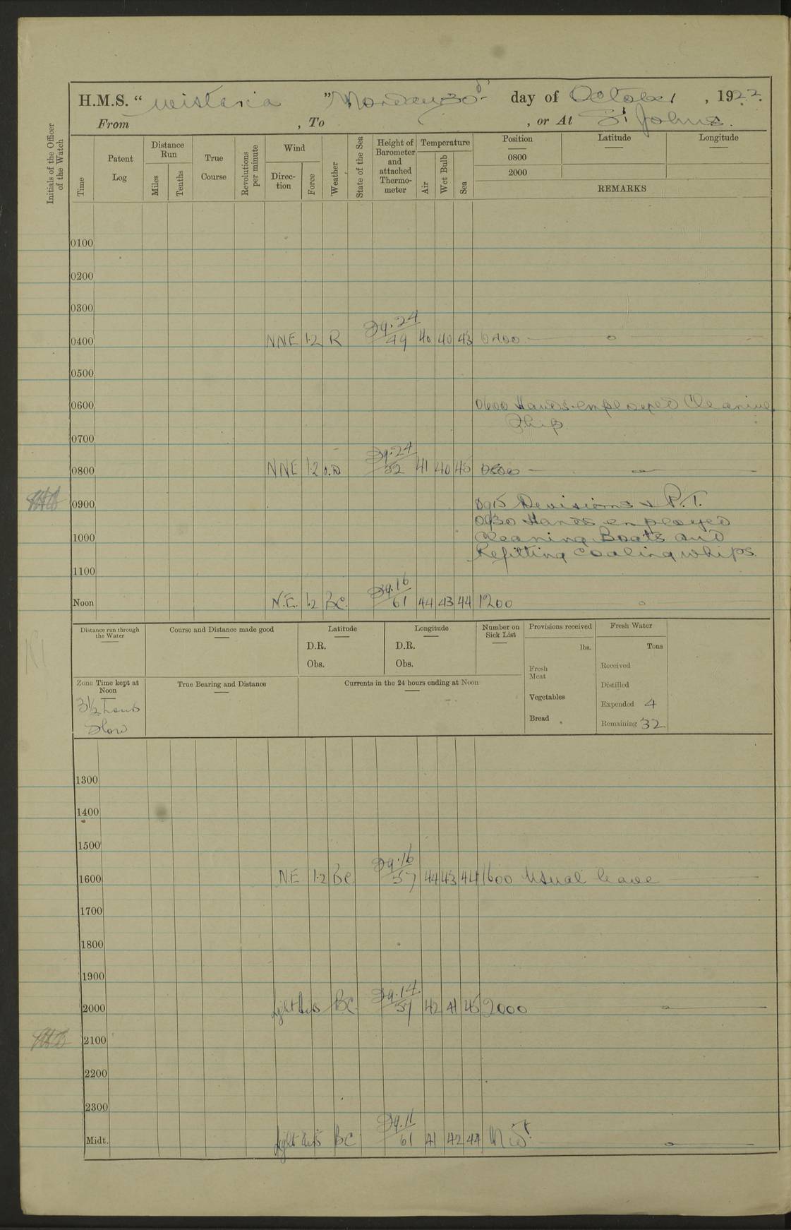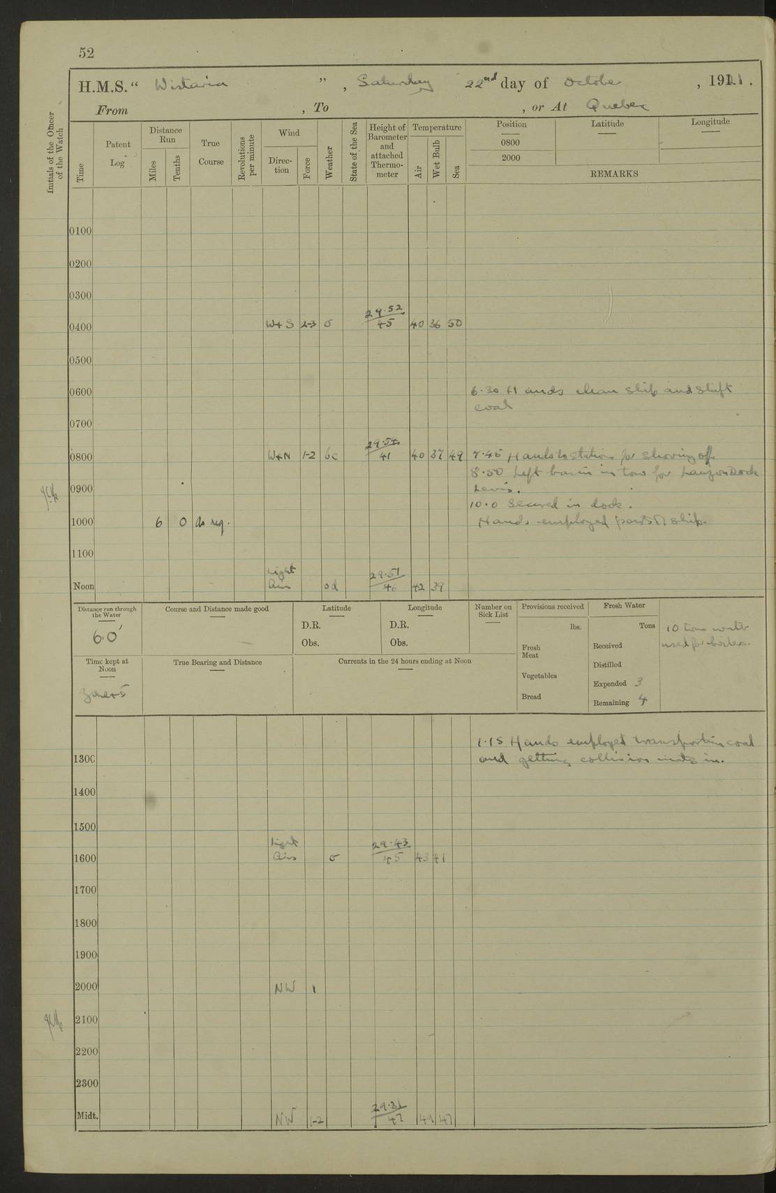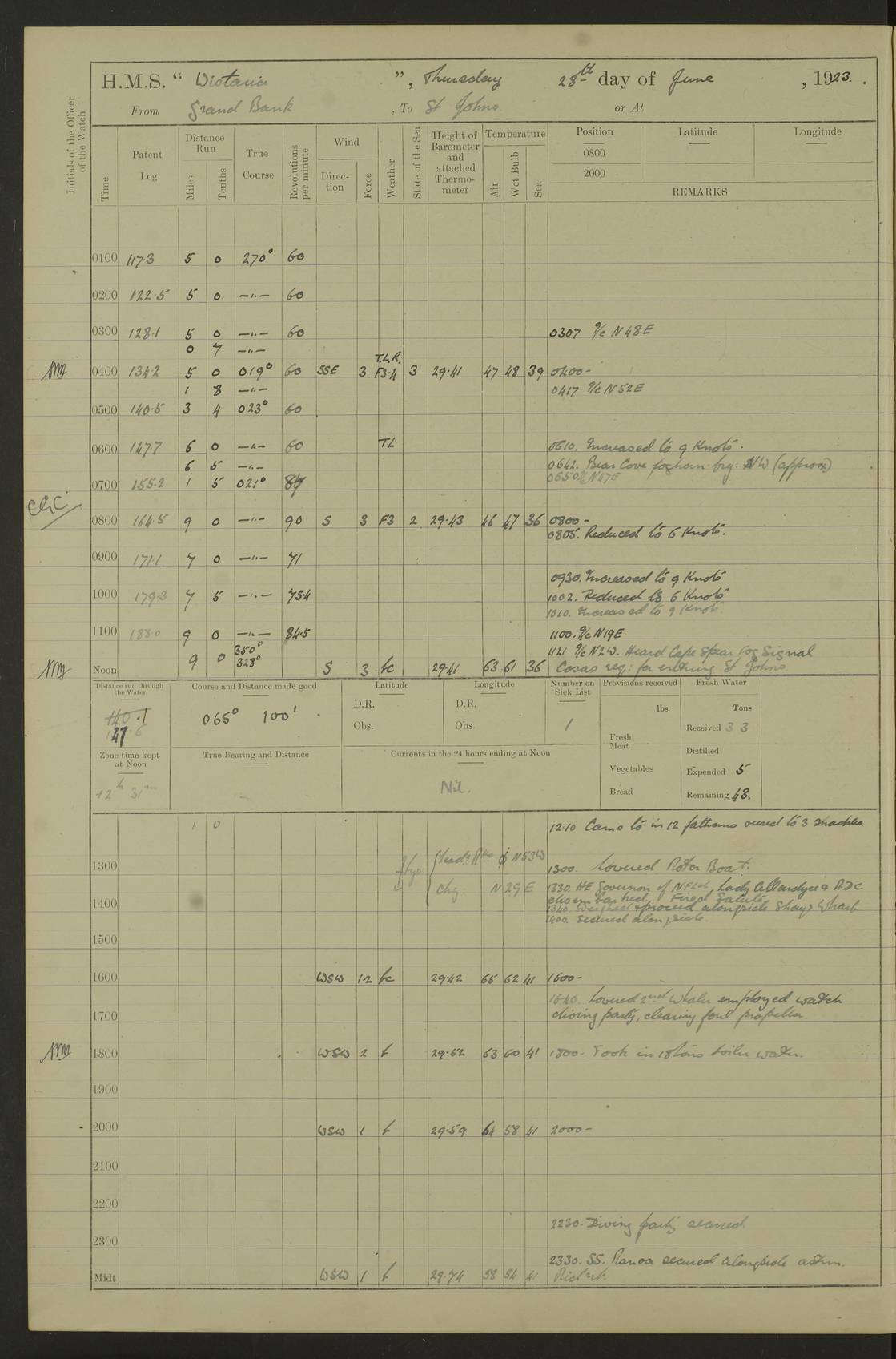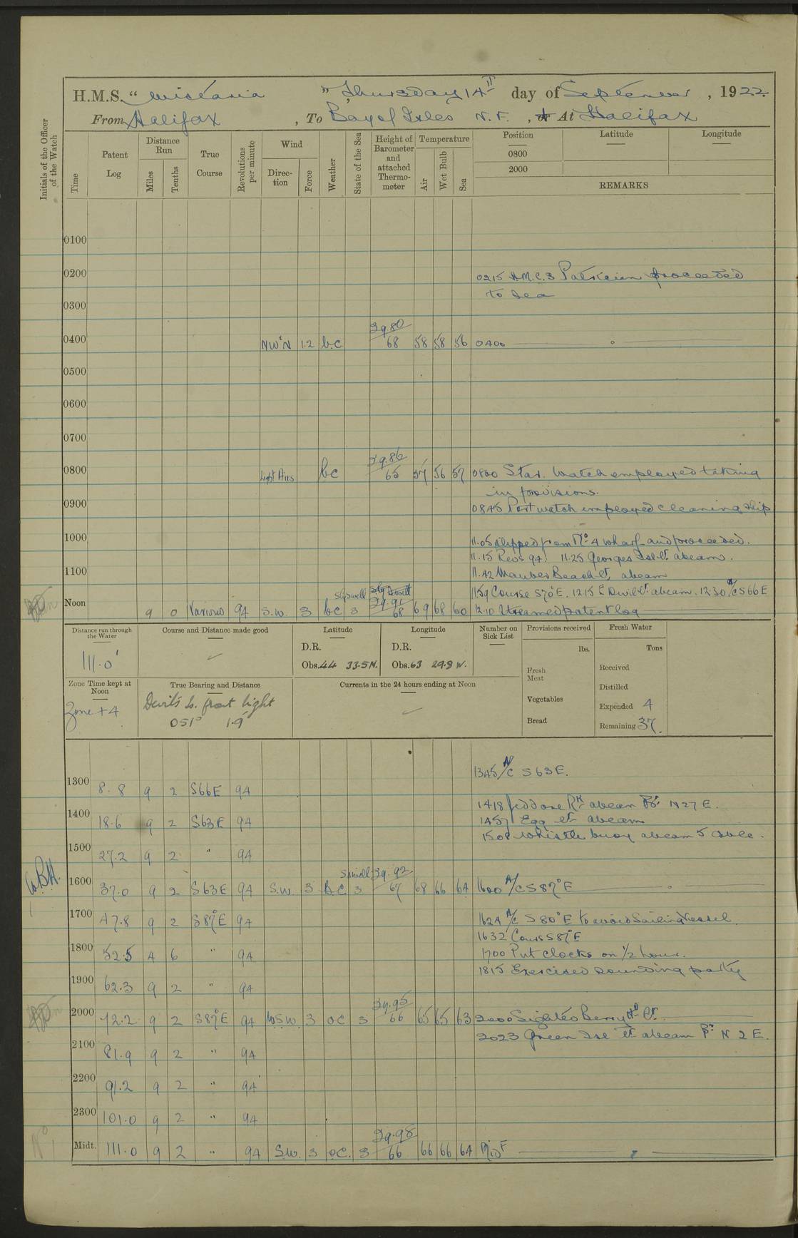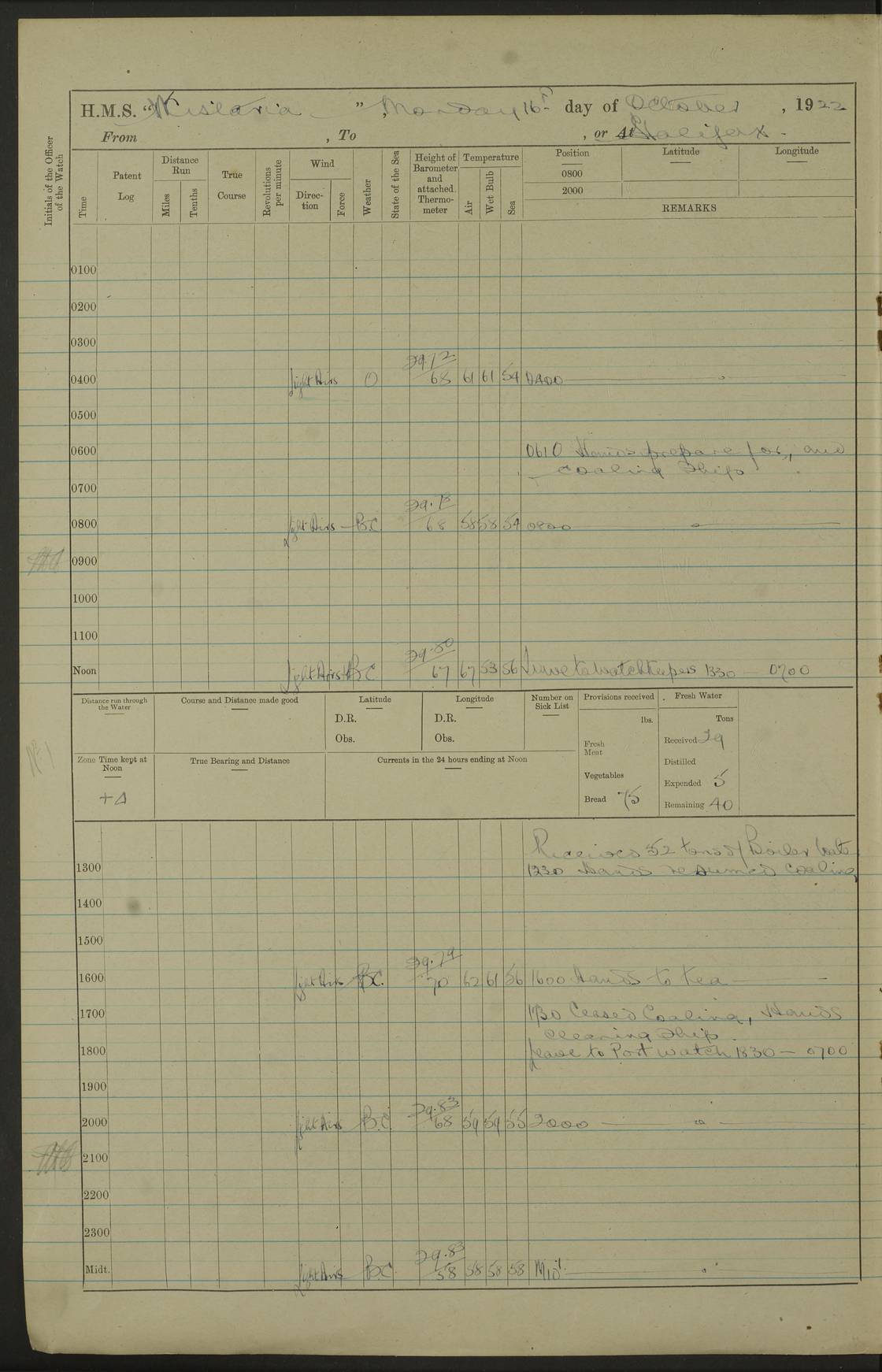 LOGS FOR OCTOBER 1922 4f73cb05a2fc8ea903000c65: (https://s3.amazonaws.com:443/oldweather/ADM53-93270/0003_1.jpg) 1 October 1922 At Forteau Bay Lat 51.46, Long -56.91 6.0am: Hands employed cleaning ship 9.45am: Divisions & Prayers 4f73cb05a2fc8ea903000c66: (https://s3.amazonaws.com:443/oldweather/ADM53-93270/0004_0.jpg) 2 October 1922 At Forteau Bay Lat 51.46, Long -56.91 6.0am: Hands employed cleaning ship 8.30am: Hands employed cleaning out boats and refitting well deck awnings 9.30am: Divisions & P.T. Party of 7 PO and 1 man to “Raleigh” 1.0pm: Hands for monthly payment 1.30pm: Hands employed refitting well deck awning and painting davits, etc 6.45pm: Hoisted Motor Boat 4f73cb05a2fc8ea903000c67: (https://s3.amazonaws.com:443/oldweather/ADM53-93270/0004_1.jpg) 3 October 1922 At Forteau Bay Lat 51.46, Long -56.91 8.30am: Hands employed cleaning out boats and refitting well deck awning am: New ratings to “Lewis gun” instruction pm: 1 hand scrubber lost by accident pm: 3 policemen received from Newfoundland in SS “Portia” 4.20pm: SS “Portia” enters harbour 4.45pm: SS “Portia” leaves 4f73cb06a2fc8ea903000c68: (https://s3.amazonaws.com:443/oldweather/ADM53-93270/0005_0.jpg) 4 October 1922 At Forteau Bay Lat 51.46, Long -56.91 8.30am: Hands employed securing ship for sea 8.45am: Shortened in 9.0am: Weighed and proceeded to Point Amour 9.20am: Anchored in 10 fathoms Anchor Bearings: Anse Amour Pier S65E; Amour Pt, right tangent, S4W; Cliff S11E 10.0am: Hands detailed for “Raleigh” working party 2.0pm: HMS “Raleigh” abandoned 2.15pm: 1 P.O. and 11 hands joined for passage (ex “Raleigh’s”) 3.0pm: Weighed and proceeded 90 revs 4.18pm: Greenly Island Lt Ho abeam, 7.4 miles 4.37pm: Patent log streamed 6.10pm: New Ferolle Pt abeam, 6.5 miles 7.05pm: Sighted Rich Pt bearing S42W 8.11pm: Rich Pt (bow) S15W 8.48pm: Rich Pt (Abeam), dist 5.7 miles. Altered course S52W 4f73cb06a2fc8ea903000c69: (https://s3.amazonaws.com:443/oldweather/ADM53-93270/0005_1.jpg) 5 October 1922 From Forteau Bay to Bonne Bay Lat 49.41, Long -58.25 1.35am: Sighted Cow Head Lt bearing S9W 1.40am: Cow Head Lt bearing S7W (bow), dist 8.3 miles 2.39am: Cow Head Lt bearing S38E (abeam), dist 8.3 miles 3.25am: Sighted Lobster Head Lt bearing S15W 5.20am: Sighted Lobster Point bearing S10E 6.47am: Lobster Cove Head abeam, 1 mile 7.35am: Anchored Bonne Bay 8.45am: Hands employed cleaning after sail room & canteen flat 9.15am: Weighed & proceeded, 90 revs 1.0pm: Altered course South and as requisite for entering Humber Arm, Bay of Isles 3.34pm: Anchored in 10 faths Anchor Bearings: Humber Mouth Pier right tangent S45W; Point, right tangent, S45E; left tangent, Hughes Brook N69E True Bearing and Distance: Gregory Island 192°, 8 miles 4f73cb07a2fc8ea903000c6a: (https://s3.amazonaws.com:443/oldweather/ADM53-93270/0006_0.jpg) 6 October 1922 From Bay of Isles to Halifax Lat 48.88, Long -58.81 6.09am: Weighed & proceeded 90 revs. Course N76W 6.24am: Streamed patent log 7.32am: Frenchman’s Head abeam 8.55am: South Head abeam 9.35am: Little Port Pt abeam, 1 mile 10.27am: Bear Head abeam, 3½ miles 11.15am: Shag Island abeam, 7.2 miles noon: Long Pt Lt Ho bearing S2W 12.10pm: Long Pt Lt House abeam, 6.3 miles 12.30pm: Sighted Red Island bearing S65W 1.0pm: Hauled in patent log 2.0pm: Streamed log 2.50pm: Red Island abeam, 4.5 miles 3.38pm: C. St George abeam, 5.5 miles 8.0pm: South part of C. Anguille abeam, 22½ miles 10.35pm: Sighted steamer bearing S49W 11.45pm: Sighted St Pauls Island True Bearing and Distance: Long Pt Lt Ho 160°, 6.8 miles 4f73cb07a2fc8ea903000c6b: (https://s3.amazonaws.com:443/oldweather/ADM53-93270/0006_1.jpg) 7 October 1922 From Bay of Isles to Halifax Lat 45.85, Long -61.56 12.26am: St Pauls Island Lt abeam, 16 miles 1.06am: Sighted Cape St Lawrence Lt S32W 1.30am: Sighted Money Pt Lt bearing S9E 2.37am: Cape St Lawrence Lt abeam, 7 miles 4.10am: Turned out Starboard sounding boom & took sounding (100 fath) 4.10am: Sighted Chiticamp Pt 5.39am: Sighted Sea Wolf Island bearing S43W 6.14am: Chiticamp Pt abeam, 5.5 miles 8.07am: Sea Wolf Island abeam, 4 miles 11.03am: C Henry Lt Ho abeam, 3 miles 12.07pm: Judique shoal buoy abeam, 1 mile 1.0pm: Course as requisite for Gut of Canso 1.05pm: North Canso Lt House abeam, 1 mile 1.33pm: Balache Pt Lt Ho abeam 2.25pm: Bear Island lighthouse abeam, 0.4 miles. Course SE 4.56pm: Whistle buoy bearing S3W 4.58pm: Altered course S22W. (Put clocks back ½ hour) 4.31pm: Whistle buoy abeam 4.55pm: Cranberry Island Lt Ho abeam 5.39pm: White Rk whistle buoy abeam 6.17pm: White Head Lt abeam, 5 miles 8.18pm: Country Island Lt abeam, 7 miles 9.30pm: Humbolt Rock light buoy bearing N69W 9.39pm: Luscombe Island Lt bearing N40W 10.18pm: Luscombe Island Lt abeam, 8.5 miles 11.05pm: Sighted Beaver Island Lt bearing N65W True Bearing and Distance: North Canso Lt Ho 158°, 10.5 miles [Chiticamp Point: misspelt for Chéticamp Point, the southwestern point of the island] [Luscombe Island: misspelt for Liscomb Island] 4f73cb07a2fc8ea903000c6c: (https://s3.amazonaws.com:443/oldweather/ADM53-93270/0007_0.jpg) 8 October 1922 From Bay of Isles to Halifax and at Halifax Lat 49.41, Long -58.25 0.20am: Beaver Isle abeam, 6 ¼ miles 0.59am: Roach Isle abeam, 9 miles 1.34am: Sighted Egg Island Lt bearing N64W 3.02am: Egg Island Lt abeam, 7.5 miles 3.25am: Sighted Jeddore Lt bearing N15W 5.30am: Sighted Whistle buoy bearing N60W 5.50am: Whistle buoy abeam, 1 mile 6.30am: Sighted Chebucto Head lighthouse bearing S88W 6.38am: Portuguese shoal whistle buoy abeam. Altered course North 7.08am: Manger Beach Lt abeam 7.10am: Hauled in patent log 7.45am: Secured alongside Number 4 wharf 9.0am: Hands employed cleaning up decks for divisions 4f73cb08a2fc8ea903000c6d: (https://s3.amazonaws.com:443/oldweather/ADM53-93270/0007_1.jpg) 9 October 1922 At Halifax Lat 44.69, Long -63.64 8.30am: Hands employed in getting out “Raleigh’s” boats 9.05am: HMCS “Patriot” proceeded to Sea 1.