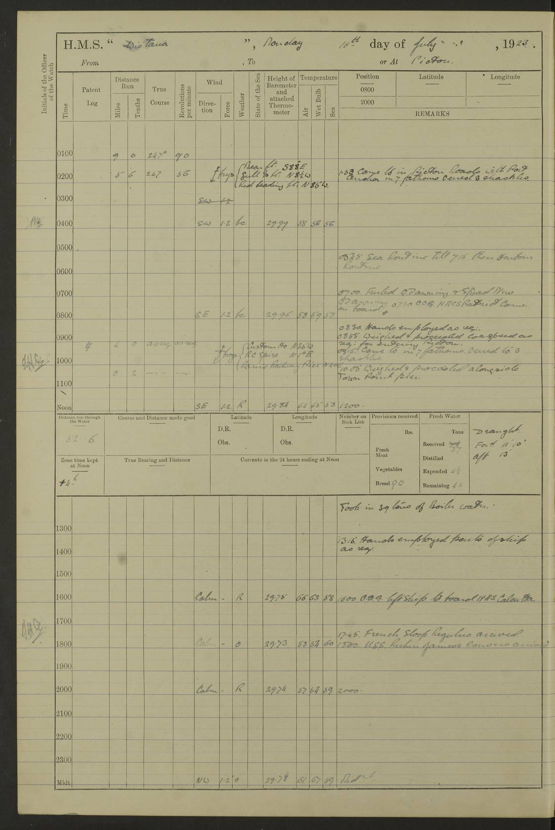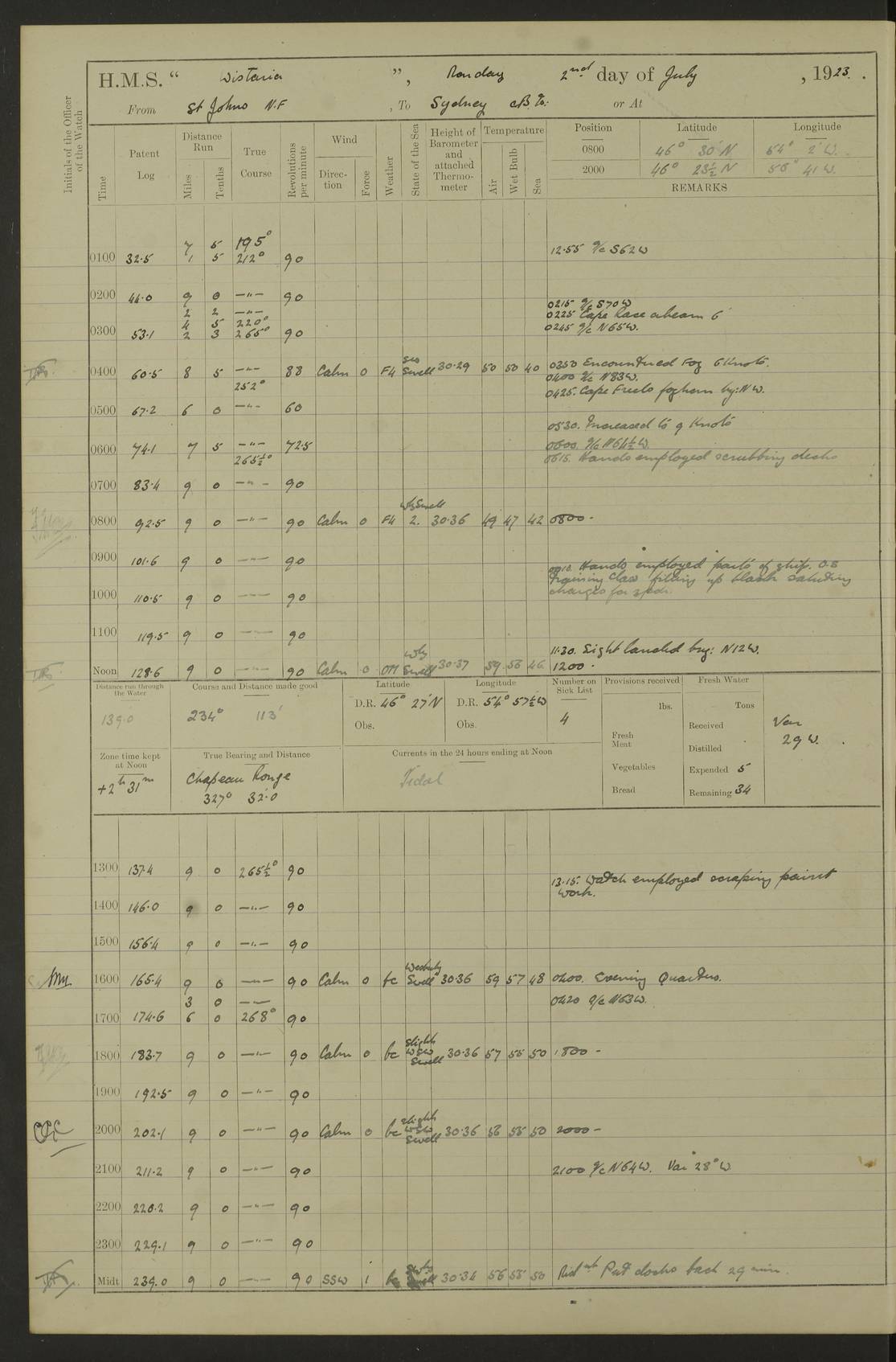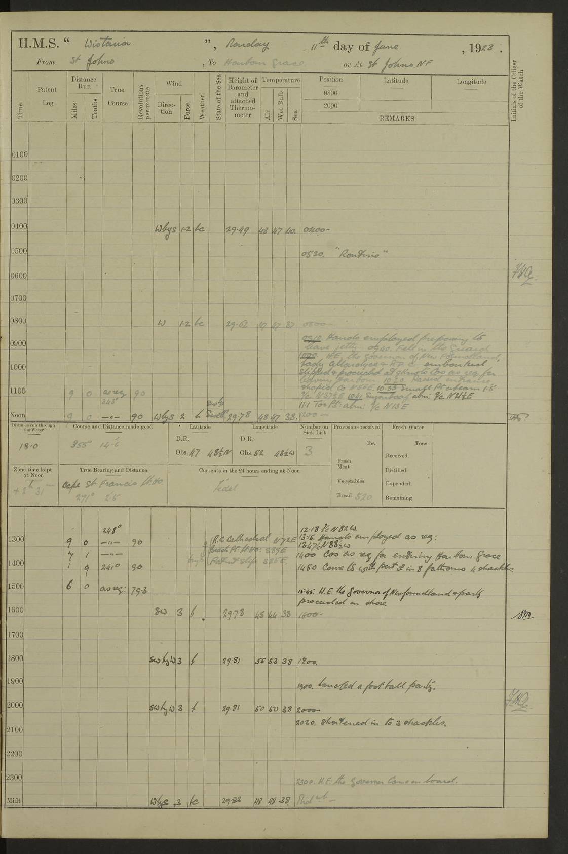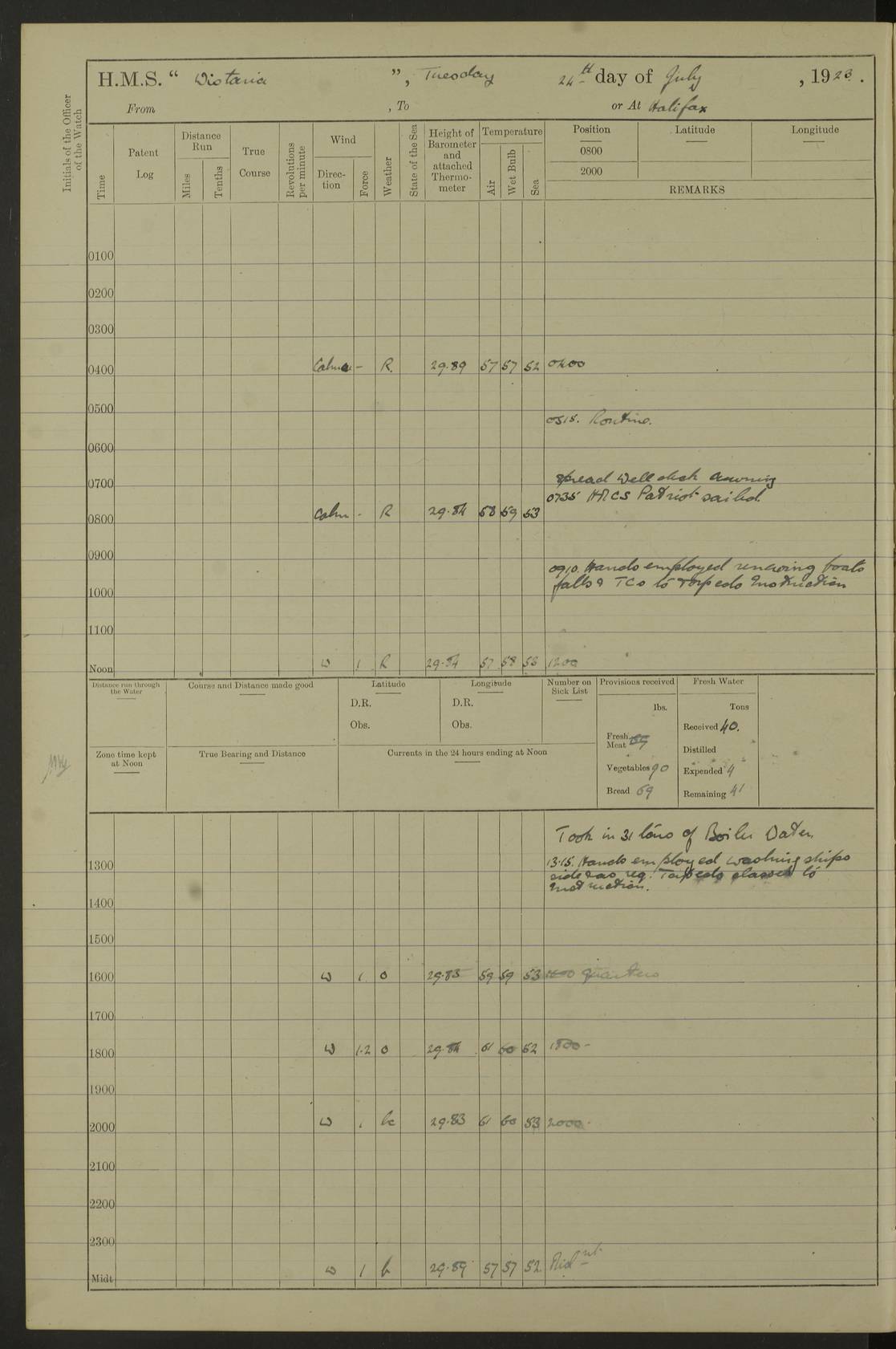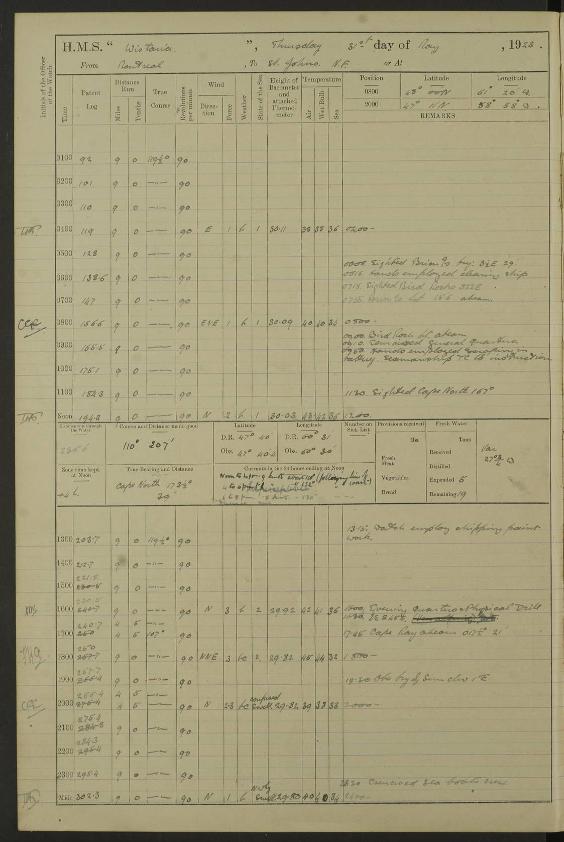 LOGS FOR OCTOBER 1922 4f73cb05a2fc8ea903000c65: (https://s3.amazonaws.com:443/oldweather/ADM53-93270/0003_1.jpg) 1 October 1922 At Forteau Bay Lat 51.46, Long -56.91 6.0am: Hands employed cleaning ship 9.45am: Divisions & Prayers 4f73cb05a2fc8ea903000c66: (https://s3.amazonaws.com:443/oldweather/ADM53-93270/0004_0.jpg) 2 October 1922 At Forteau Bay Lat 51.46, Long -56.91 6.0am: Hands employed cleaning ship 8.30am: Hands employed cleaning out boats and refitting well deck awnings 9.30am: Divisions & P.T. Party of 7 PO and 1 man to “Raleigh” 1.0pm: Hands for monthly payment 1.30pm: Hands employed refitting well deck awning and painting davits, etc 6.45pm: Hoisted Motor Boat 4f73cb05a2fc8ea903000c67: (https://s3.amazonaws.com:443/oldweather/ADM53-93270/0004_1.jpg) 3 October 1922 At Forteau Bay Lat 51.46, Long -56.91 8.30am: Hands employed cleaning out boats and refitting well deck awning am: New ratings to “Lewis gun” instruction pm: 1 hand scrubber lost by accident pm: 3 policemen received from Newfoundland in SS “Portia” 4.20pm: SS “Portia” enters harbour 4.45pm: SS “Portia” leaves 4f73cb06a2fc8ea903000c68: (https://s3.amazonaws.com:443/oldweather/ADM53-93270/0005_0.jpg) 4 October 1922 At Forteau Bay Lat 51.46, Long -56.91 8.30am: Hands employed securing ship for sea 8.45am: Shortened in 9.0am: Weighed and proceeded to Point Amour 9.20am: Anchored in 10 fathoms Anchor Bearings: Anse Amour Pier S65E; Amour Pt, right tangent, S4W; Cliff S11E 10.0am: Hands detailed for “Raleigh” working party 2.0pm: HMS “Raleigh” abandoned 2.15pm: 1 P.O. and 11 hands joined for passage (ex “Raleigh’s”) 3.0pm: Weighed and proceeded 90 revs 4.18pm: Greenly Island Lt Ho abeam, 7.4 miles 4.37pm: Patent log streamed 6.10pm: New Ferolle Pt abeam, 6.5 miles 7.05pm: Sighted Rich Pt bearing S42W 8.11pm: Rich Pt (bow) S15W 8.48pm: Rich Pt (Abeam), dist 5.7 miles. Altered course S52W 4f73cb06a2fc8ea903000c69: (https://s3.amazonaws.com:443/oldweather/ADM53-93270/0005_1.jpg) 5 October 1922 From Forteau Bay to Bonne Bay Lat 49.41, Long -58.25 1.35am: Sighted Cow Head Lt bearing S9W 1.40am: Cow Head Lt bearing S7W (bow), dist 8.3 miles 2.39am: Cow Head Lt bearing S38E (abeam), dist 8.3 miles 3.25am: Sighted Lobster Head Lt bearing S15W 5.20am: Sighted Lobster Point bearing S10E 6.47am: Lobster Cove Head abeam, 1 mile 7.35am: Anchored Bonne Bay 8.45am: Hands employed cleaning after sail room & canteen flat 9.15am: Weighed & proceeded, 90 revs 1.0pm: Altered course South and as requisite for entering Humber Arm, Bay of Isles 3.34pm: Anchored in 10 faths Anchor Bearings: Humber Mouth Pier right tangent S45W; Point, right tangent, S45E; left tangent, Hughes Brook N69E True Bearing and Distance: Gregory Island 192°, 8 miles 4f73cb07a2fc8ea903000c6a: (https://s3.amazonaws.com:443/oldweather/ADM53-93270/0006_0.jpg) 6 October 1922 From Bay of Isles to Halifax Lat 48.88, Long -58.81 6.09am: Weighed & proceeded 90 revs. Course N76W 6.24am: Streamed patent log 7.32am: Frenchman’s Head abeam 8.55am: South Head abeam 9.35am: Little Port Pt abeam, 1 mile 10.27am: Bear Head abeam, 3½ miles 11.15am: Shag Island abeam, 7.2 miles noon: Long Pt Lt Ho bearing S2W 12.10pm: Long Pt Lt House abeam, 6.3 miles 12.30pm: Sighted Red Island bearing S65W 1.0pm: Hauled in patent log 2.0pm: Streamed log 2.50pm: Red Island abeam, 4.5 miles 3.38pm: C. St George abeam, 5.5 miles 8.0pm: South part of C. Anguille abeam, 22½ miles 10.35pm: Sighted steamer bearing S49W 11.45pm: Sighted St Pauls Island True Bearing and Distance: Long Pt Lt Ho 160°, 6.8 miles 4f73cb07a2fc8ea903000c6b: (https://s3.amazonaws.com:443/oldweather/ADM53-93270/0006_1.jpg) 7 October 1922 From Bay of Isles to Halifax Lat 45.85, Long -61.56 12.26am: St Pauls Island Lt abeam, 16 miles 1.06am: Sighted Cape St Lawrence Lt S32W 1.30am: Sighted Money Pt Lt bearing S9E 2.37am: Cape St Lawrence Lt abeam, 7 miles 4.10am: Turned out Starboard sounding boom & took sounding (100 fath) 4.10am: Sighted Chiticamp Pt 5.39am: Sighted Sea Wolf Island bearing S43W 6.14am: Chiticamp Pt abeam, 5.5 miles 8.07am: Sea Wolf Island abeam, 4 miles 11.03am: C Henry Lt Ho abeam, 3 miles 12.07pm: Judique shoal buoy abeam, 1 mile 1.0pm: Course as requisite for Gut of Canso 1.05pm: North Canso Lt House abeam, 1 mile 1.33pm: Balache Pt Lt Ho abeam 2.25pm: Bear Island lighthouse abeam, 0.4 miles. Course SE 4.56pm: Whistle buoy bearing S3W 4.58pm: Altered course S22W. (Put clocks back ½ hour) 4.31pm: Whistle buoy abeam 4.55pm: Cranberry Island Lt Ho abeam 5.39pm: White Rk whistle buoy abeam 6.17pm: White Head Lt abeam, 5 miles 8.18pm: Country Island Lt abeam, 7 miles 9.30pm: Humbolt Rock light buoy bearing N69W 9.39pm: Luscombe Island Lt bearing N40W 10.18pm: Luscombe Island Lt abeam, 8.5 miles 11.05pm: Sighted Beaver Island Lt bearing N65W True Bearing and Distance: North Canso Lt Ho 158°, 10.5 miles [Chiticamp Point: misspelt for Chéticamp Point, the southwestern point of the island] [Luscombe Island: misspelt for Liscomb Island] 4f73cb07a2fc8ea903000c6c: (https://s3.amazonaws.com:443/oldweather/ADM53-93270/0007_0.jpg) 8 October 1922 From Bay of Isles to Halifax and at Halifax Lat 49.41, Long -58.25 0.20am: Beaver Isle abeam, 6 ¼ miles 0.59am: Roach Isle abeam, 9 miles 1.34am: Sighted Egg Island Lt bearing N64W 3.02am: Egg Island Lt abeam, 7.5 miles 3.25am: Sighted Jeddore Lt bearing N15W 5.30am: Sighted Whistle buoy bearing N60W 5.50am: Whistle buoy abeam, 1 mile 6.30am: Sighted Chebucto Head lighthouse bearing S88W 6.38am: Portuguese shoal whistle buoy abeam. Altered course North 7.08am: Manger Beach Lt abeam 7.10am: Hauled in patent log 7.45am: Secured alongside Number 4 wharf 9.0am: Hands employed cleaning up decks for divisions 4f73cb08a2fc8ea903000c6d: (https://s3.amazonaws.com:443/oldweather/ADM53-93270/0007_1.jpg) 9 October 1922 At Halifax Lat 44.69, Long -63.64 8.30am: Hands employed in getting out “Raleigh’s” boats 9.05am: HMCS “Patriot” proceeded to Sea 1.