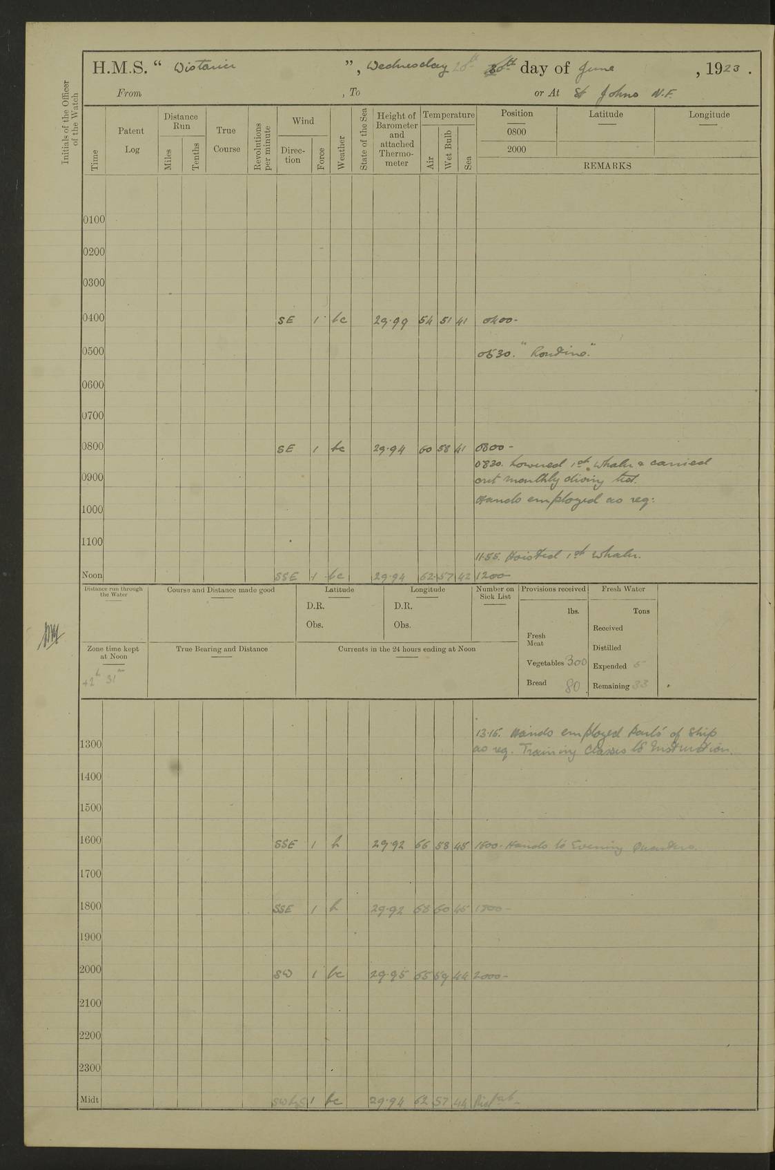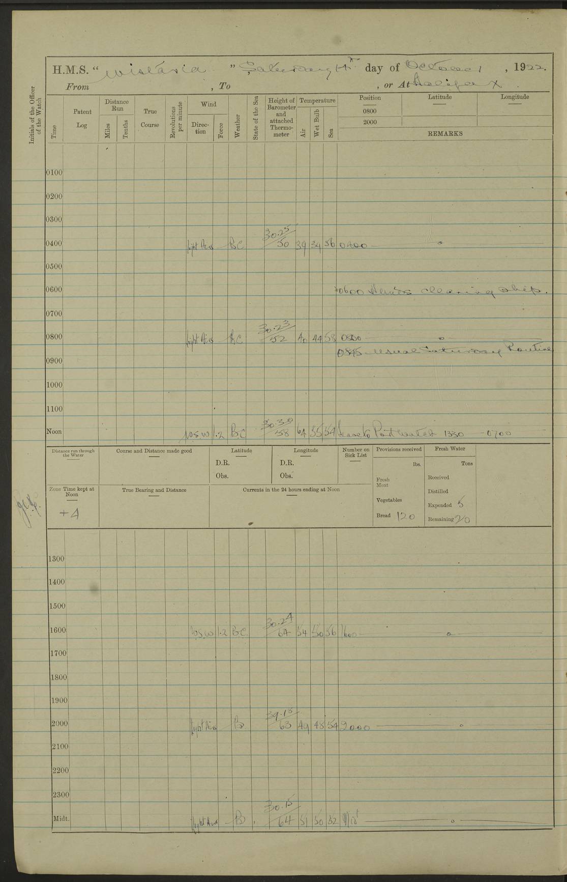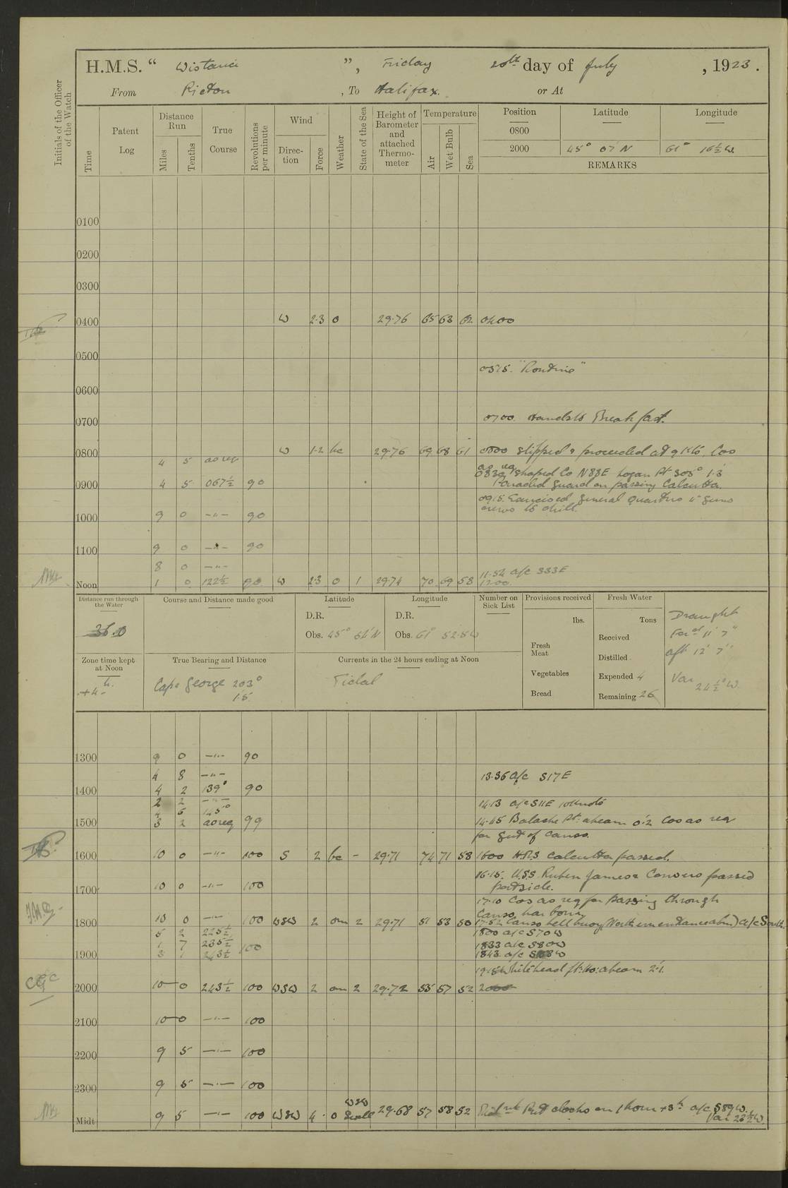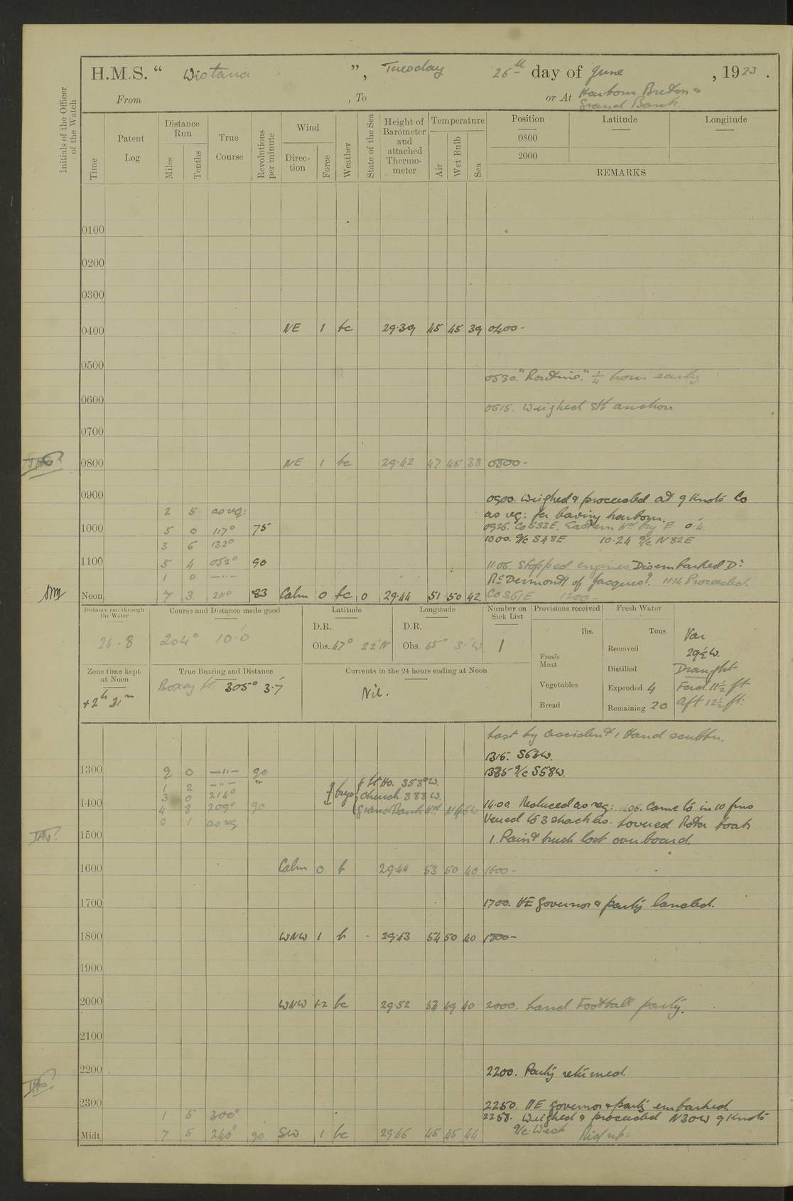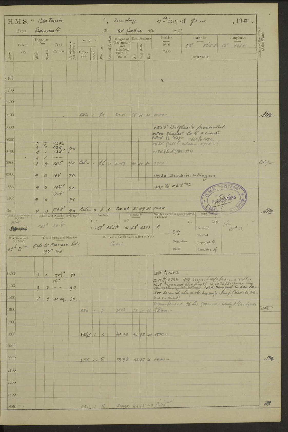 LOGS FOR OCTOBER 1922 4f73cb05a2fc8ea903000c65: (https://s3.amazonaws.com:443/oldweather/ADM53-93270/0003_1.jpg) 1 October 1922 At Forteau Bay Lat 51.46, Long -56.91 6.0am: Hands employed cleaning ship 9.45am: Divisions & Prayers 4f73cb05a2fc8ea903000c66: (https://s3.amazonaws.com:443/oldweather/ADM53-93270/0004_0.jpg) 2 October 1922 At Forteau Bay Lat 51.46, Long -56.91 6.0am: Hands employed cleaning ship 8.30am: Hands employed cleaning out boats and refitting well deck awnings 9.30am: Divisions & P.T. Party of 7 PO and 1 man to “Raleigh” 1.0pm: Hands for monthly payment 1.30pm: Hands employed refitting well deck awning and painting davits, etc 6.45pm: Hoisted Motor Boat 4f73cb05a2fc8ea903000c67: (https://s3.amazonaws.com:443/oldweather/ADM53-93270/0004_1.jpg) 3 October 1922 At Forteau Bay Lat 51.46, Long -56.91 8.30am: Hands employed cleaning out boats and refitting well deck awning am: New ratings to “Lewis gun” instruction pm: 1 hand scrubber lost by accident pm: 3 policemen received from Newfoundland in SS “Portia” 4.20pm: SS “Portia” enters harbour 4.45pm: SS “Portia” leaves 4f73cb06a2fc8ea903000c68: (https://s3.amazonaws.com:443/oldweather/ADM53-93270/0005_0.jpg) 4 October 1922 At Forteau Bay Lat 51.46, Long -56.91 8.30am: Hands employed securing ship for sea 8.45am: Shortened in 9.0am: Weighed and proceeded to Point Amour 9.20am: Anchored in 10 fathoms Anchor Bearings: Anse Amour Pier S65E; Amour Pt, right tangent, S4W; Cliff S11E 10.0am: Hands detailed for “Raleigh” working party 2.0pm: HMS “Raleigh” abandoned 2.15pm: 1 P.O. and 11 hands joined for passage (ex “Raleigh’s”) 3.0pm: Weighed and proceeded 90 revs 4.18pm: Greenly Island Lt Ho abeam, 7.4 miles 4.37pm: Patent log streamed 6.10pm: New Ferolle Pt abeam, 6.5 miles 7.05pm: Sighted Rich Pt bearing S42W 8.11pm: Rich Pt (bow) S15W 8.48pm: Rich Pt (Abeam), dist 5.7 miles. Altered course S52W 4f73cb06a2fc8ea903000c69: (https://s3.amazonaws.com:443/oldweather/ADM53-93270/0005_1.jpg) 5 October 1922 From Forteau Bay to Bonne Bay Lat 49.41, Long -58.25 1.35am: Sighted Cow Head Lt bearing S9W 1.40am: Cow Head Lt bearing S7W (bow), dist 8.3 miles 2.39am: Cow Head Lt bearing S38E (abeam), dist 8.3 miles 3.25am: Sighted Lobster Head Lt bearing S15W 5.20am: Sighted Lobster Point bearing S10E 6.47am: Lobster Cove Head abeam, 1 mile 7.35am: Anchored Bonne Bay 8.45am: Hands employed cleaning after sail room & canteen flat 9.15am: Weighed & proceeded, 90 revs 1.0pm: Altered course South and as requisite for entering Humber Arm, Bay of Isles 3.34pm: Anchored in 10 faths Anchor Bearings: Humber Mouth Pier right tangent S45W; Point, right tangent, S45E; left tangent, Hughes Brook N69E True Bearing and Distance: Gregory Island 192°, 8 miles 4f73cb07a2fc8ea903000c6a: (https://s3.amazonaws.com:443/oldweather/ADM53-93270/0006_0.jpg) 6 October 1922 From Bay of Isles to Halifax Lat 48.88, Long -58.81 6.09am: Weighed & proceeded 90 revs. Course N76W 6.24am: Streamed patent log 7.32am: Frenchman’s Head abeam 8.55am: South Head abeam 9.35am: Little Port Pt abeam, 1 mile 10.27am: Bear Head abeam, 3½ miles 11.15am: Shag Island abeam, 7.2 miles noon: Long Pt Lt Ho bearing S2W 12.10pm: Long Pt Lt House abeam, 6.3 miles 12.30pm: Sighted Red Island bearing S65W 1.0pm: Hauled in patent log 2.0pm: Streamed log 2.50pm: Red Island abeam, 4.5 miles 3.38pm: C. St George abeam, 5.5 miles 8.0pm: South part of C. Anguille abeam, 22½ miles 10.35pm: Sighted steamer bearing S49W 11.45pm: Sighted St Pauls Island True Bearing and Distance: Long Pt Lt Ho 160°, 6.8 miles 4f73cb07a2fc8ea903000c6b: (https://s3.amazonaws.com:443/oldweather/ADM53-93270/0006_1.jpg) 7 October 1922 From Bay of Isles to Halifax Lat 45.85, Long -61.56 12.26am: St Pauls Island Lt abeam, 16 miles 1.06am: Sighted Cape St Lawrence Lt S32W 1.30am: Sighted Money Pt Lt bearing S9E 2.37am: Cape St Lawrence Lt abeam, 7 miles 4.10am: Turned out Starboard sounding boom & took sounding (100 fath) 4.10am: Sighted Chiticamp Pt 5.39am: Sighted Sea Wolf Island bearing S43W 6.14am: Chiticamp Pt abeam, 5.5 miles 8.07am: Sea Wolf Island abeam, 4 miles 11.03am: C Henry Lt Ho abeam, 3 miles 12.07pm: Judique shoal buoy abeam, 1 mile 1.0pm: Course as requisite for Gut of Canso 1.05pm: North Canso Lt House abeam, 1 mile 1.33pm: Balache Pt Lt Ho abeam 2.25pm: Bear Island lighthouse abeam, 0.4 miles. Course SE 4.56pm: Whistle buoy bearing S3W 4.58pm: Altered course S22W. (Put clocks back ½ hour) 4.31pm: Whistle buoy abeam 4.55pm: Cranberry Island Lt Ho abeam 5.39pm: White Rk whistle buoy abeam 6.17pm: White Head Lt abeam, 5 miles 8.18pm: Country Island Lt abeam, 7 miles 9.30pm: Humbolt Rock light buoy bearing N69W 9.39pm: Luscombe Island Lt bearing N40W 10.18pm: Luscombe Island Lt abeam, 8.5 miles 11.05pm: Sighted Beaver Island Lt bearing N65W True Bearing and Distance: North Canso Lt Ho 158°, 10.5 miles [Chiticamp Point: misspelt for Chéticamp Point, the southwestern point of the island] [Luscombe Island: misspelt for Liscomb Island] 4f73cb07a2fc8ea903000c6c: (https://s3.amazonaws.com:443/oldweather/ADM53-93270/0007_0.jpg) 8 October 1922 From Bay of Isles to Halifax and at Halifax Lat 49.41, Long -58.25 0.20am: Beaver Isle abeam, 6 ¼ miles 0.59am: Roach Isle abeam, 9 miles 1.34am: Sighted Egg Island Lt bearing N64W 3.02am: Egg Island Lt abeam, 7.5 miles 3.25am: Sighted Jeddore Lt bearing N15W 5.30am: Sighted Whistle buoy bearing N60W 5.50am: Whistle buoy abeam, 1 mile 6.30am: Sighted Chebucto Head lighthouse bearing S88W 6.38am: Portuguese shoal whistle buoy abeam. Altered course North 7.08am: Manger Beach Lt abeam 7.10am: Hauled in patent log 7.45am: Secured alongside Number 4 wharf 9.0am: Hands employed cleaning up decks for divisions 4f73cb08a2fc8ea903000c6d: (https://s3.amazonaws.com:443/oldweather/ADM53-93270/0007_1.jpg) 9 October 1922 At Halifax Lat 44.69, Long -63.64 8.30am: Hands employed in getting out “Raleigh’s” boats 9.05am: HMCS “Patriot” proceeded to Sea 1.