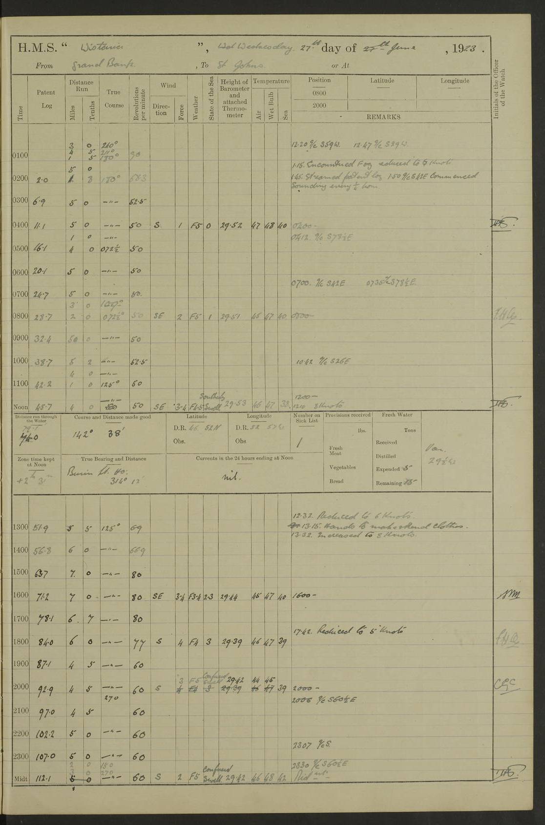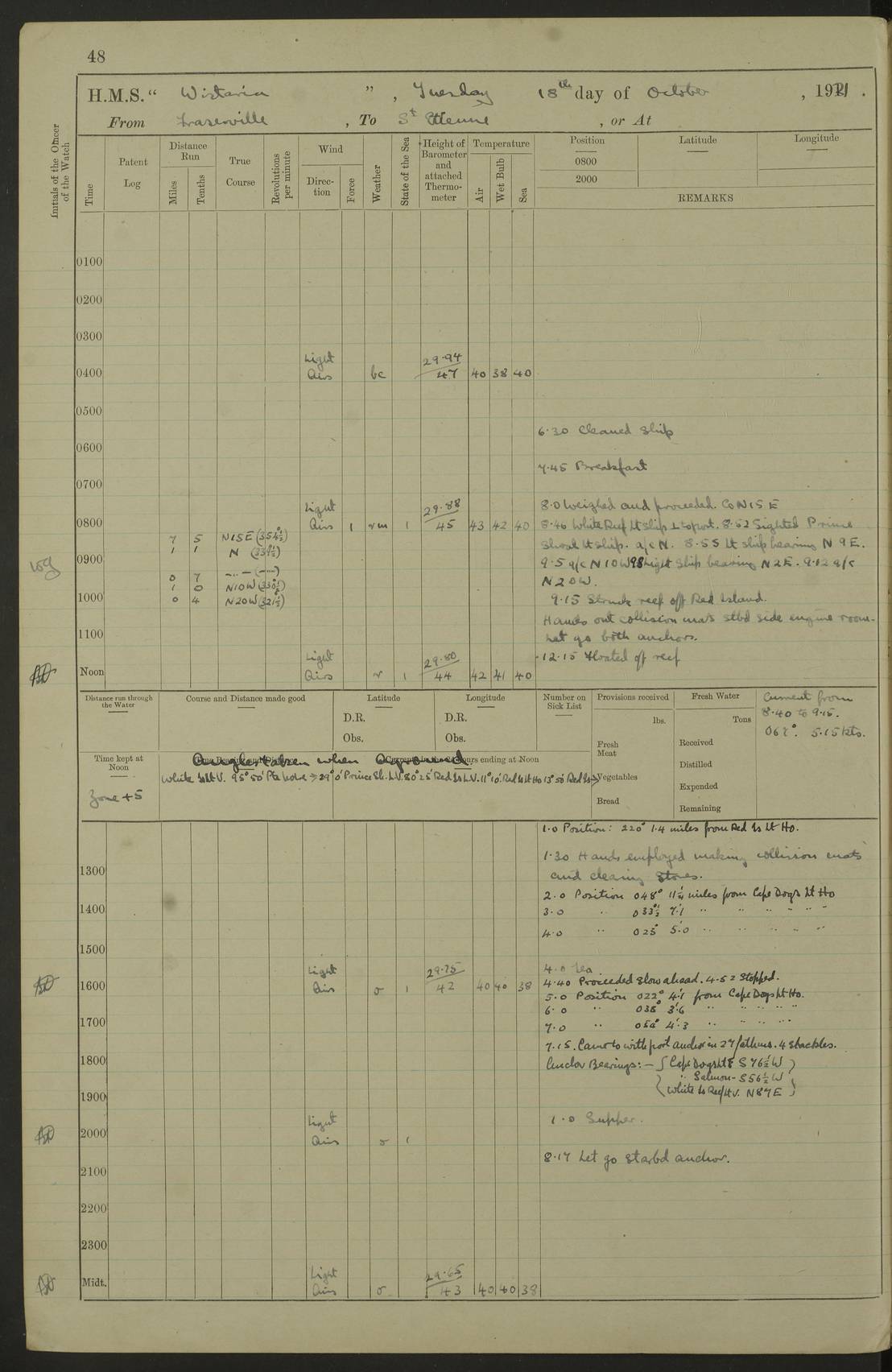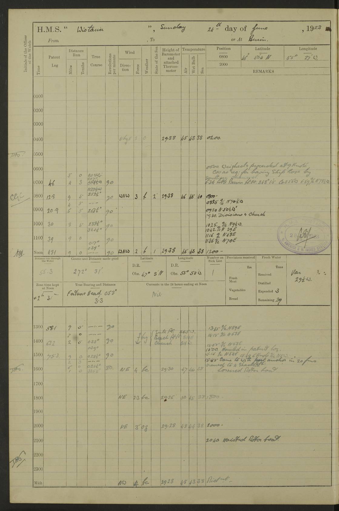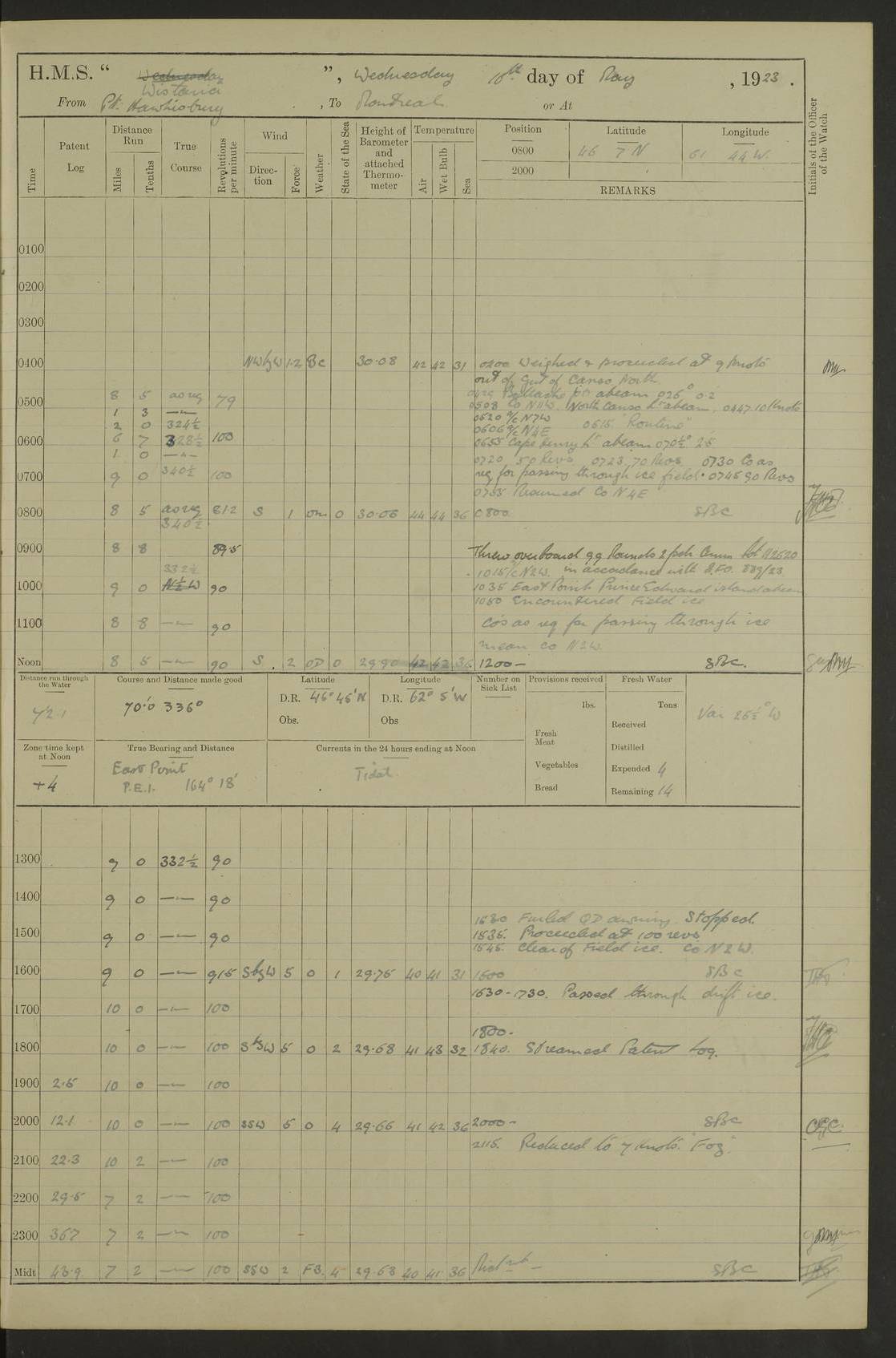 LOGS FOR OCTOBER 1922 4f73cb05a2fc8ea903000c65: (https://s3.amazonaws.com:443/oldweather/ADM53-93270/0003_1.jpg) 1 October 1922 At Forteau Bay Lat 51.46, Long -56.91 6.0am: Hands employed cleaning ship 9.45am: Divisions & Prayers 4f73cb05a2fc8ea903000c66: (https://s3.amazonaws.com:443/oldweather/ADM53-93270/0004_0.jpg) 2 October 1922 At Forteau Bay Lat 51.46, Long -56.91 6.0am: Hands employed cleaning ship 8.30am: Hands employed cleaning out boats and refitting well deck awnings 9.30am: Divisions & P.T. Party of 7 PO and 1 man to “Raleigh” 1.0pm: Hands for monthly payment 1.30pm: Hands employed refitting well deck awning and painting davits, etc 6.45pm: Hoisted Motor Boat 4f73cb05a2fc8ea903000c67: (https://s3.amazonaws.com:443/oldweather/ADM53-93270/0004_1.jpg) 3 October 1922 At Forteau Bay Lat 51.46, Long -56.91 8.30am: Hands employed cleaning out boats and refitting well deck awning am: New ratings to “Lewis gun” instruction pm: 1 hand scrubber lost by accident pm: 3 policemen received from Newfoundland in SS “Portia” 4.20pm: SS “Portia” enters harbour 4.45pm: SS “Portia” leaves 4f73cb06a2fc8ea903000c68: (https://s3.amazonaws.com:443/oldweather/ADM53-93270/0005_0.jpg) 4 October 1922 At Forteau Bay Lat 51.46, Long -56.91 8.30am: Hands employed securing ship for sea 8.45am: Shortened in 9.0am: Weighed and proceeded to Point Amour 9.20am: Anchored in 10 fathoms Anchor Bearings: Anse Amour Pier S65E; Amour Pt, right tangent, S4W; Cliff S11E 10.0am: Hands detailed for “Raleigh” working party 2.0pm: HMS “Raleigh” abandoned 2.15pm: 1 P.O. and 11 hands joined for passage (ex “Raleigh’s”) 3.0pm: Weighed and proceeded 90 revs 4.18pm: Greenly Island Lt Ho abeam, 7.4 miles 4.37pm: Patent log streamed 6.10pm: New Ferolle Pt abeam, 6.5 miles 7.05pm: Sighted Rich Pt bearing S42W 8.11pm: Rich Pt (bow) S15W 8.48pm: Rich Pt (Abeam), dist 5.7 miles. Altered course S52W 4f73cb06a2fc8ea903000c69: (https://s3.amazonaws.com:443/oldweather/ADM53-93270/0005_1.jpg) 5 October 1922 From Forteau Bay to Bonne Bay Lat 49.41, Long -58.25 1.35am: Sighted Cow Head Lt bearing S9W 1.40am: Cow Head Lt bearing S7W (bow), dist 8.3 miles 2.39am: Cow Head Lt bearing S38E (abeam), dist 8.3 miles 3.25am: Sighted Lobster Head Lt bearing S15W 5.20am: Sighted Lobster Point bearing S10E 6.47am: Lobster Cove Head abeam, 1 mile 7.35am: Anchored Bonne Bay 8.45am: Hands employed cleaning after sail room & canteen flat 9.15am: Weighed & proceeded, 90 revs 1.0pm: Altered course South and as requisite for entering Humber Arm, Bay of Isles 3.34pm: Anchored in 10 faths Anchor Bearings: Humber Mouth Pier right tangent S45W; Point, right tangent, S45E; left tangent, Hughes Brook N69E True Bearing and Distance: Gregory Island 192°, 8 miles 4f73cb07a2fc8ea903000c6a: (https://s3.amazonaws.com:443/oldweather/ADM53-93270/0006_0.jpg) 6 October 1922 From Bay of Isles to Halifax Lat 48.88, Long -58.81 6.09am: Weighed & proceeded 90 revs. Course N76W 6.24am: Streamed patent log 7.32am: Frenchman’s Head abeam 8.55am: South Head abeam 9.35am: Little Port Pt abeam, 1 mile 10.27am: Bear Head abeam, 3½ miles 11.15am: Shag Island abeam, 7.2 miles noon: Long Pt Lt Ho bearing S2W 12.10pm: Long Pt Lt House abeam, 6.3 miles 12.30pm: Sighted Red Island bearing S65W 1.0pm: Hauled in patent log 2.0pm: Streamed log 2.50pm: Red Island abeam, 4.5 miles 3.38pm: C. St George abeam, 5.5 miles 8.0pm: South part of C. Anguille abeam, 22½ miles 10.35pm: Sighted steamer bearing S49W 11.45pm: Sighted St Pauls Island True Bearing and Distance: Long Pt Lt Ho 160°, 6.8 miles 4f73cb07a2fc8ea903000c6b: (https://s3.amazonaws.com:443/oldweather/ADM53-93270/0006_1.jpg) 7 October 1922 From Bay of Isles to Halifax Lat 45.85, Long -61.56 12.26am: St Pauls Island Lt abeam, 16 miles 1.06am: Sighted Cape St Lawrence Lt S32W 1.30am: Sighted Money Pt Lt bearing S9E 2.37am: Cape St Lawrence Lt abeam, 7 miles 4.10am: Turned out Starboard sounding boom & took sounding (100 fath) 4.10am: Sighted Chiticamp Pt 5.39am: Sighted Sea Wolf Island bearing S43W 6.14am: Chiticamp Pt abeam, 5.5 miles 8.07am: Sea Wolf Island abeam, 4 miles 11.03am: C Henry Lt Ho abeam, 3 miles 12.07pm: Judique shoal buoy abeam, 1 mile 1.0pm: Course as requisite for Gut of Canso 1.05pm: North Canso Lt House abeam, 1 mile 1.33pm: Balache Pt Lt Ho abeam 2.25pm: Bear Island lighthouse abeam, 0.4 miles. Course SE 4.56pm: Whistle buoy bearing S3W 4.58pm: Altered course S22W. (Put clocks back ½ hour) 4.31pm: Whistle buoy abeam 4.55pm: Cranberry Island Lt Ho abeam 5.39pm: White Rk whistle buoy abeam 6.17pm: White Head Lt abeam, 5 miles 8.18pm: Country Island Lt abeam, 7 miles 9.30pm: Humbolt Rock light buoy bearing N69W 9.39pm: Luscombe Island Lt bearing N40W 10.18pm: Luscombe Island Lt abeam, 8.5 miles 11.05pm: Sighted Beaver Island Lt bearing N65W True Bearing and Distance: North Canso Lt Ho 158°, 10.5 miles [Chiticamp Point: misspelt for Chéticamp Point, the southwestern point of the island] [Luscombe Island: misspelt for Liscomb Island] 4f73cb07a2fc8ea903000c6c: (https://s3.amazonaws.com:443/oldweather/ADM53-93270/0007_0.jpg) 8 October 1922 From Bay of Isles to Halifax and at Halifax Lat 49.41, Long -58.25 0.20am: Beaver Isle abeam, 6 ¼ miles 0.59am: Roach Isle abeam, 9 miles 1.34am: Sighted Egg Island Lt bearing N64W 3.02am: Egg Island Lt abeam, 7.5 miles 3.25am: Sighted Jeddore Lt bearing N15W 5.30am: Sighted Whistle buoy bearing N60W 5.50am: Whistle buoy abeam, 1 mile 6.30am: Sighted Chebucto Head lighthouse bearing S88W 6.38am: Portuguese shoal whistle buoy abeam. Altered course North 7.08am: Manger Beach Lt abeam 7.10am: Hauled in patent log 7.45am: Secured alongside Number 4 wharf 9.0am: Hands employed cleaning up decks for divisions 4f73cb08a2fc8ea903000c6d: (https://s3.amazonaws.com:443/oldweather/ADM53-93270/0007_1.jpg) 9 October 1922 At Halifax Lat 44.69, Long -63.64 8.30am: Hands employed in getting out “Raleigh’s” boats 9.05am: HMCS “Patriot” proceeded to Sea 1.