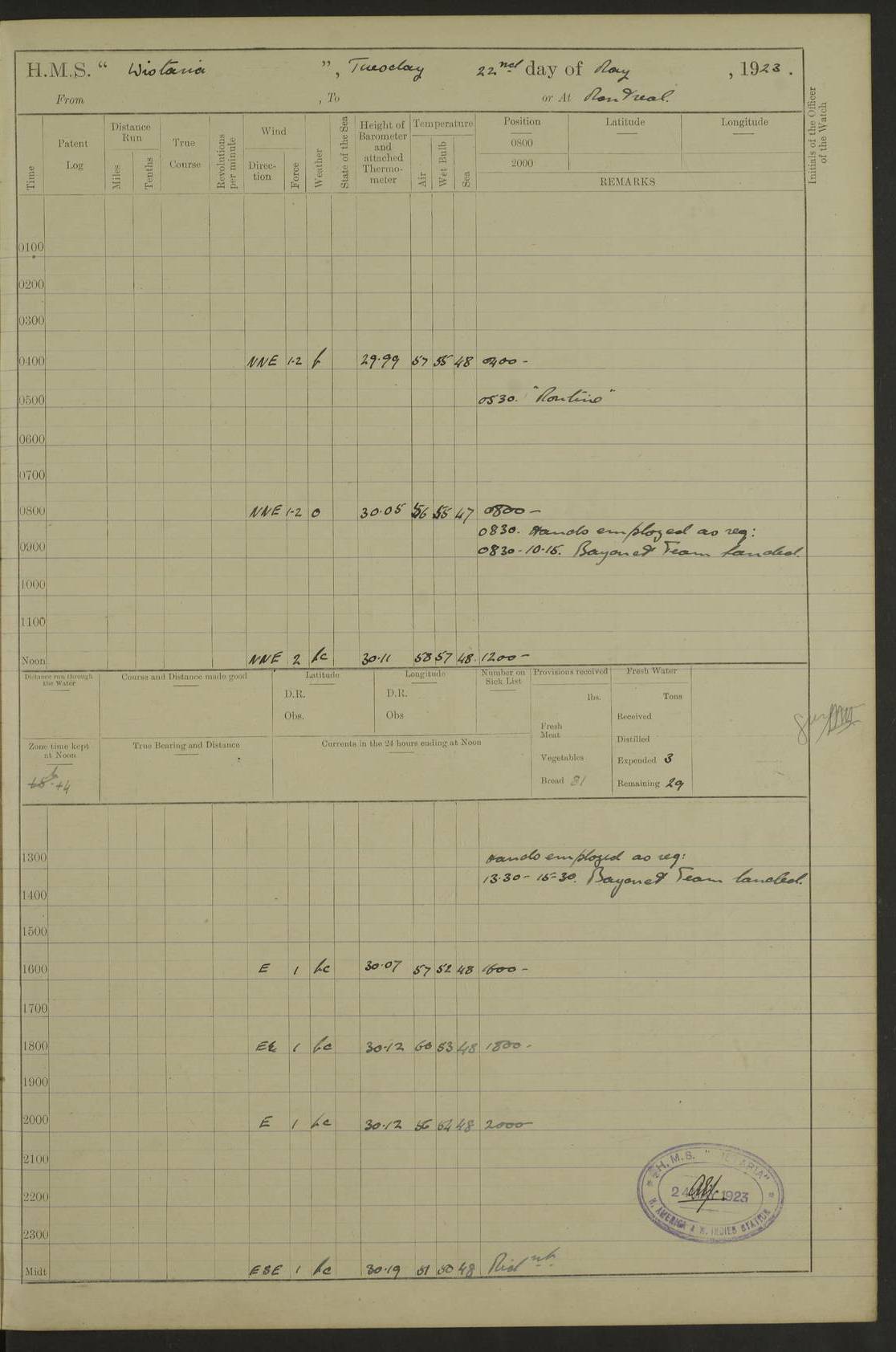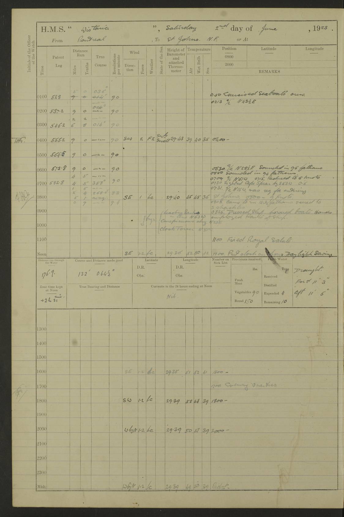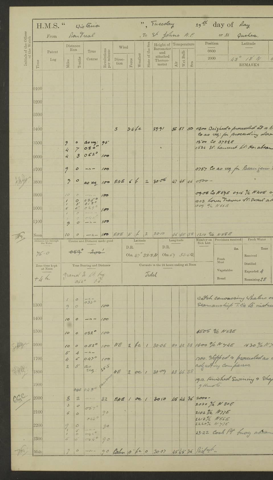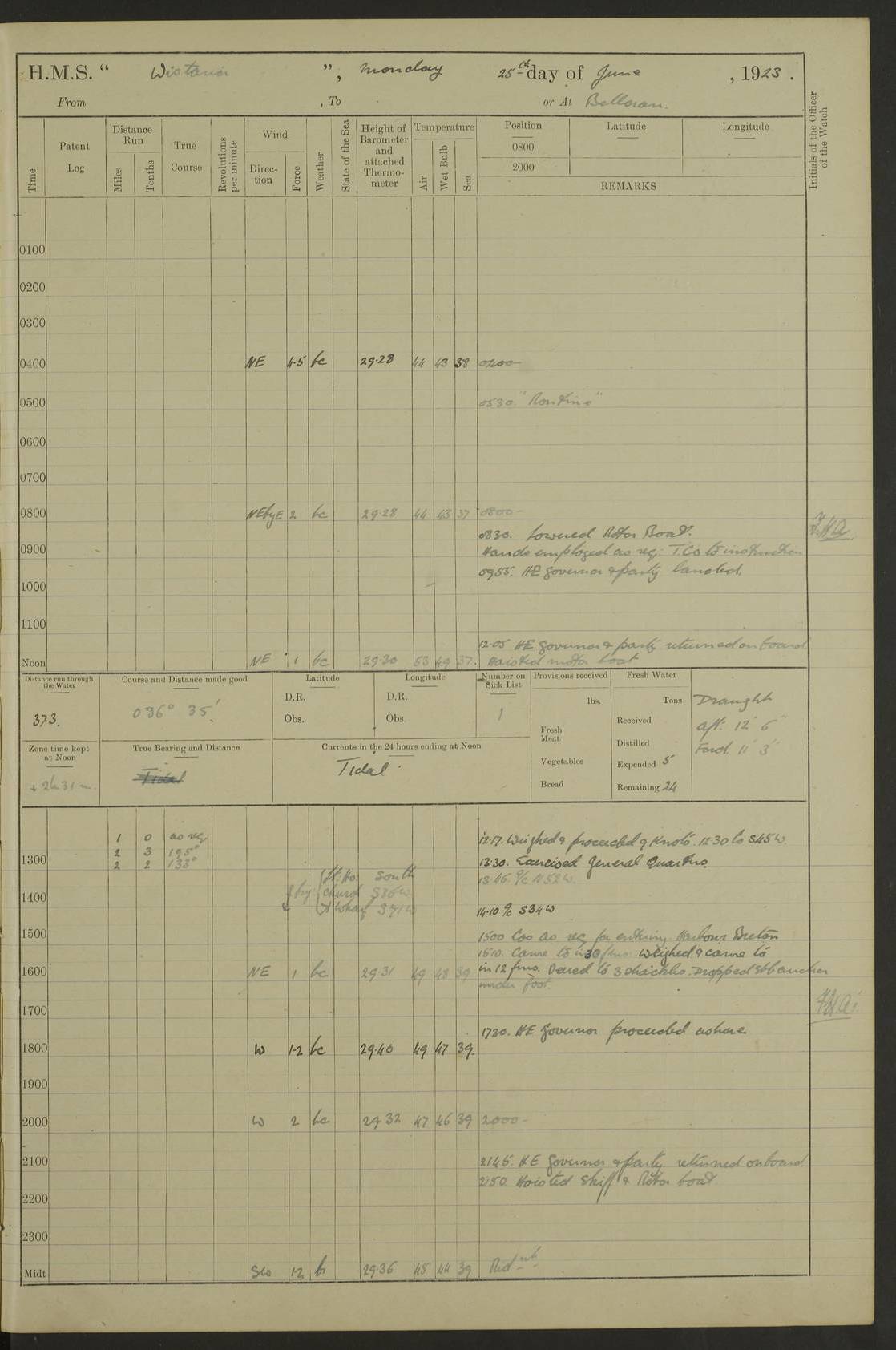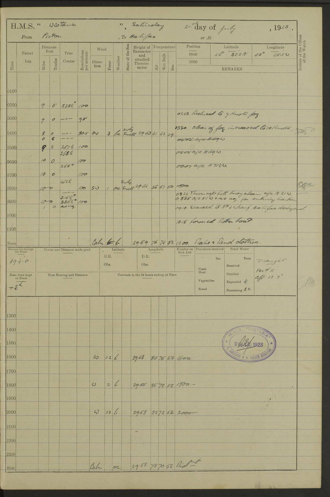 LOGS FOR OCTOBER 1922 4f73cb05a2fc8ea903000c65: (https://s3.amazonaws.com:443/oldweather/ADM53-93270/0003_1.jpg) 1 October 1922 At Forteau Bay Lat 51.46, Long -56.91 6.0am: Hands employed cleaning ship 9.45am: Divisions & Prayers 4f73cb05a2fc8ea903000c66: (https://s3.amazonaws.com:443/oldweather/ADM53-93270/0004_0.jpg) 2 October 1922 At Forteau Bay Lat 51.46, Long -56.91 6.0am: Hands employed cleaning ship 8.30am: Hands employed cleaning out boats and refitting well deck awnings 9.30am: Divisions & P.T. Party of 7 PO and 1 man to “Raleigh” 1.0pm: Hands for monthly payment 1.30pm: Hands employed refitting well deck awning and painting davits, etc 6.45pm: Hoisted Motor Boat 4f73cb05a2fc8ea903000c67: (https://s3.amazonaws.com:443/oldweather/ADM53-93270/0004_1.jpg) 3 October 1922 At Forteau Bay Lat 51.46, Long -56.91 8.30am: Hands employed cleaning out boats and refitting well deck awning am: New ratings to “Lewis gun” instruction pm: 1 hand scrubber lost by accident pm: 3 policemen received from Newfoundland in SS “Portia” 4.20pm: SS “Portia” enters harbour 4.45pm: SS “Portia” leaves 4f73cb06a2fc8ea903000c68: (https://s3.amazonaws.com:443/oldweather/ADM53-93270/0005_0.jpg) 4 October 1922 At Forteau Bay Lat 51.46, Long -56.91 8.30am: Hands employed securing ship for sea 8.45am: Shortened in 9.0am: Weighed and proceeded to Point Amour 9.20am: Anchored in 10 fathoms Anchor Bearings: Anse Amour Pier S65E; Amour Pt, right tangent, S4W; Cliff S11E 10.0am: Hands detailed for “Raleigh” working party 2.0pm: HMS “Raleigh” abandoned 2.15pm: 1 P.O. and 11 hands joined for passage (ex “Raleigh’s”) 3.0pm: Weighed and proceeded 90 revs 4.18pm: Greenly Island Lt Ho abeam, 7.4 miles 4.37pm: Patent log streamed 6.10pm: New Ferolle Pt abeam, 6.5 miles 7.05pm: Sighted Rich Pt bearing S42W 8.11pm: Rich Pt (bow) S15W 8.48pm: Rich Pt (Abeam), dist 5.7 miles. Altered course S52W 4f73cb06a2fc8ea903000c69: (https://s3.amazonaws.com:443/oldweather/ADM53-93270/0005_1.jpg) 5 October 1922 From Forteau Bay to Bonne Bay Lat 49.41, Long -58.25 1.35am: Sighted Cow Head Lt bearing S9W 1.40am: Cow Head Lt bearing S7W (bow), dist 8.3 miles 2.39am: Cow Head Lt bearing S38E (abeam), dist 8.3 miles 3.25am: Sighted Lobster Head Lt bearing S15W 5.20am: Sighted Lobster Point bearing S10E 6.47am: Lobster Cove Head abeam, 1 mile 7.35am: Anchored Bonne Bay 8.45am: Hands employed cleaning after sail room & canteen flat 9.15am: Weighed & proceeded, 90 revs 1.0pm: Altered course South and as requisite for entering Humber Arm, Bay of Isles 3.34pm: Anchored in 10 faths Anchor Bearings: Humber Mouth Pier right tangent S45W; Point, right tangent, S45E; left tangent, Hughes Brook N69E True Bearing and Distance: Gregory Island 192°, 8 miles 4f73cb07a2fc8ea903000c6a: (https://s3.amazonaws.com:443/oldweather/ADM53-93270/0006_0.jpg) 6 October 1922 From Bay of Isles to Halifax Lat 48.88, Long -58.81 6.09am: Weighed & proceeded 90 revs. Course N76W 6.24am: Streamed patent log 7.32am: Frenchman’s Head abeam 8.55am: South Head abeam 9.35am: Little Port Pt abeam, 1 mile 10.27am: Bear Head abeam, 3½ miles 11.15am: Shag Island abeam, 7.2 miles noon: Long Pt Lt Ho bearing S2W 12.10pm: Long Pt Lt House abeam, 6.3 miles 12.30pm: Sighted Red Island bearing S65W 1.0pm: Hauled in patent log 2.0pm: Streamed log 2.50pm: Red Island abeam, 4.5 miles 3.38pm: C. St George abeam, 5.5 miles 8.0pm: South part of C. Anguille abeam, 22½ miles 10.35pm: Sighted steamer bearing S49W 11.45pm: Sighted St Pauls Island True Bearing and Distance: Long Pt Lt Ho 160°, 6.8 miles 4f73cb07a2fc8ea903000c6b: (https://s3.amazonaws.com:443/oldweather/ADM53-93270/0006_1.jpg) 7 October 1922 From Bay of Isles to Halifax Lat 45.85, Long -61.56 12.26am: St Pauls Island Lt abeam, 16 miles 1.06am: Sighted Cape St Lawrence Lt S32W 1.30am: Sighted Money Pt Lt bearing S9E 2.37am: Cape St Lawrence Lt abeam, 7 miles 4.10am: Turned out Starboard sounding boom & took sounding (100 fath) 4.10am: Sighted Chiticamp Pt 5.39am: Sighted Sea Wolf Island bearing S43W 6.14am: Chiticamp Pt abeam, 5.5 miles 8.07am: Sea Wolf Island abeam, 4 miles 11.03am: C Henry Lt Ho abeam, 3 miles 12.07pm: Judique shoal buoy abeam, 1 mile 1.0pm: Course as requisite for Gut of Canso 1.05pm: North Canso Lt House abeam, 1 mile 1.33pm: Balache Pt Lt Ho abeam 2.25pm: Bear Island lighthouse abeam, 0.4 miles. Course SE 4.56pm: Whistle buoy bearing S3W 4.58pm: Altered course S22W. (Put clocks back ½ hour) 4.31pm: Whistle buoy abeam 4.55pm: Cranberry Island Lt Ho abeam 5.39pm: White Rk whistle buoy abeam 6.17pm: White Head Lt abeam, 5 miles 8.18pm: Country Island Lt abeam, 7 miles 9.30pm: Humbolt Rock light buoy bearing N69W 9.39pm: Luscombe Island Lt bearing N40W 10.18pm: Luscombe Island Lt abeam, 8.5 miles 11.05pm: Sighted Beaver Island Lt bearing N65W True Bearing and Distance: North Canso Lt Ho 158°, 10.5 miles [Chiticamp Point: misspelt for Chéticamp Point, the southwestern point of the island] [Luscombe Island: misspelt for Liscomb Island] 4f73cb07a2fc8ea903000c6c: (https://s3.amazonaws.com:443/oldweather/ADM53-93270/0007_0.jpg) 8 October 1922 From Bay of Isles to Halifax and at Halifax Lat 49.41, Long -58.25 0.20am: Beaver Isle abeam, 6 ¼ miles 0.59am: Roach Isle abeam, 9 miles 1.34am: Sighted Egg Island Lt bearing N64W 3.02am: Egg Island Lt abeam, 7.5 miles 3.25am: Sighted Jeddore Lt bearing N15W 5.30am: Sighted Whistle buoy bearing N60W 5.50am: Whistle buoy abeam, 1 mile 6.30am: Sighted Chebucto Head lighthouse bearing S88W 6.38am: Portuguese shoal whistle buoy abeam. Altered course North 7.08am: Manger Beach Lt abeam 7.10am: Hauled in patent log 7.45am: Secured alongside Number 4 wharf 9.0am: Hands employed cleaning up decks for divisions 4f73cb08a2fc8ea903000c6d: (https://s3.amazonaws.com:443/oldweather/ADM53-93270/0007_1.jpg) 9 October 1922 At Halifax Lat 44.69, Long -63.64 8.30am: Hands employed in getting out “Raleigh’s” boats 9.05am: HMCS “Patriot” proceeded to Sea 1.