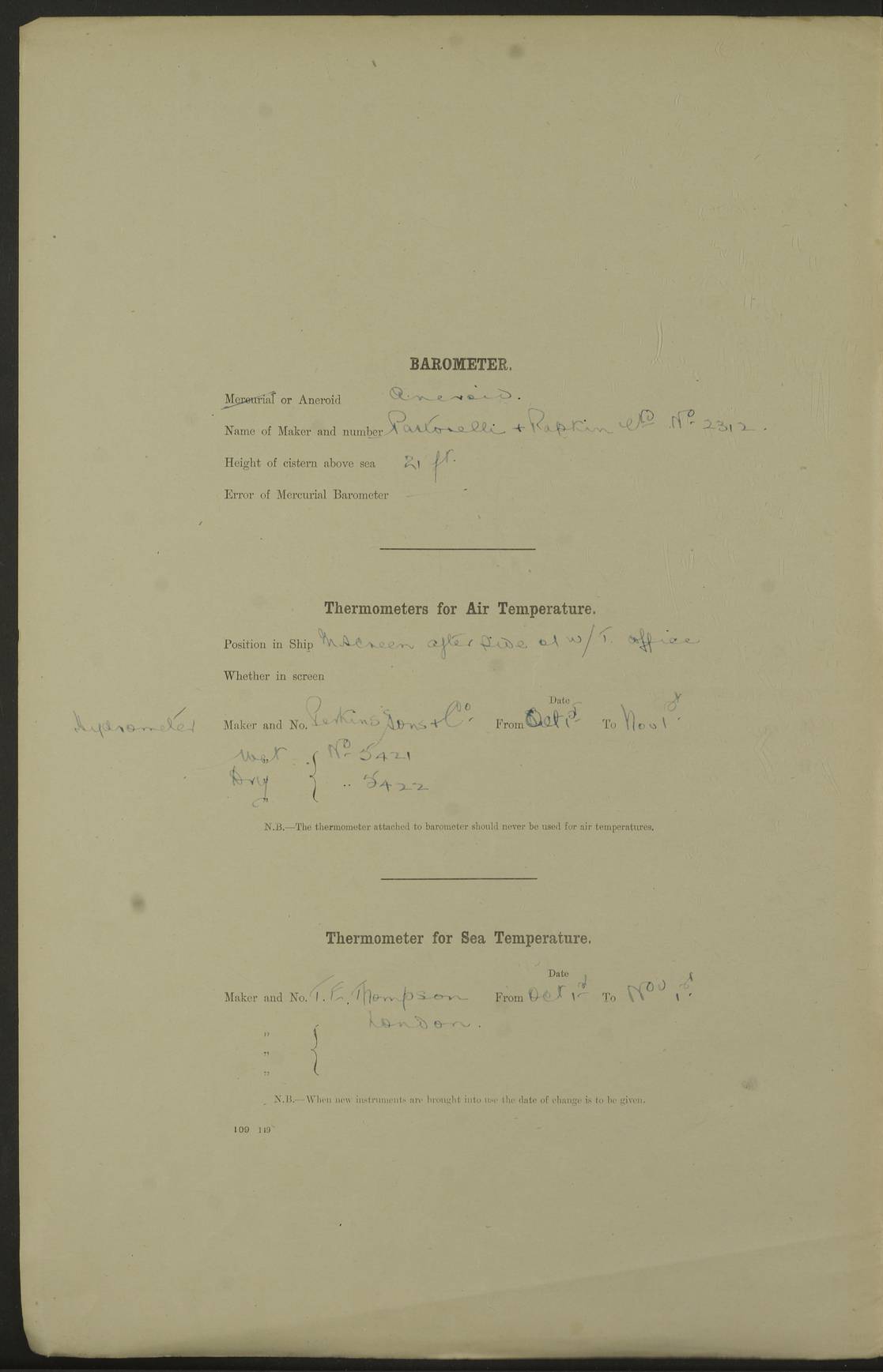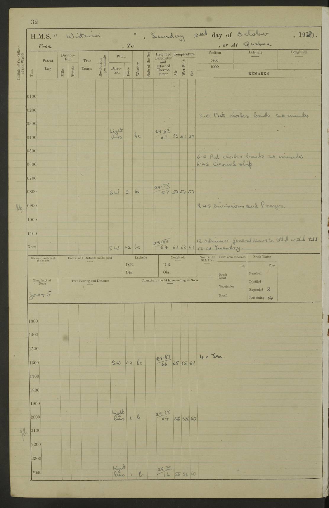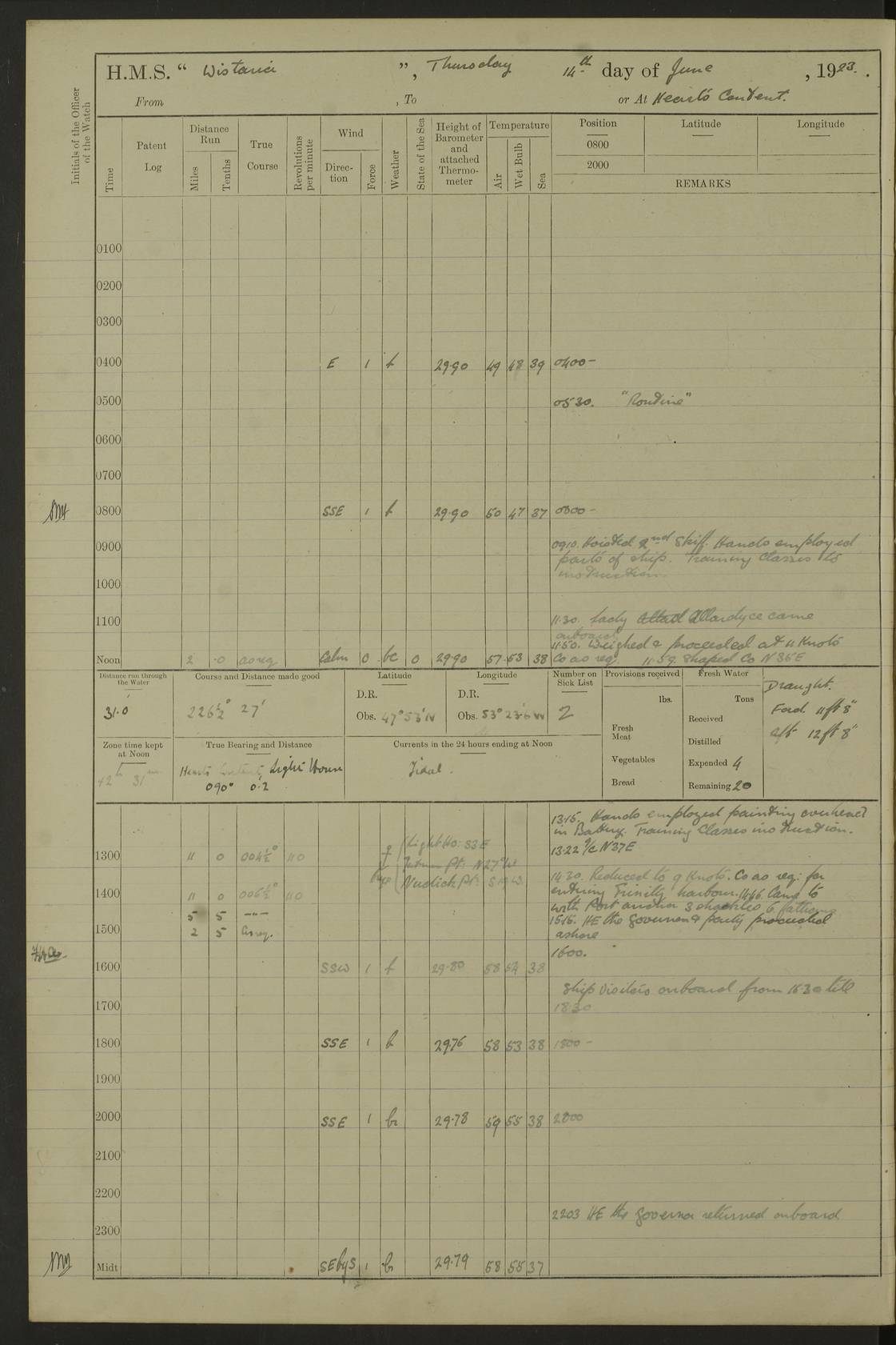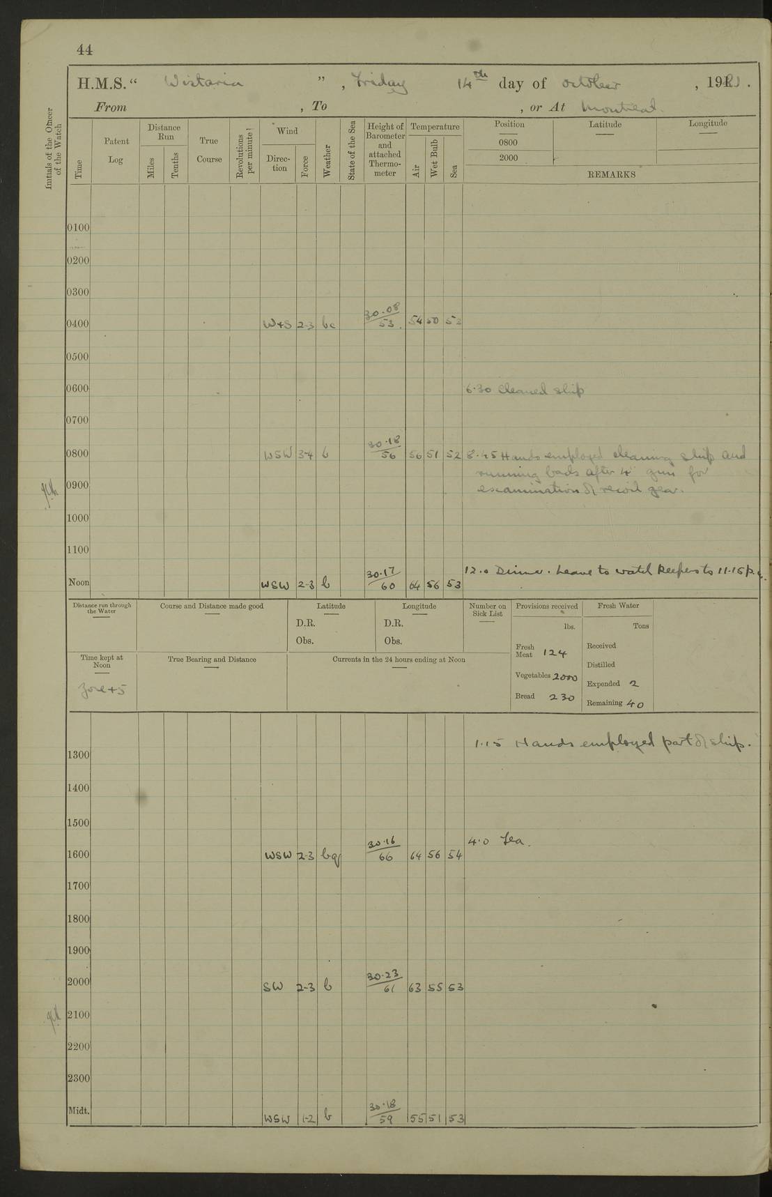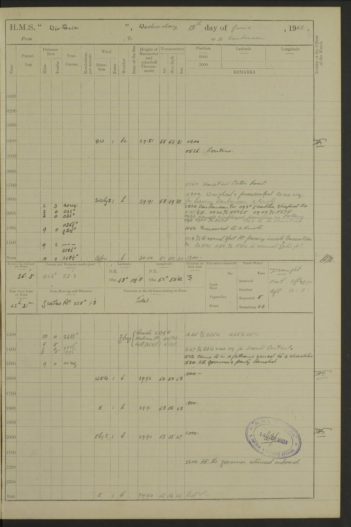 LOGS FOR OCTOBER 1922 4f73cb05a2fc8ea903000c65: (https://s3.amazonaws.com:443/oldweather/ADM53-93270/0003_1.jpg) 1 October 1922 At Forteau Bay Lat 51.46, Long -56.91 6.0am: Hands employed cleaning ship 9.45am: Divisions & Prayers 4f73cb05a2fc8ea903000c66: (https://s3.amazonaws.com:443/oldweather/ADM53-93270/0004_0.jpg) 2 October 1922 At Forteau Bay Lat 51.46, Long -56.91 6.0am: Hands employed cleaning ship 8.30am: Hands employed cleaning out boats and refitting well deck awnings 9.30am: Divisions & P.T. Party of 7 PO and 1 man to “Raleigh” 1.0pm: Hands for monthly payment 1.30pm: Hands employed refitting well deck awning and painting davits, etc 6.45pm: Hoisted Motor Boat 4f73cb05a2fc8ea903000c67: (https://s3.amazonaws.com:443/oldweather/ADM53-93270/0004_1.jpg) 3 October 1922 At Forteau Bay Lat 51.46, Long -56.91 8.30am: Hands employed cleaning out boats and refitting well deck awning am: New ratings to “Lewis gun” instruction pm: 1 hand scrubber lost by accident pm: 3 policemen received from Newfoundland in SS “Portia” 4.20pm: SS “Portia” enters harbour 4.45pm: SS “Portia” leaves 4f73cb06a2fc8ea903000c68: (https://s3.amazonaws.com:443/oldweather/ADM53-93270/0005_0.jpg) 4 October 1922 At Forteau Bay Lat 51.46, Long -56.91 8.30am: Hands employed securing ship for sea 8.45am: Shortened in 9.0am: Weighed and proceeded to Point Amour 9.20am: Anchored in 10 fathoms Anchor Bearings: Anse Amour Pier S65E; Amour Pt, right tangent, S4W; Cliff S11E 10.0am: Hands detailed for “Raleigh” working party 2.0pm: HMS “Raleigh” abandoned 2.15pm: 1 P.O. and 11 hands joined for passage (ex “Raleigh’s”) 3.0pm: Weighed and proceeded 90 revs 4.18pm: Greenly Island Lt Ho abeam, 7.4 miles 4.37pm: Patent log streamed 6.10pm: New Ferolle Pt abeam, 6.5 miles 7.05pm: Sighted Rich Pt bearing S42W 8.11pm: Rich Pt (bow) S15W 8.48pm: Rich Pt (Abeam), dist 5.7 miles. Altered course S52W 4f73cb06a2fc8ea903000c69: (https://s3.amazonaws.com:443/oldweather/ADM53-93270/0005_1.jpg) 5 October 1922 From Forteau Bay to Bonne Bay Lat 49.41, Long -58.25 1.35am: Sighted Cow Head Lt bearing S9W 1.40am: Cow Head Lt bearing S7W (bow), dist 8.3 miles 2.39am: Cow Head Lt bearing S38E (abeam), dist 8.3 miles 3.25am: Sighted Lobster Head Lt bearing S15W 5.20am: Sighted Lobster Point bearing S10E 6.47am: Lobster Cove Head abeam, 1 mile 7.35am: Anchored Bonne Bay 8.45am: Hands employed cleaning after sail room & canteen flat 9.15am: Weighed & proceeded, 90 revs 1.0pm: Altered course South and as requisite for entering Humber Arm, Bay of Isles 3.34pm: Anchored in 10 faths Anchor Bearings: Humber Mouth Pier right tangent S45W; Point, right tangent, S45E; left tangent, Hughes Brook N69E True Bearing and Distance: Gregory Island 192°, 8 miles 4f73cb07a2fc8ea903000c6a: (https://s3.amazonaws.com:443/oldweather/ADM53-93270/0006_0.jpg) 6 October 1922 From Bay of Isles to Halifax Lat 48.88, Long -58.81 6.09am: Weighed & proceeded 90 revs. Course N76W 6.24am: Streamed patent log 7.32am: Frenchman’s Head abeam 8.55am: South Head abeam 9.35am: Little Port Pt abeam, 1 mile 10.27am: Bear Head abeam, 3½ miles 11.15am: Shag Island abeam, 7.2 miles noon: Long Pt Lt Ho bearing S2W 12.10pm: Long Pt Lt House abeam, 6.3 miles 12.30pm: Sighted Red Island bearing S65W 1.0pm: Hauled in patent log 2.0pm: Streamed log 2.50pm: Red Island abeam, 4.5 miles 3.38pm: C. St George abeam, 5.5 miles 8.0pm: South part of C. Anguille abeam, 22½ miles 10.35pm: Sighted steamer bearing S49W 11.45pm: Sighted St Pauls Island True Bearing and Distance: Long Pt Lt Ho 160°, 6.8 miles 4f73cb07a2fc8ea903000c6b: (https://s3.amazonaws.com:443/oldweather/ADM53-93270/0006_1.jpg) 7 October 1922 From Bay of Isles to Halifax Lat 45.85, Long -61.56 12.26am: St Pauls Island Lt abeam, 16 miles 1.06am: Sighted Cape St Lawrence Lt S32W 1.30am: Sighted Money Pt Lt bearing S9E 2.37am: Cape St Lawrence Lt abeam, 7 miles 4.10am: Turned out Starboard sounding boom & took sounding (100 fath) 4.10am: Sighted Chiticamp Pt 5.39am: Sighted Sea Wolf Island bearing S43W 6.14am: Chiticamp Pt abeam, 5.5 miles 8.07am: Sea Wolf Island abeam, 4 miles 11.03am: C Henry Lt Ho abeam, 3 miles 12.07pm: Judique shoal buoy abeam, 1 mile 1.0pm: Course as requisite for Gut of Canso 1.05pm: North Canso Lt House abeam, 1 mile 1.33pm: Balache Pt Lt Ho abeam 2.25pm: Bear Island lighthouse abeam, 0.4 miles. Course SE 4.56pm: Whistle buoy bearing S3W 4.58pm: Altered course S22W. (Put clocks back ½ hour) 4.31pm: Whistle buoy abeam 4.55pm: Cranberry Island Lt Ho abeam 5.39pm: White Rk whistle buoy abeam 6.17pm: White Head Lt abeam, 5 miles 8.18pm: Country Island Lt abeam, 7 miles 9.30pm: Humbolt Rock light buoy bearing N69W 9.39pm: Luscombe Island Lt bearing N40W 10.18pm: Luscombe Island Lt abeam, 8.5 miles 11.05pm: Sighted Beaver Island Lt bearing N65W True Bearing and Distance: North Canso Lt Ho 158°, 10.5 miles [Chiticamp Point: misspelt for Chéticamp Point, the southwestern point of the island] [Luscombe Island: misspelt for Liscomb Island] 4f73cb07a2fc8ea903000c6c: (https://s3.amazonaws.com:443/oldweather/ADM53-93270/0007_0.jpg) 8 October 1922 From Bay of Isles to Halifax and at Halifax Lat 49.41, Long -58.25 0.20am: Beaver Isle abeam, 6 ¼ miles 0.59am: Roach Isle abeam, 9 miles 1.34am: Sighted Egg Island Lt bearing N64W 3.02am: Egg Island Lt abeam, 7.5 miles 3.25am: Sighted Jeddore Lt bearing N15W 5.30am: Sighted Whistle buoy bearing N60W 5.50am: Whistle buoy abeam, 1 mile 6.30am: Sighted Chebucto Head lighthouse bearing S88W 6.38am: Portuguese shoal whistle buoy abeam. Altered course North 7.08am: Manger Beach Lt abeam 7.10am: Hauled in patent log 7.45am: Secured alongside Number 4 wharf 9.0am: Hands employed cleaning up decks for divisions 4f73cb08a2fc8ea903000c6d: (https://s3.amazonaws.com:443/oldweather/ADM53-93270/0007_1.jpg) 9 October 1922 At Halifax Lat 44.69, Long -63.64 8.30am: Hands employed in getting out “Raleigh’s” boats 9.05am: HMCS “Patriot” proceeded to Sea 1.