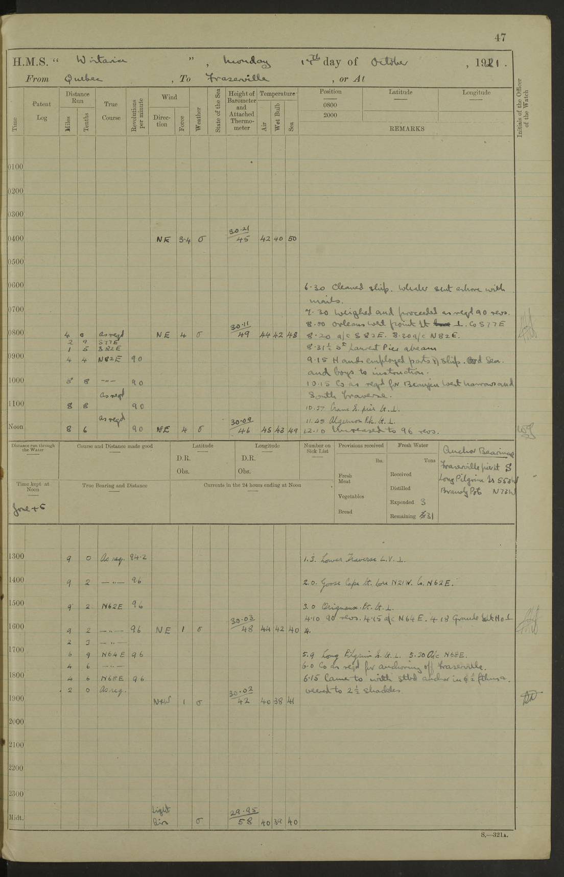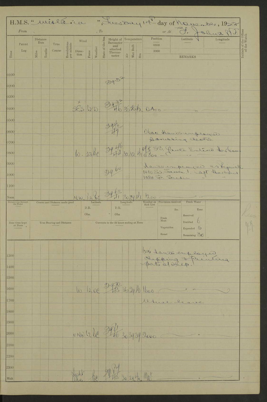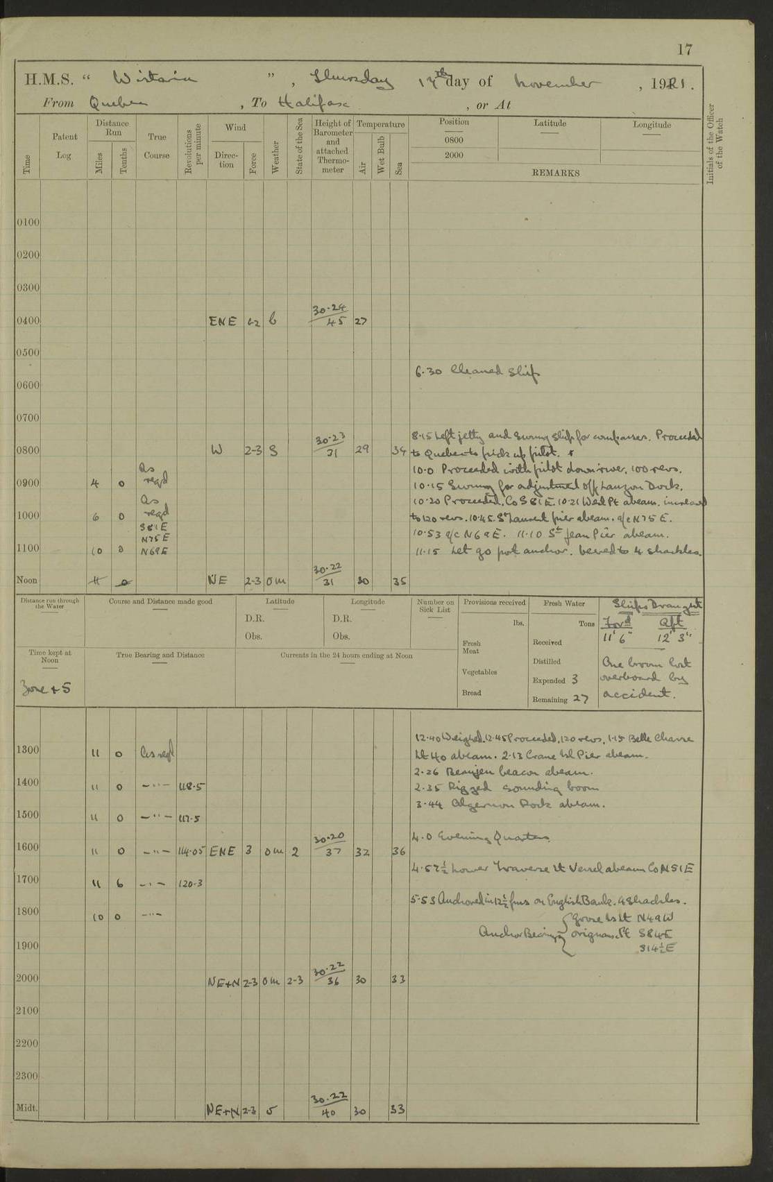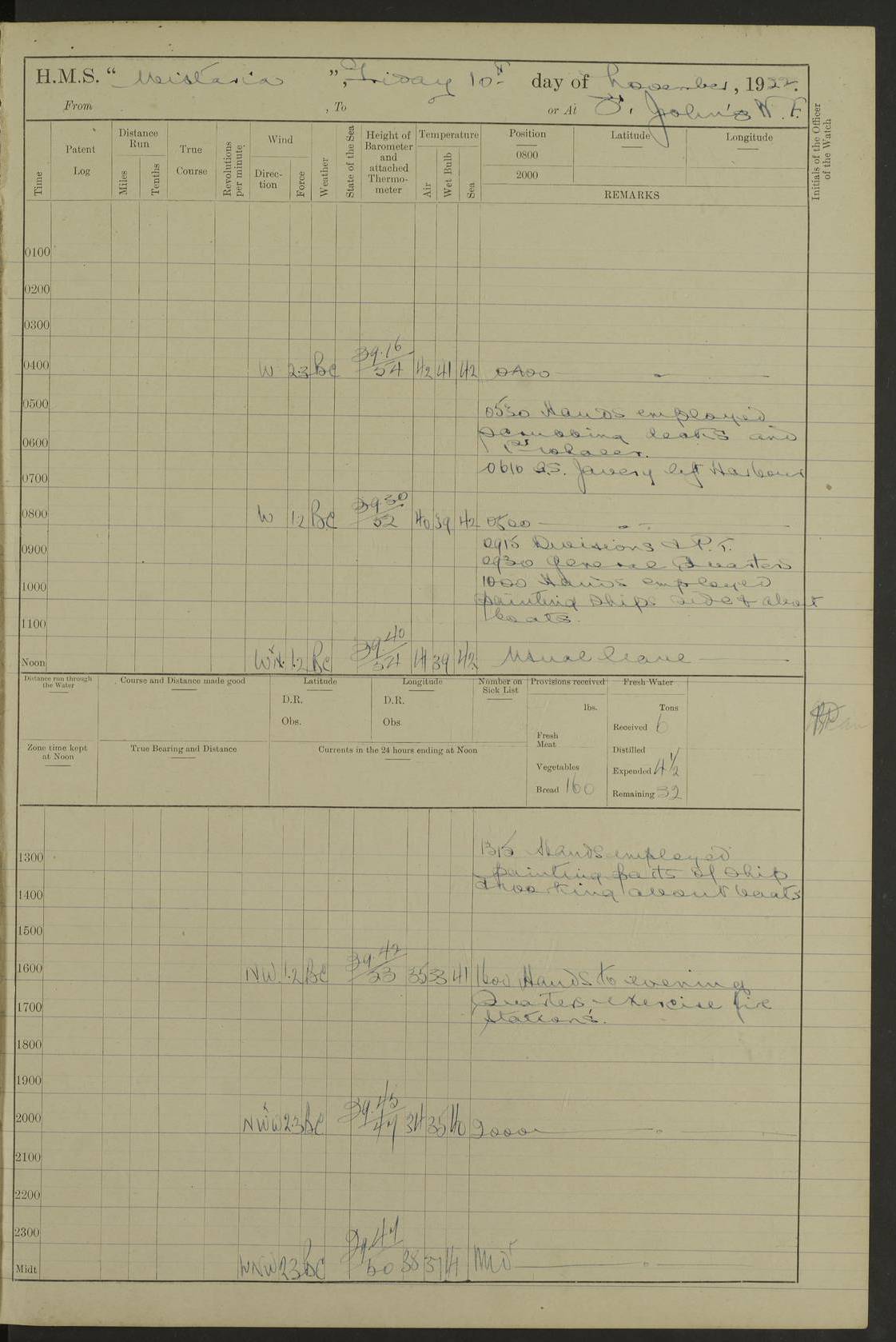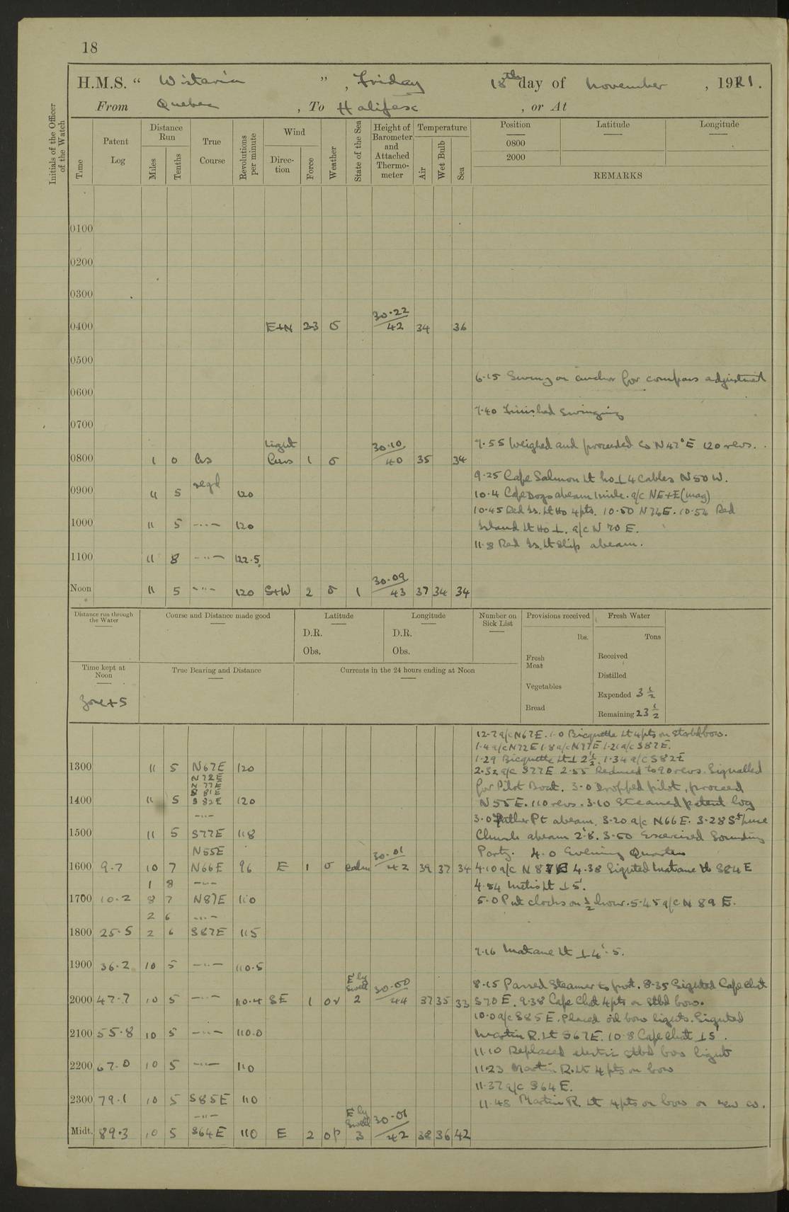LOGS FOR NOVEMBER 1921 4f73ca6ea2fc8ea903000ad1: (https://s3.amazonaws.com:443/oldweather/ADM53-93264/0003_1.jpg) 4f73ca69a2fc8ea903000ac6: (https://s3.amazonaws.com:443/oldweather/ADM53-93263/0034_0.jpg) 1 November 1921 At Lévis Lat 46.8, Long -71.19 10.0am: Hands employed blacking down rigging refitting guard rails & scraping 1st whaler 1.10pm: Hands mustered for monthly payment 1.30pm: Hands employed as forenoon 5.0pm: [Exercised] fire stations 4f73ca6ea2fc8ea903000ad2: (https://s3.amazonaws.com:443/oldweather/ADM53-93264/0004_0.jpg) 4f73ca6aa2fc8ea903000ac7: (https://s3.amazonaws.com:443/oldweather/ADM53-93263/0034_1.jpg) 2 November 1921 At Lévis Lat 46.8, Long -71.19 8.0am: Hands employed blacking down rigging, refitting guard rails, chipping ship's side and scraping first whales 1.15pm: Hands employed as forenoon 4f73ca6ea2fc8ea903000ad3: (https://s3.amazonaws.com:443/oldweather/ADM53-93264/0004_1.jpg) 3 November 1921 At Lévis Lat 46.8, Long -71.19 8.0am: Hands employed refitting guard rails, chipping ship’s side & scraping whaler 1.15pm: Hands employed as forenoon 4f73ca6fa2fc8ea903000ad4: (https://s3.amazonaws.com:443/oldweather/ADM53-93264/0005_0.jpg) 4 November 1921 At Lévis Lat 46.8, Long -71.19 8.0am: Hands employed parts of ship 1.15pm: Hands employed variously parts of ship 5.0pm: Exercised fire quarters 4f73ca6fa2fc8ea903000ad5: (https://s3.amazonaws.com:443/oldweather/ADM53-93264/0005_1.jpg) 5 November 1921 At Lévis Lat 46.8, Long -71.19 8.0am: Hands employed scraping ship’s side and boats and working about storerooms 4f73ca70a2fc8ea903000ad6: (https://s3.amazonaws.com:443/oldweather/ADM53-93264/0006_0.jpg) 6 November 1921 At Lévis Lat 46.8, Long -71.19 8.0am: Scrubbed decks 5.0pm: Exercised fire quarters 4f73ca70a2fc8ea903000ad7: (https://s3.amazonaws.com:443/oldweather/ADM53-93264/0006_1.jpg) 7 November 1921 At Lévis Lat 46.8, Long -71.19 8.40am: Seaman landing party landed 12.25am: Landing party returned 1.45pm: Hands employed scraping boats & cleaning ship 4f73ca70a2fc8ea903000ad8: (https://s3.amazonaws.com:443/oldweather/ADM53-93264/0007_0.jpg) 8 November 1921 At Lévis Lat 46.8, Long -71.19 8.0am: Hands employed cleaning store rooms, refitting guard rails & scraping boats 1.15pm: Hands employed cleaning store rooms, refitting guard rails & scraping boats 4f73ca71a2fc8ea903000ad9: (https://s3.amazonaws.com:443/oldweather/ADM53-93264/0007_1.jpg) 9 November 1921 At Lévis Lat 46.8, Long -71.19 8.0am: Hands employed scraping & redleading ship’s side, cleaning storerooms & scraping boats 1.15pm: Hands employed painting part of ship’s side, painting 1st whaler, scraping 2nd whaler, refitting guard rails and cleaning after store room 5.0pm: Exercised fire quarters 4f73ca71a2fc8ea903000ada: (https://s3.amazonaws.com:443/oldweather/ADM53-93264/0008_0.jpg) 10 November 1921 At Lévis Lat 46.8, Long -71.19 8.0am: Hands employed refitting guard rails, scraping 2nd whaler and clearing away snow 1.15pm: Hands employed as forenoon 4f73ca71a2fc8ea903000adb: (https://s3.amazonaws.com:443/oldweather/ADM53-93264/0008_1.jpg) 11 November 1921 At Lévis Lat 46.8, Long -71.19 8.0am: Hands employed scraping whaler, refitting fenders & parts of ship 11.0am: Two minutes silence in commemoration of Armistice 1.15pm: Hands employed scraping whaler, refitting fenders, scraping and redleading chutes and clearing snow 4f73ca72a2fc8ea903000adc: (https://s3.amazonaws.com:443/oldweather/ADM53-93264/0009_0.jpg) 12 November 1921 At Lévis Lat 46.8, Long -71.19 8.0am: Hands employed parts of ship and scraping boats & refitting fenders 4f73ca72a2fc8ea903000add: (https://s3.amazonaws.com:443/oldweather/ADM53-93264/0009_1.jpg) 13 November 1921 At Lévis Lat 46.8, Long -71.19 8.0am: Cleaned ship 10.0am: Divisions and Prayers 4f73ca72a2fc8ea903000ade: (https://s3.amazonaws.com:443/oldweather/ADM53-93264/0010_0.jpg) 14 November 1921 At Lévis Lat 46.8, Long -71.19 8.0am: Hands employed embarking ammunition and working about 2nd whaler 1.15pm: Hands employed embarking ammunition and restowing provisions 4f73ca73a2fc8ea903000adf: (https://s3.amazonaws.com:443/oldweather/ADM53-93264/0010_1.jpg) 15 November 1921 At Lévis Lat 46.8, Long -71.19 8.0am: Hands employed parts of ship 1.15pm: Hands employed cleaning up ship 4f73ca73a2fc8ea903000ae0: (https://s3.amazonaws.com:443/oldweather/ADM53-93264/0011_0.jpg) 16 November 1921 At Lévis Lat 46.8, Long -71.19 8.0am: Hands employed parts of ship noon: Dinner & clean in coaling rig 1.15pm: Hands employed parts of ship 2.55pm: Commenced flooding dock 3.20pm: Ship became water borne. Starboard watch to tea 4.0pm: Port watch to tea 4.10pm: Shifted ship from dock to jetty outside 4.40pm: Coal lighter secured alongside 5.0pm: Hands coal ship 11.30pm: Commenced basin trials 4f73ca74a2fc8ea903000ae1: (https://s3.amazonaws.com:443/oldweather/ADM53-93264/0011_1.jpg) 17 November 1921 From Quebec to Halifax [Lat 46.93, Long -70.73] [Belle Chasse Island coordinates] 8.15am: Left jetty and swung ship for compasses. Proceeded to Quebec to pick up pilot 10.0am: Proceeded with pilot down river, 100 revs 10.15am: Swung for adjustment off Lauzon Dock 10.20am: Proceeded. Course S81E 10.21am: West Pt abeam, increased to 120 revs 10.45am: St Laurent Pier abeam. Altered course N75E 11.10am: St Jean Pier abeam 11.15am: Let go Port anchor veered to 4 shackles One broom lost overboard by accident 12.40pm: Weighed 12.45pm: Proceeded 120 revs 1.15pm: Belle Chasse Lt Ho abeam 2.13pm: Crane Island Pier abeam 2.26pm: Beaujeu Beacon abeam 2.35pm: Rigged sounding boom 3.44pm: Algernon Rock abeam 4.57½pm: Lower Traverse Lt Vessel abeam, course N51E 5.53pm: Anchored in 12½ fms on English Bank, 4 shackles Anchor Bearings: Goose Island Lt N49W, Orignaux Pt S84E, [space left blank] S14½E [“English Bank: proper extends from a position 4 miles NNW of Orignaux Point for about 10 miles SW by W¼W, to Middle ground with a width of about half a mile at its eastern point, gradually increasing