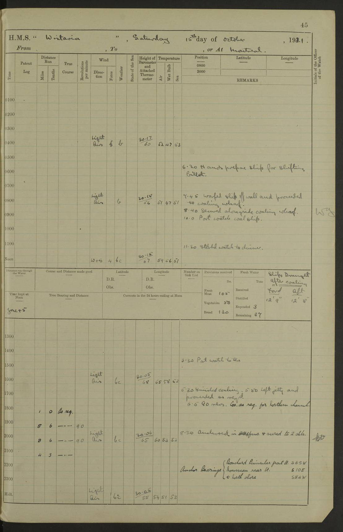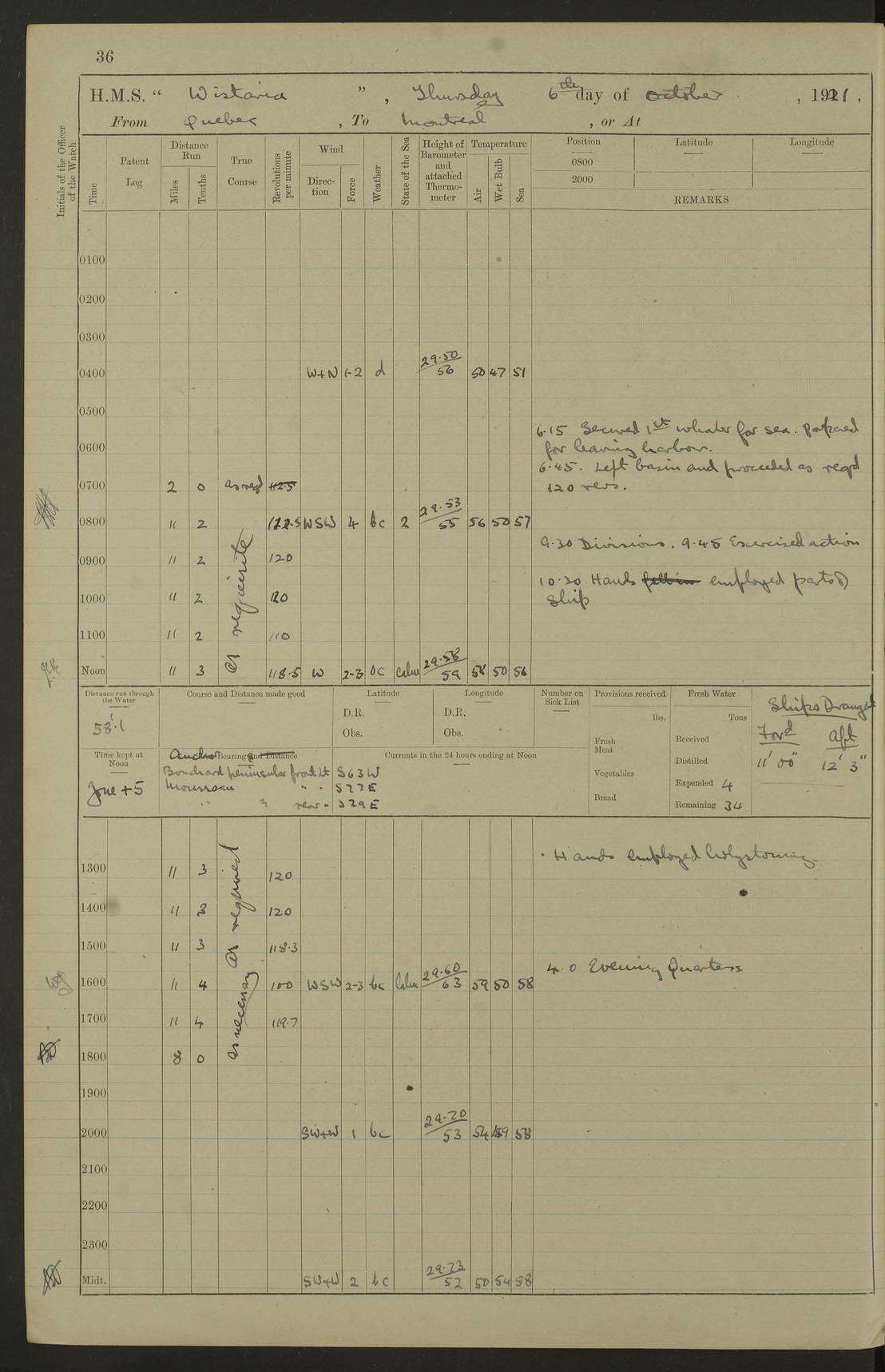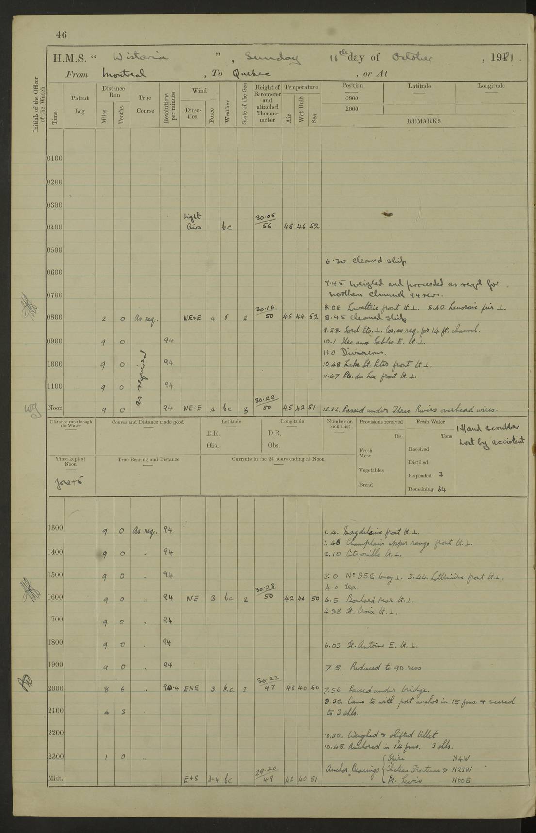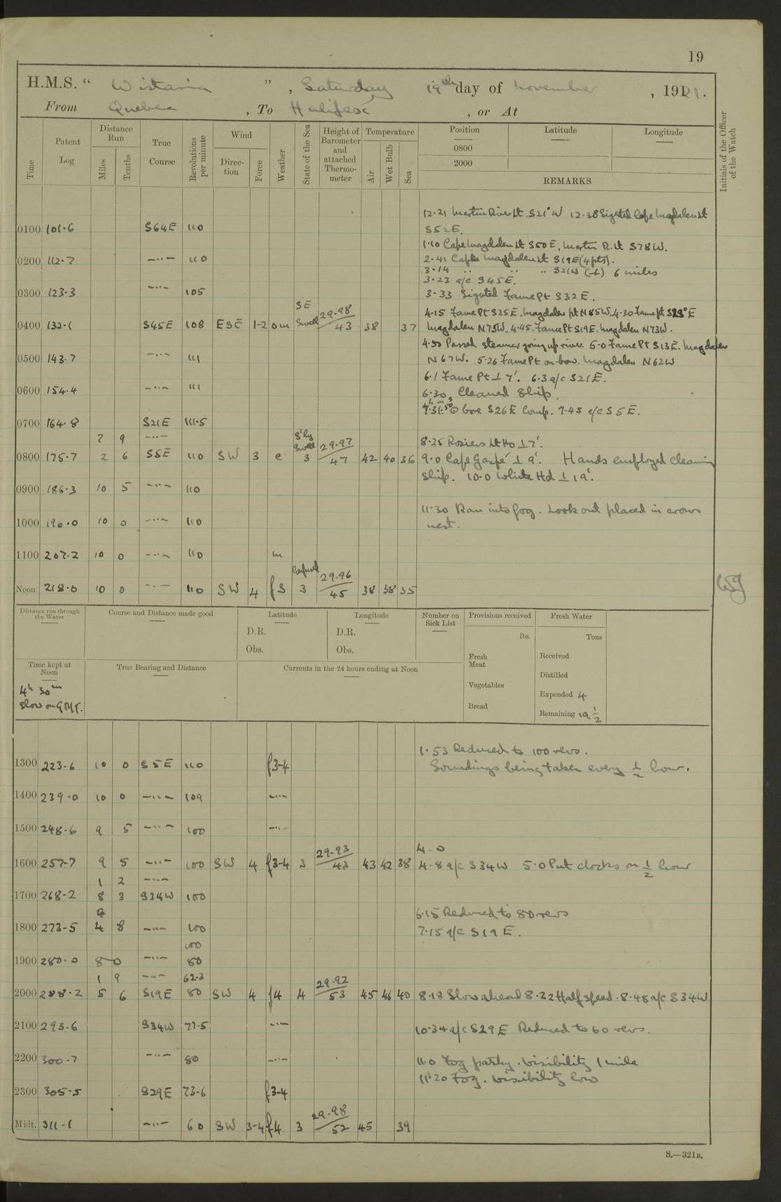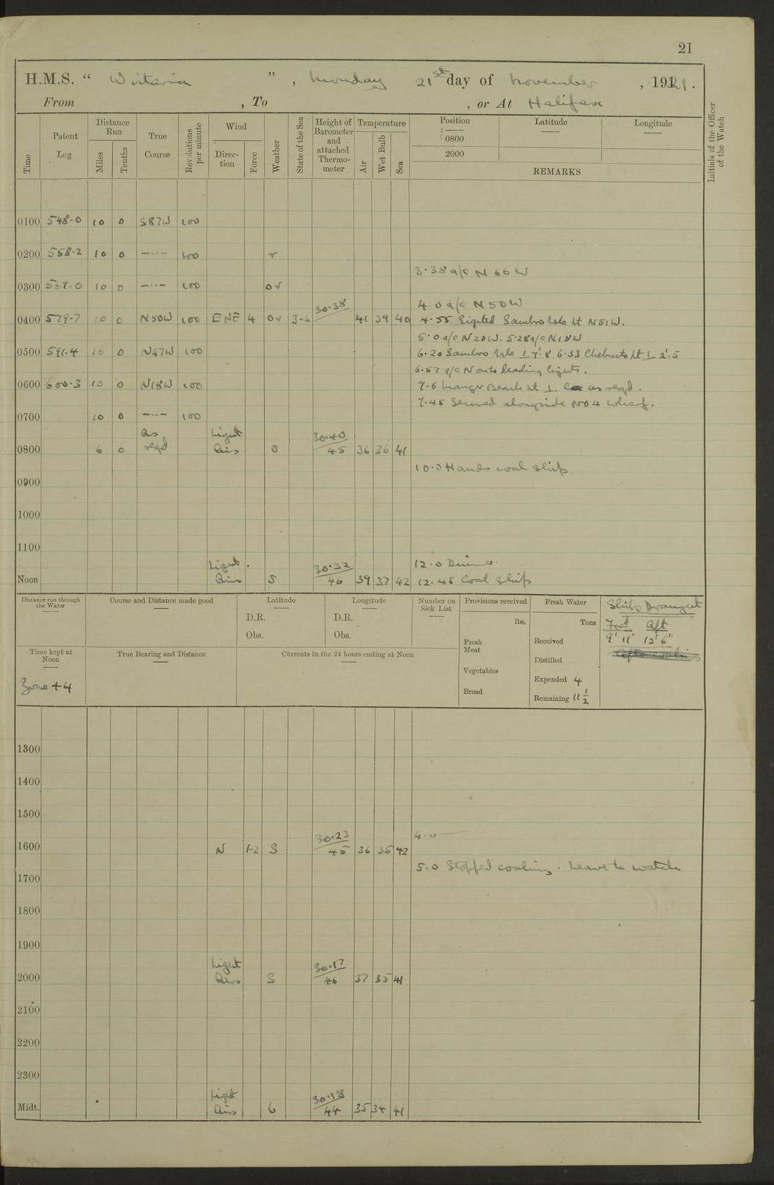 LOGS FOR NOVEMBER 1921 4f73ca6ea2fc8ea903000ad1: (https://s3.amazonaws.com:443/oldweather/ADM53-93264/0003_1.jpg) 4f73ca69a2fc8ea903000ac6: (https://s3.amazonaws.com:443/oldweather/ADM53-93263/0034_0.jpg) 1 November 1921 At Lévis Lat 46.8, Long -71.19 10.0am: Hands employed blacking down rigging refitting guard rails & scraping 1st whaler 1.10pm: Hands mustered for monthly payment 1.30pm: Hands employed as forenoon 5.0pm: [Exercised] fire stations 4f73ca6ea2fc8ea903000ad2: (https://s3.amazonaws.com:443/oldweather/ADM53-93264/0004_0.jpg) 4f73ca6aa2fc8ea903000ac7: (https://s3.amazonaws.com:443/oldweather/ADM53-93263/0034_1.jpg) 2 November 1921 At Lévis Lat 46.8, Long -71.19 8.0am: Hands employed blacking down rigging, refitting guard rails, chipping ship's side and scraping first whales 1.15pm: Hands employed as forenoon 4f73ca6ea2fc8ea903000ad3: (https://s3.amazonaws.com:443/oldweather/ADM53-93264/0004_1.jpg) 3 November 1921 At Lévis Lat 46.8, Long -71.19 8.0am: Hands employed refitting guard rails, chipping ship’s side & scraping whaler 1.15pm: Hands employed as forenoon 4f73ca6fa2fc8ea903000ad4: (https://s3.amazonaws.com:443/oldweather/ADM53-93264/0005_0.jpg) 4 November 1921 At Lévis Lat 46.8, Long -71.19 8.0am: Hands employed parts of ship 1.15pm: Hands employed variously parts of ship 5.0pm: Exercised fire quarters 4f73ca6fa2fc8ea903000ad5: (https://s3.amazonaws.com:443/oldweather/ADM53-93264/0005_1.jpg) 5 November 1921 At Lévis Lat 46.8, Long -71.19 8.0am: Hands employed scraping ship’s side and boats and working about storerooms 4f73ca70a2fc8ea903000ad6: (https://s3.amazonaws.com:443/oldweather/ADM53-93264/0006_0.jpg) 6 November 1921 At Lévis Lat 46.8, Long -71.19 8.0am: Scrubbed decks 5.0pm: Exercised fire quarters 4f73ca70a2fc8ea903000ad7: (https://s3.amazonaws.com:443/oldweather/ADM53-93264/0006_1.jpg) 7 November 1921 At Lévis Lat 46.8, Long -71.19 8.40am: Seaman landing party landed 12.25am: Landing party returned 1.45pm: Hands employed scraping boats & cleaning ship 4f73ca70a2fc8ea903000ad8: (https://s3.amazonaws.com:443/oldweather/ADM53-93264/0007_0.jpg) 8 November 1921 At Lévis Lat 46.8, Long -71.19 8.0am: Hands employed cleaning store rooms, refitting guard rails & scraping boats 1.15pm: Hands employed cleaning store rooms, refitting guard rails & scraping boats 4f73ca71a2fc8ea903000ad9: (https://s3.amazonaws.com:443/oldweather/ADM53-93264/0007_1.jpg) 9 November 1921 At Lévis Lat 46.8, Long -71.19 8.0am: Hands employed scraping & redleading ship’s side, cleaning storerooms & scraping boats 1.15pm: Hands employed painting part of ship’s side, painting 1st whaler, scraping 2nd whaler, refitting guard rails and cleaning after store room 5.0pm: Exercised fire quarters 4f73ca71a2fc8ea903000ada: (https://s3.amazonaws.com:443/oldweather/ADM53-93264/0008_0.jpg) 10 November 1921 At Lévis Lat 46.8, Long -71.19 8.0am: Hands employed refitting guard rails, scraping 2nd whaler and clearing away snow 1.15pm: Hands employed as forenoon 4f73ca71a2fc8ea903000adb: (https://s3.amazonaws.com:443/oldweather/ADM53-93264/0008_1.jpg) 11 November 1921 At Lévis Lat 46.8, Long -71.19 8.0am: Hands employed scraping whaler, refitting fenders & parts of ship 11.0am: Two minutes silence in commemoration of Armistice 1.15pm: Hands employed scraping whaler, refitting fenders, scraping and redleading chutes and clearing snow 4f73ca72a2fc8ea903000adc: (https://s3.amazonaws.com:443/oldweather/ADM53-93264/0009_0.jpg) 12 November 1921 At Lévis Lat 46.8, Long -71.19 8.0am: Hands employed parts of ship and scraping boats & refitting fenders 4f73ca72a2fc8ea903000add: (https://s3.amazonaws.com:443/oldweather/ADM53-93264/0009_1.jpg) 13 November 1921 At Lévis Lat 46.8, Long -71.19 8.0am: Cleaned ship 10.0am: Divisions and Prayers 4f73ca72a2fc8ea903000ade: (https://s3.amazonaws.com:443/oldweather/ADM53-93264/0010_0.jpg) 14 November 1921 At Lévis Lat 46.8, Long -71.19 8.0am: Hands employed embarking ammunition and working about 2nd whaler 1.15pm: Hands employed embarking ammunition and restowing provisions 4f73ca73a2fc8ea903000adf: (https://s3.amazonaws.com:443/oldweather/ADM53-93264/0010_1.jpg) 15 November 1921 At Lévis Lat 46.8, Long -71.19 8.0am: Hands employed parts of ship 1.15pm: Hands employed cleaning up ship 4f73ca73a2fc8ea903000ae0: (https://s3.amazonaws.com:443/oldweather/ADM53-93264/0011_0.jpg) 16 November 1921 At Lévis Lat 46.8, Long -71.19 8.0am: Hands employed parts of ship noon: Dinner & clean in coaling rig 1.15pm: Hands employed parts of ship 2.55pm: Commenced flooding dock 3.20pm: Ship became water borne. Starboard watch to tea 4.0pm: Port watch to tea 4.10pm: Shifted ship from dock to jetty outside 4.40pm: Coal lighter secured alongside 5.0pm: Hands coal ship 11.30pm: Commenced basin trials 4f73ca74a2fc8ea903000ae1: (https://s3.amazonaws.com:443/oldweather/ADM53-93264/0011_1.jpg) 17 November 1921 From Quebec to Halifax [Lat 46.93, Long -70.73] [Belle Chasse Island coordinates] 8.15am: Left jetty and swung ship for compasses. Proceeded to Quebec to pick up pilot 10.0am: Proceeded with pilot down river, 100 revs 10.15am: Swung for adjustment off Lauzon Dock 10.20am: Proceeded. Course S81E 10.21am: West Pt abeam, increased to 120 revs 10.45am: St Laurent Pier abeam. Altered course N75E 11.10am: St Jean Pier abeam 11.15am: Let go Port anchor veered to 4 shackles One broom lost overboard by accident 12.40pm: Weighed 12.45pm: Proceeded 120 revs 1.15pm: Belle Chasse Lt Ho abeam 2.13pm: Crane Island Pier abeam 2.26pm: Beaujeu Beacon abeam 2.35pm: Rigged sounding boom 3.44pm: Algernon Rock abeam 4.57½pm: Lower Traverse Lt Vessel abeam, course N51E 5.53pm: Anchored in 12½ fms on English Bank, 4 shackles Anchor Bearings: Goose Island Lt N49W, Orignaux Pt S84E, [space left blank] S14½E [“English Bank: proper extends from a position 4 miles NNW of Orignaux Point for about 10 miles SW by W¼W, to Middle ground with a width of about half a mile at its eastern point, gradually increasing