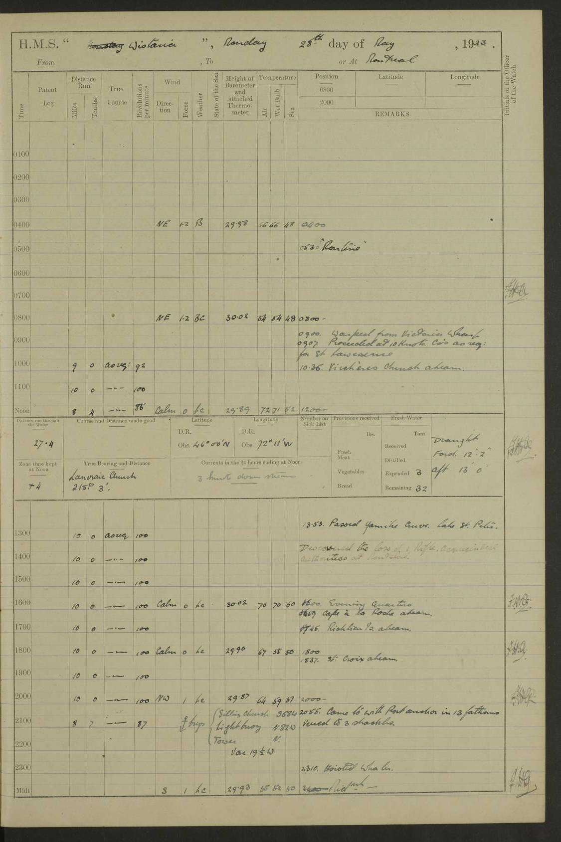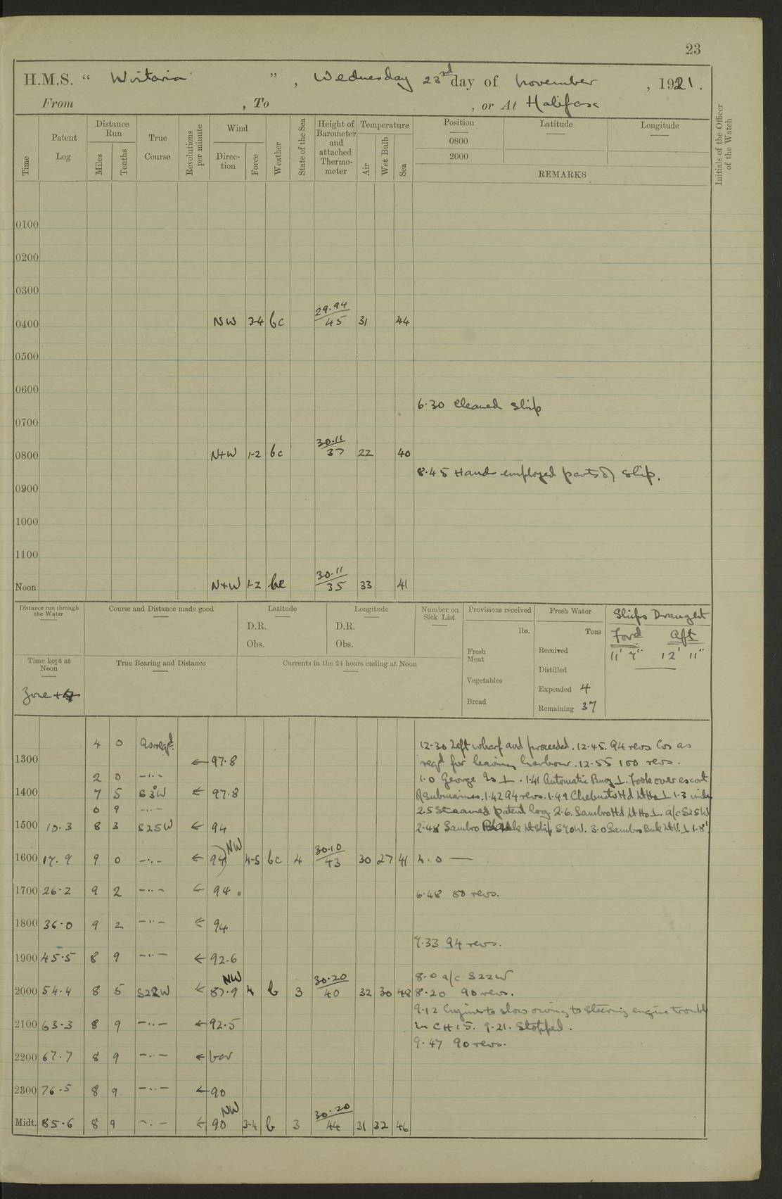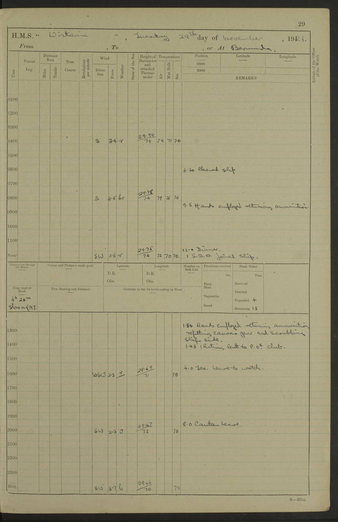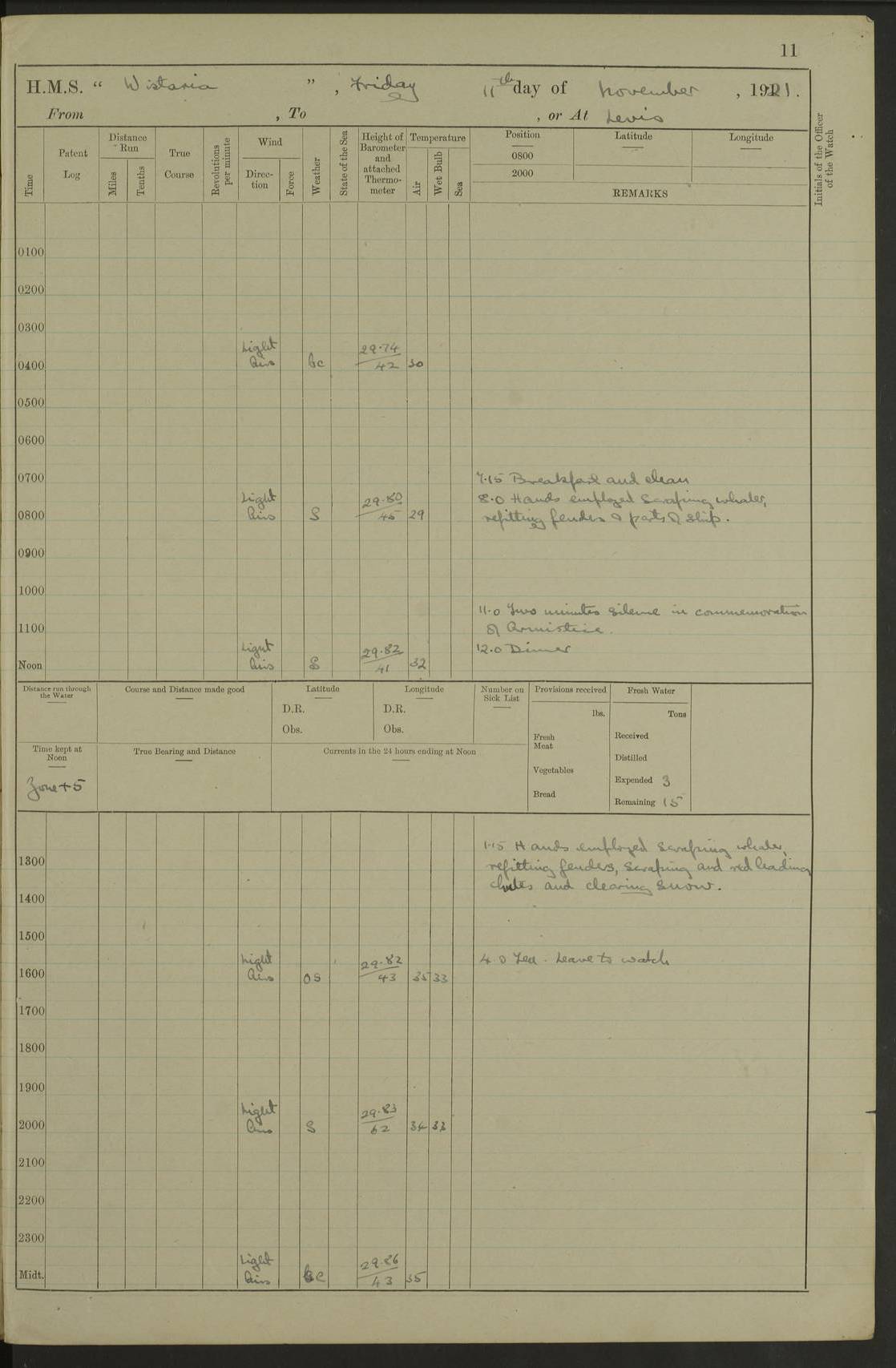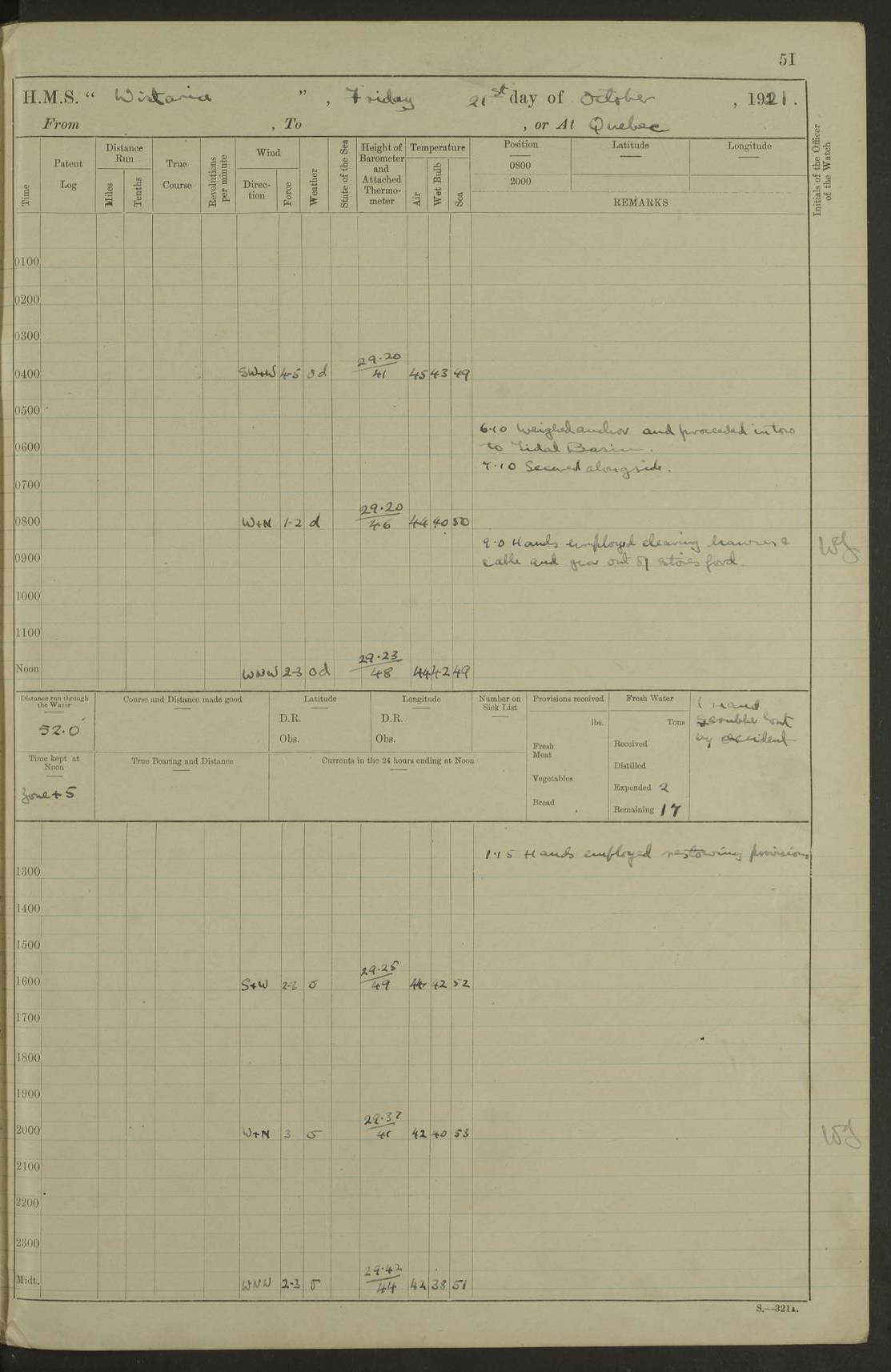 LOGS FOR NOVEMBER 1921 4f73ca6ea2fc8ea903000ad1: (https://s3.amazonaws.com:443/oldweather/ADM53-93264/0003_1.jpg) 4f73ca69a2fc8ea903000ac6: (https://s3.amazonaws.com:443/oldweather/ADM53-93263/0034_0.jpg) 1 November 1921 At Lévis Lat 46.8, Long -71.19 10.0am: Hands employed blacking down rigging refitting guard rails & scraping 1st whaler 1.10pm: Hands mustered for monthly payment 1.30pm: Hands employed as forenoon 5.0pm: [Exercised] fire stations 4f73ca6ea2fc8ea903000ad2: (https://s3.amazonaws.com:443/oldweather/ADM53-93264/0004_0.jpg) 4f73ca6aa2fc8ea903000ac7: (https://s3.amazonaws.com:443/oldweather/ADM53-93263/0034_1.jpg) 2 November 1921 At Lévis Lat 46.8, Long -71.19 8.0am: Hands employed blacking down rigging, refitting guard rails, chipping ship's side and scraping first whales 1.15pm: Hands employed as forenoon 4f73ca6ea2fc8ea903000ad3: (https://s3.amazonaws.com:443/oldweather/ADM53-93264/0004_1.jpg) 3 November 1921 At Lévis Lat 46.8, Long -71.19 8.0am: Hands employed refitting guard rails, chipping ship’s side & scraping whaler 1.15pm: Hands employed as forenoon 4f73ca6fa2fc8ea903000ad4: (https://s3.amazonaws.com:443/oldweather/ADM53-93264/0005_0.jpg) 4 November 1921 At Lévis Lat 46.8, Long -71.19 8.0am: Hands employed parts of ship 1.15pm: Hands employed variously parts of ship 5.0pm: Exercised fire quarters 4f73ca6fa2fc8ea903000ad5: (https://s3.amazonaws.com:443/oldweather/ADM53-93264/0005_1.jpg) 5 November 1921 At Lévis Lat 46.8, Long -71.19 8.0am: Hands employed scraping ship’s side and boats and working about storerooms 4f73ca70a2fc8ea903000ad6: (https://s3.amazonaws.com:443/oldweather/ADM53-93264/0006_0.jpg) 6 November 1921 At Lévis Lat 46.8, Long -71.19 8.0am: Scrubbed decks 5.0pm: Exercised fire quarters 4f73ca70a2fc8ea903000ad7: (https://s3.amazonaws.com:443/oldweather/ADM53-93264/0006_1.jpg) 7 November 1921 At Lévis Lat 46.8, Long -71.19 8.40am: Seaman landing party landed 12.25am: Landing party returned 1.45pm: Hands employed scraping boats & cleaning ship 4f73ca70a2fc8ea903000ad8: (https://s3.amazonaws.com:443/oldweather/ADM53-93264/0007_0.jpg) 8 November 1921 At Lévis Lat 46.8, Long -71.19 8.0am: Hands employed cleaning store rooms, refitting guard rails & scraping boats 1.15pm: Hands employed cleaning store rooms, refitting guard rails & scraping boats 4f73ca71a2fc8ea903000ad9: (https://s3.amazonaws.com:443/oldweather/ADM53-93264/0007_1.jpg) 9 November 1921 At Lévis Lat 46.8, Long -71.19 8.0am: Hands employed scraping & redleading ship’s side, cleaning storerooms & scraping boats 1.15pm: Hands employed painting part of ship’s side, painting 1st whaler, scraping 2nd whaler, refitting guard rails and cleaning after store room 5.0pm: Exercised fire quarters 4f73ca71a2fc8ea903000ada: (https://s3.amazonaws.com:443/oldweather/ADM53-93264/0008_0.jpg) 10 November 1921 At Lévis Lat 46.8, Long -71.19 8.0am: Hands employed refitting guard rails, scraping 2nd whaler and clearing away snow 1.15pm: Hands employed as forenoon 4f73ca71a2fc8ea903000adb: (https://s3.amazonaws.com:443/oldweather/ADM53-93264/0008_1.jpg) 11 November 1921 At Lévis Lat 46.8, Long -71.19 8.0am: Hands employed scraping whaler, refitting fenders & parts of ship 11.0am: Two minutes silence in commemoration of Armistice 1.15pm: Hands employed scraping whaler, refitting fenders, scraping and redleading chutes and clearing snow 4f73ca72a2fc8ea903000adc: (https://s3.amazonaws.com:443/oldweather/ADM53-93264/0009_0.jpg) 12 November 1921 At Lévis Lat 46.8, Long -71.19 8.0am: Hands employed parts of ship and scraping boats & refitting fenders 4f73ca72a2fc8ea903000add: (https://s3.amazonaws.com:443/oldweather/ADM53-93264/0009_1.jpg) 13 November 1921 At Lévis Lat 46.8, Long -71.19 8.0am: Cleaned ship 10.0am: Divisions and Prayers 4f73ca72a2fc8ea903000ade: (https://s3.amazonaws.com:443/oldweather/ADM53-93264/0010_0.jpg) 14 November 1921 At Lévis Lat 46.8, Long -71.19 8.0am: Hands employed embarking ammunition and working about 2nd whaler 1.15pm: Hands employed embarking ammunition and restowing provisions 4f73ca73a2fc8ea903000adf: (https://s3.amazonaws.com:443/oldweather/ADM53-93264/0010_1.jpg) 15 November 1921 At Lévis Lat 46.8, Long -71.19 8.0am: Hands employed parts of ship 1.15pm: Hands employed cleaning up ship 4f73ca73a2fc8ea903000ae0: (https://s3.amazonaws.com:443/oldweather/ADM53-93264/0011_0.jpg) 16 November 1921 At Lévis Lat 46.8, Long -71.19 8.0am: Hands employed parts of ship noon: Dinner & clean in coaling rig 1.15pm: Hands employed parts of ship 2.55pm: Commenced flooding dock 3.20pm: Ship became water borne. Starboard watch to tea 4.0pm: Port watch to tea 4.10pm: Shifted ship from dock to jetty outside 4.40pm: Coal lighter secured alongside 5.0pm: Hands coal ship 11.30pm: Commenced basin trials 4f73ca74a2fc8ea903000ae1: (https://s3.amazonaws.com:443/oldweather/ADM53-93264/0011_1.jpg) 17 November 1921 From Quebec to Halifax [Lat 46.93, Long -70.73] [Belle Chasse Island coordinates] 8.15am: Left jetty and swung ship for compasses. Proceeded to Quebec to pick up pilot 10.0am: Proceeded with pilot down river, 100 revs 10.15am: Swung for adjustment off Lauzon Dock 10.20am: Proceeded. Course S81E 10.21am: West Pt abeam, increased to 120 revs 10.45am: St Laurent Pier abeam. Altered course N75E 11.10am: St Jean Pier abeam 11.15am: Let go Port anchor veered to 4 shackles One broom lost overboard by accident 12.40pm: Weighed 12.45pm: Proceeded 120 revs 1.15pm: Belle Chasse Lt Ho abeam 2.13pm: Crane Island Pier abeam 2.26pm: Beaujeu Beacon abeam 2.35pm: Rigged sounding boom 3.44pm: Algernon Rock abeam 4.57½pm: Lower Traverse Lt Vessel abeam, course N51E 5.53pm: Anchored in 12½ fms on English Bank, 4 shackles Anchor Bearings: Goose Island Lt N49W, Orignaux Pt S84E, [space left blank] S14½E [“English Bank: proper extends from a position 4 miles NNW of Orignaux Point for about 10 miles SW by W¼W, to Middle ground with a width of about half a mile at its eastern point, gradually increasing