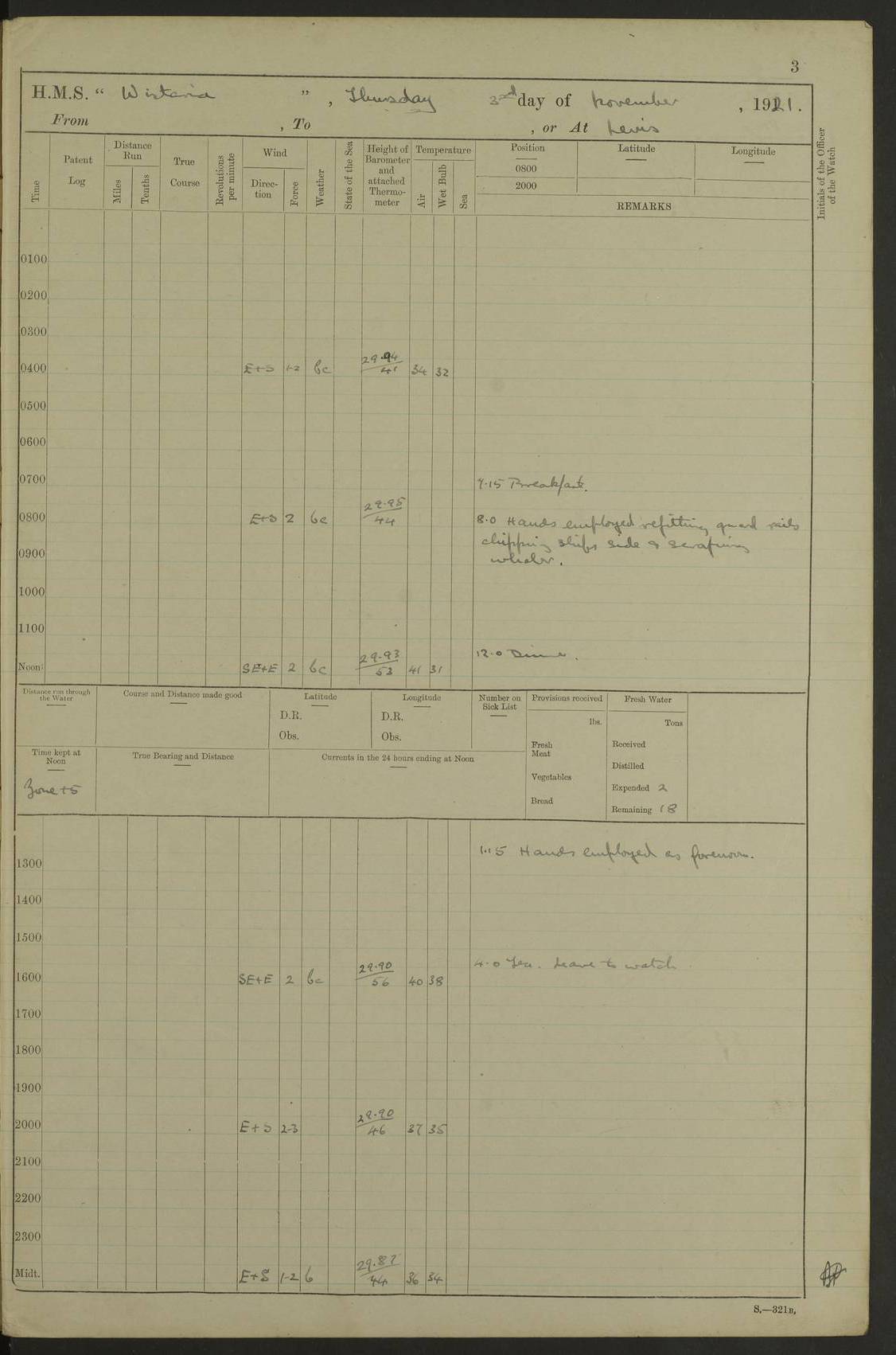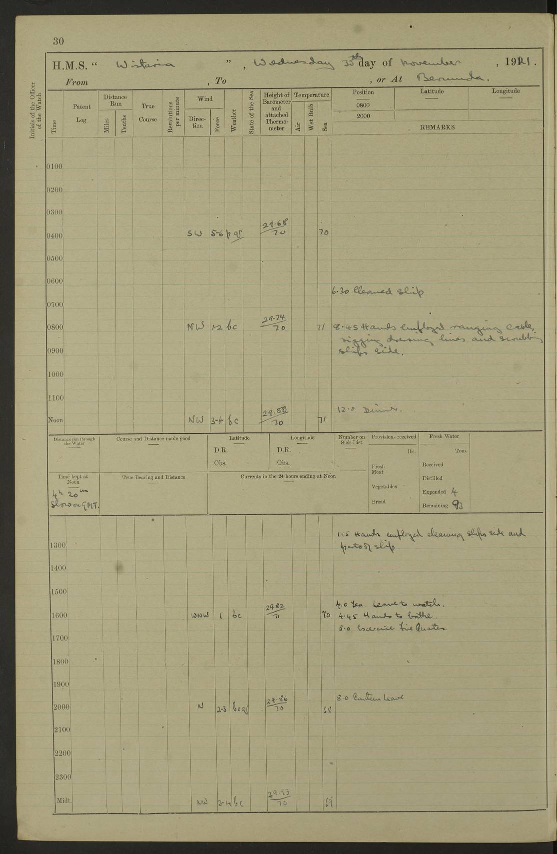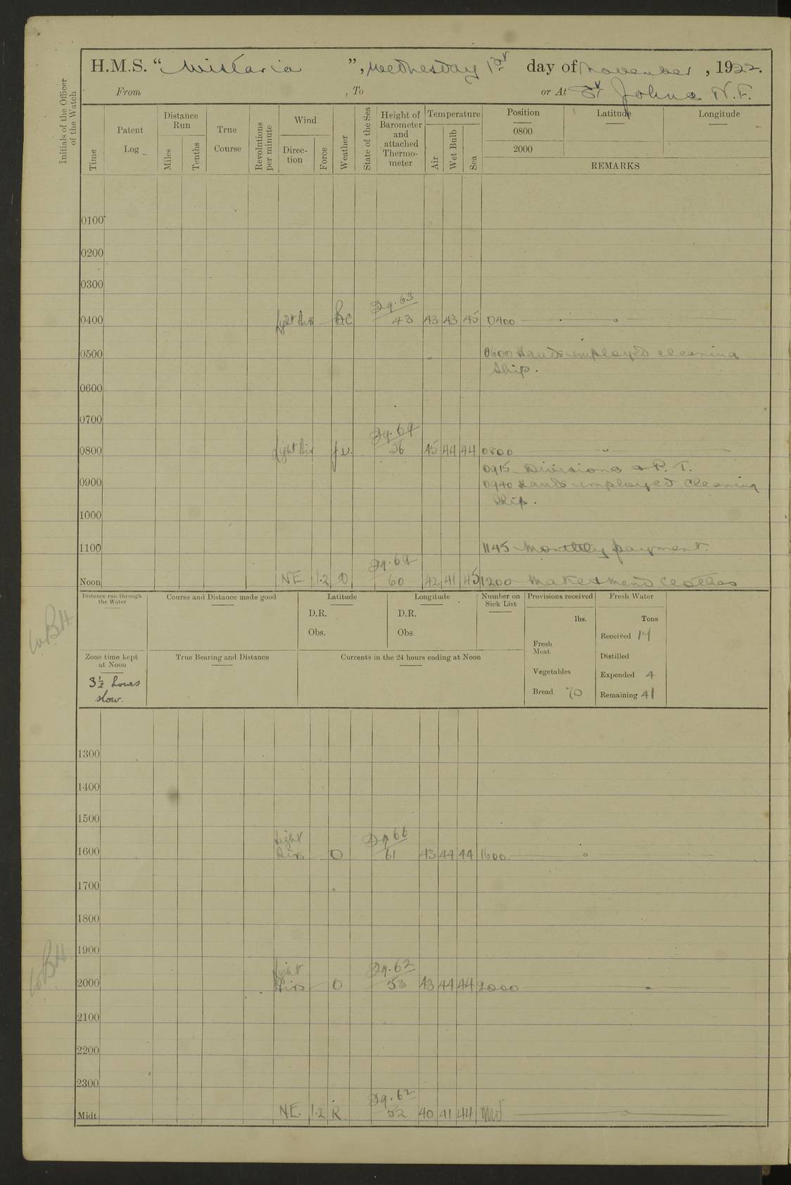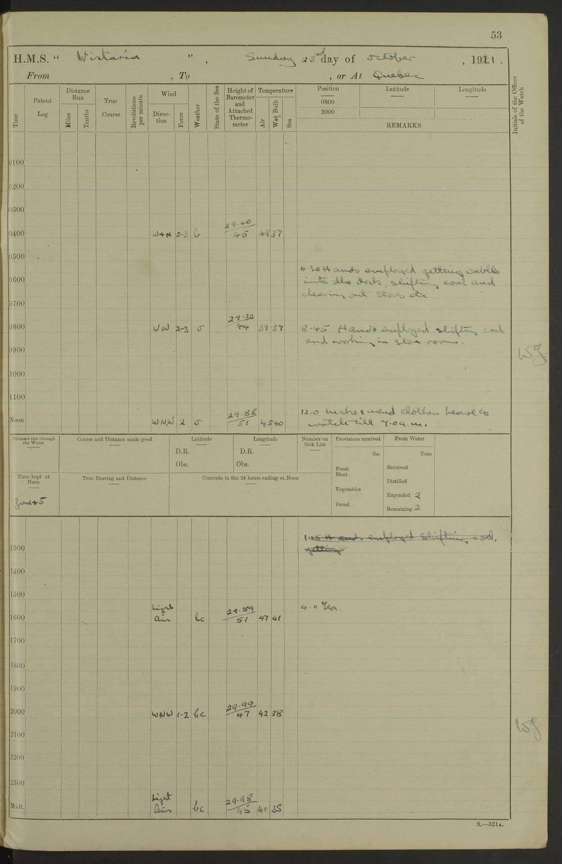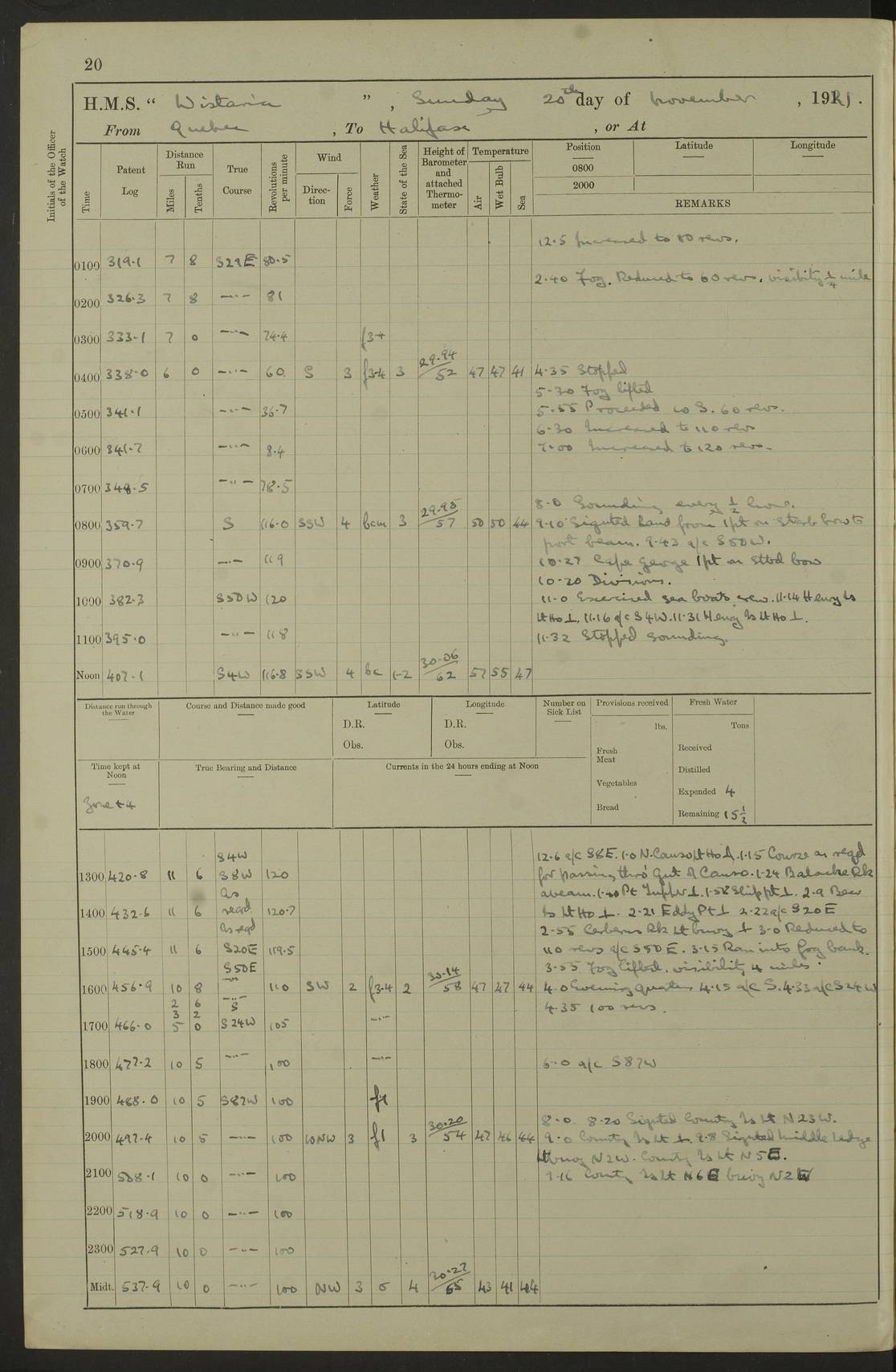 LOGS FOR NOVEMBER 1921 4f73ca6ea2fc8ea903000ad1: (https://s3.amazonaws.com:443/oldweather/ADM53-93264/0003_1.jpg) 4f73ca69a2fc8ea903000ac6: (https://s3.amazonaws.com:443/oldweather/ADM53-93263/0034_0.jpg) 1 November 1921 At Lévis Lat 46.8, Long -71.19 10.0am: Hands employed blacking down rigging refitting guard rails & scraping 1st whaler 1.10pm: Hands mustered for monthly payment 1.30pm: Hands employed as forenoon 5.0pm: [Exercised] fire stations 4f73ca6ea2fc8ea903000ad2: (https://s3.amazonaws.com:443/oldweather/ADM53-93264/0004_0.jpg) 4f73ca6aa2fc8ea903000ac7: (https://s3.amazonaws.com:443/oldweather/ADM53-93263/0034_1.jpg) 2 November 1921 At Lévis Lat 46.8, Long -71.19 8.0am: Hands employed blacking down rigging, refitting guard rails, chipping ship's side and scraping first whales 1.15pm: Hands employed as forenoon 4f73ca6ea2fc8ea903000ad3: (https://s3.amazonaws.com:443/oldweather/ADM53-93264/0004_1.jpg) 3 November 1921 At Lévis Lat 46.8, Long -71.19 8.0am: Hands employed refitting guard rails, chipping ship’s side & scraping whaler 1.15pm: Hands employed as forenoon 4f73ca6fa2fc8ea903000ad4: (https://s3.amazonaws.com:443/oldweather/ADM53-93264/0005_0.jpg) 4 November 1921 At Lévis Lat 46.8, Long -71.19 8.0am: Hands employed parts of ship 1.15pm: Hands employed variously parts of ship 5.0pm: Exercised fire quarters 4f73ca6fa2fc8ea903000ad5: (https://s3.amazonaws.com:443/oldweather/ADM53-93264/0005_1.jpg) 5 November 1921 At Lévis Lat 46.8, Long -71.19 8.0am: Hands employed scraping ship’s side and boats and working about storerooms 4f73ca70a2fc8ea903000ad6: (https://s3.amazonaws.com:443/oldweather/ADM53-93264/0006_0.jpg) 6 November 1921 At Lévis Lat 46.8, Long -71.19 8.0am: Scrubbed decks 5.0pm: Exercised fire quarters 4f73ca70a2fc8ea903000ad7: (https://s3.amazonaws.com:443/oldweather/ADM53-93264/0006_1.jpg) 7 November 1921 At Lévis Lat 46.8, Long -71.19 8.40am: Seaman landing party landed 12.25am: Landing party returned 1.45pm: Hands employed scraping boats & cleaning ship 4f73ca70a2fc8ea903000ad8: (https://s3.amazonaws.com:443/oldweather/ADM53-93264/0007_0.jpg) 8 November 1921 At Lévis Lat 46.8, Long -71.19 8.0am: Hands employed cleaning store rooms, refitting guard rails & scraping boats 1.15pm: Hands employed cleaning store rooms, refitting guard rails & scraping boats 4f73ca71a2fc8ea903000ad9: (https://s3.amazonaws.com:443/oldweather/ADM53-93264/0007_1.jpg) 9 November 1921 At Lévis Lat 46.8, Long -71.19 8.0am: Hands employed scraping & redleading ship’s side, cleaning storerooms & scraping boats 1.15pm: Hands employed painting part of ship’s side, painting 1st whaler, scraping 2nd whaler, refitting guard rails and cleaning after store room 5.0pm: Exercised fire quarters 4f73ca71a2fc8ea903000ada: (https://s3.amazonaws.com:443/oldweather/ADM53-93264/0008_0.jpg) 10 November 1921 At Lévis Lat 46.8, Long -71.19 8.0am: Hands employed refitting guard rails, scraping 2nd whaler and clearing away snow 1.15pm: Hands employed as forenoon 4f73ca71a2fc8ea903000adb: (https://s3.amazonaws.com:443/oldweather/ADM53-93264/0008_1.jpg) 11 November 1921 At Lévis Lat 46.8, Long -71.19 8.0am: Hands employed scraping whaler, refitting fenders & parts of ship 11.0am: Two minutes silence in commemoration of Armistice 1.15pm: Hands employed scraping whaler, refitting fenders, scraping and redleading chutes and clearing snow 4f73ca72a2fc8ea903000adc: (https://s3.amazonaws.com:443/oldweather/ADM53-93264/0009_0.jpg) 12 November 1921 At Lévis Lat 46.8, Long -71.19 8.0am: Hands employed parts of ship and scraping boats & refitting fenders 4f73ca72a2fc8ea903000add: (https://s3.amazonaws.com:443/oldweather/ADM53-93264/0009_1.jpg) 13 November 1921 At Lévis Lat 46.8, Long -71.19 8.0am: Cleaned ship 10.0am: Divisions and Prayers 4f73ca72a2fc8ea903000ade: (https://s3.amazonaws.com:443/oldweather/ADM53-93264/0010_0.jpg) 14 November 1921 At Lévis Lat 46.8, Long -71.19 8.0am: Hands employed embarking ammunition and working about 2nd whaler 1.15pm: Hands employed embarking ammunition and restowing provisions 4f73ca73a2fc8ea903000adf: (https://s3.amazonaws.com:443/oldweather/ADM53-93264/0010_1.jpg) 15 November 1921 At Lévis Lat 46.8, Long -71.19 8.0am: Hands employed parts of ship 1.15pm: Hands employed cleaning up ship 4f73ca73a2fc8ea903000ae0: (https://s3.amazonaws.com:443/oldweather/ADM53-93264/0011_0.jpg) 16 November 1921 At Lévis Lat 46.8, Long -71.19 8.0am: Hands employed parts of ship noon: Dinner & clean in coaling rig 1.15pm: Hands employed parts of ship 2.55pm: Commenced flooding dock 3.20pm: Ship became water borne. Starboard watch to tea 4.0pm: Port watch to tea 4.10pm: Shifted ship from dock to jetty outside 4.40pm: Coal lighter secured alongside 5.0pm: Hands coal ship 11.30pm: Commenced basin trials 4f73ca74a2fc8ea903000ae1: (https://s3.amazonaws.com:443/oldweather/ADM53-93264/0011_1.jpg) 17 November 1921 From Quebec to Halifax [Lat 46.93, Long -70.73] [Belle Chasse Island coordinates] 8.15am: Left jetty and swung ship for compasses. Proceeded to Quebec to pick up pilot 10.0am: Proceeded with pilot down river, 100 revs 10.15am: Swung for adjustment off Lauzon Dock 10.20am: Proceeded. Course S81E 10.21am: West Pt abeam, increased to 120 revs 10.45am: St Laurent Pier abeam. Altered course N75E 11.10am: St Jean Pier abeam 11.15am: Let go Port anchor veered to 4 shackles One broom lost overboard by accident 12.40pm: Weighed 12.45pm: Proceeded 120 revs 1.15pm: Belle Chasse Lt Ho abeam 2.13pm: Crane Island Pier abeam 2.26pm: Beaujeu Beacon abeam 2.35pm: Rigged sounding boom 3.44pm: Algernon Rock abeam 4.57½pm: Lower Traverse Lt Vessel abeam, course N51E 5.53pm: Anchored in 12½ fms on English Bank, 4 shackles Anchor Bearings: Goose Island Lt N49W, Orignaux Pt S84E, [space left blank] S14½E [“English Bank: proper extends from a position 4 miles NNW of Orignaux Point for about 10 miles SW by W¼W, to Middle ground with a width of about half a mile at its eastern point, gradually increasing
