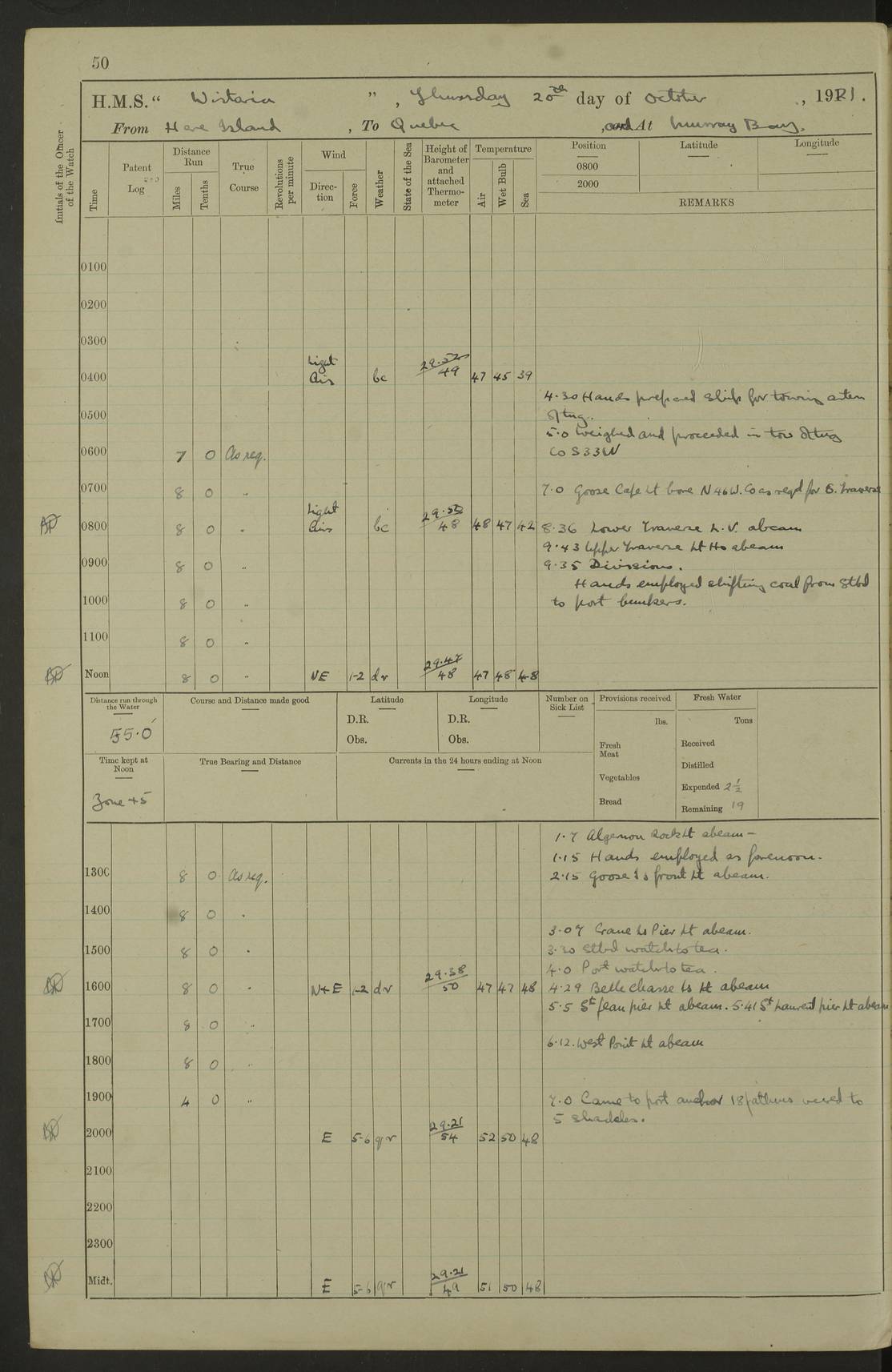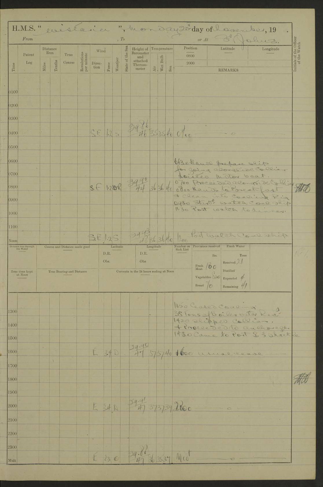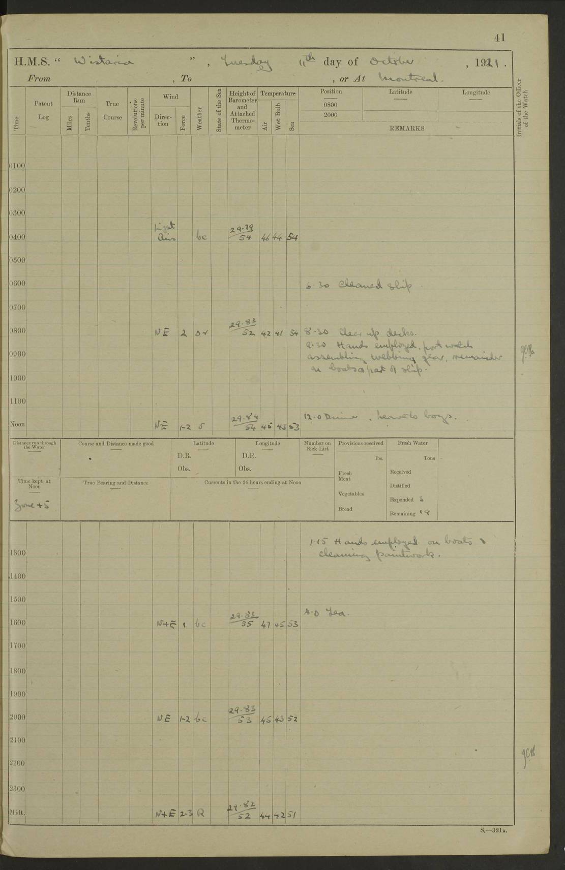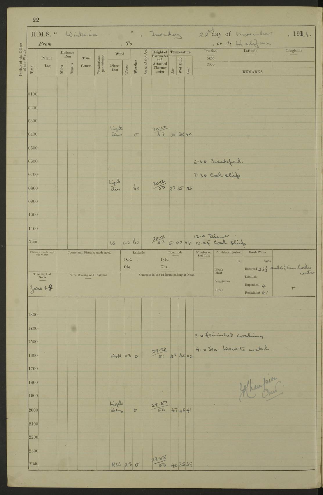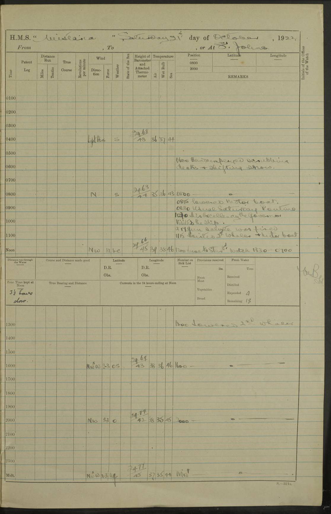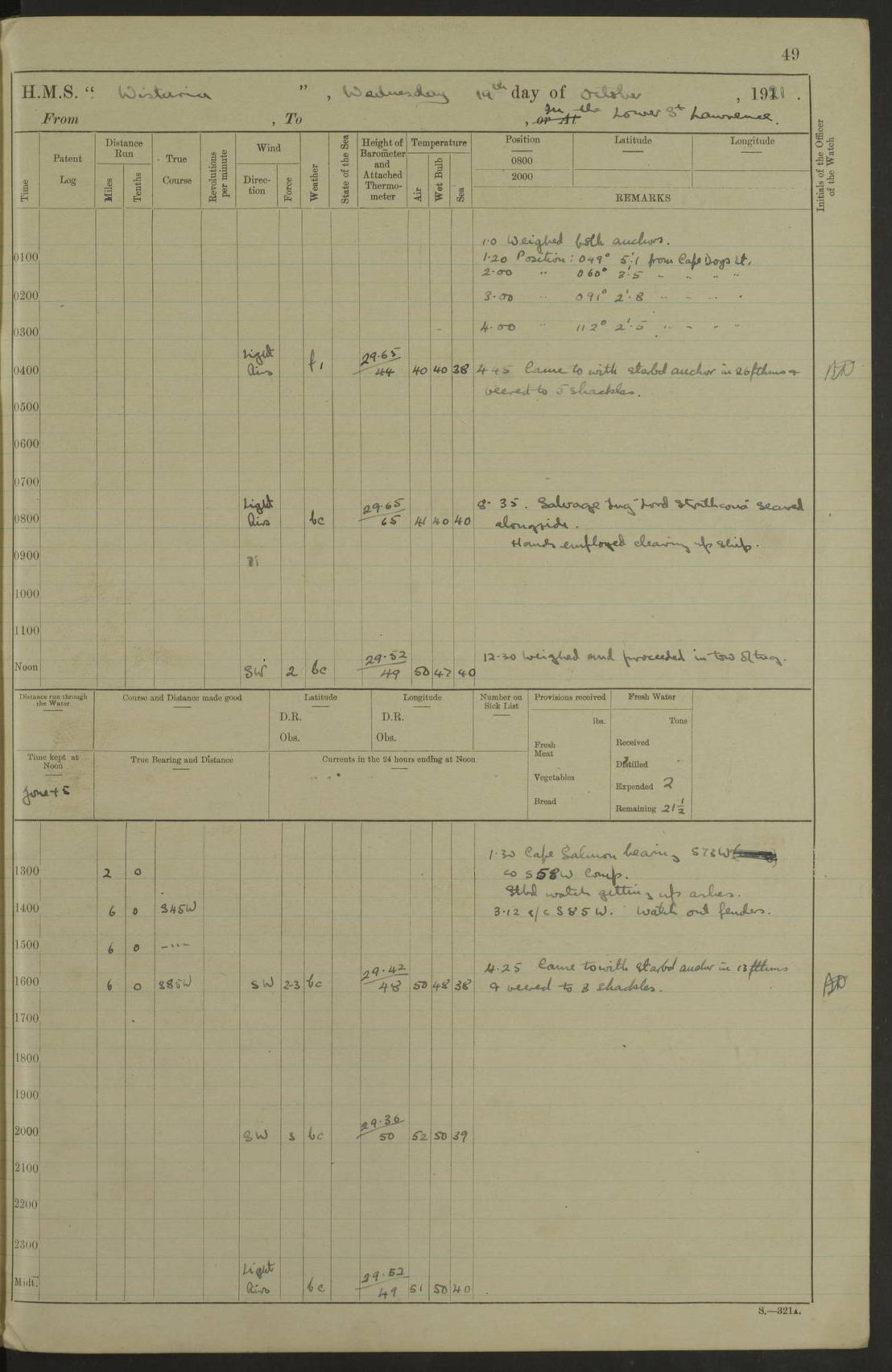 LOGS FOR NOVEMBER 1921 4f73ca6ea2fc8ea903000ad1: (https://s3.amazonaws.com:443/oldweather/ADM53-93264/0003_1.jpg) 4f73ca69a2fc8ea903000ac6: (https://s3.amazonaws.com:443/oldweather/ADM53-93263/0034_0.jpg) 1 November 1921 At Lévis Lat 46.8, Long -71.19 10.0am: Hands employed blacking down rigging refitting guard rails & scraping 1st whaler 1.10pm: Hands mustered for monthly payment 1.30pm: Hands employed as forenoon 5.0pm: [Exercised] fire stations 4f73ca6ea2fc8ea903000ad2: (https://s3.amazonaws.com:443/oldweather/ADM53-93264/0004_0.jpg) 4f73ca6aa2fc8ea903000ac7: (https://s3.amazonaws.com:443/oldweather/ADM53-93263/0034_1.jpg) 2 November 1921 At Lévis Lat 46.8, Long -71.19 8.0am: Hands employed blacking down rigging, refitting guard rails, chipping ship's side and scraping first whales 1.15pm: Hands employed as forenoon 4f73ca6ea2fc8ea903000ad3: (https://s3.amazonaws.com:443/oldweather/ADM53-93264/0004_1.jpg) 3 November 1921 At Lévis Lat 46.8, Long -71.19 8.0am: Hands employed refitting guard rails, chipping ship’s side & scraping whaler 1.15pm: Hands employed as forenoon 4f73ca6fa2fc8ea903000ad4: (https://s3.amazonaws.com:443/oldweather/ADM53-93264/0005_0.jpg) 4 November 1921 At Lévis Lat 46.8, Long -71.19 8.0am: Hands employed parts of ship 1.15pm: Hands employed variously parts of ship 5.0pm: Exercised fire quarters 4f73ca6fa2fc8ea903000ad5: (https://s3.amazonaws.com:443/oldweather/ADM53-93264/0005_1.jpg) 5 November 1921 At Lévis Lat 46.8, Long -71.19 8.0am: Hands employed scraping ship’s side and boats and working about storerooms 4f73ca70a2fc8ea903000ad6: (https://s3.amazonaws.com:443/oldweather/ADM53-93264/0006_0.jpg) 6 November 1921 At Lévis Lat 46.8, Long -71.19 8.0am: Scrubbed decks 5.0pm: Exercised fire quarters 4f73ca70a2fc8ea903000ad7: (https://s3.amazonaws.com:443/oldweather/ADM53-93264/0006_1.jpg) 7 November 1921 At Lévis Lat 46.8, Long -71.19 8.40am: Seaman landing party landed 12.25am: Landing party returned 1.45pm: Hands employed scraping boats & cleaning ship 4f73ca70a2fc8ea903000ad8: (https://s3.amazonaws.com:443/oldweather/ADM53-93264/0007_0.jpg) 8 November 1921 At Lévis Lat 46.8, Long -71.19 8.0am: Hands employed cleaning store rooms, refitting guard rails & scraping boats 1.15pm: Hands employed cleaning store rooms, refitting guard rails & scraping boats 4f73ca71a2fc8ea903000ad9: (https://s3.amazonaws.com:443/oldweather/ADM53-93264/0007_1.jpg) 9 November 1921 At Lévis Lat 46.8, Long -71.19 8.0am: Hands employed scraping & redleading ship’s side, cleaning storerooms & scraping boats 1.15pm: Hands employed painting part of ship’s side, painting 1st whaler, scraping 2nd whaler, refitting guard rails and cleaning after store room 5.0pm: Exercised fire quarters 4f73ca71a2fc8ea903000ada: (https://s3.amazonaws.com:443/oldweather/ADM53-93264/0008_0.jpg) 10 November 1921 At Lévis Lat 46.8, Long -71.19 8.0am: Hands employed refitting guard rails, scraping 2nd whaler and clearing away snow 1.15pm: Hands employed as forenoon 4f73ca71a2fc8ea903000adb: (https://s3.amazonaws.com:443/oldweather/ADM53-93264/0008_1.jpg) 11 November 1921 At Lévis Lat 46.8, Long -71.19 8.0am: Hands employed scraping whaler, refitting fenders & parts of ship 11.0am: Two minutes silence in commemoration of Armistice 1.15pm: Hands employed scraping whaler, refitting fenders, scraping and redleading chutes and clearing snow 4f73ca72a2fc8ea903000adc: (https://s3.amazonaws.com:443/oldweather/ADM53-93264/0009_0.jpg) 12 November 1921 At Lévis Lat 46.8, Long -71.19 8.0am: Hands employed parts of ship and scraping boats & refitting fenders 4f73ca72a2fc8ea903000add: (https://s3.amazonaws.com:443/oldweather/ADM53-93264/0009_1.jpg) 13 November 1921 At Lévis Lat 46.8, Long -71.19 8.0am: Cleaned ship 10.0am: Divisions and Prayers 4f73ca72a2fc8ea903000ade: (https://s3.amazonaws.com:443/oldweather/ADM53-93264/0010_0.jpg) 14 November 1921 At Lévis Lat 46.8, Long -71.19 8.0am: Hands employed embarking ammunition and working about 2nd whaler 1.15pm: Hands employed embarking ammunition and restowing provisions 4f73ca73a2fc8ea903000adf: (https://s3.amazonaws.com:443/oldweather/ADM53-93264/0010_1.jpg) 15 November 1921 At Lévis Lat 46.8, Long -71.19 8.0am: Hands employed parts of ship 1.15pm: Hands employed cleaning up ship 4f73ca73a2fc8ea903000ae0: (https://s3.amazonaws.com:443/oldweather/ADM53-93264/0011_0.jpg) 16 November 1921 At Lévis Lat 46.8, Long -71.19 8.0am: Hands employed parts of ship noon: Dinner & clean in coaling rig 1.15pm: Hands employed parts of ship 2.55pm: Commenced flooding dock 3.20pm: Ship became water borne. Starboard watch to tea 4.0pm: Port watch to tea 4.10pm: Shifted ship from dock to jetty outside 4.40pm: Coal lighter secured alongside 5.0pm: Hands coal ship 11.30pm: Commenced basin trials 4f73ca74a2fc8ea903000ae1: (https://s3.amazonaws.com:443/oldweather/ADM53-93264/0011_1.jpg) 17 November 1921 From Quebec to Halifax [Lat 46.93, Long -70.73] [Belle Chasse Island coordinates] 8.15am: Left jetty and swung ship for compasses. Proceeded to Quebec to pick up pilot 10.0am: Proceeded with pilot down river, 100 revs 10.15am: Swung for adjustment off Lauzon Dock 10.20am: Proceeded. Course S81E 10.21am: West Pt abeam, increased to 120 revs 10.45am: St Laurent Pier abeam. Altered course N75E 11.10am: St Jean Pier abeam 11.15am: Let go Port anchor veered to 4 shackles One broom lost overboard by accident 12.40pm: Weighed 12.45pm: Proceeded 120 revs 1.15pm: Belle Chasse Lt Ho abeam 2.13pm: Crane Island Pier abeam 2.26pm: Beaujeu Beacon abeam 2.35pm: Rigged sounding boom 3.44pm: Algernon Rock abeam 4.57½pm: Lower Traverse Lt Vessel abeam, course N51E 5.53pm: Anchored in 12½ fms on English Bank, 4 shackles Anchor Bearings: Goose Island Lt N49W, Orignaux Pt S84E, [space left blank] S14½E [“English Bank: proper extends from a position 4 miles NNW of Orignaux Point for about 10 miles SW by W¼W, to Middle ground with a width of about half a mile at its eastern point, gradually increasing