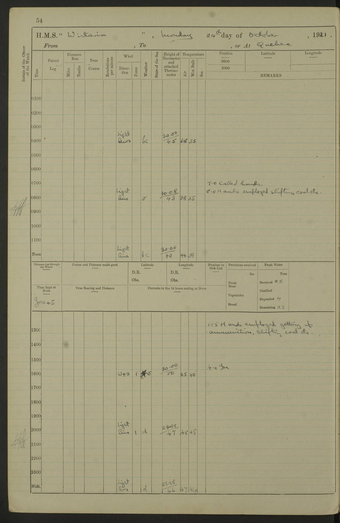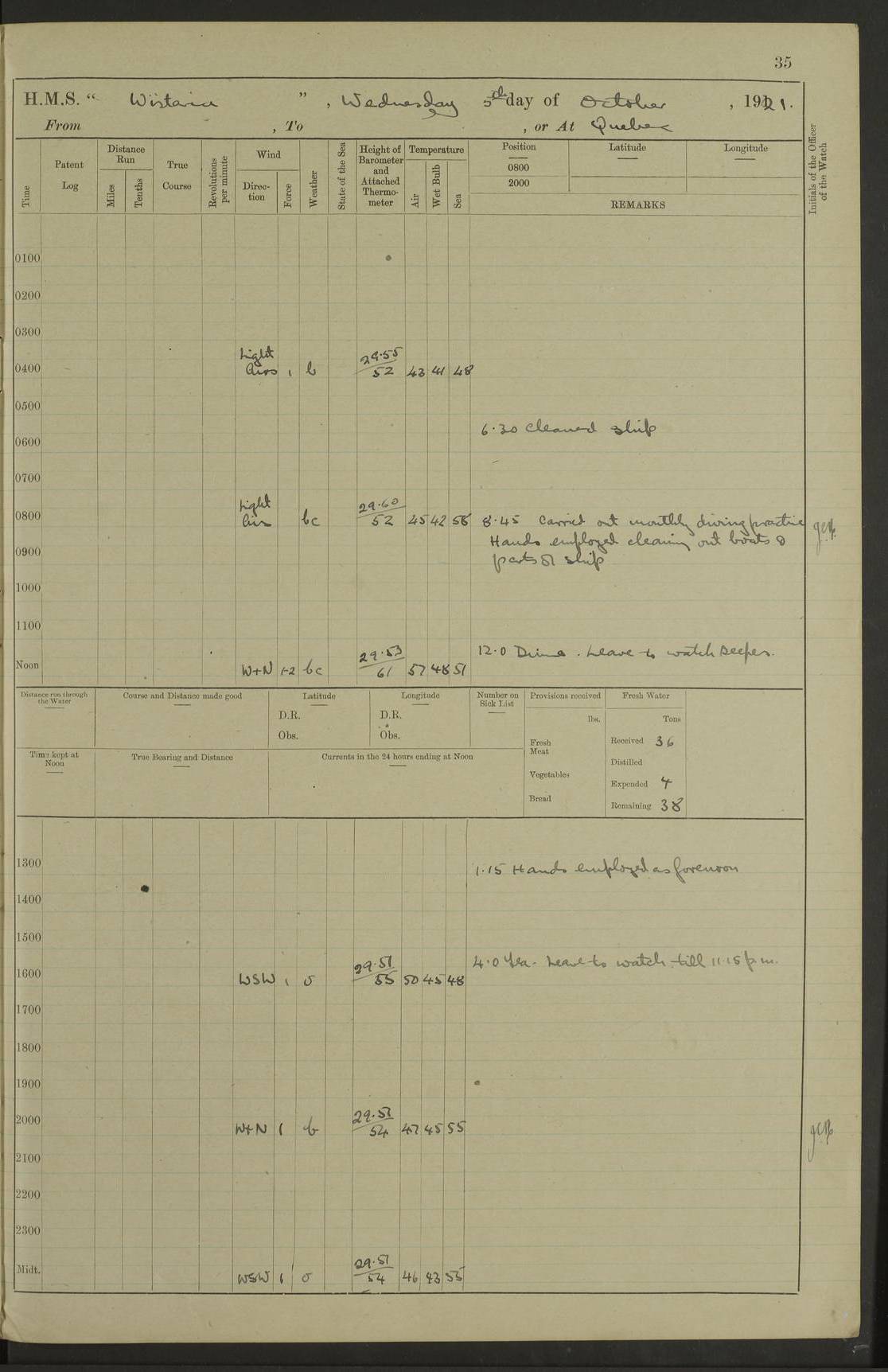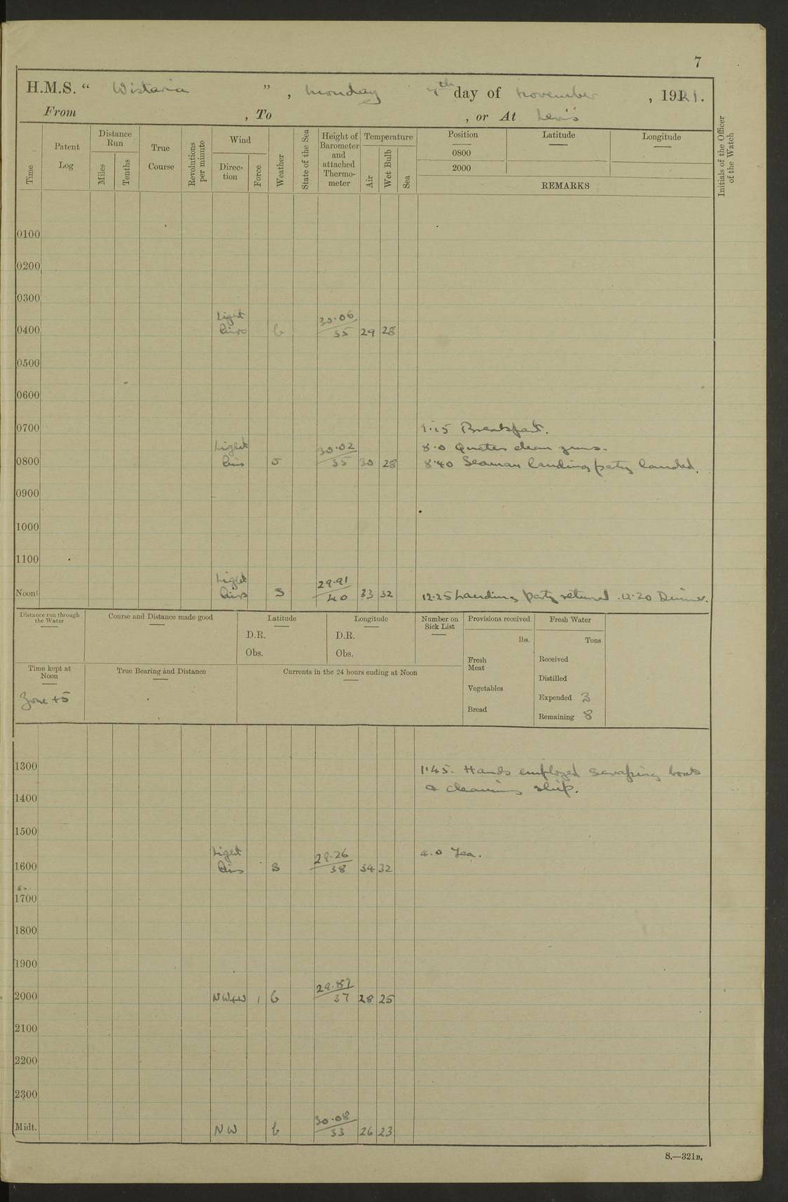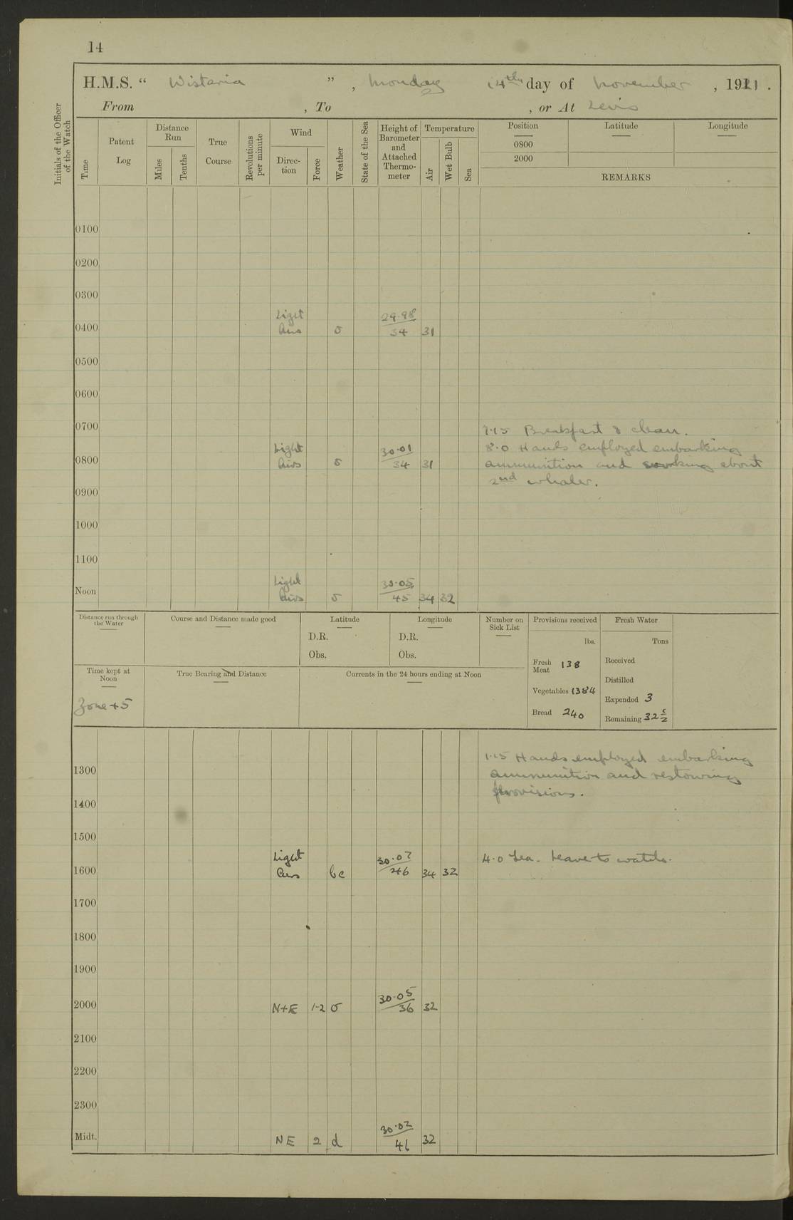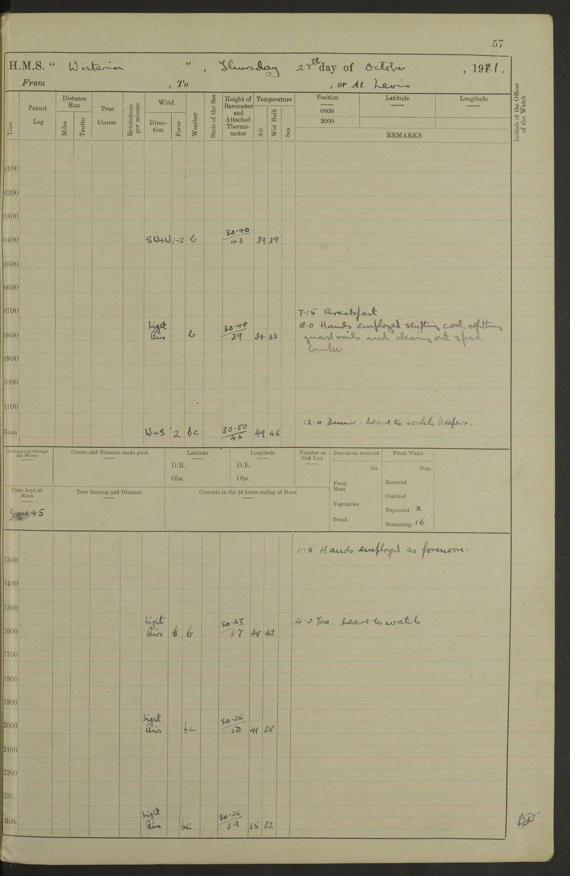 LOGS FOR NOVEMBER 1921 4f73ca6ea2fc8ea903000ad1: (https://s3.amazonaws.com:443/oldweather/ADM53-93264/0003_1.jpg) 4f73ca69a2fc8ea903000ac6: (https://s3.amazonaws.com:443/oldweather/ADM53-93263/0034_0.jpg) 1 November 1921 At Lévis Lat 46.8, Long -71.19 10.0am: Hands employed blacking down rigging refitting guard rails & scraping 1st whaler 1.10pm: Hands mustered for monthly payment 1.30pm: Hands employed as forenoon 5.0pm: [Exercised] fire stations 4f73ca6ea2fc8ea903000ad2: (https://s3.amazonaws.com:443/oldweather/ADM53-93264/0004_0.jpg) 4f73ca6aa2fc8ea903000ac7: (https://s3.amazonaws.com:443/oldweather/ADM53-93263/0034_1.jpg) 2 November 1921 At Lévis Lat 46.8, Long -71.19 8.0am: Hands employed blacking down rigging, refitting guard rails, chipping ship's side and scraping first whales 1.15pm: Hands employed as forenoon 4f73ca6ea2fc8ea903000ad3: (https://s3.amazonaws.com:443/oldweather/ADM53-93264/0004_1.jpg) 3 November 1921 At Lévis Lat 46.8, Long -71.19 8.0am: Hands employed refitting guard rails, chipping ship’s side & scraping whaler 1.15pm: Hands employed as forenoon 4f73ca6fa2fc8ea903000ad4: (https://s3.amazonaws.com:443/oldweather/ADM53-93264/0005_0.jpg) 4 November 1921 At Lévis Lat 46.8, Long -71.19 8.0am: Hands employed parts of ship 1.15pm: Hands employed variously parts of ship 5.0pm: Exercised fire quarters 4f73ca6fa2fc8ea903000ad5: (https://s3.amazonaws.com:443/oldweather/ADM53-93264/0005_1.jpg) 5 November 1921 At Lévis Lat 46.8, Long -71.19 8.0am: Hands employed scraping ship’s side and boats and working about storerooms 4f73ca70a2fc8ea903000ad6: (https://s3.amazonaws.com:443/oldweather/ADM53-93264/0006_0.jpg) 6 November 1921 At Lévis Lat 46.8, Long -71.19 8.0am: Scrubbed decks 5.0pm: Exercised fire quarters 4f73ca70a2fc8ea903000ad7: (https://s3.amazonaws.com:443/oldweather/ADM53-93264/0006_1.jpg) 7 November 1921 At Lévis Lat 46.8, Long -71.19 8.40am: Seaman landing party landed 12.25am: Landing party returned 1.45pm: Hands employed scraping boats & cleaning ship 4f73ca70a2fc8ea903000ad8: (https://s3.amazonaws.com:443/oldweather/ADM53-93264/0007_0.jpg) 8 November 1921 At Lévis Lat 46.8, Long -71.19 8.0am: Hands employed cleaning store rooms, refitting guard rails & scraping boats 1.15pm: Hands employed cleaning store rooms, refitting guard rails & scraping boats 4f73ca71a2fc8ea903000ad9: (https://s3.amazonaws.com:443/oldweather/ADM53-93264/0007_1.jpg) 9 November 1921 At Lévis Lat 46.8, Long -71.19 8.0am: Hands employed scraping & redleading ship’s side, cleaning storerooms & scraping boats 1.15pm: Hands employed painting part of ship’s side, painting 1st whaler, scraping 2nd whaler, refitting guard rails and cleaning after store room 5.0pm: Exercised fire quarters 4f73ca71a2fc8ea903000ada: (https://s3.amazonaws.com:443/oldweather/ADM53-93264/0008_0.jpg) 10 November 1921 At Lévis Lat 46.8, Long -71.19 8.0am: Hands employed refitting guard rails, scraping 2nd whaler and clearing away snow 1.15pm: Hands employed as forenoon 4f73ca71a2fc8ea903000adb: (https://s3.amazonaws.com:443/oldweather/ADM53-93264/0008_1.jpg) 11 November 1921 At Lévis Lat 46.8, Long -71.19 8.0am: Hands employed scraping whaler, refitting fenders & parts of ship 11.0am: Two minutes silence in commemoration of Armistice 1.15pm: Hands employed scraping whaler, refitting fenders, scraping and redleading chutes and clearing snow 4f73ca72a2fc8ea903000adc: (https://s3.amazonaws.com:443/oldweather/ADM53-93264/0009_0.jpg) 12 November 1921 At Lévis Lat 46.8, Long -71.19 8.0am: Hands employed parts of ship and scraping boats & refitting fenders 4f73ca72a2fc8ea903000add: (https://s3.amazonaws.com:443/oldweather/ADM53-93264/0009_1.jpg) 13 November 1921 At Lévis Lat 46.8, Long -71.19 8.0am: Cleaned ship 10.0am: Divisions and Prayers 4f73ca72a2fc8ea903000ade: (https://s3.amazonaws.com:443/oldweather/ADM53-93264/0010_0.jpg) 14 November 1921 At Lévis Lat 46.8, Long -71.19 8.0am: Hands employed embarking ammunition and working about 2nd whaler 1.15pm: Hands employed embarking ammunition and restowing provisions 4f73ca73a2fc8ea903000adf: (https://s3.amazonaws.com:443/oldweather/ADM53-93264/0010_1.jpg) 15 November 1921 At Lévis Lat 46.8, Long -71.19 8.0am: Hands employed parts of ship 1.15pm: Hands employed cleaning up ship 4f73ca73a2fc8ea903000ae0: (https://s3.amazonaws.com:443/oldweather/ADM53-93264/0011_0.jpg) 16 November 1921 At Lévis Lat 46.8, Long -71.19 8.0am: Hands employed parts of ship noon: Dinner & clean in coaling rig 1.15pm: Hands employed parts of ship 2.55pm: Commenced flooding dock 3.20pm: Ship became water borne. Starboard watch to tea 4.0pm: Port watch to tea 4.10pm: Shifted ship from dock to jetty outside 4.40pm: Coal lighter secured alongside 5.0pm: Hands coal ship 11.30pm: Commenced basin trials 4f73ca74a2fc8ea903000ae1: (https://s3.amazonaws.com:443/oldweather/ADM53-93264/0011_1.jpg) 17 November 1921 From Quebec to Halifax [Lat 46.93, Long -70.73] [Belle Chasse Island coordinates] 8.15am: Left jetty and swung ship for compasses. Proceeded to Quebec to pick up pilot 10.0am: Proceeded with pilot down river, 100 revs 10.15am: Swung for adjustment off Lauzon Dock 10.20am: Proceeded. Course S81E 10.21am: West Pt abeam, increased to 120 revs 10.45am: St Laurent Pier abeam. Altered course N75E 11.10am: St Jean Pier abeam 11.15am: Let go Port anchor veered to 4 shackles One broom lost overboard by accident 12.40pm: Weighed 12.45pm: Proceeded 120 revs 1.15pm: Belle Chasse Lt Ho abeam 2.13pm: Crane Island Pier abeam 2.26pm: Beaujeu Beacon abeam 2.35pm: Rigged sounding boom 3.44pm: Algernon Rock abeam 4.57½pm: Lower Traverse Lt Vessel abeam, course N51E 5.53pm: Anchored in 12½ fms on English Bank, 4 shackles Anchor Bearings: Goose Island Lt N49W, Orignaux Pt S84E, [space left blank] S14½E [“English Bank: proper extends from a position 4 miles NNW of Orignaux Point for about 10 miles SW by W¼W, to Middle ground with a width of about half a mile at its eastern point, gradually increasing
