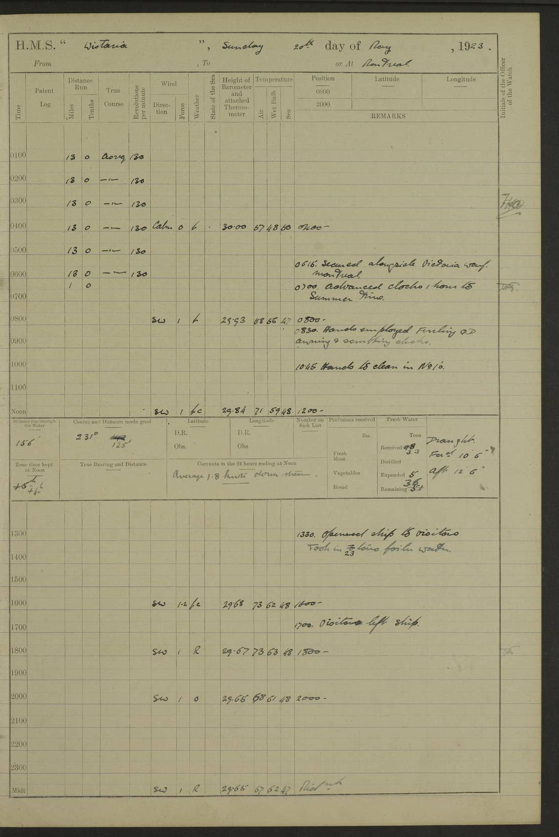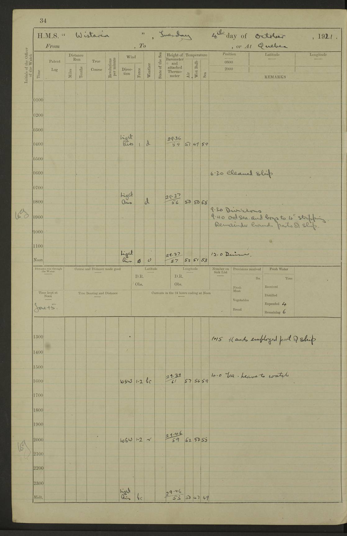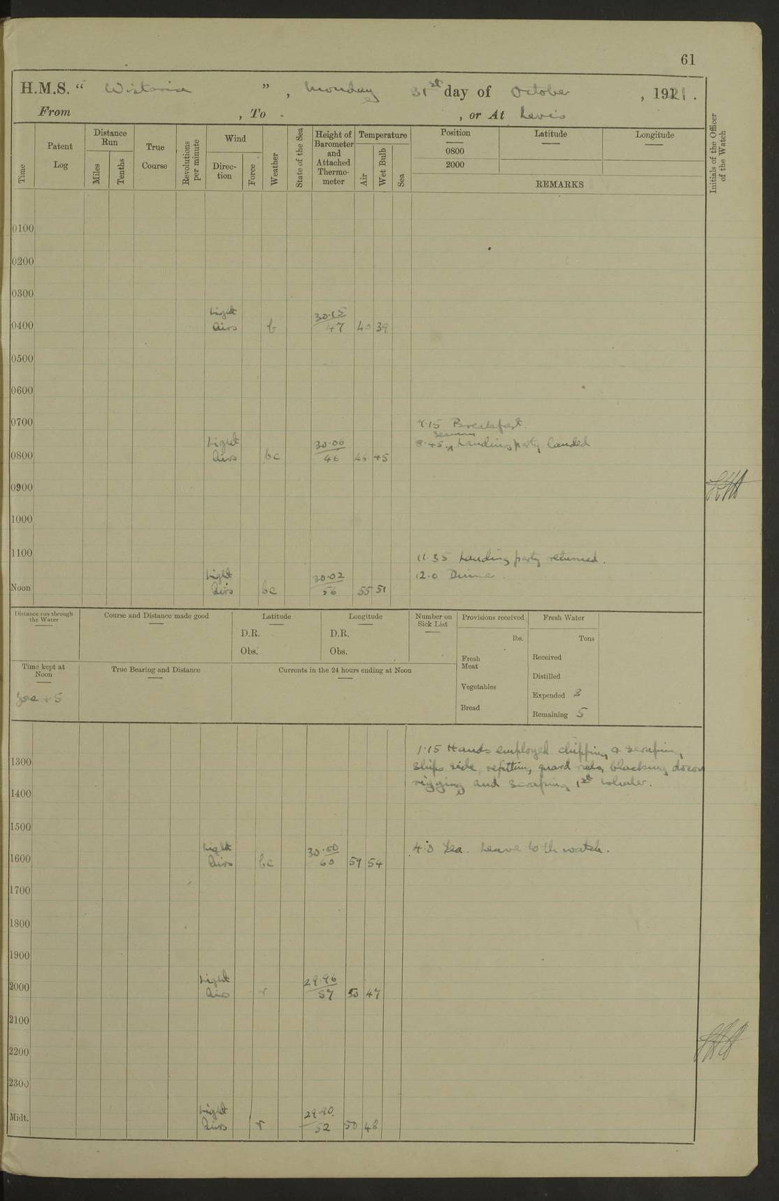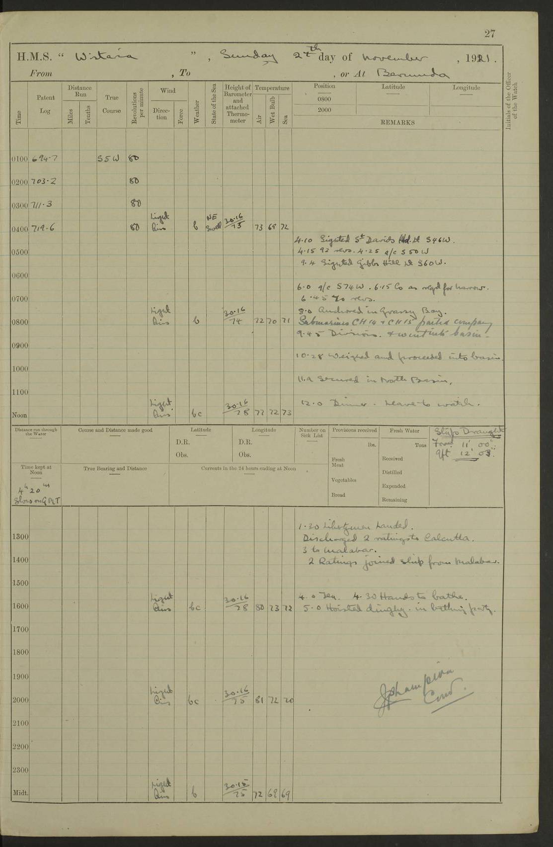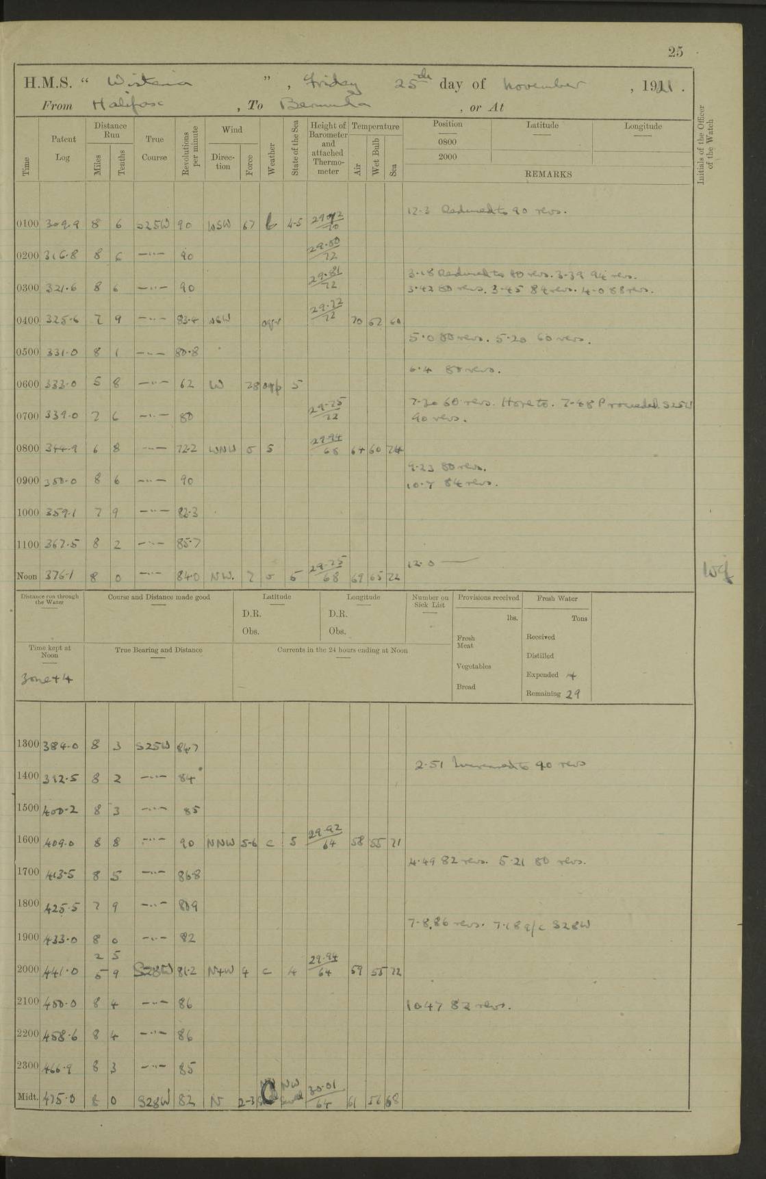 LOGS FOR NOVEMBER 1921 4f73ca6ea2fc8ea903000ad1: (https://s3.amazonaws.com:443/oldweather/ADM53-93264/0003_1.jpg) 4f73ca69a2fc8ea903000ac6: (https://s3.amazonaws.com:443/oldweather/ADM53-93263/0034_0.jpg) 1 November 1921 At Lévis Lat 46.8, Long -71.19 10.0am: Hands employed blacking down rigging refitting guard rails & scraping 1st whaler 1.10pm: Hands mustered for monthly payment 1.30pm: Hands employed as forenoon 5.0pm: [Exercised] fire stations 4f73ca6ea2fc8ea903000ad2: (https://s3.amazonaws.com:443/oldweather/ADM53-93264/0004_0.jpg) 4f73ca6aa2fc8ea903000ac7: (https://s3.amazonaws.com:443/oldweather/ADM53-93263/0034_1.jpg) 2 November 1921 At Lévis Lat 46.8, Long -71.19 8.0am: Hands employed blacking down rigging, refitting guard rails, chipping ship's side and scraping first whales 1.15pm: Hands employed as forenoon 4f73ca6ea2fc8ea903000ad3: (https://s3.amazonaws.com:443/oldweather/ADM53-93264/0004_1.jpg) 3 November 1921 At Lévis Lat 46.8, Long -71.19 8.0am: Hands employed refitting guard rails, chipping ship’s side & scraping whaler 1.15pm: Hands employed as forenoon 4f73ca6fa2fc8ea903000ad4: (https://s3.amazonaws.com:443/oldweather/ADM53-93264/0005_0.jpg) 4 November 1921 At Lévis Lat 46.8, Long -71.19 8.0am: Hands employed parts of ship 1.15pm: Hands employed variously parts of ship 5.0pm: Exercised fire quarters 4f73ca6fa2fc8ea903000ad5: (https://s3.amazonaws.com:443/oldweather/ADM53-93264/0005_1.jpg) 5 November 1921 At Lévis Lat 46.8, Long -71.19 8.0am: Hands employed scraping ship’s side and boats and working about storerooms 4f73ca70a2fc8ea903000ad6: (https://s3.amazonaws.com:443/oldweather/ADM53-93264/0006_0.jpg) 6 November 1921 At Lévis Lat 46.8, Long -71.19 8.0am: Scrubbed decks 5.0pm: Exercised fire quarters 4f73ca70a2fc8ea903000ad7: (https://s3.amazonaws.com:443/oldweather/ADM53-93264/0006_1.jpg) 7 November 1921 At Lévis Lat 46.8, Long -71.19 8.40am: Seaman landing party landed 12.25am: Landing party returned 1.45pm: Hands employed scraping boats & cleaning ship 4f73ca70a2fc8ea903000ad8: (https://s3.amazonaws.com:443/oldweather/ADM53-93264/0007_0.jpg) 8 November 1921 At Lévis Lat 46.8, Long -71.19 8.0am: Hands employed cleaning store rooms, refitting guard rails & scraping boats 1.15pm: Hands employed cleaning store rooms, refitting guard rails & scraping boats 4f73ca71a2fc8ea903000ad9: (https://s3.amazonaws.com:443/oldweather/ADM53-93264/0007_1.jpg) 9 November 1921 At Lévis Lat 46.8, Long -71.19 8.0am: Hands employed scraping & redleading ship’s side, cleaning storerooms & scraping boats 1.15pm: Hands employed painting part of ship’s side, painting 1st whaler, scraping 2nd whaler, refitting guard rails and cleaning after store room 5.0pm: Exercised fire quarters 4f73ca71a2fc8ea903000ada: (https://s3.amazonaws.com:443/oldweather/ADM53-93264/0008_0.jpg) 10 November 1921 At Lévis Lat 46.8, Long -71.19 8.0am: Hands employed refitting guard rails, scraping 2nd whaler and clearing away snow 1.15pm: Hands employed as forenoon 4f73ca71a2fc8ea903000adb: (https://s3.amazonaws.com:443/oldweather/ADM53-93264/0008_1.jpg) 11 November 1921 At Lévis Lat 46.8, Long -71.19 8.0am: Hands employed scraping whaler, refitting fenders & parts of ship 11.0am: Two minutes silence in commemoration of Armistice 1.15pm: Hands employed scraping whaler, refitting fenders, scraping and redleading chutes and clearing snow 4f73ca72a2fc8ea903000adc: (https://s3.amazonaws.com:443/oldweather/ADM53-93264/0009_0.jpg) 12 November 1921 At Lévis Lat 46.8, Long -71.19 8.0am: Hands employed parts of ship and scraping boats & refitting fenders 4f73ca72a2fc8ea903000add: (https://s3.amazonaws.com:443/oldweather/ADM53-93264/0009_1.jpg) 13 November 1921 At Lévis Lat 46.8, Long -71.19 8.0am: Cleaned ship 10.0am: Divisions and Prayers 4f73ca72a2fc8ea903000ade: (https://s3.amazonaws.com:443/oldweather/ADM53-93264/0010_0.jpg) 14 November 1921 At Lévis Lat 46.8, Long -71.19 8.0am: Hands employed embarking ammunition and working about 2nd whaler 1.15pm: Hands employed embarking ammunition and restowing provisions 4f73ca73a2fc8ea903000adf: (https://s3.amazonaws.com:443/oldweather/ADM53-93264/0010_1.jpg) 15 November 1921 At Lévis Lat 46.8, Long -71.19 8.0am: Hands employed parts of ship 1.15pm: Hands employed cleaning up ship 4f73ca73a2fc8ea903000ae0: (https://s3.amazonaws.com:443/oldweather/ADM53-93264/0011_0.jpg) 16 November 1921 At Lévis Lat 46.8, Long -71.19 8.0am: Hands employed parts of ship noon: Dinner & clean in coaling rig 1.15pm: Hands employed parts of ship 2.55pm: Commenced flooding dock 3.20pm: Ship became water borne. Starboard watch to tea 4.0pm: Port watch to tea 4.10pm: Shifted ship from dock to jetty outside 4.40pm: Coal lighter secured alongside 5.0pm: Hands coal ship 11.30pm: Commenced basin trials 4f73ca74a2fc8ea903000ae1: (https://s3.amazonaws.com:443/oldweather/ADM53-93264/0011_1.jpg) 17 November 1921 From Quebec to Halifax [Lat 46.93, Long -70.73] [Belle Chasse Island coordinates] 8.15am: Left jetty and swung ship for compasses. Proceeded to Quebec to pick up pilot 10.0am: Proceeded with pilot down river, 100 revs 10.15am: Swung for adjustment off Lauzon Dock 10.20am: Proceeded. Course S81E 10.21am: West Pt abeam, increased to 120 revs 10.45am: St Laurent Pier abeam. Altered course N75E 11.10am: St Jean Pier abeam 11.15am: Let go Port anchor veered to 4 shackles One broom lost overboard by accident 12.40pm: Weighed 12.45pm: Proceeded 120 revs 1.15pm: Belle Chasse Lt Ho abeam 2.13pm: Crane Island Pier abeam 2.26pm: Beaujeu Beacon abeam 2.35pm: Rigged sounding boom 3.44pm: Algernon Rock abeam 4.57½pm: Lower Traverse Lt Vessel abeam, course N51E 5.53pm: Anchored in 12½ fms on English Bank, 4 shackles Anchor Bearings: Goose Island Lt N49W, Orignaux Pt S84E, [space left blank] S14½E [“English Bank: proper extends from a position 4 miles NNW of Orignaux Point for about 10 miles SW by W¼W, to Middle ground with a width of about half a mile at its eastern point, gradually increasing