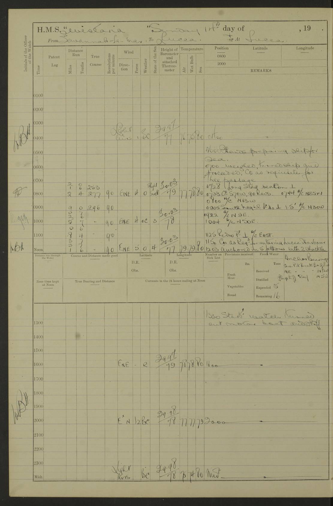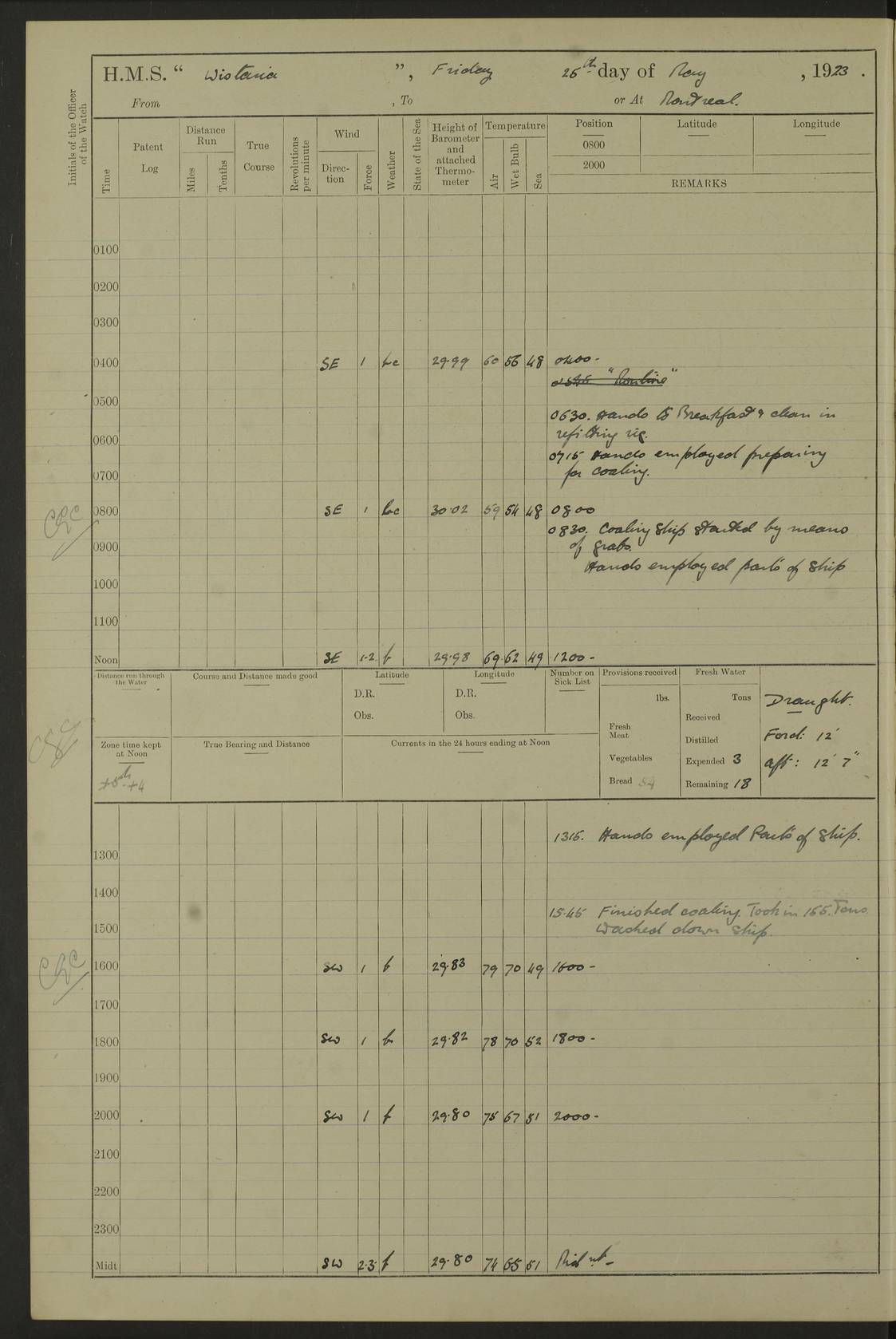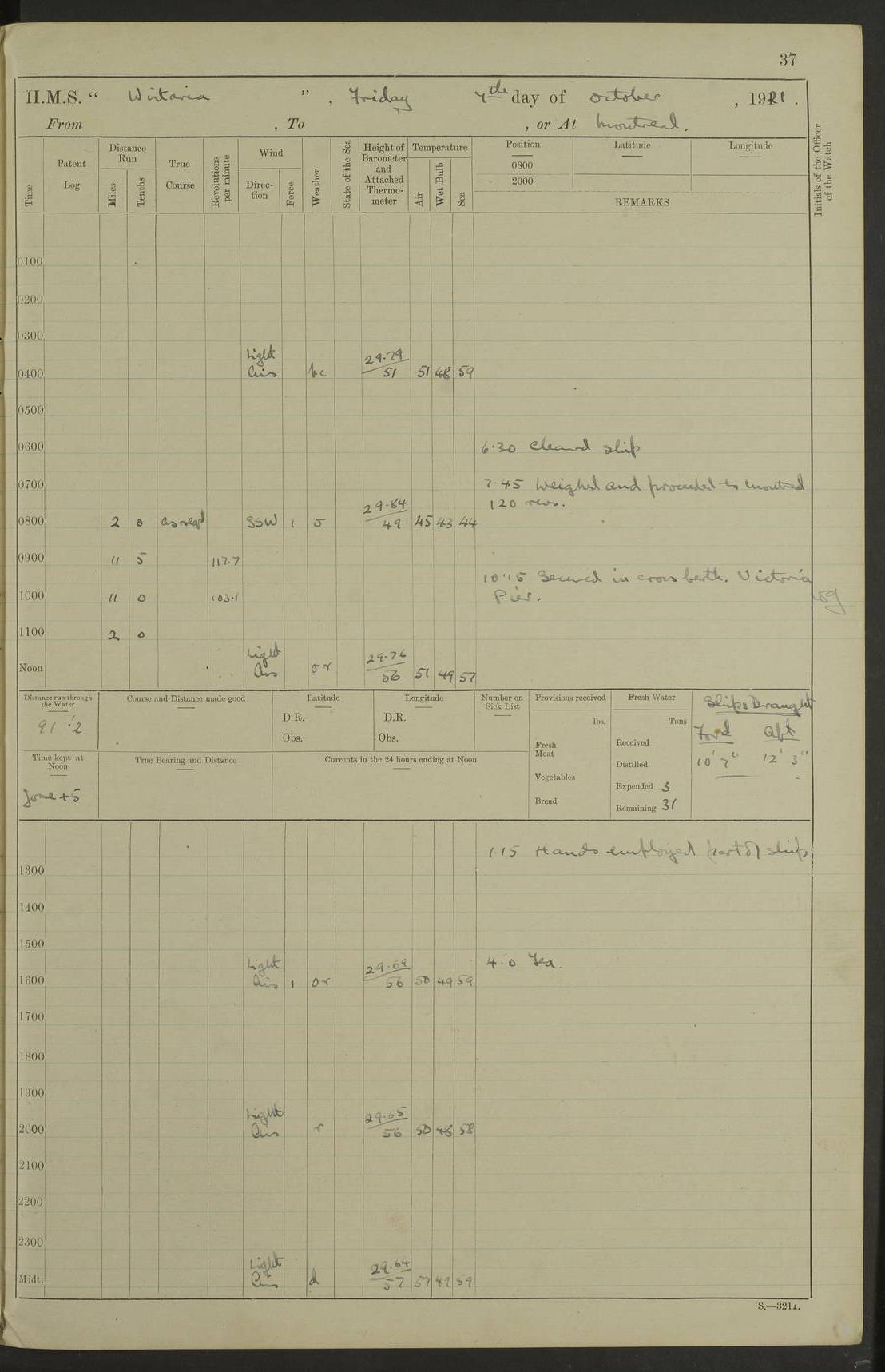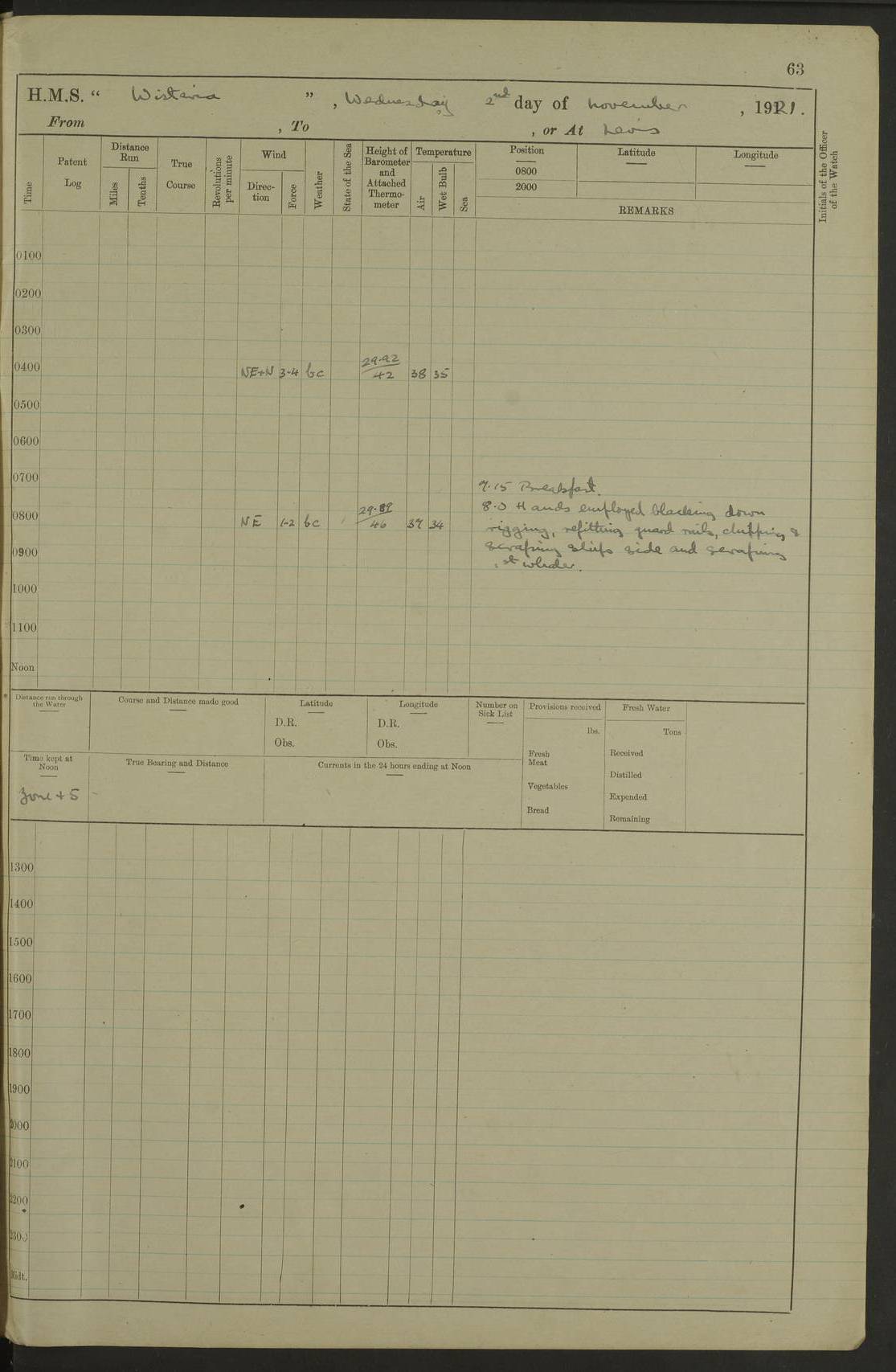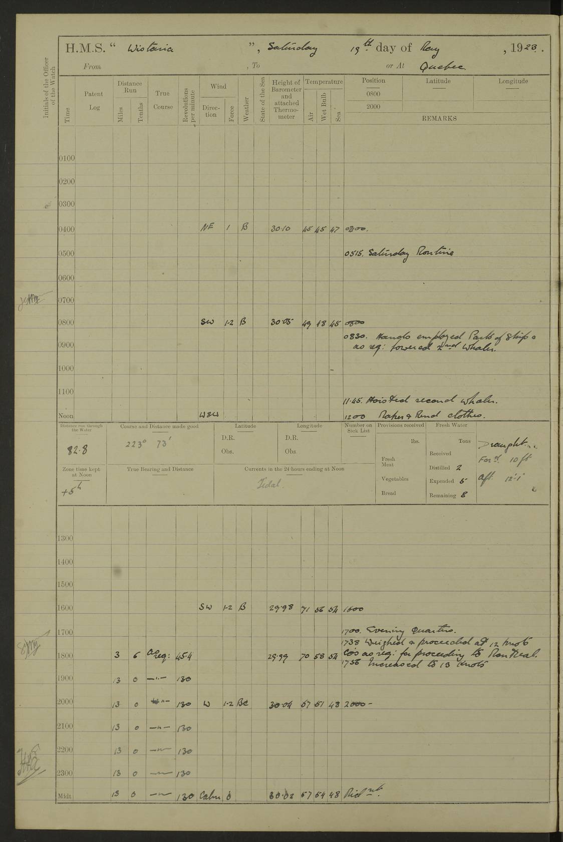 LOGS FOR NOVEMBER 1921 4f73ca6ea2fc8ea903000ad1: (https://s3.amazonaws.com:443/oldweather/ADM53-93264/0003_1.jpg) 4f73ca69a2fc8ea903000ac6: (https://s3.amazonaws.com:443/oldweather/ADM53-93263/0034_0.jpg) 1 November 1921 At Lévis Lat 46.8, Long -71.19 10.0am: Hands employed blacking down rigging refitting guard rails & scraping 1st whaler 1.10pm: Hands mustered for monthly payment 1.30pm: Hands employed as forenoon 5.0pm: [Exercised] fire stations 4f73ca6ea2fc8ea903000ad2: (https://s3.amazonaws.com:443/oldweather/ADM53-93264/0004_0.jpg) 4f73ca6aa2fc8ea903000ac7: (https://s3.amazonaws.com:443/oldweather/ADM53-93263/0034_1.jpg) 2 November 1921 At Lévis Lat 46.8, Long -71.19 8.0am: Hands employed blacking down rigging, refitting guard rails, chipping ship's side and scraping first whales 1.15pm: Hands employed as forenoon 4f73ca6ea2fc8ea903000ad3: (https://s3.amazonaws.com:443/oldweather/ADM53-93264/0004_1.jpg) 3 November 1921 At Lévis Lat 46.8, Long -71.19 8.0am: Hands employed refitting guard rails, chipping ship’s side & scraping whaler 1.15pm: Hands employed as forenoon 4f73ca6fa2fc8ea903000ad4: (https://s3.amazonaws.com:443/oldweather/ADM53-93264/0005_0.jpg) 4 November 1921 At Lévis Lat 46.8, Long -71.19 8.0am: Hands employed parts of ship 1.15pm: Hands employed variously parts of ship 5.0pm: Exercised fire quarters 4f73ca6fa2fc8ea903000ad5: (https://s3.amazonaws.com:443/oldweather/ADM53-93264/0005_1.jpg) 5 November 1921 At Lévis Lat 46.8, Long -71.19 8.0am: Hands employed scraping ship’s side and boats and working about storerooms 4f73ca70a2fc8ea903000ad6: (https://s3.amazonaws.com:443/oldweather/ADM53-93264/0006_0.jpg) 6 November 1921 At Lévis Lat 46.8, Long -71.19 8.0am: Scrubbed decks 5.0pm: Exercised fire quarters 4f73ca70a2fc8ea903000ad7: (https://s3.amazonaws.com:443/oldweather/ADM53-93264/0006_1.jpg) 7 November 1921 At Lévis Lat 46.8, Long -71.19 8.40am: Seaman landing party landed 12.25am: Landing party returned 1.45pm: Hands employed scraping boats & cleaning ship 4f73ca70a2fc8ea903000ad8: (https://s3.amazonaws.com:443/oldweather/ADM53-93264/0007_0.jpg) 8 November 1921 At Lévis Lat 46.8, Long -71.19 8.0am: Hands employed cleaning store rooms, refitting guard rails & scraping boats 1.15pm: Hands employed cleaning store rooms, refitting guard rails & scraping boats 4f73ca71a2fc8ea903000ad9: (https://s3.amazonaws.com:443/oldweather/ADM53-93264/0007_1.jpg) 9 November 1921 At Lévis Lat 46.8, Long -71.19 8.0am: Hands employed scraping & redleading ship’s side, cleaning storerooms & scraping boats 1.15pm: Hands employed painting part of ship’s side, painting 1st whaler, scraping 2nd whaler, refitting guard rails and cleaning after store room 5.0pm: Exercised fire quarters 4f73ca71a2fc8ea903000ada: (https://s3.amazonaws.com:443/oldweather/ADM53-93264/0008_0.jpg) 10 November 1921 At Lévis Lat 46.8, Long -71.19 8.0am: Hands employed refitting guard rails, scraping 2nd whaler and clearing away snow 1.15pm: Hands employed as forenoon 4f73ca71a2fc8ea903000adb: (https://s3.amazonaws.com:443/oldweather/ADM53-93264/0008_1.jpg) 11 November 1921 At Lévis Lat 46.8, Long -71.19 8.0am: Hands employed scraping whaler, refitting fenders & parts of ship 11.0am: Two minutes silence in commemoration of Armistice 1.15pm: Hands employed scraping whaler, refitting fenders, scraping and redleading chutes and clearing snow 4f73ca72a2fc8ea903000adc: (https://s3.amazonaws.com:443/oldweather/ADM53-93264/0009_0.jpg) 12 November 1921 At Lévis Lat 46.8, Long -71.19 8.0am: Hands employed parts of ship and scraping boats & refitting fenders 4f73ca72a2fc8ea903000add: (https://s3.amazonaws.com:443/oldweather/ADM53-93264/0009_1.jpg) 13 November 1921 At Lévis Lat 46.8, Long -71.19 8.0am: Cleaned ship 10.0am: Divisions and Prayers 4f73ca72a2fc8ea903000ade: (https://s3.amazonaws.com:443/oldweather/ADM53-93264/0010_0.jpg) 14 November 1921 At Lévis Lat 46.8, Long -71.19 8.0am: Hands employed embarking ammunition and working about 2nd whaler 1.15pm: Hands employed embarking ammunition and restowing provisions 4f73ca73a2fc8ea903000adf: (https://s3.amazonaws.com:443/oldweather/ADM53-93264/0010_1.jpg) 15 November 1921 At Lévis Lat 46.8, Long -71.19 8.0am: Hands employed parts of ship 1.15pm: Hands employed cleaning up ship 4f73ca73a2fc8ea903000ae0: (https://s3.amazonaws.com:443/oldweather/ADM53-93264/0011_0.jpg) 16 November 1921 At Lévis Lat 46.8, Long -71.19 8.0am: Hands employed parts of ship noon: Dinner & clean in coaling rig 1.15pm: Hands employed parts of ship 2.55pm: Commenced flooding dock 3.20pm: Ship became water borne. Starboard watch to tea 4.0pm: Port watch to tea 4.10pm: Shifted ship from dock to jetty outside 4.40pm: Coal lighter secured alongside 5.0pm: Hands coal ship 11.30pm: Commenced basin trials 4f73ca74a2fc8ea903000ae1: (https://s3.amazonaws.com:443/oldweather/ADM53-93264/0011_1.jpg) 17 November 1921 From Quebec to Halifax [Lat 46.93, Long -70.73] [Belle Chasse Island coordinates] 8.15am: Left jetty and swung ship for compasses. Proceeded to Quebec to pick up pilot 10.0am: Proceeded with pilot down river, 100 revs 10.15am: Swung for adjustment off Lauzon Dock 10.20am: Proceeded. Course S81E 10.21am: West Pt abeam, increased to 120 revs 10.45am: St Laurent Pier abeam. Altered course N75E 11.10am: St Jean Pier abeam 11.15am: Let go Port anchor veered to 4 shackles One broom lost overboard by accident 12.40pm: Weighed 12.45pm: Proceeded 120 revs 1.15pm: Belle Chasse Lt Ho abeam 2.13pm: Crane Island Pier abeam 2.26pm: Beaujeu Beacon abeam 2.35pm: Rigged sounding boom 3.44pm: Algernon Rock abeam 4.57½pm: Lower Traverse Lt Vessel abeam, course N51E 5.53pm: Anchored in 12½ fms on English Bank, 4 shackles Anchor Bearings: Goose Island Lt N49W, Orignaux Pt S84E, [space left blank] S14½E [“English Bank: proper extends from a position 4 miles NNW of Orignaux Point for about 10 miles SW by W¼W, to Middle ground with a width of about half a mile at its eastern point, gradually increasing
