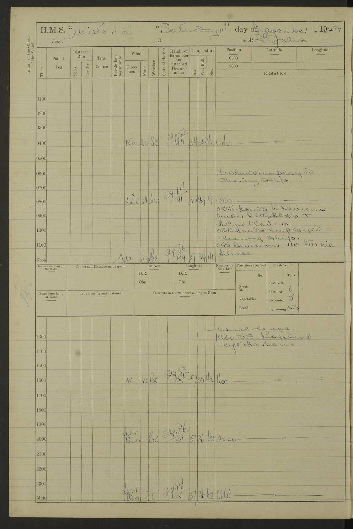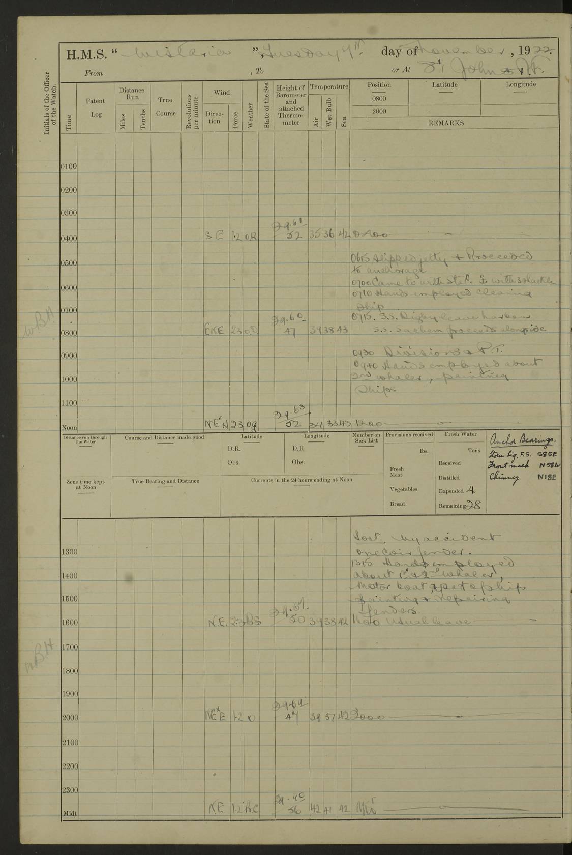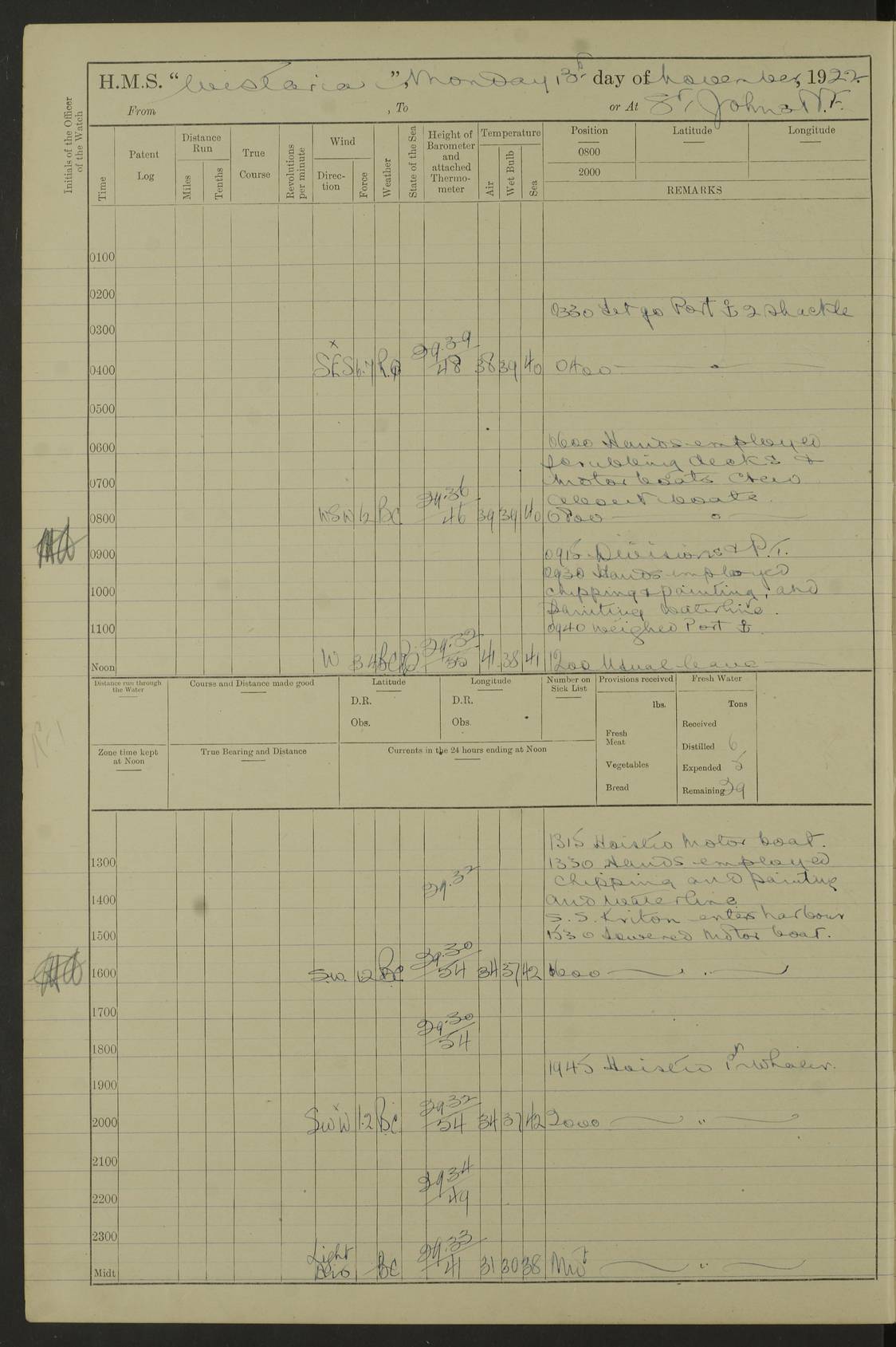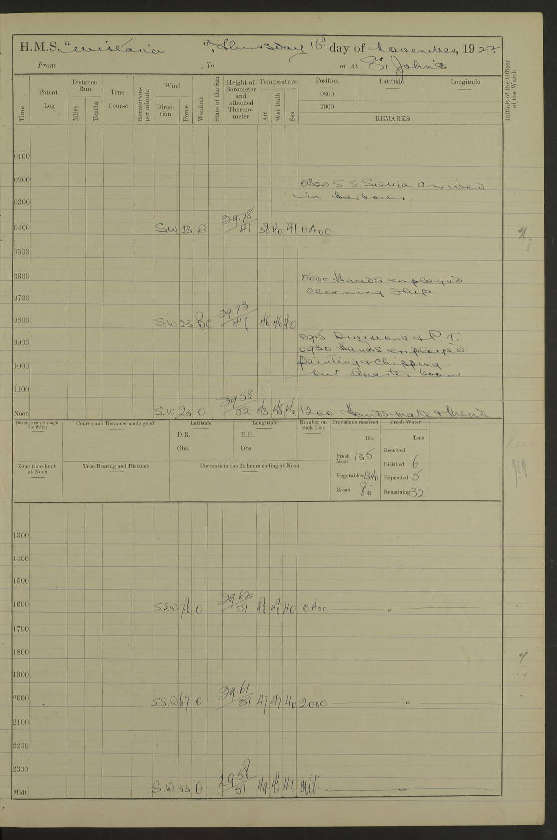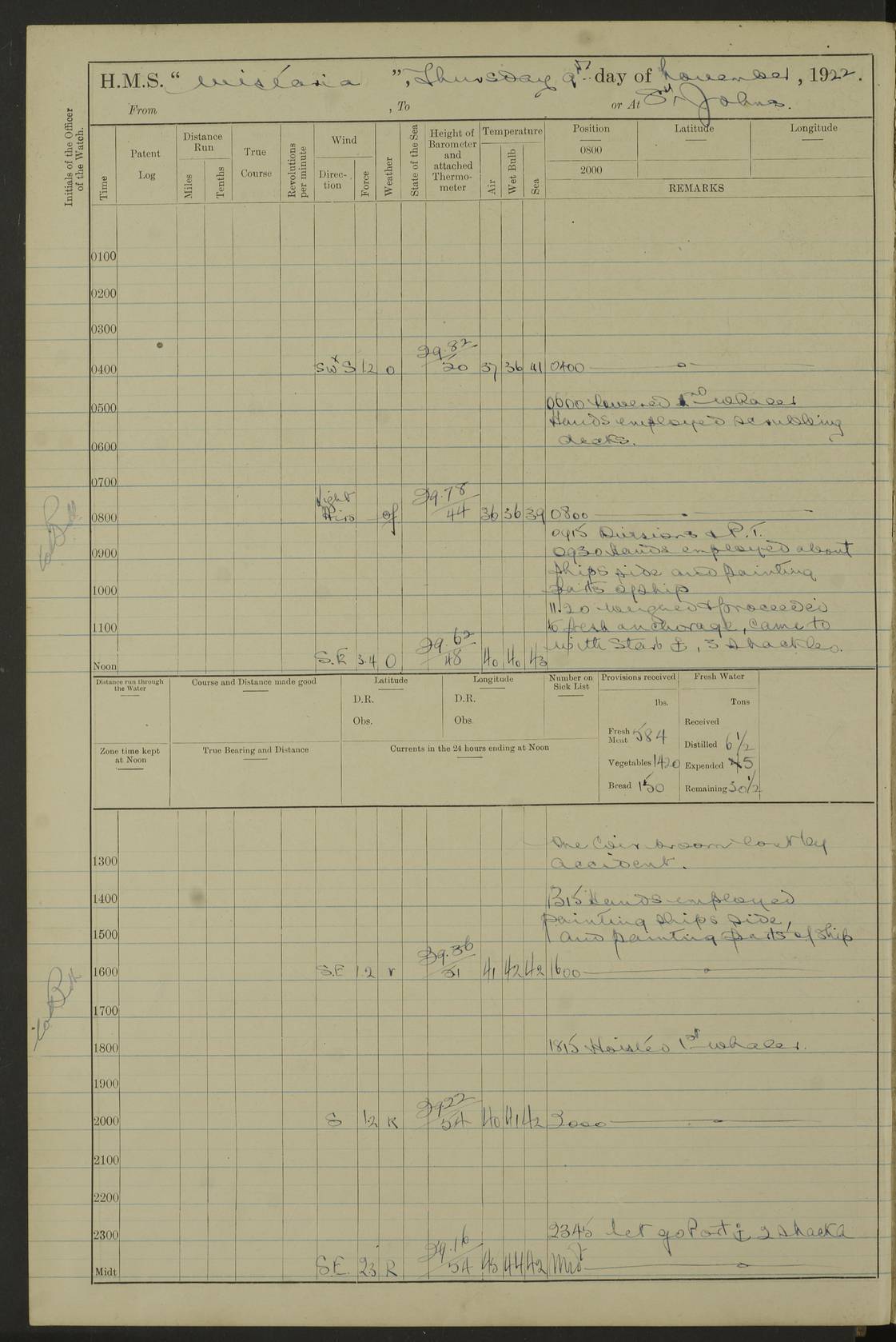[Signed] A E Johnston, Captain [Signed] F H Alderson Navigating Officer LOGS FOR NOVEMBER 1922 4f73cb16a2fc8ea903000c94: (https://s3.amazonaws.com:443/oldweather/ADM53-93271/0006_0.jpg) 1 November 1922 At St. John’s N.F. Lat 47.56, Long -52.705 9.40am: Hands employed cleaning ship 11.45am: Monthly payment 4f73cb16a2fc8ea903000c95: (https://s3.amazonaws.com:443/oldweather/ADM53-93271/0006_1.jpg) 2 November 1922 At St. John’s N.F. Lat 47.56, Long -52.705 5.30am: 4½” Hemp hawser carried away 6.0am: Hands employed scrubbing decks 8.15am: Hands employed parts of ship 1.15pm: Hands employed parts of ship and about 2nd whaler 4f73cb17a2fc8ea903000c96: (https://s3.amazonaws.com:443/oldweather/ADM53-93271/0007_0.jpg) 3 November 1922 At St. John’s N.F. Lat 47.56, Long -52.705 8.15am: Hands to quarters clean guns 10.0am: Hands employed about 2nd whaler & parts of ship 1.15pm: Q.D. employed with 2½” wire, 2nd whaler & parts of ship 6.15pm: Spring of 2½” wire carried away 4f73cb17a2fc8ea903000c97: (https://s3.amazonaws.com:443/oldweather/ADM53-93271/0007_1.jpg) 4 November 1922 At St. John’s N.F. Lat 47.56, Long -52.705 8.30am: Hands employed part of ship, 2nd whaler, motor boat & 2½” wire 12.45pm: SS “Silvia” leaves harbour 4.30pm: Hauled ship 20 ft ahead [SS “Silvia”: built 1909 as “Orel” for the Russian Voluntary Fleet, 1921 sold to C. T. Bowring & Co., Liverpool, renamed “Silvia”, 1929 transferred to Bermuda & West Indies SS Co., Hamilton, 1935 sold to Douglas SS Co., Hong Kong, renamed “Haitan”, 1950 scrapped. A picture of SS “Silvia” here] 4f73cb17a2fc8ea903000c98: (https://s3.amazonaws.com:443/oldweather/ADM53-93271/0008_0.jpg) 5 November 1922 At St. John’s N.F. Lat 47.56, Long -52.705 6.30am: Hands employed cleaning ship 7.30pm: 1 Ld. Sto. discharged to hospital 4f73cb18a2fc8ea903000c99: (https://s3.amazonaws.com:443/oldweather/ADM53-93271/0008_1.jpg) 6 November 1922 At St. John’s N.F. Lat 47.56, Long -52.705 6.0am: Hands employed scrubbing decks 9.30am: Hands employed parts of ship & boats 1.15pm: Hands employed parts of ship & 2nd whaler 4f73cb18a2fc8ea903000c9a: (https://s3.amazonaws.com:443/oldweather/ADM53-93271/0009_0.jpg) 7 November 1922 At St. John’s N.F. Lat 47.56, Long -52.705 6.15am: Slipped jetty and proceeded to anchorage 7.0am: Came to with Starboard anchor with 3 shackles 7.15am: SS “Digby” leaves harbour; SS “Sachem” proceeds alongside 9.40am: Hands employed about 2nd whaler, painting ship Anchor bearings: Storm Sig FS S85E, Front mark N58W, Chimney N18E pm: Lost by accident: one coir fender 1.15pm: Hands employed about 1st and 2nd whaler, motor boat & parts of ship, painting & repairing fenders [SS “Digby”: built 1913. 1914 commissioned as armed merchant cruiser HMS “Digby”, 1916 renamed “Artois”, 1918 reverted to “Digby”, 1925 transferred to Bermuda & West Indies SS Co, renamed “Dominica”, 1934 sold to United Baltic Co, renamed “Baltrover”, 1939-1944 chartered from United Baltic Co, 1944 returned to owners] [SS “Sachem”: passenger ship built 1893 built by Harland and Wolff for Geo Warren & Co and completed on 28 October 1893. 1927 scrapped.] 4f73cb19a2fc8ea903000c9b: (https://s3.amazonaws.com:443/oldweather/ADM53-93271/0009_1.jpg) 8 November 1922 At St. John’s N.F. Lat 47.56, Long -52.705 6.0am: Hands employed scrubbing decks 9.15am: Hands employed painting parts of ship, refitting fenders, 1st whaler, motor boat, & scraping in battery pm: 1 whalers’ oar broken pm: SS “Sachem” left Harbour 18.00 pm: SS “Manoa” left Harbour 18.55 [Canada Steamship Lines ship “Manoa” (II): built in 1911 by Bremer Vulkan at Vegesack, Germany, and operated as a passenger-cargo ship by the Hamburg-America Line as SS “Wasgenwald”, was chartered for World War I service by the United States Army on 26 October 1917 from the Custom House, New York, and used as a depot collier with the name SS “Shoshone”. In 1920, the vessel was acquired by the American Interlake Line before the Canada Steamship Lines purchased the vessel, renamed her “Manoa” and registered her in London] 4f73cb19a2fc8ea903000c9c: (https://s3.amazonaws.com:443/oldweather/ADM53-93271/0010_0.jpg) 9 November 1922 At St. John’s Lat 47.56, Long -52.705 6.0am: Lowered 2nd whaler. Hands employed scrubbing decks 9.30am: Hands employed about ship's side and painting parts of ship 11.20am: Weighed & proceeded to fresh anchorage, came to with Starboard anchor, 3 shackles pm: One coir fender lost by accident 1.15pm: Hands employed painting ship’s side and painting parts of ship 6.15pm: Hoisted 1st whaler 11.45pm: Let go Port anchor 2 shackles 4f73cb19a2fc8ea903000c9d: (https://s3.amazonaws.com:443/oldweather/ADM53-93271/0010_1.jpg) 10 November 1922 At St. John’s N.F. Lat 47.56, Long -52.705 5.30am: Hands employed scrubbing decks and 1st whaler 6.10am: SS “Javary” left harbour 10.0am: Hands employed painting ship’s side & about boats 1.15pm: Hands employed painting parts of ship & working about boats 4.0pm: Hands to evening quarters, exercise fire stations 4f73cb1aa2fc8ea903000c9e: (https://s3.amazonaws.com:443/oldweather/ADM53-93271/0011_0.jpg) 11 November 1922 At St. John’s N.F. Lat 47.56, Long -52.705 8.35am: Hands to divisions. Muster Ditty Boxes & Helmet Covers 8.45am: Hands employed cleaning ship 10.55am: Divisions 11.0am: Two minute silence 12.30pm: SS “Rosaline” left harbour [SS “Rosaline”: perhaps SS “Rosaline” built 1895] 4f73cb1aa2fc8ea903000c9f: (https://s3.amazonaws.com:443/oldweather/ADM53-93271/0011_1.jpg) 12 November 1922 At St. John’s N.F. Lat 47.56, Long -52.705 6.30am: Hands employed cleaning ship 9.45am: Divisions, Prayers and Rounds 4f73cb1aa2fc8ea903000ca0: (https://s3.amazonaws.com:443/oldweather/ADM53-93271/0012_0.jpg) 13 November 1922 At St. John’s N.F. Lat 47.56, Long -52.705 3.30am: Let go Port anchor 2 shackles 6.0am: Hands employed scrubbing decks & motor boats crew about boats 9