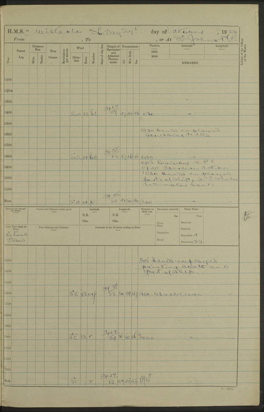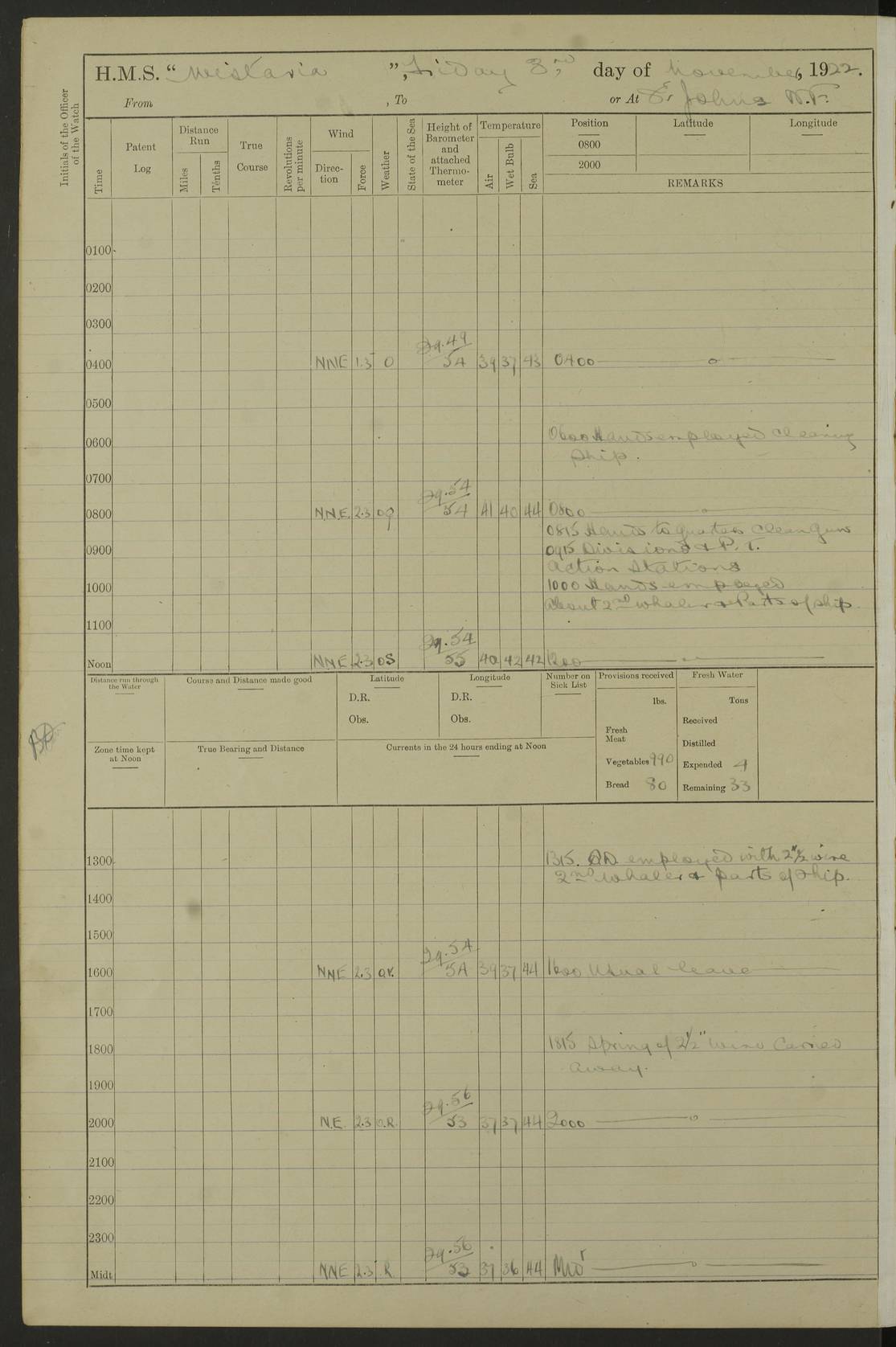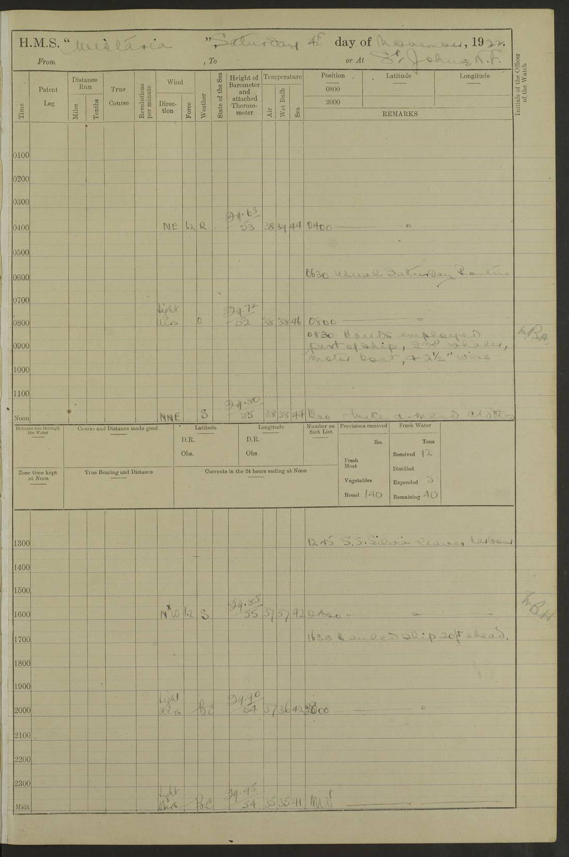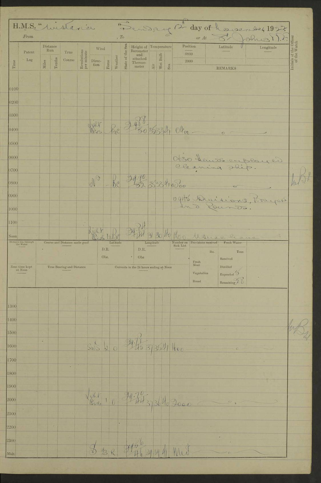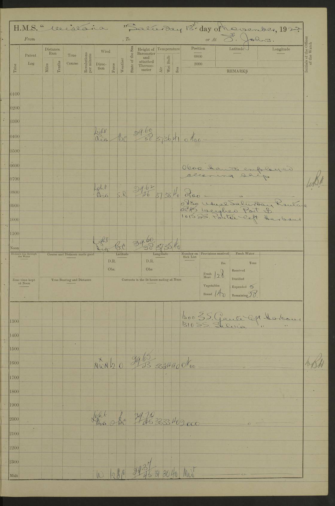 [Signed] A E Johnston, Captain [Signed] F H Alderson Navigating Officer LOGS FOR NOVEMBER 1922 4f73cb16a2fc8ea903000c94: (https://s3.amazonaws.com:443/oldweather/ADM53-93271/0006_0.jpg) 1 November 1922 At St. John’s N.F. Lat 47.56, Long -52.705 9.40am: Hands employed cleaning ship 11.45am: Monthly payment 4f73cb16a2fc8ea903000c95: (https://s3.amazonaws.com:443/oldweather/ADM53-93271/0006_1.jpg) 2 November 1922 At St. John’s N.F. Lat 47.56, Long -52.705 5.30am: 4½” Hemp hawser carried away 6.0am: Hands employed scrubbing decks 8.15am: Hands employed parts of ship 1.15pm: Hands employed parts of ship and about 2nd whaler 4f73cb17a2fc8ea903000c96: (https://s3.amazonaws.com:443/oldweather/ADM53-93271/0007_0.jpg) 3 November 1922 At St. John’s N.F. Lat 47.56, Long -52.705 8.15am: Hands to quarters clean guns 10.0am: Hands employed about 2nd whaler & parts of ship 1.15pm: Q.D. employed with 2½” wire, 2nd whaler & parts of ship 6.15pm: Spring of 2½” wire carried away 4f73cb17a2fc8ea903000c97: (https://s3.amazonaws.com:443/oldweather/ADM53-93271/0007_1.jpg) 4 November 1922 At St. John’s N.F. Lat 47.56, Long -52.705 8.30am: Hands employed part of ship, 2nd whaler, motor boat & 2½” wire 12.45pm: SS “Silvia” leaves harbour 4.30pm: Hauled ship 20 ft ahead [SS “Silvia”: built 1909 as “Orel” for the Russian Voluntary Fleet, 1921 sold to C. T. Bowring & Co., Liverpool, renamed “Silvia”, 1929 transferred to Bermuda & West Indies SS Co., Hamilton, 1935 sold to Douglas SS Co., Hong Kong, renamed “Haitan”, 1950 scrapped. A picture of SS “Silvia” here] 4f73cb17a2fc8ea903000c98: (https://s3.amazonaws.com:443/oldweather/ADM53-93271/0008_0.jpg) 5 November 1922 At St. John’s N.F. Lat 47.56, Long -52.705 6.30am: Hands employed cleaning ship 7.30pm: 1 Ld. Sto. discharged to hospital 4f73cb18a2fc8ea903000c99: (https://s3.amazonaws.com:443/oldweather/ADM53-93271/0008_1.jpg) 6 November 1922 At St. John’s N.F. Lat 47.56, Long -52.705 6.0am: Hands employed scrubbing decks 9.30am: Hands employed parts of ship & boats 1.15pm: Hands employed parts of ship & 2nd whaler 4f73cb18a2fc8ea903000c9a: (https://s3.amazonaws.com:443/oldweather/ADM53-93271/0009_0.jpg) 7 November 1922 At St. John’s N.F. Lat 47.56, Long -52.705 6.15am: Slipped jetty and proceeded to anchorage 7.0am: Came to with Starboard anchor with 3 shackles 7.15am: SS “Digby” leaves harbour; SS “Sachem” proceeds alongside 9.40am: Hands employed about 2nd whaler, painting ship Anchor bearings: Storm Sig FS S85E, Front mark N58W, Chimney N18E pm: Lost by accident: one coir fender 1.15pm: Hands employed about 1st and 2nd whaler, motor boat & parts of ship, painting & repairing fenders [SS “Digby”: built 1913. 1914 commissioned as armed merchant cruiser HMS “Digby”, 1916 renamed “Artois”, 1918 reverted to “Digby”, 1925 transferred to Bermuda & West Indies SS Co, renamed “Dominica”, 1934 sold to United Baltic Co, renamed “Baltrover”, 1939-1944 chartered from United Baltic Co, 1944 returned to owners] [SS “Sachem”: passenger ship built 1893 built by Harland and Wolff for Geo Warren & Co and completed on 28 October 1893. 1927 scrapped.] 4f73cb19a2fc8ea903000c9b: (https://s3.amazonaws.com:443/oldweather/ADM53-93271/0009_1.jpg) 8 November 1922 At St. John’s N.F. Lat 47.56, Long -52.705 6.0am: Hands employed scrubbing decks 9.15am: Hands employed painting parts of ship, refitting fenders, 1st whaler, motor boat, & scraping in battery pm: 1 whalers’ oar broken pm: SS “Sachem” left Harbour 18.00 pm: SS “Manoa” left Harbour 18.55 [Canada Steamship Lines ship “Manoa” (II): built in 1911 by Bremer Vulkan at Vegesack, Germany, and operated as a passenger-cargo ship by the Hamburg-America Line as SS “Wasgenwald”, was chartered for World War I service by the United States Army on 26 October 1917 from the Custom House, New York, and used as a depot collier with the name SS “Shoshone”. In 1920, the vessel was acquired by the American Interlake Line before the Canada Steamship Lines purchased the vessel, renamed her “Manoa” and registered her in London] 4f73cb19a2fc8ea903000c9c: (https://s3.amazonaws.com:443/oldweather/ADM53-93271/0010_0.jpg) 9 November 1922 At St. John’s Lat 47.56, Long -52.705 6.0am: Lowered 2nd whaler. Hands employed scrubbing decks 9.30am: Hands employed about ship's side and painting parts of ship 11.20am: Weighed & proceeded to fresh anchorage, came to with Starboard anchor, 3 shackles pm: One coir fender lost by accident 1.15pm: Hands employed painting ship’s side and painting parts of ship 6.15pm: Hoisted 1st whaler 11.45pm: Let go Port anchor 2 shackles 4f73cb19a2fc8ea903000c9d: (https://s3.amazonaws.com:443/oldweather/ADM53-93271/0010_1.jpg) 10 November 1922 At St. John’s N.F. Lat 47.56, Long -52.705 5.30am: Hands employed scrubbing decks and 1st whaler 6.10am: SS “Javary” left harbour 10.0am: Hands employed painting ship’s side & about boats 1.15pm: Hands employed painting parts of ship & working about boats 4.0pm: Hands to evening quarters, exercise fire stations 4f73cb1aa2fc8ea903000c9e: (https://s3.amazonaws.com:443/oldweather/ADM53-93271/0011_0.jpg) 11 November 1922 At St. John’s N.F. Lat 47.56, Long -52.705 8.35am: Hands to divisions. Muster Ditty Boxes & Helmet Covers 8.45am: Hands employed cleaning ship 10.55am: Divisions 11.0am: Two minute silence 12.30pm: SS “Rosaline” left harbour [SS “Rosaline”: perhaps SS “Rosaline” built 1895] 4f73cb1aa2fc8ea903000c9f: (https://s3.amazonaws.com:443/oldweather/ADM53-93271/0011_1.jpg) 12 November 1922 At St. John’s N.F. Lat 47.56, Long -52.705 6.30am: Hands employed cleaning ship 9.45am: Divisions, Prayers and Rounds 4f73cb1aa2fc8ea903000ca0: (https://s3.amazonaws.com:443/oldweather/ADM53-93271/0012_0.jpg) 13 November 1922 At St. John’s N.F. Lat 47.56, Long -52.705 3.30am: Let go Port anchor 2 shackles 6.0am: Hands employed scrubbing decks & motor boats crew about boats 9